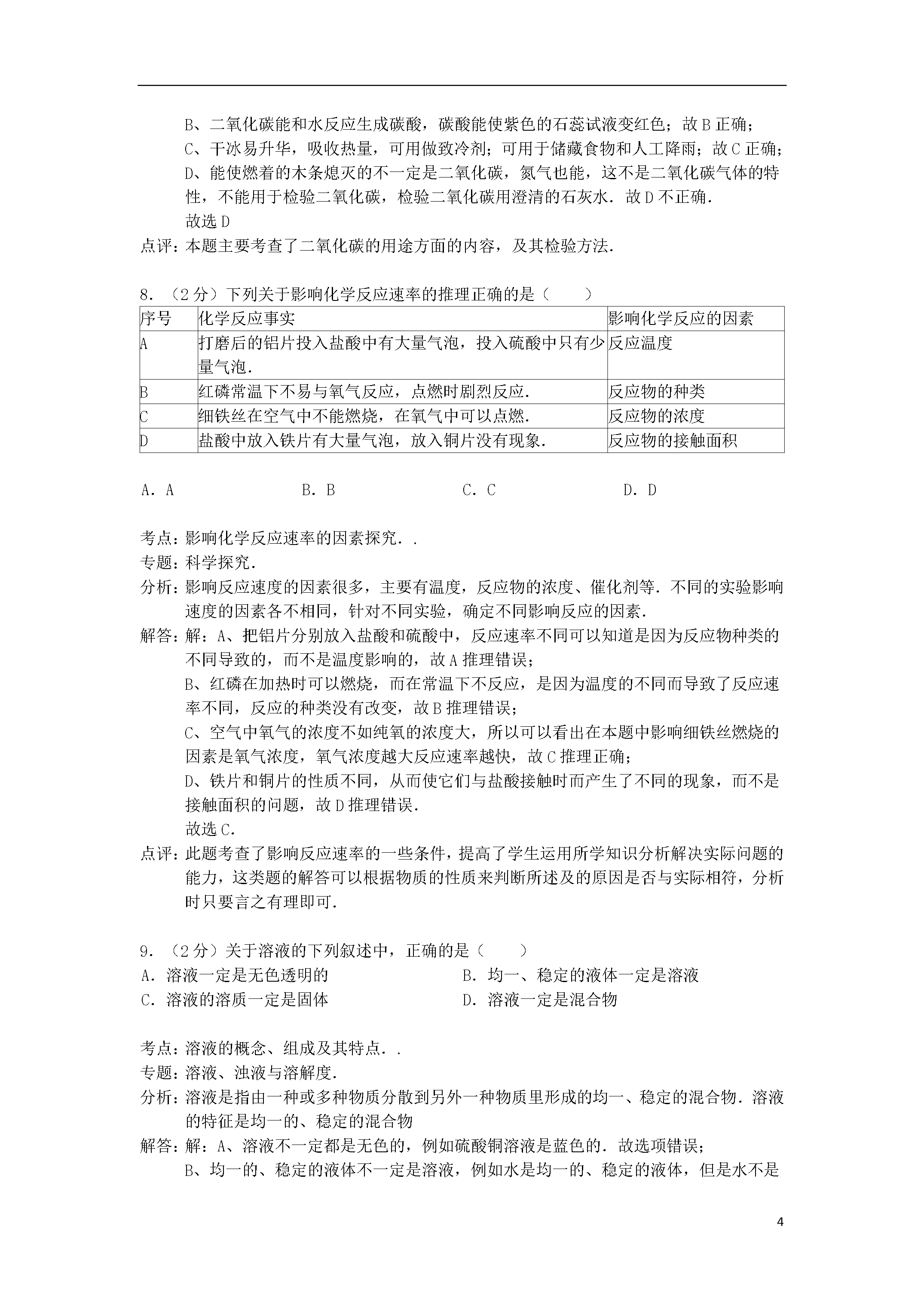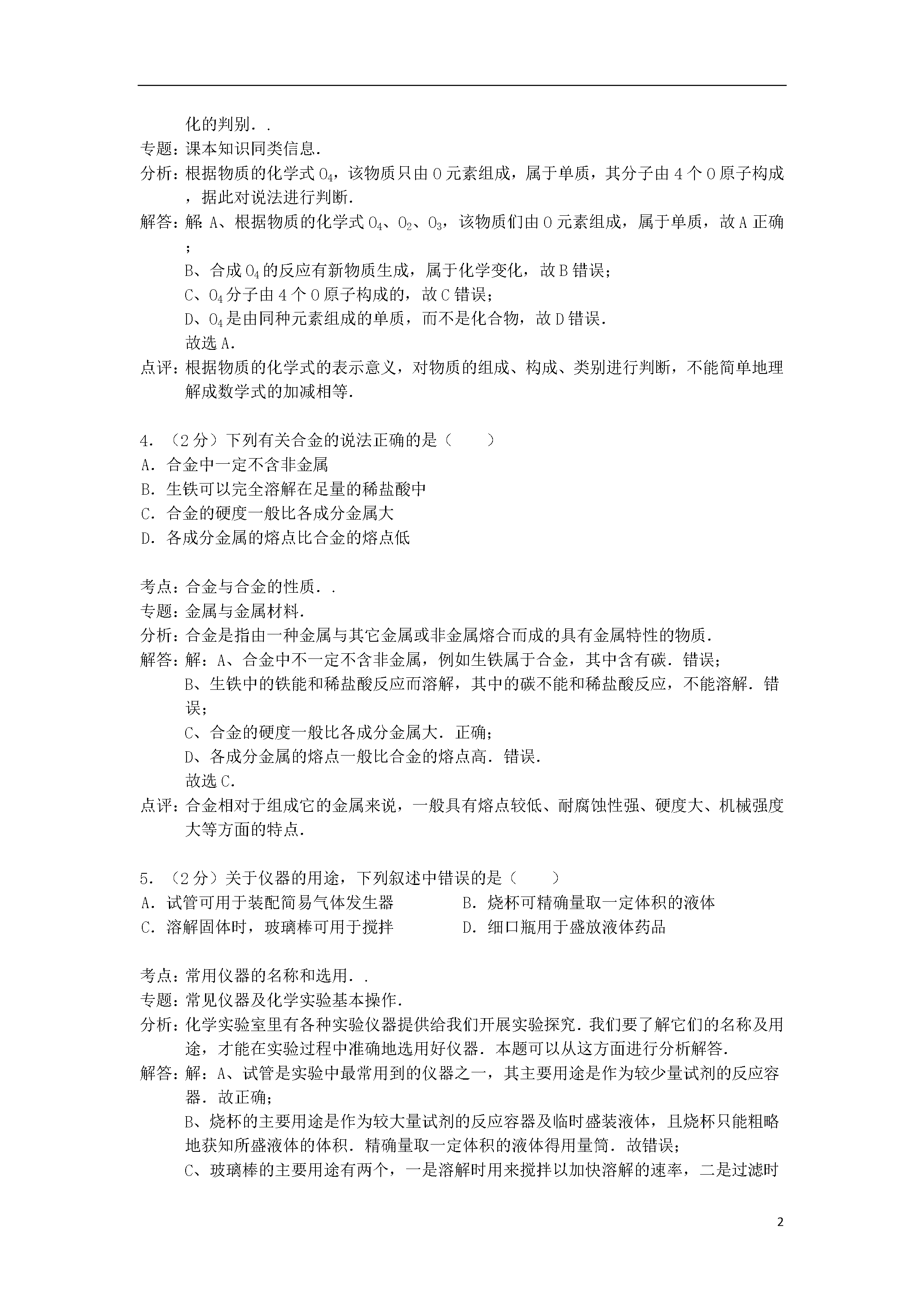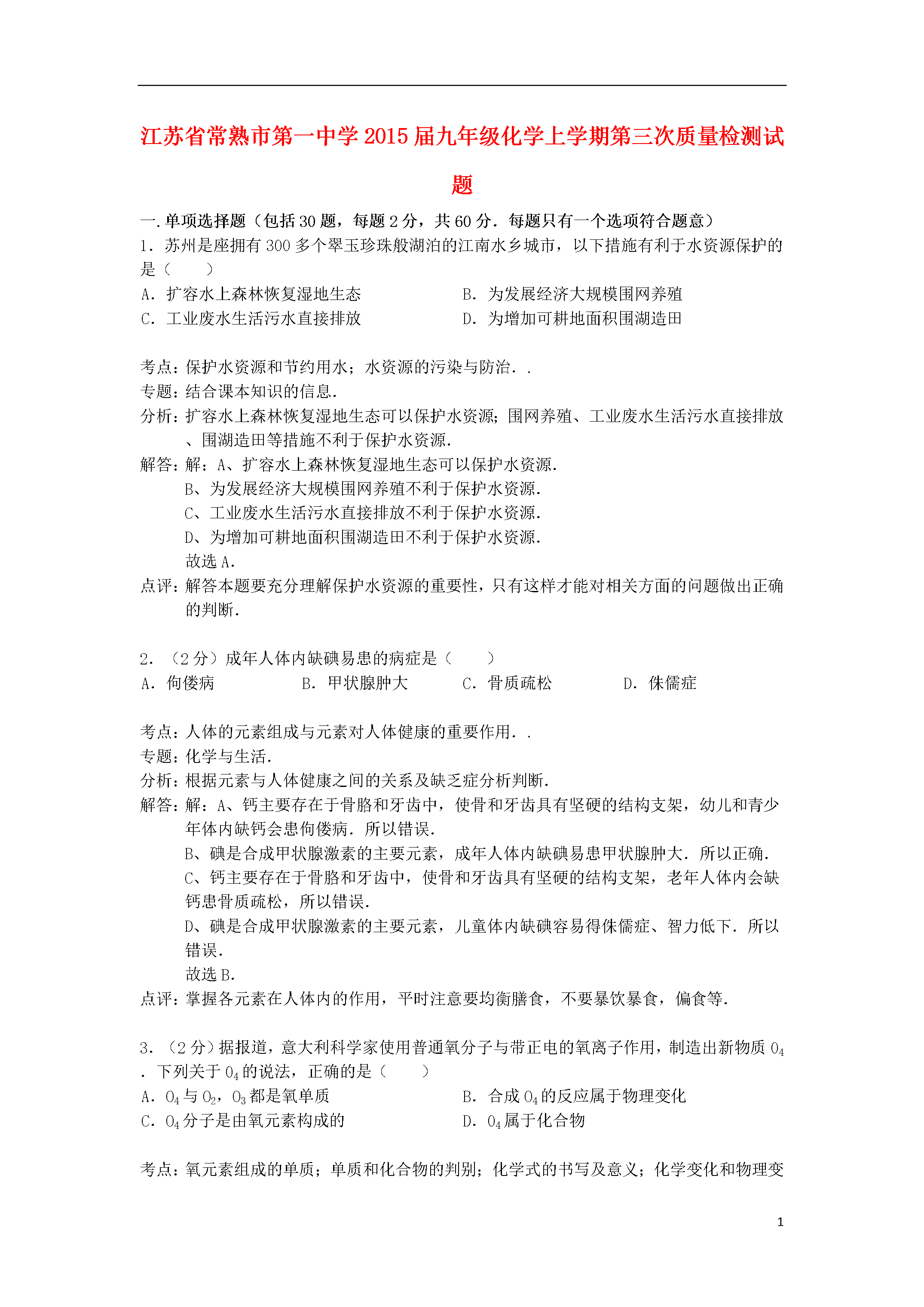 21江苏省常熟市第一中学2015届九年级化学上学期第三次质量检测试题一.单项选择题(包括30题,每题2分,共60分.每题只有一个选项符合题意)1.苏州是座拥有300多个翠玉珍珠般湖泊的江南水乡城市,以下措施有利于水资源保护的是()A.扩容水上森林恢复湿地生态B.为发展经济大规模围网养殖C.工业废水生活污水直接排放D.为增加可耕地面积围湖造田考点:保护水资源和节约用水;水资源的污染与防治..专题:结合课本知识的信息.分析:扩容水上森林恢复湿地生态可以保护水资源;围网养殖、工业废水生活污水直接排放、围湖造田等措施不利于保护水资源.解答:解:A、扩容水上森林恢复湿地生态可以保护水资源.B、为发展经济大规模围网养殖不利于保护水资源.C、工业废水生活污水直接排放不利于保护水资源.D、为增加可耕地面积围湖造田不利于保护水资源.故选A.点评:解答本题要充分理解保护水资源的重要性,只有这样才能对相关方面的问题做出正确的判断.2.(2分)成年人体内缺碘易患的病症是()A.佝偻病B.甲状腺肿大C.骨质疏松D.侏儒症考点:人体的元素组成与元素对人体健康的重要作用..专题:化学与生活.分析:根据元素与人体健康之间的关系及缺乏症分析判断.解答:解:A、钙主要存在于骨胳和牙齿中,使骨和牙齿具有坚硬的结构支架,幼儿和青少年体内缺钙会患佝偻病.所以错误.B、碘是合成甲状腺激素的主要元素,成年人体内缺碘易患甲状腺肿大.所以正确.C、钙主要存在于骨胳和牙齿中,使骨和牙齿具有坚硬的结构支架,老年人体内会缺钙患骨质疏松,所以错误.D、碘是合成甲状腺激素的主要元素,儿童体内缺碘容易得侏儒症、智力低下.所以错误.故选B.点评:掌握各元素在人体内的作用,平时注意要均衡膳食,不要暴饮暴食,偏食等.3.(2分)据报道,意大利科学家使用普通氧分子与带正电的氧离子作用,制造出新物质04.下列关于04的说法,正确的是()A.O4与O2,O3都是氧单质B.合成O4的反应属于物理变化C.O4分子是由氧元素构成的D.04属于化合物考点:氧元素组成的单质;单质和化合物的判别;化学式的书写及意义;化学变化和物理变化的判别..专题:课本知识同类信息.分析:根据物质的化学式O4,该物质只由O元素组成,属于单质,其分子由4个O原子构成,据此对说法进行判断.解答:解:A、根据物质的化学式O4、O2、O3,该物质们由O元素组成,属于单质,故A正确;B、合成O4的反应有新物质生成,属于化学变化,故B错误;C、O4分子由4个O原子构成的,故C错误;D、O4是由同种元素组成的单质,而不是化合物,故D错误.故选A.点评:根据物质的化学式的表示意义,对物质的组成、构成、类别进行判断,不能简单地理解成数学式的加减相等.4.(2分)下列有关合金的说法正确的是()A.合金中一定不含非金属B.生铁可以完全溶解在足量的稀盐酸中C.合金的硬度一般比各成分金属大D.各成分金属的熔点比合金的熔点低考点:合金与合金的性质..专题:金属与金属材料.分析:合金是指由一种金属与其它金属或非金属熔合而成的具有金属特性的物质.解答:解:A、合金中不一定不含非金属,例如生铁属于合金,其中含有碳.错误;B、生铁中的铁能和稀盐酸反应而溶解,其中的碳不能和稀盐酸反应,不能溶解.错误;C、合金的硬度一般比各成分金属大.正确;D、各成分金属的熔点一般比合金的熔点高.错误.故选C.点评:合金相对于组成它的金属来说,一般具有熔点较低、耐腐蚀性强、硬度大、机械强度大等方面的特点.5.(2分)关于仪器的用途,下列叙述中错误的是()A.试管可用于装配简易气体发生器B.烧杯可精确量取一定体积的液体C.溶解固体时,玻璃棒可用于搅拌D.细口瓶用于盛放液体药品考点:常用仪器的名称和选用..专题:常见仪器及化学实验基本操作.分析:化学实验室里有各种实验仪器提供给我们开展实验探究.我们要了解它们的名称及用途,才能在实验过程中准确地选用好仪器.本题可以从这方面进行分析解答.解答:解:A、试管是实验中最常用到的仪器之一,其主要用途是作为较少量试剂的反应容器.故正确;B、烧杯的主要用途是作为较大量试剂的反应容器及临时盛装液体,且烧杯只能粗略地获知所盛液体的体积.精确量取一定体积的液体得用量筒.故错误;C、玻璃棒的主要用途有两个,一是溶解时用来搅拌以加快溶解的速率,二是过滤时用来引流.故正确.D、用于盛装试剂的试剂瓶主要有广口瓶和细口瓶两种,一般情况下广口瓶用来盛装固体药品,而细口瓶用来盛装液体药品.故正确.故选B.点评:化学是一门以实验为甚而的自然科学,对常用实验仪器的深入了解能使我们在实验中准确地作出选择.6.(2分)下列说法中不正确的是()A.置换反应的反应物中一定有单质B.置换反应的生成物中一定有单质C.化合反应的反应物一定是单质D.分解反应的反应物一定不是单质考点:置换