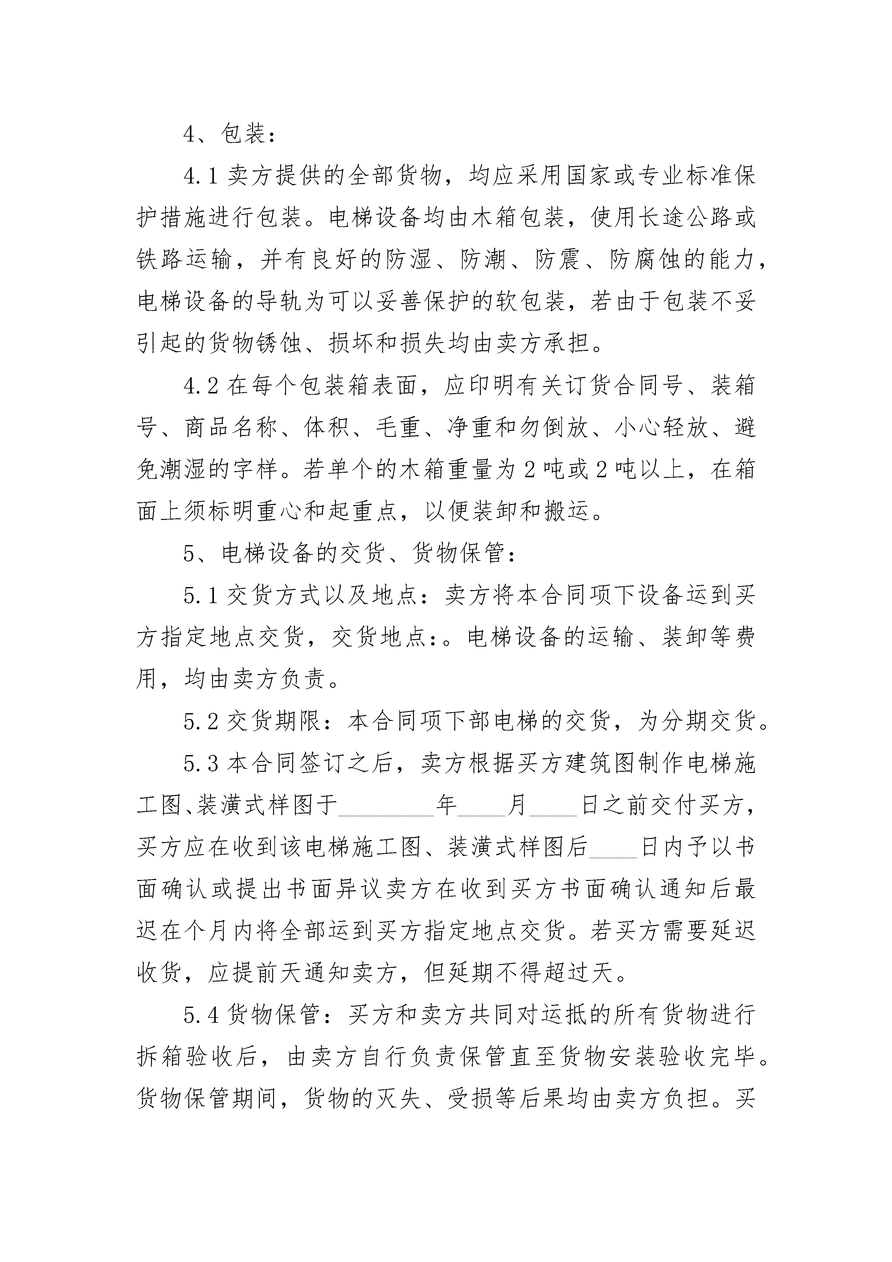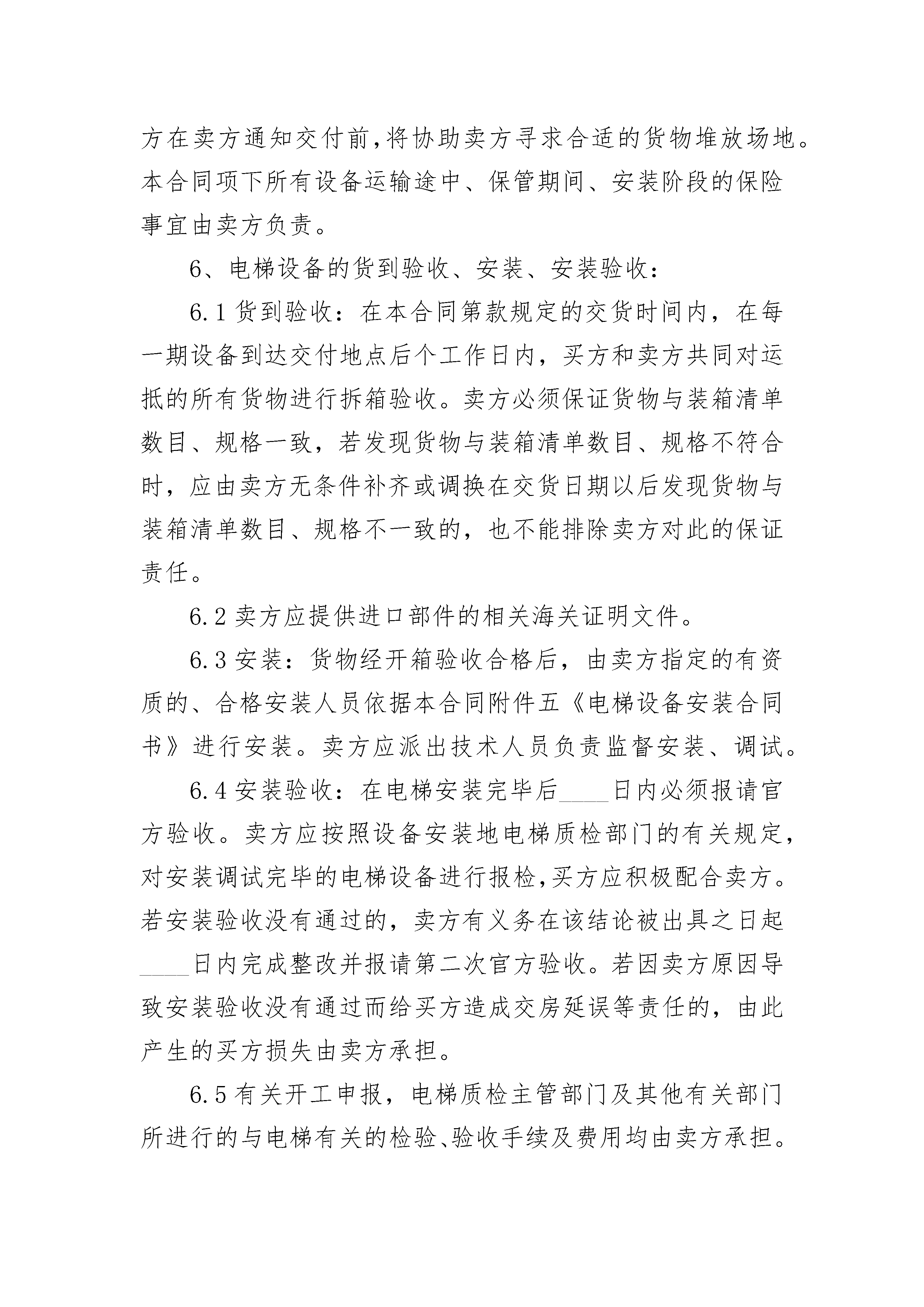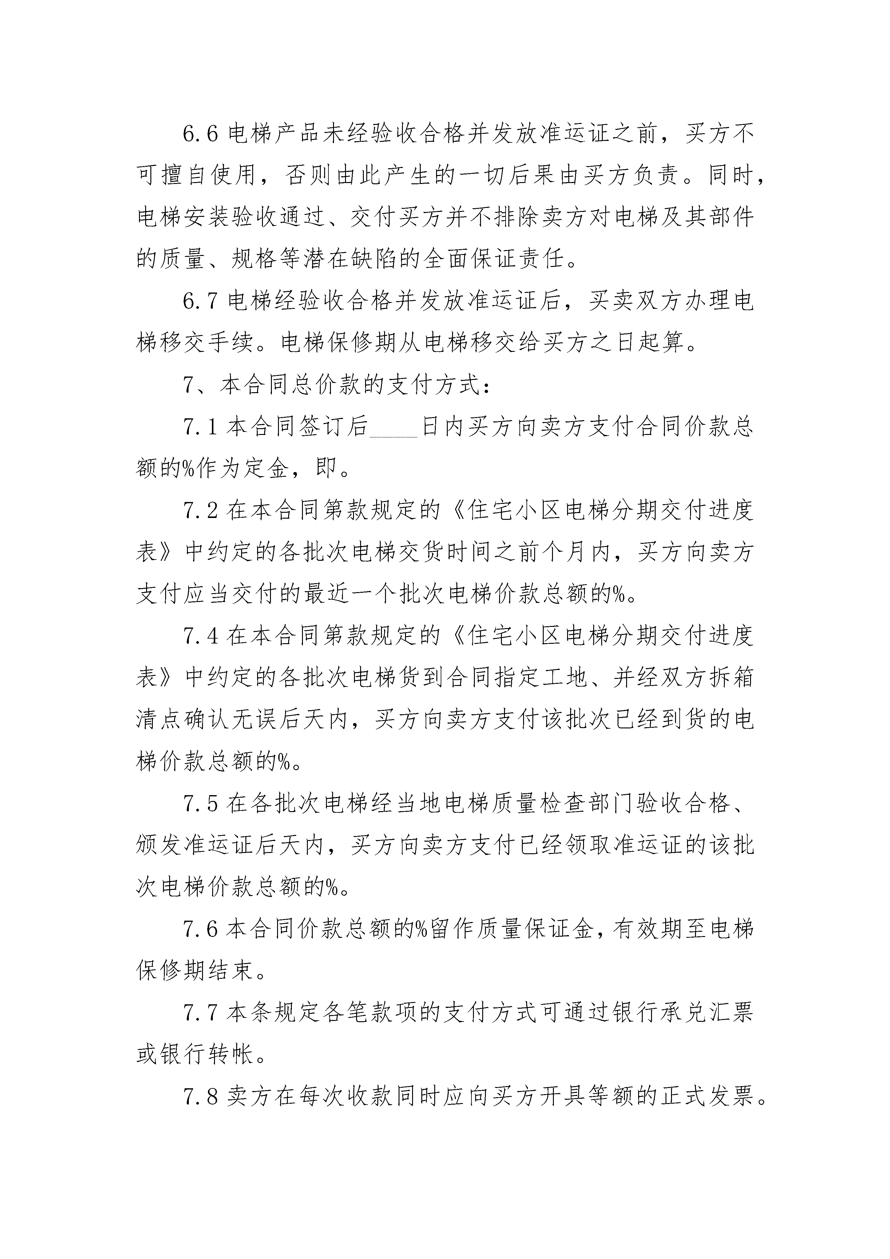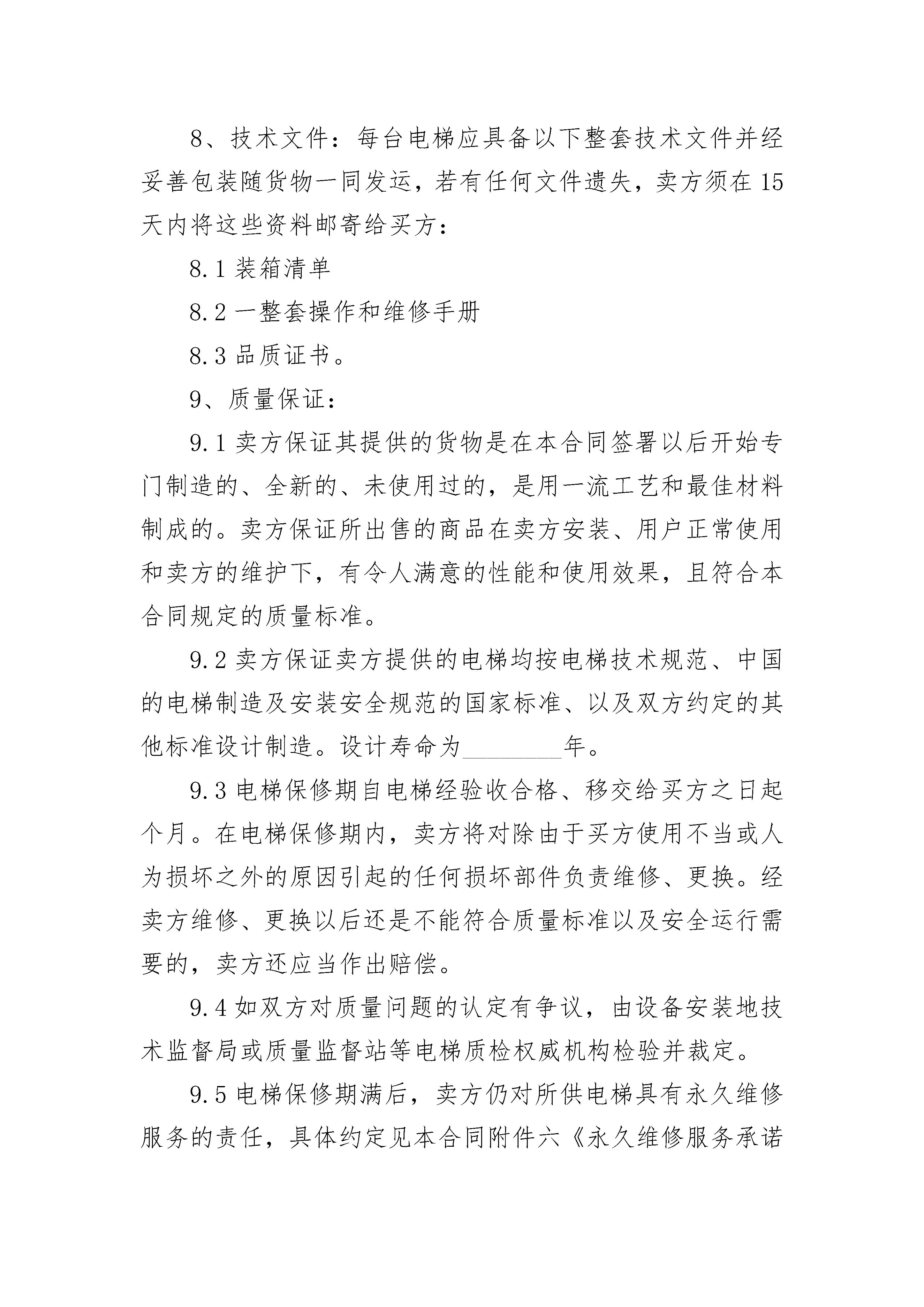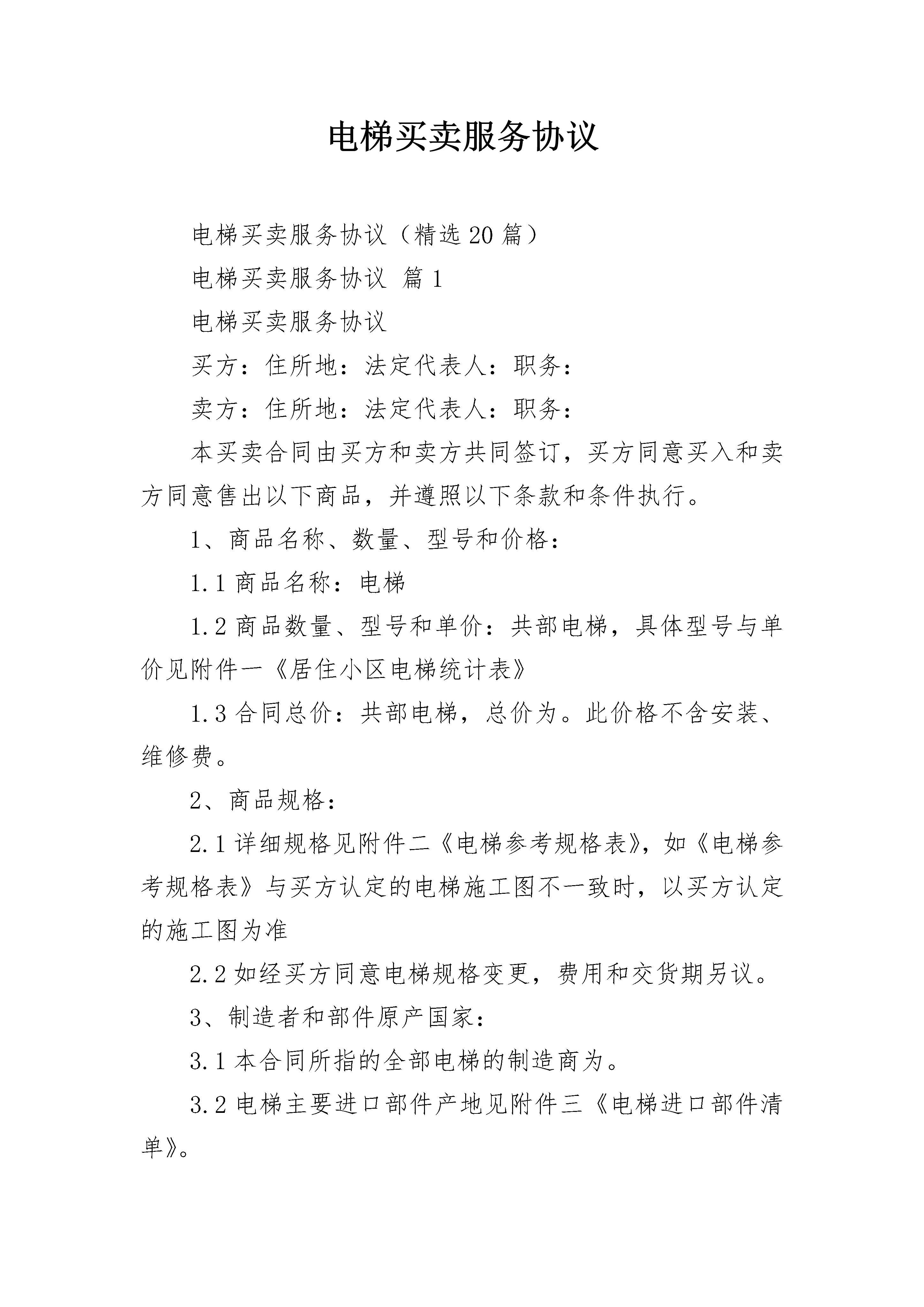 电梯买卖服务协议电梯买卖服务协议(精选20篇)电梯买卖服务协议篇1电梯买卖服务协议买方:住所地:法定代表人:职务:卖方:住所地:法定代表人:职务:本买卖合同由买方和卖方共同签订,买方同意买入和卖方同意售出以下商品,并遵照以下条款和条件执行。1、商品名称、数量、型号和价格:1.1商品名称:电梯1.2商品数量、型号和单价:共部电梯,具体型号与单价见附件一《居住小区电梯统计表》1.3合同总价:共部电梯,总价为。此价格不含安装、维修费。2、商品规格:2.1详细规格见附件二《电梯参考规格表》,如《电梯参考规格表》与买方认定的电梯施工图不一致时,以买方认定的施工图为准2.2如经买方同意电梯规格变更,费用和交货期另议。3、制造者和部件原产国家:3.1本合同所指的全部电梯的制造商为。3.2电梯主要进口部件产地见附件三《电梯进口部件清单》。4、包装:4.1卖方提供的全部货物,均应采用国家或专业标准保护措施进行包装。电梯设备均由木箱包装,使用长途公路或铁路运输,并有良好的防湿、防潮、防震、防腐蚀的能力,电梯设备的导轨为可以妥善保护的软包装,若由于包装不妥引起的货物锈蚀、损坏和损失均由卖方承担。4.2在每个包装箱表面,应印明有关订货合同号、装箱号、商品名称、体积、毛重、净重和勿倒放、小心轻放、避免潮湿的字样。若单个的木箱重量为2吨或2吨以上,在箱面上须标明重心和起重点,以便装卸和搬运。5、电梯设备的交货、货物保管:5.1交货方式以及地点:卖方将本合同项下设备运到买方指定地点交货,交货地点:。电梯设备的运输、装卸等费用,均由卖方负责。5.2交货期限:本合同项下部电梯的交货,为分期交货。5.3本合同签订之后,卖方根据买方建筑图制作电梯施工图、装潢式样图于________年____月____日之前交付买方,买方应在收到该电梯施工图、装潢式样图后____日内予以书面确认或提出书面异议卖方在收到买方书面确认通知后最迟在个月内将全部运到买方指定地点交货。若买方需要延迟收货,应提前天通知卖方,但延期不得超过天。5.4货物保管:买方和卖方共同对运抵的所有货物进行拆箱验收后,由卖方自行负责保管直至货物安装验收完毕。货物保管期间,货物的灭失、受损等后果均由卖方负担。买方在卖方通知交付前,将协助卖方寻求合适的货物堆放场地。本合同项下所有设备运输途中、保管期间、安装阶段的保险事宜由卖方负责。6、电梯设备的货到验收、安装、安装验收:6.1货到验收:在本合同第款规定的交货时间内,在每一期设备到达交付地点后个工作日内,买方和卖方共同对运抵的所有货物进行拆箱验收。卖方必须保证货物与装箱清单数目、规格一致,若发现货物与装箱清单数目、规格不符合时,应由卖方无条件补齐或调换在交货日期以后发现货物与装箱清单数目、规格不一致的,也不能排除卖方对此的保证责任。6.2卖方应提供进口部件的相关海关证明文件。6.3安装:货物经开箱验收合格后,由卖方指定的有资质的、合格安装人员依据本合同附件五《电梯设备安装合同书》进行安装。卖方应派出技术人员负责监督安装、调试。6.4安装验收:在电梯安装完毕后____日内必须报请官方验收。卖方应按照设备安装地电梯质检部门的有关规定,对安装调试完毕的电梯设备进行报检,买方应积极配合卖方。若安装验收没有通过的,卖方有义务在该结论被出具之日起____日内完成整改并报请第二次官方验收。若因卖方原因导致安装验收没有通过而给买方造成交房延误等责任的,由此产生的买方损失由卖方承担。6.5有关开工申报,电梯质检主管部门及其他有关部门所进行的与电梯有关的检验、验收手续及费用均由卖方承担。6.6电梯产品未经验收合格并发放准运证之前,买方不可擅自使用,否则由此产生的一切后果由买方负责。同时,电梯安装验收通过、交付买方并不排除卖方对电梯及其部件的质量、规格等潜在缺陷的全面保证责任。6.7电梯经验收合格并发放准运证后,买卖双方办理电梯移交手续。电梯保修期从电梯移交给买方之日起算。7、本合同总价款的支付方式:7.1本合同签订后____日内买方向卖方支付合同价款总额的%作为定金,即。7.2在本合同第款规定的《住宅小区电梯分期交付进度表》中约定的各批次电梯交货时间之前个月内,买方向卖方支付应当交付的最近一个批次电梯价款总额的%。7.4在本合同第款规定的《住宅小区电梯分期交付进度表》中约定的各批次电梯货到合同指定工地、并经双方拆箱清点确认无误后天内,买方向卖方支付该批次已经到货的电梯价款总额的%。7.5在各批次电梯经当地电梯质量检查部门验收合格、颁发准运证后天内,买方向卖方支付已经领取准运证的该批次电梯价款总额的%。7.6本合同价款总额的%留作质量保证金,有效期至电梯保修期结束。7.7本条规定各笔款项的支付方式可通过银行承兑汇票或银行转帐。7.8卖方在每次收款同时应向买方开具等额的正式发票。8、