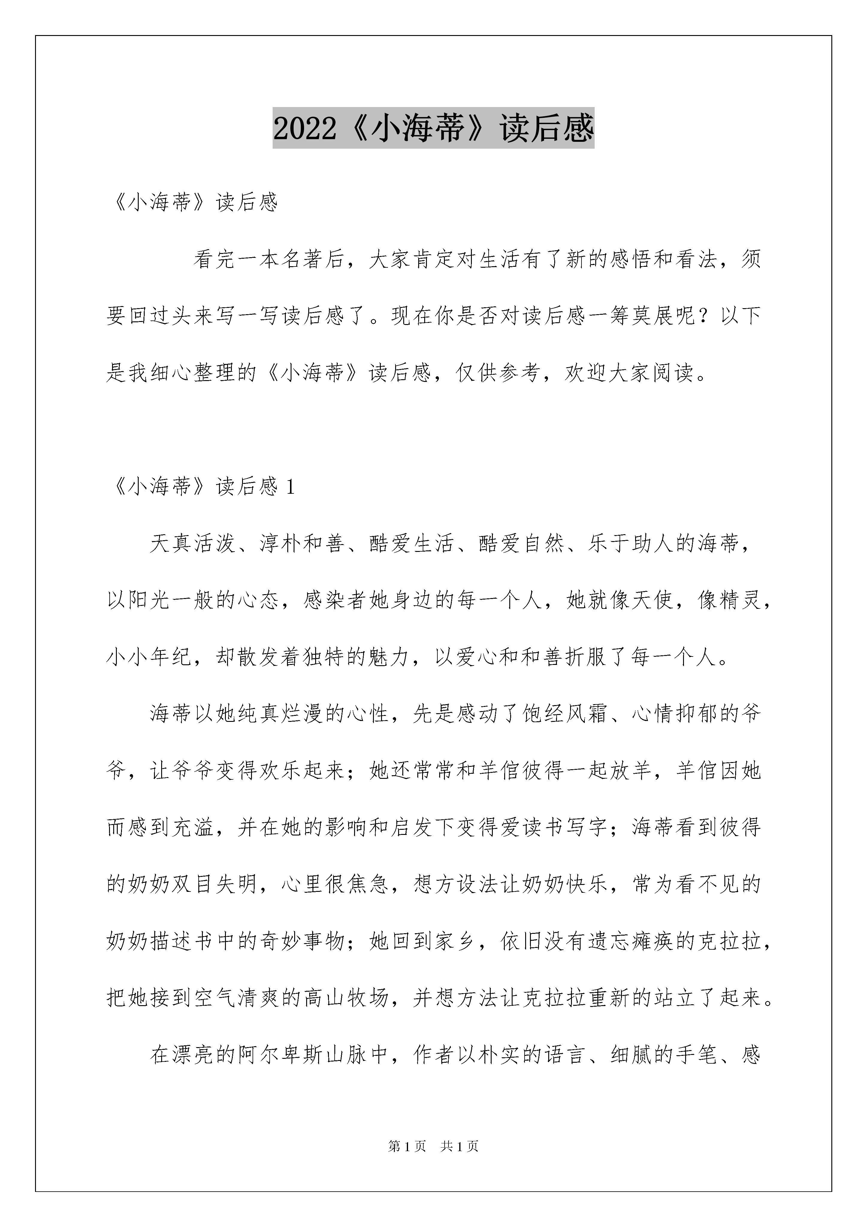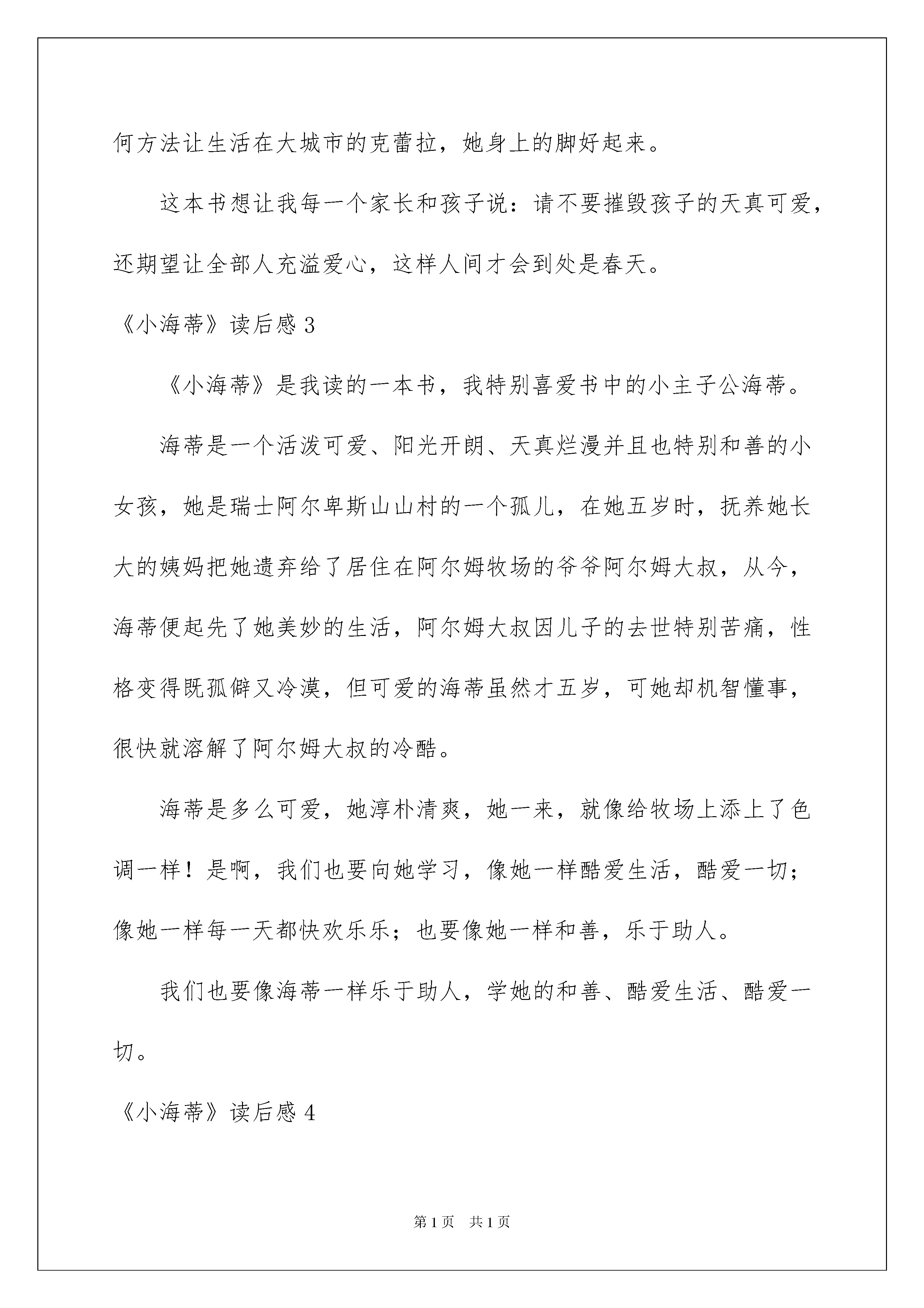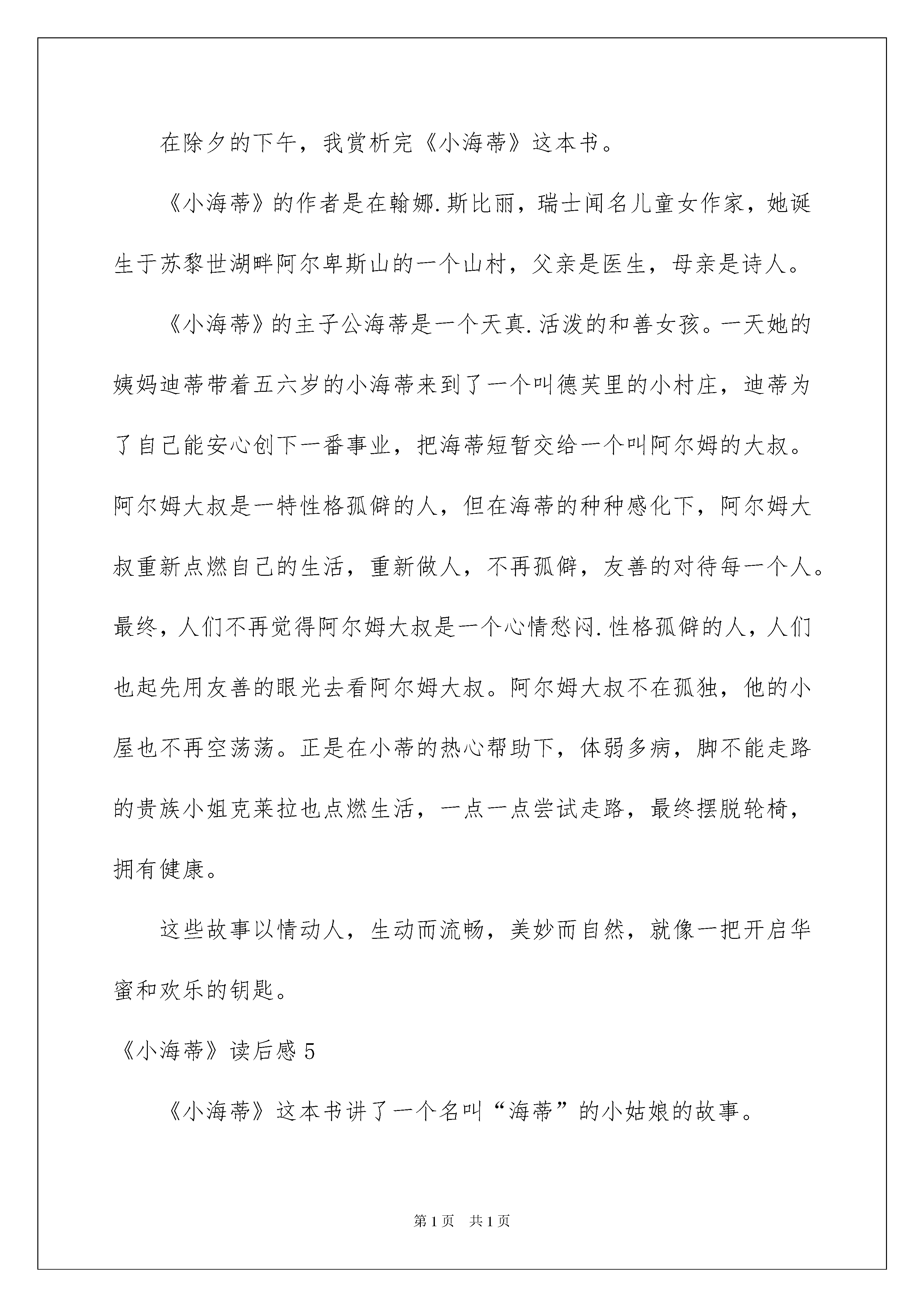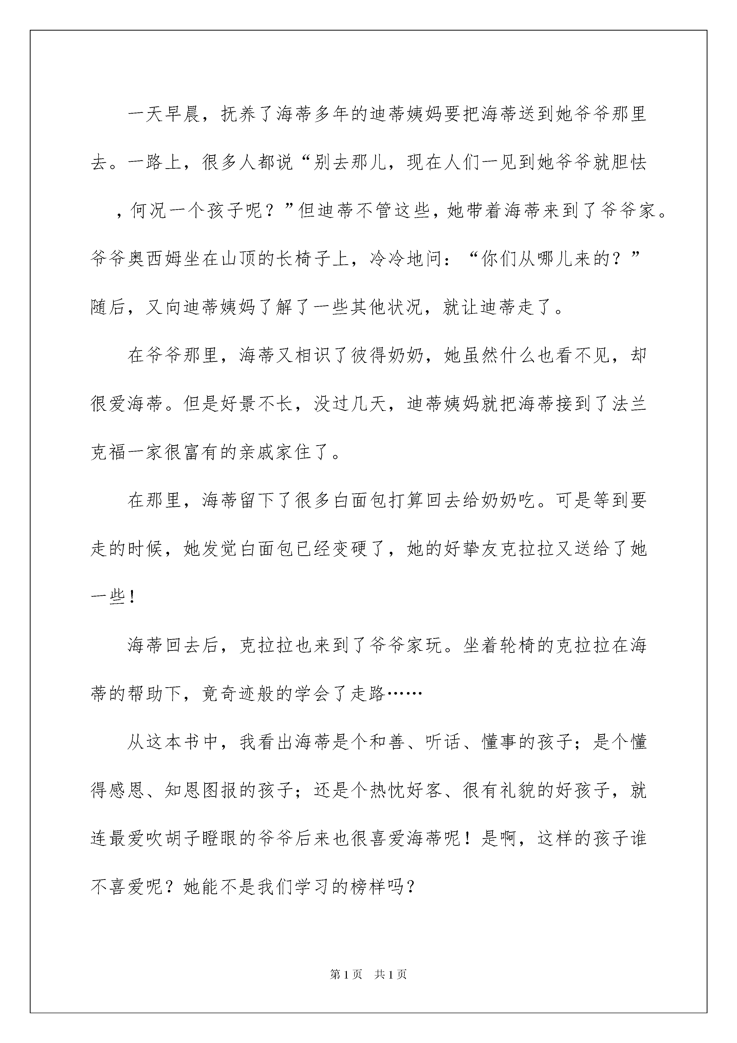 2022《小海蒂》读后感《小海蒂》读后感看完一本名著后,大家肯定对生活有了新的感悟和看法,须要回过头来写一写读后感了。现在你是否对读后感一筹莫展呢?以下是我细心整理的《小海蒂》读后感,仅供参考,欢迎大家阅读。《小海蒂》读后感1天真活泼、淳朴和善、酷爱生活、酷爱自然、乐于助人的海蒂,以阳光一般的心态,感染者她身边的每一个人,她就像天使,像精灵,小小年纪,却散发着独特的魅力,以爱心和和善折服了每一个人。海蒂以她纯真烂漫的心性,先是感动了饱经风霜、心情抑郁的爷爷,让爷爷变得欢乐起来;她还常常和羊倌彼得一起放羊,羊倌因她而感到充溢,并在她的影响和启发下变得爱读书写字;海蒂看到彼得的奶奶双目失明,心里很焦急,想方设法让奶奶快乐,常为看不见的奶奶描述书中的奇妙事物;她回到家乡,依旧没有遗忘瘫痪的克拉拉,把她接到空气清爽的高山牧场,并想方法让克拉拉重新的站立了起来。在漂亮的阿尔卑斯山脉中,作者以朴实的语言、细腻的手笔、感人的场景为我们带来一部充溢阳光味道的《海蒂》,海蒂鲜活的艺术形象根植在我们心中,感动着多数的人们。在海蒂的影响下,我们正可以反思自己的自私和傲岸,重新相识爱的真谛。其实华蜜和欢乐很简洁,这就是,把阳光和爱的种子洒满人间。看到我们在乎的人华蜜就是我们最大的欢乐《小海蒂》读后感2最近我看了一本书,这本书的名字叫做《小海蒂》。这本书讲解并描述了这样一个纯净的故事:一个名叫小海蒂的小女孩,在5岁的时候,被她的姨妈送到爷爷家去。小海蒂很快就爱上了那里的完备风光和纯朴的人们。她用她的爱心帮忙性格孤僻的爷爷和村里人复原了来往,她还教会了放羊娃彼得认字,更让人惊异的是,小海蒂和她的爷爷让残疾女孩各蕾拉奇迹般地复原了独立行走和潜力。我觉得这本书中构造的主子公小海蒂让我久久不能忘去。我从她的那充溢而又简朴和欢乐的生活中,看出隐藏那颗童年的`心中的纯净的天真。不愧是8岁的小孩,又有爱心又那么的天真的心。假如他没有爱心,那么就没法和怪癖的爷爷沟通;假如她没有爱心,那么就没有方法让爷爷和村里的人进行沟通;假如小海蒂没有爱心,那么也没有任何方法让生活在大城市的克蕾拉,她身上的脚好起来。这本书想让我每一个家长和孩子说:请不要摧毁孩子的天真可爱,还期望让全部人充溢爱心,这样人间才会到处是春天。《小海蒂》读后感3《小海蒂》是我读的一本书,我特别喜爱书中的小主子公海蒂。海蒂是一个活泼可爱、阳光开朗、天真烂漫并且也特别和善的小女孩,她是瑞士阿尔卑斯山山村的一个孤儿,在她五岁时,抚养她长大的姨妈把她遗弃给了居住在阿尔姆牧场的爷爷阿尔姆大叔,从今,海蒂便起先了她美妙的生活,阿尔姆大叔因儿子的去世特别苦痛,性格变得既孤僻又冷漠,但可爱的海蒂虽然才五岁,可她却机智懂事,很快就溶解了阿尔姆大叔的冷酷。海蒂是多么可爱,她淳朴清爽,她一来,就像给牧场上添上了色调一样!是啊,我们也要向她学习,像她一样酷爱生活,酷爱一切;像她一样每一天都快欢乐乐;也要像她一样和善,乐于助人。我们也要像海蒂一样乐于助人,学她的和善、酷爱生活、酷爱一切。《小海蒂》读后感4在除夕的下午,我赏析完《小海蒂》这本书。《小海蒂》的作者是在翰娜.斯比丽,瑞士闻名儿童女作家,她诞生于苏黎世湖畔阿尔卑斯山的一个山村,父亲是医生,母亲是诗人。《小海蒂》的主子公海蒂是一个天真.活泼的和善女孩。一天她的姨妈迪蒂带着五六岁的小海蒂来到了一个叫德芙里的小村庄,迪蒂为了自己能安心创下一番事业,把海蒂短暂交给一个叫阿尔姆的大叔。阿尔姆大叔是一特性格孤僻的人,但在海蒂的种种感化下,阿尔姆大叔重新点燃自己的生活,重新做人,不再孤僻,友善的对待每一个人。最终,人们不再觉得阿尔姆大叔是一个心情愁闷.性格孤僻的人,人们也起先用友善的眼光去看阿尔姆大叔。阿尔姆大叔不在孤独,他的小屋也不再空荡荡。正是在小蒂的热心帮助下,体弱多病,脚不能走路的贵族小姐克莱拉也点燃生活,一点一点尝试走路,最终摆脱轮椅,拥有健康。这些故事以情动人,生动而流畅,美妙而自然,就像一把开启华蜜和欢乐的钥匙。《小海蒂》读后感5《小海蒂》这本书讲了一个名叫“海蒂”的小姑娘的故事。一天早晨,抚养了海蒂多年的迪蒂姨妈要把海蒂送到她爷爷那里去。一路上,很多人都说“别去那儿,现在人们一见到她爷爷就胆怯,何况一个孩子呢?”但迪蒂不管这些,她带着海蒂来到了爷爷家。爷爷奥西姆坐在山顶的长椅子上,冷冷地问:“你们从哪儿来的?”随后,又向迪蒂姨妈了解了一些其他状况,就让迪蒂走了。在爷爷那里,海蒂又相识了彼得奶奶,她虽然什么也看不见,却很爱海蒂。但是好景不长,没过几天,迪蒂姨妈就把海蒂接到了法兰克福一家很富有的亲戚家住了。在那里,海蒂留
