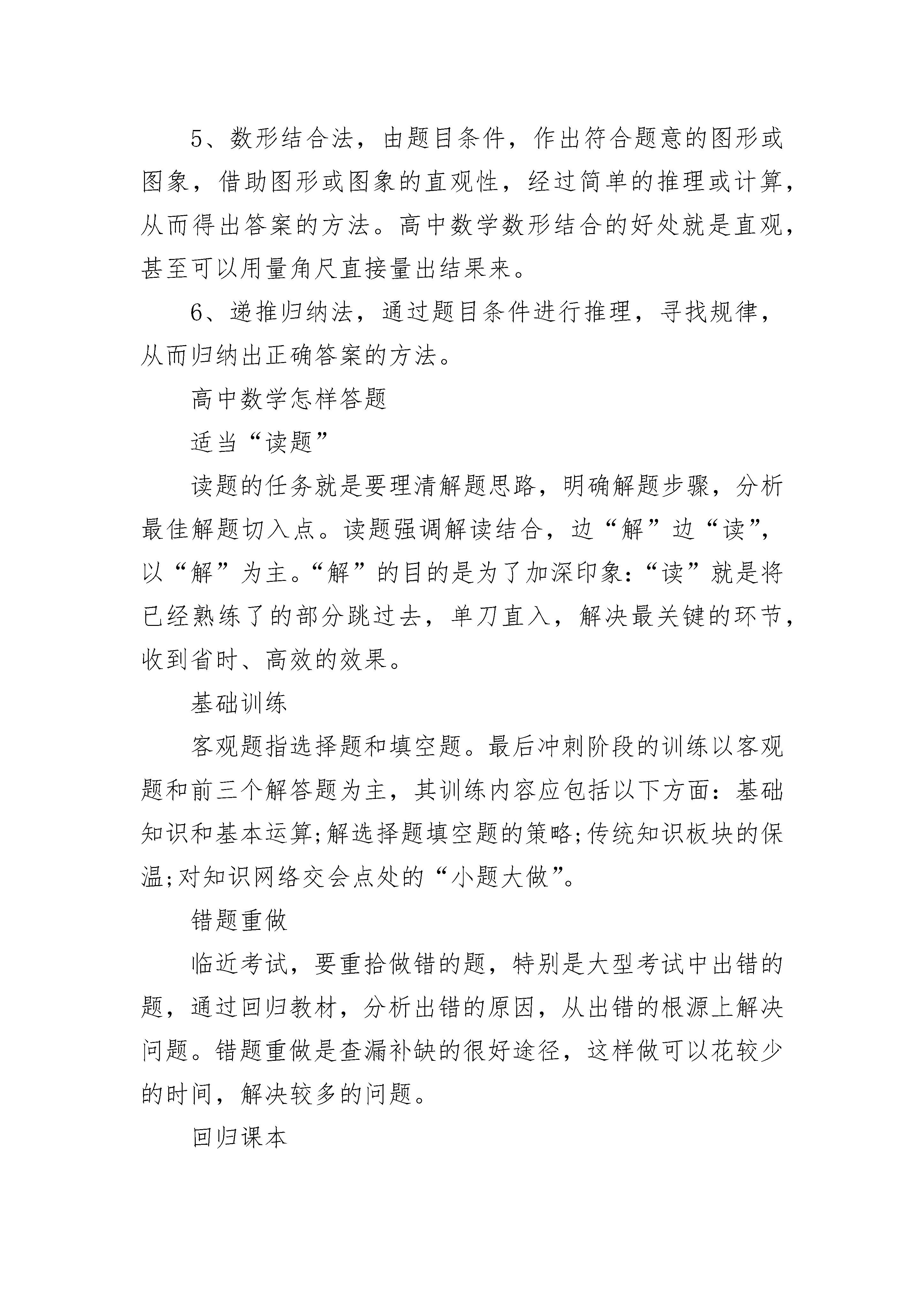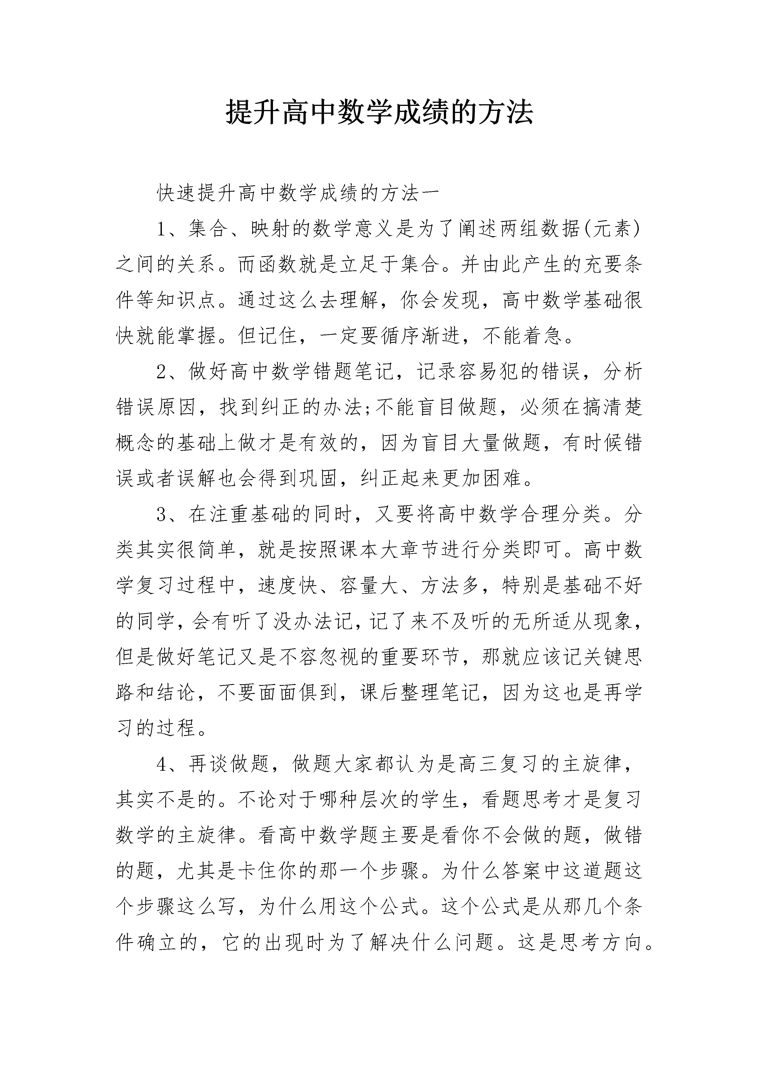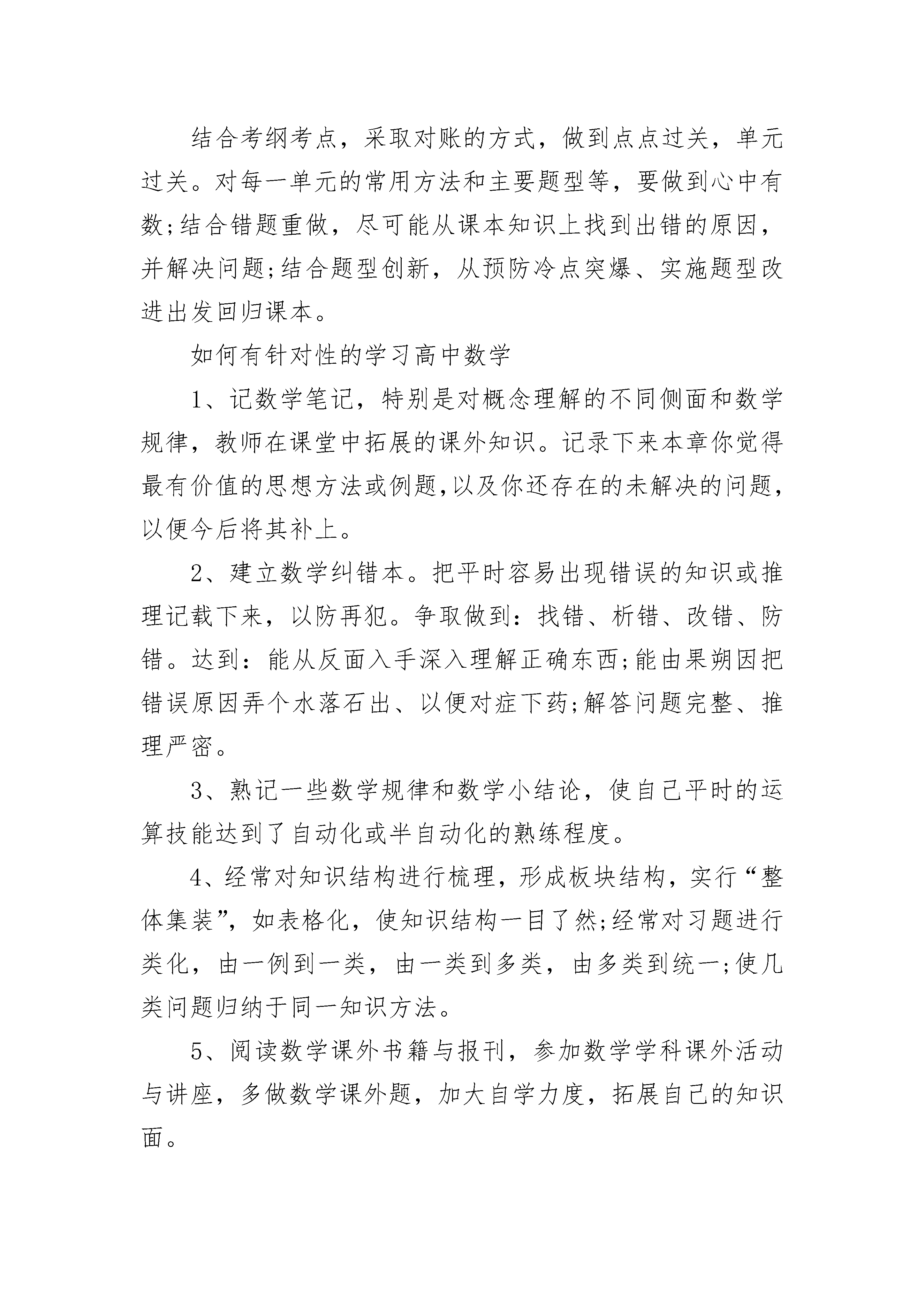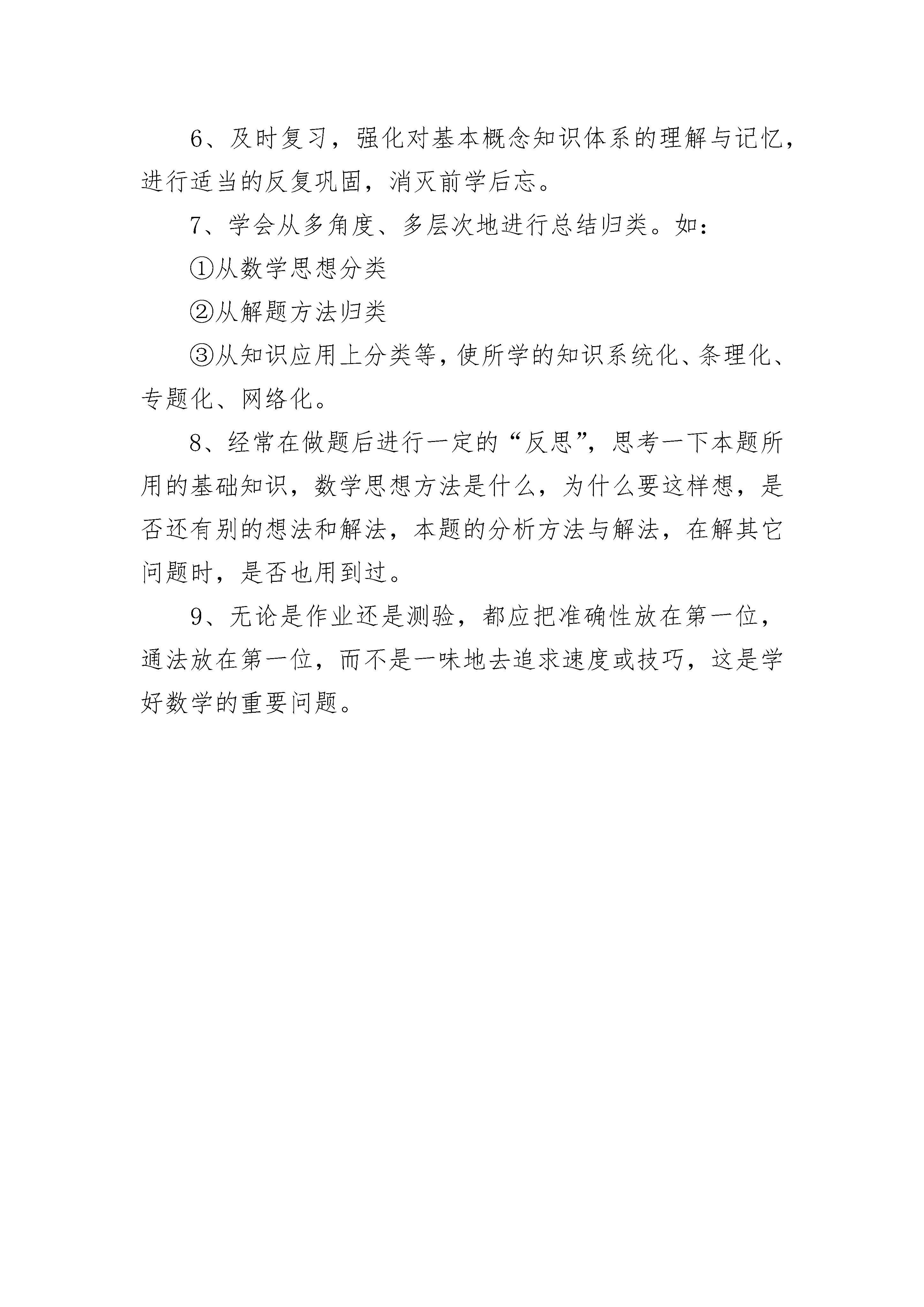 提升高中数学成绩的方法快速提升高中数学成绩的方法一1、集合、映射的数学意义是为了阐述两组数据(元素)之间的关系。而函数就是立足于集合。并由此产生的充要条件等知识点。通过这么去理解,你会发现,高中数学基础很快就能掌握。但记住,一定要循序渐进,不能着急。2、做好高中数学错题笔记,记录容易犯的错误,分析错误原因,找到纠正的办法;不能盲目做题,必须在搞清楚概念的基础上做才是有效的,因为盲目大量做题,有时候错误或者误解也会得到巩固,纠正起来更加困难。3、在注重基础的同时,又要将高中数学合理分类。分类其实很简单,就是按照课本大章节进行分类即可。高中数学复习过程中,速度快、容量大、方法多,特别是基础不好的同学,会有听了没办法记,记了来不及听的无所适从现象,但是做好笔记又是不容忽视的重要环节,那就应该记关键思路和结论,不要面面俱到,课后整理笔记,因为这也是再学习的过程。4、再谈做题,做题大家都认为是高三复习的主旋律,其实不是的。不论对于哪种层次的学生,看题思考才是复习数学的主旋律。看高中数学题主要是看你不会做的题,做错的题,尤其是卡住你的那一个步骤。为什么答案中这道题这个步骤这么写,为什么用这个公式。这个公式是从那几个条件确立的,它的出现时为了解决什么问题。这是思考方向。5、数形结合法,由题目条件,作出符合题意的图形或图象,借助图形或图象的直观性,经过简单的推理或计算,从而得出答案的方法。高中数学数形结合的好处就是直观,甚至可以用量角尺直接量出结果来。6、递推归纳法,通过题目条件进行推理,寻找规律,从而归纳出正确答案的方法。高中数学怎样答题适当“读题”读题的任务就是要理清解题思路,明确解题步骤,分析最佳解题切入点。读题强调解读结合,边“解”边“读”,以“解”为主。“解”的目的是为了加深印象:“读”就是将已经熟练了的部分跳过去,单刀直入,解决最关键的环节,收到省时、高效的效果。基础训练客观题指选择题和填空题。最后冲刺阶段的训练以客观题和前三个解答题为主,其训练内容应包括以下方面:基础知识和基本运算;解选择题填空题的策略;传统知识板块的保温;对知识网络交会点处的“小题大做”。错题重做临近考试,要重拾做错的题,特别是大型考试中出错的题,通过回归教材,分析出错的原因,从出错的根源上解决问题。错题重做是查漏补缺的很好途径,这样做可以花较少的时间,解决较多的问题。回归课本结合考纲考点,采取对账的方式,做到点点过关,单元过关。对每一单元的常用方法和主要题型等,要做到心中有数;结合错题重做,尽可能从课本知识上找到出错的原因,并解决问题;结合题型创新,从预防冷点突爆、实施题型改进出发回归课本。如何有针对性的学习高中数学1、记数学笔记,特别是对概念理解的不同侧面和数学规律,教师在课堂中拓展的课外知识。记录下来本章你觉得最有价值的思想方法或例题,以及你还存在的未解决的问题,以便今后将其补上。2、建立数学纠错本。把平时容易出现错误的知识或推理记载下来,以防再犯。争取做到:找错、析错、改错、防错。达到:能从反面入手深入理解正确东西;能由果朔因把错误原因弄个水落石出、以便对症下药;解答问题完整、推理严密。3、熟记一些数学规律和数学小结论,使自己平时的运算技能达到了自动化或半自动化的熟练程度。4、经常对知识结构进行梳理,形成板块结构,实行“整体集装”,如表格化,使知识结构一目了然;经常对习题进行类化,由一例到一类,由一类到多类,由多类到统一;使几类问题归纳于同一知识方法。5、阅读数学课外书籍与报刊,参加数学学科课外活动与讲座,多做数学课外题,加大自学力度,拓展自己的知识面。6、及时复习,强化对基本概念知识体系的理解与记忆,进行适当的反复巩固,消灭前学后忘。7、学会从多角度、多层次地进行总结归类。如:①从数学思想分类②从解题方法归类③从知识应用上分类等,使所学的知识系统化、条理化、专题化、网络化。8、经常在做题后进行一定的“反思”,思考一下本题所用的基础知识,数学思想方法是什么,为什么要这样想,是否还有别的想法和解法,本题的分析方法与解法,在解其它问题时,是否也用到过。9、无论是作业还是测验,都应把准确性放在第一位,通法放在第一位,而不是一味地去追求速度或技巧,这是学好数学的重要问题。