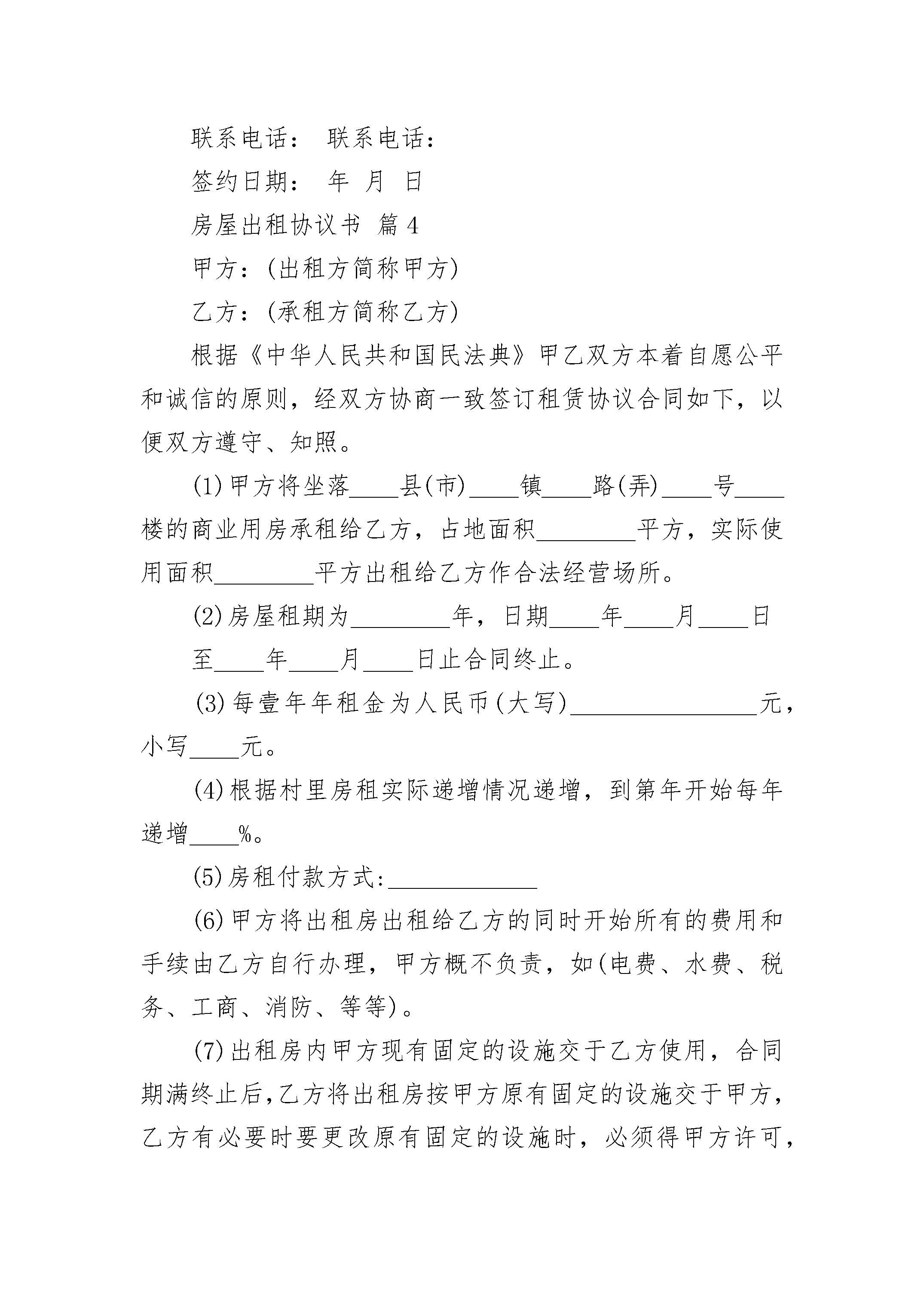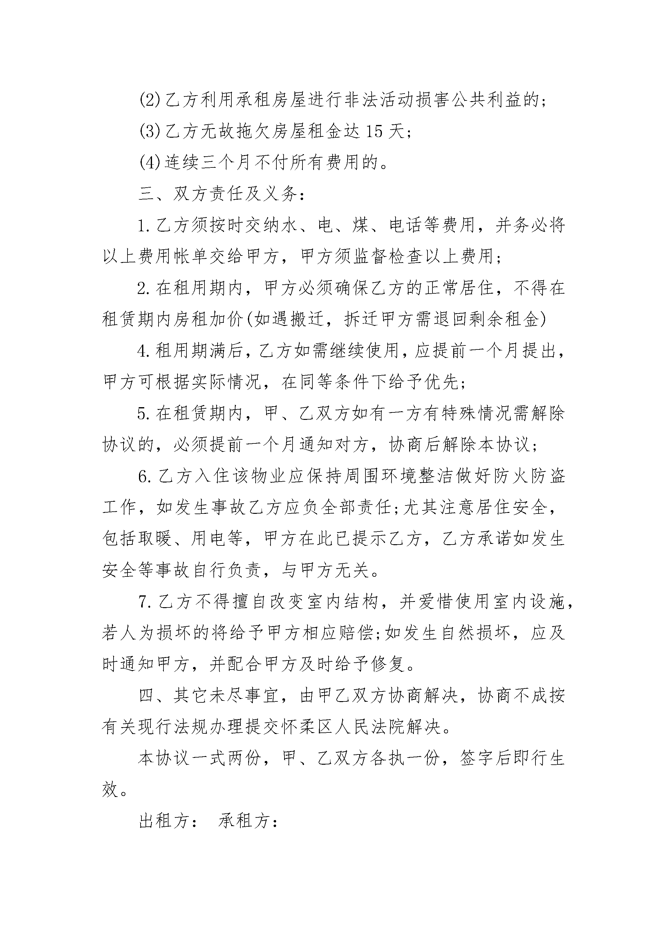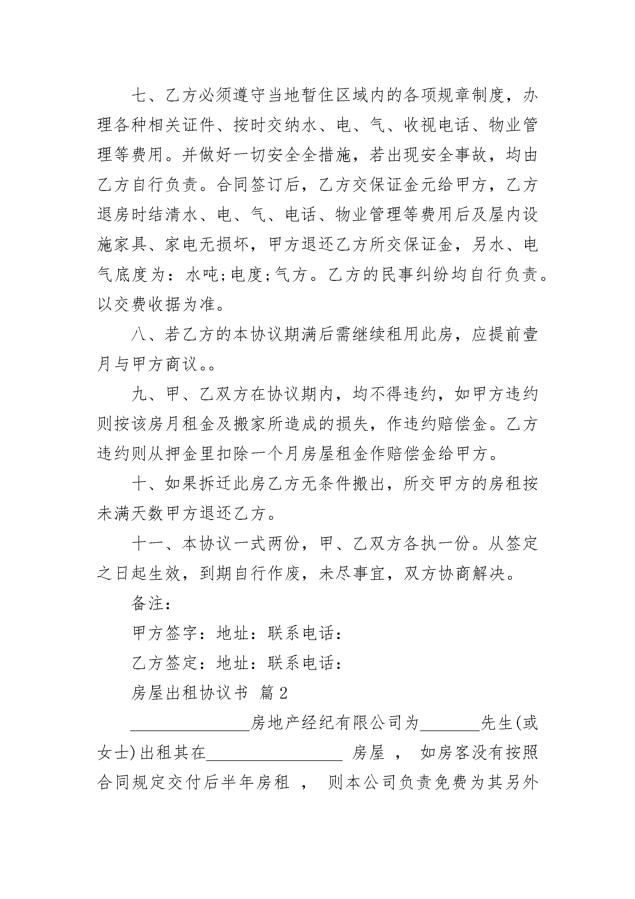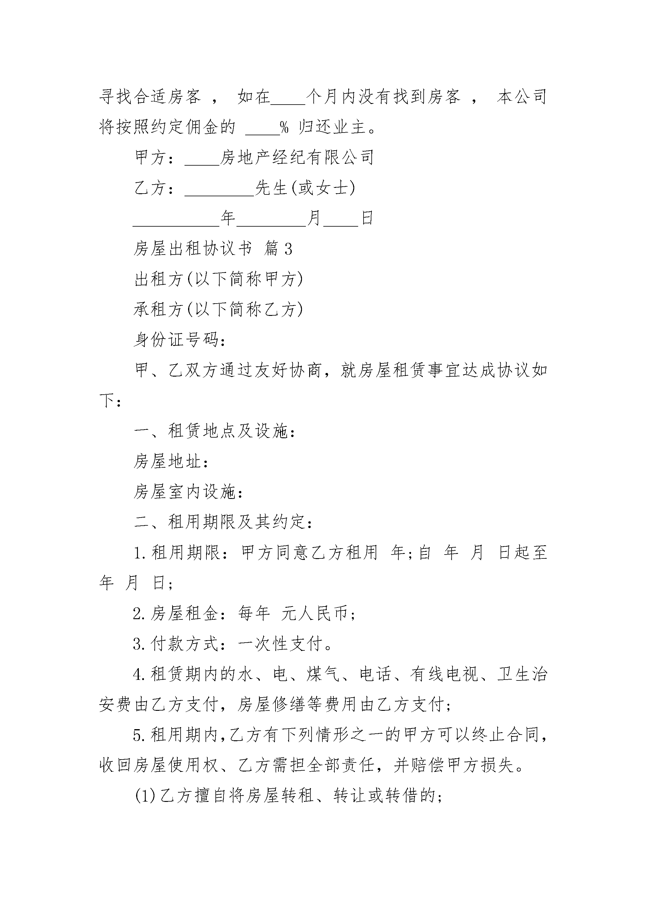 房屋出租协议书房屋出租协议书(通用25篇)房屋出租协议书篇1出租方姓名:签定日期:年月日身份证号:[简称甲方]承租方姓名:身份证号:[简称乙方]甲方现有㎡面积的房屋,套型为地址:在签订本协议时,甲方向乙方出示该房及本人的有关合法手续。经甲、乙双方共同协商达成以下协议:一、租房从年月日起至年月日止,有效期为年二、该房出租的使用性质为用房,月租金为元,缴租方式为支付一次,计人民币元以后就在付款期末前天支付。三、乙方接到住房后,应及时更换门锁,否则发生意外与甲方无关。四、乙方不得擅自改变其房屋的使用性质,更不能擅自改变房屋的结构,必须爱护房内设施,如有损坏应及时维修,否则照价赔偿。五、在本协议期内,甲方不得干涉乙方的合法居住权,不得收回房屋或转租他人,更不得提高房租或终止协议。六、乙方必须按照交纳房租,否则甲方有权采取措施收回房屋,由此造成的损失由乙方承担。七、乙方必须遵守当地暂住区域内的各项规章制度,办理各种相关证件、按时交纳水、电、气、收视电话、物业管理等费用。并做好一切安全全措施,若出现安全事故,均由乙方自行负责。合同签订后,乙方交保证金元给甲方,乙方退房时结清水、电、气、电话、物业管理等费用后及屋内设施家具、家电无损坏,甲方退还乙方所交保证金,另水、电气底度为:水吨;电度;气方。乙方的民事纠纷均自行负责。以交费收据为准。八、若乙方的本协议期满后需继续租用此房,应提前壹月与甲方商议。。九、甲、乙双方在协议期内,均不得违约,如甲方违约则按该房月租金及搬家所造成的损失,作违约赔偿金。乙方违约则从押金里扣除一个月房屋租金作赔偿金给甲方。十、如果拆迁此房乙方无条件搬出,所交甲方的房租按未满天数甲方退还乙方。十一、本协议一式两份,甲、乙双方各执一份。从签定之日起生效,到期自行作废,未尽事宜,双方协商解决。备注:甲方签字:地址:联系电话:乙方签定:地址:联系电话:房屋出租协议书篇2______________房地产经纪有限公司为_______先生(或女士)出租其在________________房屋,如房客没有按照合同规定交付后半年房租,则本公司负责免费为其另外寻找合适房客,如在____个月内没有找到房客,本公司将按照约定佣金的____%归还业主。甲方:____房地产经纪有限公司乙方:________先生(或女士)__________年________月____日房屋出租协议书篇3出租方(以下简称甲方)承租方(以下简称乙方)身份证号码:甲、乙双方通过友好协商,就房屋租赁事宜达成协议如下:一、租赁地点及设施:房屋地址:房屋室内设施:二、租用期限及其约定:1.租用期限:甲方同意乙方租用年;自年月日起至年月日;2.房屋租金:每年元人民币;3.付款方式:一次性支付。4.租赁期内的水、电、煤气、电话、有线电视、卫生治安费由乙方支付,房屋修缮等费用由乙方支付;5.租用期内,乙方有下列情形之一的甲方可以终止合同,收回房屋使用权、乙方需担全部责任,并赔偿甲方损失。(1)乙方擅自将房屋转租、转让或转借的;(2)乙方利用承租房屋进行非法活动损害公共利益的;(3)乙方无故拖欠房屋租金达15天;(4)连续三个月不付所有费用的。三、双方责任及义务:1.乙方须按时交纳水、电、煤、电话等费用,并务必将以上费用帐单交给甲方,甲方须监督检查以上费用;2.在租用期内,甲方必须确保乙方的正常居住,不得在租赁期内房租加价(如遇搬迁,拆迁甲方需退回剩余租金)4.租用期满后,乙方如需继续使用,应提前一个月提出,甲方可根据实际情况,在同等条件下给予优先;5.在租赁期内,甲、乙双方如有一方有特殊情况需解除协议的,必须提前一个月通知对方,协商后解除本协议;6.乙方入住该物业应保持周围环境整洁做好防火防盗工作,如发生事故乙方应负全部责任;尤其注意居住安全,包括取暖、用电等,甲方在此已提示乙方,乙方承诺如发生安全等事故自行负责,与甲方无关。7.乙方不得擅自改变室内结构,并爱惜使用室内设施,若人为损坏的将给予甲方相应赔偿;如发生自然损坏,应及时通知甲方,并配合甲方及时给予修复。四、其它未尽事宜,由甲乙双方协商解决,协商不成按有关现行法规办理提交怀柔区人民法院解决。本协议一式两份,甲、乙双方各执一份,签字后即行生效。出租方:承租方:联系电话:联系电话:签约日期:年月日房屋出租协议书篇4甲方:(出租方简称甲方)乙方:(承租方简称乙方)根据《中华人民共和国民法典》甲乙双方本着自愿公平和诚信的原则,经双方协商一致签订租赁协议合同如下,以便双方遵守、知照。(1)甲方将坐落____县(市)____镇____路(弄)____号____楼的商业用房承租给乙方,占地面积________平方,实际使用面积________平方出租给乙方作合法经营场所。(2)房屋租期为________年,日期____年____月__