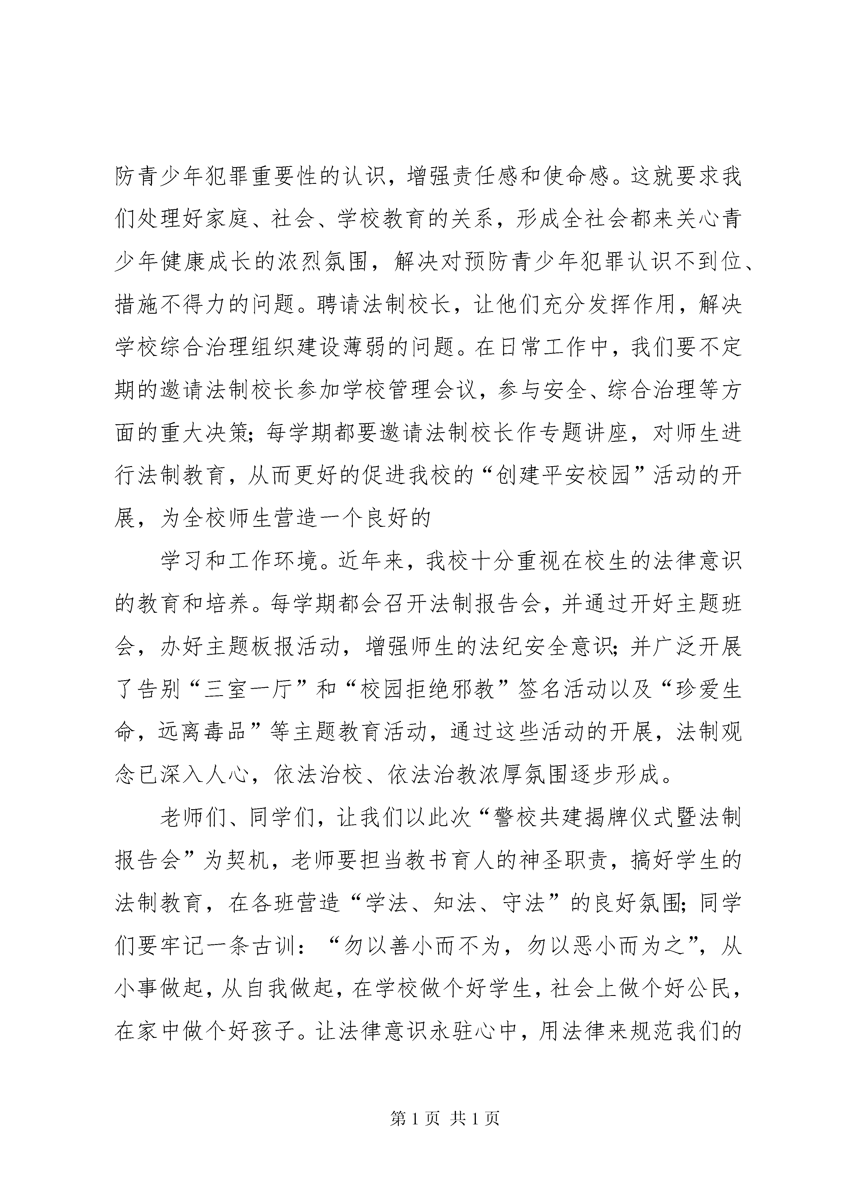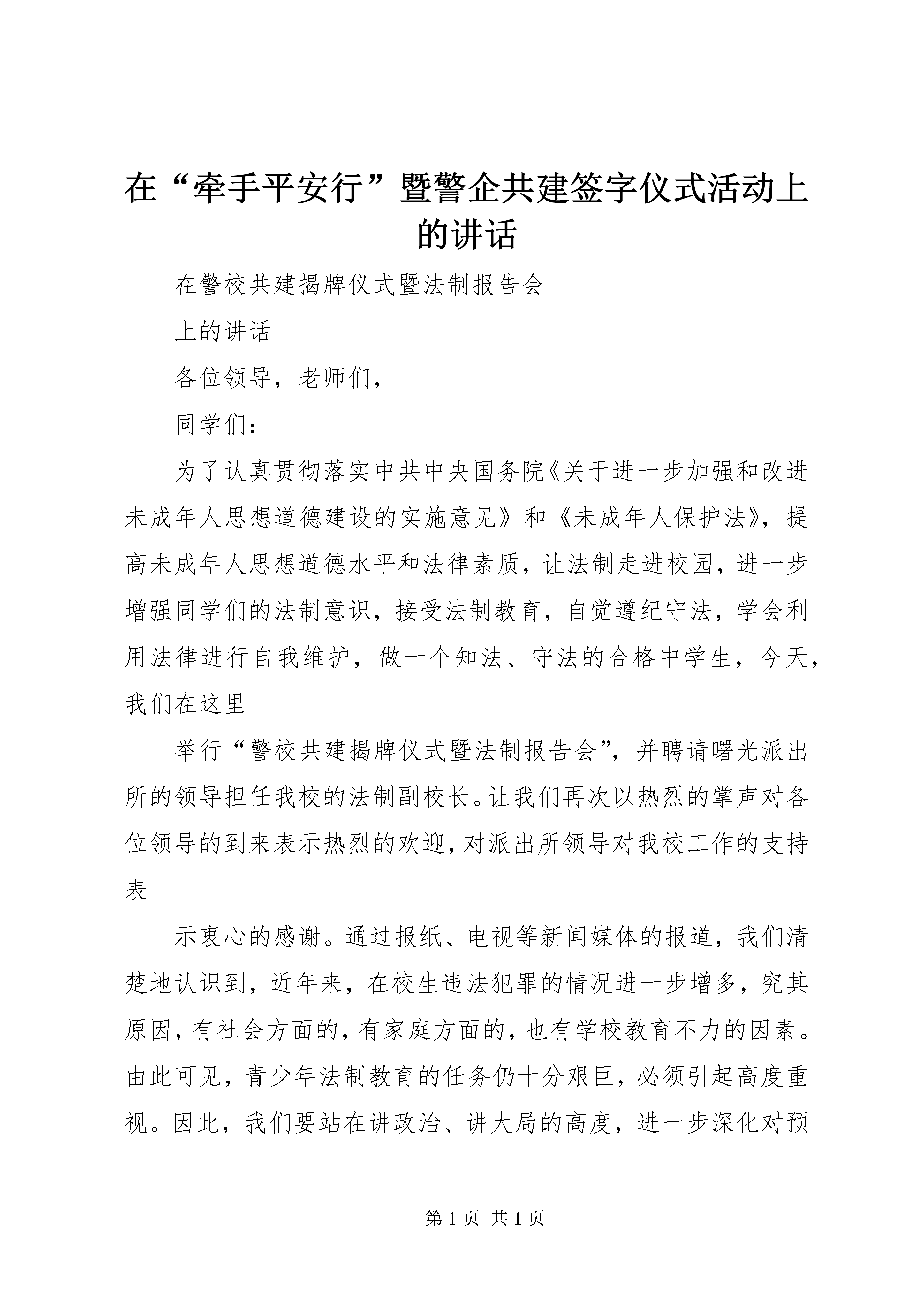 在“牵手平安行”暨警企共建签字仪式活动上的讲话在警校共建揭牌仪式暨法制报告会上的讲话各位领导,老师们,同学们:为了认真贯彻落实中共中央国务院《关于进一步加强和改进未成年人思想道德建设的实施意见》和《未成年人保护法》,提高未成年人思想道德水平和法律素质,让法制走进校园,进一步增强同学们的法制意识,接受法制教育,自觉遵纪守法,学会利用法律进行自我维护,做一个知法、守法的合格中学生,今天,我们在这里举行“警校共建揭牌仪式暨法制报告会”,并聘请曙光派出所的领导担任我校的法制副校长。让我们再次以热烈的掌声对各位领导的到来表示热烈的欢迎,对派出所领导对我校工作的支持表示衷心的感谢。通过报纸、电视等新闻媒体的报道,我们清楚地认识到,近年来,在校生违法犯罪的情况进一步增多,究其原因,有社会方面的,有家庭方面的,也有学校教育不力的因素。由此可见,青少年法制教育的任务仍十分艰巨,必须引起高度重视。因此,我们要站在讲政治、讲大局的高度,进一步深化对预防青少年犯罪重要性的认识,增强责任感和使命感。这就要求我们处理好家庭、社会、学校教育的关系,形成全社会都来关心青少年健康成长的浓烈氛围,解决对预防青少年犯罪认识不到位、措施不得力的问题。聘请法制校长,让他们充分发挥作用,解决学校综合治理组织建设薄弱的问题。在日常工作中,我们要不定期的邀请法制校长参加学校管理会议,参与安全、综合治理等方面的重大决策;每学期都要邀请法制校长作专题讲座,对师生进行法制教育,从而更好的促进我校的“创建平安校园”活动的开展,为全校师生营造一个良好的学习和工作环境。近年来,我校十分重视在校生的法律意识的教育和培养。每学期都会召开法制报告会,并通过开好主题班会,办好主题板报活动,增强师生的法纪安全意识;并广泛开展了告别“三室一厅”和“校园拒绝邪教”签名活动以及“珍爱生命,远离毒品”等主题教育活动,通过这些活动的开展,法制观念已深入人心,依法治校、依法治教浓厚氛围逐步形成。老师们、同学们,让我们以此次“警校共建揭牌仪式暨法制报告会”为契机,老师要担当教书育人的神圣职责,搞好学生的法制教育,在各班营造“学法、知法、守法”的良好氛围;同学们要牢记一条古训:“勿以善小而不为,勿以恶小而为之”,从小事做起,从自我做起,在学校做个好学生,社会上做个好公民,在家中做个好孩子。让法律意识永驻心中,用法律来规范我们的言行,让我们警校合作,全体师生携起手来,共同营造“和谐、平安,更加美好的曙光。谢谢大家。