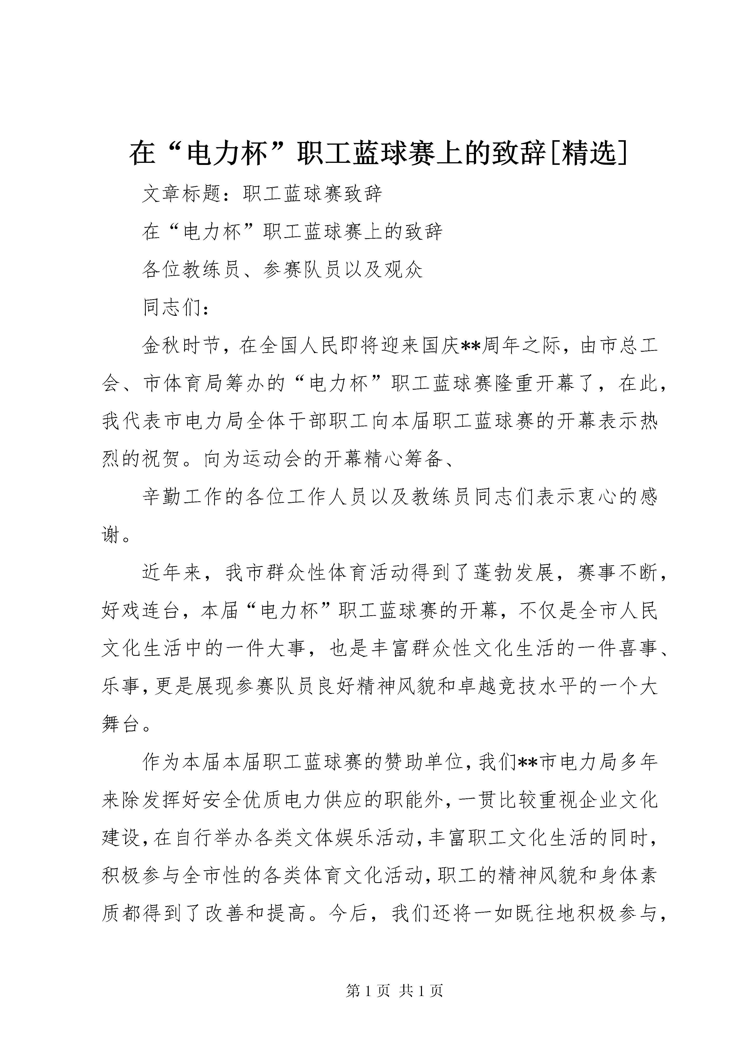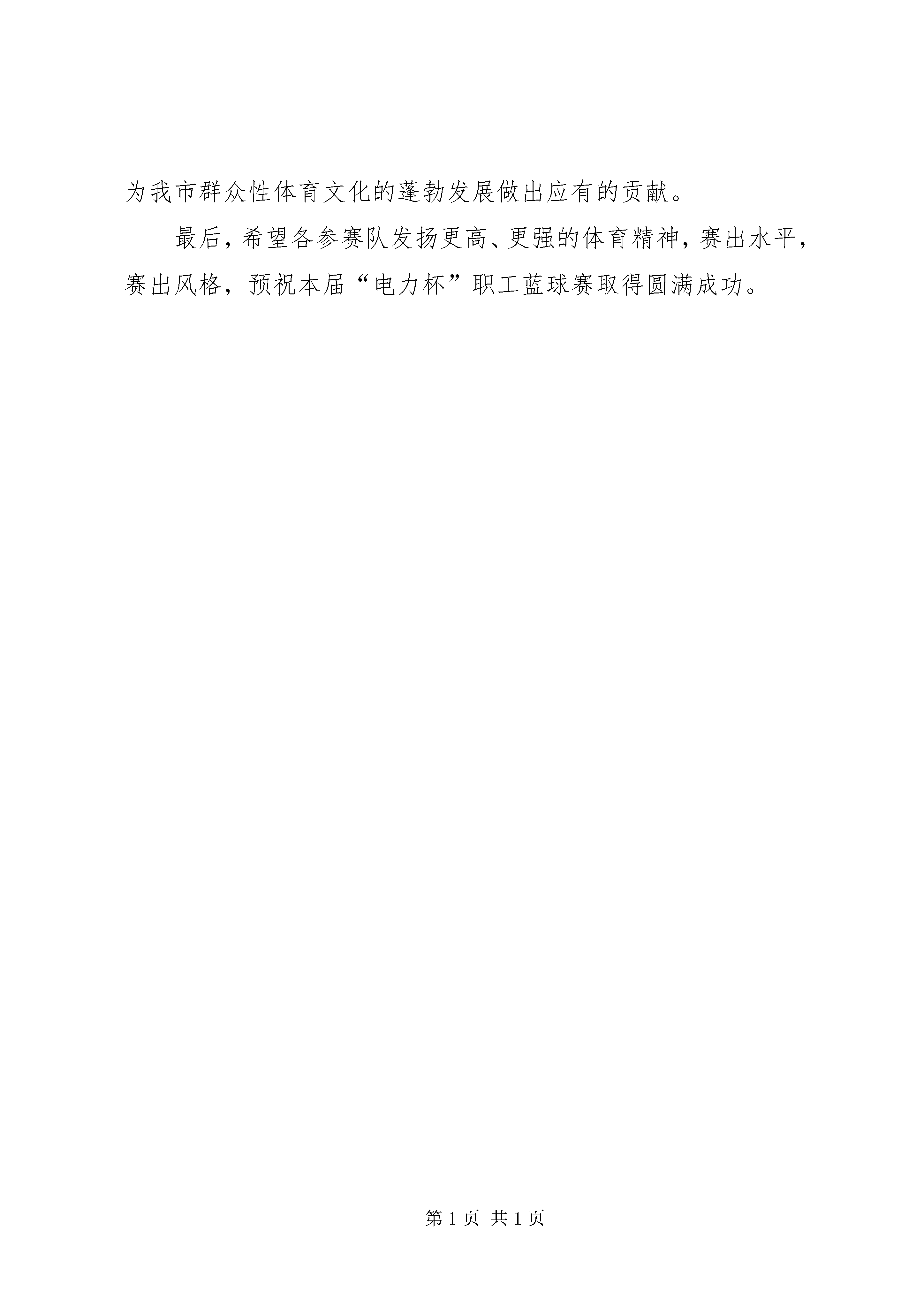在“电力杯”职工蓝球赛上的致辞[精选]文章标题:职工蓝球赛致辞在“电力杯”职工蓝球赛上的致辞各位教练员、参赛队员以及观众同志们:金秋时节,在全国人民即将迎来国庆**周年之际,由市总工会、市体育局筹办的“电力杯”职工蓝球赛隆重开幕了,在此,我代表市电力局全体干部职工向本届职工蓝球赛的开幕表示热烈的祝贺。向为运动会的开幕精心筹备、辛勤工作的各位工作人员以及教练员同志们表示衷心的感谢。近年来,我市群众性体育活动得到了蓬勃发展,赛事不断,好戏连台,本届“电力杯”职工蓝球赛的开幕,不仅是全市人民文化生活中的一件大事,也是丰富群众性文化生活的一件喜事、乐事,更是展现参赛队员良好精神风貌和卓越竞技水平的一个大舞台。作为本届本届职工蓝球赛的赞助单位,我们**市电力局多年来除发挥好安全优质电力供应的职能外,一贯比较重视企业文化建设,在自行举办各类文体娱乐活动,丰富职工文化生活的同时,积极参与全市性的各类体育文化活动,职工的精神风貌和身体素质都得到了改善和提高。今后,我们还将一如既往地积极参与,为我市群众性体育文化的蓬勃发展做出应有的贡献。最后,希望各参赛队发扬更高、更强的体育精神,赛出水平,赛出风格,预祝本届“电力杯”职工蓝球赛取得圆满成功。