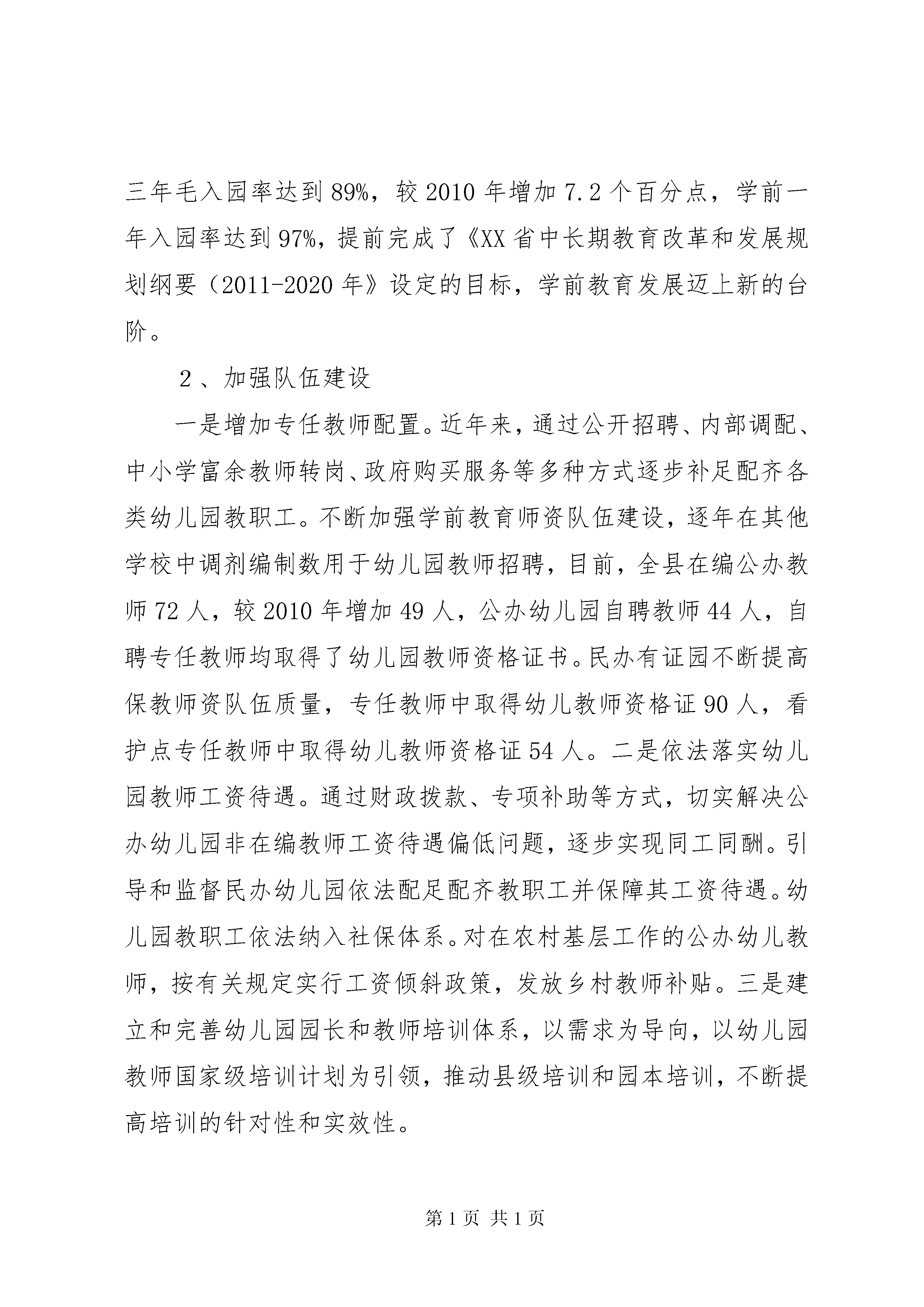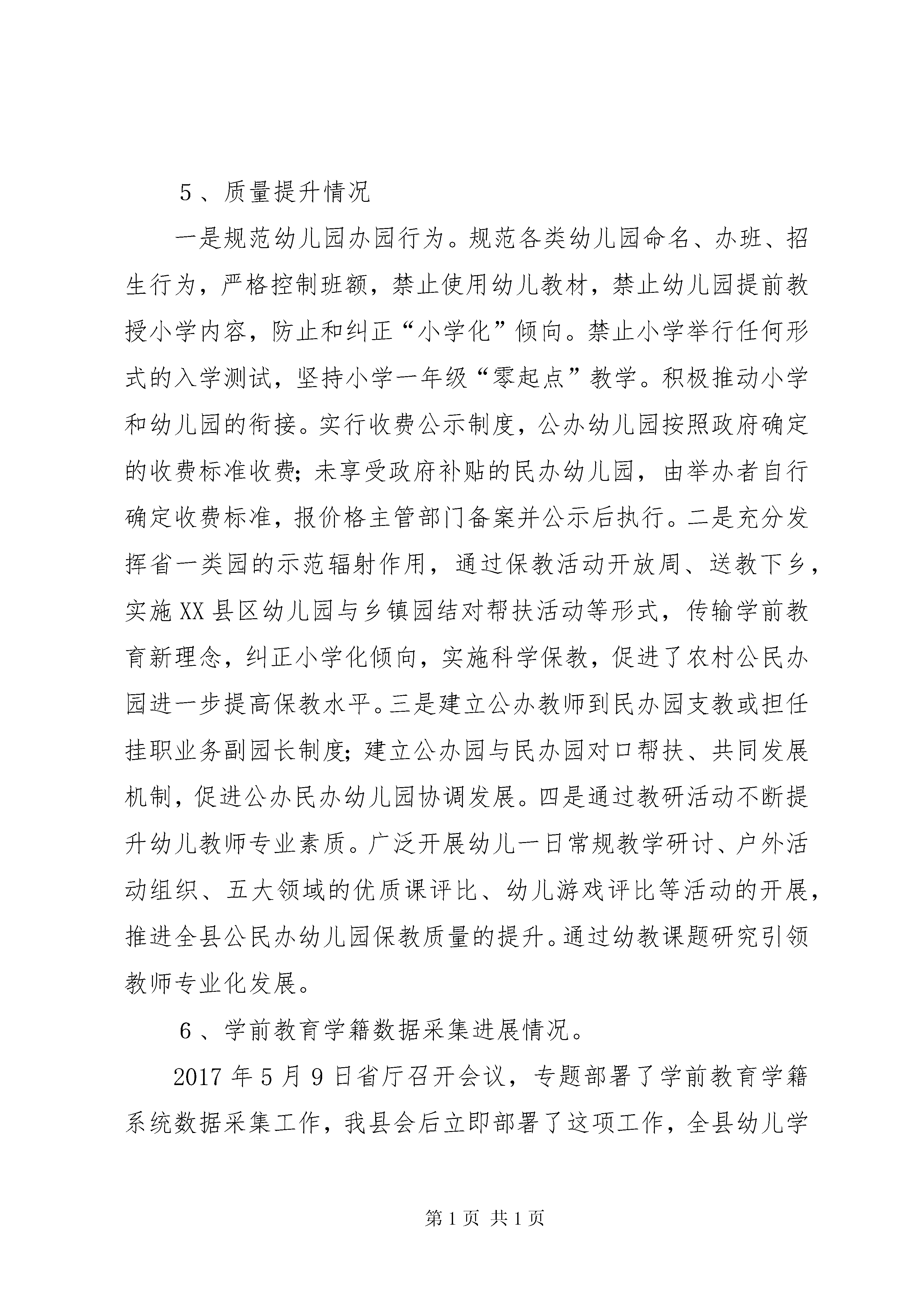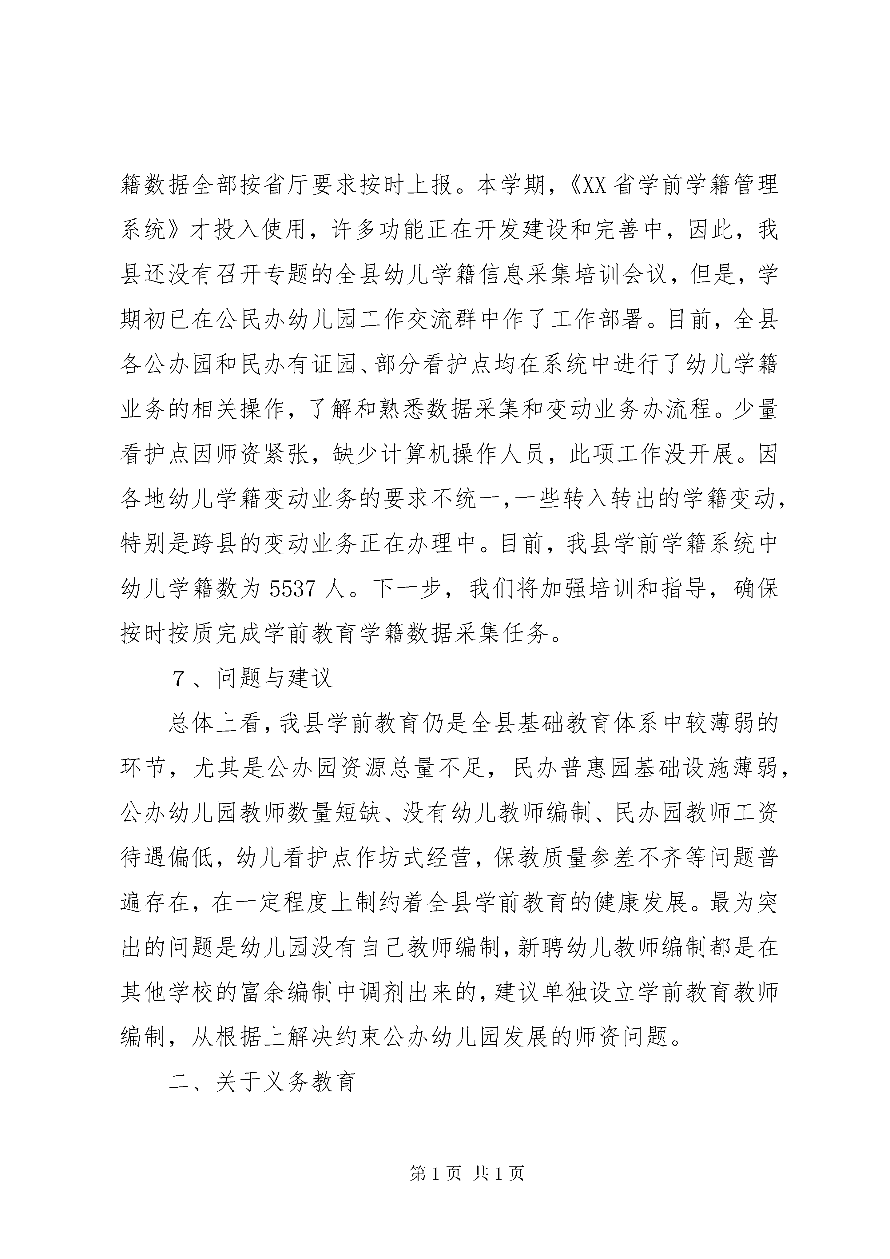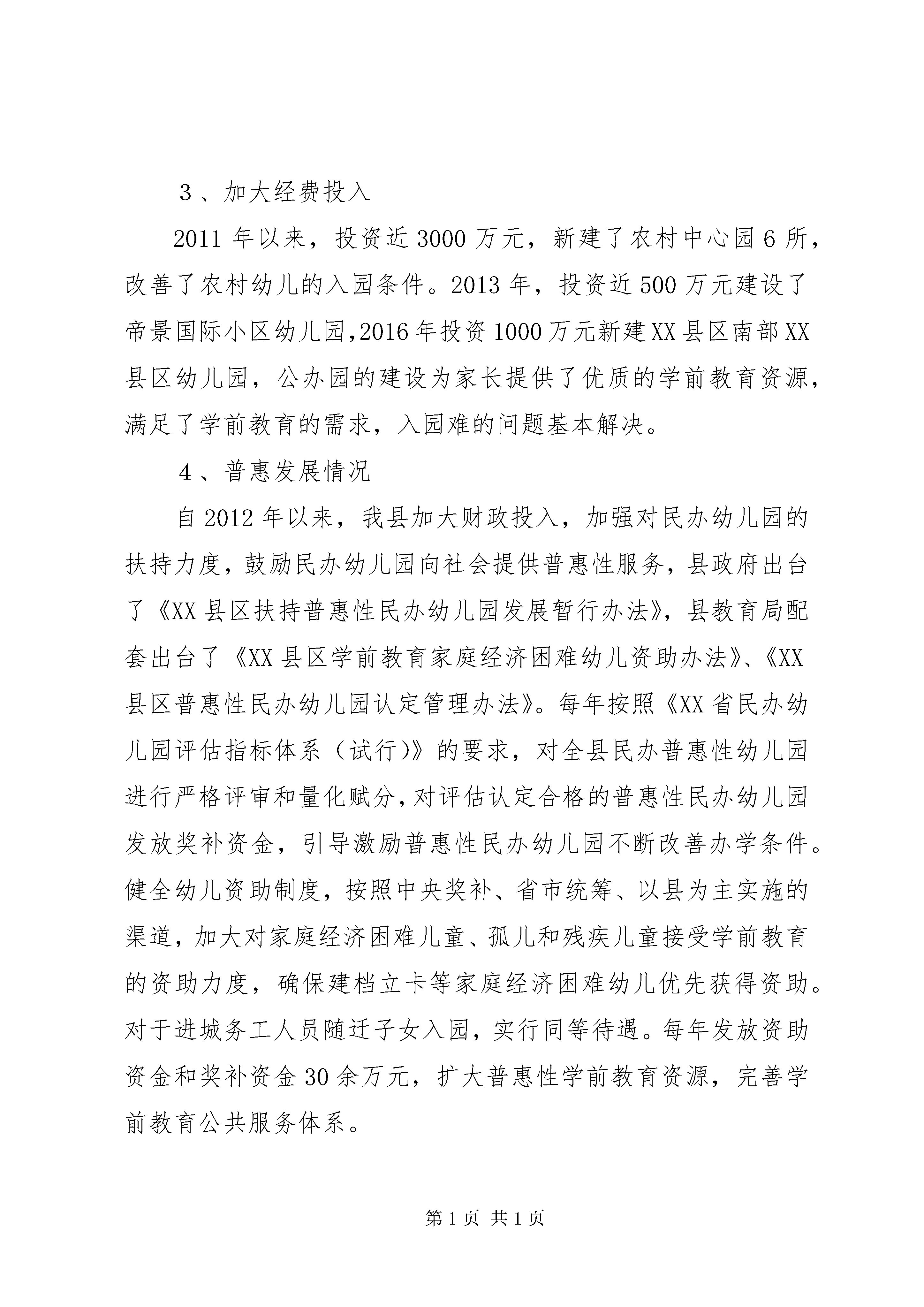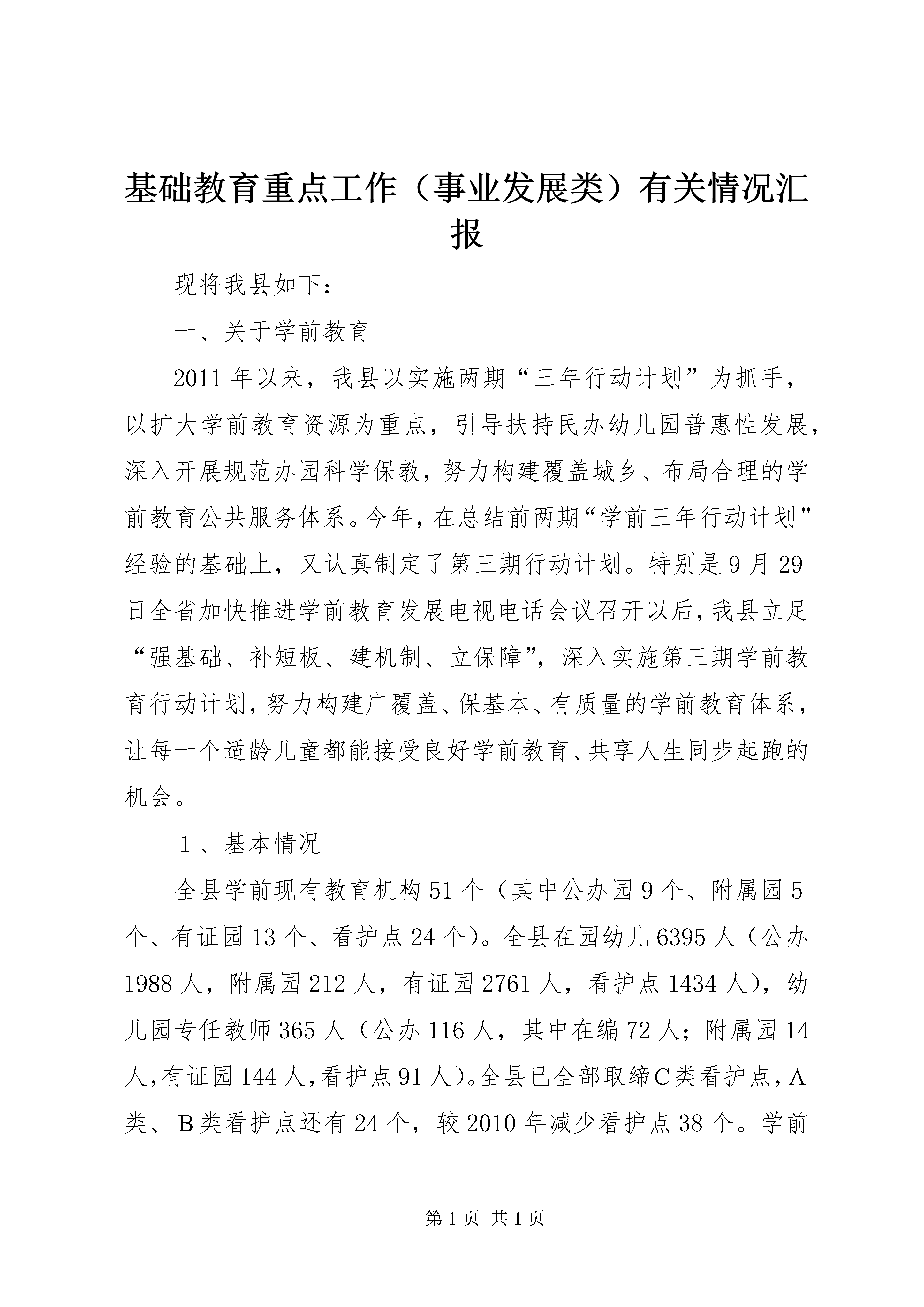 基础教育重点工作(事业发展类)有关情况汇报现将我县如下:一、关于学前教育2011年以来,我县以实施两期“三年行动计划”为抓手,以扩大学前教育资源为重点,引导扶持民办幼儿园普惠性发展,深入开展规范办园科学保教,努力构建覆盖城乡、布局合理的学前教育公共服务体系。今年,在总结前两期“学前三年行动计划”经验的基础上,又认真制定了第三期行动计划。特别是9月29日全省加快推进学前教育发展电视电话会议召开以后,我县立足“强基础、补短板、建机制、立保障”,深入实施第三期学前教育行动计划,努力构建广覆盖、保基本、有质量的学前教育体系,让每一个适龄儿童都能接受良好学前教育、共享人生同步起跑的机会。1、基本情况全县学前现有教育机构51个(其中公办园9个、附属园5个、有证园13个、看护点24个)。全县在园幼儿6395人(公办1988人,附属园212人,有证园2761人,看护点1434人),幼儿园专任教师365人(公办116人,其中在编72人;附属园14人,有证园144人,看护点91人)。全县已全部取缔C类看护点,A类、B类看护点还有24个,较2010年减少看护点38个。学前三年毛入园率达到89%,较2010年增加7.2个百分点,学前一年入园率达到97%,提前完成了《XX省中长期教育改革和发展规划纲要(2011-2020年》设定的目标,学前教育发展迈上新的台阶。2、加强队伍建设一是增加专任教师配置。近年来,通过公开招聘、内部调配、中小学富余教师转岗、政府购买服务等多种方式逐步补足配齐各类幼儿园教职工。不断加强学前教育师资队伍建设,逐年在其他学校中调剂编制数用于幼儿园教师招聘,目前,全县在编公办教师72人,较2010年增加49人,公办幼儿园自聘教师44人,自聘专任教师均取得了幼儿园教师资格证书。民办有证园不断提高保教师资队伍质量,专任教师中取得幼儿教师资格证90人,看护点专任教师中取得幼儿教师资格证54人。二是依法落实幼儿园教师工资待遇。通过财政拨款、专项补助等方式,切实解决公办幼儿园非在编教师工资待遇偏低问题,逐步实现同工同酬。引导和监督民办幼儿园依法配足配齐教职工并保障其工资待遇。幼儿园教职工依法纳入社保体系。对在农村基层工作的公办幼儿教师,按有关规定实行工资倾斜政策,发放乡村教师补贴。三是建立和完善幼儿园园长和教师培训体系,以需求为导向,以幼儿园教师国家级培训计划为引领,推动县级培训和园本培训,不断提高培训的针对性和实效性。3、加大经费投入2011年以来,投资近3000万元,新建了农村中心园6所,改善了农村幼儿的入园条件。2013年,投资近500万元建设了帝景国际小区幼儿园,2016年投资1000万元新建XX县区南部XX县区幼儿园,公办园的建设为家长提供了优质的学前教育资源,满足了学前教育的需求,入园难的问题基本解决。4、普惠发展情况自2012年以来,我县加大财政投入,加强对民办幼儿园的扶持力度,鼓励民办幼儿园向社会提供普惠性服务,县政府出台了《XX县区扶持普惠性民办幼儿园发展暂行办法》,县教育局配套出台了《XX县区学前教育家庭经济困难幼儿资助办法》、《XX县区普惠性民办幼儿园认定管理办法》。每年按照《XX省民办幼儿园评估指标体系(试行)》的要求,对全县民办普惠性幼儿园进行严格评审和量化赋分,对评估认定合格的普惠性民办幼儿园发放奖补资金,引导激励普惠性民办幼儿园不断改善办学条件。健全幼儿资助制度,按照中央奖补、省市统筹、以县为主实施的渠道,加大对家庭经济困难儿童、孤儿和残疾儿童接受学前教育的资助力度,确保建档立卡等家庭经济困难幼儿优先获得资助。对于进城务工人员随迁子女入园,实行同等待遇。每年发放资助资金和奖补资金30余万元,扩大普惠性学前教育资源,完善学前教育公共服务体系。5、质量提升情况一是规范幼儿园办园行为。规范各类幼儿园命名、办班、招生行为,严格控制班额,禁止使用幼儿教材,禁止幼儿园提前教授小学内容,防止和纠正“小学化”倾向。禁止小学举行任何形式的入学测试,坚持小学一年级“零起点”教学。积极推动小学和幼儿园的衔接。实行收费公示制度,公办幼儿园按照政府确定的收费标准收费;未享受政府补贴的民办幼儿园,由举办者自行确定收费标准,报价格主管部门备案并公示后执行。二是充分发挥省一类园的示范辐射作用,通过保教活动开放周、送教下乡,实施XX县区幼儿园与乡镇园结对帮扶活动等形式,传输学前教育新理念,纠正小学化倾向,实施科学保教,促进了农村公民办园进一步提高保教水平。三是建立公办教师到民办园支教或担任挂职业务副园长制度;建立公办园与民办园对口帮扶、共同发展机制,促进公办民办幼儿园协调发展。四是通过教研活动不断提升幼儿教师专业素质。广泛开展幼儿一日常规教学研讨、户外活动组织、五大领域的优质课评比、幼儿游戏评比等活动的开展,推进全县公民办