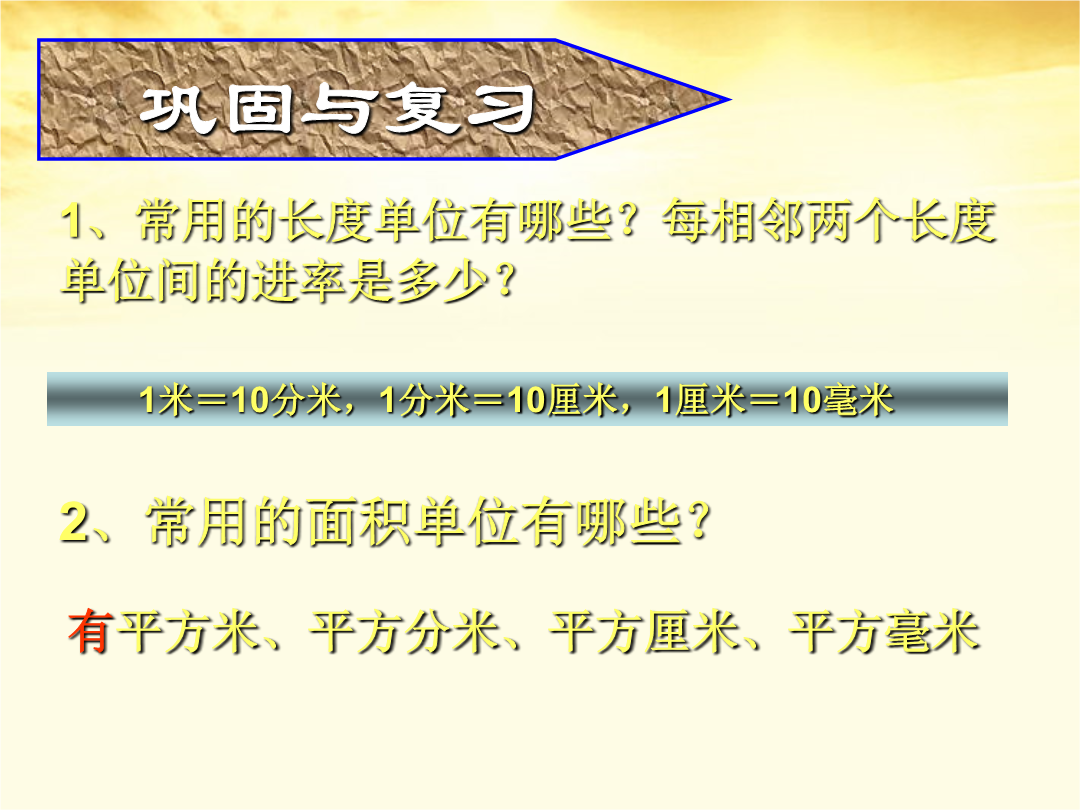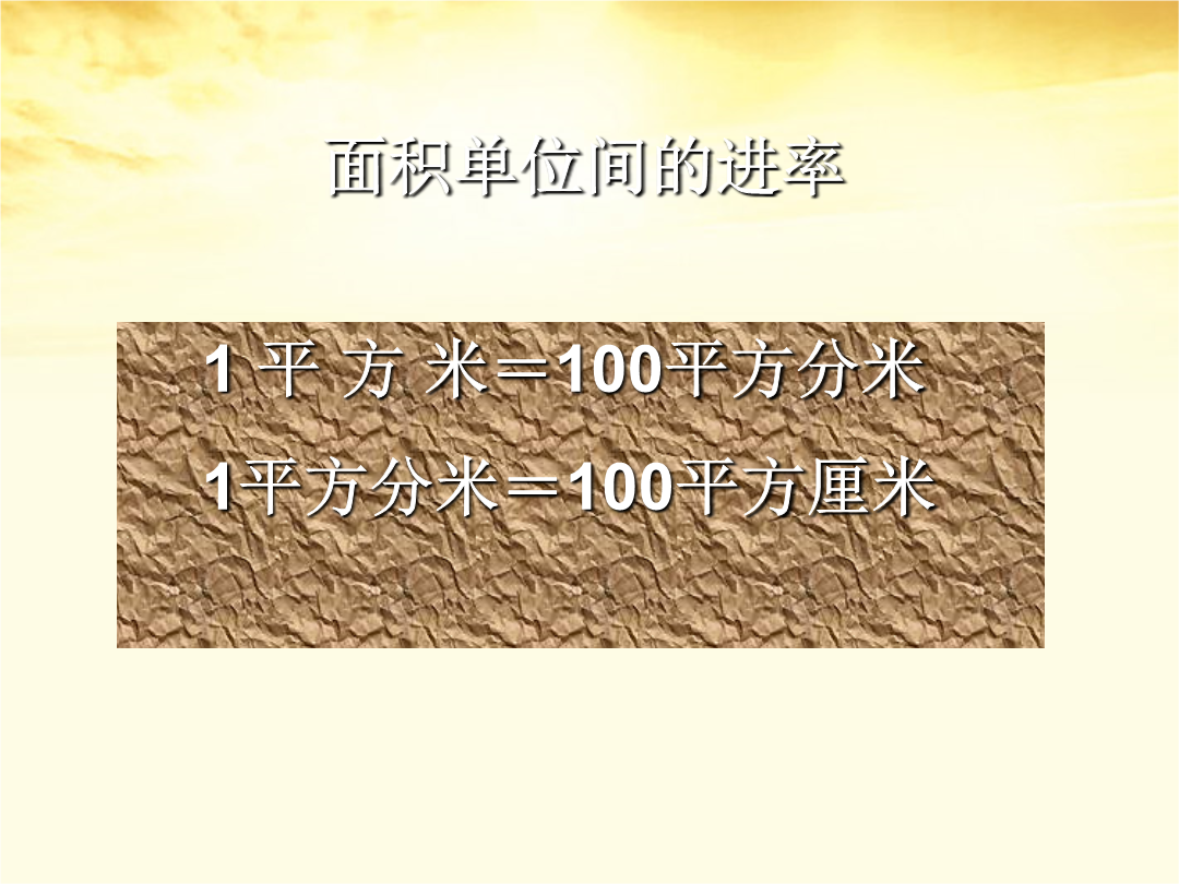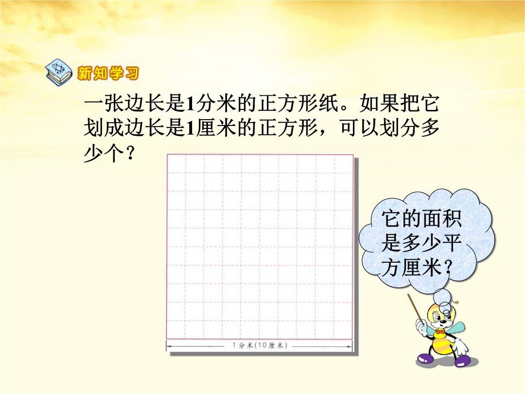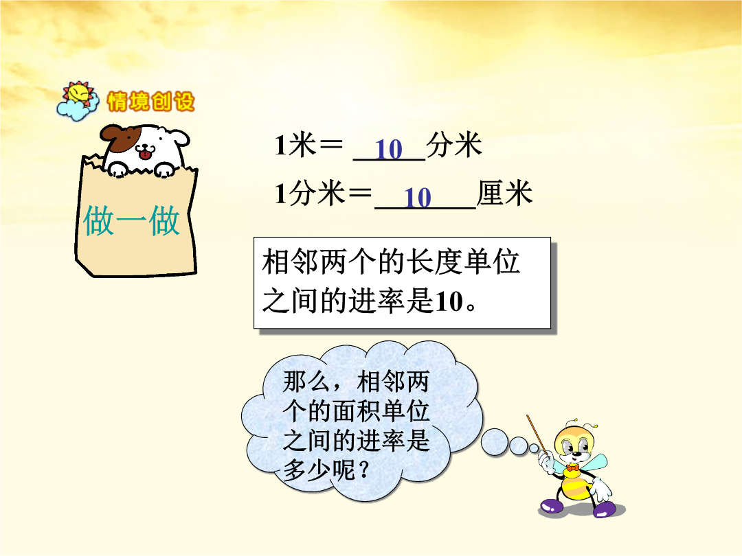 人教新课标版三年级数学下册巩固与复习面积单位间的进率1米=_____分米1分米=_______厘米一张边长是1分米的正方形纸。如果把它划成边长是1厘米的正方形,可以划分多少个?边长是1分米的正方形,面积是1平方分米。1平方分米=100厘米1平方米=()平方分米教室前面的墙壁,长6米、宽3米。墙上有一块黑板,面积是300平方分米。现在要粉刷这面墙壁,要粉刷的面积是多少平方米?做一做做一做墙报的面积是18×12=216(平方分米)