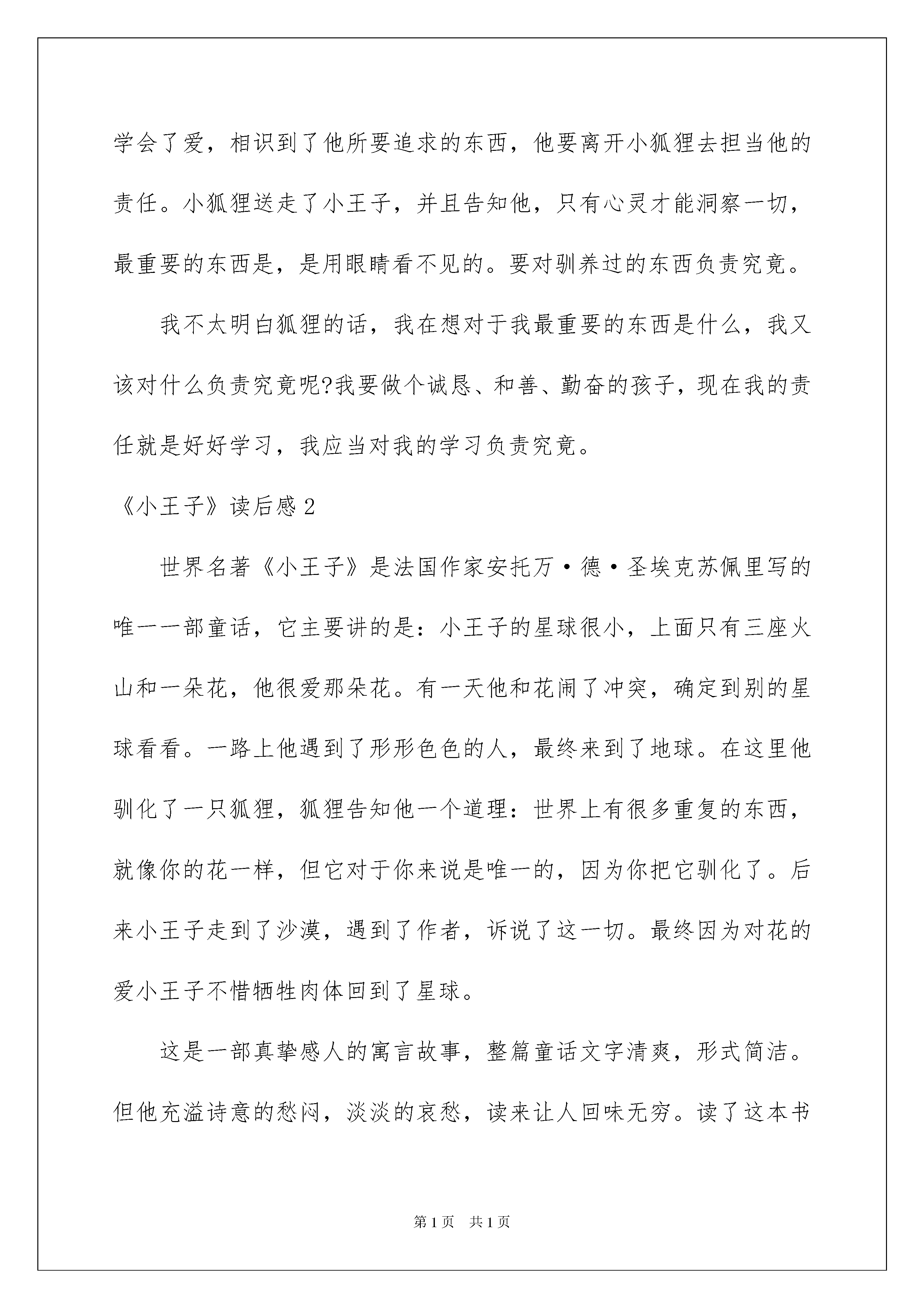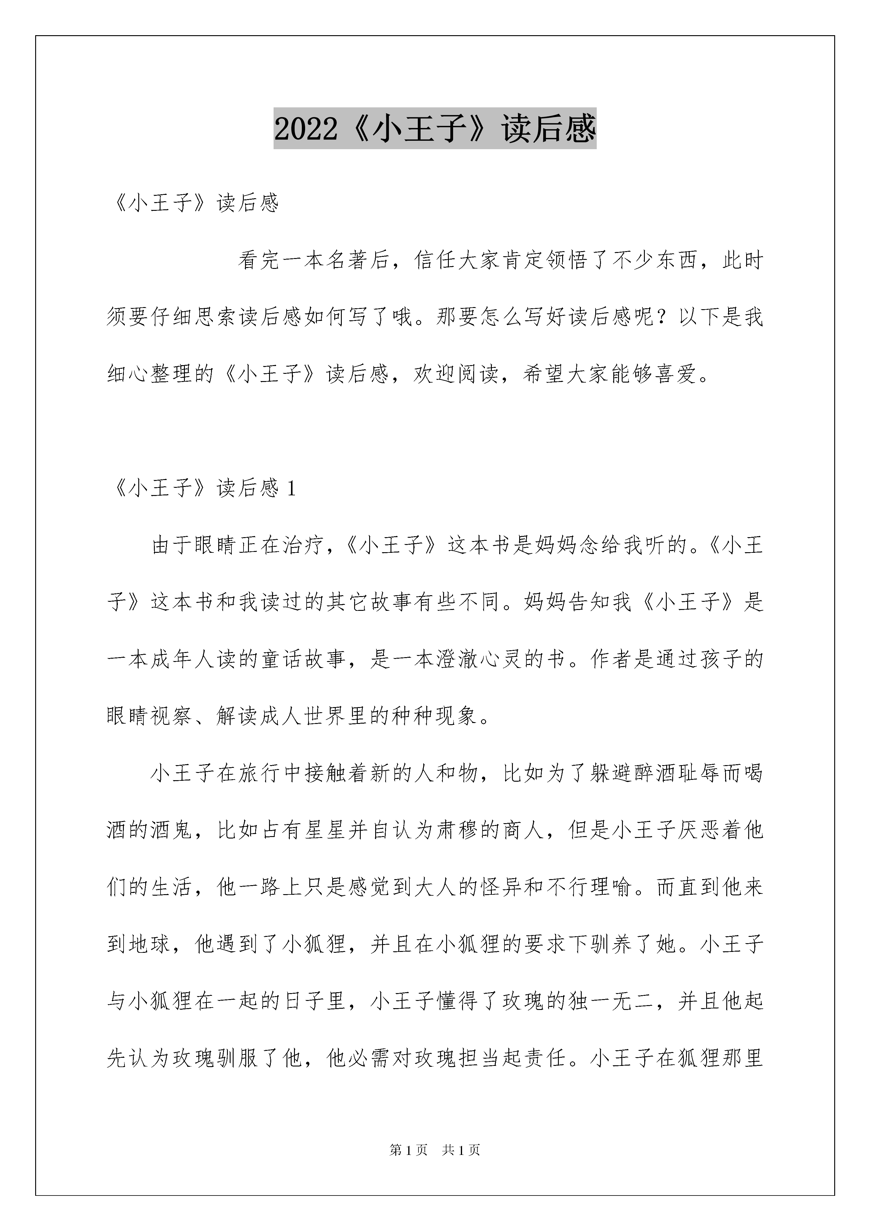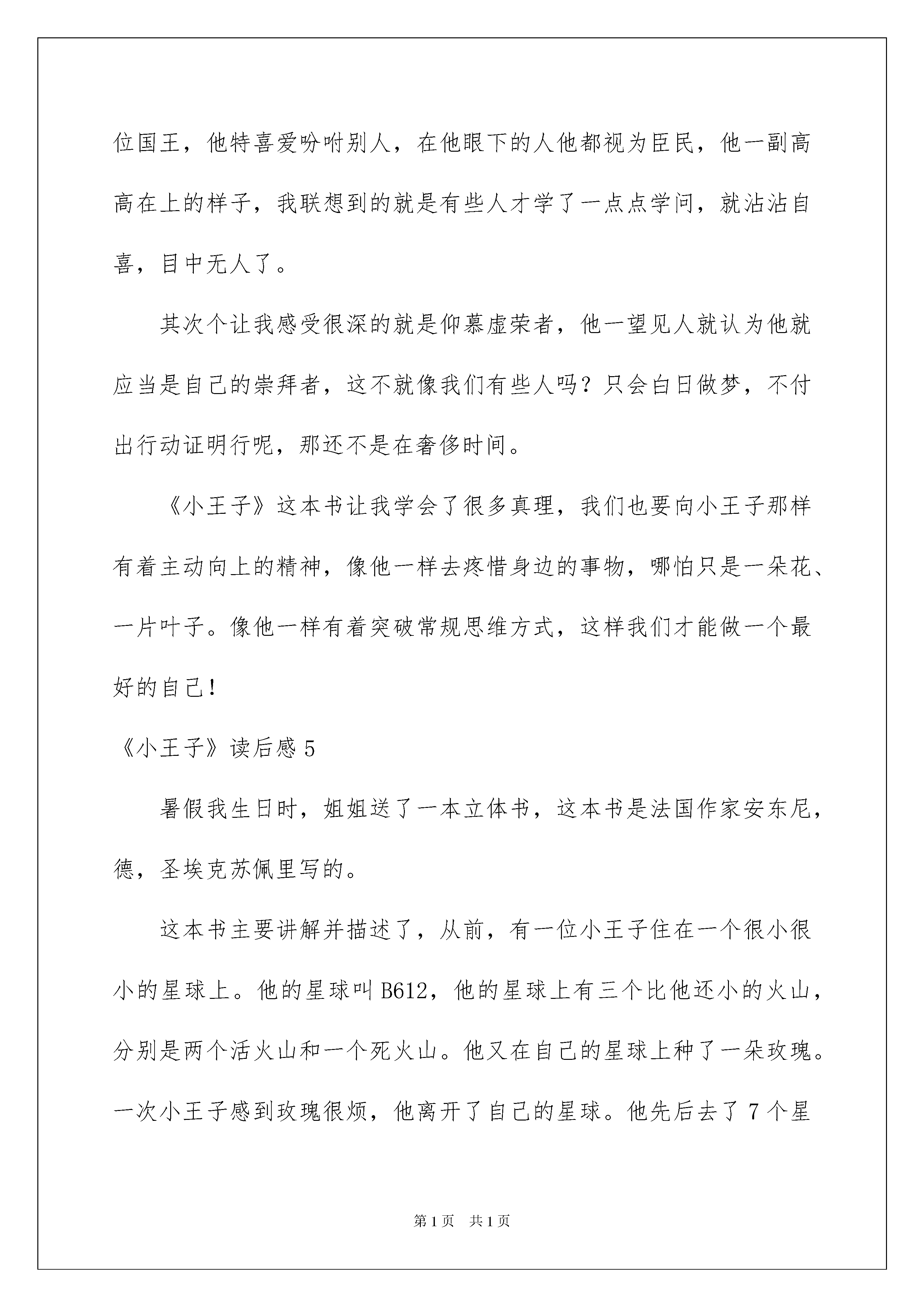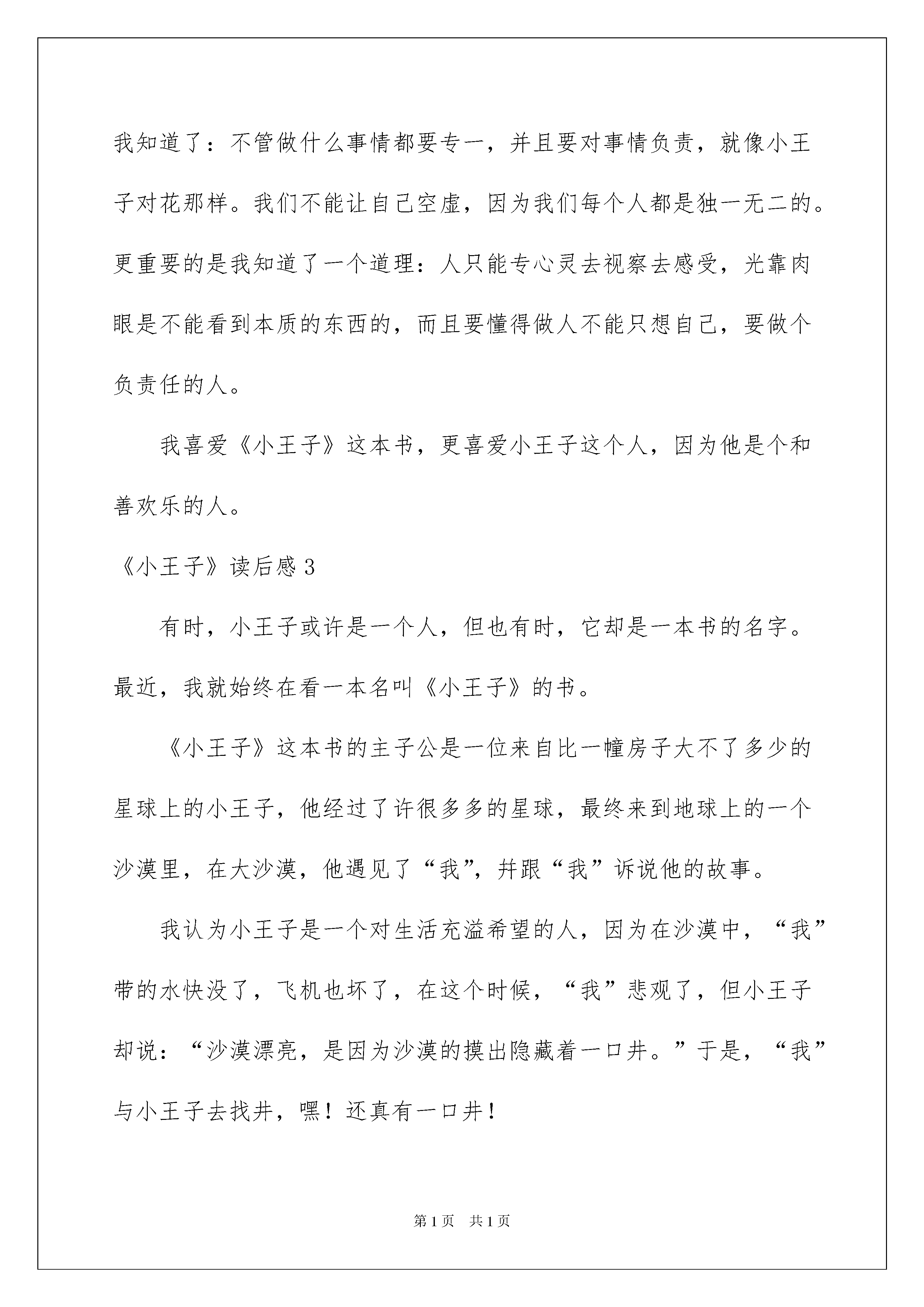2022《小王子》读后感《小王子》读后感看完一本名著后,信任大家肯定领悟了不少东西,此时须要仔细思索读后感如何写了哦。那要怎么写好读后感呢?以下是我细心整理的《小王子》读后感,欢迎阅读,希望大家能够喜爱。《小王子》读后感1由于眼睛正在治疗,《小王子》这本书是妈妈念给我听的。《小王子》这本书和我读过的其它故事有些不同。妈妈告知我《小王子》是一本成年人读的童话故事,是一本澄澈心灵的书。作者是通过孩子的眼睛视察、解读成人世界里的种种现象。小王子在旅行中接触着新的人和物,比如为了躲避醉酒耻辱而喝酒的酒鬼,比如占有星星并自认为肃穆的商人,但是小王子厌恶着他们的生活,他一路上只是感觉到大人的怪异和不行理喻。而直到他来到地球,他遇到了小狐狸,并且在小狐狸的要求下驯养了她。小王子与小狐狸在一起的日子里,小王子懂得了玫瑰的独一无二,并且他起先认为玫瑰驯服了他,他必需对玫瑰担当起责任。小王子在狐狸那里学会了爱,相识到了他所要追求的东西,他要离开小狐狸去担当他的责任。小狐狸送走了小王子,并且告知他,只有心灵才能洞察一切,最重要的东西是,是用眼睛看不见的。要对驯养过的东西负责究竟。我不太明白狐狸的话,我在想对于我最重要的东西是什么,我又该对什么负责究竟呢?我要做个诚恳、和善、勤奋的孩子,现在我的责任就是好好学习,我应当对我的学习负责究竟。《小王子》读后感2世界名著《小王子》是法国作家安托万·德·圣埃克苏佩里写的唯一一部童话,它主要讲的是:小王子的星球很小,上面只有三座火山和一朵花,他很爱那朵花。有一天他和花闹了冲突,确定到别的星球看看。一路上他遇到了形形色色的人,最终来到了地球。在这里他驯化了一只狐狸,狐狸告知他一个道理:世界上有很多重复的东西,就像你的花一样,但它对于你来说是唯一的,因为你把它驯化了。后来小王子走到了沙漠,遇到了作者,诉说了这一切。最终因为对花的爱小王子不惜牺牲肉体回到了星球。这是一部真挚感人的寓言故事,整篇童话文字清爽,形式简洁。但他充溢诗意的愁闷,淡淡的哀愁,读来让人回味无穷。读了这本书我知道了:不管做什么事情都要专一,并且要对事情负责,就像小王子对花那样。我们不能让自己空虚,因为我们每个人都是独一无二的。更重要的是我知道了一个道理:人只能专心灵去视察去感受,光靠肉眼是不能看到本质的东西的,而且要懂得做人不能只想自己,要做个负责任的人。我喜爱《小王子》这本书,更喜爱小王子这个人,因为他是个和善欢乐的人。《小王子》读后感3有时,小王子或许是一个人,但也有时,它却是一本书的名字。最近,我就始终在看一本名叫《小王子》的书。《小王子》这本书的主子公是一位来自比一幢房子大不了多少的星球上的小王子,他经过了许很多多的星球,最终来到地球上的一个沙漠里,在大沙漠,他遇见了“我”,幷跟“我”诉说他的故事。我认为小王子是一个对生活充溢希望的人,因为在沙漠中,“我”带的水快没了,飞机也坏了,在这个时候,“我”悲观了,但小王子却说:“沙漠漂亮,是因为沙漠的摸出隐藏着一口井。”于是,“我”与小王子去找井,嘿!还真有一口井!为权势、虚荣、职责、学问之类表面的东西忙劳碌碌。那个自以为很有权威,其实却成了对权威的追求的牺牲品的国王;那个要求别人向他不断脱帽和鼓掌的自负的人;那个为喝酒感到惭愧,为遗忘惭愧而舍命喝酒的家伙;热衷于统计星星的数目的商人;从不自己出门的地理学家;拘泥于职责的劳累的点灯人……他们都有个共同的特点,就是把真正美妙的东西忽视掉了。世界上,有许很多多这样的人,天啊!大家都忽视美妙的东西!这是多么可怕的一件事!不过真正美妙的东西是什么呢?读下去我才知道,就是:我们藏起来的真诚与童心。《小王子》读后感4这几天我读了安东尼·德圣埃克苏佩里写的《小王子》,这本书让我受益匪浅。一起先我还不怎么读得懂,慢慢地,我知道了读这本书要用赤子之心去读。小王子生活在B612小星球上,那个星球很小,小得种三课猴面包树也种不下,但这星球上也充溢了朝气,上面有两座火山和一座死火山,还有小王子的伙伴玫瑰花。小王子新奇心很强,他参观了很多星球,其中有一个星球住着一位国王,他特喜爱吩咐别人,在他眼下的人他都视为臣民,他一副高高在上的样子,我联想到的就是有些人才学了一点点学问,就沾沾自喜,目中无人了。其次个让我感受很深的就是仰慕虚荣者,他一望见人就认为他就应当是自己的崇拜者,这不就像我们有些人吗?只会白日做梦,不付出行动证明行呢,那还不是在奢侈时间。《小王子》这本书让我学会了很多真理,我们也要向小王子那样有着主动向上的精神,像他一样去疼惜身边的事物,哪怕只是一朵花、一片叶子。像他一样有着突破常规思维方式,这样我们才能做一个