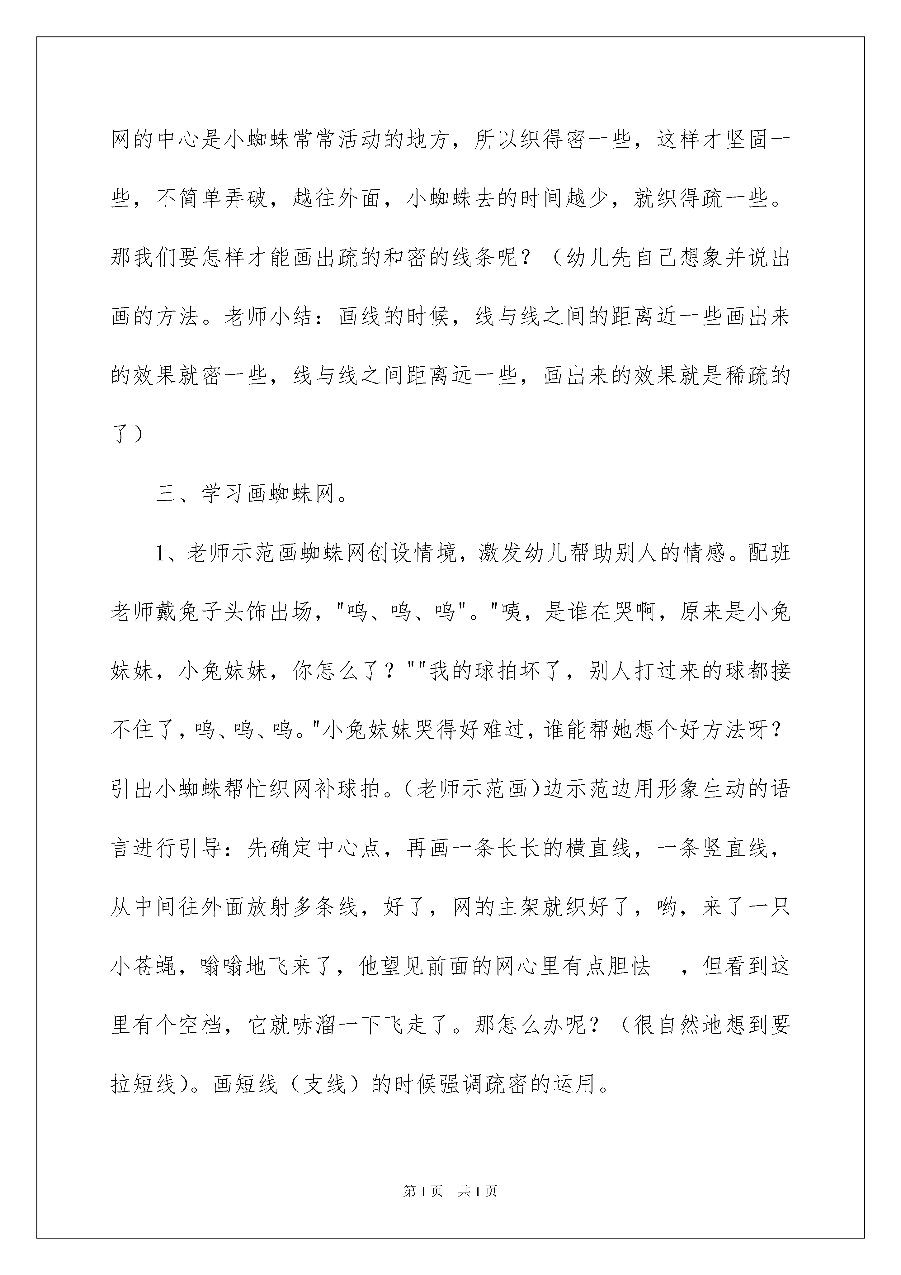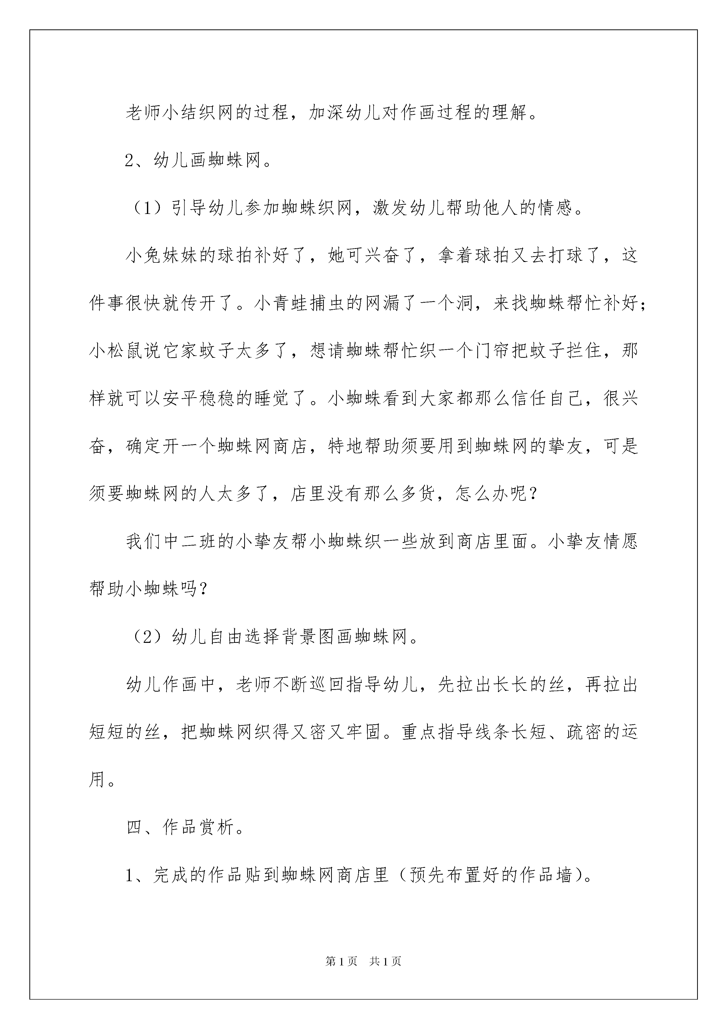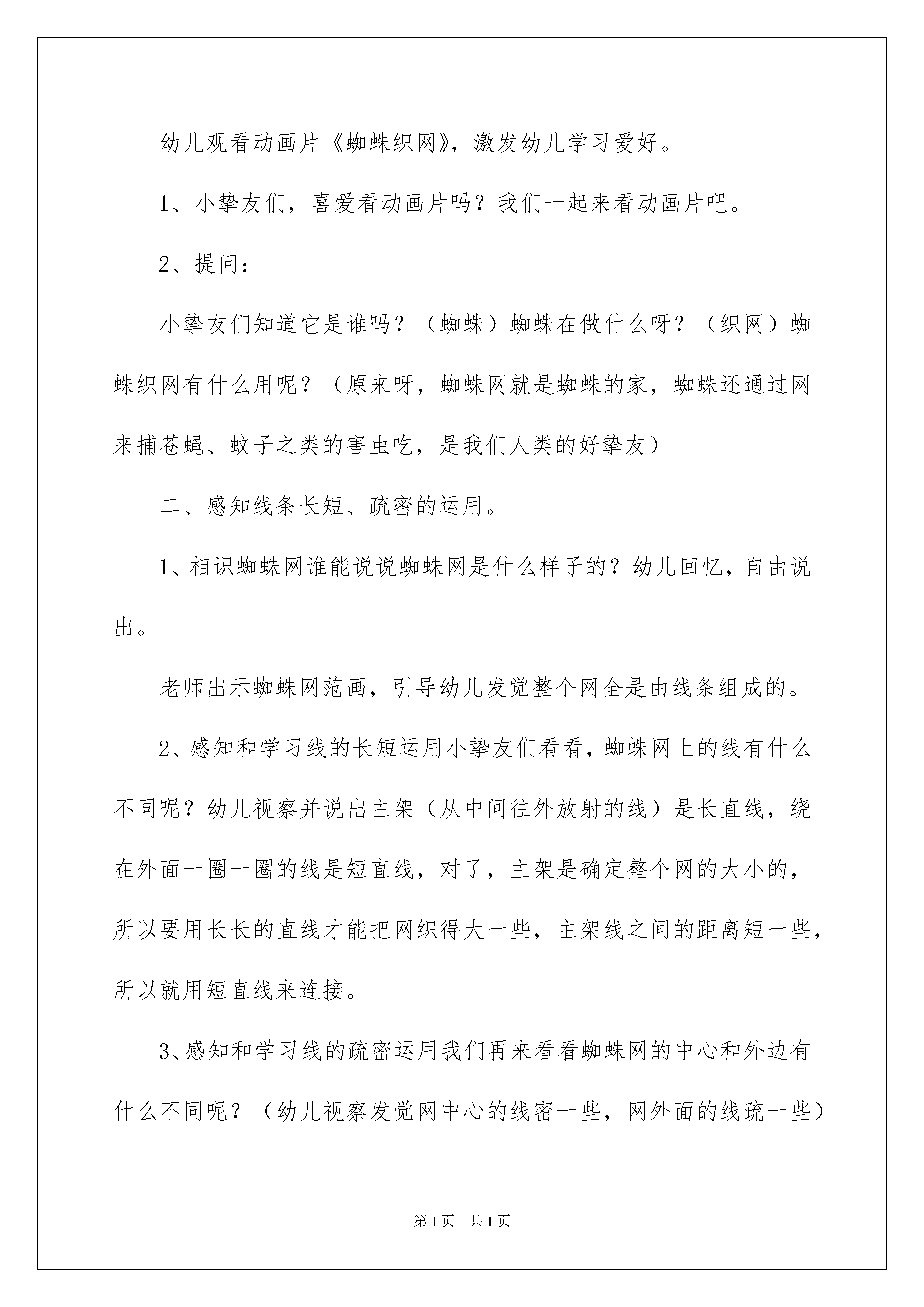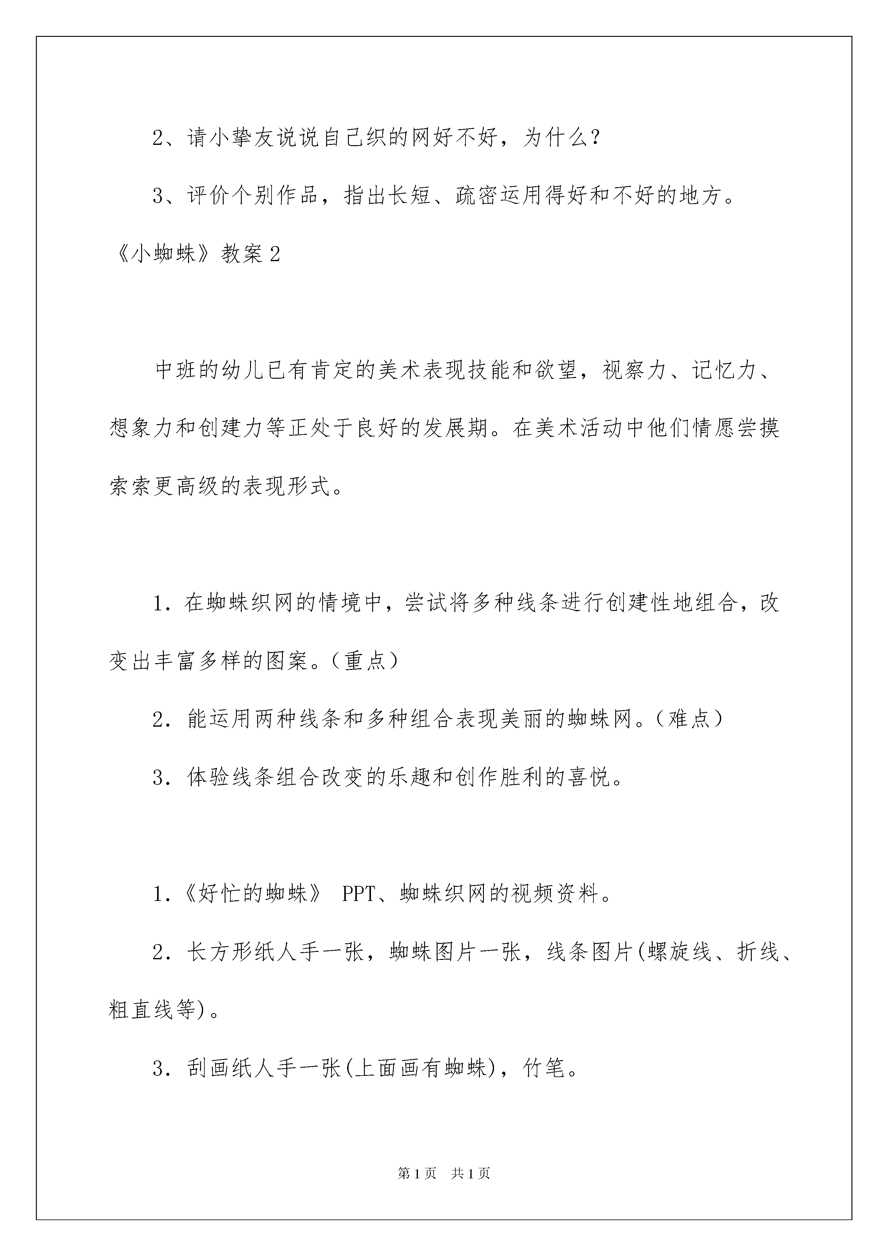 2022《小蜘蛛》教案《小蜘蛛》教案作为一位优秀的人民老师,通常须要打算好一份教案,教案是教材及大纲与课堂教学的纽带和桥梁。那要怎么写好教案呢?以下是我为大家整理的《小蜘蛛》教案,仅供参考,大家一起来看看吧。《小蜘蛛》教案1活动目标:1、感知线条的长短、疏密改变。(重点)2、初步尝试运用线条的长短、疏密改变进行绘画。(难点)3、体验线条组合的乐趣和胜利的喜悦。活动打算:蜘蛛织网视频、蜘蛛网示范画一张,示范用背景图《蜘蛛网店》一张、幼儿作画背景图人手一张、勾线笔人手一支、背景音乐及出场音乐《郊游》活动过程:一、课件导入。幼儿观看动画片《蜘蛛织网》,激发幼儿学习爱好。1、小挚友们,喜爱看动画片吗?我们一起来看动画片吧。2、提问:小挚友们知道它是谁吗?(蜘蛛)蜘蛛在做什么呀?(织网)蜘蛛织网有什么用呢?(原来呀,蜘蛛网就是蜘蛛的家,蜘蛛还通过网来捕苍蝇、蚊子之类的害虫吃,是我们人类的好挚友)二、感知线条长短、疏密的运用。1、相识蜘蛛网谁能说说蜘蛛网是什么样子的?幼儿回忆,自由说出。老师出示蜘蛛网范画,引导幼儿发觉整个网全是由线条组成的。2、感知和学习线的长短运用小挚友们看看,蜘蛛网上的线有什么不同呢?幼儿视察并说出主架(从中间往外放射的线)是长直线,绕在外面一圈一圈的线是短直线,对了,主架是确定整个网的大小的,所以要用长长的直线才能把网织得大一些,主架线之间的距离短一些,所以就用短直线来连接。3、感知和学习线的疏密运用我们再来看看蜘蛛网的中心和外边有什么不同呢?(幼儿视察发觉网中心的线密一些,网外面的线疏一些)网的中心是小蜘蛛常常活动的地方,所以织得密一些,这样才坚固一些,不简单弄破,越往外面,小蜘蛛去的时间越少,就织得疏一些。那我们要怎样才能画出疏的和密的线条呢?(幼儿先自己想象并说出画的方法。老师小结:画线的时候,线与线之间的距离近一些画出来的效果就密一些,线与线之间距离远一些,画出来的效果就是稀疏的了)三、学习画蜘蛛网。1、老师示范画蜘蛛网创设情境,激发幼儿帮助别人的情感。配班老师戴兔子头饰出场,"呜、呜、呜"。"咦,是谁在哭啊,原来是小兔妹妹,小兔妹妹,你怎么了?""我的球拍坏了,别人打过来的球都接不住了,呜、呜、呜。"小兔妹妹哭得好难过,谁能帮她想个好方法呀?引出小蜘蛛帮忙织网补球拍。(老师示范画)边示范边用形象生动的语言进行引导:先确定中心点,再画一条长长的横直线,一条竖直线,从中间往外面放射多条线,好了,网的主架就织好了,哟,来了一只小苍蝇,嗡嗡地飞来了,他望见前面的网心里有点胆怯,但看到这里有个空档,它就哧溜一下飞走了。那怎么办呢?(很自然地想到要拉短线)。画短线(支线)的时候强调疏密的运用。老师小结织网的过程,加深幼儿对作画过程的理解。2、幼儿画蜘蛛网。(1)引导幼儿参加蜘蛛织网,激发幼儿帮助他人的情感。小兔妹妹的球拍补好了,她可兴奋了,拿着球拍又去打球了,这件事很快就传开了。小青蛙捕虫的网漏了一个洞,来找蜘蛛帮忙补好;小松鼠说它家蚊子太多了,想请蜘蛛帮忙织一个门帘把蚊子拦住,那样就可以安平稳稳的睡觉了。小蜘蛛看到大家都那么信任自己,很兴奋,确定开一个蜘蛛网商店,特地帮助须要用到蜘蛛网的挚友,可是须要蜘蛛网的人太多了,店里没有那么多货,怎么办呢?我们中二班的小挚友帮小蜘蛛织一些放到商店里面。小挚友情愿帮助小蜘蛛吗?(2)幼儿自由选择背景图画蜘蛛网。幼儿作画中,老师不断巡回指导幼儿,先拉出长长的丝,再拉出短短的丝,把蜘蛛网织得又密又牢固。重点指导线条长短、疏密的运用。四、作品赏析。1、完成的作品贴到蜘蛛网商店里(预先布置好的作品墙)。2、请小挚友说说自己织的网好不好,为什么?3、评价个别作品,指出长短、疏密运用得好和不好的地方。《小蜘蛛》教案2中班的幼儿已有肯定的美术表现技能和欲望,视察力、记忆力、想象力和创建力等正处于良好的发展期。在美术活动中他们情愿尝摸索索更高级的表现形式。1.在蜘蛛织网的情境中,尝试将多种线条进行创建性地组合,改变出丰富多样的图案。(重点)2.能运用两种线条和多种组合表现美丽的蜘蛛网。(难点)3.体验线条组合改变的乐趣和创作胜利的喜悦。1.《好忙的蜘蛛》PPT、蜘蛛织网的视频资料。2.长方形纸人手一张,蜘蛛图片一张,线条图片(螺旋线、折线、粗直线等)。3.刮画纸人手一张(上面画有蜘蛛),竹笔。一、老师运用情景“好忙的小蜘蛛”导入活动,激发幼儿学习爱好。1.出示PPT,幼儿视察并回答:谁来了?小蜘蛛在干什么?它是怎么织网的?2.老师请幼儿细致视察图片并提问:蜘蛛吐的丝是什么样的?假如你是小蜘蛛,会利用丝吐出什么样的花纹?二、老师示范刮画纸的