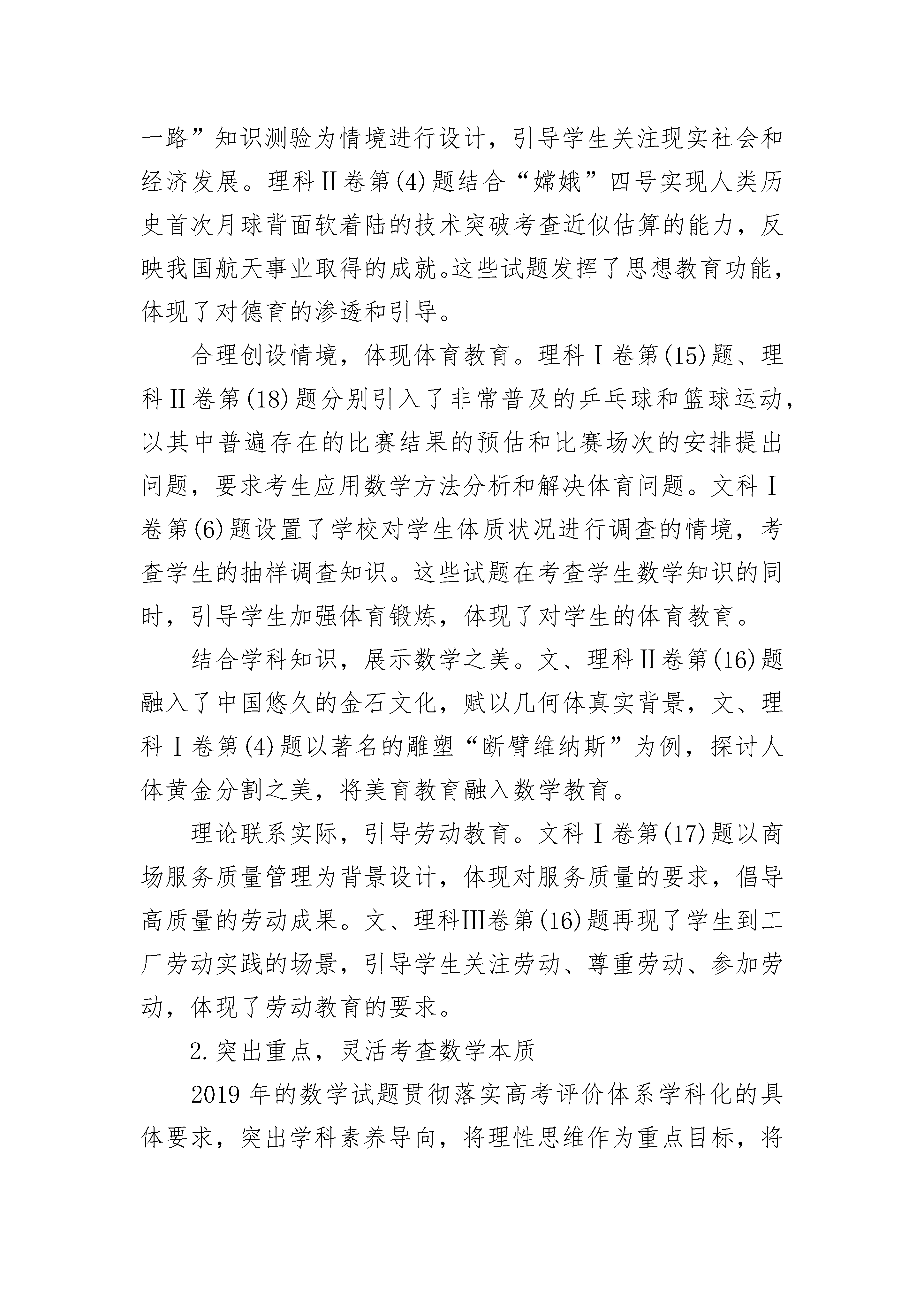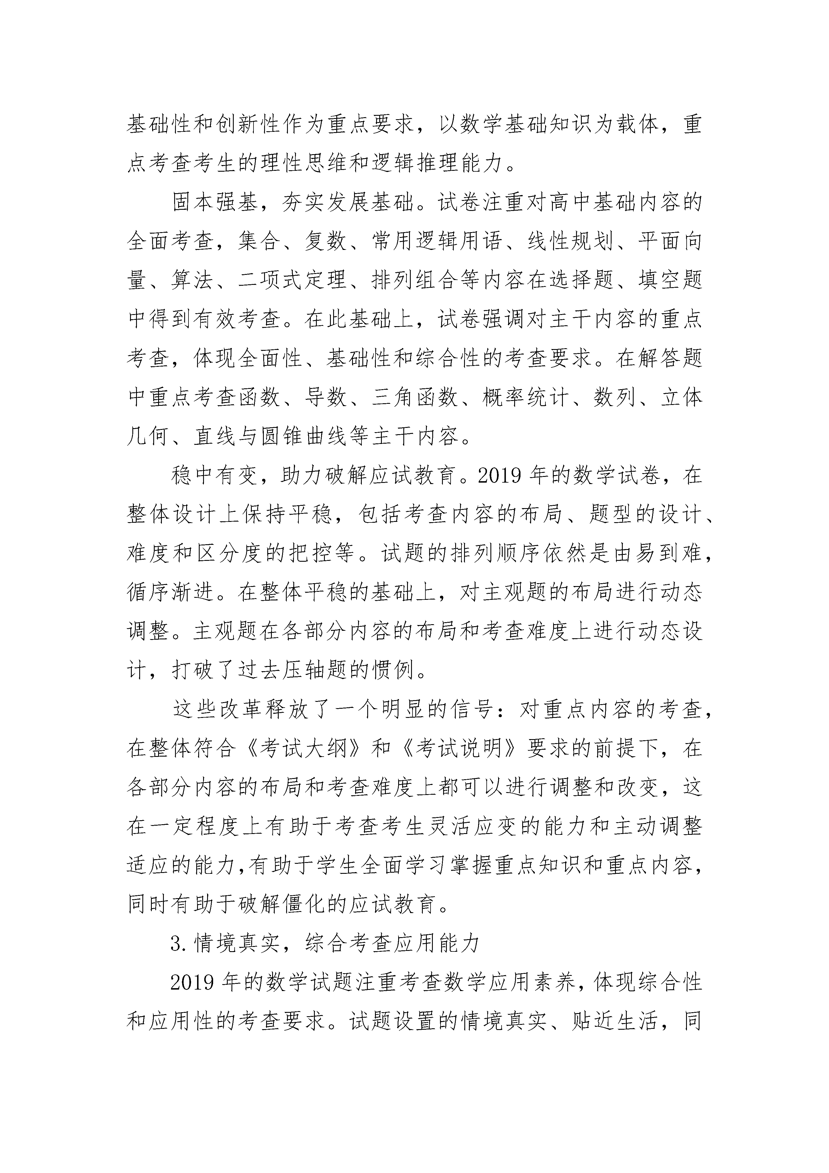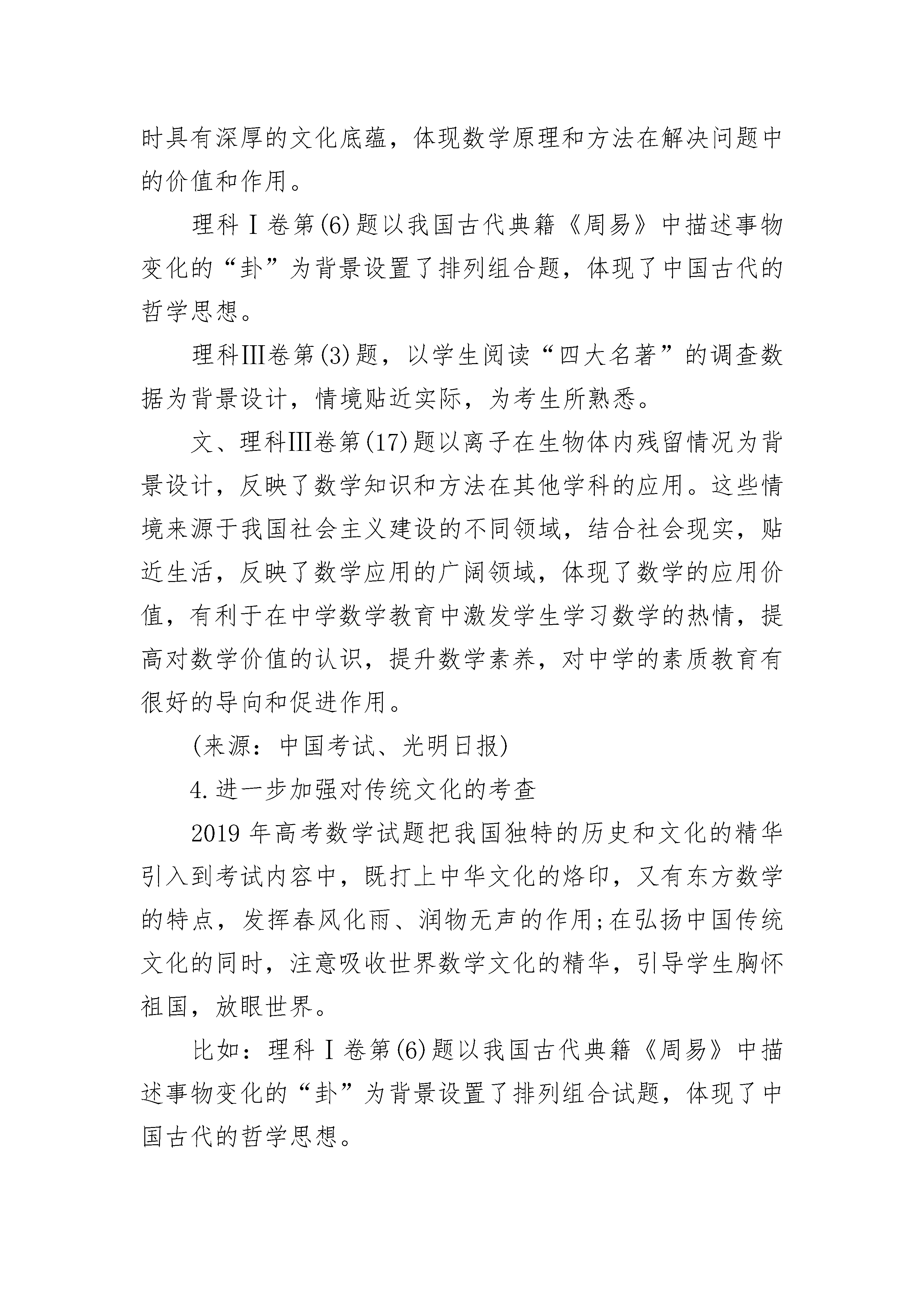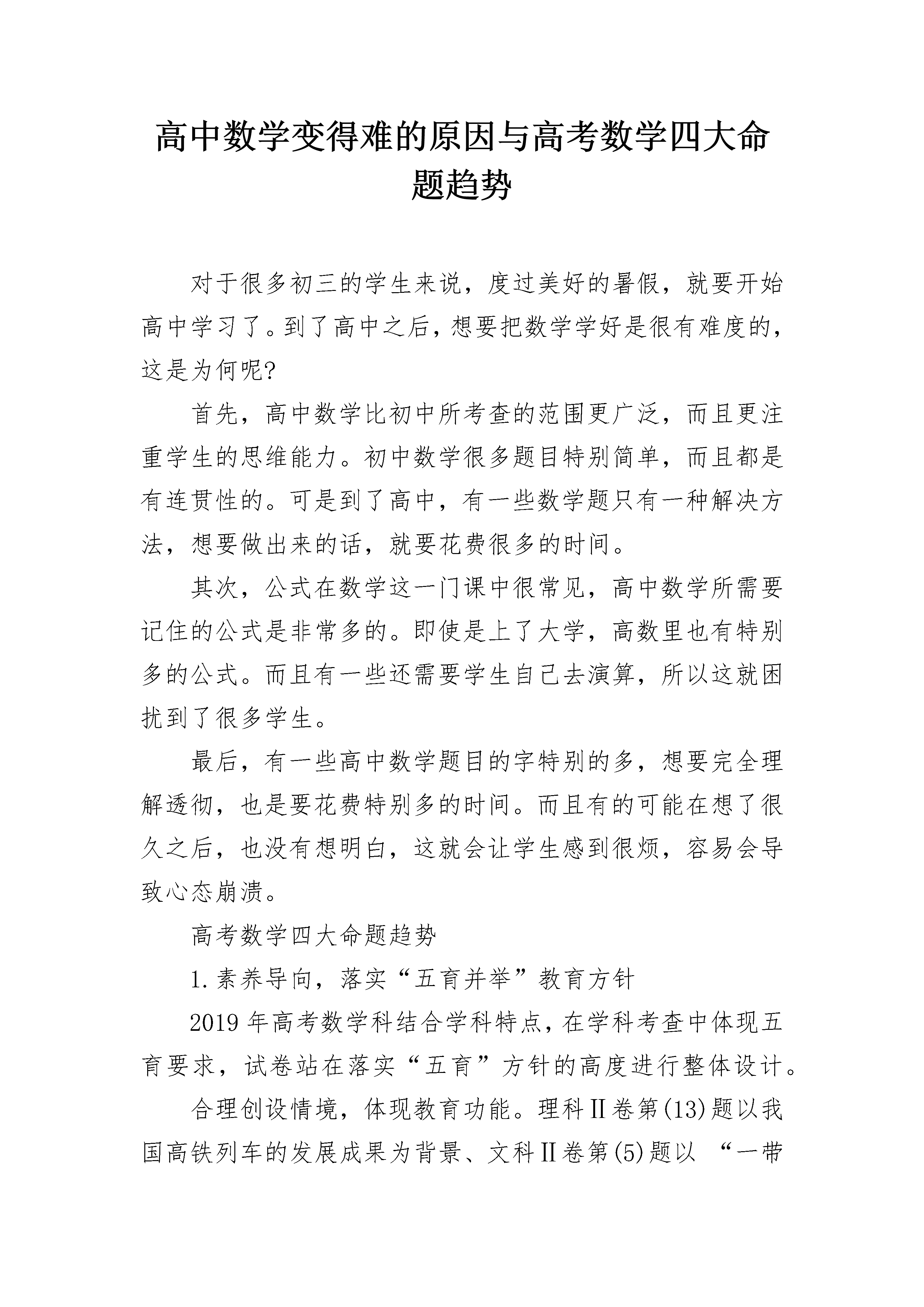 高中数学变得难的原因与高考数学四大命题趋势对于很多初三的学生来说,度过美好的暑假,就要开始高中学习了。到了高中之后,想要把数学学好是很有难度的,这是为何呢?首先,高中数学比初中所考查的范围更广泛,而且更注重学生的思维能力。初中数学很多题目特别简单,而且都是有连贯性的。可是到了高中,有一些数学题只有一种解决方法,想要做出来的话,就要花费很多的时间。其次,公式在数学这一门课中很常见,高中数学所需要记住的公式是非常多的。即使是上了大学,高数里也有特别多的公式。而且有一些还需要学生自己去演算,所以这就困扰到了很多学生。最后,有一些高中数学题目的字特别的多,想要完全理解透彻,也是要花费特别多的时间。而且有的可能在想了很久之后,也没有想明白,这就会让学生感到很烦,容易会导致心态崩溃。高考数学四大命题趋势1.素养导向,落实“五育并举”教育方针2019年高考数学科结合学科特点,在学科考查中体现五育要求,试卷站在落实“五育”方针的高度进行整体设计。合理创设情境,体现教育功能。理科Ⅱ卷第(13)题以我国高铁列车的发展成果为背景、文科Ⅱ卷第(5)题以“一带一路”知识测验为情境进行设计,引导学生关注现实社会和经济发展。理科Ⅱ卷第(4)题结合“嫦娥”四号实现人类历史首次月球背面软着陆的技术突破考查近似估算的能力,反映我国航天事业取得的成就。这些试题发挥了思想教育功能,体现了对德育的渗透和引导。合理创设情境,体现体育教育。理科Ⅰ卷第(15)题、理科Ⅱ卷第(18)题分别引入了非常普及的乒乓球和篮球运动,以其中普遍存在的比赛结果的预估和比赛场次的安排提出问题,要求考生应用数学方法分析和解决体育问题。文科Ⅰ卷第(6)题设置了学校对学生体质状况进行调查的情境,考查学生的抽样调查知识。这些试题在考查学生数学知识的同时,引导学生加强体育锻炼,体现了对学生的体育教育。结合学科知识,展示数学之美。文、理科Ⅱ卷第(16)题融入了中国悠久的金石文化,赋以几何体真实背景,文、理科Ⅰ卷第(4)题以著名的雕塑“断臂维纳斯”为例,探讨人体黄金分割之美,将美育教育融入数学教育。理论联系实际,引导劳动教育。文科Ⅰ卷第(17)题以商场服务质量管理为背景设计,体现对服务质量的要求,倡导高质量的劳动成果。文、理科Ⅲ卷第(16)题再现了学生到工厂劳动实践的场景,引导学生关注劳动、尊重劳动、参加劳动,体现了劳动教育的要求。2.突出重点,灵活考查数学本质2019年的数学试题贯彻落实高考评价体系学科化的具体要求,突出学科素养导向,将理性思维作为重点目标,将基础性和创新性作为重点要求,以数学基础知识为载体,重点考查考生的理性思维和逻辑推理能力。固本强基,夯实发展基础。试卷注重对高中基础内容的全面考查,集合、复数、常用逻辑用语、线性规划、平面向量、算法、二项式定理、排列组合等内容在选择题、填空题中得到有效考查。在此基础上,试卷强调对主干内容的重点考查,体现全面性、基础性和综合性的考查要求。在解答题中重点考查函数、导数、三角函数、概率统计、数列、立体几何、直线与圆锥曲线等主干内容。稳中有变,助力破解应试教育。2019年的数学试卷,在整体设计上保持平稳,包括考查内容的布局、题型的设计、难度和区分度的把控等。试题的排列顺序依然是由易到难,循序渐进。在整体平稳的基础上,对主观题的布局进行动态调整。主观题在各部分内容的布局和考查难度上进行动态设计,打破了过去压轴题的惯例。这些改革释放了一个明显的信号:对重点内容的考查,在整体符合《考试大纲》和《考试说明》要求的前提下,在各部分内容的布局和考查难度上都可以进行调整和改变,这在一定程度上有助于考查考生灵活应变的能力和主动调整适应的能力,有助于学生全面学习掌握重点知识和重点内容,同时有助于破解僵化的应试教育。3.情境真实,综合考查应用能力2019年的数学试题注重考查数学应用素养,体现综合性和应用性的考查要求。试题设置的情境真实、贴近生活,同时具有深厚的文化底蕴,体现数学原理和方法在解决问题中的价值和作用。理科Ⅰ卷第(6)题以我国古代典籍《周易》中描述事物变化的“卦”为背景设置了排列组合题,体现了中国古代的哲学思想。理科Ⅲ卷第(3)题,以学生阅读“四大名著”的调查数据为背景设计,情境贴近实际,为考生所熟悉。文、理科Ⅲ卷第(17)题以离子在生物体内残留情况为背景设计,反映了数学知识和方法在其他学科的应用。这些情境来源于我国社会主义建设的不同领域,结合社会现实,贴近生活,反映了数学应用的广阔领域,体现了数学的应用价值,有利于在中学数学教育中激发学生学习数学的热情,提高对数学价值的认识,提升数学素养,对中学的素质教育有很好的导向和促进作用。(来源:中国考试、光明日报)4.进一步加强对传统文化的考查2019年高考数学试题把我国独特的历史和文化的精华引入到考试内容中,既打上中华