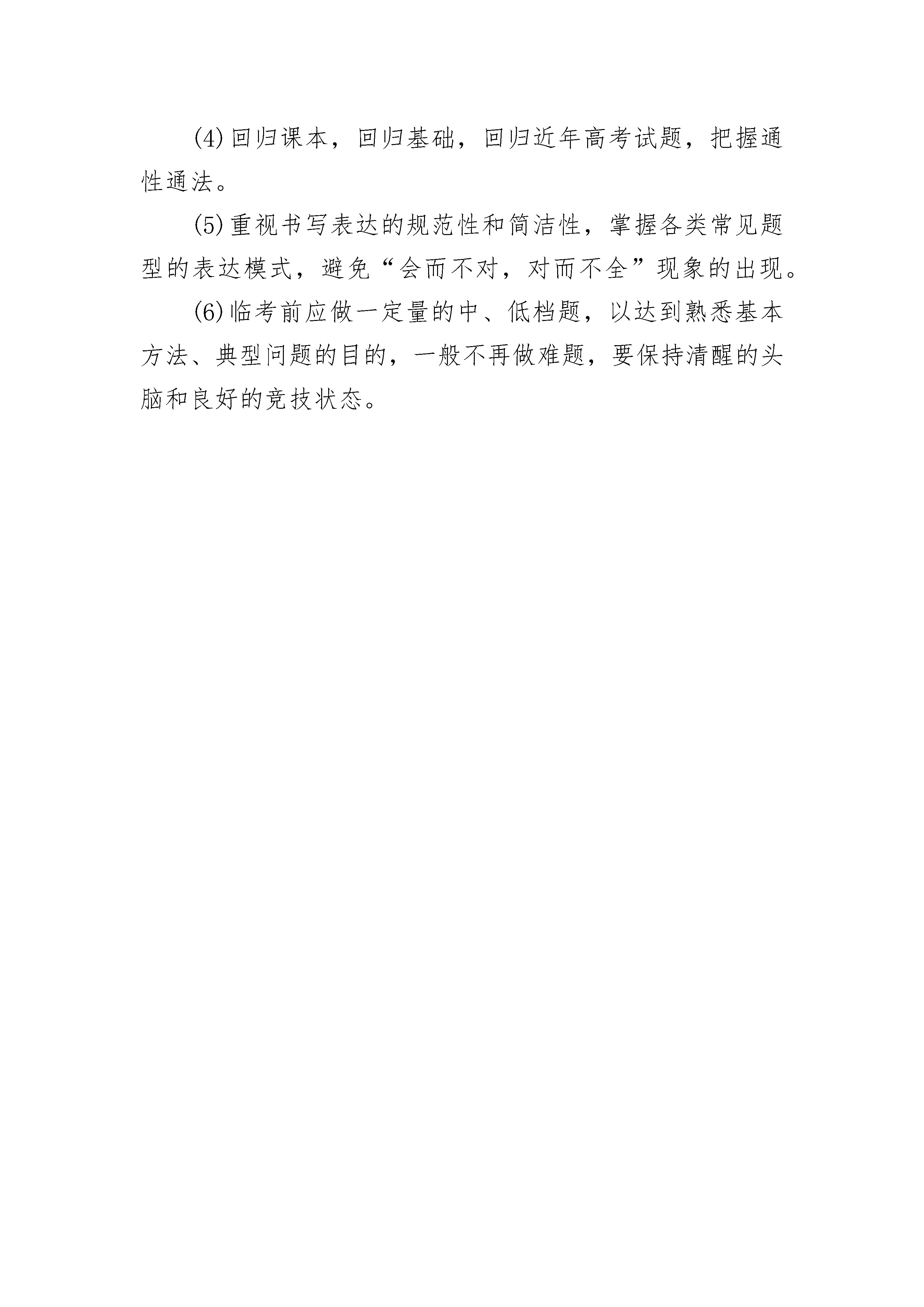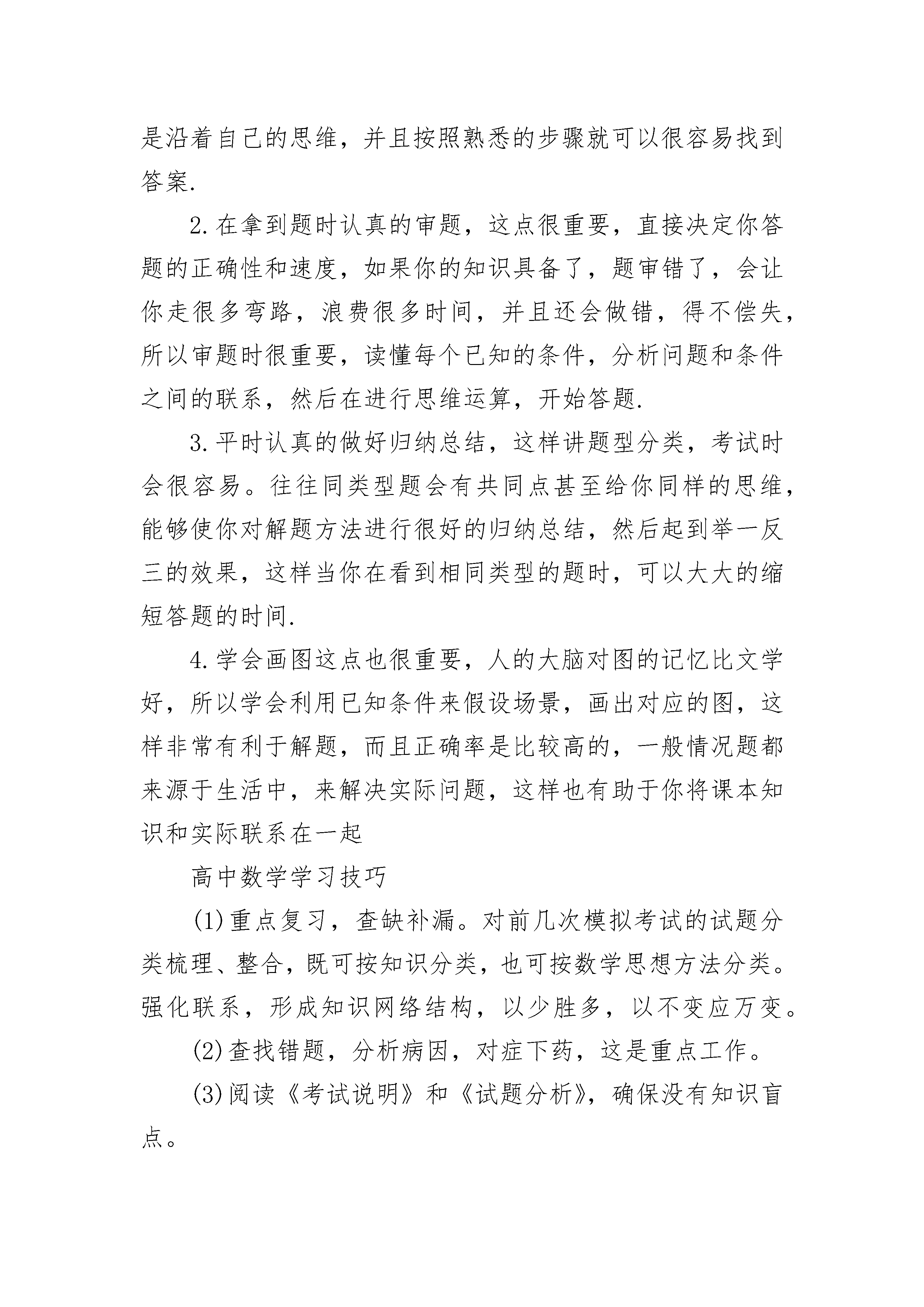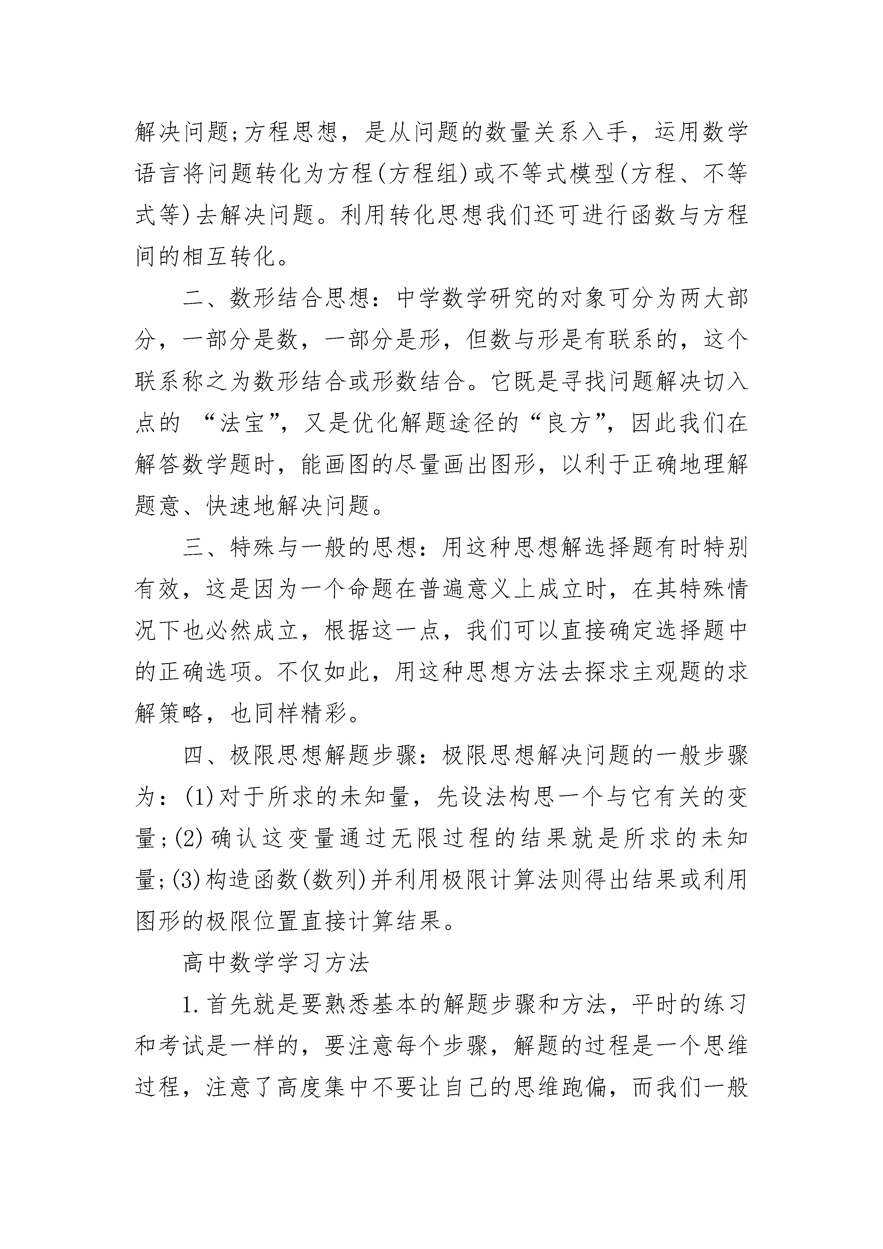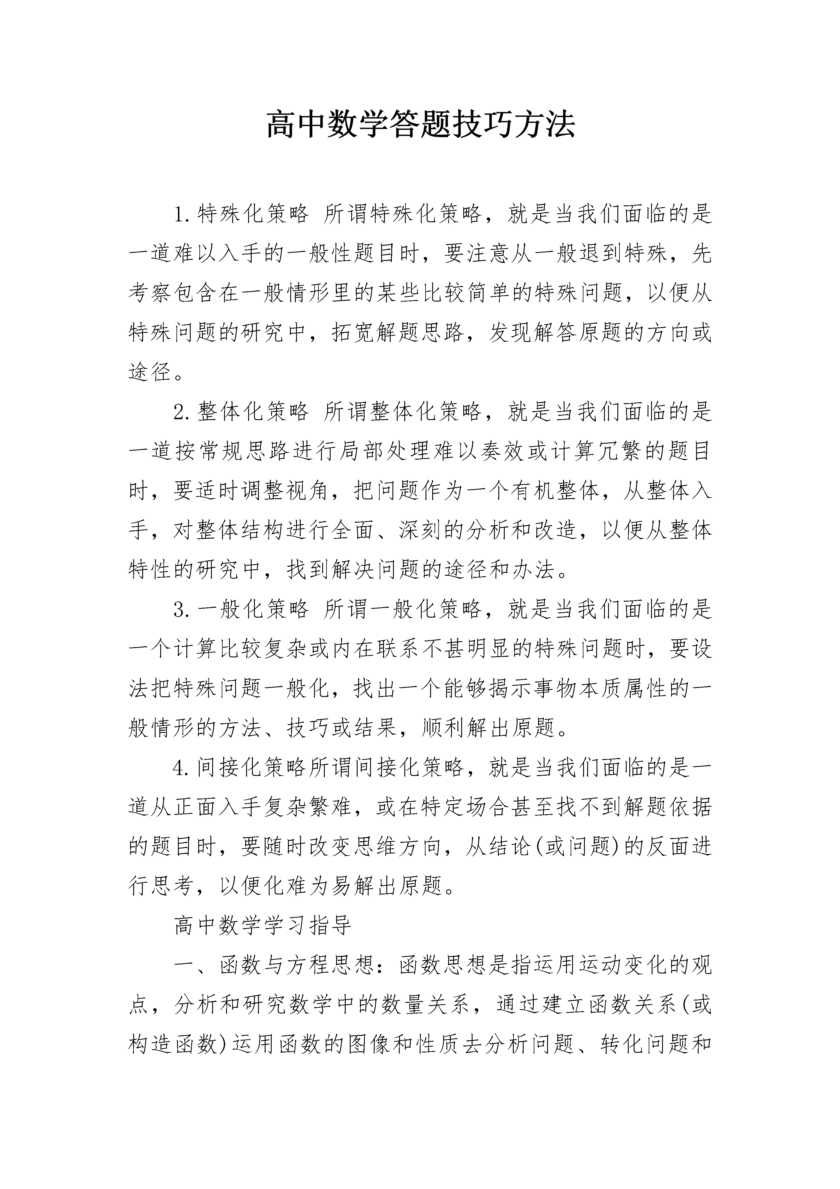 高中数学答题技巧方法1.特殊化策略所谓特殊化策略,就是当我们面临的是一道难以入手的一般性题目时,要注意从一般退到特殊,先考察包含在一般情形里的某些比较简单的特殊问题,以便从特殊问题的研究中,拓宽解题思路,发现解答原题的方向或途径。2.整体化策略所谓整体化策略,就是当我们面临的是一道按常规思路进行局部处理难以奏效或计算冗繁的题目时,要适时调整视角,把问题作为一个有机整体,从整体入手,对整体结构进行全面、深刻的分析和改造,以便从整体特性的研究中,找到解决问题的途径和办法。3.一般化策略所谓一般化策略,就是当我们面临的是一个计算比较复杂或内在联系不甚明显的特殊问题时,要设法把特殊问题一般化,找出一个能够揭示事物本质属性的一般情形的方法、技巧或结果,顺利解出原题。4.间接化策略所谓间接化策略,就是当我们面临的是一道从正面入手复杂繁难,或在特定场合甚至找不到解题依据的题目时,要随时改变思维方向,从结论(或问题)的反面进行思考,以便化难为易解出原题。高中数学学习指导一、函数与方程思想:函数思想是指运用运动变化的观点,分析和研究数学中的数量关系,通过建立函数关系(或构造函数)运用函数的图像和性质去分析问题、转化问题和解决问题;方程思想,是从问题的数量关系入手,运用数学语言将问题转化为方程(方程组)或不等式模型(方程、不等式等)去解决问题。利用转化思想我们还可进行函数与方程间的相互转化。二、数形结合思想:中学数学研究的对象可分为两大部分,一部分是数,一部分是形,但数与形是有联系的,这个联系称之为数形结合或形数结合。它既是寻找问题解决切入点的“法宝”,又是优化解题途径的“良方”,因此我们在解答数学题时,能画图的尽量画出图形,以利于正确地理解题意、快速地解决问题。三、特殊与一般的思想:用这种思想解选择题有时特别有效,这是因为一个命题在普遍意义上成立时,在其特殊情况下也必然成立,根据这一点,我们可以直接确定选择题中的正确选项。不仅如此,用这种思想方法去探求主观题的求解策略,也同样精彩。四、极限思想解题步骤:极限思想解决问题的一般步骤为:(1)对于所求的未知量,先设法构思一个与它有关的变量;(2)确认这变量通过无限过程的结果就是所求的未知量;(3)构造函数(数列)并利用极限计算法则得出结果或利用图形的极限位置直接计算结果。高中数学学习方法1.首先就是要熟悉基本的解题步骤和方法,平时的练习和考试是一样的,要注意每个步骤,解题的过程是一个思维过程,注意了高度集中不要让自己的思维跑偏,而我们一般是沿着自己的思维,并且按照熟悉的步骤就可以很容易找到答案.2.在拿到题时认真的审题,这点很重要,直接决定你答题的正确性和速度,如果你的知识具备了,题审错了,会让你走很多弯路,浪费很多时间,并且还会做错,得不偿失,所以审题时很重要,读懂每个已知的条件,分析问题和条件之间的联系,然后在进行思维运算,开始答题.3.平时认真的做好归纳总结,这样讲题型分类,考试时会很容易。往往同类型题会有共同点甚至给你同样的思维,能够使你对解题方法进行很好的归纳总结,然后起到举一反三的效果,这样当你在看到相同类型的题时,可以大大的缩短答题的时间.4.学会画图这点也很重要,人的大脑对图的记忆比文学好,所以学会利用已知条件来假设场景,画出对应的图,这样非常有利于解题,而且正确率是比较高的,一般情况题都来源于生活中,来解决实际问题,这样也有助于你将课本知识和实际联系在一起高中数学学习技巧(1)重点复习,查缺补漏。对前几次模拟考试的试题分类梳理、整合,既可按知识分类,也可按数学思想方法分类。强化联系,形成知识网络结构,以少胜多,以不变应万变。(2)查找错题,分析病因,对症下药,这是重点工作。(3)阅读《考试说明》和《试题分析》,确保没有知识盲点。(4)回归课本,回归基础,回归近年高考试题,把握通性通法。(5)重视书写表达的规范性和简洁性,掌握各类常见题型的表达模式,避免“会而不对,对而不全”现象的出现。(6)临考前应做一定量的中、低档题,以达到熟悉基本方法、典型问题的目的,一般不再做难题,要保持清醒的头脑和良好的竞技状态。