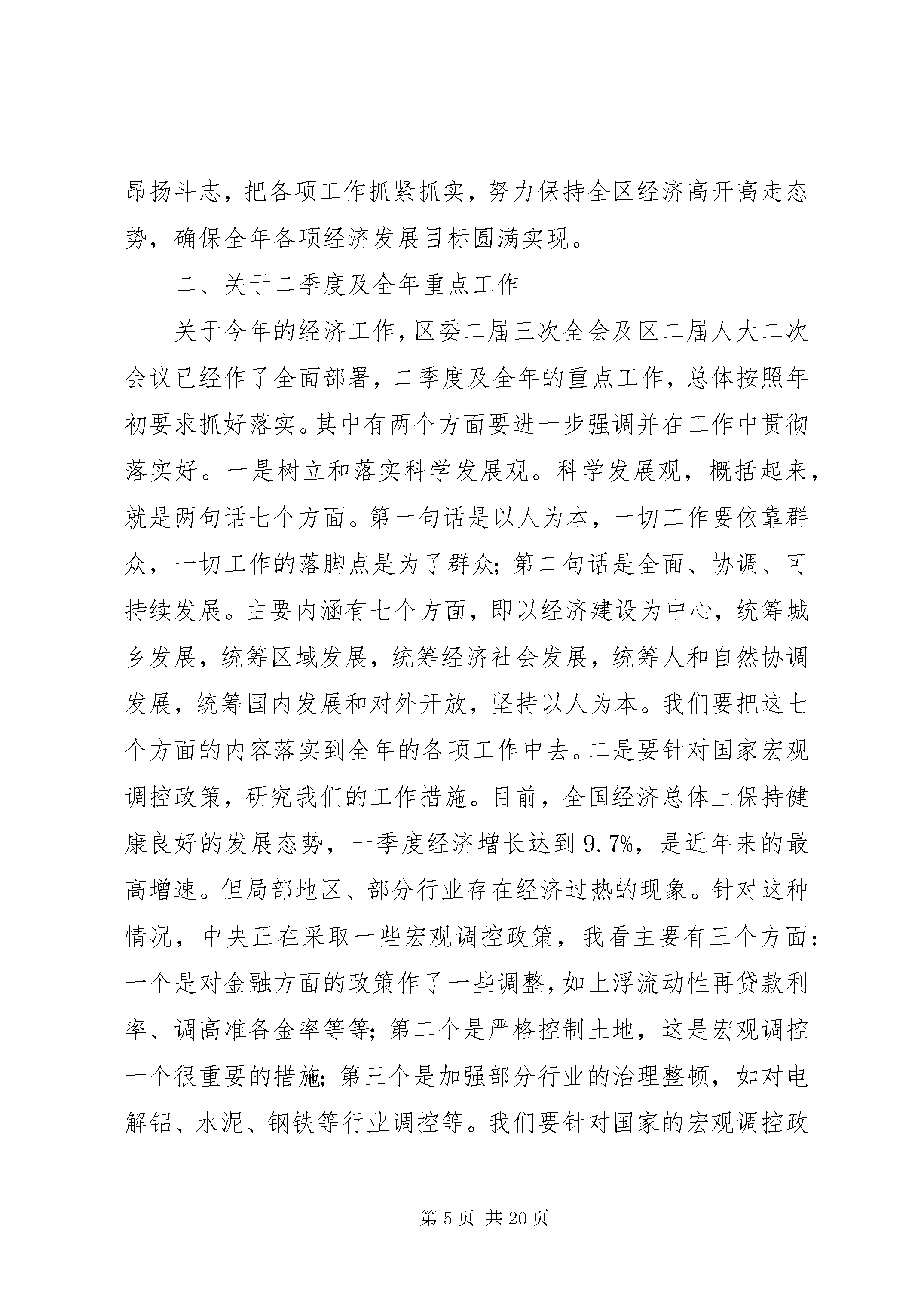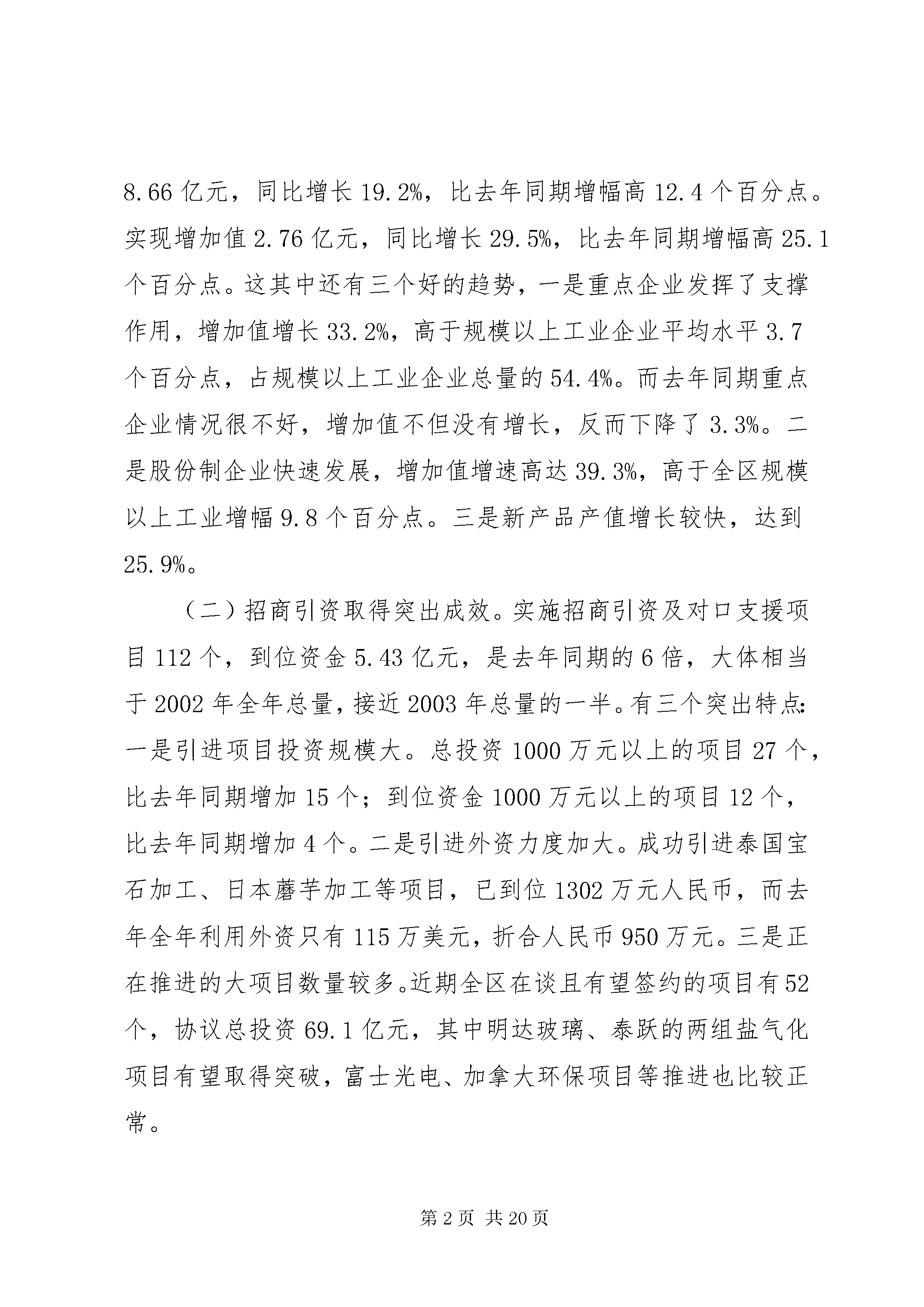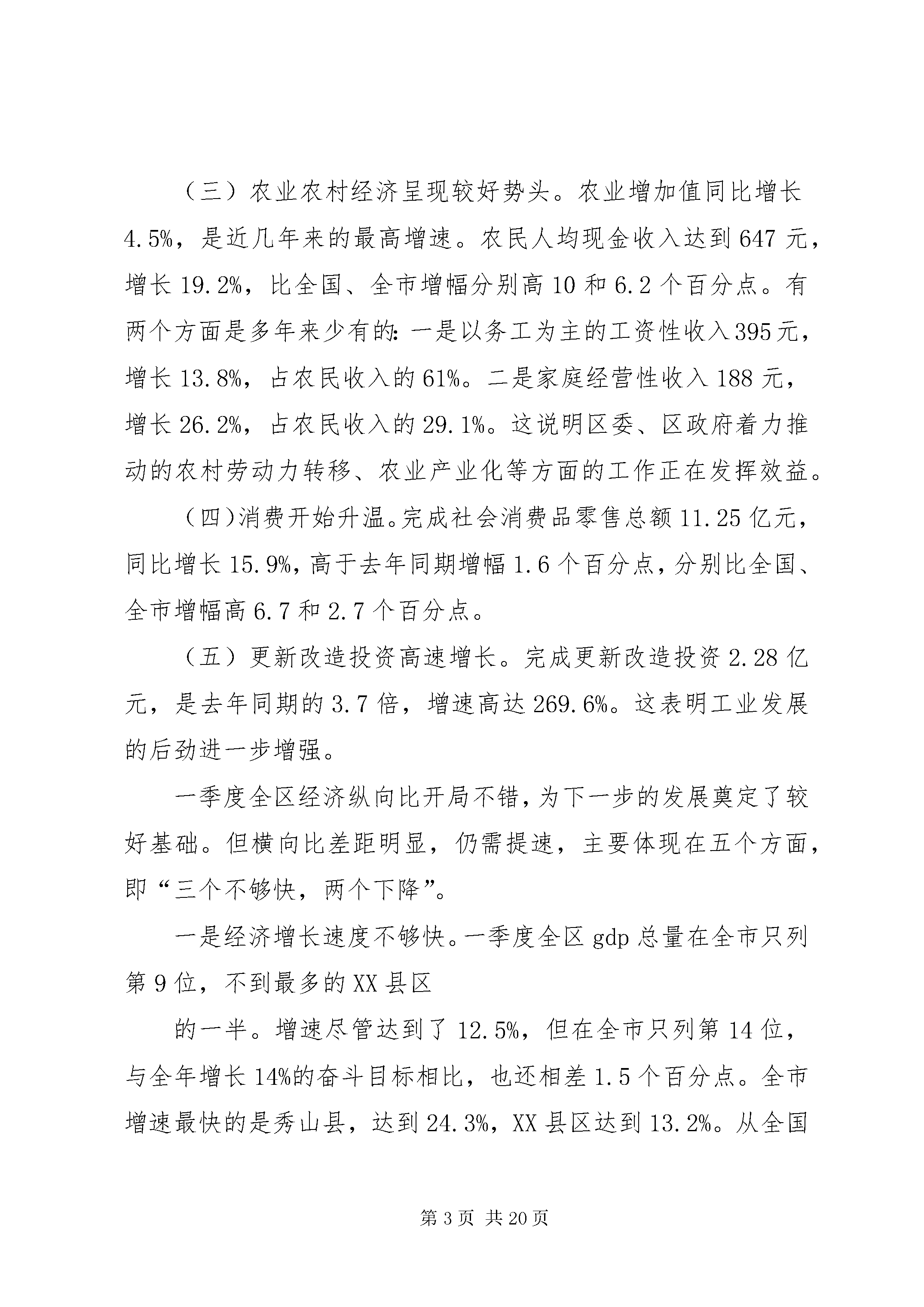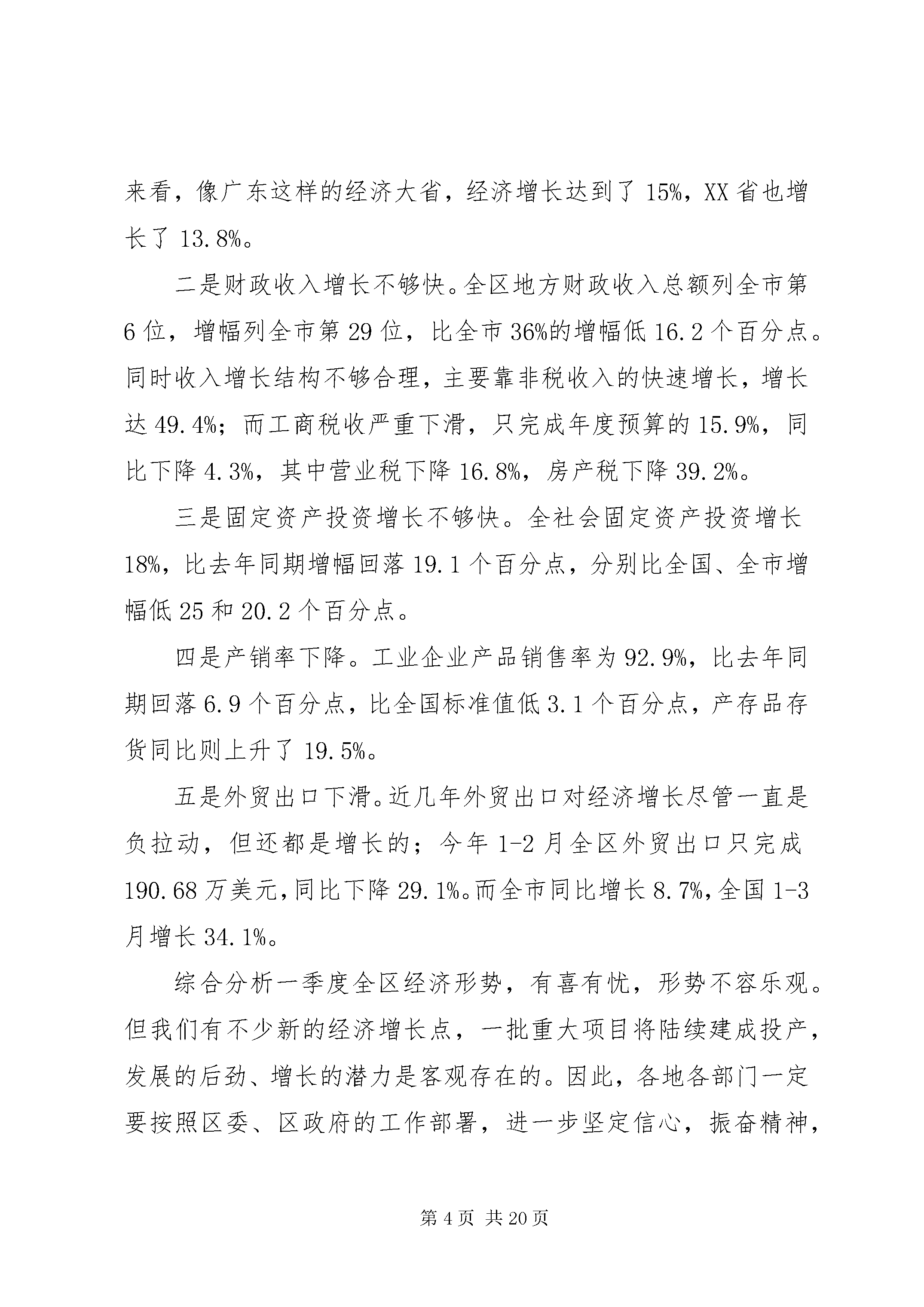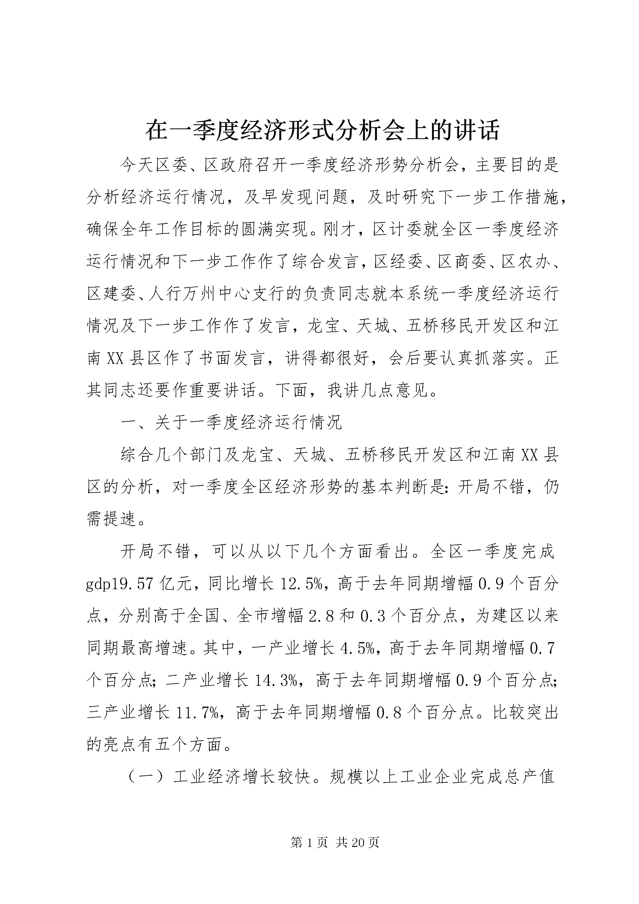 在一季度经济形式分析会上的讲话今天区委、区政府召开一季度经济形势分析会,主要目的是分析经济运行情况,及早发现问题,及时研究下一步工作措施,确保全年工作目标的圆满实现。刚才,区计委就全区一季度经济运行情况和下一步工作作了综合发言,区经委、区商委、区农办、区建委、人行万州中心支行的负责同志就本系统一季度经济运行情况及下一步工作作了发言,龙宝、天城、五桥移民开发区和江南XX县区作了书面发言,讲得都很好,会后要认真抓落实。正其同志还要作重要讲话。下面,我讲几点意见。一、关于一季度经济运行情况综合几个部门及龙宝、天城、五桥移民开发区和江南XX县区的分析,对一季度全区经济形势的基本判断是:开局不错,仍需提速。开局不错,可以从以下几个方面看出。全区一季度完成gdp19.57亿元,同比增长12.5%,高于去年同期增幅0.9个百分点,分别高于全国、全市增幅2.8和0.3个百分点,为建区以来同期最高增速。其中,一产业增长4.5%,高于去年同期增幅0.7个百分点;二产业增长14.3%,高于去年同期增幅0.9个百分点;三产业增长11.7%,高于去年同期增幅0.8个百分点。比较突出的亮点有五个方面。(一)工业经济增长较快。规模以上工业企业完成总产值8.66亿元,同比增长19.2%,比去年同期增幅高12.4个百分点。实现增加值2.76亿元,同比增长29.5%,比去年同期增幅高25.1个百分点。这其中还有三个好的趋势,一是重点企业发挥了支撑作用,增加值增长33.2%,高于规模以上工业企业平均水平3.7个百分点,占规模以上工业企业总量的54.4%。而去年同期重点企业情况很不好,增加值不但没有增长,反而下降了3.3%。二是股份制企业快速发展,增加值增速高达39.3%,高于全区规模以上工业增幅9.8个百分点。三是新产品产值增长较快,达到25.9%。(二)招商引资取得突出成效。实施招商引资及对口支援项目112个,到位资金5.43亿元,是去年同期的6倍,大体相当于2002年全年总量,接近2003年总量的一半。有三个突出特点:一是引进项目投资规模大。总投资1000万元以上的项目27个,比去年同期增加15个;到位资金1000万元以上的项目12个,比去年同期增加4个。二是引进外资力度加大。成功引进泰国宝石加工、日本蘑芋加工等项目,已到位1302万元人民币,而去年全年利用外资只有115万美元,折合人民币950万元。三是正在推进的大项目数量较多。近期全区在谈且有望签约的项目有52个,协议总投资69.1亿元,其中明达玻璃、泰跃的两组盐气化项目有望取得突破,富士光电、加拿大环保项目等推进也比较正常。(三)农业农村经济呈现较好势头。农业增加值同比增长4.5%,是近几年来的最高增速。农民人均现金收入达到647元,增长19.2%,比全国、全市增幅分别高10和6.2个百分点。有两个方面是多年来少有的:一是以务工为主的工资性收入395元,增长13.8%,占农民收入的61%。二是家庭经营性收入188元,增长26.2%,占农民收入的29.1%。这说明区委、区政府着力推动的农村劳动力转移、农业产业化等方面的工作正在发挥效益。(四)消费开始升温。完成社会消费品零售总额11.25亿元,同比增长15.9%,高于去年同期增幅1.6个百分点,分别比全国、全市增幅高6.7和2.7个百分点。(五)更新改造投资高速增长。完成更新改造投资2.28亿元,是去年同期的3.7倍,增速高达269.6%。这表明工业发展的后劲进一步增强。一季度全区经济纵向比开局不错,为下一步的发展奠定了较好基础。但横向比差距明显,仍需提速,主要体现在五个方面,即“三个不够快,两个下降”。一是经济增长速度不够快。一季度全区gdp总量在全市只列第9位,不到最多的XX县区的一半。增速尽管达到了12.5%,但在全市只列第14位,与全年增长14%的奋斗目标相比,也还相差1.5个百分点。全市增速最快的是秀山县,达到24.3%,XX县区达到13.2%。从全国来看,像广东这样的经济大省,经济增长达到了15%,XX省也增长了13.8%。二是财政收入增长不够快。全区地方财政收入总额列全市第6位,增幅列全市第29位,比全市36%的增幅低16.2个百分点。同时收入增长结构不够合理,主要靠非税收入的快速增长,增长达49.4%;而工商税收严重下滑,只完成年度预算的15.9%,同比下降4.3%,其中营业税下降16.8%,房产税下降39.2%。三是固定资产投资增长不够快。全社会固定资产投资增长18%,比去年同期增幅回落19.1个百分点,分别比全国、全市增幅低25和20.2个百分点。四是产销率下降。工业企业产品销售率为92.9%,比去年同期回落6.9个百分点,比全国标准值低3.1个百分点,产存品存货同比则上升了19.5%。五是外贸出口下滑。近几年外贸出口对经济增长尽管一直是