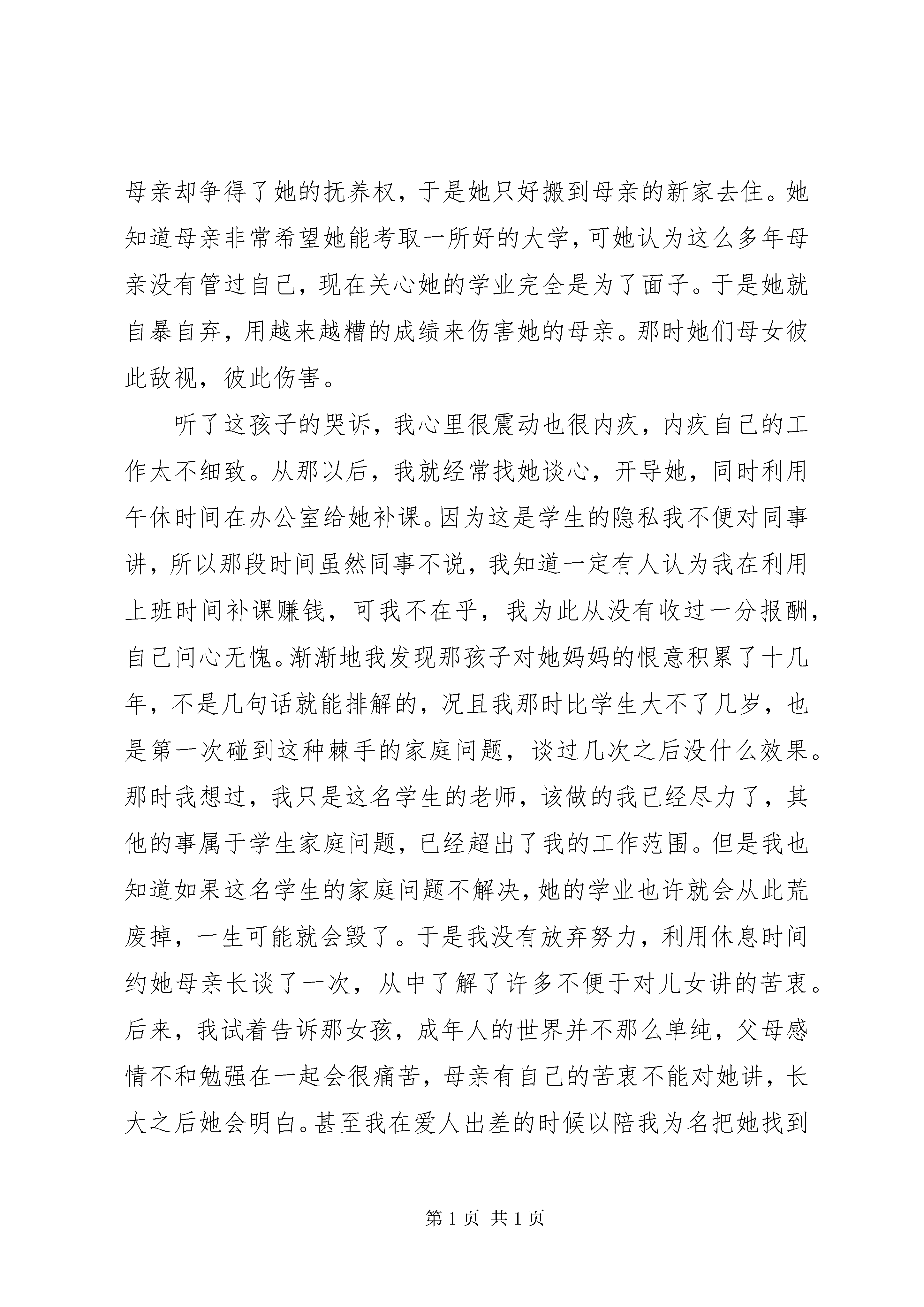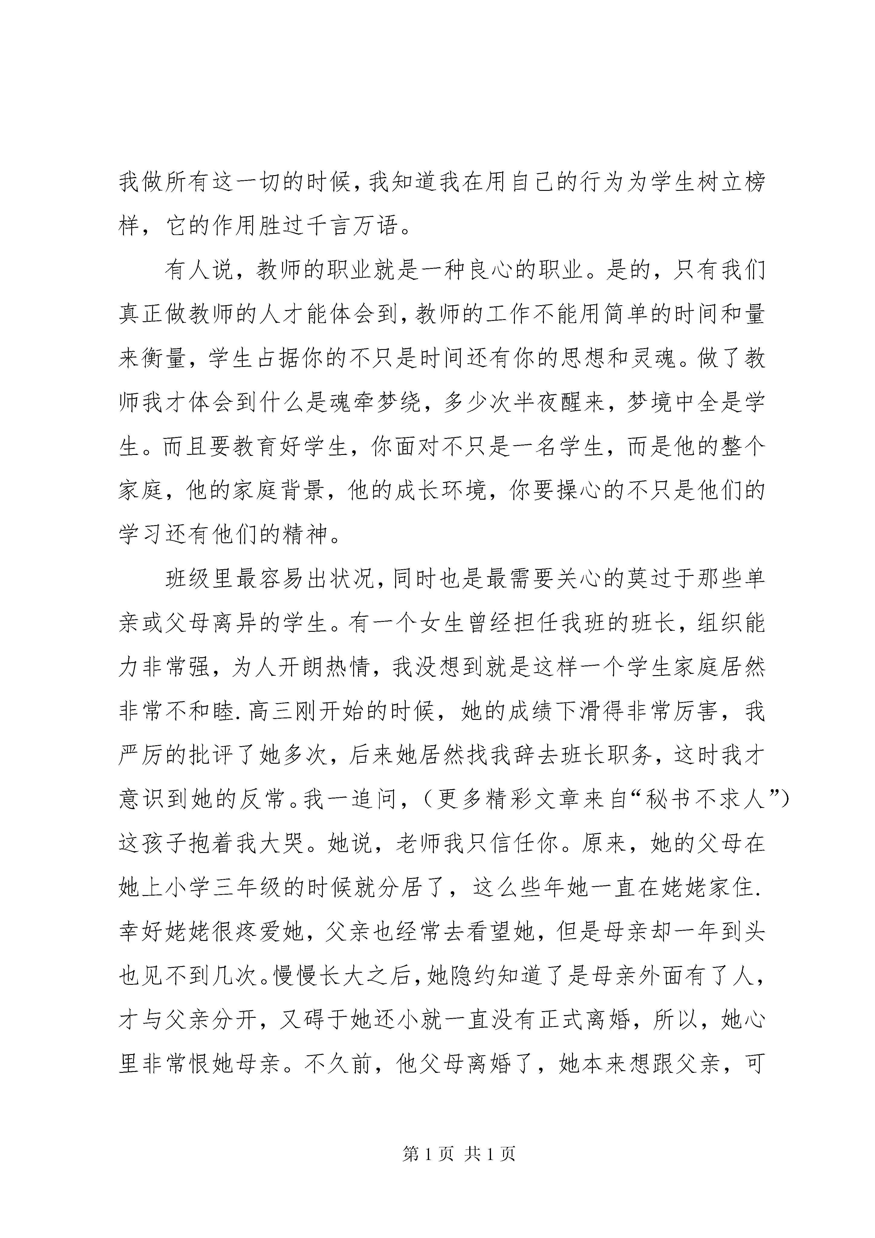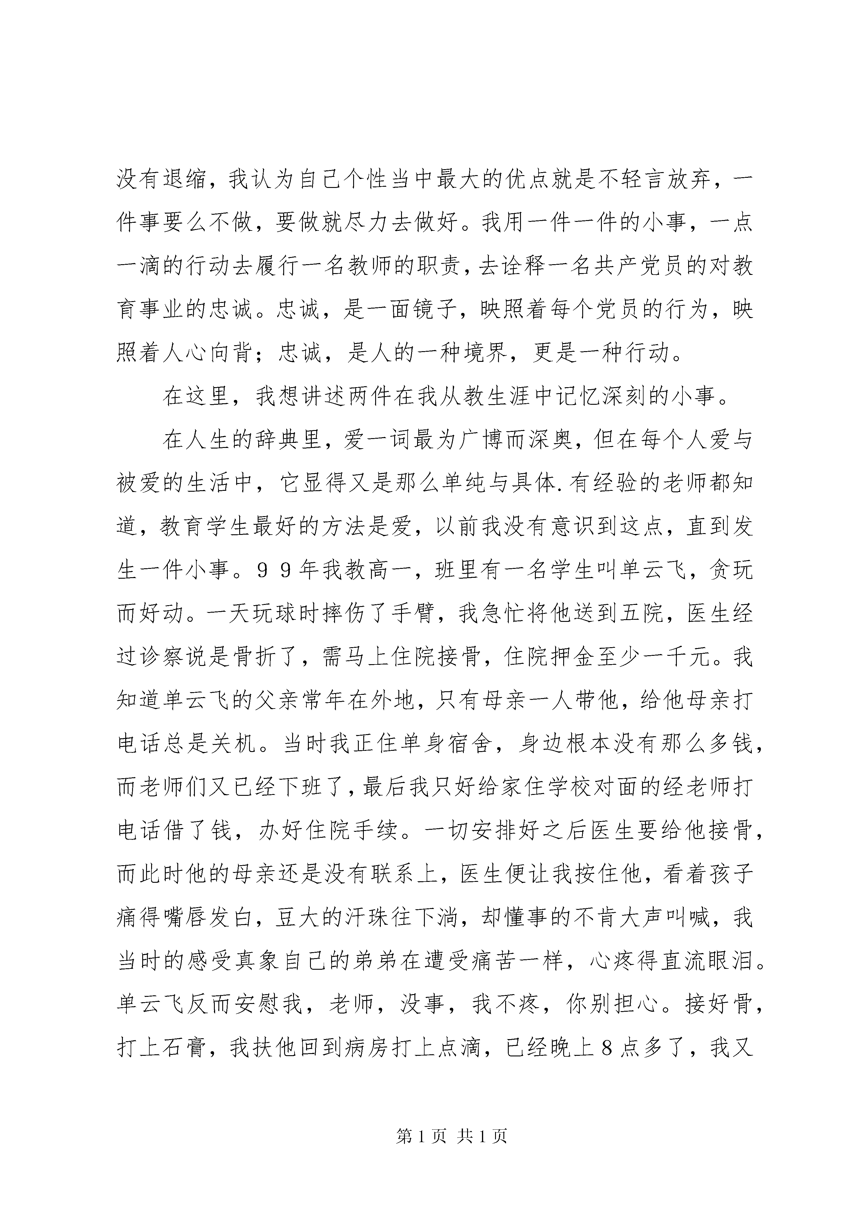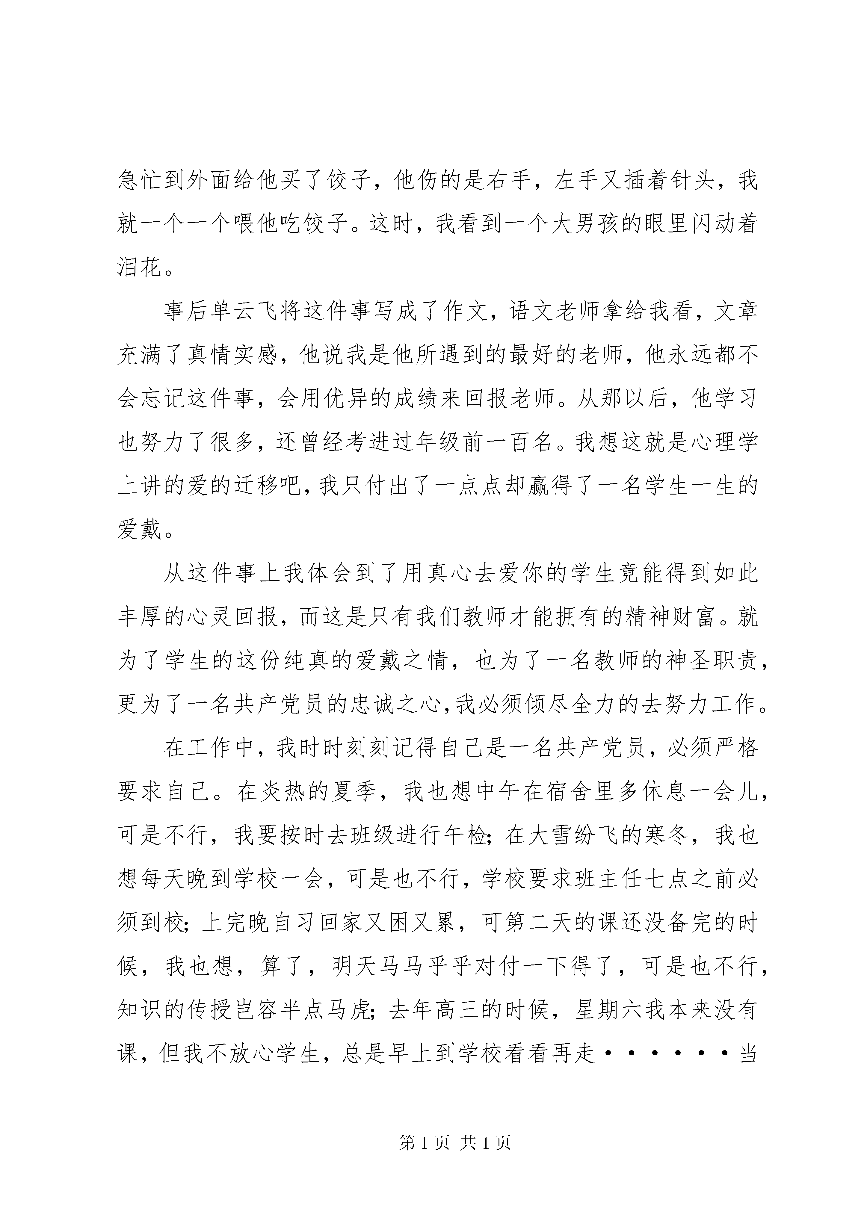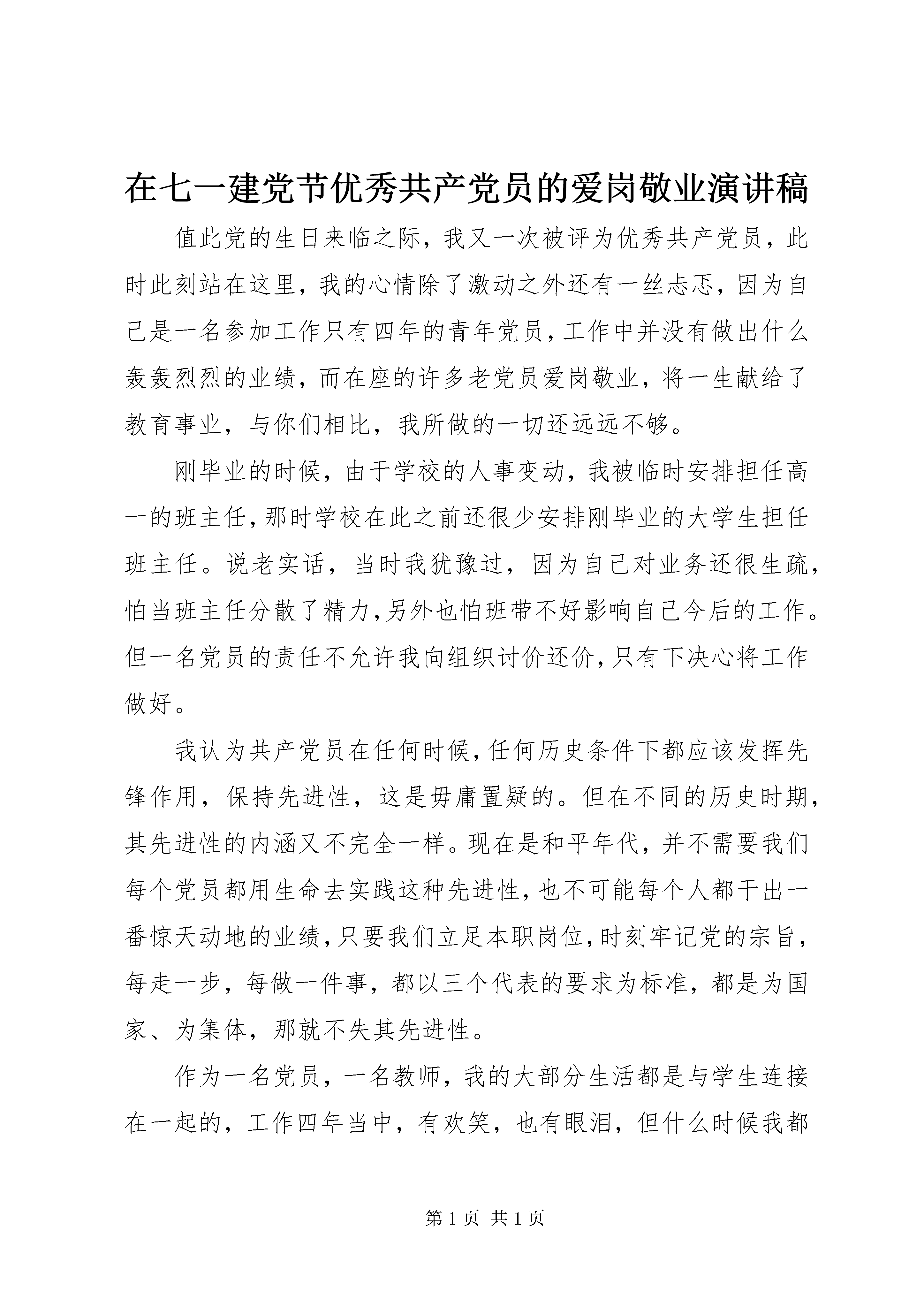 在七一建党节优秀共产党员的爱岗敬业演讲稿值此党的生日来临之际,我又一次被评为优秀共产党员,此时此刻站在这里,我的心情除了激动之外还有一丝忐忑,因为自己是一名参加工作只有四年的青年党员,工作中并没有做出什么轰轰烈烈的业绩,而在座的许多老党员爱岗敬业,将一生献给了教育事业,与你们相比,我所做的一切还远远不够。刚毕业的时候,由于学校的人事变动,我被临时安排担任高一的班主任,那时学校在此之前还很少安排刚毕业的大学生担任班主任。说老实话,当时我犹豫过,因为自己对业务还很生疏,怕当班主任分散了精力,另外也怕班带不好影响自己今后的工作。但一名党员的责任不允许我向组织讨价还价,只有下决心将工作做好。我认为共产党员在任何时候,任何历史条件下都应该发挥先锋作用,保持先进性,这是毋庸置疑的。但在不同的历史时期,其先进性的内涵又不完全一样。现在是和平年代,并不需要我们每个党员都用生命去实践这种先进性,也不可能每个人都干出一番惊天动地的业绩,只要我们立足本职岗位,时刻牢记党的宗旨,每走一步,每做一件事,都以三个代表的要求为标准,都是为国家、为集体,那就不失其先进性。作为一名党员,一名教师,我的大部分生活都是与学生连接在一起的,工作四年当中,有欢笑,也有眼泪,但什么时候我都没有退缩,我认为自己个性当中最大的优点就是不轻言放弃,一件事要么不做,要做就尽力去做好。我用一件一件的小事,一点一滴的行动去履行一名教师的职责,去诠释一名共产党员的对教育事业的忠诚。忠诚,是一面镜子,映照着每个党员的行为,映照着人心向背;忠诚,是人的一种境界,更是一种行动。在这里,我想讲述两件在我从教生涯中记忆深刻的小事。在人生的辞典里,爱一词最为广博而深奥,但在每个人爱与被爱的生活中,它显得又是那么单纯与具体.有经验的老师都知道,教育学生最好的方法是爱,以前我没有意识到这点,直到发生一件小事。99年我教高一,班里有一名学生叫单云飞,贪玩而好动。一天玩球时摔伤了手臂,我急忙将他送到五院,医生经过诊察说是骨折了,需马上住院接骨,住院押金至少一千元。我知道单云飞的父亲常年在外地,只有母亲一人带他,给他母亲打电话总是关机。当时我正住单身宿舍,身边根本没有那么多钱,而老师们又已经下班了,最后我只好给家住学校对面的经老师打电话借了钱,办好住院手续。一切安排好之后医生要给他接骨,而此时他的母亲还是没有联系上,医生便让我按住他,看着孩子痛得嘴唇发白,豆大的汗珠往下淌,却懂事的不肯大声叫喊,我当时的感受真象自己的弟弟在遭受痛苦一样,心疼得直流眼泪。单云飞反而安慰我,老师,没事,我不疼,你别担心。接好骨,打上石膏,我扶他回到病房打上点滴,已经晚上8点多了,我又急忙到外面给他买了饺子,他伤的是右手,左手又插着针头,我就一个一个喂他吃饺子。这时,我看到一个大男孩的眼里闪动着泪花。事后单云飞将这件事写成了作文,语文老师拿给我看,文章充满了真情实感,他说我是他所遇到的最好的老师,他永远都不会忘记这件事,会用优异的成绩来回报老师。从那以后,他学习也努力了很多,还曾经考进过年级前一百名。我想这就是心理学上讲的爱的迁移吧,我只付出了一点点却赢得了一名学生一生的爱戴。从这件事上我体会到了用真心去爱你的学生竟能得到如此丰厚的心灵回报,而这是只有我们教师才能拥有的精神财富。就为了学生的这份纯真的爱戴之情,也为了一名教师的神圣职责,更为了一名共产党员的忠诚之心,我必须倾尽全力的去努力工作。在工作中,我时时刻刻记得自己是一名共产党员,必须严格要求自己。在炎热的夏季,我也想中午在宿舍里多休息一会儿,可是不行,我要按时去班级进行午检;在大雪纷飞的寒冬,我也想每天晚到学校一会,可是也不行,学校要求班主任七点之前必须到校;上完晚自习回家又困又累,可第二天的课还没备完的时候,我也想,算了,明天马马乎乎对付一下得了,可是也不行,知识的传授岂容半点马虎;去年高三的时候,星期六我本来没有课,但我不放心学生,总是早上到学校看看再走······当我做所有这一切的时候,我知道我在用自己的行为为学生树立榜样,它的作用胜过千言万语。有人说,教师的职业就是一种良心的职业。是的,只有我们真正做教师的人才能体会到,教师的工作不能用简单的时间和量来衡量,学生占据你的不只是时间还有你的思想和灵魂。做了教师我才体会到什么是魂牵梦绕,多少次半夜醒来,梦境中全是学生。而且要教育好学生,你面对不只是一名学生,而是他的整个家庭,他的家庭背景,他的成长环境,你要操心的不只是他们的学习还有他们的精神。班级里最容易出状况,同时也是最需要关心的莫过于那些单亲或父母离异的学生。有一个女生曾经担任我班的班长,组织能力非常强,为人开朗热情,我没想到就是这样一个学生家庭居然非常不和睦.高三刚开始的时候,她的成绩下滑得非常厉害,我严厉的批评了她多次,后来她居然找我