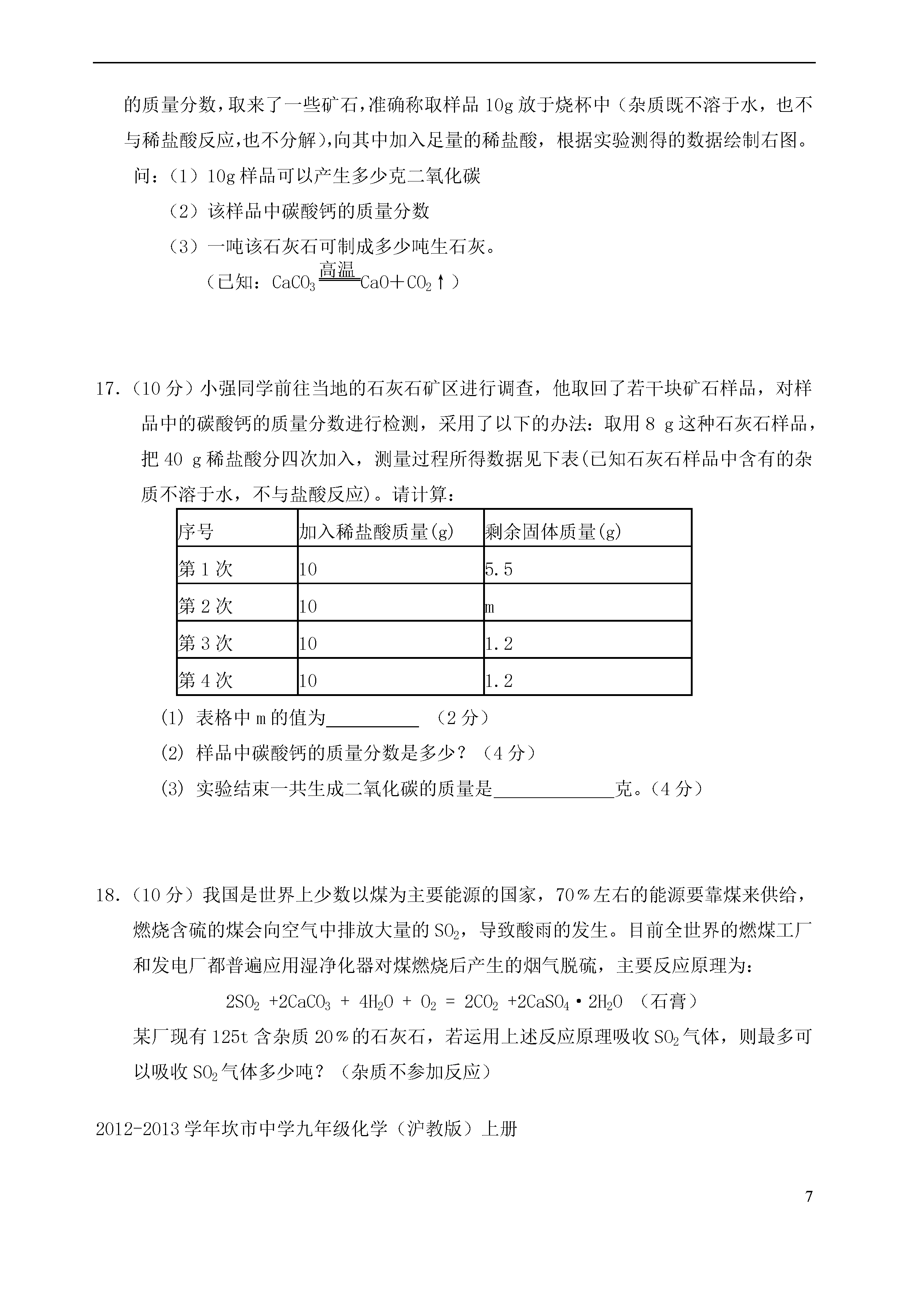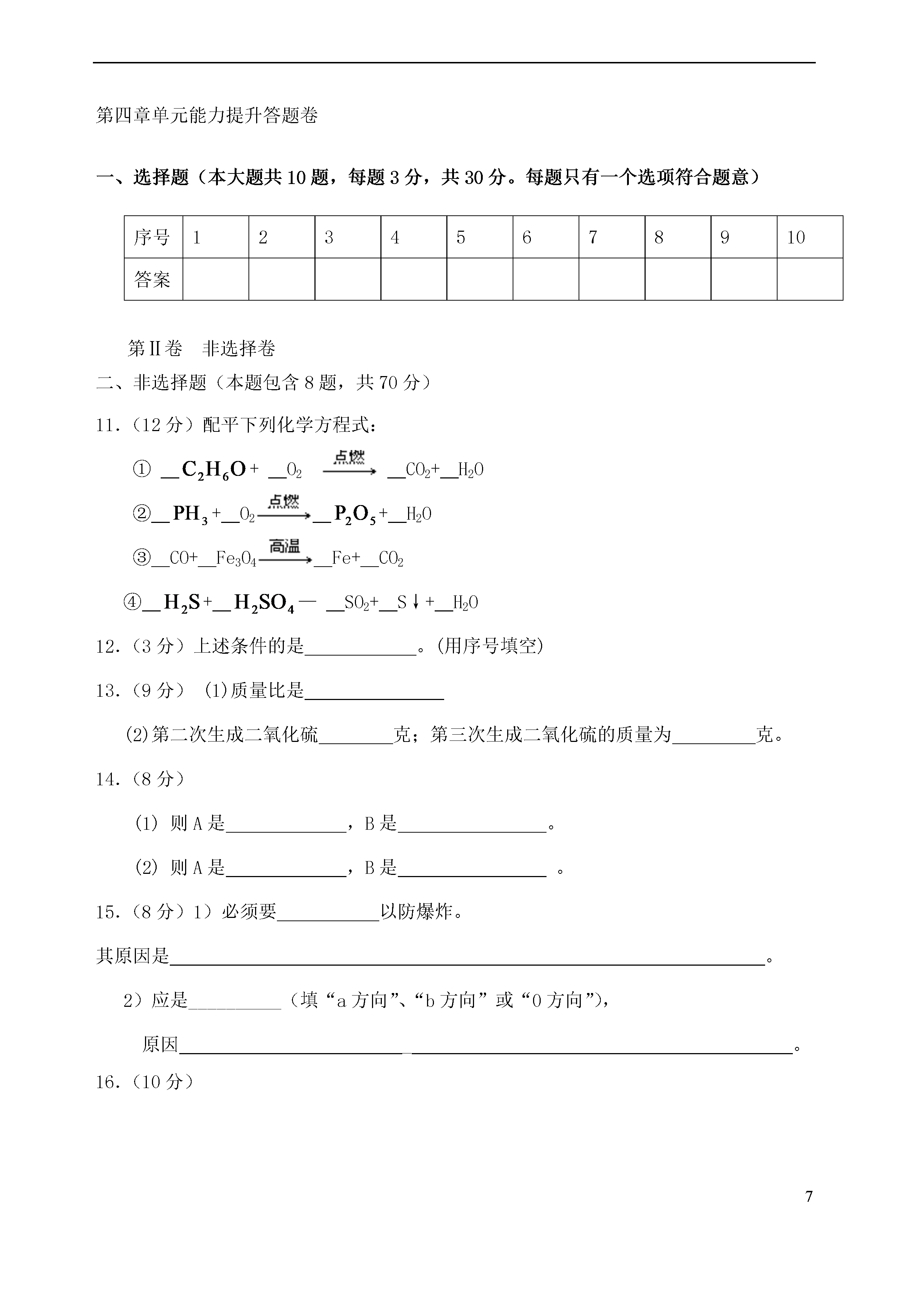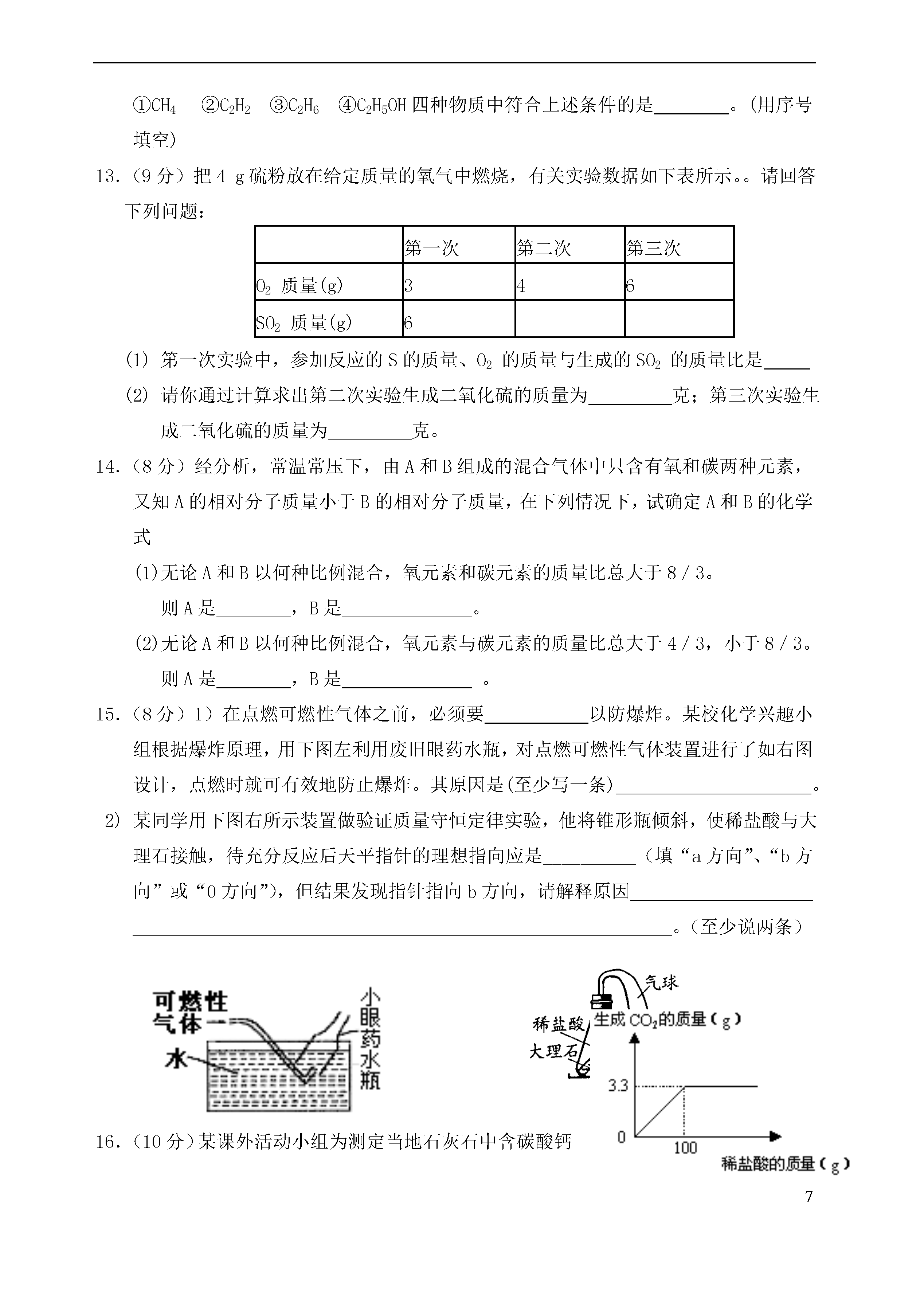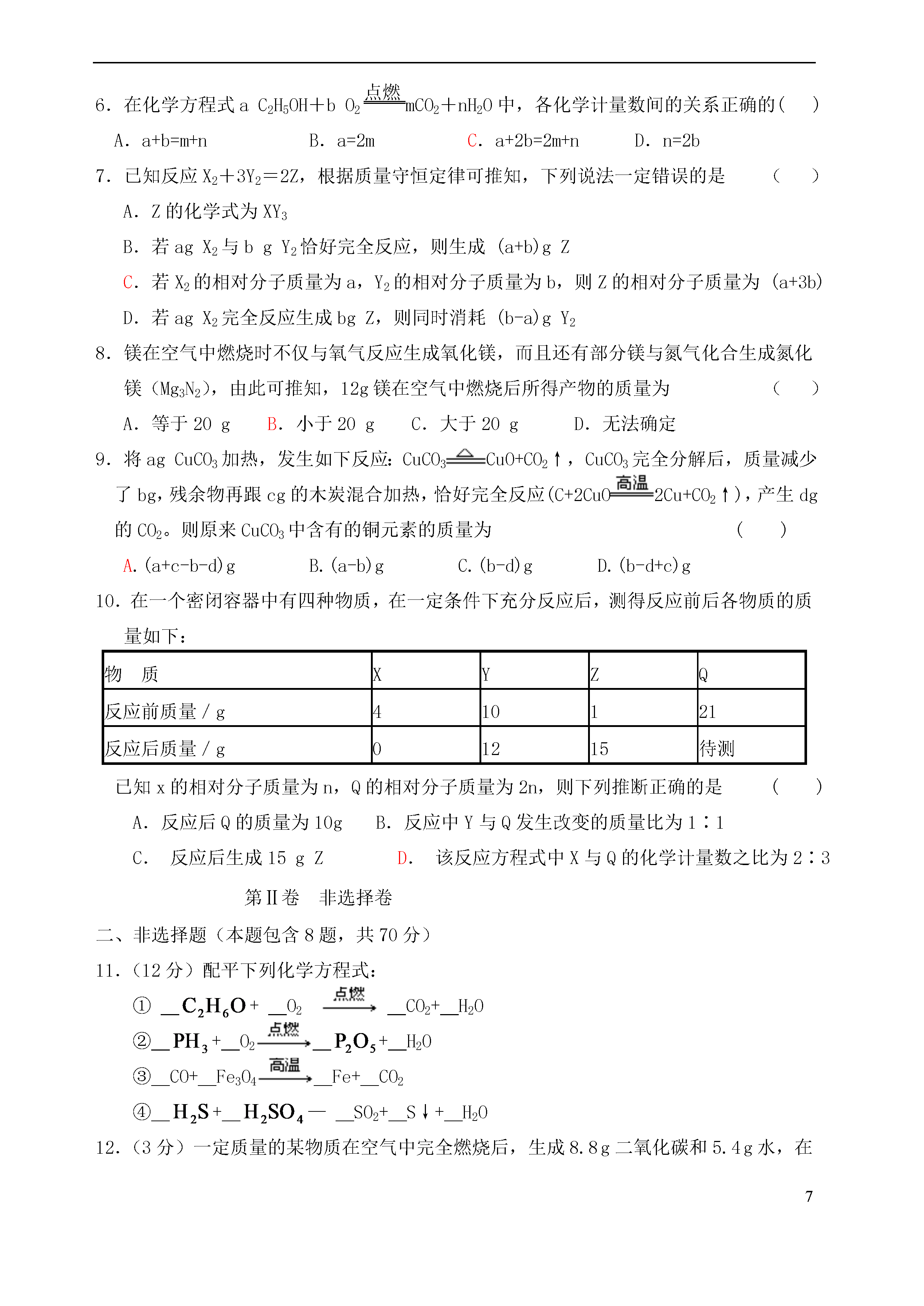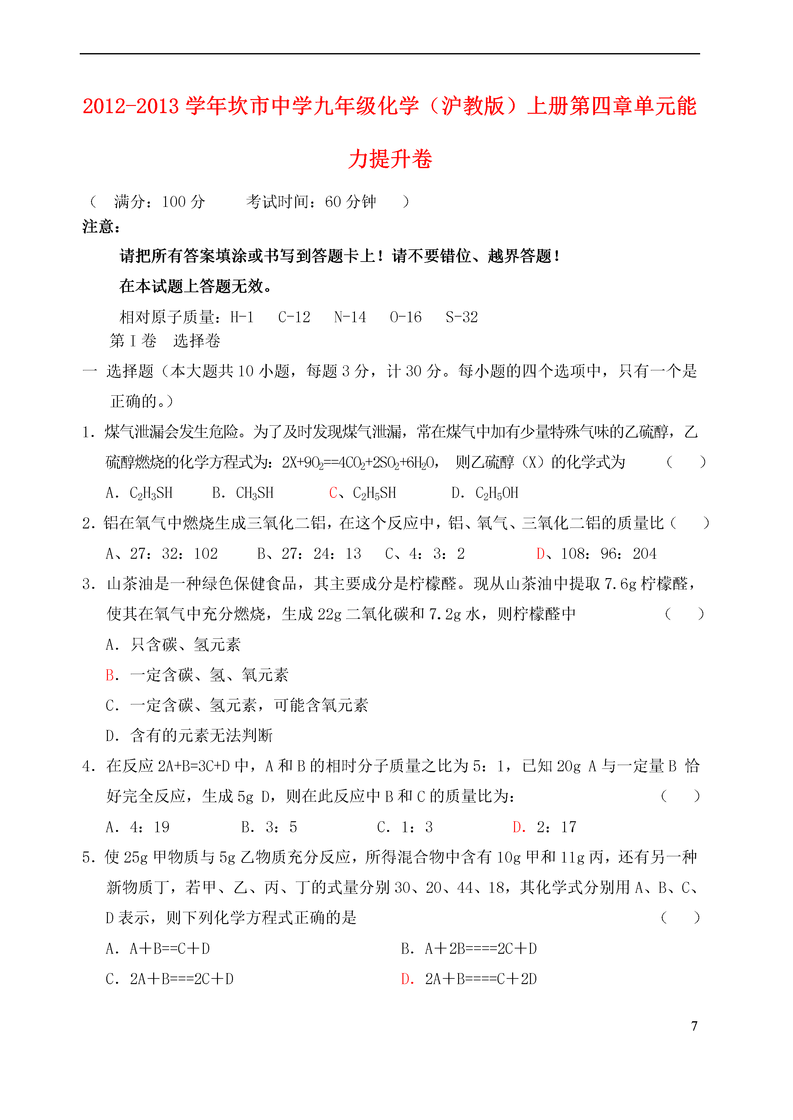 72012-2013学年坎市中学九年级化学(沪教版)上册第四章单元能力提升卷(满分:100分考试时间:60分钟)注意:请把所有答案填涂或书写到答题卡上!请不要错位、越界答题!在本试题上答题无效。相对原子质量:H-1C-12N-14O-16S-32第I卷选择卷一选择题(本大题共10小题,每题3分,计30分。每小题的四个选项中,只有一个是正确的。)1.煤气泄漏会发生危险。为了及时发现煤气泄漏,常在煤气中加有少量特殊气味的乙硫醇,乙硫醇燃烧的化学方程式为:2X+9O2==4CO2+2SO2+6H2O,则乙硫醇(X)的化学式为()A.C2H3SHB.CH3SHC、C2H5SHD.C2H5OH2.铝在氧气中燃烧生成三氧化二铝,在这个反应中,铝、氧气、三氧化二铝的质量比()A、27:32:102B、27:24:13C、4:3:2D、108:96:2043.山茶油是一种绿色保健食品,其主要成分是柠檬醛。现从山茶油中提取7.6g柠檬醛,使其在氧气中充分燃烧,生成22g二氧化碳和7.2g水,则柠檬醛中()A.只含碳、氢元素B.一定含碳、氢、氧元素C.一定含碳、氢元素,可能含氧元素D.含有的元素无法判断4.在反应2A+B=3C+D中,A和B的相时分子质量之比为5:1,已知20gA与一定量B恰好完全反应,生成5gD,则在此反应中B和C的质量比为:()A.4:19B.3:5C.1:3D.2:175.使25g甲物质与5g乙物质充分反应,所得混合物中含有10g甲和11g丙,还有另一种新物质丁,若甲、乙、丙、丁的式量分别30、20、44、18,其化学式分别用A、B、C、D表示,则下列化学方程式正确的是()A.A+B==C+DB.A+2B====2C+DC.2A+B===2C+DD.2A+B====C+2D6.在化学方程式aC2H5OH+bO2点燃mCO2+nH2O中,各化学计量数间的关系正确的()A.a+b=m+nB.a=2mC.a+2b=2m+nD.n=2b7.已知反应X2+3Y2=2Z,根据质量守恒定律可推知,下列说法一定错误的是()A.Z的化学式为XY3B.若agX2与bgY2恰好完全反应,则生成(a+b)gZC.若X2的相对分子质量为a,Y2的相对分子质量为b,则Z的相对分子质量为(a+3b)D.若agX2完全反应生成bgZ,则同时消耗(b-a)gY28.镁在空气中燃烧时不仅与氧气反应生成氧化镁,而且还有部分镁与氮气化合生成氮化镁(Mg3N2),由此可推知,12g镁在空气中燃烧后所得产物的质量为()A.等于20gB.小于20gC.大于20gD.无法确定9.将agCuCO3加热,发生如下反应:CuCO3CuO+CO2↑,CuCO3完全分解后,质量减少了bg,残余物再跟cg的木炭混合加热,恰好完全反应(C+2CuO2Cu+CO2↑),产生dg的CO2。则原来CuCO3中含有的铜元素的质量为()A.(a+c-b-d)gB.(a-b)gC.(b-d)gD.(b-d+c)g10.在一个密闭容器中有四种物质,在一定条件下充分反应后,测得反应前后各物质的质量如下:物质XYZQ反应前质量/g410121反应后质量/g01215待测已知x的相对分子质量为n,Q的相对分子质量为2n,则下列推断正确的是()A.反应后Q的质量为10gB.反应中Y与Q发生改变的质量比为1∶1C.反应后生成15gZD.该反应方程式中X与Q的化学计量数之比为2∶3第Ⅱ卷非选择卷二、非选择题(本题包含8题,共70分)11.(12分)配平下列化学方程式:①+O2CO2+H2O②+O2+H2O③CO+Fe3O4Fe+CO2④+—SO2+S↓+H2O12.(3分)一定质量的某物质在空气中完全燃烧后,生成8.8g二氧化碳和5.4g水,在①CH4②C2H2③C2H6④C2H5OH四种物质中符合上述条件的是。(用序号填空)13.(9分)把4g硫粉放在给定质量的氧气中燃烧,有关实验数据如下表所示。。请回答下列问题:第一次第二次第三次O2质量(g)346SO2质量(g)6(1)第一次实验中,参加反应的S的质量、O2的质量与生成的SO2的质量比是(2)请你通过计算求出第二次实验生成二氧化硫的质量为克;第三次实验生成二氧化硫的质量为克。14.(8分)经分析,常温常压下,由A和B组成的混合气体中只含有氧和碳两种元素,又知A的相对分子质量小于B的相对分子质量,在下列情况下,试确定A和B的化学式(1)无论A和B以何种比例混合,氧元素和碳元素的质量比总大于8/3。则A是,B是。(2)无论A和B以何种比例混合,氧元素与碳元素的质量比总大于4/3,小于8/3。则A是,B是。15.(8分)1)在点燃可燃性气体之