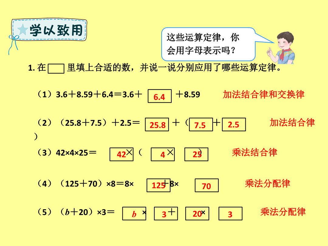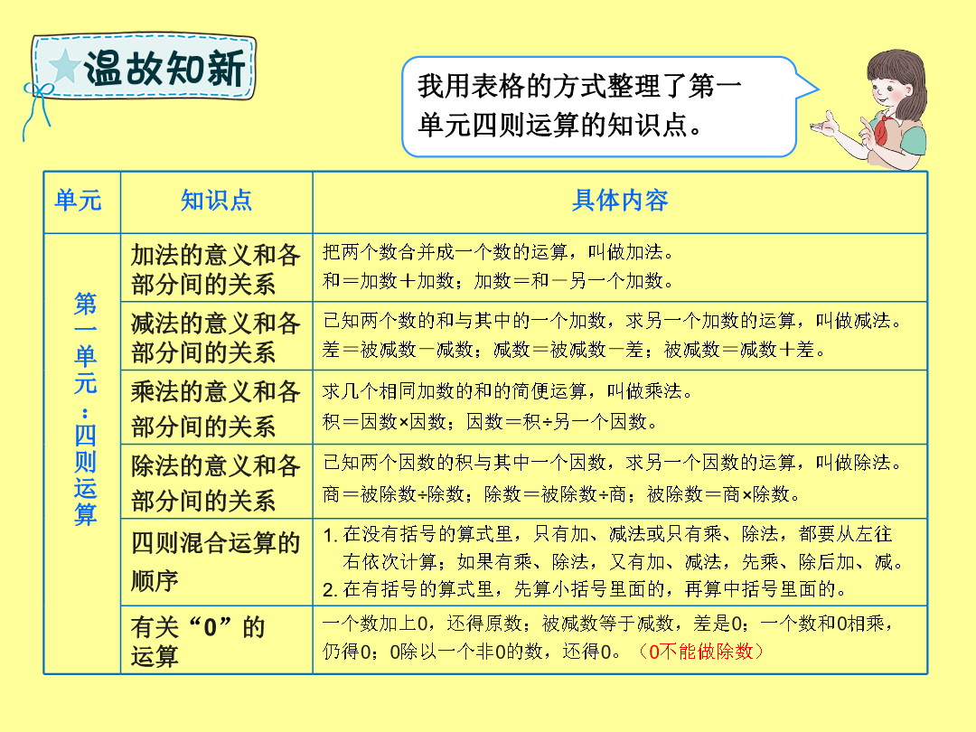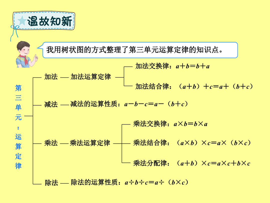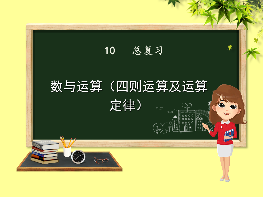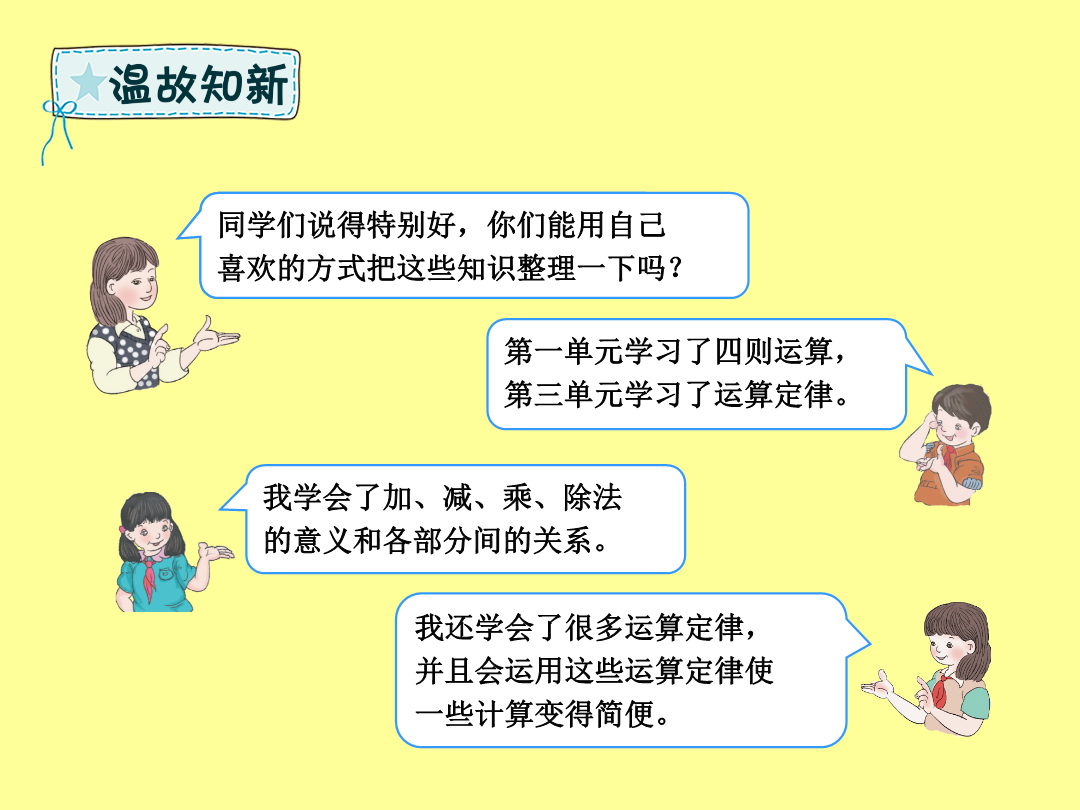 数与运算(四则运算及运算定律)同学们,这学期“数与代数”部分我们学习了哪些知识呢?我用表格的方式整理了第一单元四则运算的知识点。我用树状图的方式整理了第三单元运算定律的知识点。1.在里填上合适的数,并说一说分别应用了哪些运算定律。2.根据加、减、乘、除法各部分间的关系,分别写出另外两个算式。3.在里填上合适的数,然后列出综合算式。4.计算下面各题,怎样简便就怎样计算。1.先说一说下面各题的运算顺序,再计算。2.新学期,四(1)班转来3名新同学,学校为他们买了3套新桌椅,每张桌子68元,每把椅子32元,请你帮学校算一算,一共需要花多少钱?检验一下!你的答案合适吗?……xx小学x年级x班