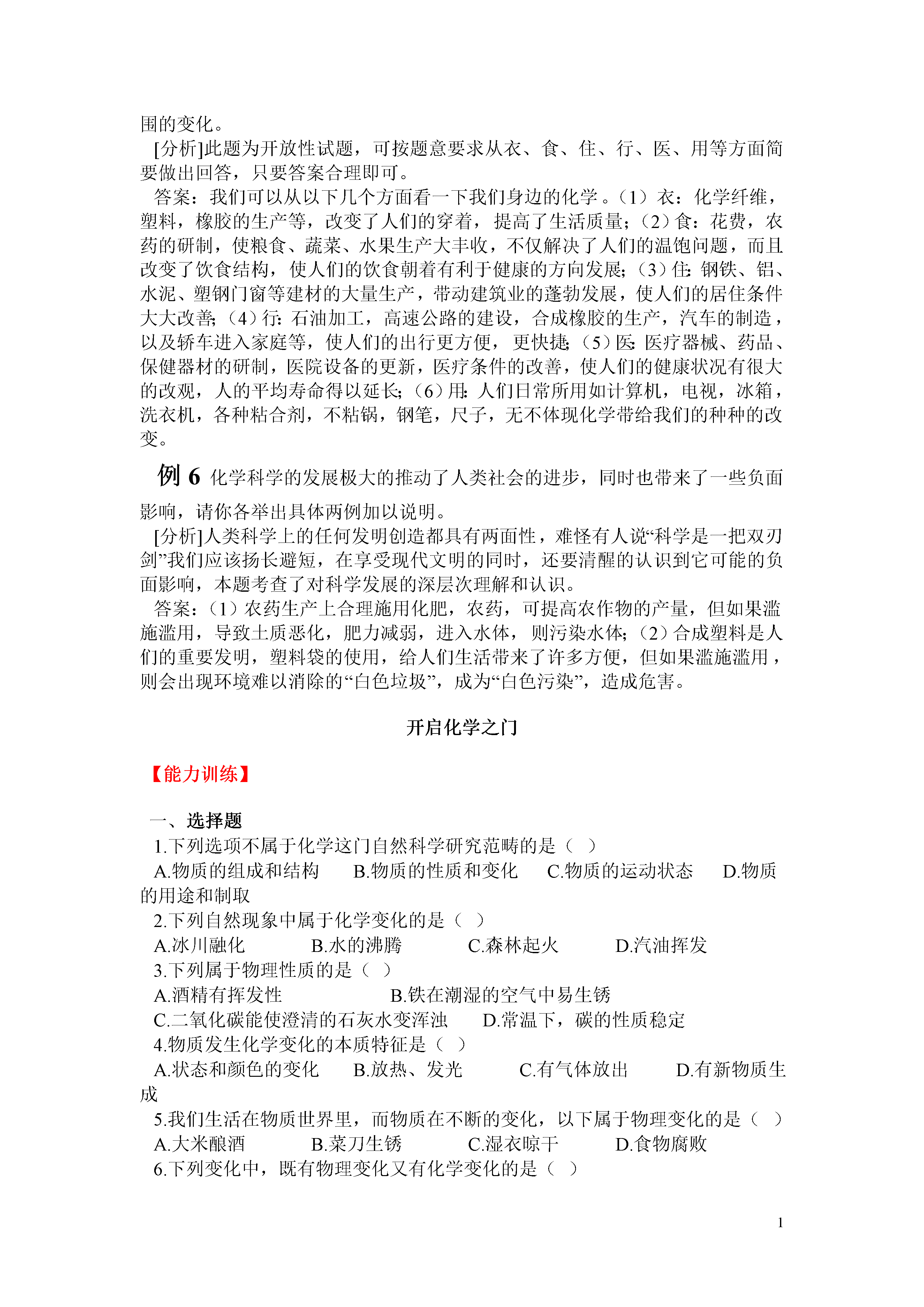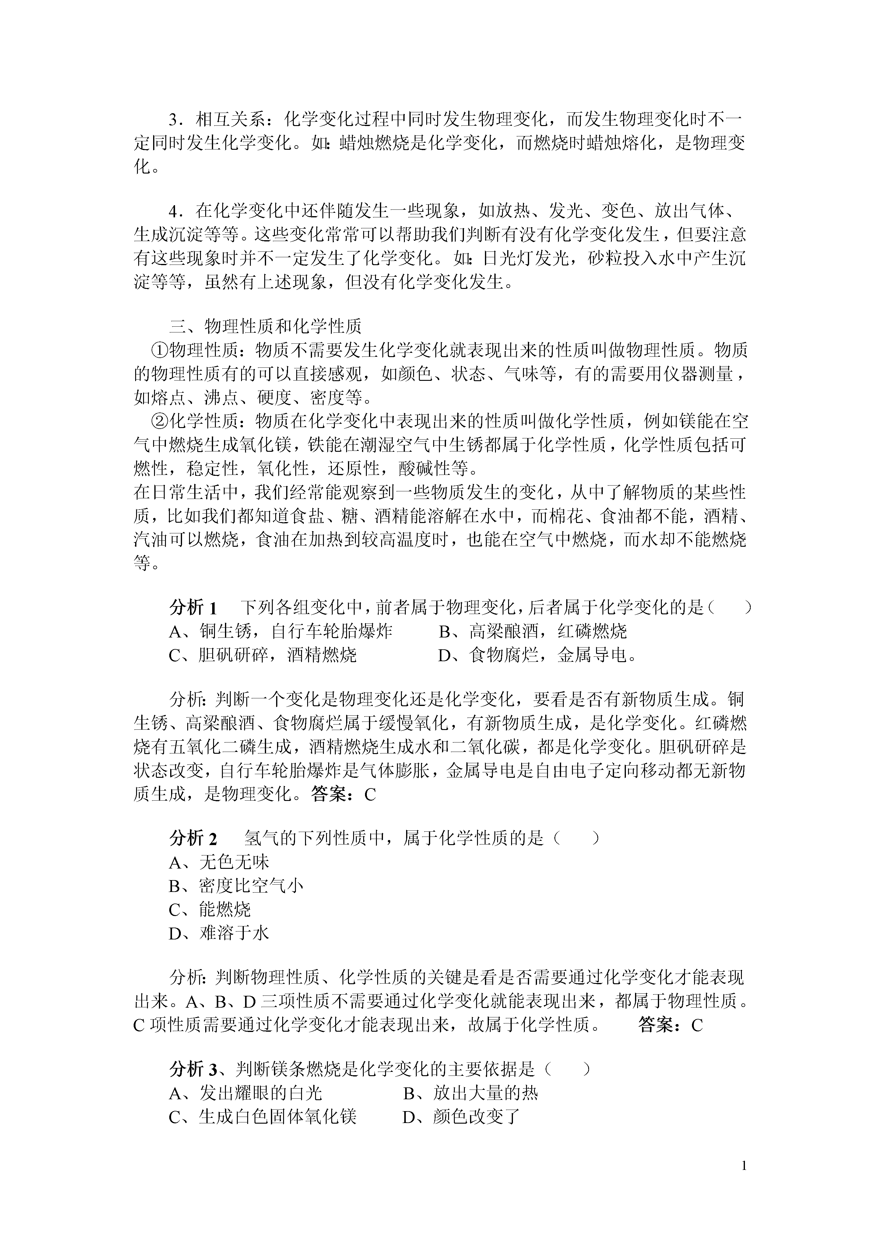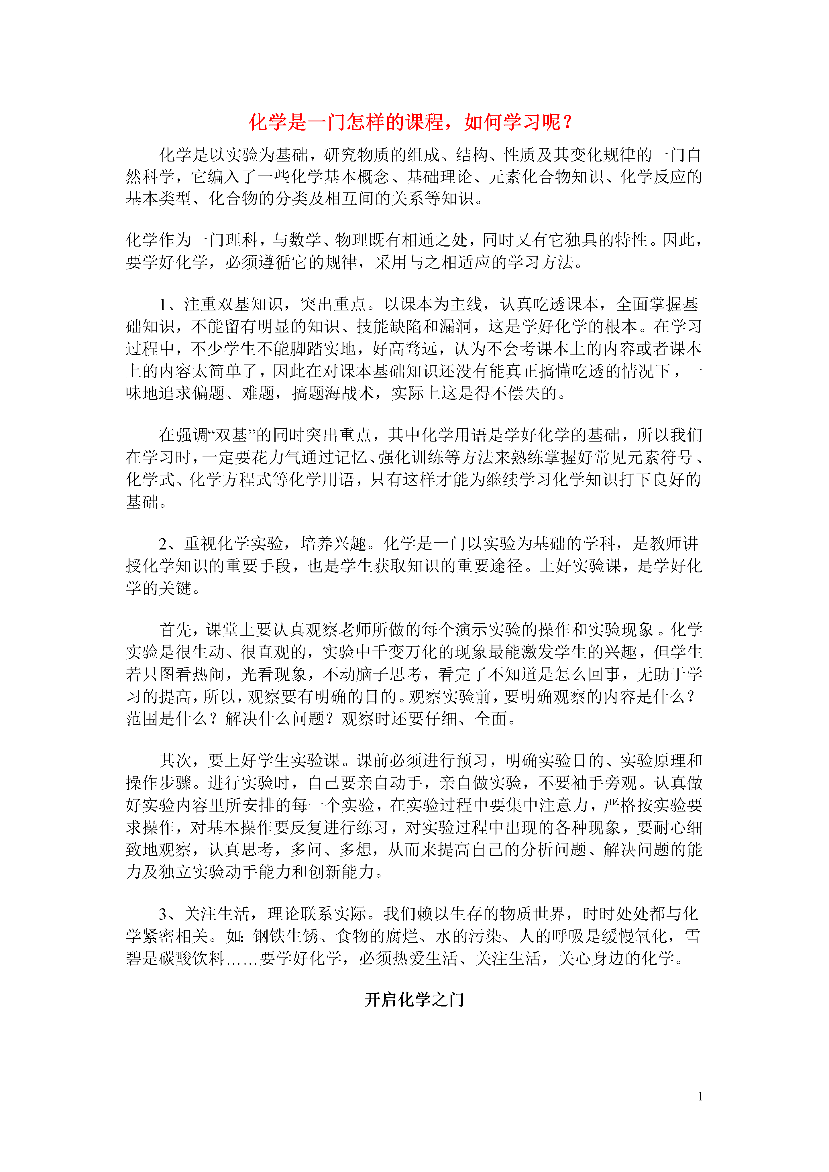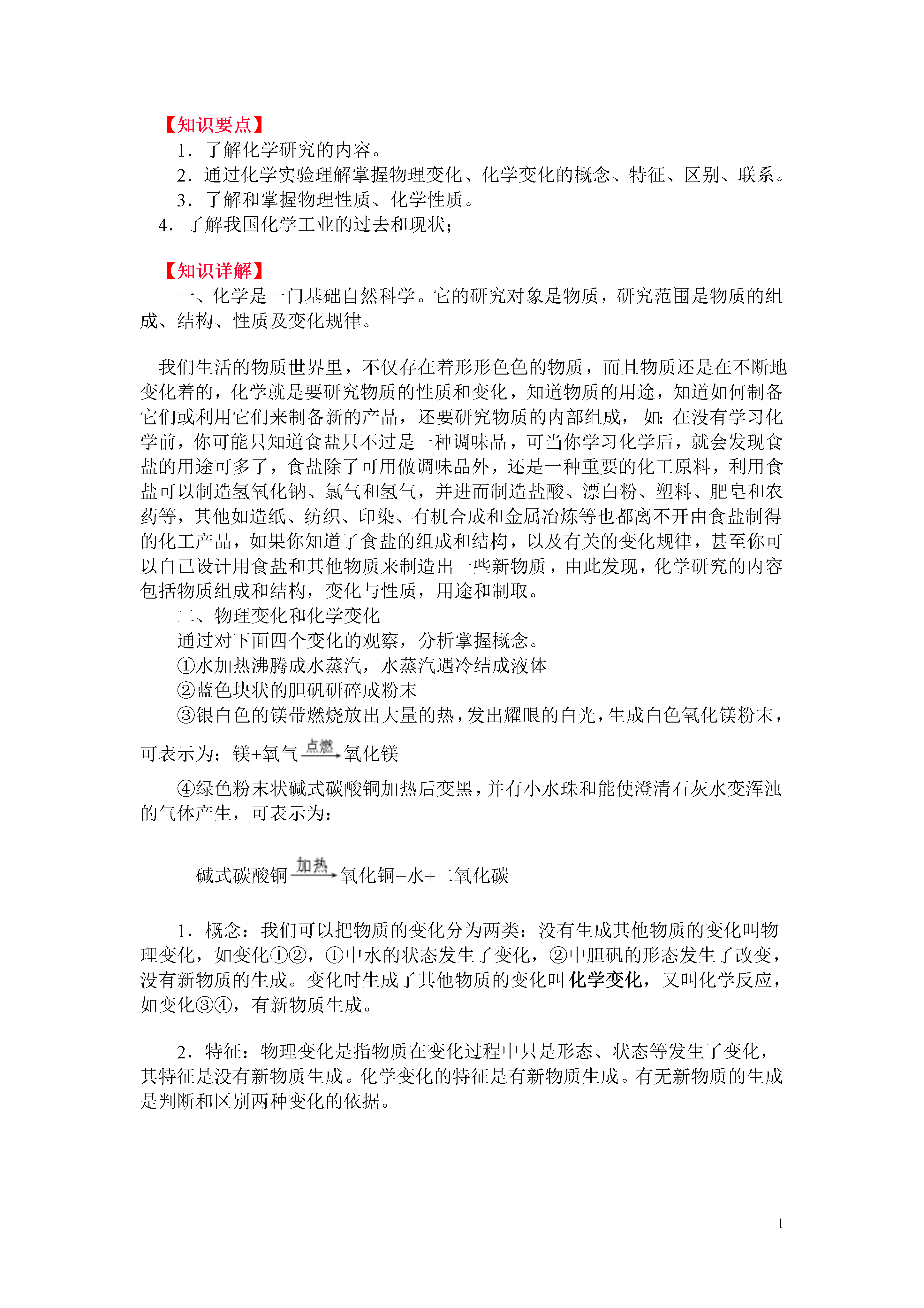1化学是一门怎样的课程,如何学习呢?化学是以实验为基础,研究物质的组成、结构、性质及其变化规律的一门自然科学,它编入了一些化学基本概念、基础理论、元素化合物知识、化学反应的基本类型、化合物的分类及相互间的关系等知识。化学作为一门理科,与数学、物理既有相通之处,同时又有它独具的特性。因此,要学好化学,必须遵循它的规律,采用与之相适应的学习方法。1、注重双基知识,突出重点。以课本为主线,认真吃透课本,全面掌握基础知识,不能留有明显的知识、技能缺陷和漏洞,这是学好化学的根本。在学习过程中,不少学生不能脚踏实地,好高骛远,认为不会考课本上的内容或者课本上的内容太简单了,因此在对课本基础知识还没有能真正搞懂吃透的情况下,一味地追求偏题、难题,搞题海战术,实际上这是得不偿失的。在强调“双基”的同时突出重点,其中化学用语是学好化学的基础,所以我们在学习时,一定要花力气通过记忆、强化训练等方法来熟练掌握好常见元素符号、化学式、化学方程式等化学用语,只有这样才能为继续学习化学知识打下良好的基础。2、重视化学实验,培养兴趣。化学是一门以实验为基础的学科,是教师讲授化学知识的重要手段,也是学生获取知识的重要途径。上好实验课,是学好化学的关键。首先,课堂上要认真观察老师所做的每个演示实验的操作和实验现象。化学实验是很生动、很直观的,实验中千变万化的现象最能激发学生的兴趣,但学生若只图看热闹,光看现象,不动脑子思考,看完了不知道是怎么回事,无助于学习的提高,所以,观察要有明确的目的。观察实验前,要明确观察的内容是什么?范围是什么?解决什么问题?观察时还要仔细、全面。其次,要上好学生实验课。课前必须进行预习,明确实验目的、实验原理和操作步骤。进行实验时,自己要亲自动手,亲自做实验,不要袖手旁观。认真做好实验内容里所安排的每一个实验,在实验过程中要集中注意力,严格按实验要求操作,对基本操作要反复进行练习,对实验过程中出现的各种现象,要耐心细致地观察,认真思考,多问、多想,从而来提高自己的分析问题、解决问题的能力及独立实验动手能力和创新能力。3、关注生活,理论联系实际。我们赖以生存的物质世界,时时处处都与化学紧密相关。如:钢铁生锈、食物的腐烂、水的污染、人的呼吸是缓慢氧化,雪碧是碳酸饮料……要学好化学,必须热爱生活、关注生活,关心身边的化学。开启化学之门【知识要点】1.了解化学研究的内容。2.通过化学实验理解掌握物理变化、化学变化的概念、特征、区别、联系。3.了解和掌握物理性质、化学性质。4.了解我国化学工业的过去和现状;【知识详解】一、化学是一门基础自然科学。它的研究对象是物质,研究范围是物质的组成、结构、性质及变化规律。我们生活的物质世界里,不仅存在着形形色色的物质,而且物质还是在不断地变化着的,化学就是要研究物质的性质和变化,知道物质的用途,知道如何制备它们或利用它们来制备新的产品,还要研究物质的内部组成,如:在没有学习化学前,你可能只知道食盐只不过是一种调味品,可当你学习化学后,就会发现食盐的用途可多了,食盐除了可用做调味品外,还是一种重要的化工原料,利用食盐可以制造氢氧化钠、氯气和氢气,并进而制造盐酸、漂白粉、塑料、肥皂和农药等,其他如造纸、纺织、印染、有机合成和金属冶炼等也都离不开由食盐制得的化工产品,如果你知道了食盐的组成和结构,以及有关的变化规律,甚至你可以自己设计用食盐和其他物质来制造出一些新物质,由此发现,化学研究的内容包括物质组成和结构,变化与性质,用途和制取。二、物理变化和化学变化通过对下面四个变化的观察,分析掌握概念。①水加热沸腾成水蒸汽,水蒸汽遇冷结成液体②蓝色块状的胆矾研碎成粉末③银白色的镁带燃烧放出大量的热,发出耀眼的白光,生成白色氧化镁粉末,可表示为:镁+氧气氧化镁④绿色粉末状碱式碳酸铜加热后变黑,并有小水珠和能使澄清石灰水变浑浊的气体产生,可表示为:碱式碳酸铜氧化铜+水+二氧化碳1.概念:我们可以把物质的变化分为两类:没有生成其他物质的变化叫物理变化,如变化①②,①中水的状态发生了变化,②中胆矾的形态发生了改变,没有新物质的生成。变化时生成了其他物质的变化叫化学变化,又叫化学反应,如变化③④,有新物质生成。2.特征:物理变化是指物质在变化过程中只是形态、状态等发生了变化,其特征是没有新物质生成。化学变化的特征是有新物质生成。有无新物质的生成是判断和区别两种变化的依据。3.相互关系:化学变化过程中同时发生物理变化,而发生物理变化时不一定同时发生化学变化。如:蜡烛燃烧是化学变化,而燃烧时蜡烛熔化,是物理变化。4.在化学变化中还伴随发生一些现象,如放热、发光、变色、放出气体、生成沉淀等等。这些变化常常可以帮助我们判断有没有化学变化发生,但要注意有这些现象时并不一定发生了化学变化。如