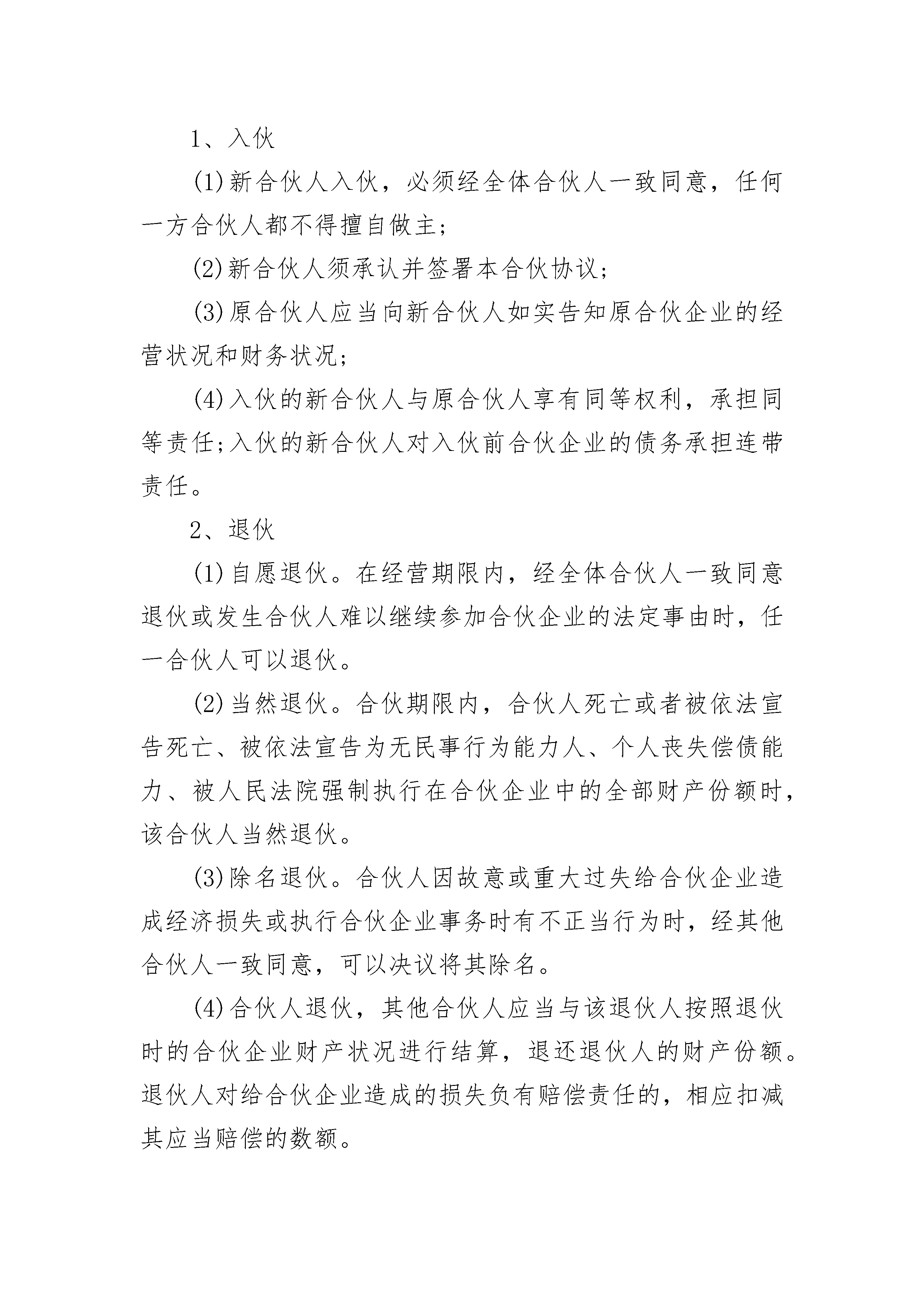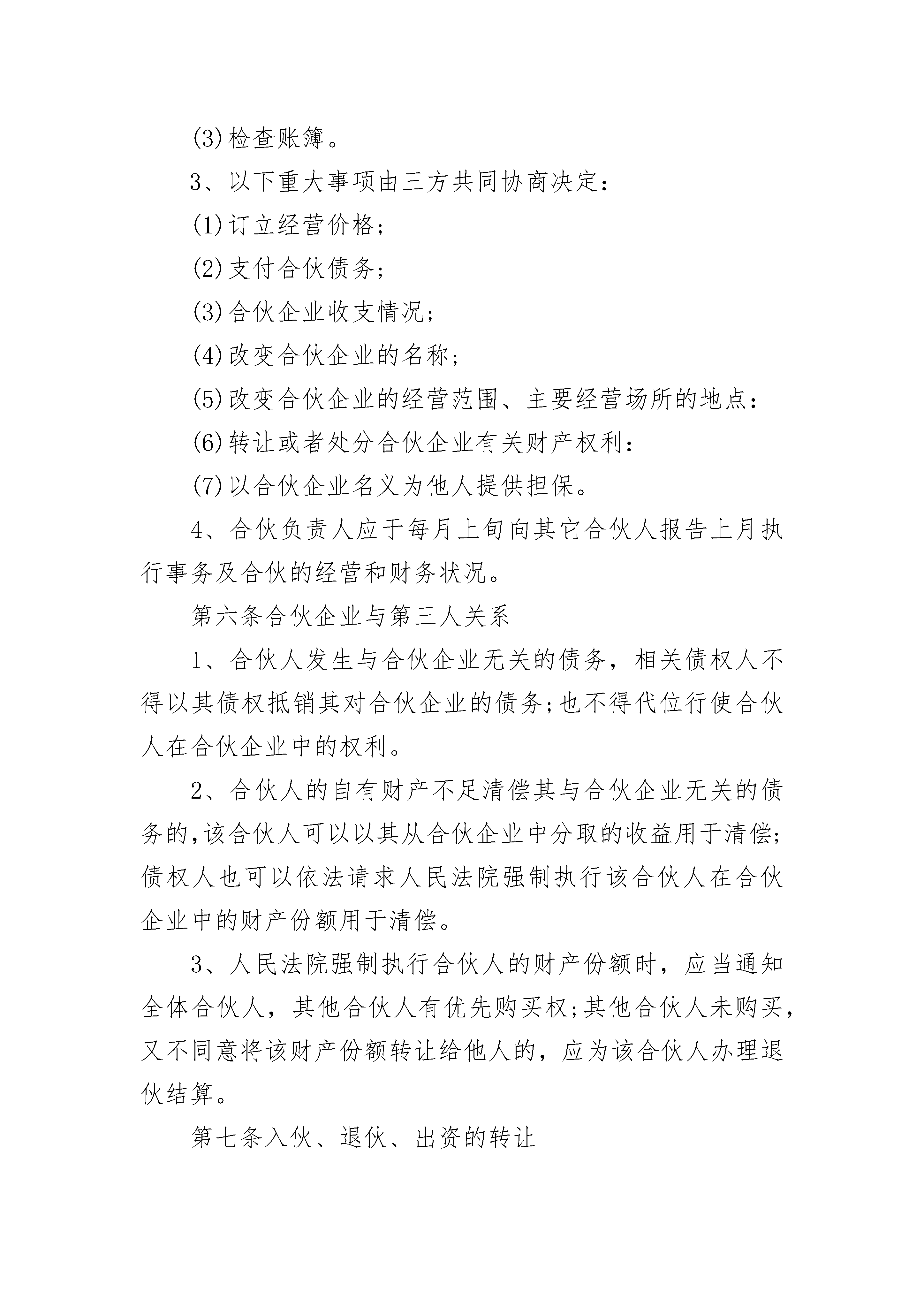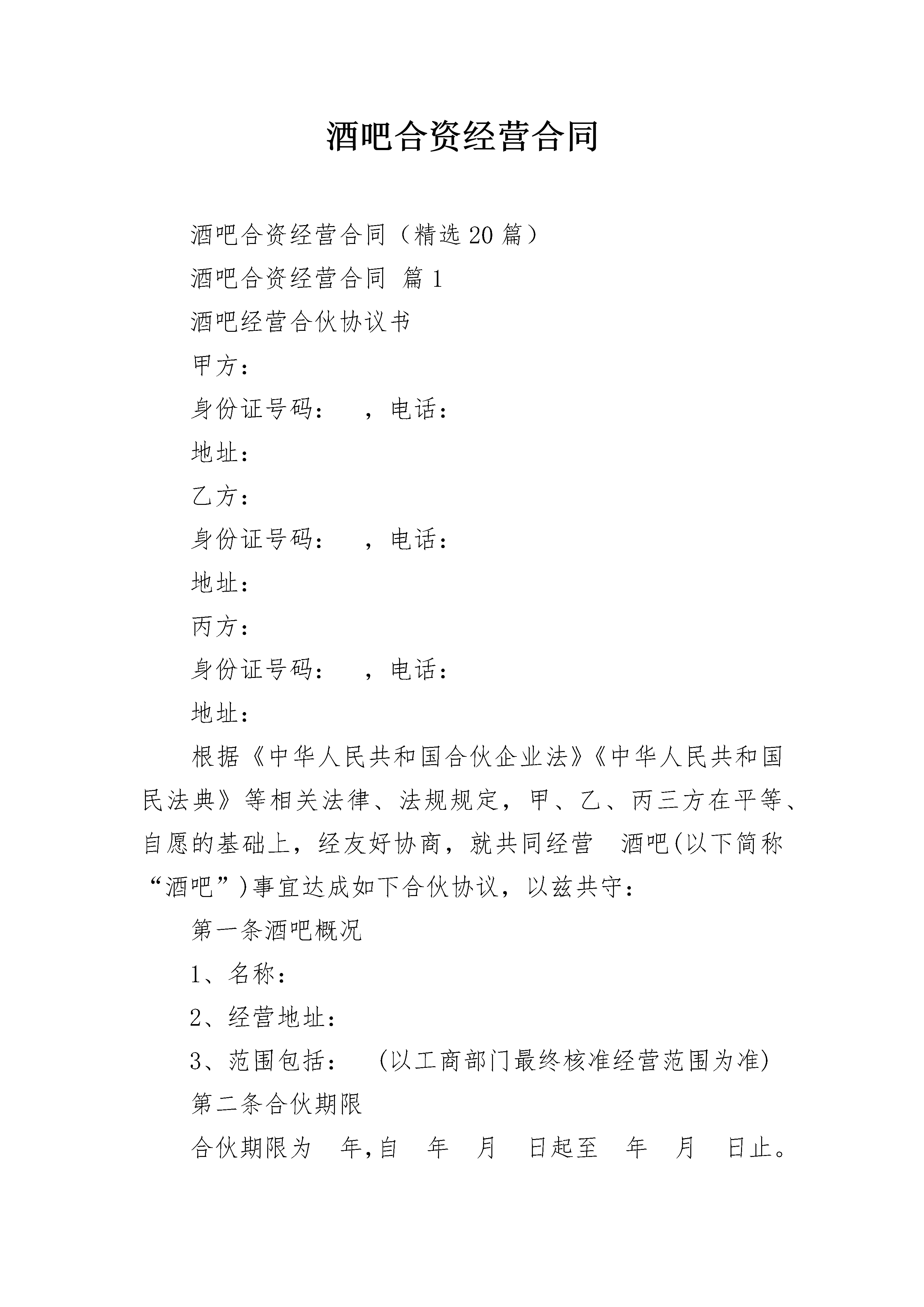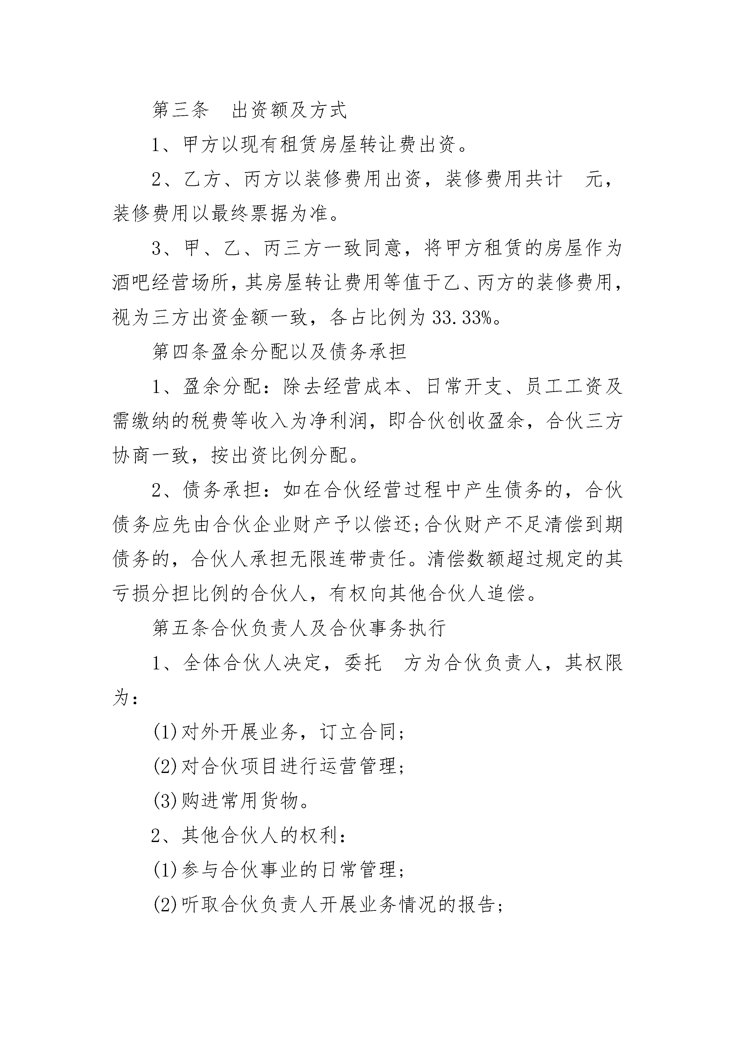 酒吧合资经营合同酒吧合资经营合同(精选20篇)酒吧合资经营合同篇1酒吧经营合伙协议书甲方:身份证号码:,电话:地址:乙方:身份证号码:,电话:地址:丙方:身份证号码:,电话:地址:根据《中华人民共和国合伙企业法》《中华人民共和国民法典》等相关法律、法规规定,甲、乙、丙三方在平等、自愿的基础上,经友好协商,就共同经营酒吧(以下简称“酒吧”)事宜达成如下合伙协议,以兹共守:第一条酒吧概况1、名称:2、经营地址:3、范围包括:(以工商部门最终核准经营范围为准)第二条合伙期限合伙期限为年,自年月日起至年月日止。第三条出资额及方式1、甲方以现有租赁房屋转让费出资。2、乙方、丙方以装修费用出资,装修费用共计元,装修费用以最终票据为准。3、甲、乙、丙三方一致同意,将甲方租赁的房屋作为酒吧经营场所,其房屋转让费用等值于乙、丙方的装修费用,视为三方出资金额一致,各占比例为33.33%。第四条盈余分配以及债务承担1、盈余分配:除去经营成本、日常开支、员工工资及需缴纳的税费等收入为净利润,即合伙创收盈余,合伙三方协商一致,按出资比例分配。2、债务承担:如在合伙经营过程中产生债务的,合伙债务应先由合伙企业财产予以偿还;合伙财产不足清偿到期债务的,合伙人承担无限连带责任。清偿数额超过规定的其亏损分担比例的合伙人,有权向其他合伙人追偿。第五条合伙负责人及合伙事务执行1、全体合伙人决定,委托方为合伙负责人,其权限为:(1)对外开展业务,订立合同;(2)对合伙项目进行运营管理;(3)购进常用货物。2、其他合伙人的权利:(1)参与合伙事业的日常管理;(2)听取合伙负责人开展业务情况的报告;(3)检查账簿。3、以下重大事项由三方共同协商决定:(1)订立经营价格;(2)支付合伙债务;(3)合伙企业收支情况;(4)改变合伙企业的名称;(5)改变合伙企业的经营范围、主要经营场所的地点:(6)转让或者处分合伙企业有关财产权利:(7)以合伙企业名义为他人提供担保。4、合伙负责人应于每月上旬向其它合伙人报告上月执行事务及合伙的经营和财务状况。第六条合伙企业与第三人关系1、合伙人发生与合伙企业无关的债务,相关债权人不得以其债权抵销其对合伙企业的债务;也不得代位行使合伙人在合伙企业中的权利。2、合伙人的自有财产不足清偿其与合伙企业无关的债务的,该合伙人可以以其从合伙企业中分取的收益用于清偿;债权人也可以依法请求人民法院强制执行该合伙人在合伙企业中的财产份额用于清偿。3、人民法院强制执行合伙人的财产份额时,应当通知全体合伙人,其他合伙人有优先购买权;其他合伙人未购买,又不同意将该财产份额转让给他人的,应为该合伙人办理退伙结算。第七条入伙、退伙、出资的转让1、入伙(1)新合伙人入伙,必须经全体合伙人一致同意,任何一方合伙人都不得擅自做主;(2)新合伙人须承认并签署本合伙协议;(3)原合伙人应当向新合伙人如实告知原合伙企业的经营状况和财务状况;(4)入伙的新合伙人与原合伙人享有同等权利,承担同等责任;入伙的新合伙人对入伙前合伙企业的债务承担连带责任。2、退伙(1)自愿退伙。在经营期限内,经全体合伙人一致同意退伙或发生合伙人难以继续参加合伙企业的法定事由时,任一合伙人可以退伙。(2)当然退伙。合伙期限内,合伙人死亡或者被依法宣告死亡、被依法宣告为无民事行为能力人、个人丧失偿债能力、被人民法院强制执行在合伙企业中的全部财产份额时,该合伙人当然退伙。(3)除名退伙。合伙人因故意或重大过失给合伙企业造成经济损失或执行合伙企业事务时有不正当行为时,经其他合伙人一致同意,可以决议将其除名。(4)合伙人退伙,其他合伙人应当与该退伙人按照退伙时的合伙企业财产状况进行结算,退还退伙人的财产份额。退伙人对给合伙企业造成的损失负有赔偿责任的,相应扣减其应当赔偿的数额。(5)退伙人在合伙企业中财产份额,以货币形式退还。3、出资的转让合伙人可转让其在合伙中的全部或部分财产份额,如向合伙人以外的第三人转让,须经其他合伙人一致同意。在同等条件下,其他合伙人有优先受让权。合伙人之间转让在合伙企业中的全部或者部分财产份额时,应当通知其他合伙人。第八条合伙人权利义务1、合伙人权利(1)合伙事务的决定权、监督权和具体的经营活动由合伙人共同决定,实行合伙人一人一票并经全体合伙人过半数通过的表决办法;(2)合伙人享有合伙利益的分配权;(3)合伙人以出资比例分配合伙利益,合伙经营积累的财产归合伙人共有;(4)合伙人有退伙的权利。2、合伙人义务(1)按照合伙协议的约定维护合伙财产的统一;(2)共同分担合伙经营损失的债务;(3)为合伙债务承担连带责任。第九条禁止行为1、未经全体合伙人一致同意,禁止任何合伙人私自以合伙名义进行业务活动;如其业务获得利益,归全体合伙人;造成的损失由该合伙人个人全额进行