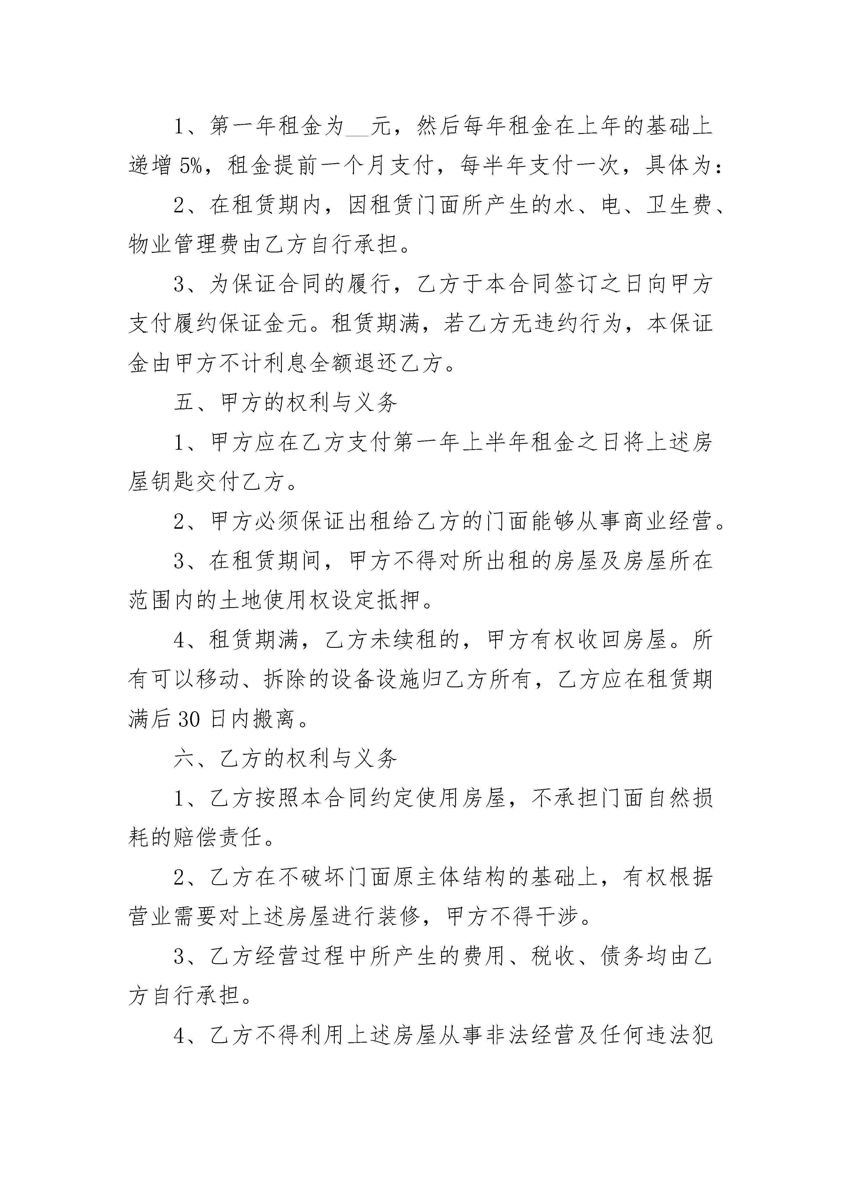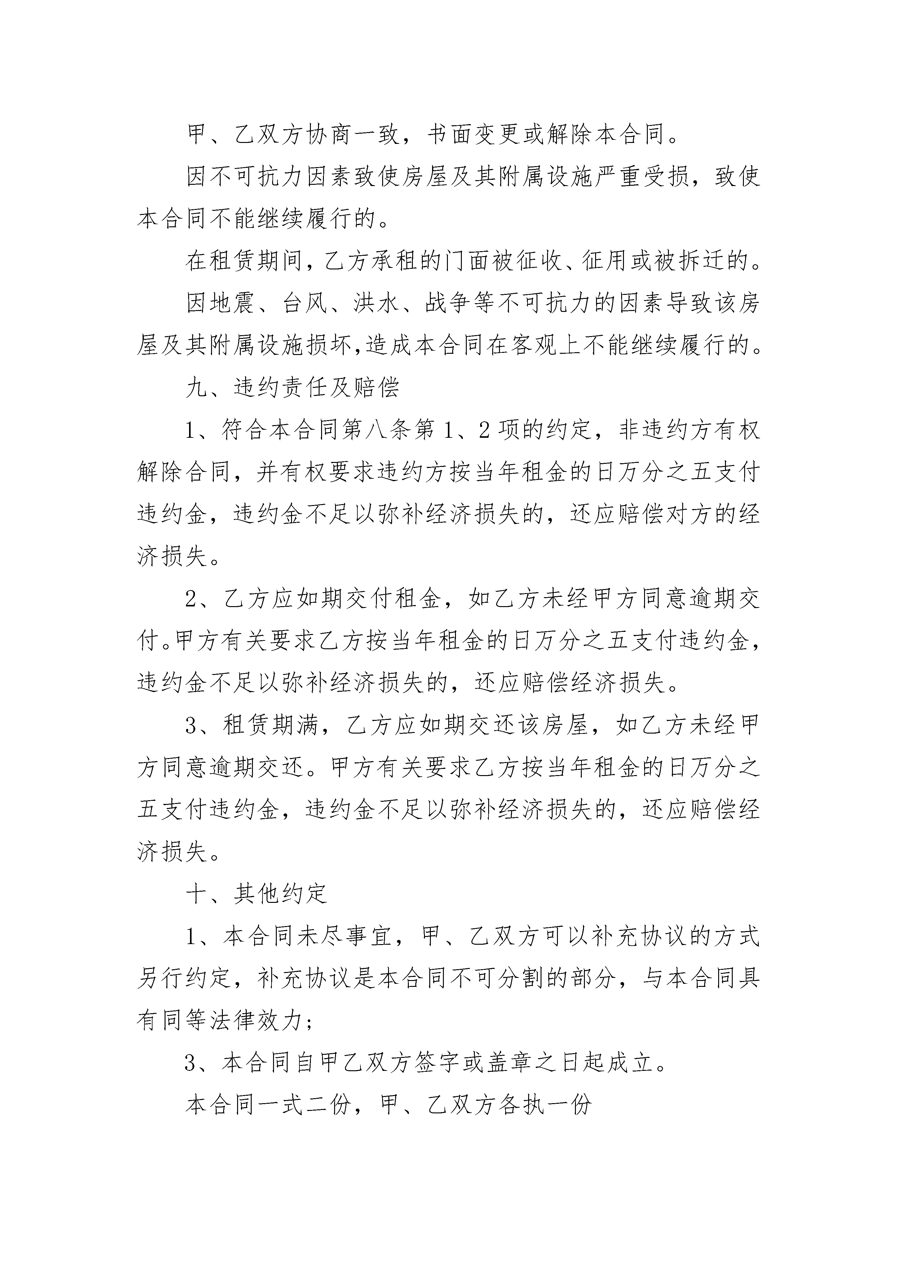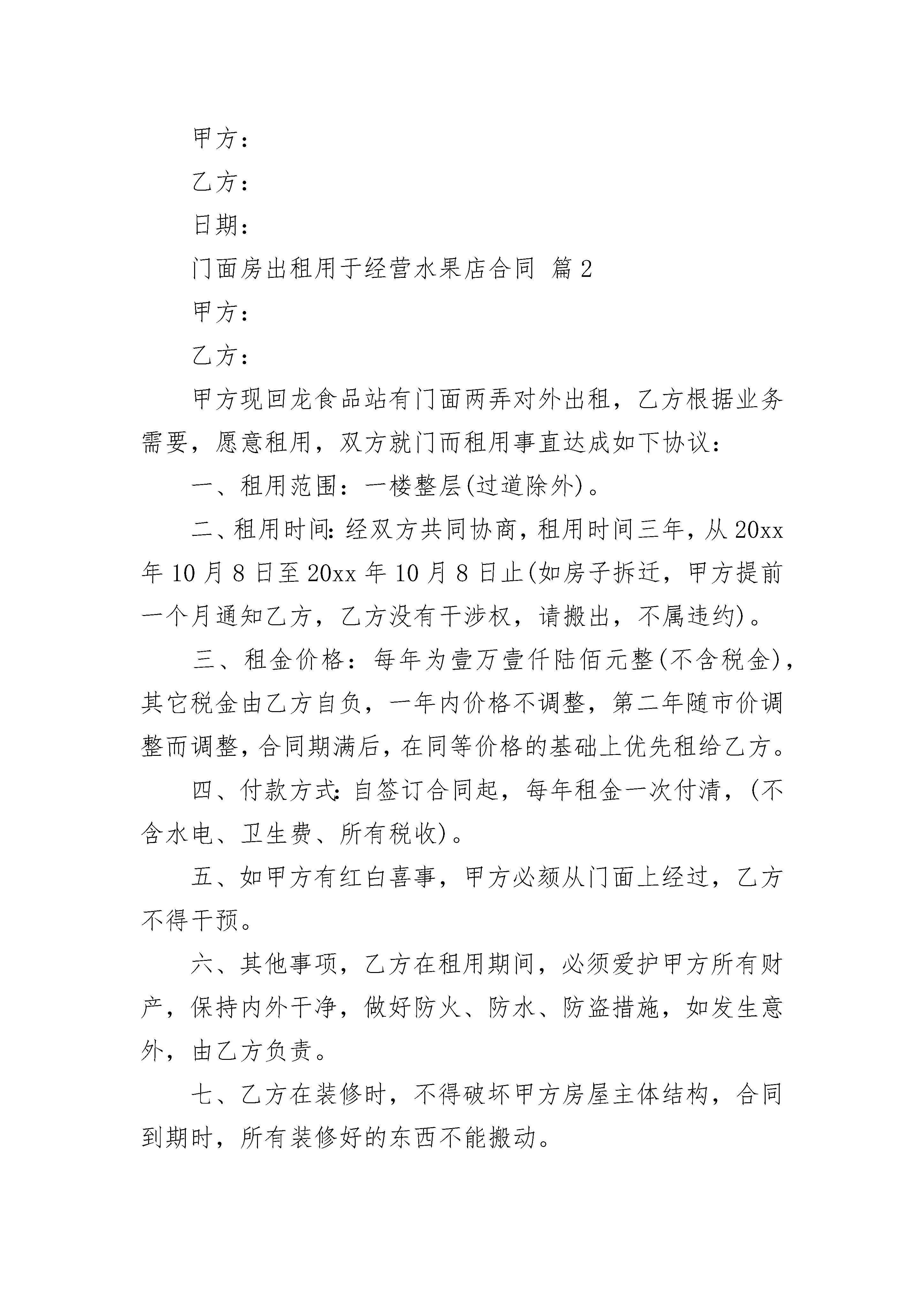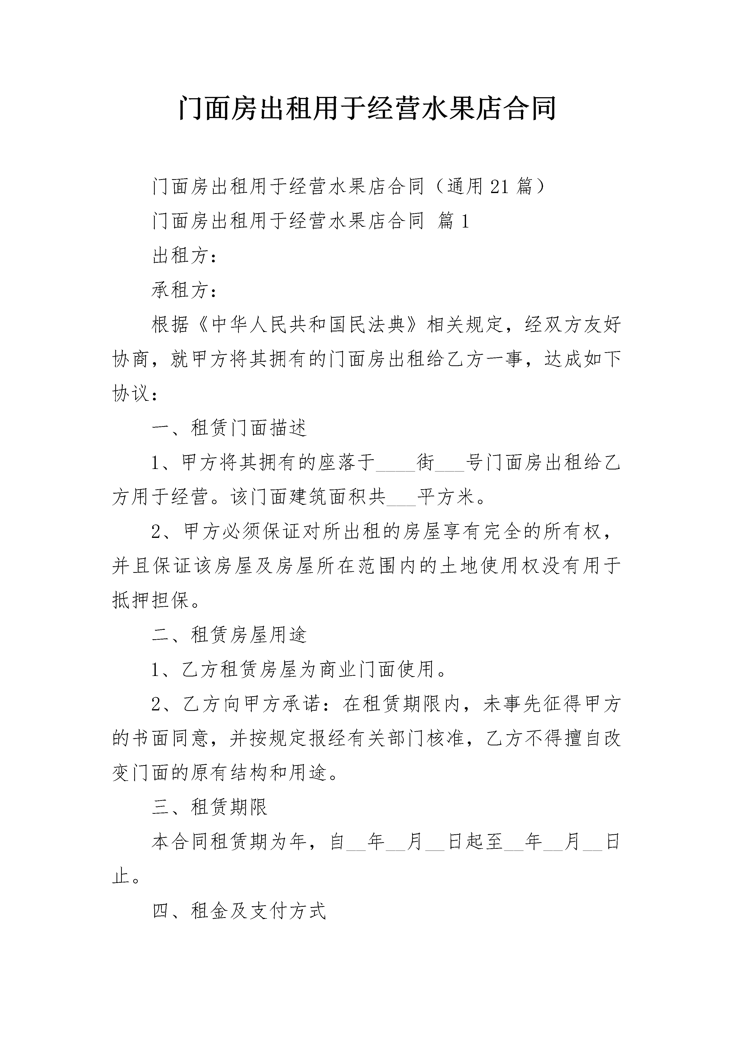 门面房出租用于经营水果店合同门面房出租用于经营水果店合同(通用21篇)门面房出租用于经营水果店合同篇1出租方:承租方:根据《中华人民共和国民法典》相关规定,经双方友好协商,就甲方将其拥有的门面房出租给乙方一事,达成如下协议:一、租赁门面描述1、甲方将其拥有的座落于____街___号门面房出租给乙方用于经营。该门面建筑面积共___平方米。2、甲方必须保证对所出租的房屋享有完全的所有权,并且保证该房屋及房屋所在范围内的土地使用权没有用于抵押担保。二、租赁房屋用途1、乙方租赁房屋为商业门面使用。2、乙方向甲方承诺:在租赁期限内,未事先征得甲方的书面同意,并按规定报经有关部门核准,乙方不得擅自改变门面的原有结构和用途。三、租赁期限本合同租赁期为年,自__年__月__日起至__年__月__日止。四、租金及支付方式1、第一年租金为__元,然后每年租金在上年的基础上递增5%,租金提前一个月支付,每半年支付一次,具体为:2、在租赁期内,因租赁门面所产生的水、电、卫生费、物业管理费由乙方自行承担。3、为保证合同的履行,乙方于本合同签订之日向甲方支付履约保证金元。租赁期满,若乙方无违约行为,本保证金由甲方不计利息全额退还乙方。五、甲方的权利与义务1、甲方应在乙方支付第一年上半年租金之日将上述房屋钥匙交付乙方。2、甲方必须保证出租给乙方的门面能够从事商业经营。3、在租赁期间,甲方不得对所出租的房屋及房屋所在范围内的土地使用权设定抵押。4、租赁期满,乙方未续租的,甲方有权收回房屋。所有可以移动、拆除的设备设施归乙方所有,乙方应在租赁期满后30日内搬离。六、乙方的权利与义务1、乙方按照本合同约定使用房屋,不承担门面自然损耗的赔偿责任。2、乙方在不破坏门面原主体结构的基础上,有权根据营业需要对上述房屋进行装修,甲方不得干涉。3、乙方经营过程中所产生的费用、税收、债务均由乙方自行承担。4、乙方不得利用上述房屋从事非法经营及任何违法犯罪活动。5、按本协议第四条约定支付租金。七、续租租赁期满,甲方如有意续租,则乙方在同等条件下有优先租权,但必须在租赁期满前的二个月向甲方提出书面申请。八、合同的变更和解除1、乙方有下列情况之一的,甲方有权解除合同;未按约定期限交付租金,超过60天以上的。在租赁期内,未经甲方书面认可或同意,擅自改变租赁房屋的结构或用途,经甲方书面通知,在限定的时间内仍未修复的。在租赁期内,未经甲方书面认可或同意,擅自转租或转让承租房屋的。从事非法经营及违法犯罪活动的。2、甲方有下列情形之一的,乙方有权解除合同:甲方不交付或者迟延交付租赁房屋20天以上的。乙方承租期间,如甲方因该房屋或房屋范围内的土地与第三方发生纠纷或甲方与第三人之间的纠纷涉及到该房屋及房屋范围内的土地,致使乙方无法正常营业超过20天的。甲方未经乙方书面许可,擅自将出租的房屋用于抵押或转让给第三方的。租赁房屋主体结构存在缺陷,危及安全的。3、在租赁期限内,有下列情况之一的,双方均可变更或解除合同:甲、乙双方协商一致,书面变更或解除本合同。因不可抗力因素致使房屋及其附属设施严重受损,致使本合同不能继续履行的。在租赁期间,乙方承租的门面被征收、征用或被拆迁的。因地震、台风、洪水、战争等不可抗力的因素导致该房屋及其附属设施损坏,造成本合同在客观上不能继续履行的。九、违约责任及赔偿1、符合本合同第八条第1、2项的约定,非违约方有权解除合同,并有权要求违约方按当年租金的日万分之五支付违约金,违约金不足以弥补经济损失的,还应赔偿对方的经济损失。2、乙方应如期交付租金,如乙方未经甲方同意逾期交付。甲方有关要求乙方按当年租金的日万分之五支付违约金,违约金不足以弥补经济损失的,还应赔偿经济损失。3、租赁期满,乙方应如期交还该房屋,如乙方未经甲方同意逾期交还。甲方有关要求乙方按当年租金的日万分之五支付违约金,违约金不足以弥补经济损失的,还应赔偿经济损失。十、其他约定1、本合同未尽事宜,甲、乙双方可以补充协议的方式另行约定,补充协议是本合同不可分割的部分,与本合同具有同等法律效力;3、本合同自甲乙双方签字或盖章之日起成立。本合同一式二份,甲、乙双方各执一份甲方:乙方:日期:门面房出租用于经营水果店合同篇2甲方:乙方:甲方现回龙食品站有门面两弄对外出租,乙方根据业务需要,愿意租用,双方就门而租用事直达成如下协议:一、租用范围:一楼整层(过道除外)。二、租用时间:经双方共同协商,租用时间三年,从20xx年10月8日至20xx年10月8日止(如房子拆迁,甲方提前一个月通知乙方,乙方没有干涉权,请搬出,不属违约)。三、租金价格:每年为壹万壹仟陆佰元整(不含税金),其它税金由乙方自负,一年内价格不调整,第二年随市价调整而调整,合同期满后,在同等价格的基础上优先租给乙方。四、付款方式:自签订合同起,每年租金一次
