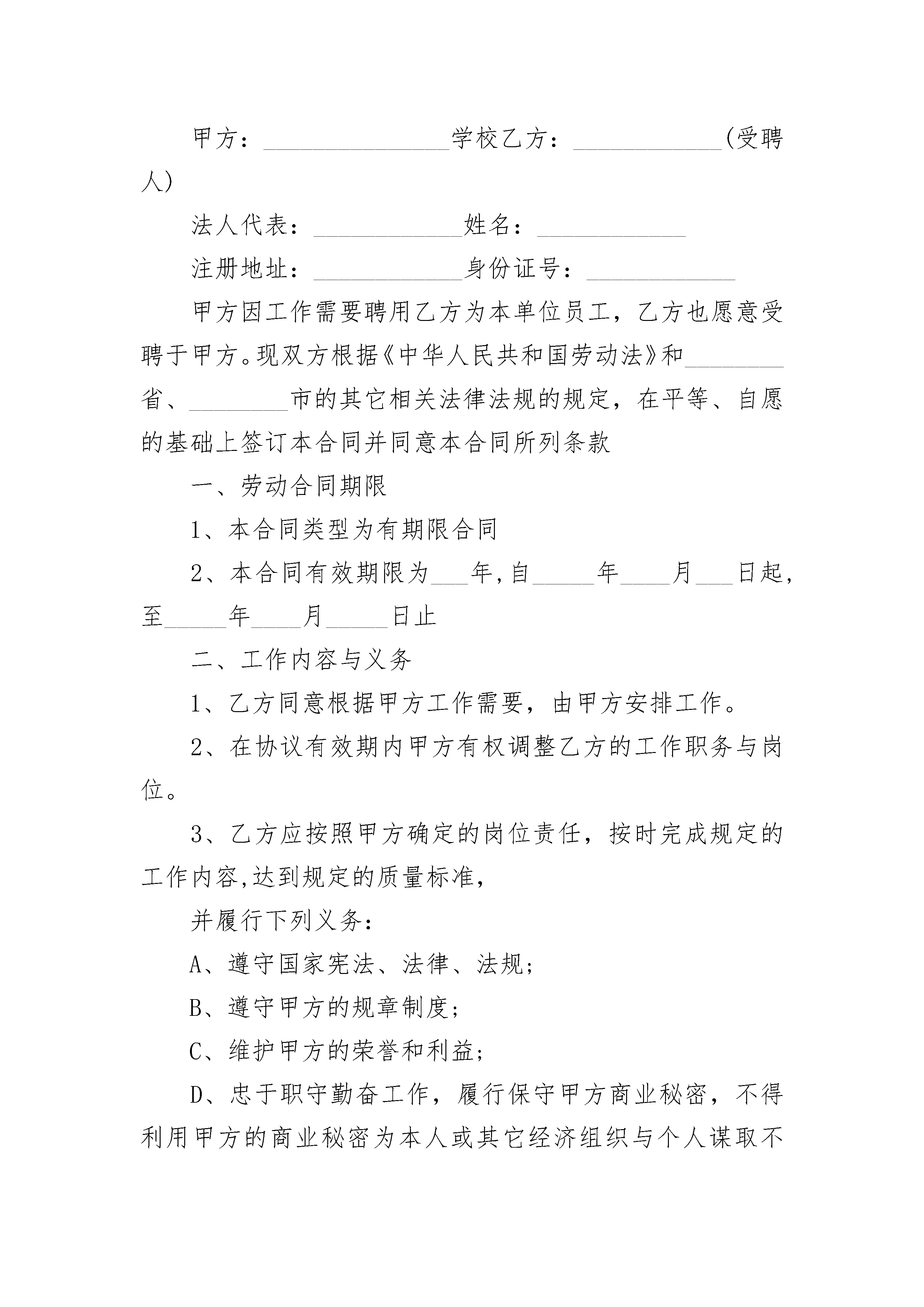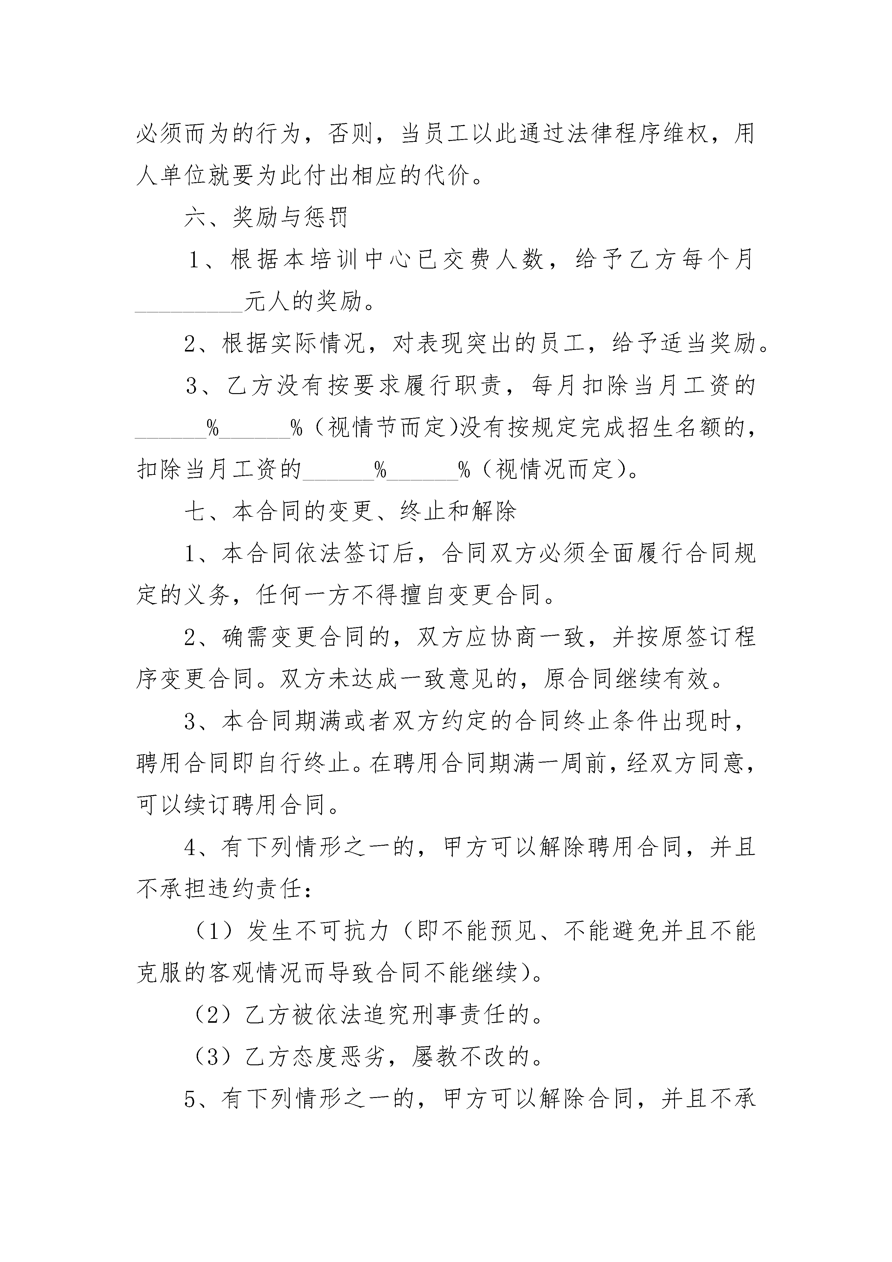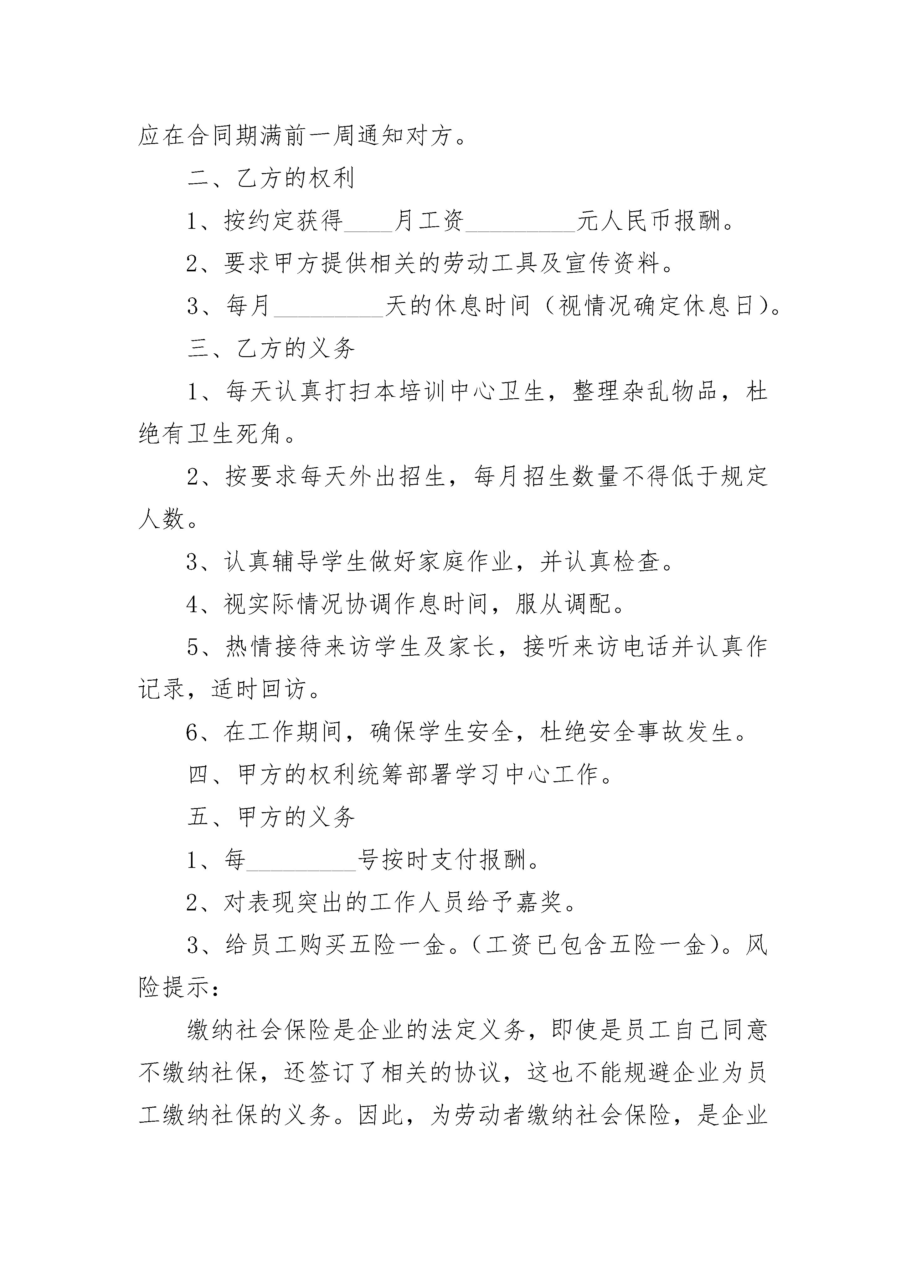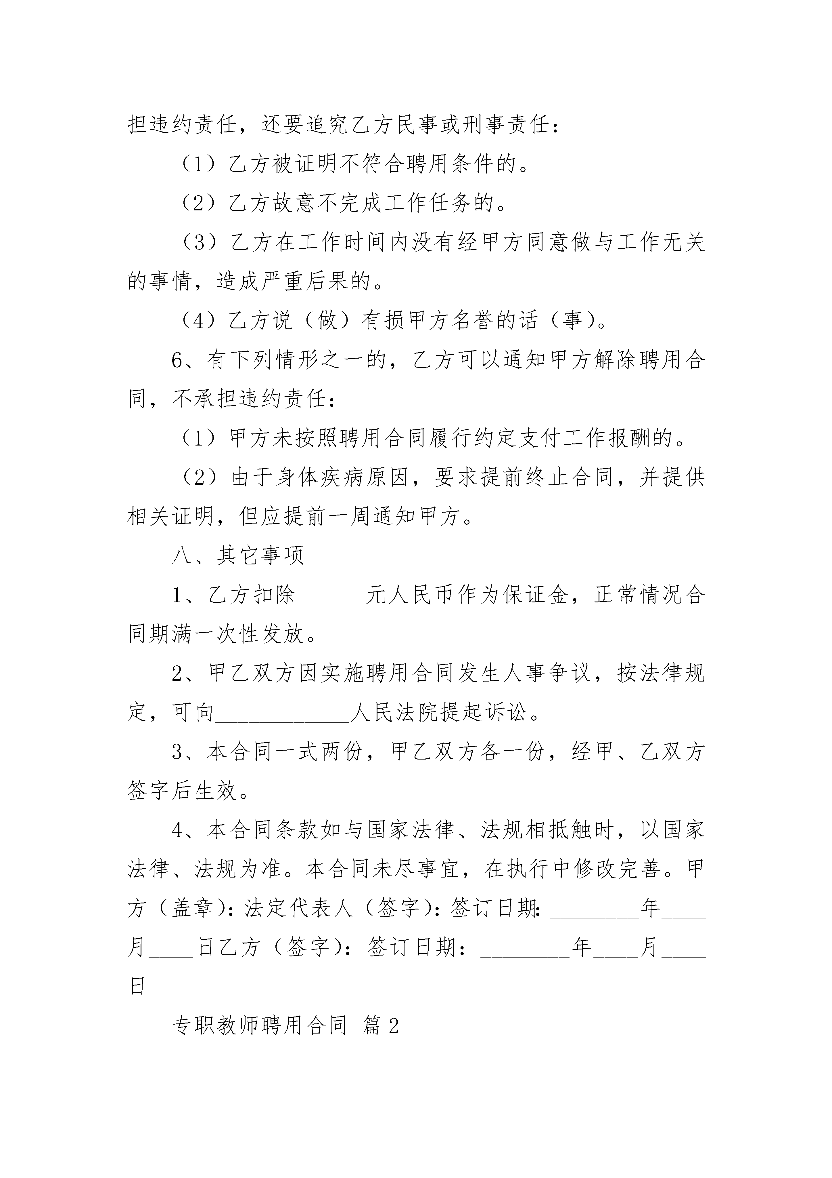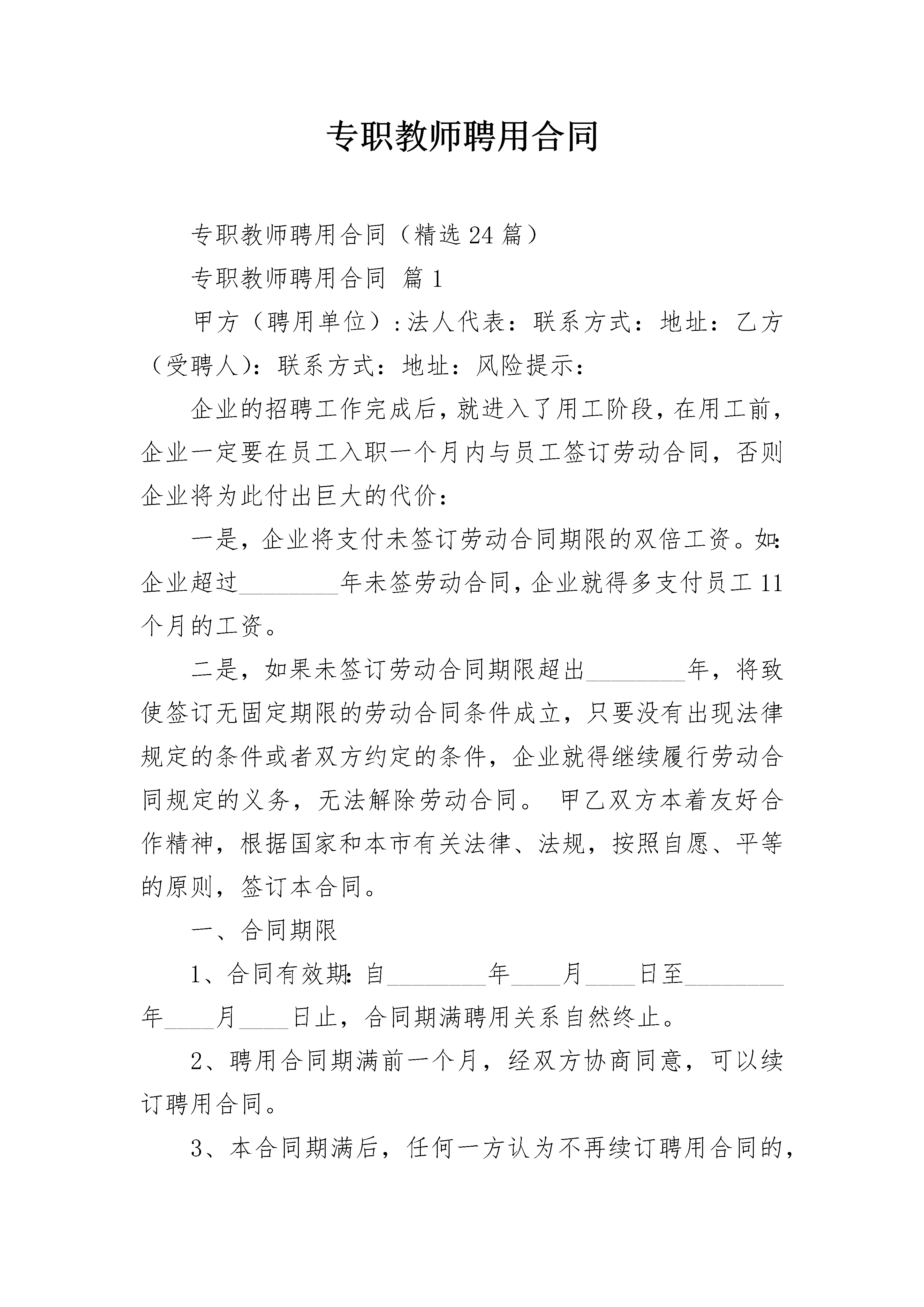 专职教师聘用合同专职教师聘用合同(精选24篇)专职教师聘用合同篇1甲方(聘用单位):法人代表:联系方式:地址:乙方(受聘人):联系方式:地址:风险提示:企业的招聘工作完成后,就进入了用工阶段,在用工前,企业一定要在员工入职一个月内与员工签订劳动合同,否则企业将为此付出巨大的代价:一是,企业将支付未签订劳动合同期限的双倍工资。如:企业超过________年未签劳动合同,企业就得多支付员工11个月的工资。二是,如果未签订劳动合同期限超出________年,将致使签订无固定期限的劳动合同条件成立,只要没有出现法律规定的条件或者双方约定的条件,企业就得继续履行劳动合同规定的义务,无法解除劳动合同。甲乙双方本着友好合作精神,根据国家和本市有关法律、法规,按照自愿、平等的原则,签订本合同。一、合同期限1、合同有效期:自________年____月____日至________年____月____日止,合同期满聘用关系自然终止。2、聘用合同期满前一个月,经双方协商同意,可以续订聘用合同。3、本合同期满后,任何一方认为不再续订聘用合同的,应在合同期满前一周通知对方。二、乙方的权利1、按约定获得____月工资_________元人民币报酬。2、要求甲方提供相关的劳动工具及宣传资料。3、每月_________天的休息时间(视情况确定休息日)。三、乙方的义务1、每天认真打扫本培训中心卫生,整理杂乱物品,杜绝有卫生死角。2、按要求每天外出招生,每月招生数量不得低于规定人数。3、认真辅导学生做好家庭作业,并认真检查。4、视实际情况协调作息时间,服从调配。5、热情接待来访学生及家长,接听来访电话并认真作记录,适时回访。6、在工作期间,确保学生安全,杜绝安全事故发生。四、甲方的权利统筹部署学习中心工作。五、甲方的义务1、每_________号按时支付报酬。2、对表现突出的工作人员给予嘉奖。3、给员工购买五险一金。(工资已包含五险一金)。风险提示:缴纳社会保险是企业的法定义务,即使是员工自己同意不缴纳社保,还签订了相关的协议,这也不能规避企业为员工缴纳社保的义务。因此,为劳动者缴纳社会保险,是企业必须而为的行为,否则,当员工以此通过法律程序维权,用人单位就要为此付出相应的代价。六、奖励与惩罚1、根据本培训中心已交费人数,给予乙方每个月_________元人的奖励。2、根据实际情况,对表现突出的员工,给予适当奖励。3、乙方没有按要求履行职责,每月扣除当月工资的______%______%(视情节而定)没有按规定完成招生名额的,扣除当月工资的______%______%(视情况而定)。七、本合同的变更、终止和解除1、本合同依法签订后,合同双方必须全面履行合同规定的义务,任何一方不得擅自变更合同。2、确需变更合同的,双方应协商一致,并按原签订程序变更合同。双方未达成一致意见的,原合同继续有效。3、本合同期满或者双方约定的合同终止条件出现时,聘用合同即自行终止。在聘用合同期满一周前,经双方同意,可以续订聘用合同。4、有下列情形之一的,甲方可以解除聘用合同,并且不承担违约责任:(1)发生不可抗力(即不能预见、不能避免并且不能克服的客观情况而导致合同不能继续)。(2)乙方被依法追究刑事责任的。(3)乙方态度恶劣,屡教不改的。5、有下列情形之一的,甲方可以解除合同,并且不承担违约责任,还要追究乙方民事或刑事责任:(1)乙方被证明不符合聘用条件的。(2)乙方故意不完成工作任务的。(3)乙方在工作时间内没有经甲方同意做与工作无关的事情,造成严重后果的。(4)乙方说(做)有损甲方名誉的话(事)。6、有下列情形之一的,乙方可以通知甲方解除聘用合同,不承担违约责任:(1)甲方未按照聘用合同履行约定支付工作报酬的。(2)由于身体疾病原因,要求提前终止合同,并提供相关证明,但应提前一周通知甲方。八、其它事项1、乙方扣除______元人民币作为保证金,正常情况合同期满一次性发放。2、甲乙双方因实施聘用合同发生人事争议,按法律规定,可向____________人民法院提起诉讼。3、本合同一式两份,甲乙双方各一份,经甲、乙双方签字后生效。4、本合同条款如与国家法律、法规相抵触时,以国家法律、法规为准。本合同未尽事宜,在执行中修改完善。甲方(盖章):法定代表人(签字):签订日期:________年____月____日乙方(签字):签订日期:________年____月____日专职教师聘用合同篇2甲方:_______________学校乙方:____________(受聘人)法人代表:____________姓名:____________注册地址:____________身份证号:____________甲方因工作需要聘用乙方为本单位员工,乙方也愿意受聘于甲方。现双方根据《中华人民共和国劳动
