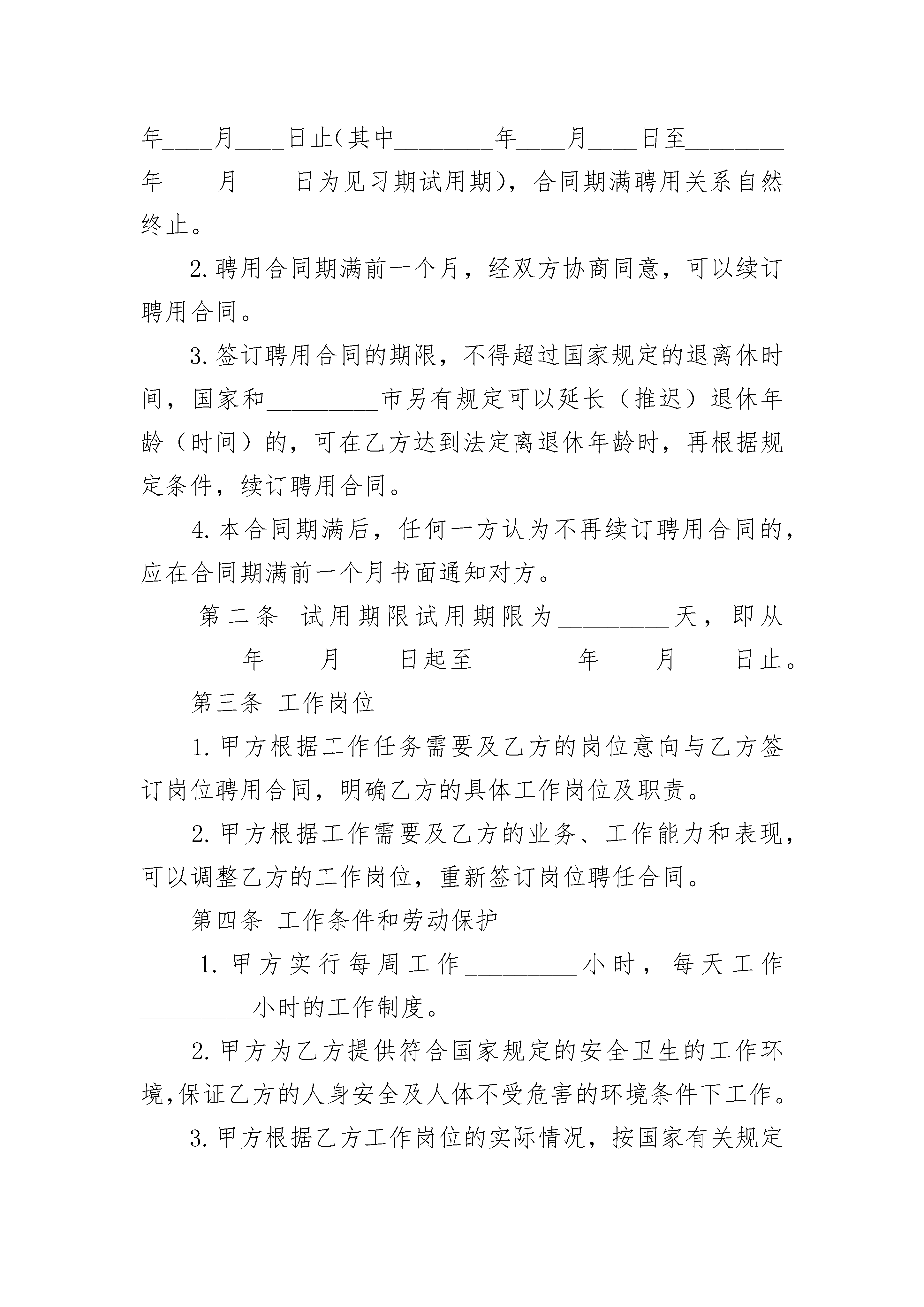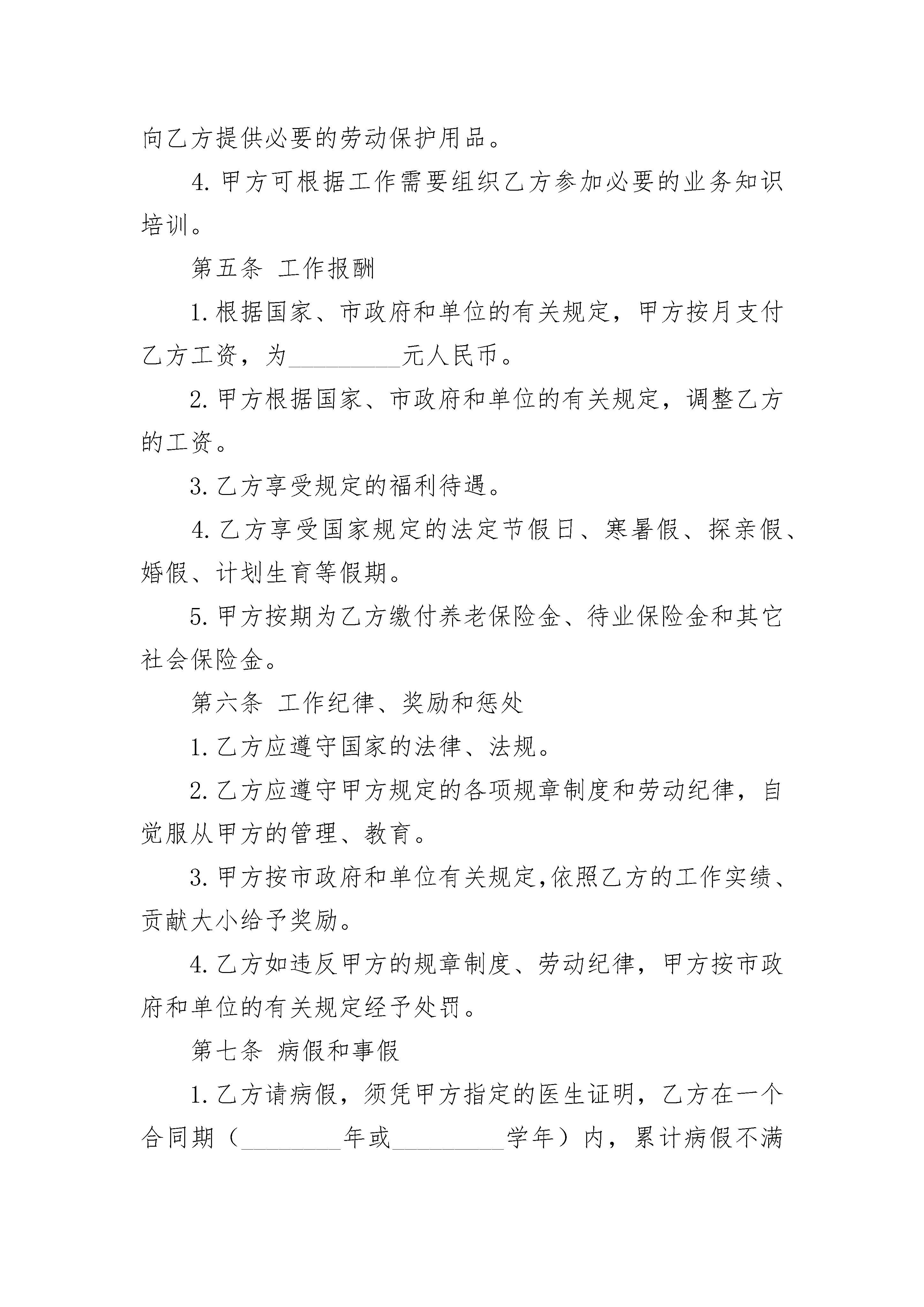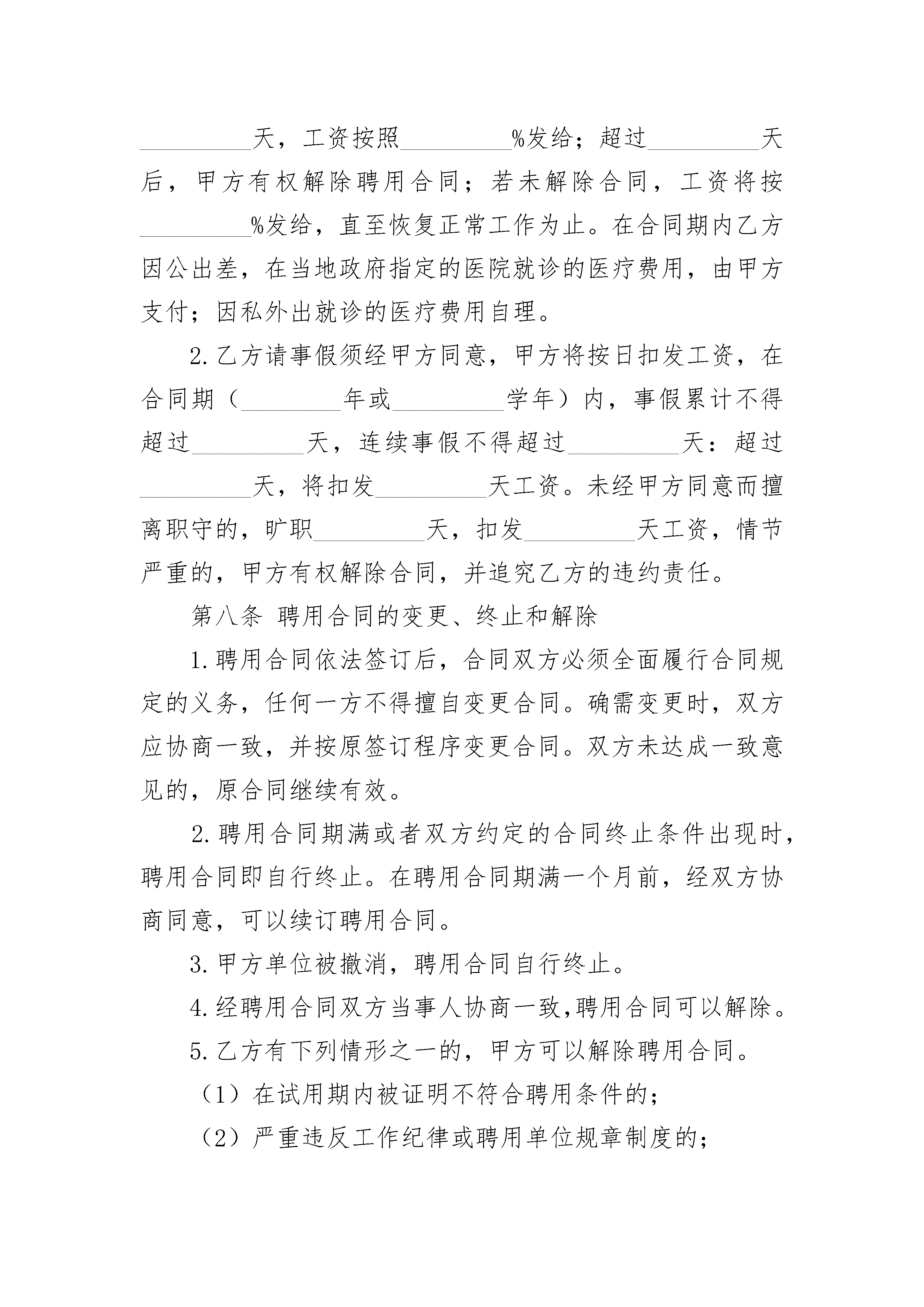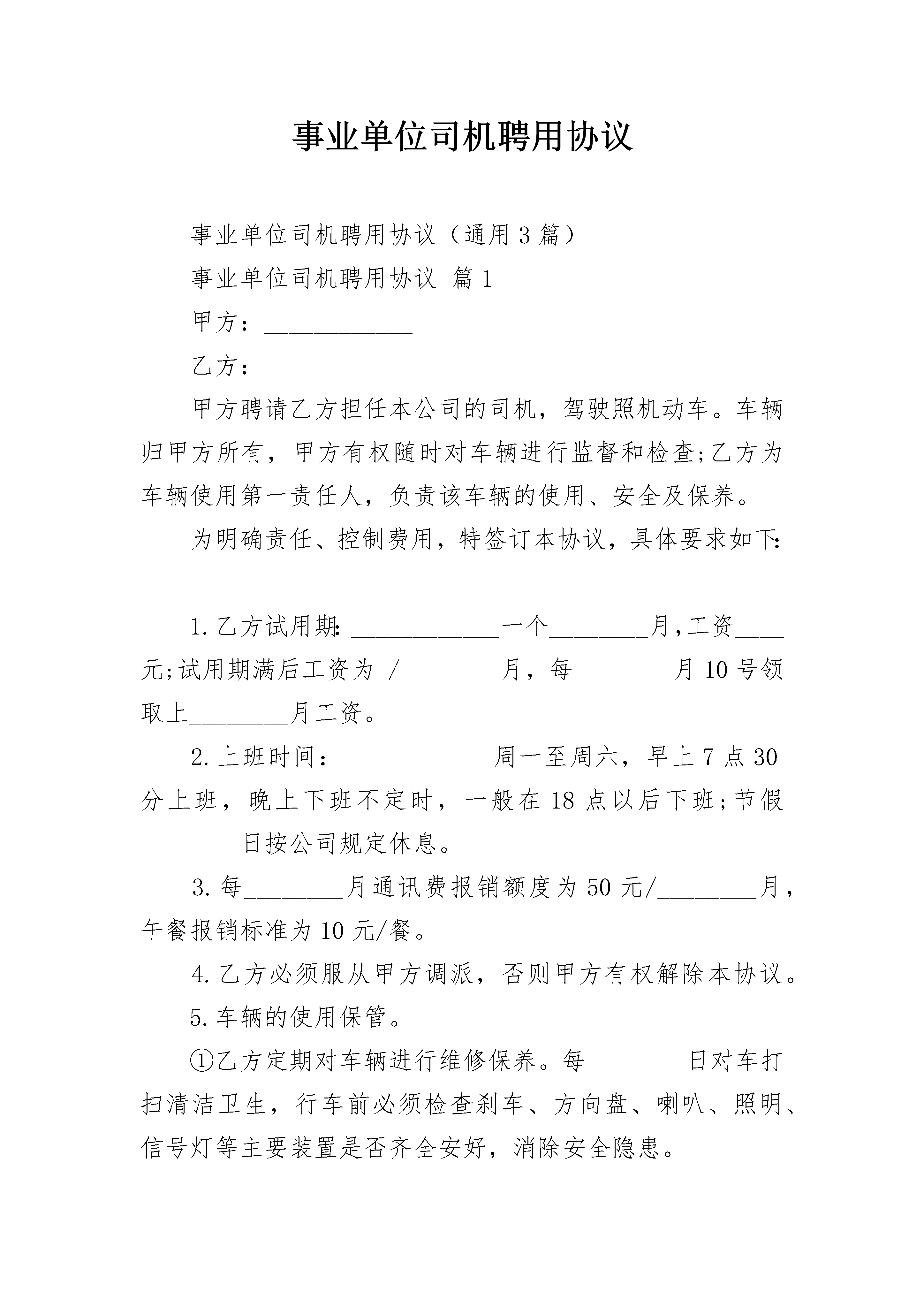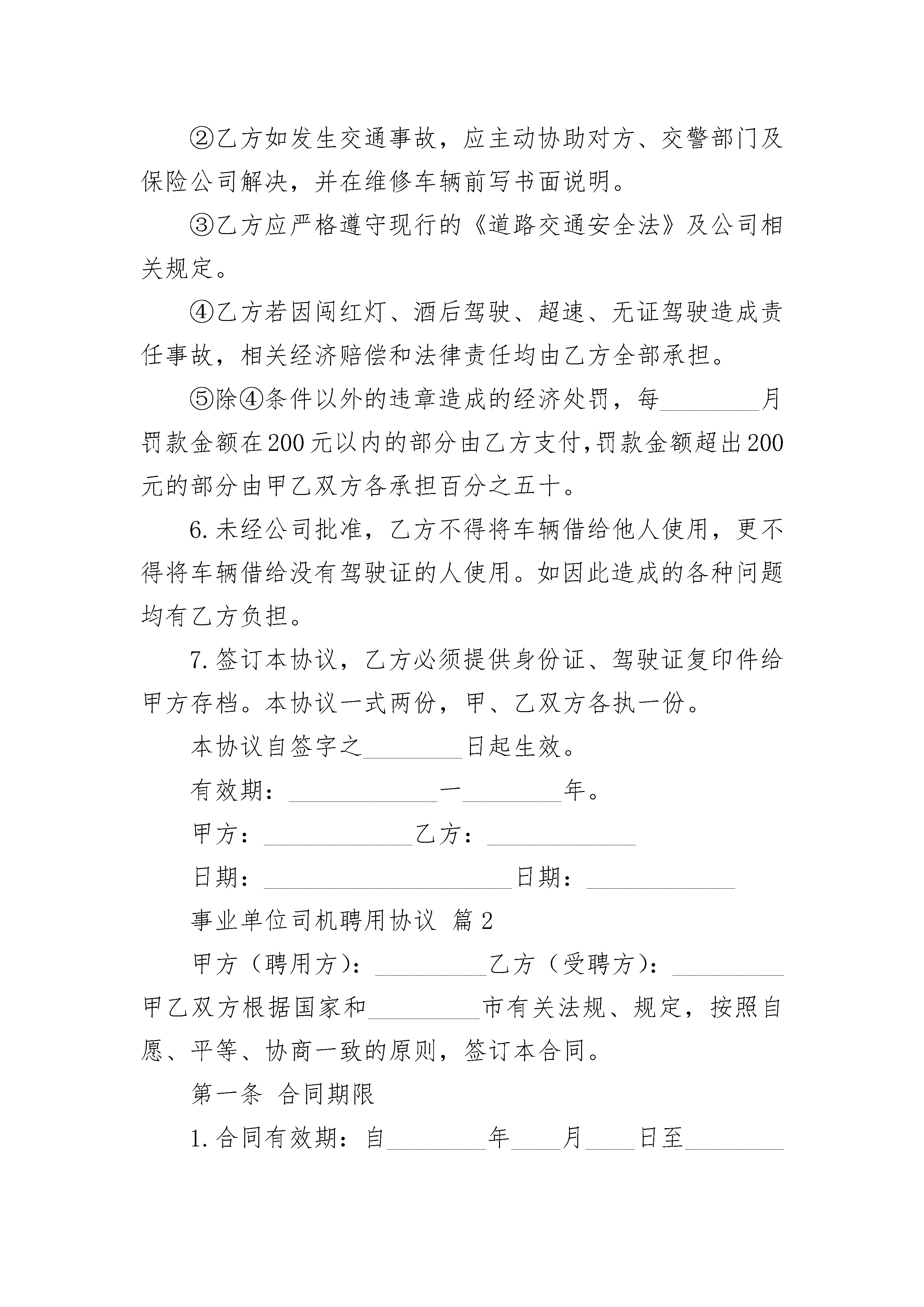 事业单位司机聘用协议事业单位司机聘用协议(通用3篇)事业单位司机聘用协议篇1甲方:____________乙方:____________甲方聘请乙方担任本公司的司机,驾驶照机动车。车辆归甲方所有,甲方有权随时对车辆进行监督和检查;乙方为车辆使用第一责任人,负责该车辆的使用、安全及保养。为明确责任、控制费用,特签订本协议,具体要求如下:____________1.乙方试用期:____________一个________月,工资____元;试用期满后工资为/________月,每________月10号领取上________月工资。2.上班时间:____________周一至周六,早上7点30分上班,晚上下班不定时,一般在18点以后下班;节假________日按公司规定休息。3.每________月通讯费报销额度为50元/________月,午餐报销标准为10元/餐。4.乙方必须服从甲方调派,否则甲方有权解除本协议。5.车辆的使用保管。①乙方定期对车辆进行维修保养。每________日对车打扫清洁卫生,行车前必须检查刹车、方向盘、喇叭、照明、信号灯等主要装置是否齐全安好,消除安全隐患。②乙方如发生交通事故,应主动协助对方、交警部门及保险公司解决,并在维修车辆前写书面说明。③乙方应严格遵守现行的《道路交通安全法》及公司相关规定。④乙方若因闯红灯、酒后驾驶、超速、无证驾驶造成责任事故,相关经济赔偿和法律责任均由乙方全部承担。⑤除④条件以外的违章造成的经济处罚,每________月罚款金额在200元以内的部分由乙方支付,罚款金额超出200元的部分由甲乙双方各承担百分之五十。6.未经公司批准,乙方不得将车辆借给他人使用,更不得将车辆借给没有驾驶证的人使用。如因此造成的各种问题均有乙方负担。7.签订本协议,乙方必须提供身份证、驾驶证复印件给甲方存档。本协议一式两份,甲、乙双方各执一份。本协议自签字之________日起生效。有效期:____________一________年。甲方:____________乙方:____________日期:____________________日期:____________事业单位司机聘用协议篇2甲方(聘用方):_________乙方(受聘方):_________甲乙双方根据国家和_________市有关法规、规定,按照自愿、平等、协商一致的原则,签订本合同。第一条合同期限1.合同有效期:自________年____月____日至________年____月____日止(其中________年____月____日至________年____月____日为见习期试用期),合同期满聘用关系自然终止。2.聘用合同期满前一个月,经双方协商同意,可以续订聘用合同。3.签订聘用合同的期限,不得超过国家规定的退离休时间,国家和_________市另有规定可以延长(推迟)退休年龄(时间)的,可在乙方达到法定离退休年龄时,再根据规定条件,续订聘用合同。4.本合同期满后,任何一方认为不再续订聘用合同的,应在合同期满前一个月书面通知对方。第二条试用期限试用期限为_________天,即从________年____月____日起至________年____月____日止。第三条工作岗位1.甲方根据工作任务需要及乙方的岗位意向与乙方签订岗位聘用合同,明确乙方的具体工作岗位及职责。2.甲方根据工作需要及乙方的业务、工作能力和表现,可以调整乙方的工作岗位,重新签订岗位聘任合同。第四条工作条件和劳动保护1.甲方实行每周工作_________小时,每天工作_________小时的工作制度。2.甲方为乙方提供符合国家规定的安全卫生的工作环境,保证乙方的人身安全及人体不受危害的环境条件下工作。3.甲方根据乙方工作岗位的实际情况,按国家有关规定向乙方提供必要的劳动保护用品。4.甲方可根据工作需要组织乙方参加必要的业务知识培训。第五条工作报酬1.根据国家、市政府和单位的有关规定,甲方按月支付乙方工资,为_________元人民币。2.甲方根据国家、市政府和单位的有关规定,调整乙方的工资。3.乙方享受规定的福利待遇。4.乙方享受国家规定的法定节假日、寒暑假、探亲假、婚假、计划生育等假期。5.甲方按期为乙方缴付养老保险金、待业保险金和其它社会保险金。第六条工作纪律、奖励和惩处1.乙方应遵守国家的法律、法规。2.乙方应遵守甲方规定的各项规章制度和劳动纪律,自觉服从甲方的管理、教育。3.甲方按市政府和单位有关规定,依照乙方的工作实绩、贡献大小给予奖励。4.乙方如违反甲方的规章制度、劳动纪律,甲方按市政府和单位的有关规定经予处罚。第七条病假和事假1.乙方请病假,须凭甲方指定的医生证明,乙方在一个合同期(________年或_________学年)内,