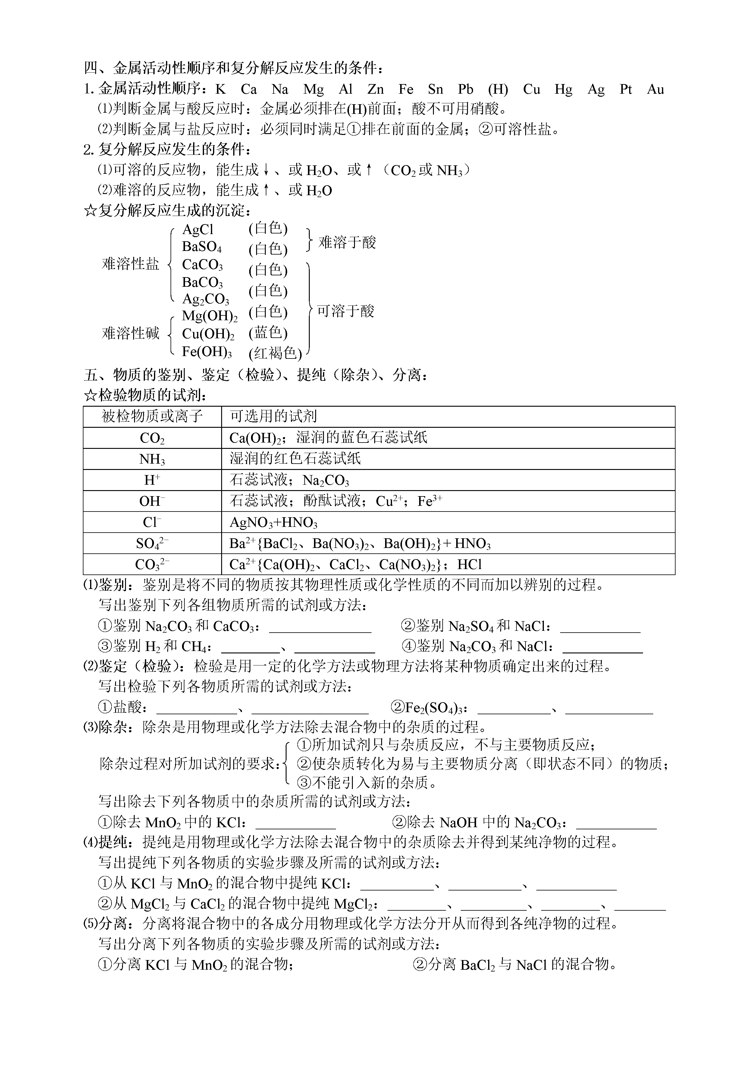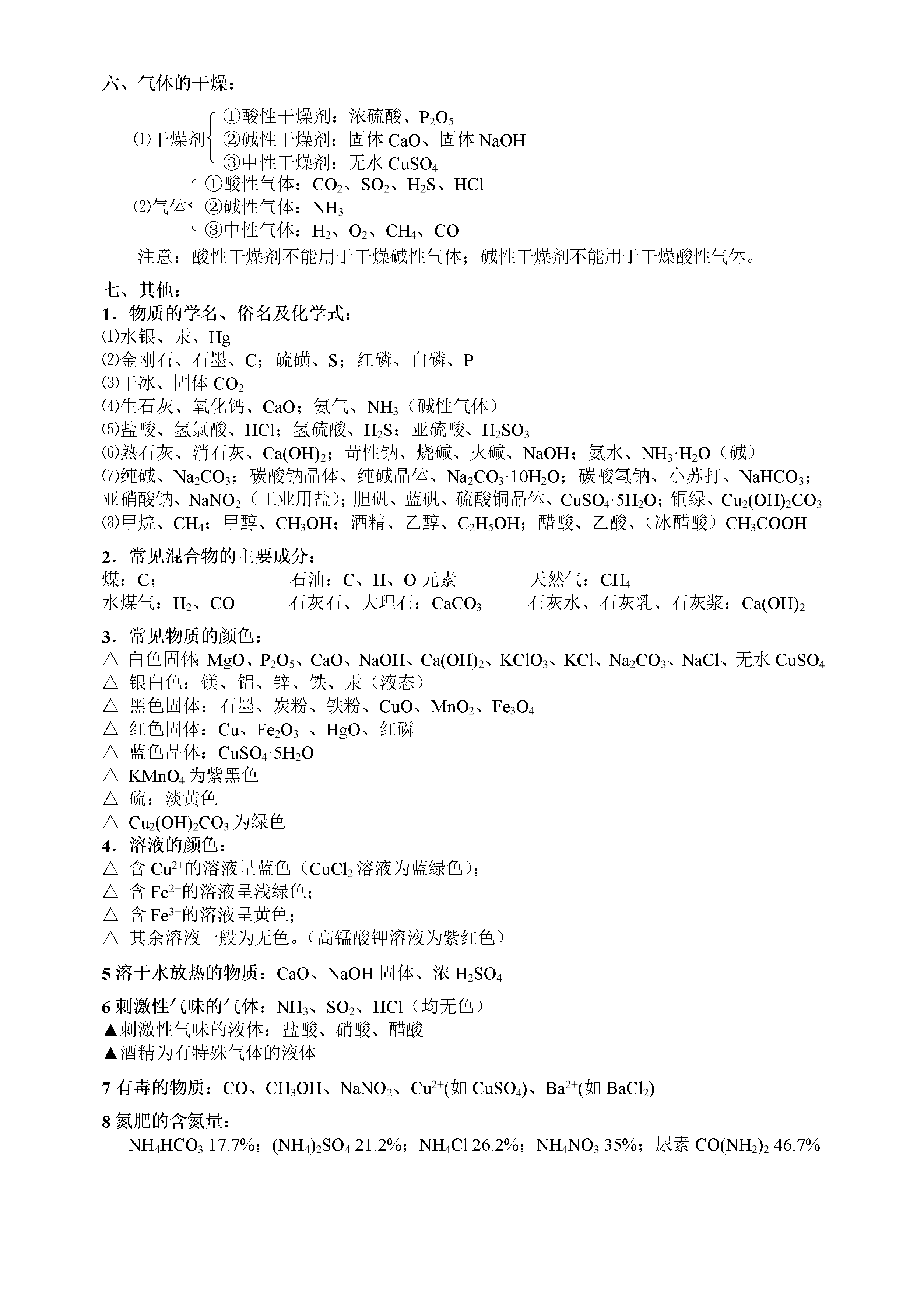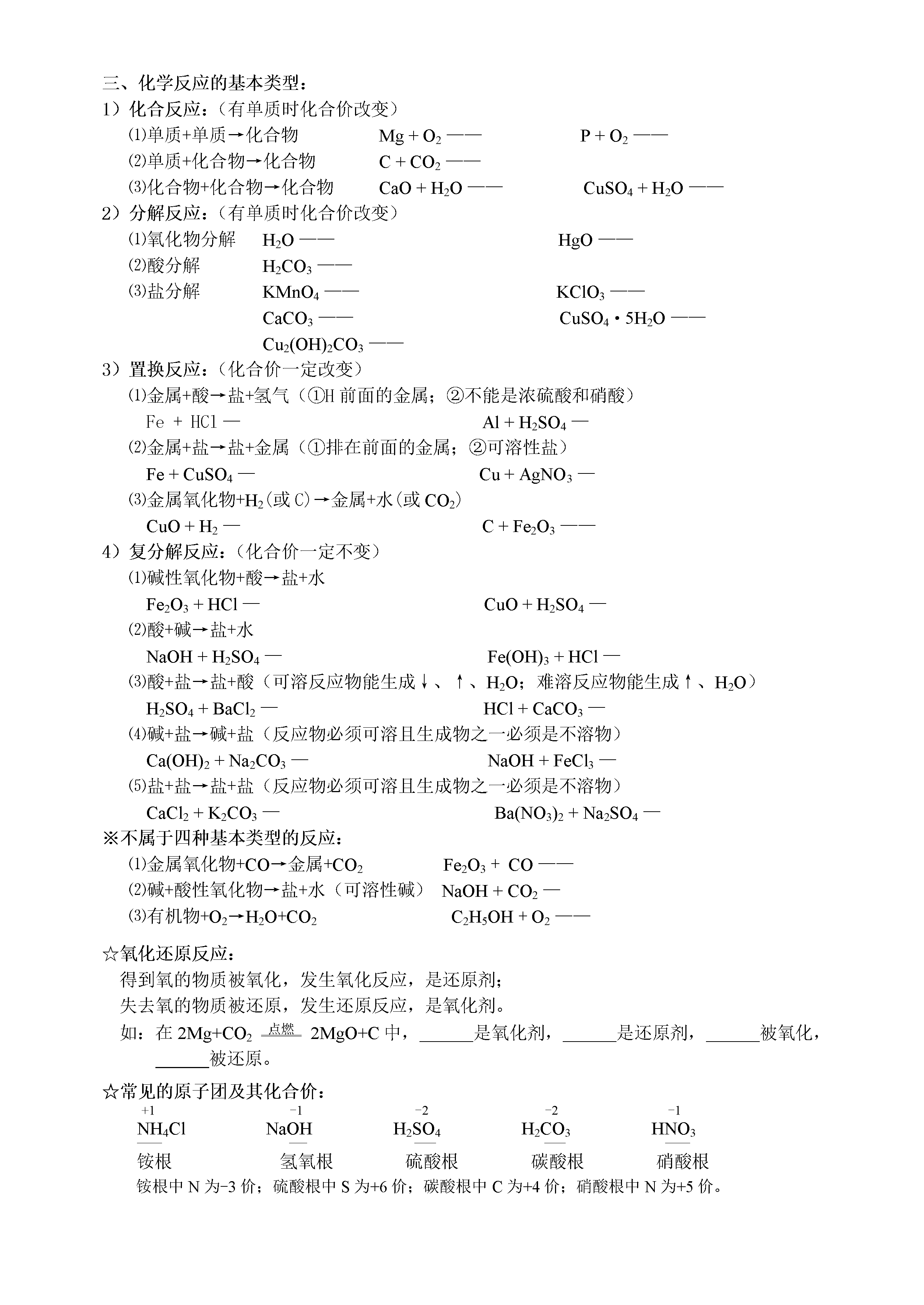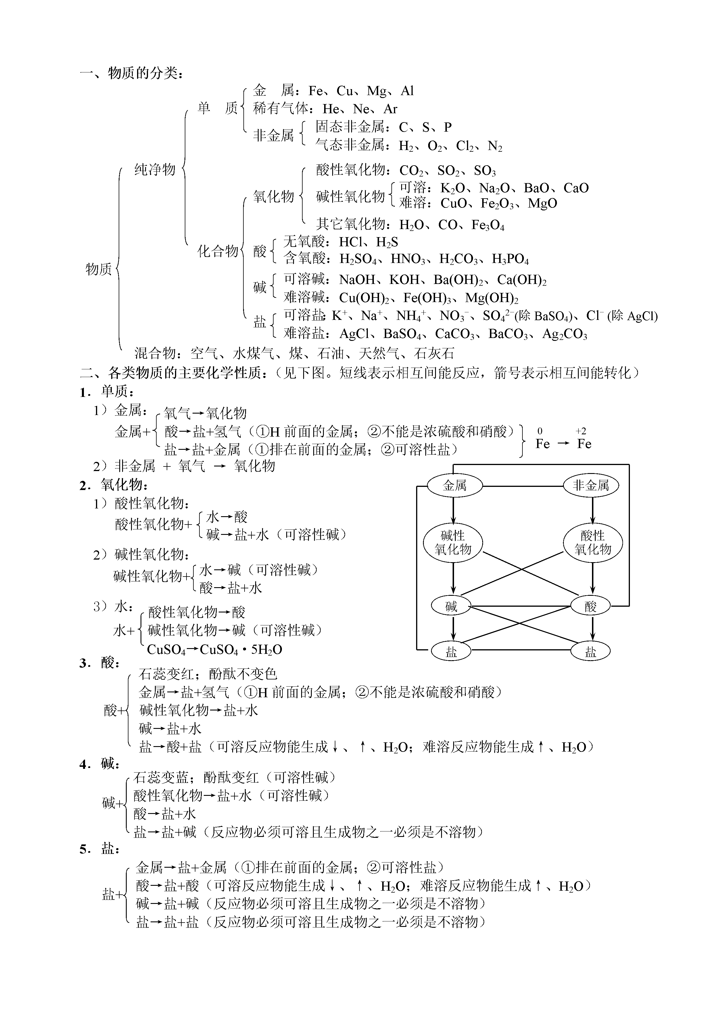 金属:Fe、Cu、Mg、Al单质稀有气体:He、Ne、Ar非金属纯净物酸性氧化物:CO2、SO2、SO3氧化物碱性氧化物其它氧化物:H2O、CO、Fe3O4化合物酸物质碱盐混合物:空气、水煤气、煤、石油、天然气、石灰石可溶盐:K+、Na+、NH4+、NO3-、SO42-(除BaSO4)、Cl-(除AgCl)难溶盐:AgCl、BaSO4、CaCO3、BaCO3、Ag2CO3可溶碱:NaOH、KOH、Ba(OH)2、Ca(OH)2难溶碱:Cu(OH)2、Fe(OH)3、Mg(OH)2无氧酸:HCl、H2S含氧酸:H2SO4、HNO3、H2CO3、H3PO4可溶:K2O、Na2O、BaO、CaO难溶:CuO、Fe2O3、MgO固态非金属:C、S、P气态非金属:H2、O2、Cl2、N2一、物质的分类:二、各类物质的主要化学性质:(见下图。短线表示相互间能反应,箭号表示相互间能转化)1.单质:0+2Fe→Fe氧气→氧化物金属+酸→盐+氢气(①H前面的金属;②不能是浓硫酸和硝酸)盐→盐+金属(①排在前面的金属;②可溶性盐)1)金属:金属碱性氧化物碱盐非金属酸性氧化物酸盐2)非金属+氧气→氧化物2.氧化物:酸性氧化物+水→酸碱→盐+水(可溶性碱)1)酸性氧化物:碱性氧化物+水→碱(可溶性碱)酸→盐+水2)碱性氧化物:酸性氧化物→酸水+碱性氧化物→碱(可溶性碱)CuSO4→CuSO4·5H2O3)水:石蕊变红;酚酞不变色金属→盐+氢气(①H前面的金属;②不能是浓硫酸和硝酸)酸+碱性氧化物→盐+水碱→盐+水盐→酸+盐(可溶反应物能生成↓、↑、H2O;难溶反应物能生成↑、H2O)3.酸:石蕊变蓝;酚酞变红(可溶性碱)酸性氧化物→盐+水(可溶性碱)酸→盐+水盐→盐+碱(反应物必须可溶且生成物之一必须是不溶物)碱+4.碱:5.盐:金属→盐+金属(①排在前面的金属;②可溶性盐)酸→盐+酸(可溶反应物能生成↓、↑、H2O;难溶反应物能生成↑、H2O)碱→盐+碱(反应物必须可溶且生成物之一必须是不溶物)盐→盐+盐(反应物必须可溶且生成物之一必须是不溶物)盐+三、化学反应的基本类型:1)化合反应:(有单质时化合价改变)⑴单质+单质→化合物Mg+O2——P+O2——⑵单质+化合物→化合物C+CO2——⑶化合物+化合物→化合物CaO+H2O——CuSO4+H2O——2)分解反应:(有单质时化合价改变)⑴氧化物分解H2O——HgO——⑵酸分解H2CO3——⑶盐分解KMnO4——KClO3——CaCO3——CuSO4·5H2O——Cu2(OH)2CO3——3)置换反应:(化合价一定改变)⑴金属+酸→盐+氢气(①H前面的金属;②不能是浓硫酸和硝酸)Fe+HCl—Al+H2SO4—⑵金属+盐→盐+金属(①排在前面的金属;②可溶性盐)Fe+CuSO4—Cu+AgNO3—⑶金属氧化物+H2(或C)→金属+水(或CO2)CuO+H2—C+Fe2O3——4)复分解反应:(化合价一定不变)⑴碱性氧化物+酸→盐+水Fe2O3+HCl—CuO+H2SO4—⑵酸+碱→盐+水NaOH+H2SO4—Fe(OH)3+HCl—⑶酸+盐→盐+酸(可溶反应物能生成↓、↑、H2O;难溶反应物能生成↑、H2O)H2SO4+BaCl2—HCl+CaCO3—⑷碱+盐→碱+盐(反应物必须可溶且生成物之一必须是不溶物)Ca(OH)2+Na2CO3—NaOH+FeCl3—⑸盐+盐→盐+盐(反应物必须可溶且生成物之一必须是不溶物)CaCl2+K2CO3—Ba(NO3)2+Na2SO4—※不属于四种基本类型的反应:⑴金属氧化物+CO→金属+CO2Fe2O3+CO——⑵碱+酸性氧化物→盐+水(可溶性碱)NaOH+CO2—⑶有机物+O2→H2O+CO2C2H5OH+O2——☆氧化还原反应:得到氧的物质被氧化,发生氧化反应,是还原剂;失去氧的物质被还原,发生还原反应,是氧化剂。如:在2Mg+CO2点燃2MgO+C中,是氧化剂,是还原剂,被氧化,被还原。+1-1-2-2-1NH4ClNaOHH2SO4H2CO3HNO3铵根氢氧根硫酸根碳酸根硝酸根铵根中N为-3价;硫酸根中S为+6价;碳酸根中C为+4价;硝酸根中N为+5价。☆常见的原子团及其化合价:四、金属活动性顺序和复分解反应发生的条件:1.金属活动性顺序:KCaNaMgAlZnFeSnPb(H)CuHgAgPtAu⑴判断金属与酸反应时:金属