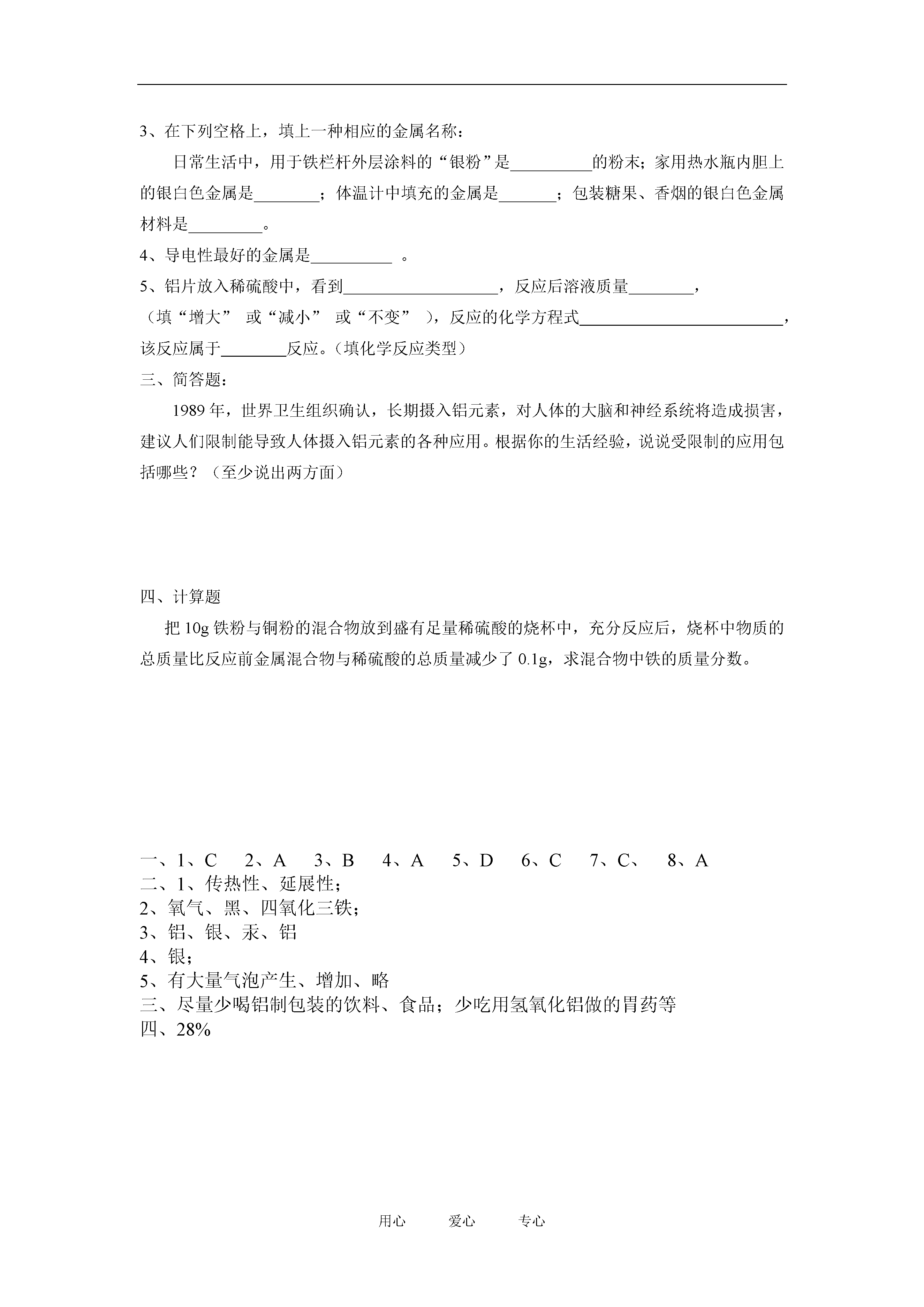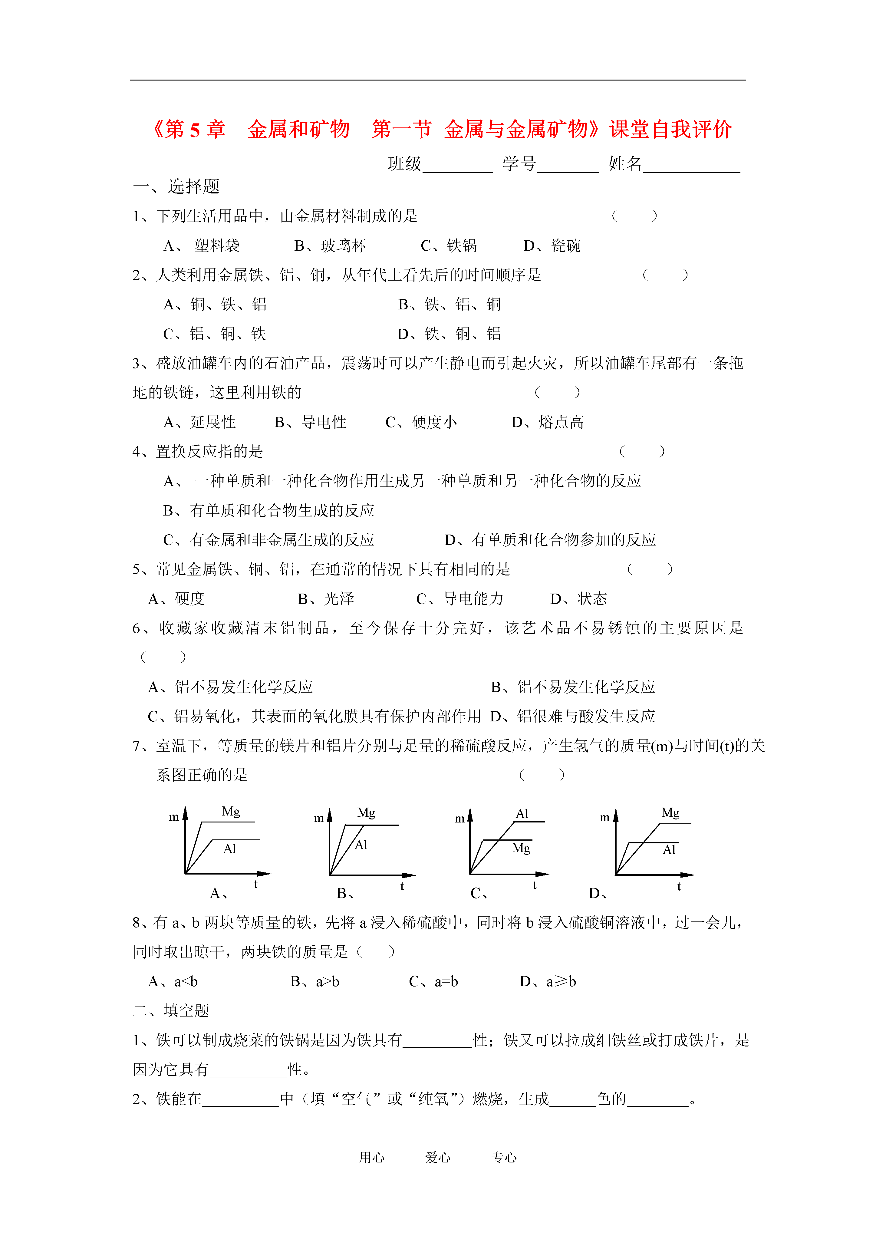 用心爱心专心《第5章金属和矿物第一节金属与金属矿物》课堂自我评价班级学号姓名一、选择题1、下列生活用品中,由金属材料制成的是()塑料袋B、玻璃杯C、铁锅D、瓷碗2、人类利用金属铁、铝、铜,从年代上看先后的时间顺序是()A、铜、铁、铝B、铁、铝、铜C、铝、铜、铁D、铁、铜、铝3、盛放油罐车内的石油产品,震荡时可以产生静电而引起火灾,所以油罐车尾部有一条拖地的铁链,这里利用铁的()A、延展性B、导电性C、硬度小D、熔点高4、置换反应指的是()一种单质和一种化合物作用生成另一种单质和另一种化合物的反应有单质和化合物生成的反应有金属和非金属生成的反应D、有单质和化合物参加的反应5、常见金属铁、铜、铝,在通常的情况下具有相同的是()A、硬度B、光泽C、导电能力D、状态6、收藏家收藏清末铝制品,至今保存十分完好,该艺术品不易锈蚀的主要原因是()A、铝不易发生化学反应B、铝不易发生化学反应C、铝易氧化,其表面的氧化膜具有保护内部作用D、铝很难与酸发生反应7、室温下,等质量的镁片和铝片分别与足量的稀硫酸反应,产生氢气的质量(m)与时间(t)的关系图正确的是()tMgmAlmMgtAlAlmtMgtMgmAlA、B、C、D、8、有a、b两块等质量的铁,先将a浸入稀硫酸中,同时将b浸入硫酸铜溶液中,过一会儿,同时取出晾干,两块铁的质量是()A、a<bB、a>bC、a=bD、a≥b二、填空题1、铁可以制成烧菜的铁锅是因为铁具有性;铁又可以拉成细铁丝或打成铁片,是因为它具有性。2、铁能在中(填“空气”或“纯氧”)燃烧,生成色的。3、在下列空格上,填上一种相应的金属名称:日常生活中,用于铁栏杆外层涂料的“银粉”是__________的粉末;家用热水瓶内胆上的银白色金属是________;体温计中填充的金属是_______;包装糖果、香烟的银白色金属材料是_________。4、导电性最好的金属是。5、铝片放入稀硫酸中,看到,反应后溶液质量,(填“增大”或“减小”或“不变”),反应的化学方程式,该反应属于反应。(填化学反应类型)三、简答题:1989年,世界卫生组织确认,长期摄入铝元素,对人体的大脑和神经系统将造成损害,建议人们限制能导致人体摄入铝元素的各种应用。根据你的生活经验,说说受限制的应用包括哪些?(至少说出两方面)四、计算题把10g铁粉与铜粉的混合物放到盛有足量稀硫酸的烧杯中,充分反应后,烧杯中物质的总质量比反应前金属混合物与稀硫酸的总质量减少了0.1g,求混合物中铁的质量分数。一、1、C2、A3、B4、A5、D6、C7、C、8、A二、1、传热性、延展性;2、氧气、黑、四氧化三铁;3、铝、银、汞、铝4、银;5、有大量气泡产生、增加、略三、尽量少喝铝制包装的饮料、食品;少吃用氢氧化铝做的胃药等四、28%