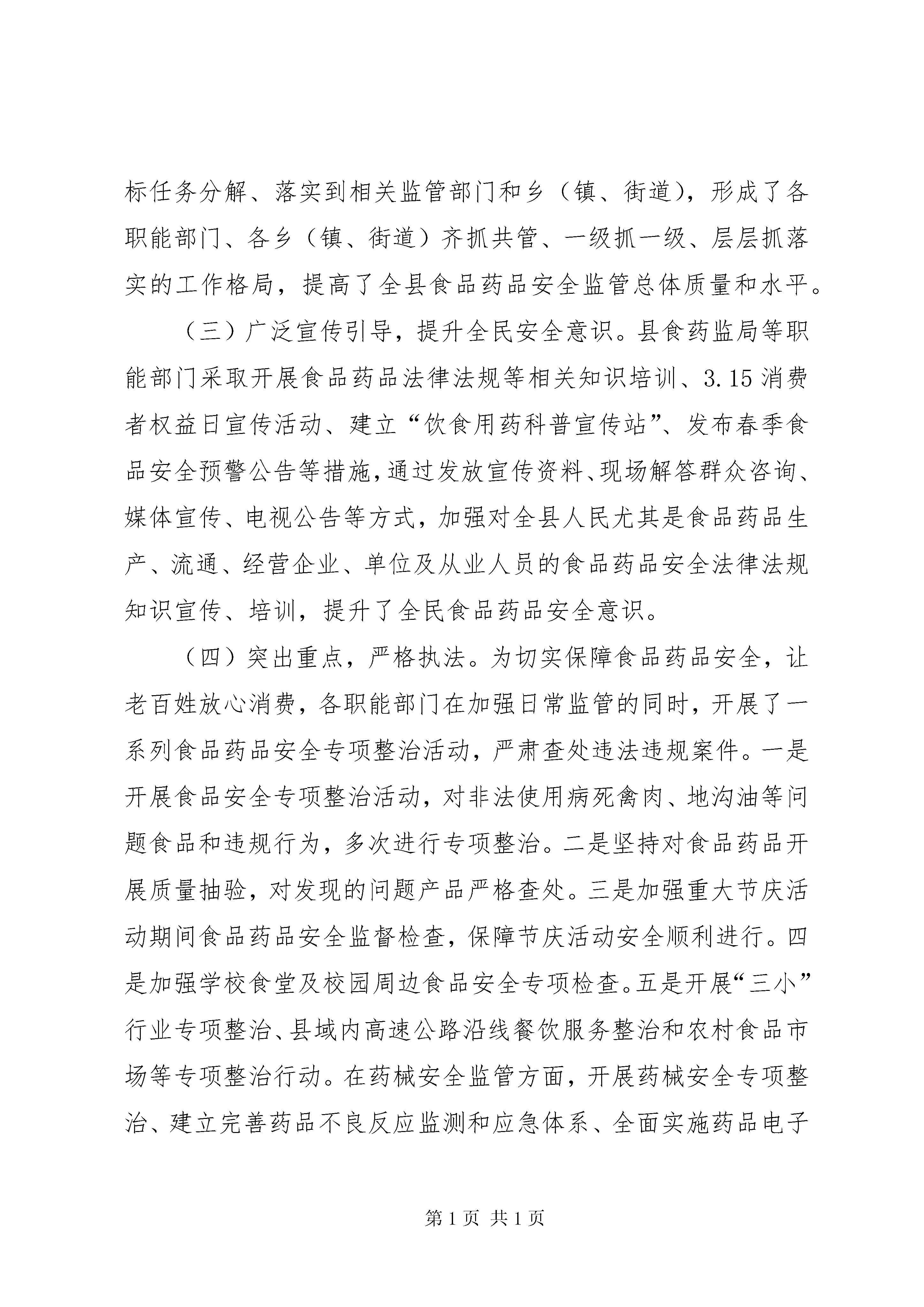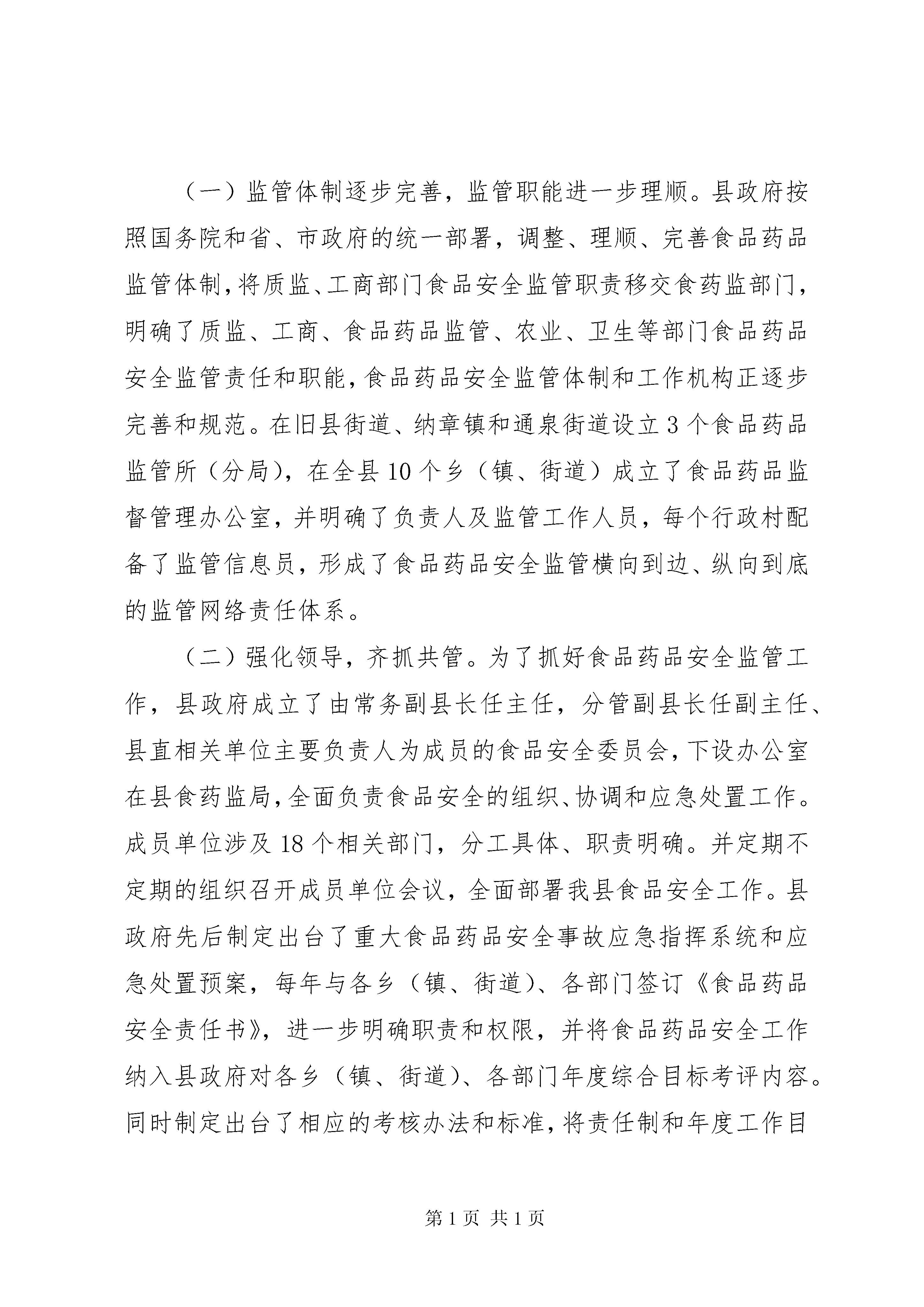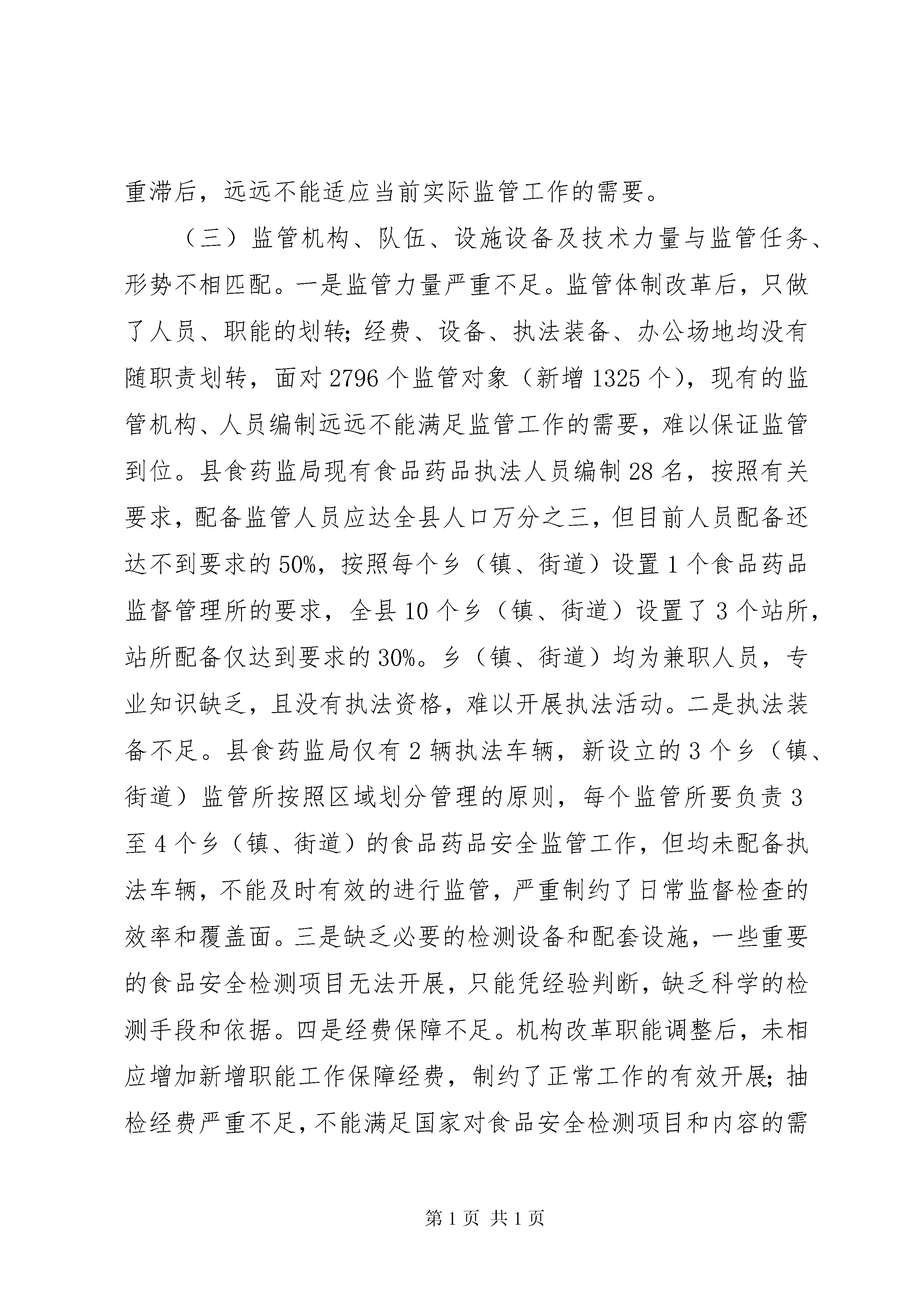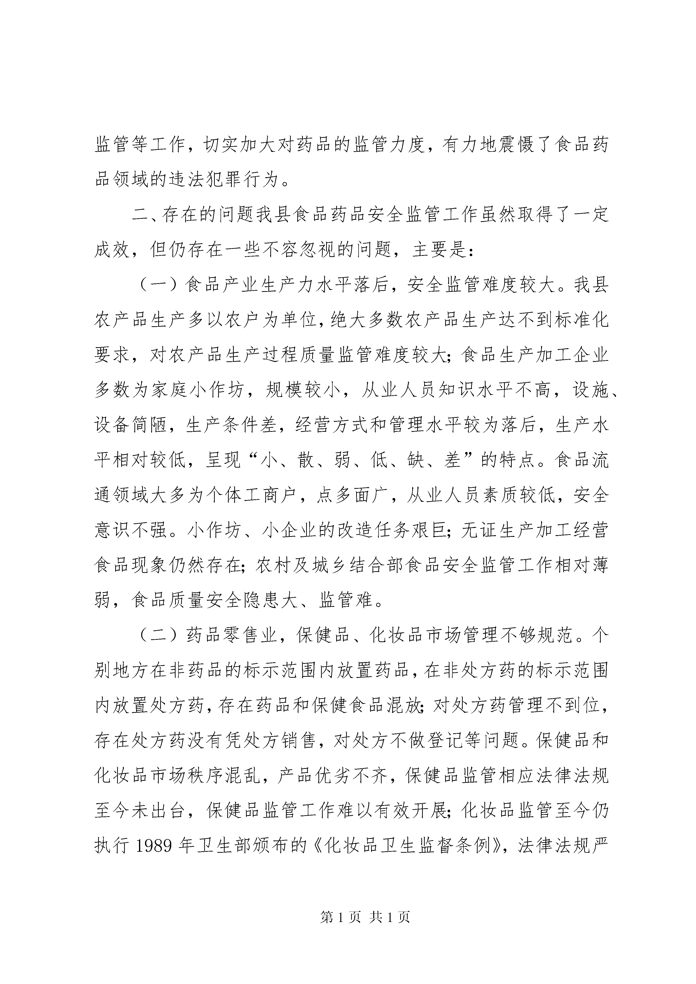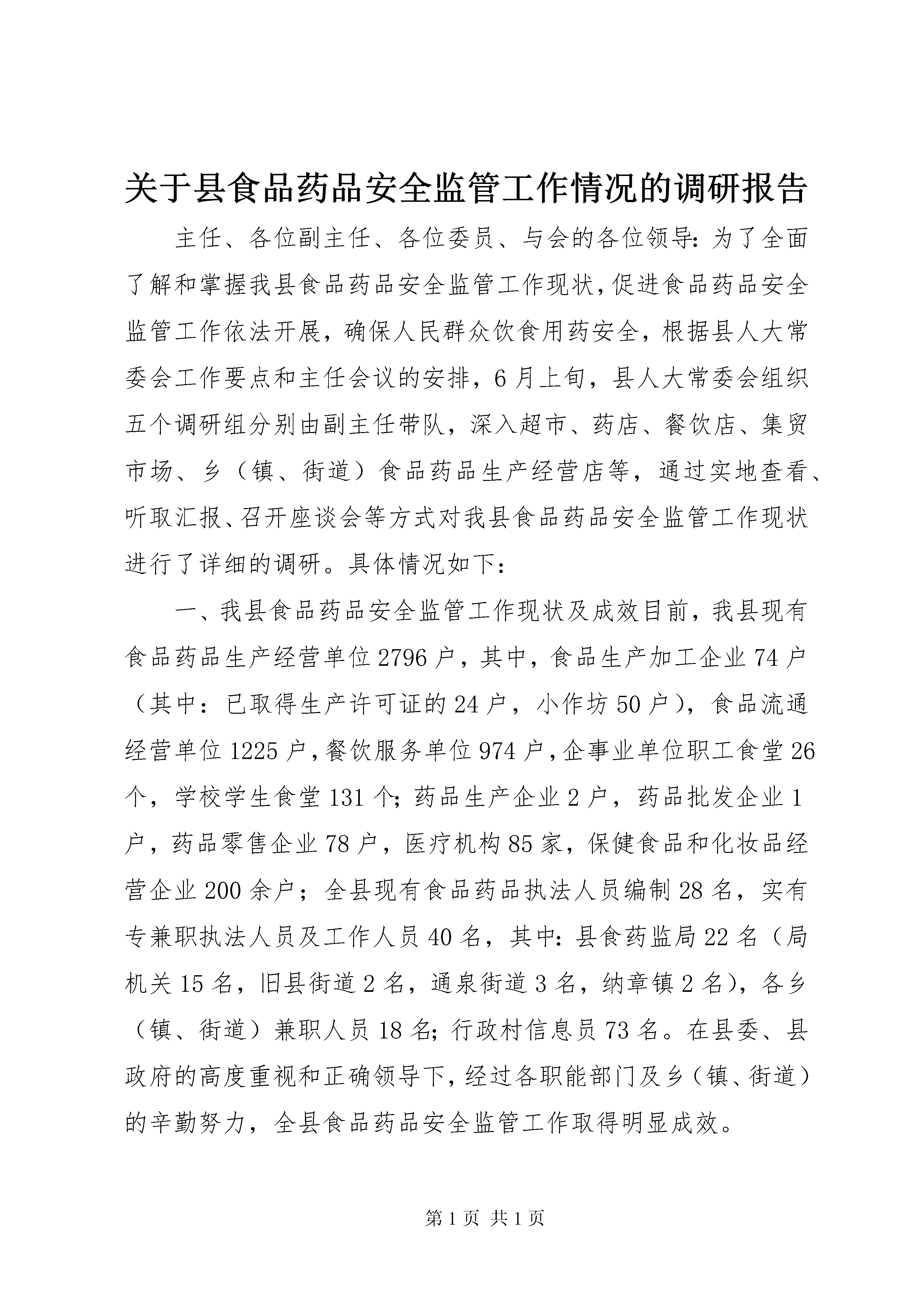 关于县食品药品安全监管工作情况的调研报告主任、各位副主任、各位委员、与会的各位领导:为了全面了解和掌握我县食品药品安全监管工作现状,促进食品药品安全监管工作依法开展,确保人民群众饮食用药安全,根据县人大常委会工作要点和主任会议的安排,6月上旬,县人大常委会组织五个调研组分别由副主任带队,深入超市、药店、餐饮店、集贸市场、乡(镇、街道)食品药品生产经营店等,通过实地查看、听取汇报、召开座谈会等方式对我县食品药品安全监管工作现状进行了详细的调研。具体情况如下:一、我县食品药品安全监管工作现状及成效目前,我县现有食品药品生产经营单位2796户,其中,食品生产加工企业74户(其中:已取得生产许可证的24户,小作坊50户),食品流通经营单位1225户,餐饮服务单位974户,企事业单位职工食堂26个,学校学生食堂131个;药品生产企业2户,药品批发企业1户,药品零售企业78户,医疗机构85家,保健食品和化妆品经营企业200余户;全县现有食品药品执法人员编制28名,实有专兼职执法人员及工作人员40名,其中:县食药监局22名(局机关15名,旧县街道2名,通泉街道3名,纳章镇2名),各乡(镇、街道)兼职人员18名;行政村信息员73名。在县委、县政府的高度重视和正确领导下,经过各职能部门及乡(镇、街道)的辛勤努力,全县食品药品安全监管工作取得明显成效。(一)监管体制逐步完善,监管职能进一步理顺。县政府按照国务院和省、市政府的统一部署,调整、理顺、完善食品药品监管体制,将质监、工商部门食品安全监管职责移交食药监部门,明确了质监、工商、食品药品监管、农业、卫生等部门食品药品安全监管责任和职能,食品药品安全监管体制和工作机构正逐步完善和规范。在旧县街道、纳章镇和通泉街道设立3个食品药品监管所(分局),在全县10个乡(镇、街道)成立了食品药品监督管理办公室,并明确了负责人及监管工作人员,每个行政村配备了监管信息员,形成了食品药品安全监管横向到边、纵向到底的监管网络责任体系。(二)强化领导,齐抓共管。为了抓好食品药品安全监管工作,县政府成立了由常务副县长任主任,分管副县长任副主任、县直相关单位主要负责人为成员的食品安全委员会,下设办公室在县食药监局,全面负责食品安全的组织、协调和应急处置工作。成员单位涉及18个相关部门,分工具体、职责明确。并定期不定期的组织召开成员单位会议,全面部署我县食品安全工作。县政府先后制定出台了重大食品药品安全事故应急指挥系统和应急处置预案,每年与各乡(镇、街道)、各部门签订《食品药品安全责任书》,进一步明确职责和权限,并将食品药品安全工作纳入县政府对各乡(镇、街道)、各部门年度综合目标考评内容。同时制定出台了相应的考核办法和标准,将责任制和年度工作目标任务分解、落实到相关监管部门和乡(镇、街道),形成了各职能部门、各乡(镇、街道)齐抓共管、一级抓一级、层层抓落实的工作格局,提高了全县食品药品安全监管总体质量和水平。(三)广泛宣传引导,提升全民安全意识。县食药监局等职能部门采取开展食品药品法律法规等相关知识培训、3.15消费者权益日宣传活动、建立“饮食用药科普宣传站”、发布春季食品安全预警公告等措施,通过发放宣传资料、现场解答群众咨询、媒体宣传、电视公告等方式,加强对全县人民尤其是食品药品生产、流通、经营企业、单位及从业人员的食品药品安全法律法规知识宣传、培训,提升了全民食品药品安全意识。(四)突出重点,严格执法。为切实保障食品药品安全,让老百姓放心消费,各职能部门在加强日常监管的同时,开展了一系列食品药品安全专项整治活动,严肃查处违法违规案件。一是开展食品安全专项整治活动,对非法使用病死禽肉、地沟油等问题食品和违规行为,多次进行专项整治。二是坚持对食品药品开展质量抽验,对发现的问题产品严格查处。三是加强重大节庆活动期间食品药品安全监督检查,保障节庆活动安全顺利进行。四是加强学校食堂及校园周边食品安全专项检查。五是开展“三小”行业专项整治、县域内高速公路沿线餐饮服务整治和农村食品市场等专项整治行动。在药械安全监管方面,开展药械安全专项整治、建立完善药品不良反应监测和应急体系、全面实施药品电子监管等工作,切实加大对药品的监管力度,有力地震慑了食品药品领域的违法犯罪行为。二、存在的问题我县食品药品安全监管工作虽然取得了一定成效,但仍存在一些不容忽视的问题,主要是:(一)食品产业生产力水平落后,安全监管难度较大。我县农产品生产多以农户为单位,绝大多数农产品生产达不到标准化要求,对农产品生产过程质量监管难度较大;食品生产加工企业多数为家庭小作坊,规模较小,从业人员知识水平不高,设施、设备简陋,生产条件差,经营方式和管理水平较为落后,生产水平相对较低,呈现“小、散、弱、低、缺、差”的特点。食品流通领域大多为个体工商