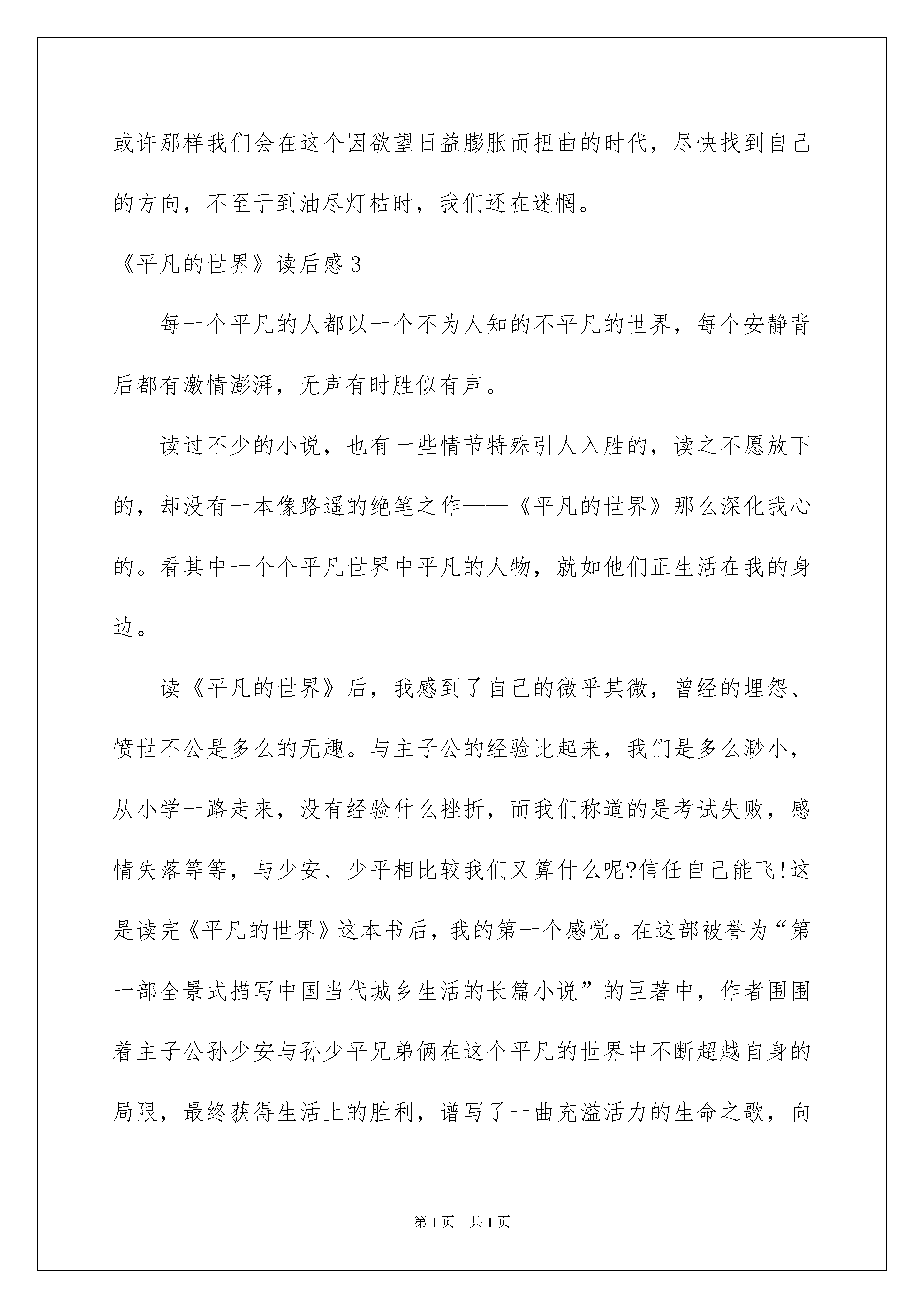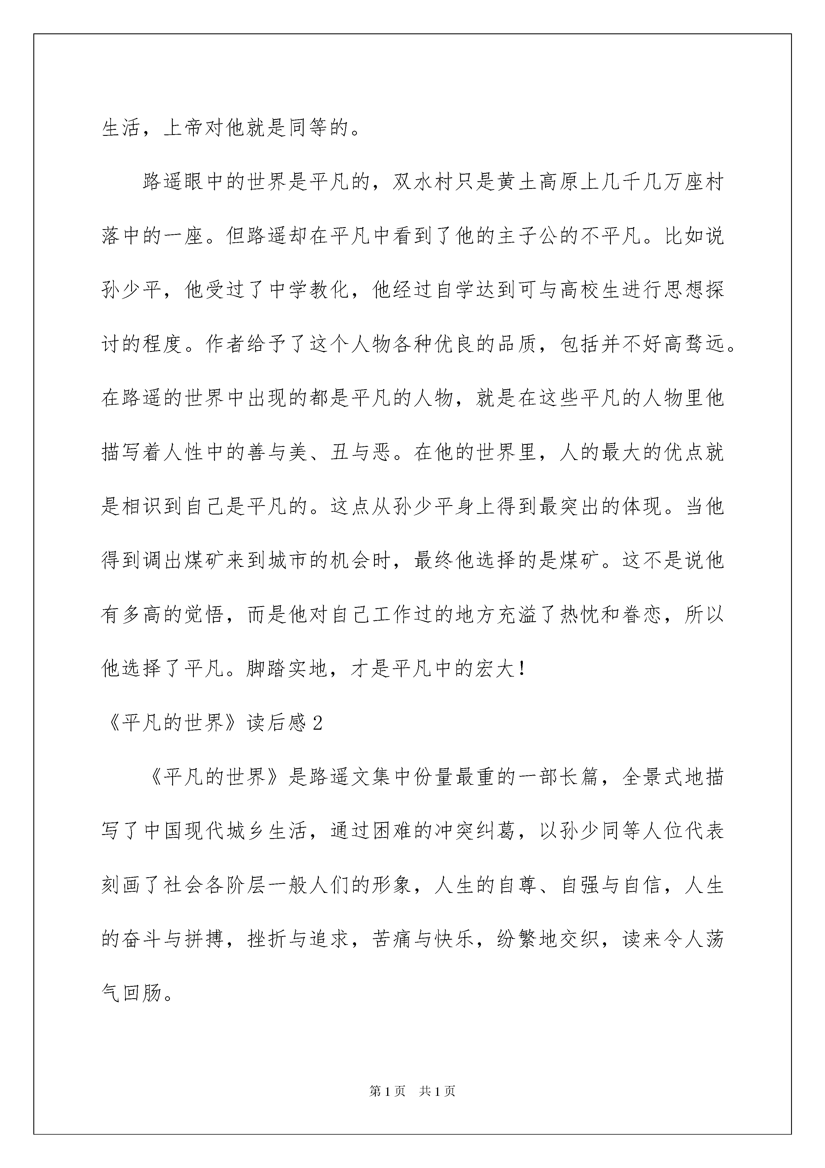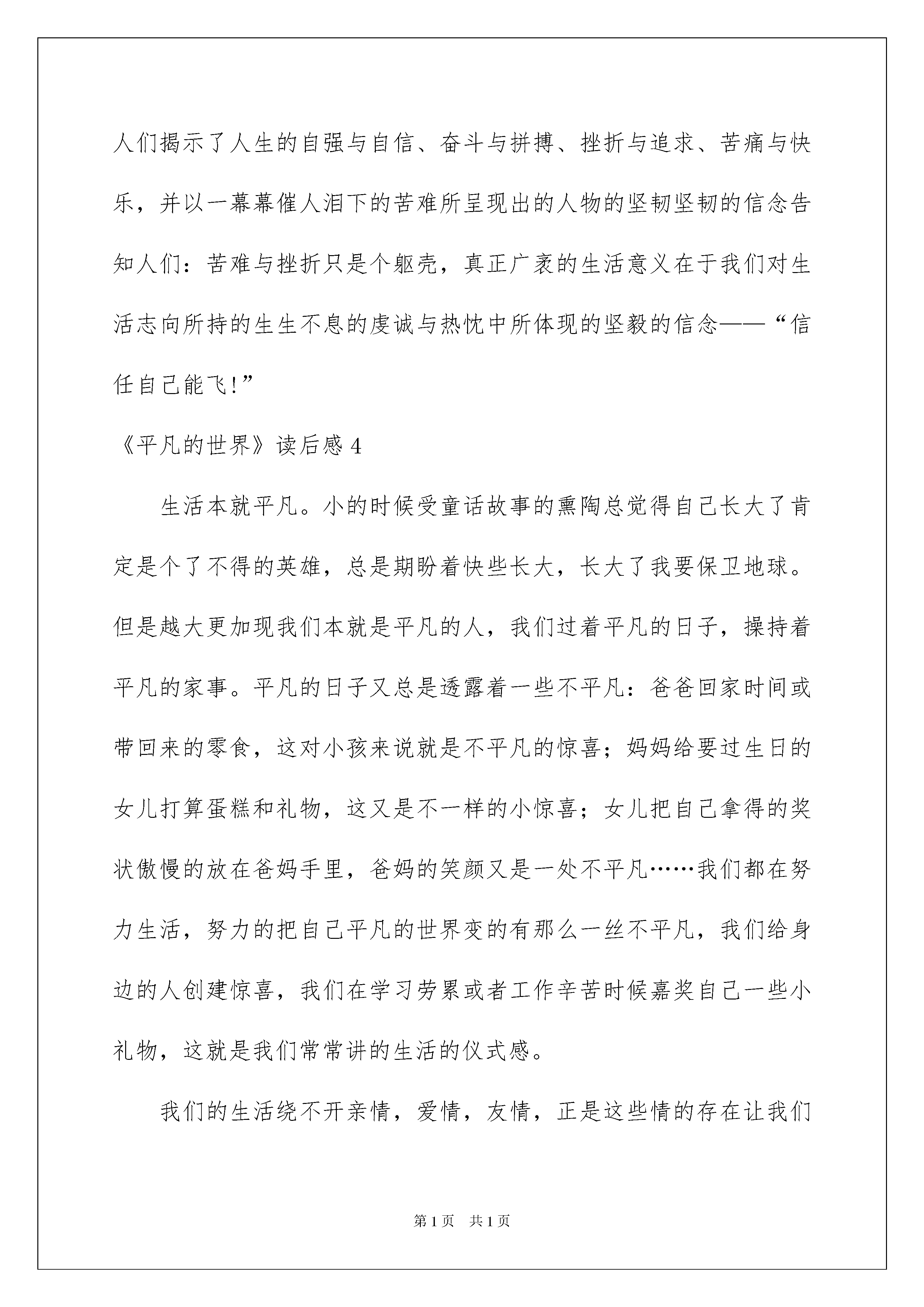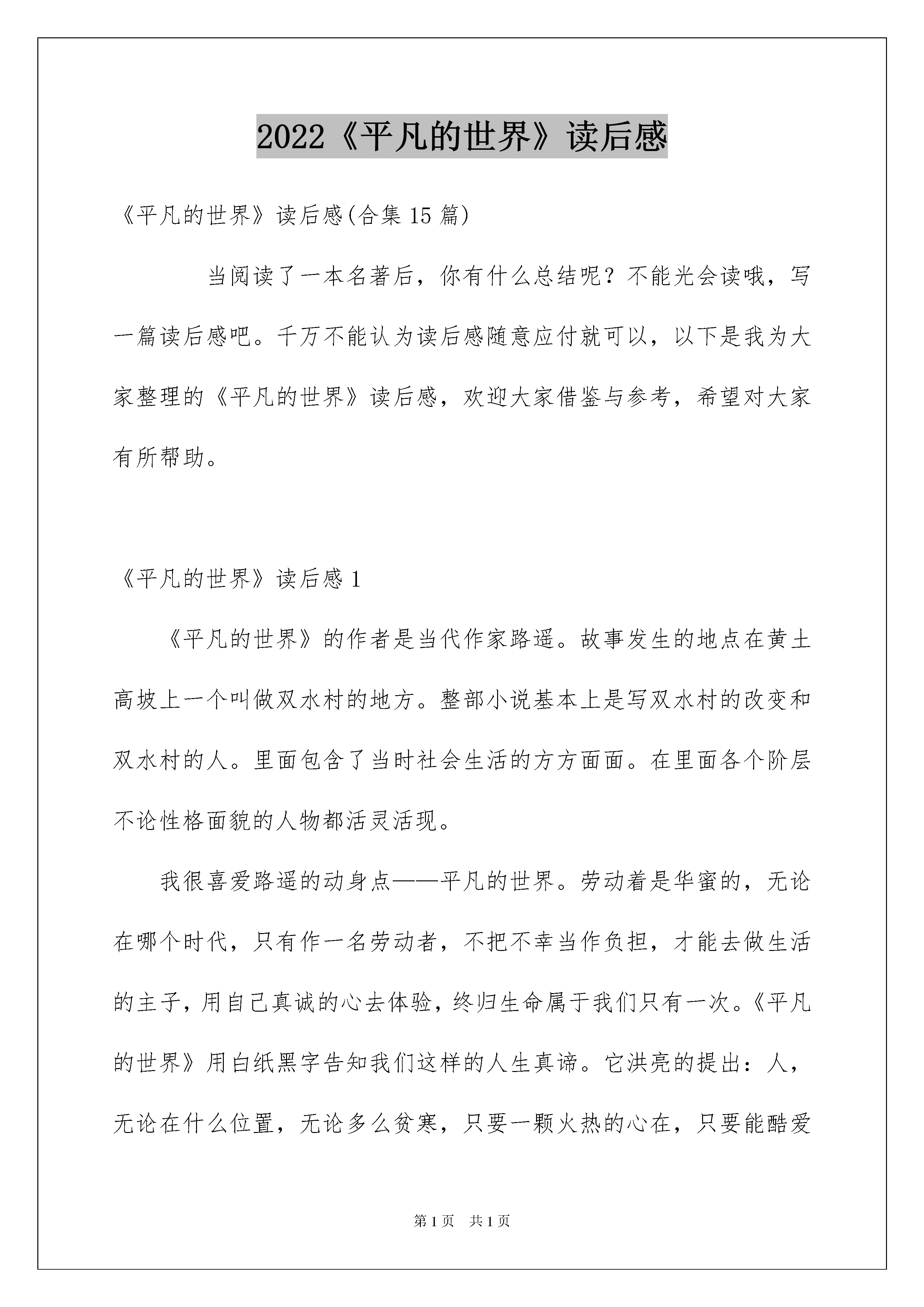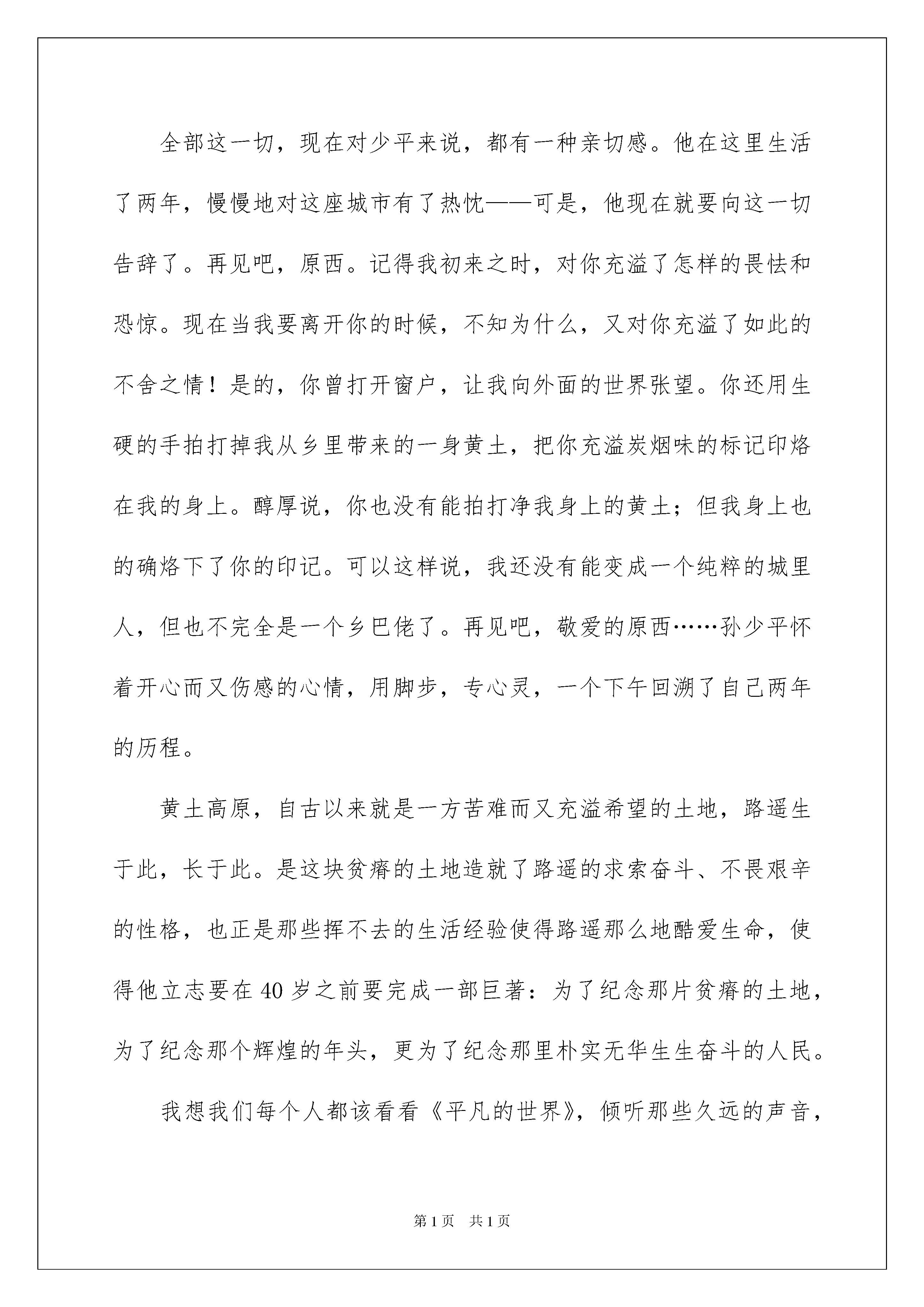 2022《平凡的世界》读后感《平凡的世界》读后感(合集15篇)当阅读了一本名著后,你有什么总结呢?不能光会读哦,写一篇读后感吧。千万不能认为读后感随意应付就可以,以下是我为大家整理的《平凡的世界》读后感,欢迎大家借鉴与参考,希望对大家有所帮助。《平凡的世界》读后感1《平凡的世界》的作者是当代作家路遥。故事发生的地点在黄土高坡上一个叫做双水村的地方。整部小说基本上是写双水村的改变和双水村的人。里面包含了当时社会生活的方方面面。在里面各个阶层不论性格面貌的人物都活灵活现。我很喜爱路遥的动身点——平凡的世界。劳动着是华蜜的,无论在哪个时代,只有作一名劳动者,不把不幸当作负担,才能去做生活的主子,用自己真诚的心去体验,终归生命属于我们只有一次。《平凡的世界》用白纸黑字告知我们这样的人生真谛。它洪亮的提出:人,无论在什么位置,无论多么贫寒,只要一颗火热的心在,只要能酷爱生活,上帝对他就是同等的。路遥眼中的世界是平凡的,双水村只是黄土高原上几千几万座村落中的一座。但路遥却在平凡中看到了他的主子公的不平凡。比如说孙少平,他受过了中学教化,他经过自学达到可与高校生进行思想探讨的程度。作者给予了这个人物各种优良的品质,包括并不好高骛远。在路遥的世界中出现的都是平凡的人物,就是在这些平凡的人物里他描写着人性中的善与美、丑与恶。在他的世界里,人的最大的优点就是相识到自己是平凡的。这点从孙少平身上得到最突出的体现。当他得到调出煤矿来到城市的机会时,最终他选择的是煤矿。这不是说他有多高的觉悟,而是他对自己工作过的地方充溢了热忱和眷恋,所以他选择了平凡。脚踏实地,才是平凡中的宏大!《平凡的世界》读后感2《平凡的世界》是路遥文集中份量最重的一部长篇,全景式地描写了中国现代城乡生活,通过困难的冲突纠葛,以孙少同等人位代表刻画了社会各阶层一般人们的形象,人生的自尊、自强与自信,人生的奋斗与拼搏,挫折与追求,苦痛与快乐,纷繁地交织,读来令人荡气回肠。全部这一切,现在对少平来说,都有一种亲切感。他在这里生活了两年,慢慢地对这座城市有了热忱——可是,他现在就要向这一切告辞了。再见吧,原西。记得我初来之时,对你充溢了怎样的畏怯和恐惊。现在当我要离开你的时候,不知为什么,又对你充溢了如此的不舍之情!是的,你曾打开窗户,让我向外面的世界张望。你还用生硬的手拍打掉我从乡里带来的一身黄土,把你充溢炭烟味的标记印烙在我的身上。醇厚说,你也没有能拍打净我身上的黄土;但我身上也的确烙下了你的印记。可以这样说,我还没有能变成一个纯粹的城里人,但也不完全是一个乡巴佬了。再见吧,敬爱的原西……孙少平怀着开心而又伤感的心情,用脚步,专心灵,一个下午回溯了自己两年的历程。黄土高原,自古以来就是一方苦难而又充溢希望的土地,路遥生于此,长于此。是这块贫瘠的土地造就了路遥的求索奋斗、不畏艰辛的性格,也正是那些挥不去的生活经验使得路遥那么地酷爱生命,使得他立志要在40岁之前要完成一部巨著:为了纪念那片贫瘠的土地,为了纪念那个辉煌的年头,更为了纪念那里朴实无华生生奋斗的人民。我想我们每个人都该看看《平凡的世界》,倾听那些久远的声音,或许那样我们会在这个因欲望日益膨胀而扭曲的时代,尽快找到自己的方向,不至于到油尽灯枯时,我们还在迷惘。《平凡的世界》读后感3每一个平凡的人都以一个不为人知的不平凡的世界,每个安静背后都有激情澎湃,无声有时胜似有声。读过不少的小说,也有一些情节特殊引人入胜的,读之不愿放下的,却没有一本像路遥的绝笔之作——《平凡的世界》那么深化我心的。看其中一个个平凡世界中平凡的人物,就如他们正生活在我的身边。读《平凡的世界》后,我感到了自己的微乎其微,曾经的埋怨、愤世不公是多么的无趣。与主子公的经验比起来,我们是多么渺小,从小学一路走来,没有经验什么挫折,而我们称道的是考试失败,感情失落等等,与少安、少平相比较我们又算什么呢?信任自己能飞!这是读完《平凡的世界》这本书后,我的第一个感觉。在这部被誉为“第一部全景式描写中国当代城乡生活的长篇小说”的巨著中,作者围围着主子公孙少安与孙少平兄弟俩在这个平凡的世界中不断超越自身的局限,最终获得生活上的胜利,谱写了一曲充溢活力的生命之歌,向人们揭示了人生的自强与自信、奋斗与拼搏、挫折与追求、苦痛与快乐,并以一幕幕催人泪下的苦难所呈现出的人物的坚韧坚韧的信念告知人们:苦难与挫折只是个躯壳,真正广袤的生活意义在于我们对生活志向所持的生生不息的虔诚与热忱中所体现的坚毅的信念——“信任自己能飞!”《平凡的世界》读后感4生活本就平凡。小的时候受童话故事的熏陶总觉得自己长大了肯定是个了不得的英雄,总是期盼着快