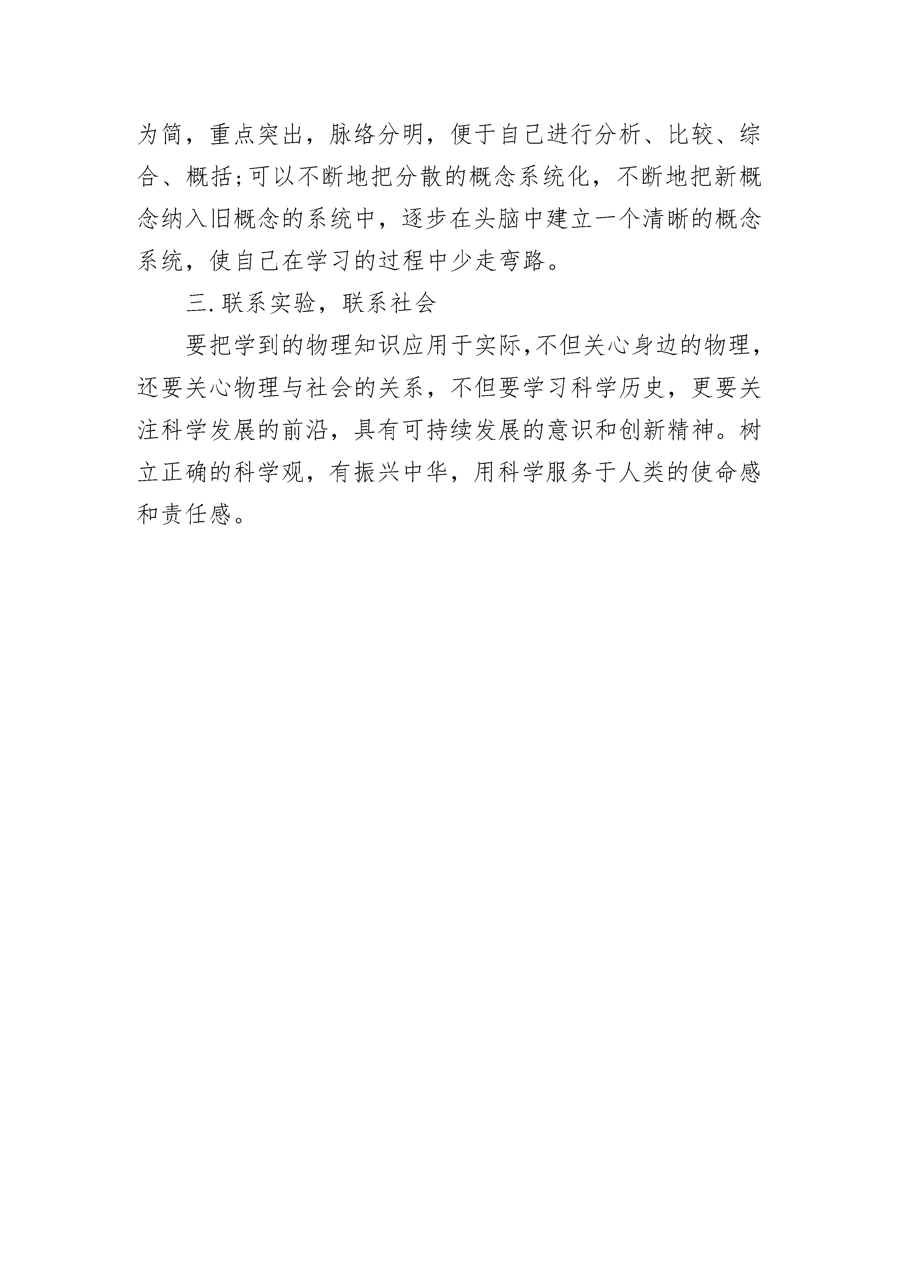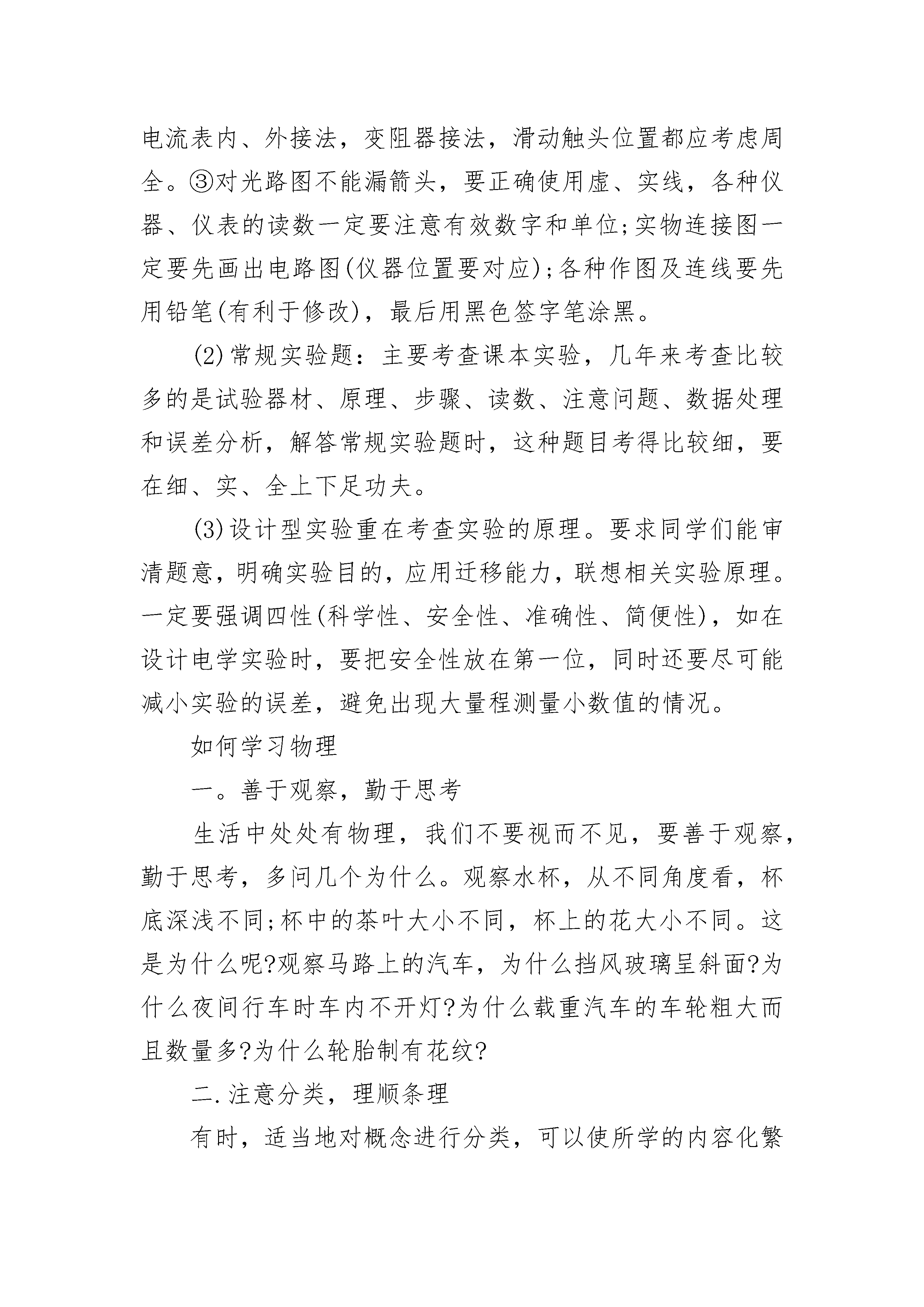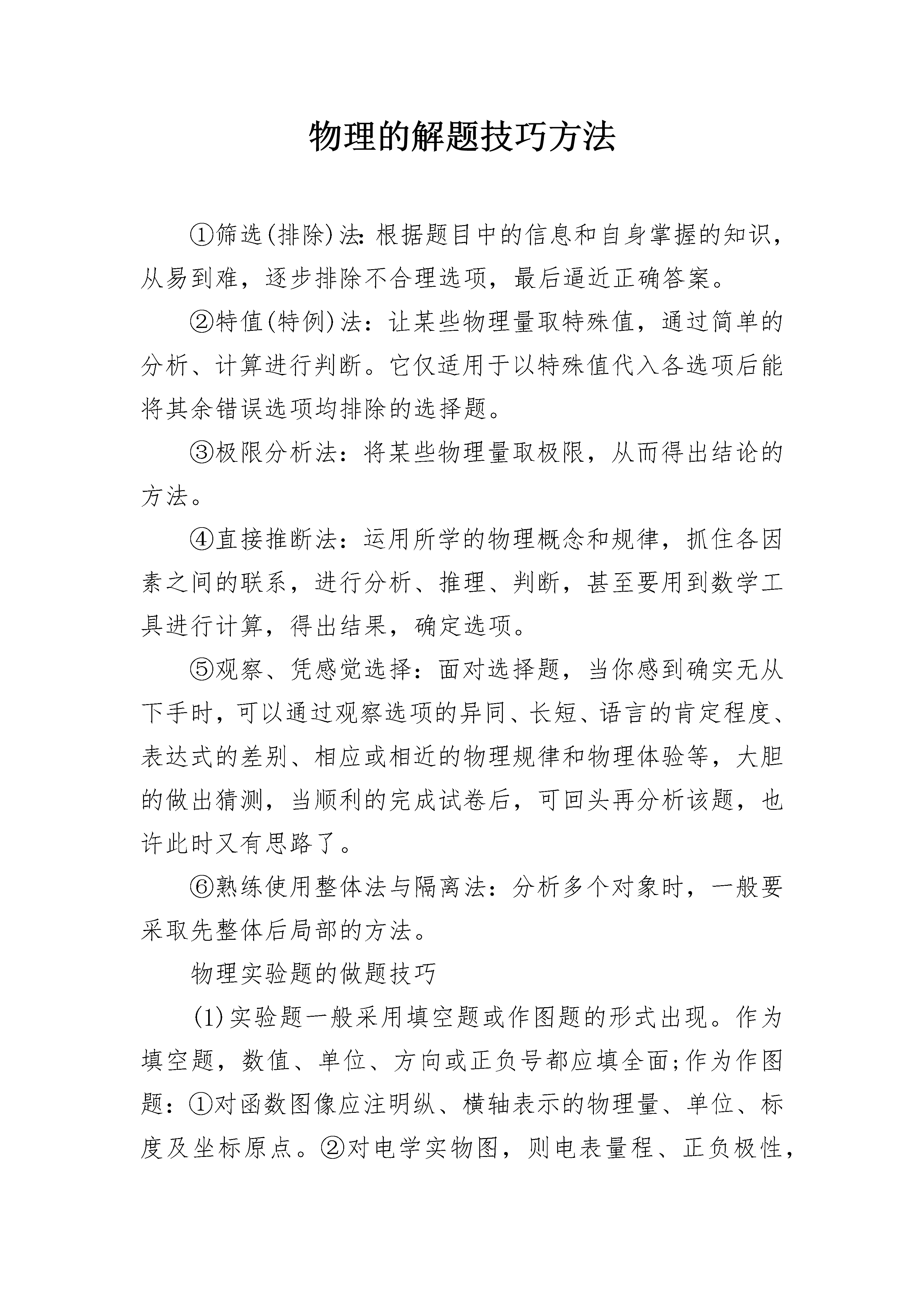 物理的解题技巧方法①筛选(排除)法:根据题目中的信息和自身掌握的知识,从易到难,逐步排除不合理选项,最后逼近正确答案。②特值(特例)法:让某些物理量取特殊值,通过简单的分析、计算进行判断。它仅适用于以特殊值代入各选项后能将其余错误选项均排除的选择题。③极限分析法:将某些物理量取极限,从而得出结论的方法。④直接推断法:运用所学的物理概念和规律,抓住各因素之间的联系,进行分析、推理、判断,甚至要用到数学工具进行计算,得出结果,确定选项。⑤观察、凭感觉选择:面对选择题,当你感到确实无从下手时,可以通过观察选项的异同、长短、语言的肯定程度、表达式的差别、相应或相近的物理规律和物理体验等,大胆的做出猜测,当顺利的完成试卷后,可回头再分析该题,也许此时又有思路了。⑥熟练使用整体法与隔离法:分析多个对象时,一般要采取先整体后局部的方法。物理实验题的做题技巧(1)实验题一般采用填空题或作图题的形式出现。作为填空题,数值、单位、方向或正负号都应填全面;作为作图题:①对函数图像应注明纵、横轴表示的物理量、单位、标度及坐标原点。②对电学实物图,则电表量程、正负极性,电流表内、外接法,变阻器接法,滑动触头位置都应考虑周全。③对光路图不能漏箭头,要正确使用虚、实线,各种仪器、仪表的读数一定要注意有效数字和单位;实物连接图一定要先画出电路图(仪器位置要对应);各种作图及连线要先用铅笔(有利于修改),最后用黑色签字笔涂黑。(2)常规实验题:主要考查课本实验,几年来考查比较多的是试验器材、原理、步骤、读数、注意问题、数据处理和误差分析,解答常规实验题时,这种题目考得比较细,要在细、实、全上下足功夫。(3)设计型实验重在考查实验的原理。要求同学们能审清题意,明确实验目的,应用迁移能力,联想相关实验原理。一定要强调四性(科学性、安全性、准确性、简便性),如在设计电学实验时,要把安全性放在第一位,同时还要尽可能减小实验的误差,避免出现大量程测量小数值的情况。如何学习物理一。善于观察,勤于思考生活中处处有物理,我们不要视而不见,要善于观察,勤于思考,多问几个为什么。观察水杯,从不同角度看,杯底深浅不同;杯中的茶叶大小不同,杯上的花大小不同。这是为什么呢?观察马路上的汽车,为什么挡风玻璃呈斜面?为什么夜间行车时车内不开灯?为什么载重汽车的车轮粗大而且数量多?为什么轮胎制有花纹?二.注意分类,理顺条理有时,适当地对概念进行分类,可以使所学的内容化繁为简,重点突出,脉络分明,便于自己进行分析、比较、综合、概括;可以不断地把分散的概念系统化,不断地把新概念纳入旧概念的系统中,逐步在头脑中建立一个清晰的概念系统,使自己在学习的过程中少走弯路。三.联系实验,联系社会要把学到的物理知识应用于实际,不但关心身边的物理,还要关心物理与社会的关系,不但要学习科学历史,更要关注科学发展的前沿,具有可持续发展的意识和创新精神。树立正确的科学观,有振兴中华,用科学服务于人类的使命感和责任感。