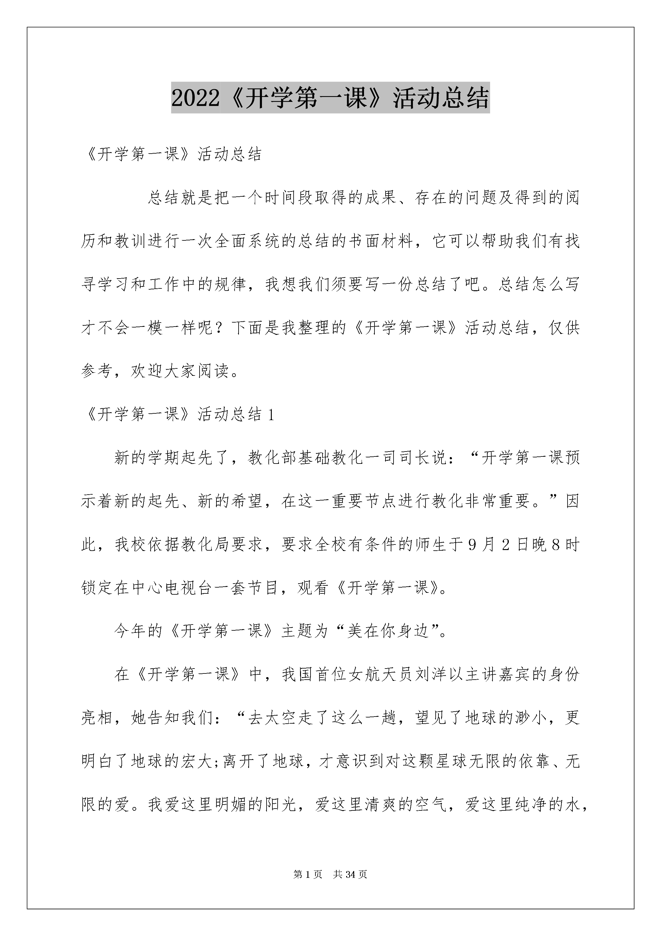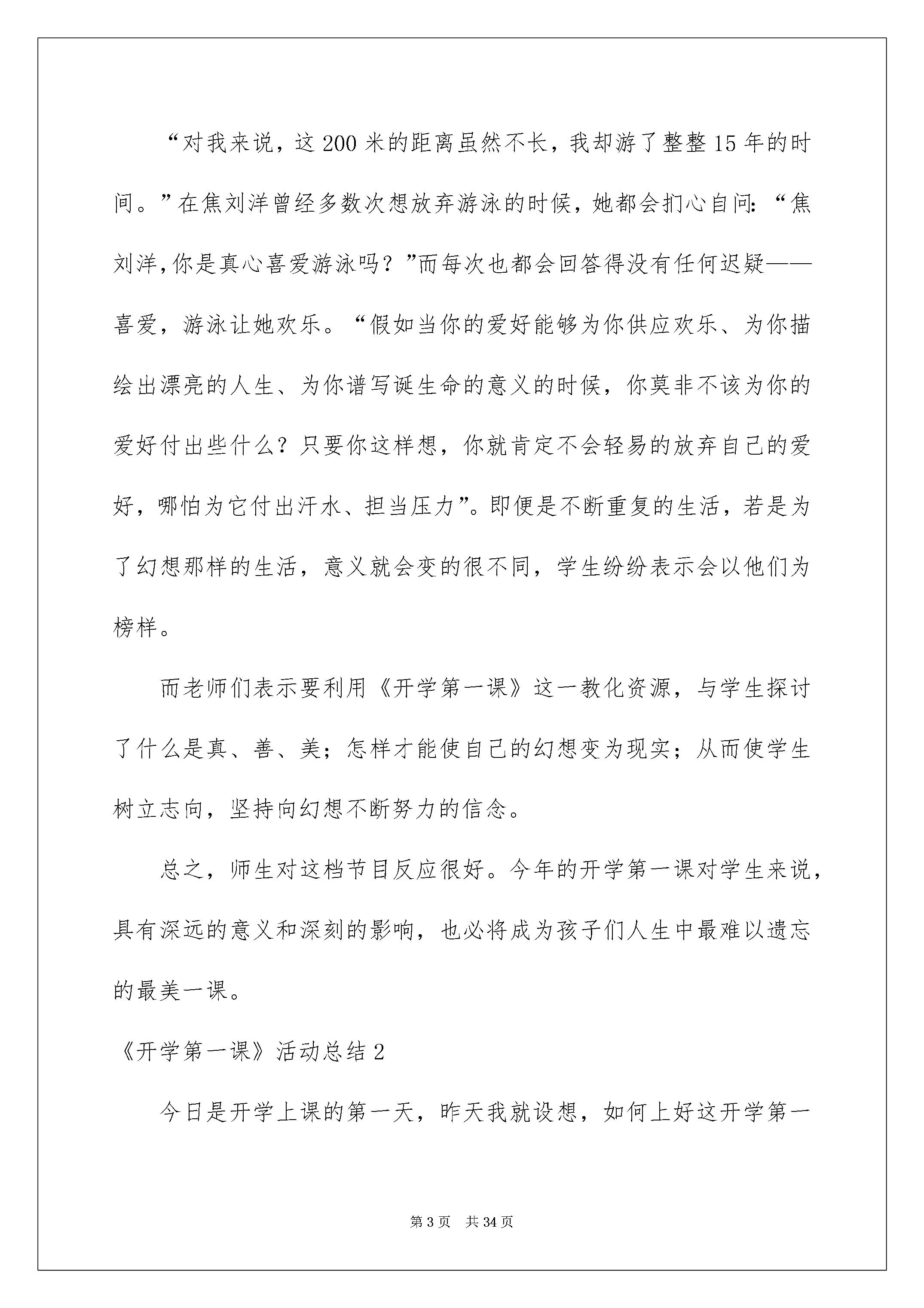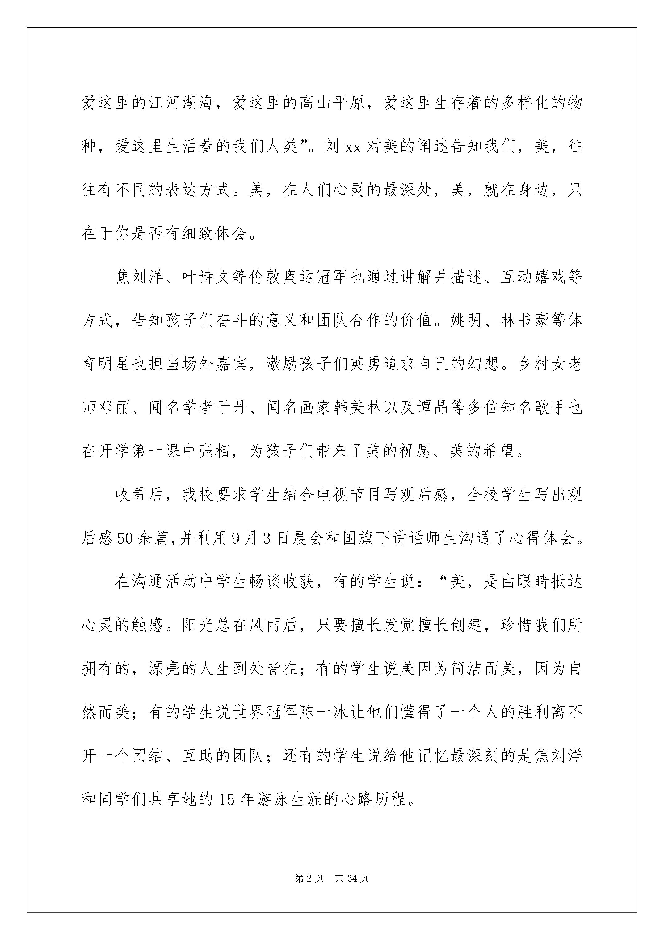 2022《开学第一课》活动总结《开学第一课》活动总结总结就是把一个时间段取得的成果、存在的问题及得到的阅历和教训进行一次全面系统的总结的书面材料,它可以帮助我们有找寻学习和工作中的规律,我想我们须要写一份总结了吧。总结怎么写才不会一模一样呢?下面是我整理的《开学第一课》活动总结,仅供参考,欢迎大家阅读。《开学第一课》活动总结1新的学期起先了,教化部基础教化一司司长说:“开学第一课预示着新的起先、新的希望,在这一重要节点进行教化非常重要。”因此,我校依据教化局要求,要求全校有条件的师生于9月2日晚8时锁定在中心电视台一套节目,观看《开学第一课》。今年的《开学第一课》主题为“美在你身边”。在《开学第一课》中,我国首位女航天员刘洋以主讲嘉宾的身份亮相,她告知我们:“去太空走了这么一趟,望见了地球的渺小,更明白了地球的宏大;离开了地球,才意识到对这颗星球无限的依靠、无限的爱。我爱这里明媚的阳光,爱这里清爽的空气,爱这里纯净的水,爱这里的江河湖海,爱这里的高山平原,爱这里生存着的多样化的物种,爱这里生活着的我们人类”。刘xx对美的阐述告知我们,美,往往有不同的表达方式。美,在人们心灵的最深处,美,就在身边,只在于你是否有细致体会。焦刘洋、叶诗文等伦敦奥运冠军也通过讲解并描述、互动嬉戏等方式,告知孩子们奋斗的意义和团队合作的价值。姚明、林书豪等体育明星也担当场外嘉宾,激励孩子们英勇追求自己的幻想。乡村女老师邓丽、闻名学者于丹、闻名画家韩美林以及谭晶等多位知名歌手也在开学第一课中亮相,为孩子们带来了美的祝愿、美的希望。收看后,我校要求学生结合电视节目写观后感,全校学生写出观后感50余篇,并利用9月3日晨会和国旗下讲话师生沟通了心得体会。在沟通活动中学生畅谈收获,有的学生说:“美,是由眼睛抵达心灵的触感。阳光总在风雨后,只要擅长发觉擅长创建,珍惜我们所拥有的,漂亮的人生到处皆在;有的学生说美因为简洁而美,因为自然而美;有的学生说世界冠军陈一冰让他们懂得了一个人的胜利离不开一个团结、互助的团队;还有的学生说给他记忆最深刻的是焦刘洋和同学们共享她的15年游泳生涯的心路历程。“对我来说,这200米的距离虽然不长,我却游了整整15年的时间。”在焦刘洋曾经多数次想放弃游泳的时候,她都会扪心自问:“焦刘洋,你是真心喜爱游泳吗?”而每次也都会回答得没有任何迟疑——喜爱,游泳让她欢乐。“假如当你的爱好能够为你供应欢乐、为你描绘出漂亮的人生、为你谱写诞生命的意义的时候,你莫非不该为你的爱好付出些什么?只要你这样想,你就肯定不会轻易的放弃自己的爱好,哪怕为它付出汗水、担当压力”。即便是不断重复的生活,若是为了幻想那样的生活,意义就会变的很不同,学生纷纷表示会以他们为榜样。而老师们表示要利用《开学第一课》这一教化资源,与学生探讨了什么是真、善、美;怎样才能使自己的幻想变为现实;从而使学生树立志向,坚持向幻想不断努力的信念。总之,师生对这档节目反应很好。今年的开学第一课对学生来说,具有深远的意义和深刻的影响,也必将成为孩子们人生中最难以遗忘的最美一课。《开学第一课》活动总结2今日是开学上课的第一天,昨天我就设想,如何上好这开学第一课。昨天我把收上来的作业检查了一遍,发觉有几个学生的作业完成的不好,布置的日记和积累没有做。也有许多同学完成得很仔细,比如孙胜豪就写了六本读书笔记,让我很欣慰。查完作业,我想,这开学第一天,还是要帮学生树立正确的学习观。早上到教室,孩子们见到我都亲热地打招呼,一个暑假没有见,有的学生已经明显长高了。刚上课,孩子们都坐得端端正正的,虽然还是那稚气的神情,可是表情却很肃穆,都专注地看着我。只是两个月,却觉得孩子们好像长大了不少,懂事了不少。我对自己要讲的内容就更有信念了。我首先总结了暑假作业的状况,对完成好的学生进行了表扬,并把孙xx的作业展示给大家看,看了他的作业以后,我就问大家:“孙胜豪上学期考了班级第一名,他为什么能考第一,你找到缘由了吗?”同学们纷纷举手,有的说:因为他努力。有的说:因为他勤奋。有的说:因为他仔细!孩子们真的会思索了。我说:“就是因为努力、勤奋、仔细、用心这些缘由,孙胜豪才取得了优异的成果。这些都是我们要学习的。”接着,我又让学生回顾上学期我们学习的台湾作家林清玄的文章《和时间赛跑》,体会时间的重要。“三年级的时间已经过去了,我们再也不能回到三年级了,三年级应当学会的内容假如我们没有学会,就说明我们把时间奢侈了,所以我们现在要努力把时间追回来,要争取比时间快几步。怎样做才能比时间快一些?”孩子们都争着发表自己的看法。“每天多背一个成语,一年就多背了365个。”“老