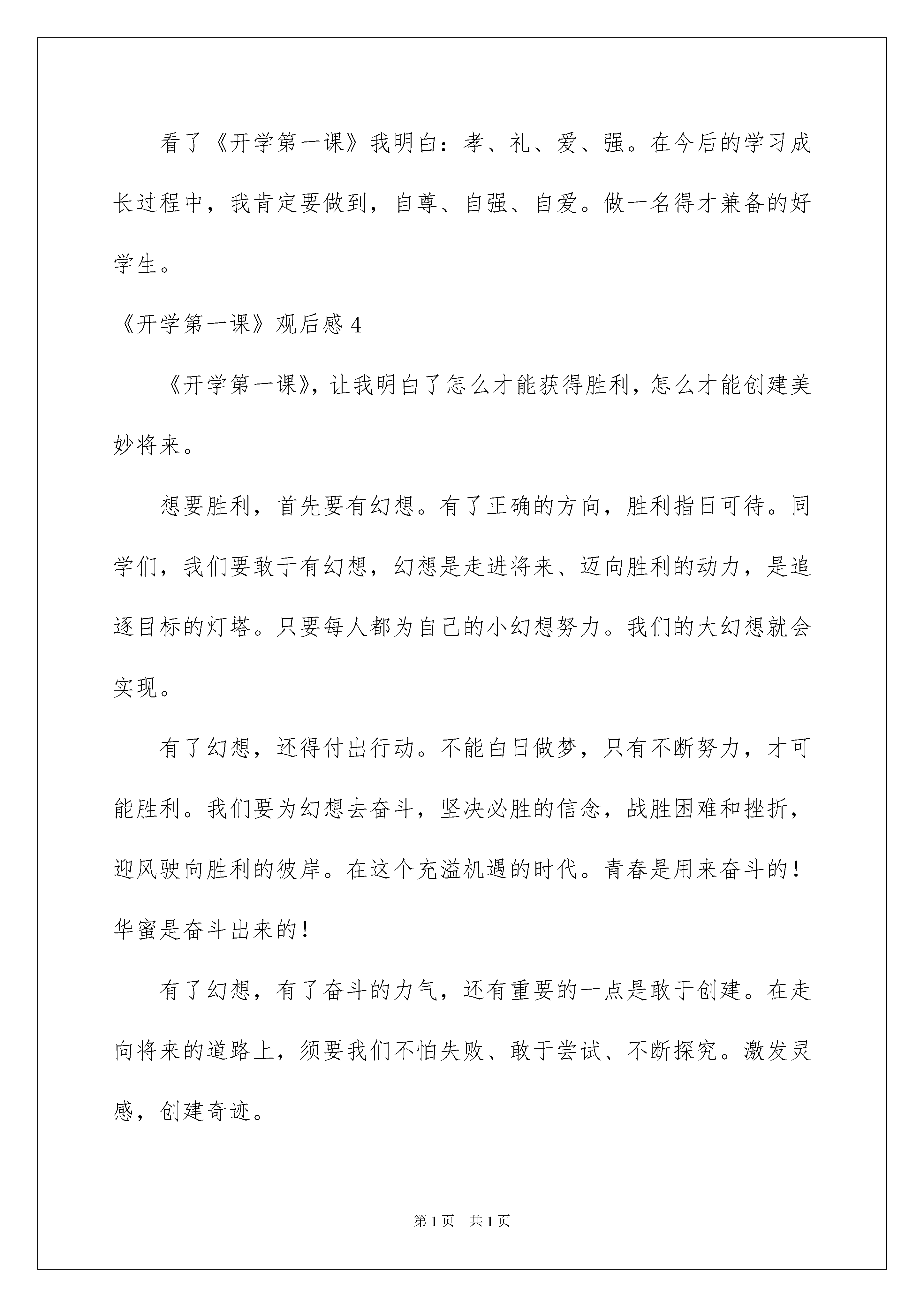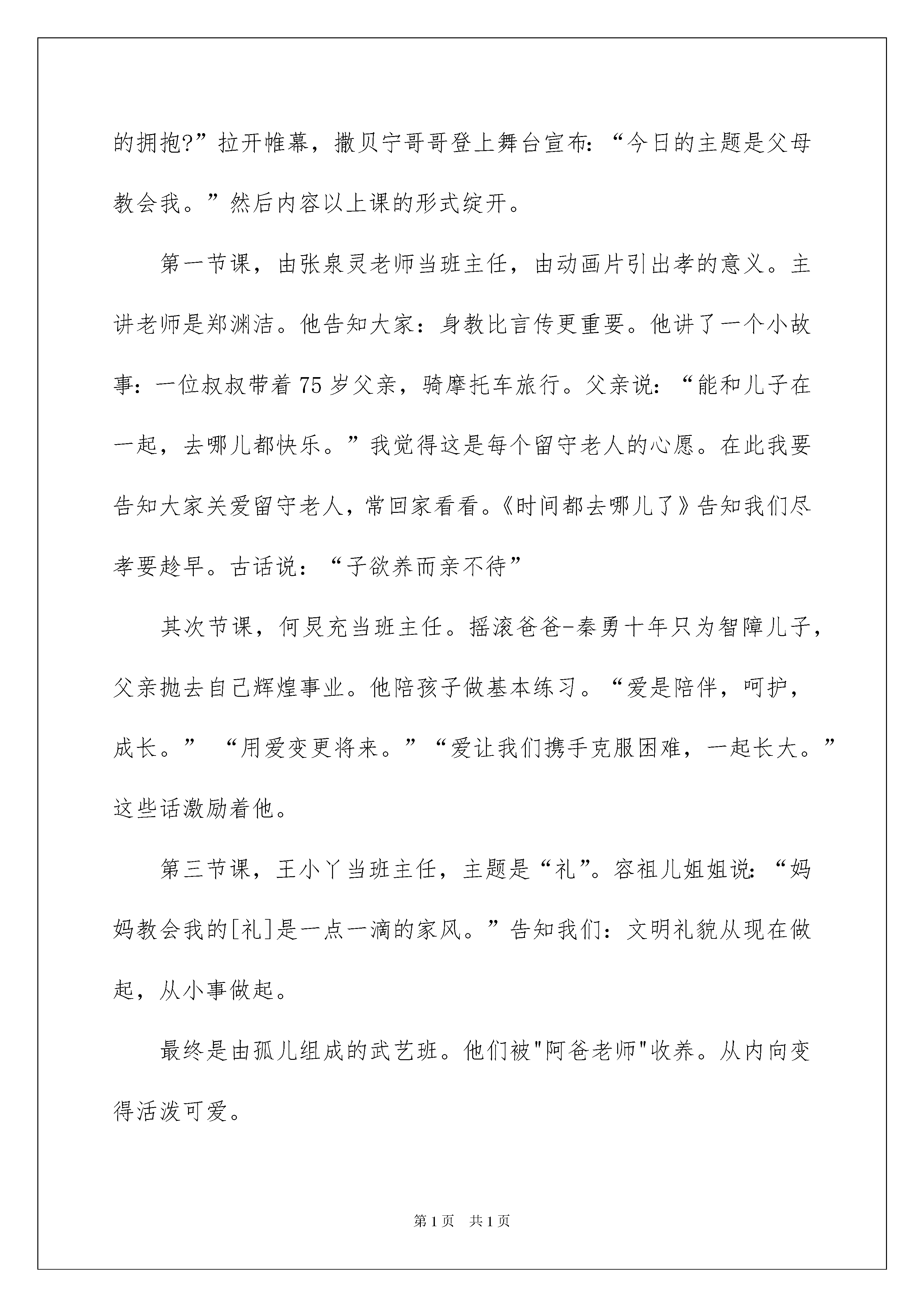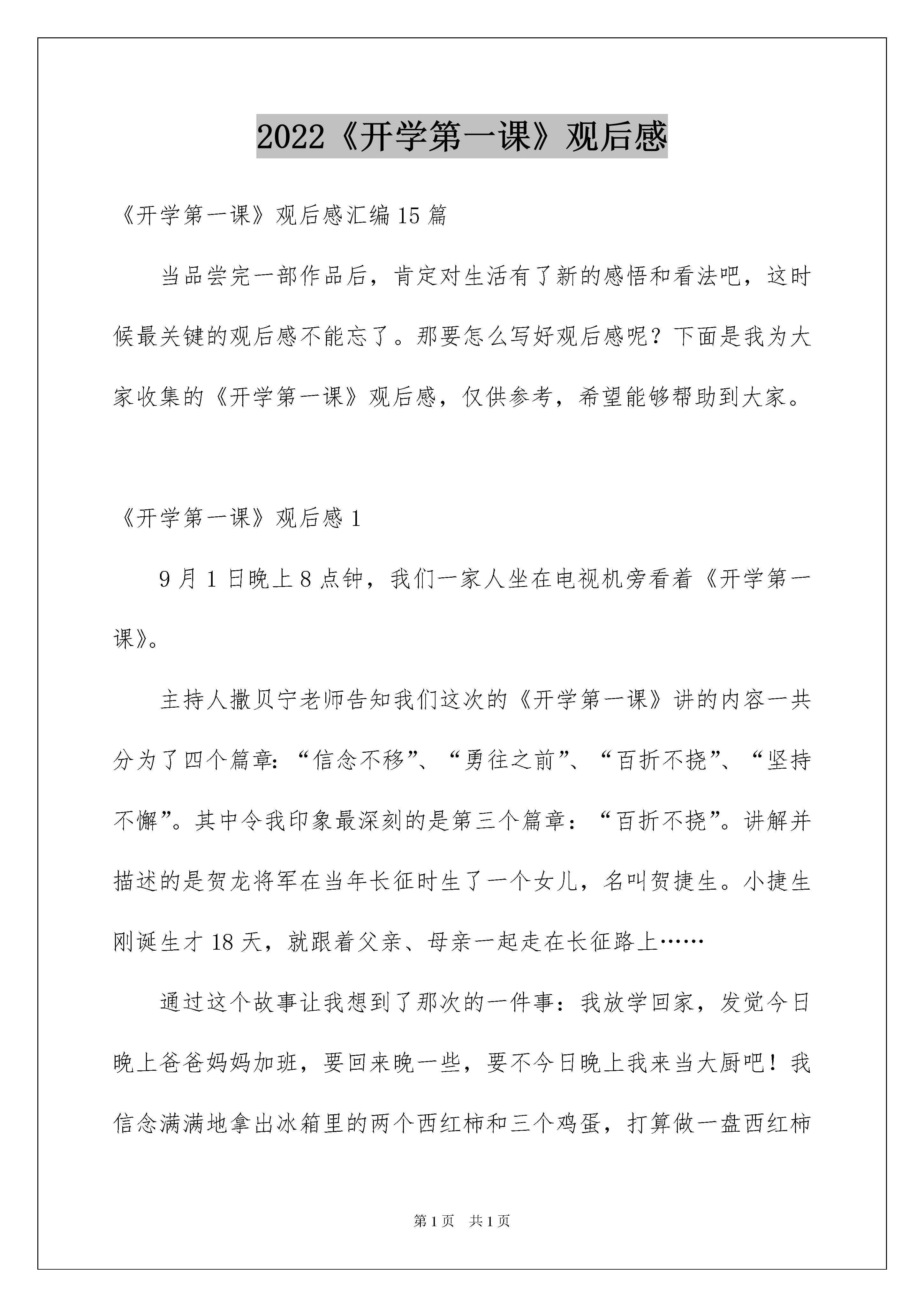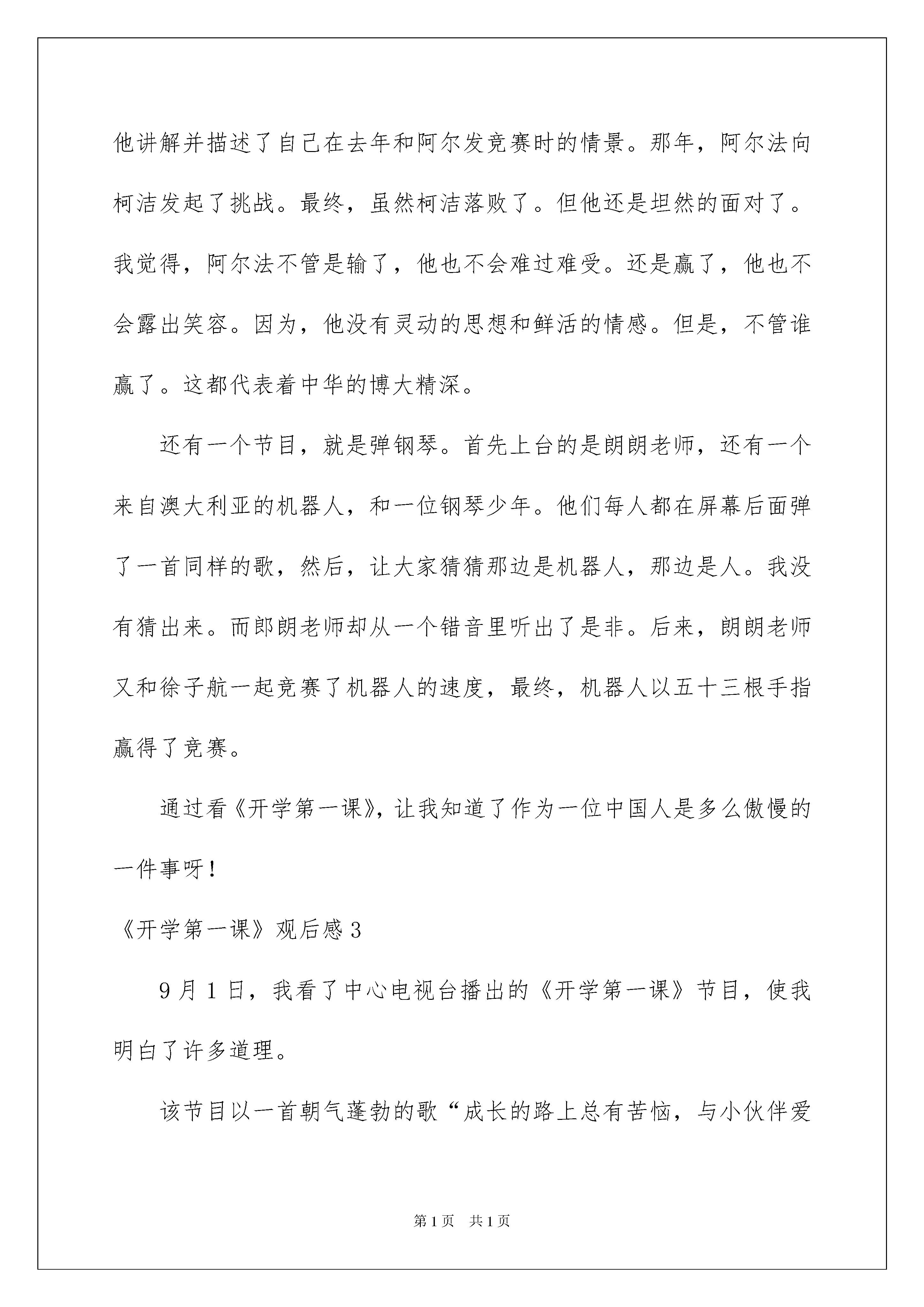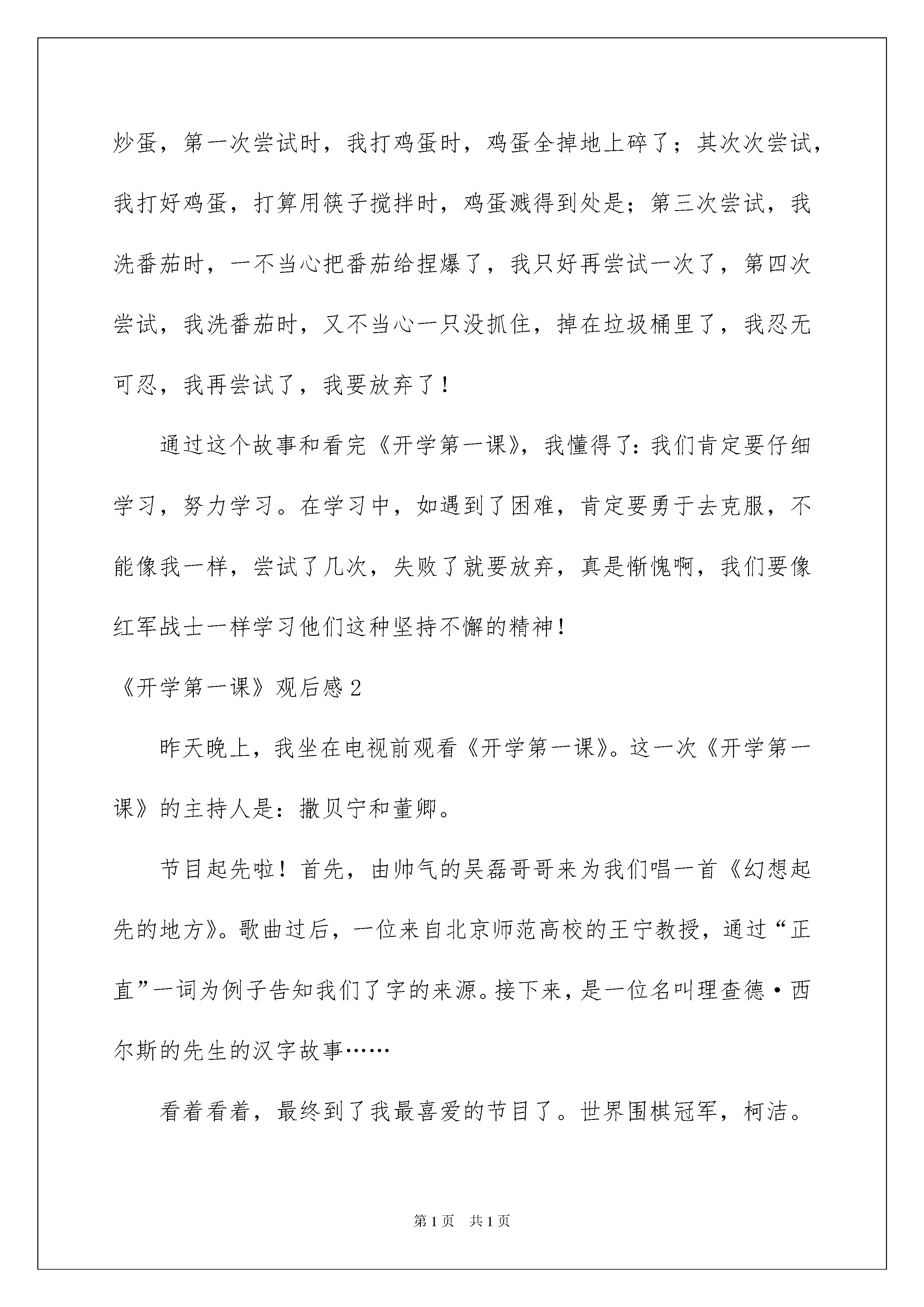 2022《开学第一课》观后感《开学第一课》观后感汇编15篇当品尝完一部作品后,肯定对生活有了新的感悟和看法吧,这时候最关键的观后感不能忘了。那要怎么写好观后感呢?下面是我为大家收集的《开学第一课》观后感,仅供参考,希望能够帮助到大家。《开学第一课》观后感19月1日晚上8点钟,我们一家人坐在电视机旁看着《开学第一课》。主持人撒贝宁老师告知我们这次的《开学第一课》讲的内容一共分为了四个篇章:“信念不移”、“勇往之前”、“百折不挠”、“坚持不懈”。其中令我印象最深刻的是第三个篇章:“百折不挠”。讲解并描述的是贺龙将军在当年长征时生了一个女儿,名叫贺捷生。小捷生刚诞生才18天,就跟着父亲、母亲一起走在长征路上……通过这个故事让我想到了那次的一件事:我放学回家,发觉今日晚上爸爸妈妈加班,要回来晚一些,要不今日晚上我来当大厨吧!我信念满满地拿出冰箱里的两个西红柿和三个鸡蛋,打算做一盘西红柿炒蛋,第一次尝试时,我打鸡蛋时,鸡蛋全掉地上碎了;其次次尝试,我打好鸡蛋,打算用筷子搅拌时,鸡蛋溅得到处是;第三次尝试,我洗番茄时,一不当心把番茄给捏爆了,我只好再尝试一次了,第四次尝试,我洗番茄时,又不当心一只没抓住,掉在垃圾桶里了,我忍无可忍,我再尝试了,我要放弃了!通过这个故事和看完《开学第一课》,我懂得了:我们肯定要仔细学习,努力学习。在学习中,如遇到了困难,肯定要勇于去克服,不能像我一样,尝试了几次,失败了就要放弃,真是惭愧啊,我们要像红军战士一样学习他们这种坚持不懈的精神!《开学第一课》观后感2昨天晚上,我坐在电视前观看《开学第一课》。这一次《开学第一课》的主持人是:撒贝宁和董卿。节目起先啦!首先,由帅气的吴磊哥哥来为我们唱一首《幻想起先的地方》。歌曲过后,一位来自北京师范高校的王宁教授,通过“正直”一词为例子告知我们了字的来源。接下来,是一位名叫理查德·西尔斯的先生的汉字故事……看着看着,最终到了我最喜爱的节目了。世界围棋冠军,柯洁。他讲解并描述了自己在去年和阿尔发竞赛时的情景。那年,阿尔法向柯洁发起了挑战。最终,虽然柯洁落败了。但他还是坦然的面对了。我觉得,阿尔法不管是输了,他也不会难过难受。还是赢了,他也不会露出笑容。因为,他没有灵动的思想和鲜活的情感。但是,不管谁赢了。这都代表着中华的博大精深。还有一个节目,就是弹钢琴。首先上台的是朗朗老师,还有一个来自澳大利亚的机器人,和一位钢琴少年。他们每人都在屏幕后面弹了一首同样的歌,然后,让大家猜猜那边是机器人,那边是人。我没有猜出来。而郎朗老师却从一个错音里听出了是非。后来,朗朗老师又和徐子航一起竞赛了机器人的速度,最终,机器人以五十三根手指赢得了竞赛。通过看《开学第一课》,让我知道了作为一位中国人是多么傲慢的一件事呀!《开学第一课》观后感39月1日,我看了中心电视台播出的《开学第一课》节目,使我明白了许多道理。该节目以一首朝气蓬勃的歌“成长的路上总有苦恼,与小伙伴爱的拥抱?”拉开帷幕,撒贝宁哥哥登上舞台宣布:“今日的主题是父母教会我。”然后内容以上课的形式绽开。第一节课,由张泉灵老师当班主任,由动画片引出孝的意义。主讲老师是郑渊洁。他告知大家:身教比言传更重要。他讲了一个小故事:一位叔叔带着75岁父亲,骑摩托车旅行。父亲说:“能和儿子在一起,去哪儿都快乐。”我觉得这是每个留守老人的心愿。在此我要告知大家关爱留守老人,常回家看看。《时间都去哪儿了》告知我们尽孝要趁早。古话说:“子欲养而亲不待”其次节课,何炅充当班主任。摇滚爸爸-秦勇十年只为智障儿子,父亲抛去自己辉煌事业。他陪孩子做基本练习。“爱是陪伴,呵护,成长。”“用爱变更将来。”“爱让我们携手克服困难,一起长大。”这些话激励着他。第三节课,王小丫当班主任,主题是“礼”。容祖儿姐姐说:“妈妈教会我的[礼]是一点一滴的家风。”告知我们:文明礼貌从现在做起,从小事做起。最终是由孤儿组成的武艺班。他们被"阿爸老师"收养。从内向变得活泼可爱。看了《开学第一课》我明白:孝、礼、爱、强。在今后的学习成长过程中,我肯定要做到,自尊、自强、自爱。做一名得才兼备的好学生。《开学第一课》观后感4《开学第一课》,让我明白了怎么才能获得胜利,怎么才能创建美妙将来。想要胜利,首先要有幻想。有了正确的方向,胜利指日可待。同学们,我们要敢于有幻想,幻想是走进将来、迈向胜利的动力,是追逐目标的灯塔。只要每人都为自己的小幻想努力。我们的大幻想就会实现。有了幻想,还得付出行动。不能白日做梦,只有不断努力,才可能胜利。我们要为幻想去奋斗,坚决必胜的信念,战胜困难和挫折,迎风驶向胜利的彼岸。在这个充溢机遇的时代。青春是用来