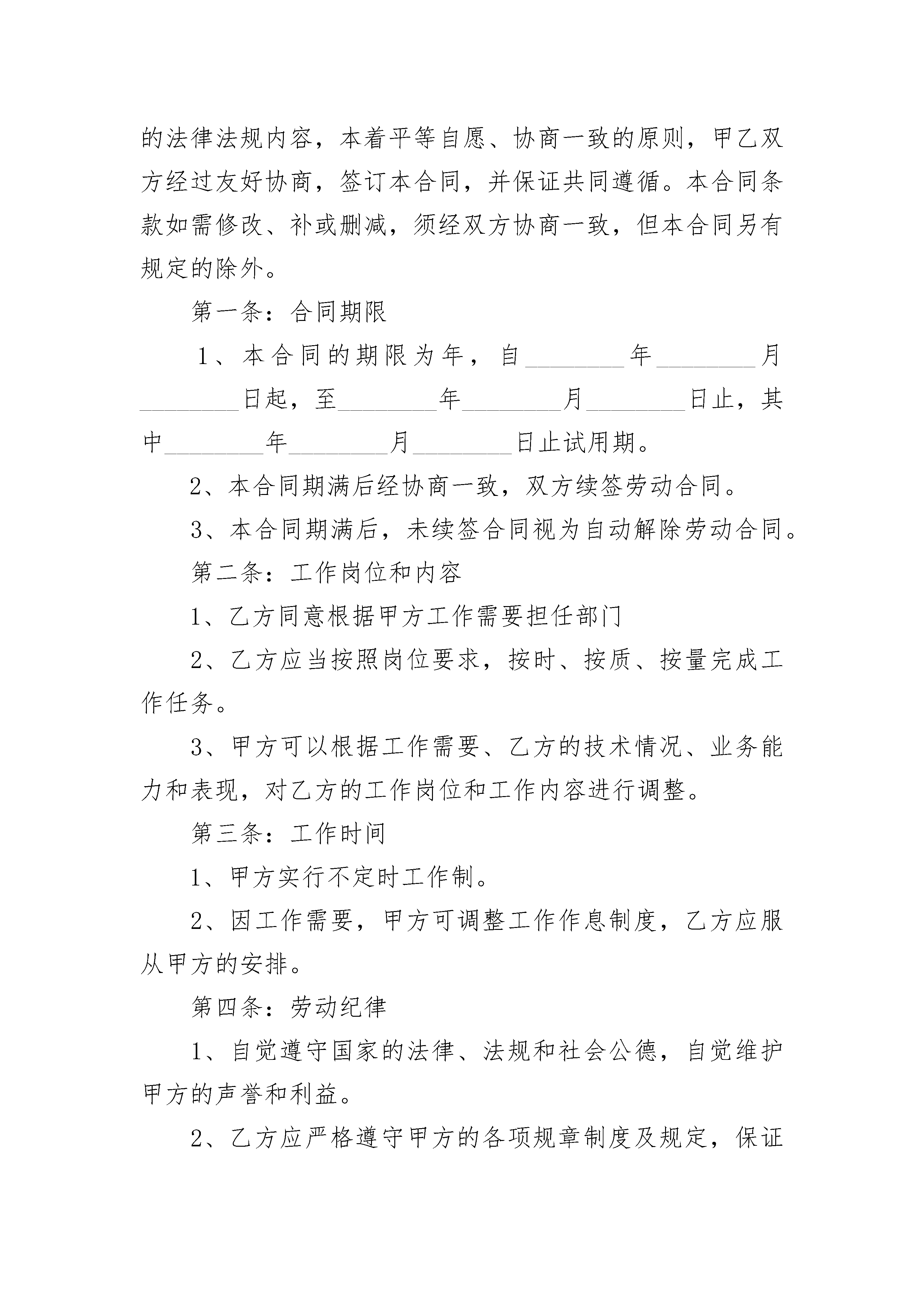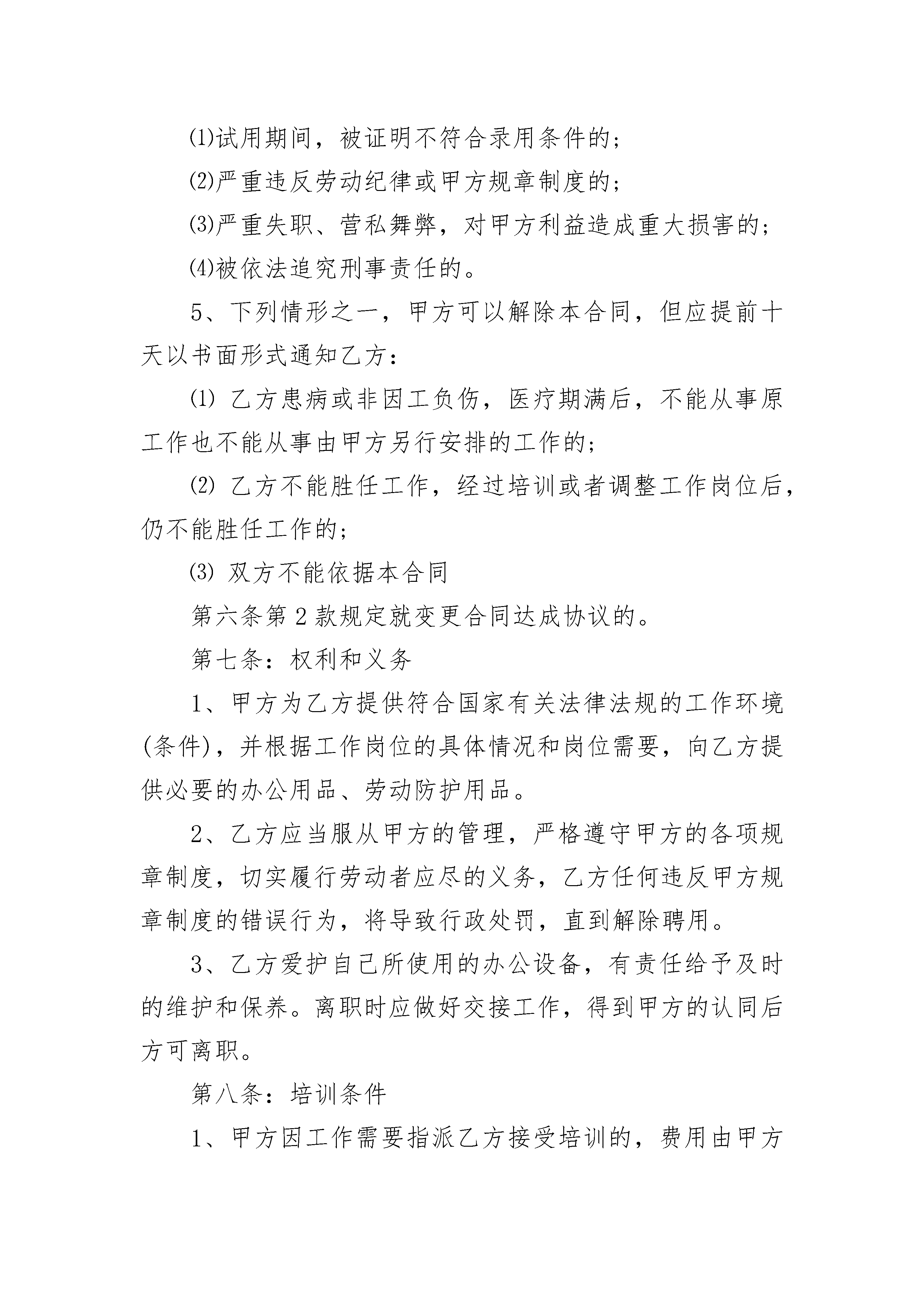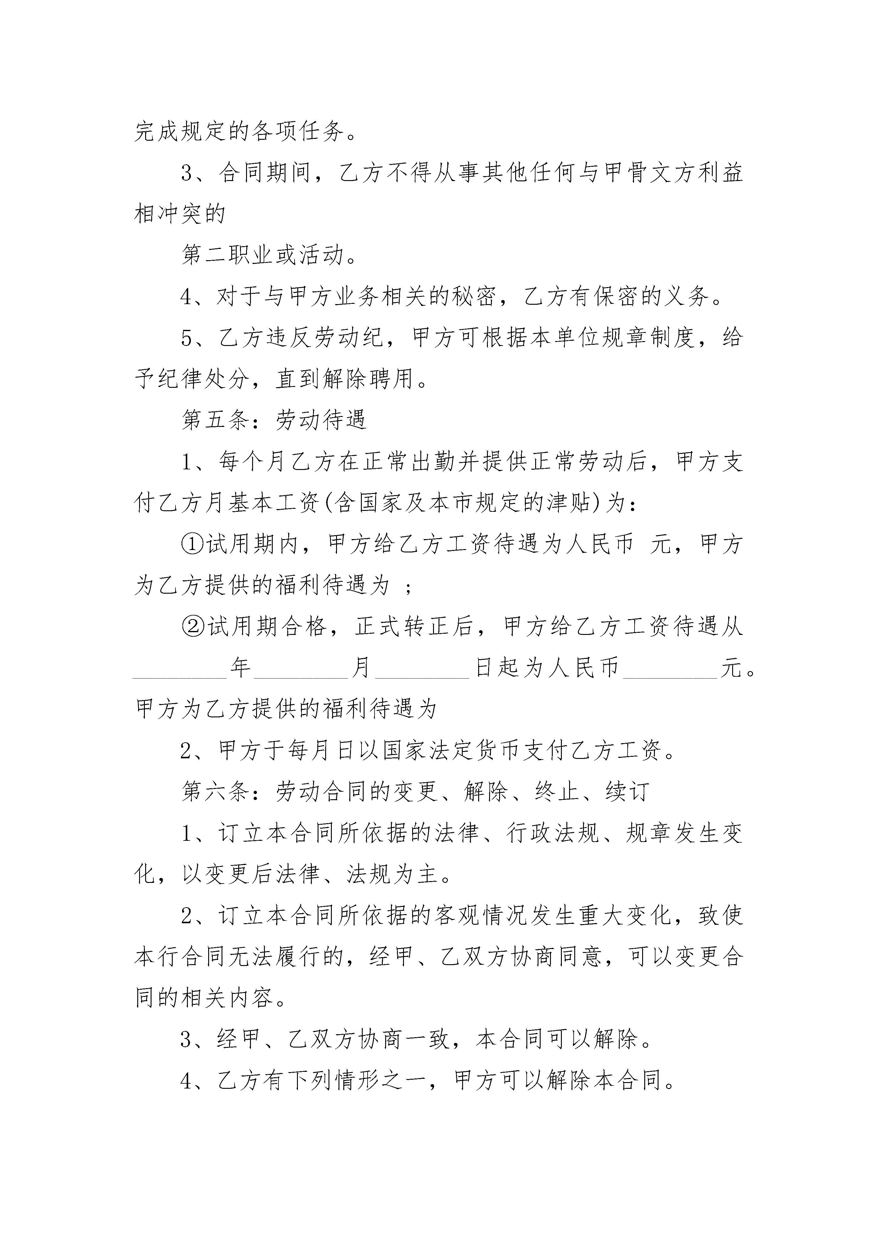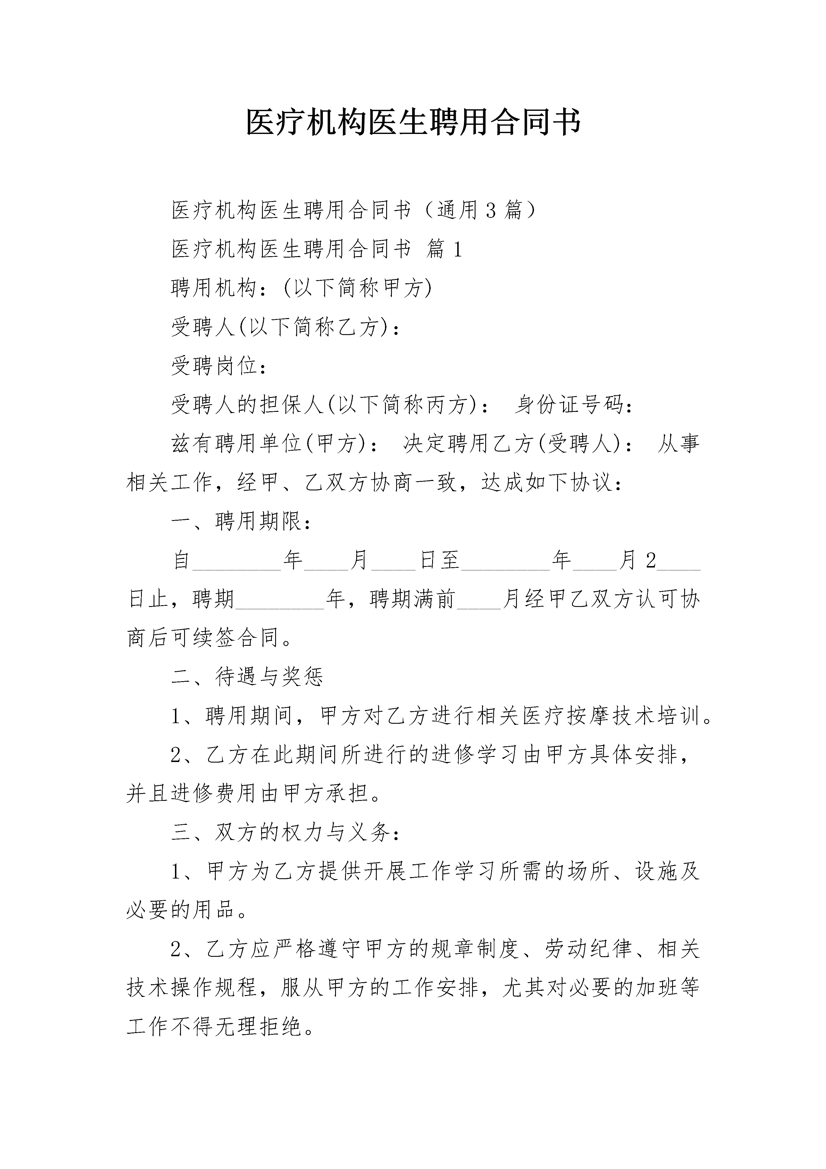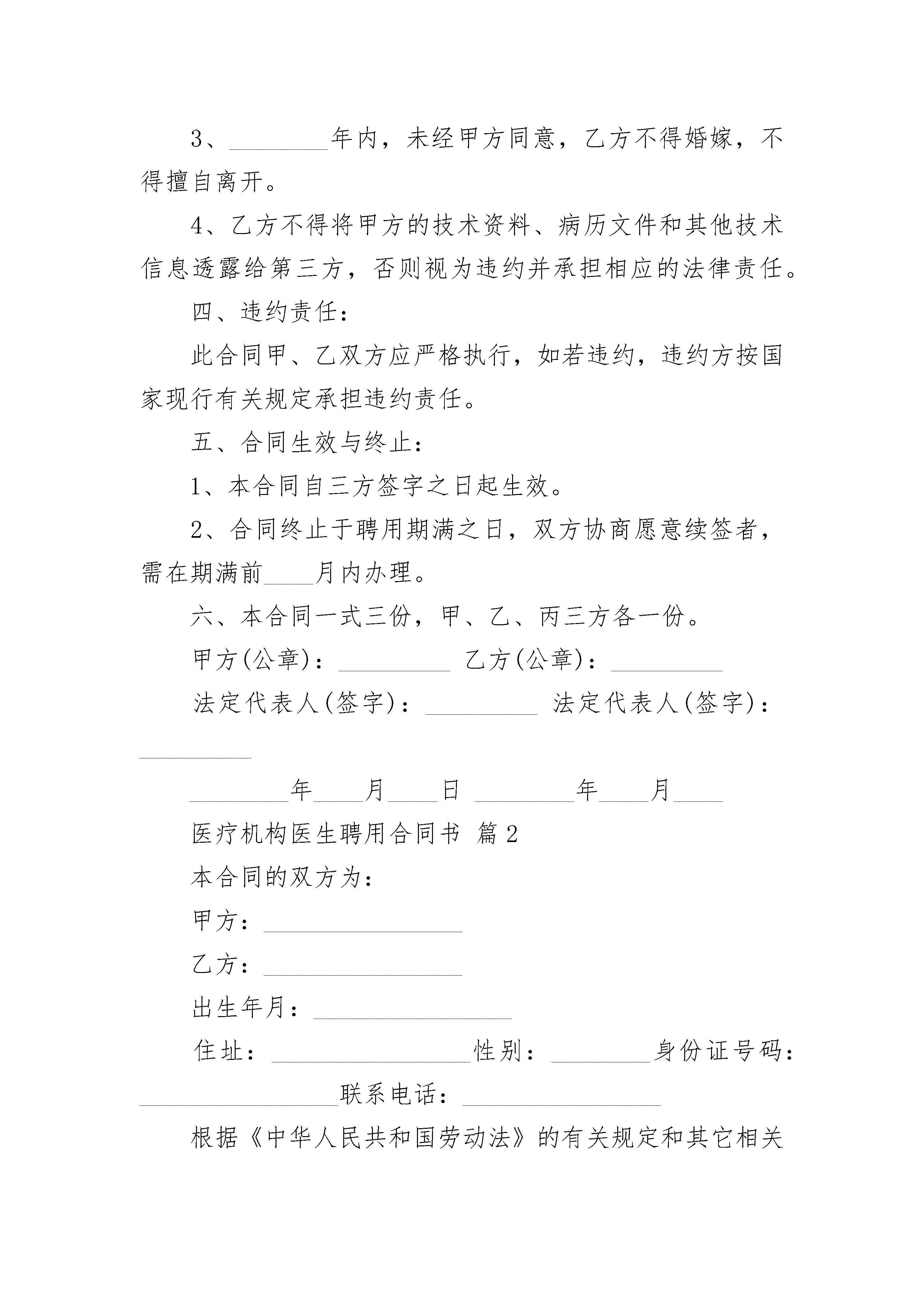 医疗机构医生聘用合同书医疗机构医生聘用合同书(通用3篇)医疗机构医生聘用合同书篇1聘用机构:(以下简称甲方)受聘人(以下简称乙方):受聘岗位:受聘人的担保人(以下简称丙方):身份证号码:兹有聘用单位(甲方):决定聘用乙方(受聘人):从事相关工作,经甲、乙双方协商一致,达成如下协议:一、聘用期限:自________年____月____日至________年____月2____日止,聘期________年,聘期满前____月经甲乙双方认可协商后可续签合同。二、待遇与奖惩1、聘用期间,甲方对乙方进行相关医疗按摩技术培训。2、乙方在此期间所进行的进修学习由甲方具体安排,并且进修费用由甲方承担。三、双方的权力与义务:1、甲方为乙方提供开展工作学习所需的场所、设施及必要的用品。2、乙方应严格遵守甲方的规章制度、劳动纪律、相关技术操作规程,服从甲方的工作安排,尤其对必要的加班等工作不得无理拒绝。3、________年内,未经甲方同意,乙方不得婚嫁,不得擅自离开。4、乙方不得将甲方的技术资料、病历文件和其他技术信息透露给第三方,否则视为违约并承担相应的法律责任。四、违约责任:此合同甲、乙双方应严格执行,如若违约,违约方按国家现行有关规定承担违约责任。五、合同生效与终止:1、本合同自三方签字之日起生效。2、合同终止于聘用期满之日,双方协商愿意续签者,需在期满前____月内办理。六、本合同一式三份,甲、乙、丙三方各一份。甲方(公章):_________乙方(公章):_________法定代表人(签字):_________法定代表人(签字):_________________年____月____日________年____月____医疗机构医生聘用合同书篇2本合同的双方为:甲方:________________乙方:________________出生年月:________________住址:________________性别:________身份证号码:________________联系电话:________________根据《中华人民共和国劳动法》的有关规定和其它相关的法律法规内容,本着平等自愿、协商一致的原则,甲乙双方经过友好协商,签订本合同,并保证共同遵循。本合同条款如需修改、补或删减,须经双方协商一致,但本合同另有规定的除外。第一条:合同期限1、本合同的期限为年,自________年________月________日起,至________年________月________日止,其中________年________月________日止试用期。2、本合同期满后经协商一致,双方续签劳动合同。3、本合同期满后,未续签合同视为自动解除劳动合同。第二条:工作岗位和内容1、乙方同意根据甲方工作需要担任部门2、乙方应当按照岗位要求,按时、按质、按量完成工作任务。3、甲方可以根据工作需要、乙方的技术情况、业务能力和表现,对乙方的工作岗位和工作内容进行调整。第三条:工作时间1、甲方实行不定时工作制。2、因工作需要,甲方可调整工作作息制度,乙方应服从甲方的安排。第四条:劳动纪律1、自觉遵守国家的法律、法规和社会公德,自觉维护甲方的声誉和利益。2、乙方应严格遵守甲方的各项规章制度及规定,保证完成规定的各项任务。3、合同期间,乙方不得从事其他任何与甲骨文方利益相冲突的第二职业或活动。4、对于与甲方业务相关的秘密,乙方有保密的义务。5、乙方违反劳动纪,甲方可根据本单位规章制度,给予纪律处分,直到解除聘用。第五条:劳动待遇1、每个月乙方在正常出勤并提供正常劳动后,甲方支付乙方月基本工资(含国家及本市规定的津贴)为:①试用期内,甲方给乙方工资待遇为人民币元,甲方为乙方提供的福利待遇为;②试用期合格,正式转正后,甲方给乙方工资待遇从________年________月________日起为人民币________元。甲方为乙方提供的福利待遇为2、甲方于每月日以国家法定货币支付乙方工资。第六条:劳动合同的变更、解除、终止、续订1、订立本合同所依据的法律、行政法规、规章发生变化,以变更后法律、法规为主。2、订立本合同所依据的客观情况发生重大变化,致使本行合同无法履行的,经甲、乙双方协商同意,可以变更合同的相关内容。3、经甲、乙双方协商一致,本合同可以解除。4、乙方有下列情形之一,甲方可以解除本合同。⑴试用期间,被证明不符合录用条件的;⑵严重违反劳动纪律或甲方规章制度的;⑶严重失职、营私舞弊,对甲方利益造成重大损害的;⑷被依法追究刑事责任的。5、下列情形之一,甲方可以解除本合同,但应提前十天以书面形式通知乙方:⑴乙方患病或非因工负伤,医疗期满后,不能从事原工作也不能从事由甲方另行安排的工作的;⑵乙方不能胜任工作,经过培训或者调整工作岗位后,仍不能胜任工作的;⑶