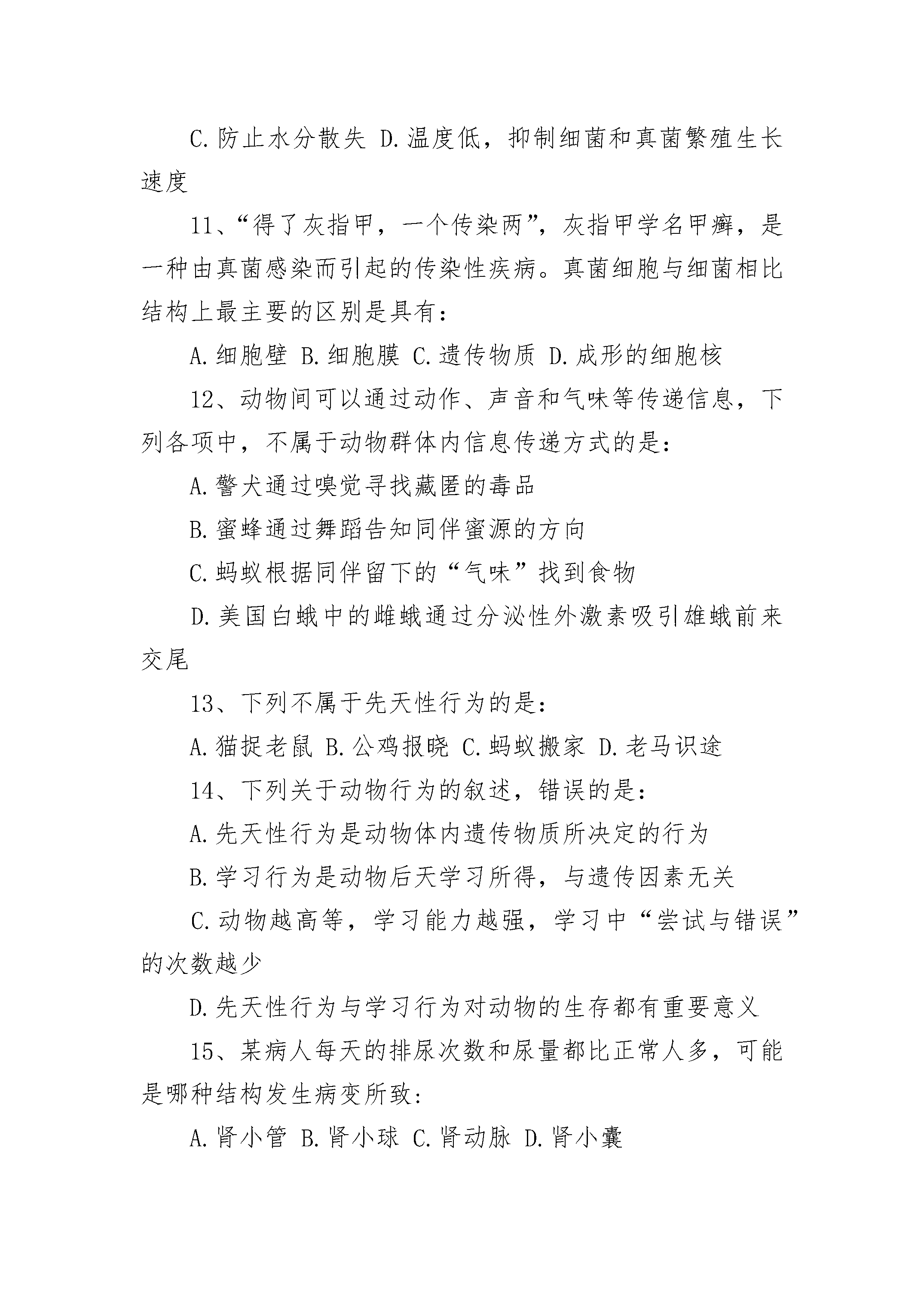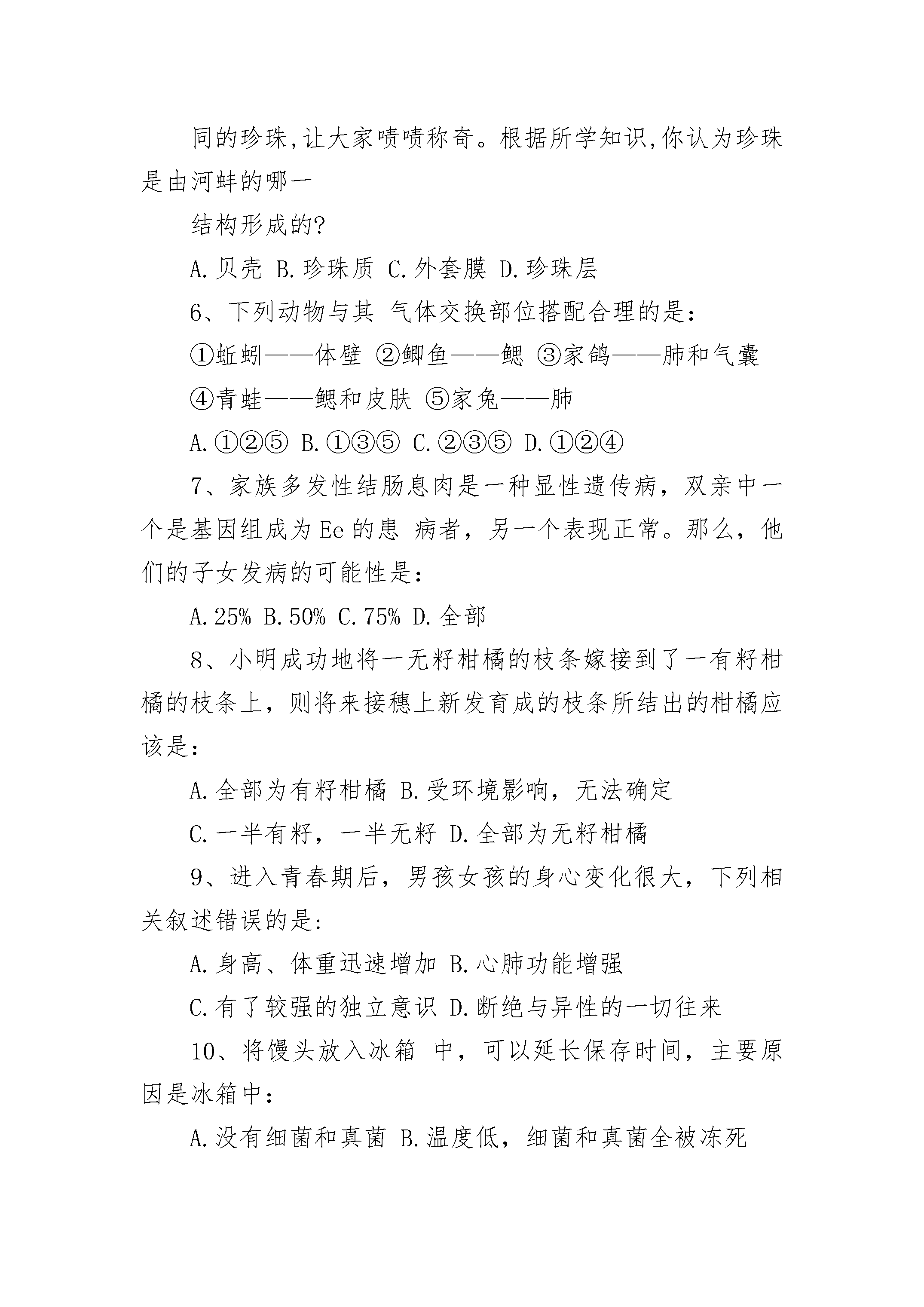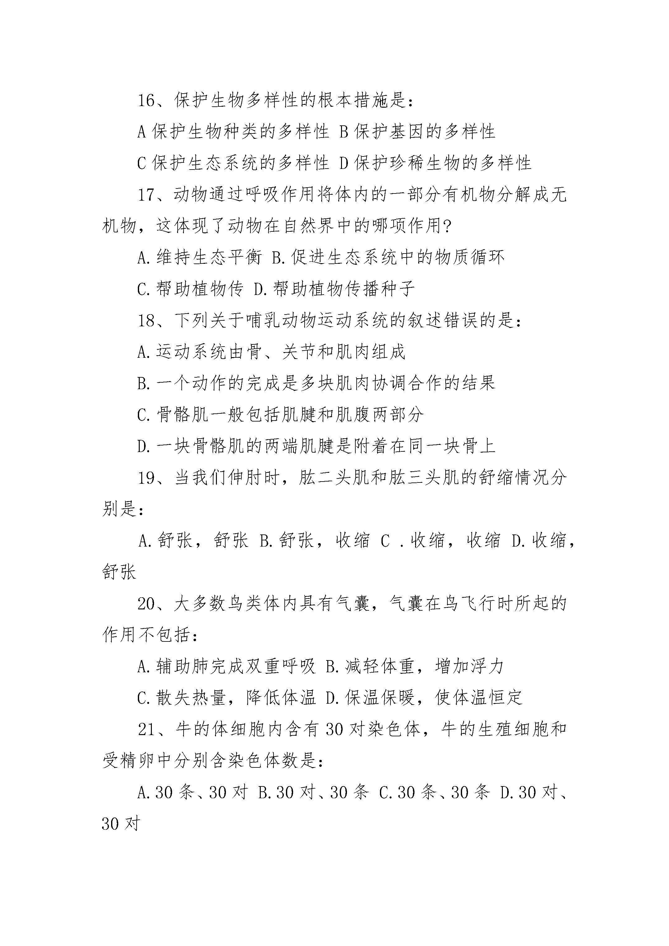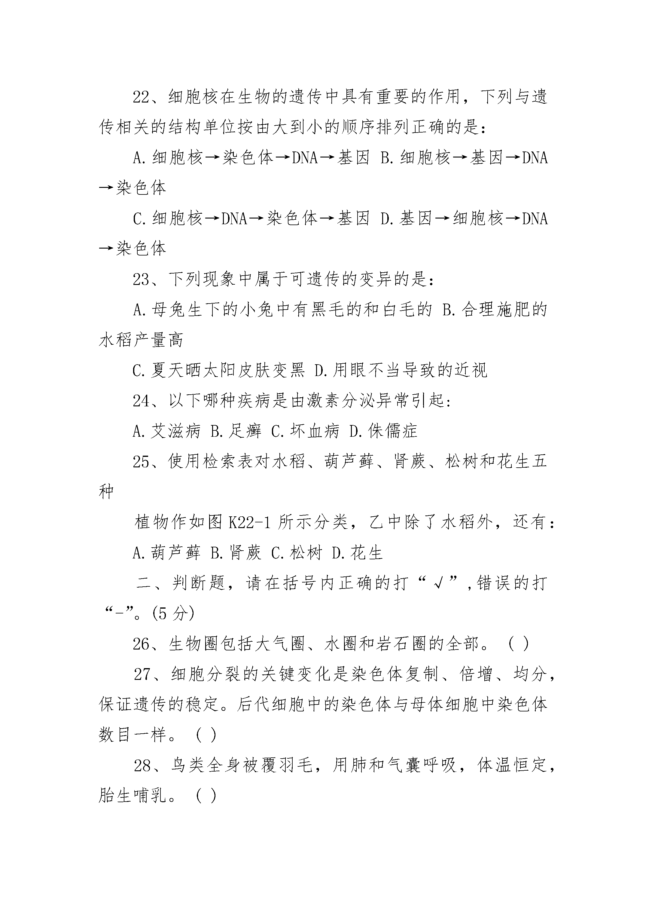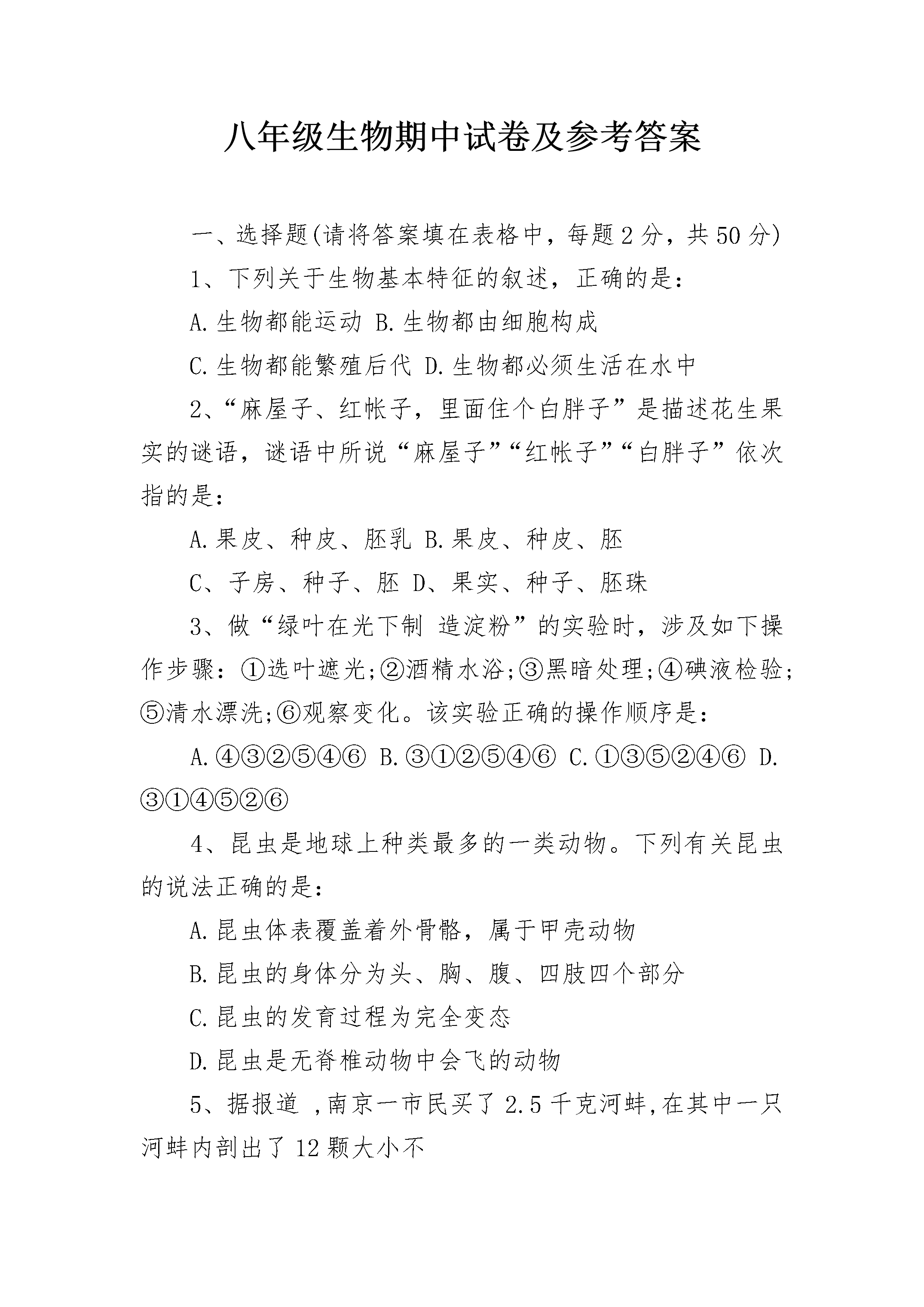 八年级生物期中试卷及参考答案一、选择题(请将答案填在表格中,每题2分,共50分)1、下列关于生物基本特征的叙述,正确的是:A.生物都能运动B.生物都由细胞构成C.生物都能繁殖后代D.生物都必须生活在水中2、“麻屋子、红帐子,里面住个白胖子”是描述花生果实的谜语,谜语中所说“麻屋子”“红帐子”“白胖子”依次指的是:A.果皮、种皮、胚乳B.果皮、种皮、胚C、子房、种子、胚D、果实、种子、胚珠3、做“绿叶在光下制造淀粉”的实验时,涉及如下操作步骤:①选叶遮光;②酒精水浴;③黑暗处理;④碘液检验;⑤清水漂洗;⑥观察变化。该实验正确的操作顺序是:A.④③②⑤④⑥B.③①②⑤④⑥C.①③⑤②④⑥D.③①④⑤②⑥4、昆虫是地球上种类最多的一类动物。下列有关昆虫的说法正确的是:A.昆虫体表覆盖着外骨骼,属于甲壳动物B.昆虫的身体分为头、胸、腹、四肢四个部分C.昆虫的发育过程为完全变态D.昆虫是无脊椎动物中会飞的动物5、据报道,南京一市民买了2.5千克河蚌,在其中一只河蚌内剖出了12颗大小不同的珍珠,让大家啧啧称奇。根据所学知识,你认为珍珠是由河蚌的哪一结构形成的?A.贝壳B.珍珠质C.外套膜D.珍珠层6、下列动物与其气体交换部位搭配合理的是:①蚯蚓——体壁②鲫鱼——鳃③家鸽——肺和气囊④青蛙——鳃和皮肤⑤家兔——肺A.①②⑤B.①③⑤C.②③⑤D.①②④7、家族多发性结肠息肉是一种显性遗传病,双亲中一个是基因组成为Ee的患病者,另一个表现正常。那么,他们的子女发病的可能性是:A.25%B.50%C.75%D.全部8、小明成功地将一无籽柑橘的枝条嫁接到了一有籽柑橘的枝条上,则将来接穗上新发育成的枝条所结出的柑橘应该是:A.全部为有籽柑橘B.受环境影响,无法确定C.一半有籽,一半无籽D.全部为无籽柑橘9、进入青春期后,男孩女孩的身心变化很大,下列相关叙述错误的是:A.身高、体重迅速增加B.心肺功能增强C.有了较强的独立意识D.断绝与异性的一切往来10、将馒头放入冰箱中,可以延长保存时间,主要原因是冰箱中:A.没有细菌和真菌B.温度低,细菌和真菌全被冻死C.防止水分散失D.温度低,抑制细菌和真菌繁殖生长速度11、“得了灰指甲,一个传染两”,灰指甲学名甲癣,是一种由真菌感染而引起的传染性疾病。真菌细胞与细菌相比结构上最主要的区别是具有:A.细胞壁B.细胞膜C.遗传物质D.成形的细胞核12、动物间可以通过动作、声音和气味等传递信息,下列各项中,不属于动物群体内信息传递方式的是:A.警犬通过嗅觉寻找藏匿的毒品B.蜜蜂通过舞蹈告知同伴蜜源的方向C.蚂蚁根据同伴留下的“气味”找到食物D.美国白蛾中的雌蛾通过分泌性外激素吸引雄蛾前来交尾13、下列不属于先天性行为的是:A.猫捉老鼠B.公鸡报晓C.蚂蚁搬家D.老马识途14、下列关于动物行为的叙述,错误的是:A.先天性行为是动物体内遗传物质所决定的行为B.学习行为是动物后天学习所得,与遗传因素无关C.动物越高等,学习能力越强,学习中“尝试与错误”的次数越少D.先天性行为与学习行为对动物的生存都有重要意义15、某病人每天的排尿次数和尿量都比正常人多,可能是哪种结构发生病变所致:A.肾小管B.肾小球C.肾动脉D.肾小囊16、保护生物多样性的根本措施是:A保护生物种类的多样性B保护基因的多样性C保护生态系统的多样性D保护珍稀生物的多样性17、动物通过呼吸作用将体内的一部分有机物分解成无机物,这体现了动物在自然界中的哪项作用?A.维持生态平衡B.促进生态系统中的物质循环C.帮助植物传D.帮助植物传播种子18、下列关于哺乳动物运动系统的叙述错误的是:A.运动系统由骨、关节和肌肉组成B.一个动作的完成是多块肌肉协调合作的结果C.骨骼肌一般包括肌腱和肌腹两部分D.一块骨骼肌的两端肌腱是附着在同一块骨上19、当我们伸肘时,肱二头肌和肱三头肌的舒缩情况分别是:A.舒张,舒张B.舒张,收缩C.收缩,收缩D.收缩,舒张20、大多数鸟类体内具有气囊,气囊在鸟飞行时所起的作用不包括:A.辅助肺完成双重呼吸B.减轻体重,增加浮力C.散失热量,降低体温D.保温保暖,使体温恒定21、牛的体细胞内含有30对染色体,牛的生殖细胞和受精卵中分别含染色体数是:A.30条、30对B.30对、30条C.30条、30条D.30对、30对22、细胞核在生物的遗传中具有重要的作用,下列与遗传相关的结构单位按由大到小的顺序排列正确的是:A.细胞核→染色体→DNA→基因B.细胞核→基因→DNA→染色体C.细胞核→DNA→染色体→基因D.基因→细胞核→DNA→染色体23、下列现象中属于可遗传的变异的是:A.母兔生下的小兔中有黑毛的和白毛的B.合理施肥的水稻产量高C.夏天晒太阳皮肤变黑D.用眼不当导致的近视24、以下哪种疾病是由激素分泌异常引起:A.艾滋病B.足癣C.坏血