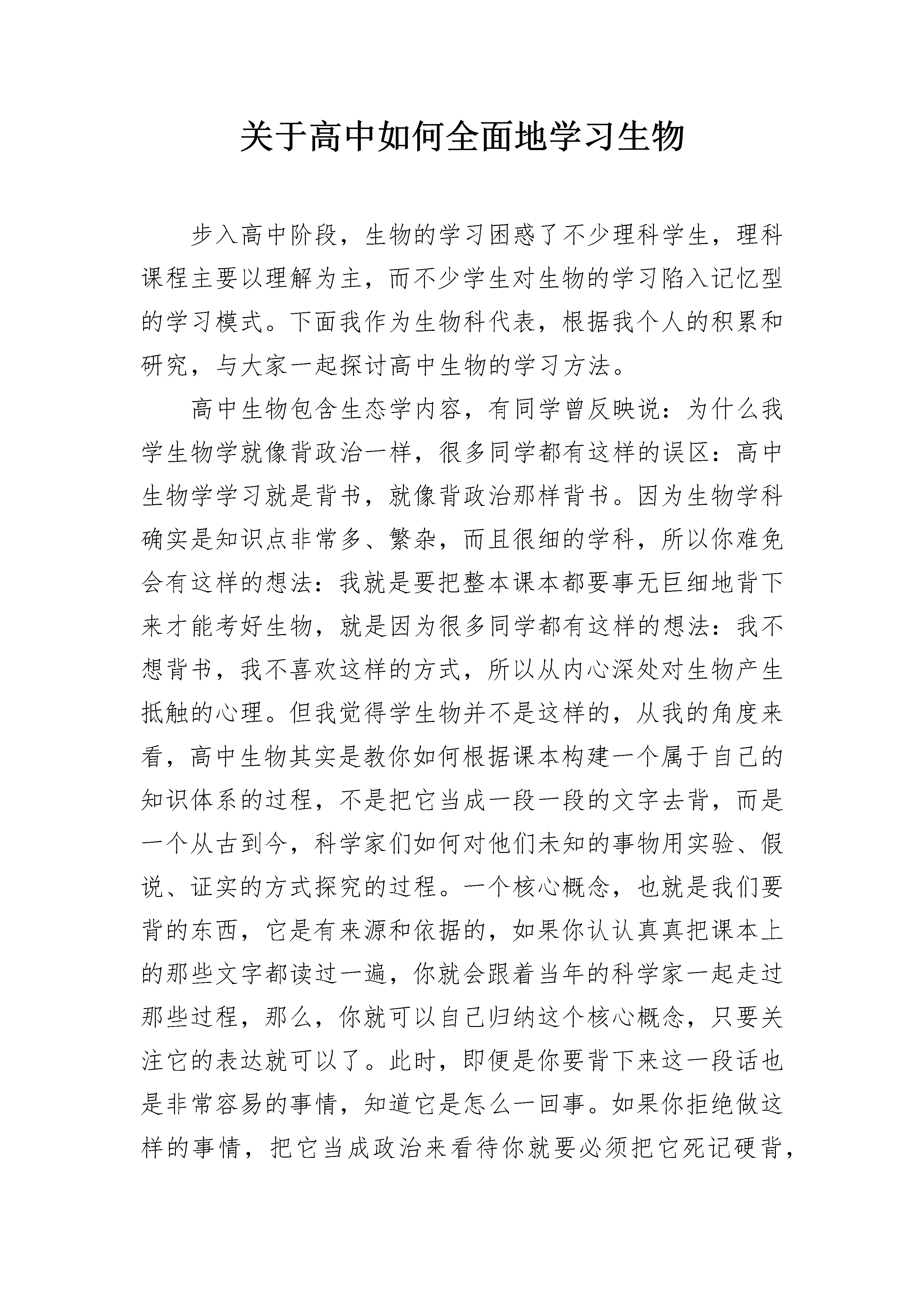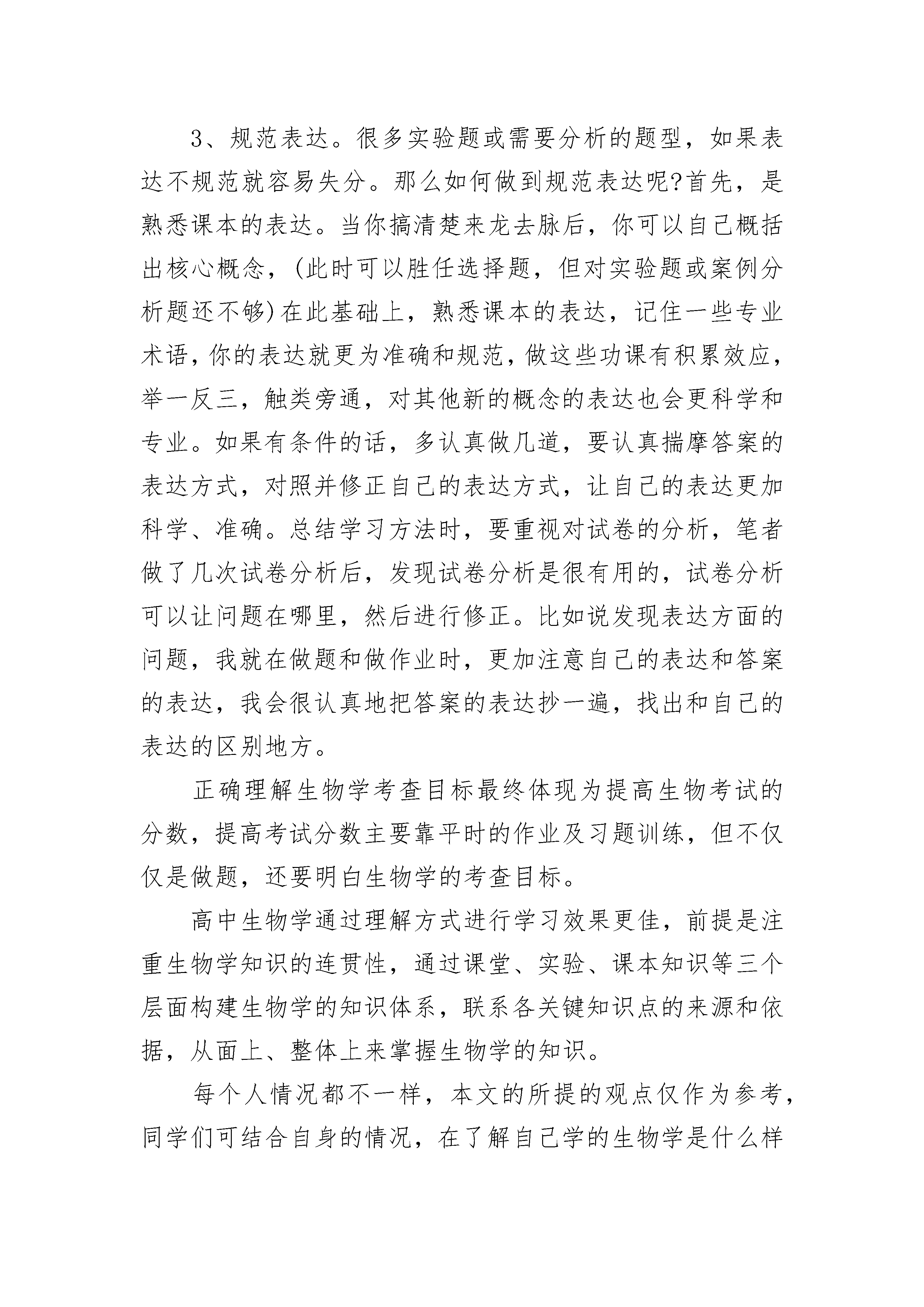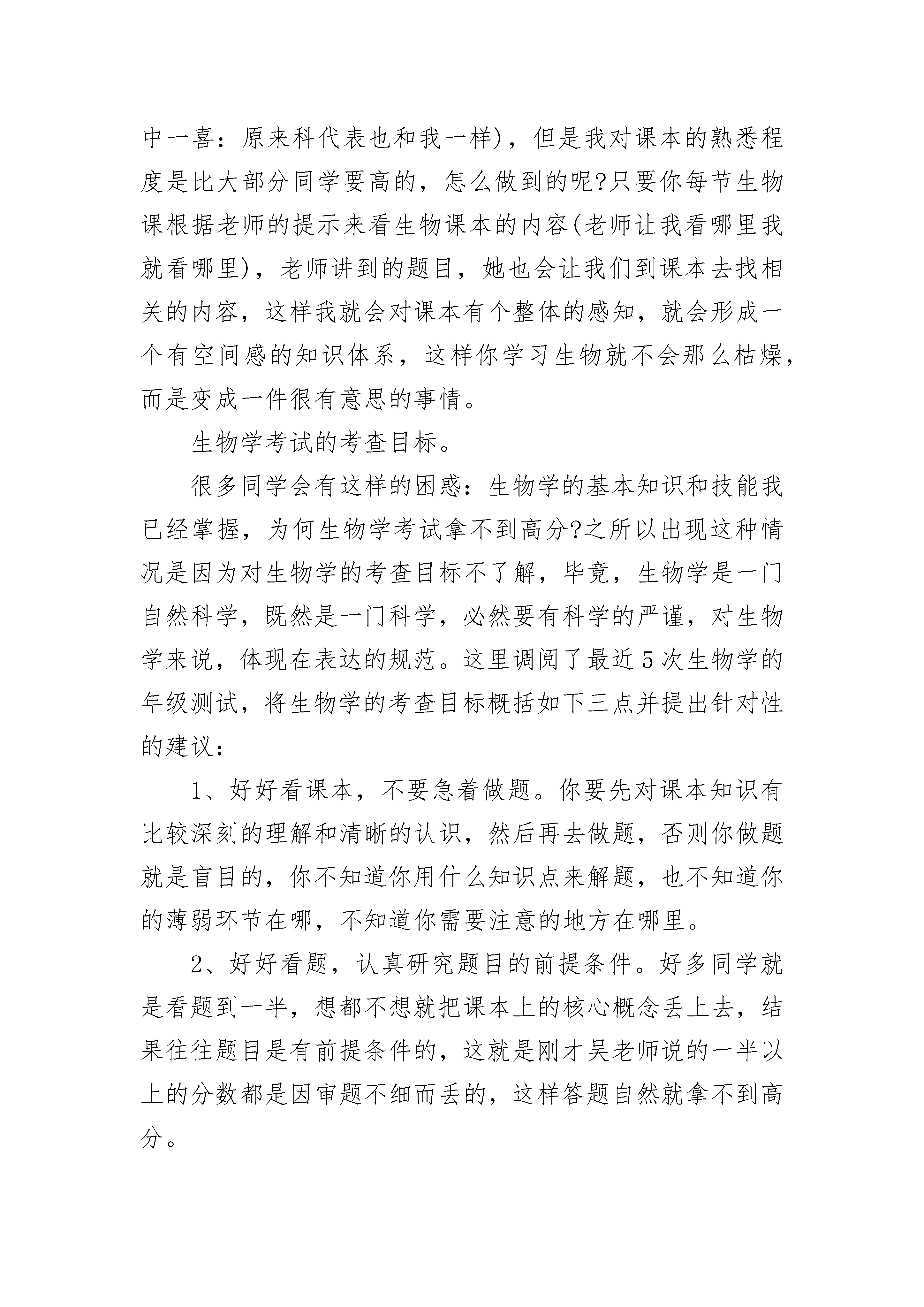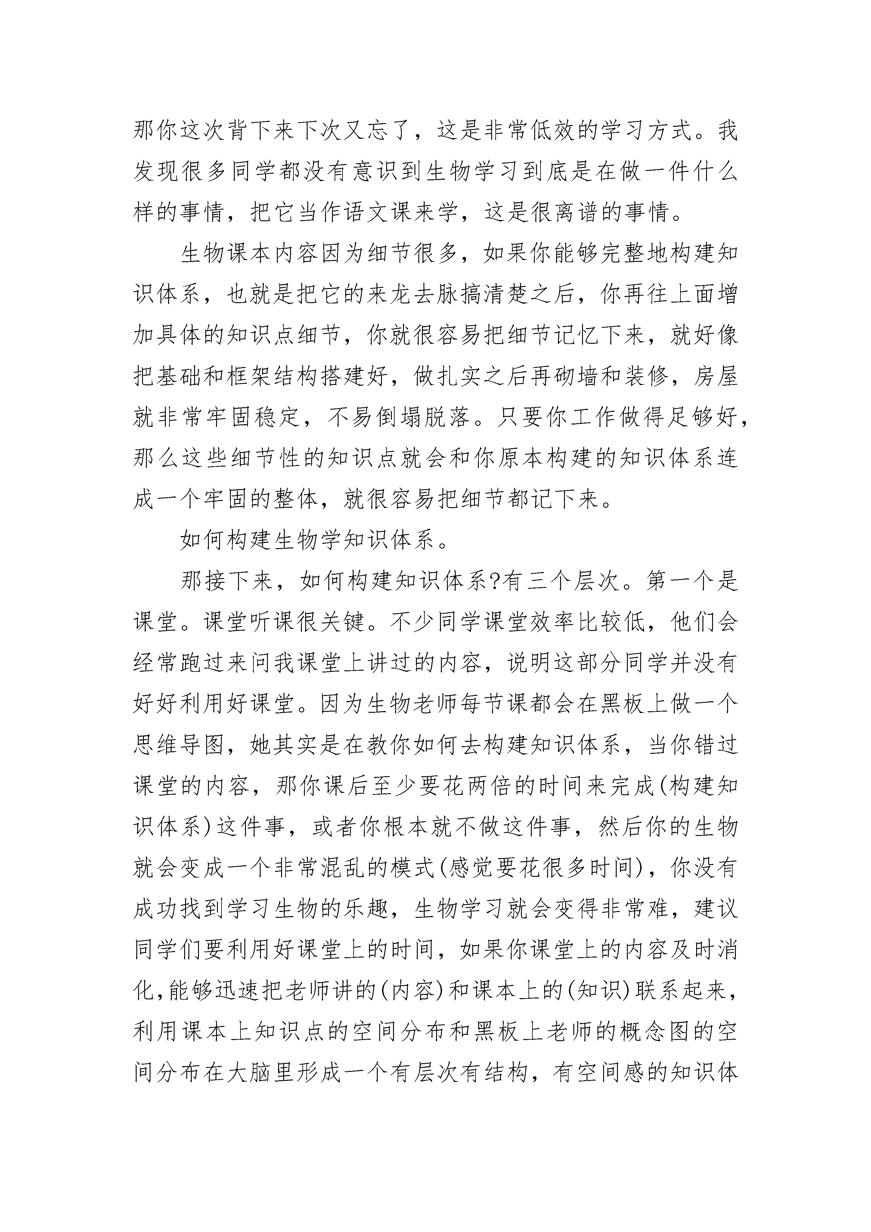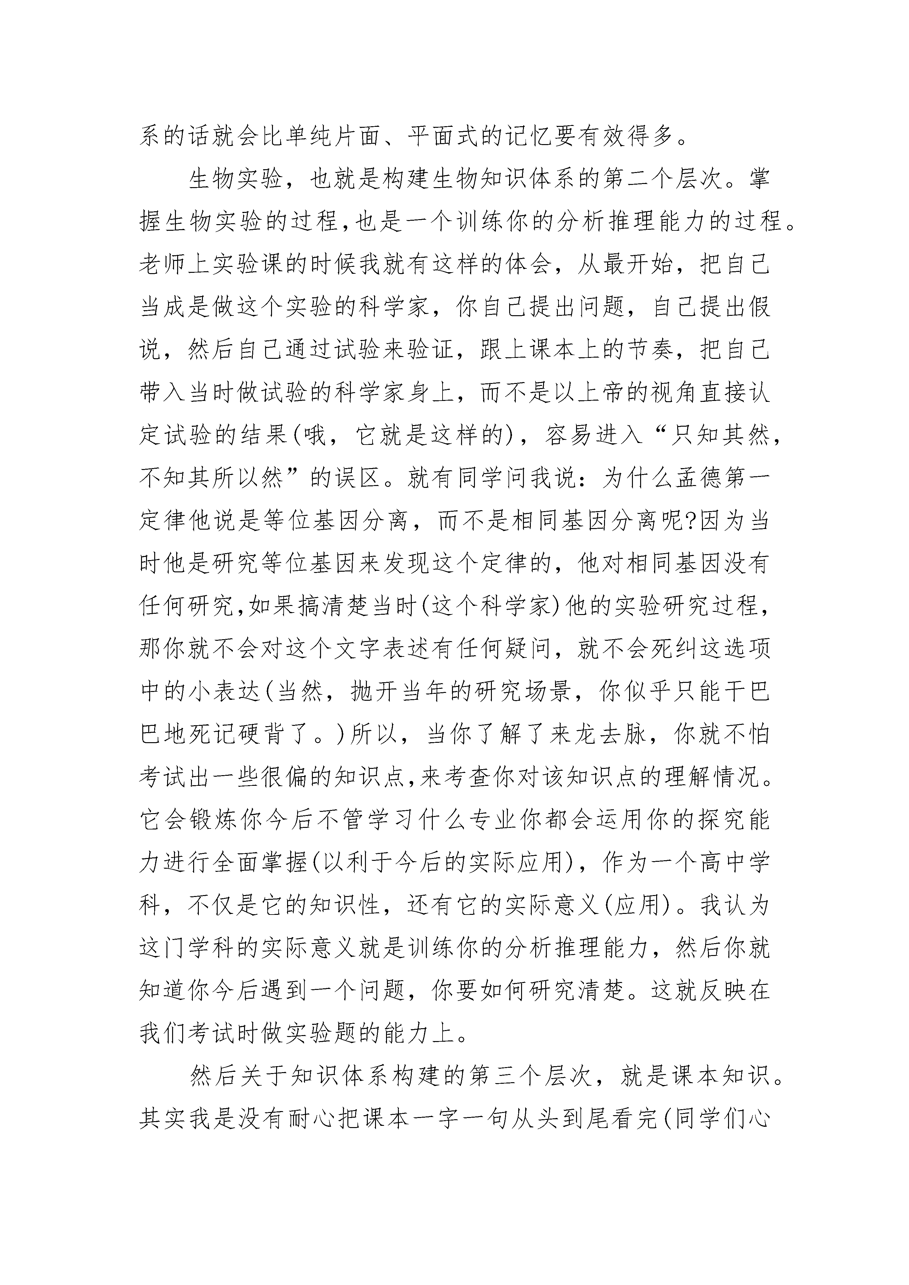 关于高中如何全面地学习生物步入高中阶段,生物的学习困惑了不少理科学生,理科课程主要以理解为主,而不少学生对生物的学习陷入记忆型的学习模式。下面我作为生物科代表,根据我个人的积累和研究,与大家一起探讨高中生物的学习方法。高中生物包含生态学内容,有同学曾反映说:为什么我学生物学就像背政治一样,很多同学都有这样的误区:高中生物学学习就是背书,就像背政治那样背书。因为生物学科确实是知识点非常多、繁杂,而且很细的学科,所以你难免会有这样的想法:我就是要把整本课本都要事无巨细地背下来才能考好生物,就是因为很多同学都有这样的想法:我不想背书,我不喜欢这样的方式,所以从内心深处对生物产生抵触的心理。但我觉得学生物并不是这样的,从我的角度来看,高中生物其实是教你如何根据课本构建一个属于自己的知识体系的过程,不是把它当成一段一段的文字去背,而是一个从古到今,科学家们如何对他们未知的事物用实验、假说、证实的方式探究的过程。一个核心概念,也就是我们要背的东西,它是有来源和依据的,如果你认认真真把课本上的那些文字都读过一遍,你就会跟着当年的科学家一起走过那些过程,那么,你就可以自己归纳这个核心概念,只要关注它的表达就可以了。此时,即便是你要背下来这一段话也是非常容易的事情,知道它是怎么一回事。如果你拒绝做这样的事情,把它当成政治来看待你就要必须把它死记硬背,那你这次背下来下次又忘了,这是非常低效的学习方式。我发现很多同学都没有意识到生物学习到底是在做一件什么样的事情,把它当作语文课来学,这是很离谱的事情。生物课本内容因为细节很多,如果你能够完整地构建知识体系,也就是把它的来龙去脉搞清楚之后,你再往上面增加具体的知识点细节,你就很容易把细节记忆下来,就好像把基础和框架结构搭建好,做扎实之后再砌墙和装修,房屋就非常牢固稳定,不易倒塌脱落。只要你工作做得足够好,那么这些细节性的知识点就会和你原本构建的知识体系连成一个牢固的整体,就很容易把细节都记下来。如何构建生物学知识体系。那接下来,如何构建知识体系?有三个层次。第一个是课堂。课堂听课很关键。不少同学课堂效率比较低,他们会经常跑过来问我课堂上讲过的内容,说明这部分同学并没有好好利用好课堂。因为生物老师每节课都会在黑板上做一个思维导图,她其实是在教你如何去构建知识体系,当你错过课堂的内容,那你课后至少要花两倍的时间来完成(构建知识体系)这件事,或者你根本就不做这件事,然后你的生物就会变成一个非常混乱的模式(感觉要花很多时间),你没有成功找到学习生物的乐趣,生物学习就会变得非常难,建议同学们要利用好课堂上的时间,如果你课堂上的内容及时消化,能够迅速把老师讲的(内容)和课本上的(知识)联系起来,利用课本上知识点的空间分布和黑板上老师的概念图的空间分布在大脑里形成一个有层次有结构,有空间感的知识体系的话就会比单纯片面、平面式的记忆要有效得多。生物实验,也就是构建生物知识体系的第二个层次。掌握生物实验的过程,也是一个训练你的分析推理能力的过程。老师上实验课的时候我就有这样的体会,从最开始,把自己当成是做这个实验的科学家,你自己提出问题,自己提出假说,然后自己通过试验来验证,跟上课本上的节奏,把自己带入当时做试验的科学家身上,而不是以上帝的视角直接认定试验的结果(哦,它就是这样的),容易进入“只知其然,不知其所以然”的误区。就有同学问我说:为什么孟德第一定律他说是等位基因分离,而不是相同基因分离呢?因为当时他是研究等位基因来发现这个定律的,他对相同基因没有任何研究,如果搞清楚当时(这个科学家)他的实验研究过程,那你就不会对这个文字表述有任何疑问,就不会死纠这选项中的小表达(当然,抛开当年的研究场景,你似乎只能干巴巴地死记硬背了。)所以,当你了解了来龙去脉,你就不怕考试出一些很偏的知识点,来考查你对该知识点的理解情况。它会锻炼你今后不管学习什么专业你都会运用你的探究能力进行全面掌握(以利于今后的实际应用),作为一个高中学科,不仅是它的知识性,还有它的实际意义(应用)。我认为这门学科的实际意义就是训练你的分析推理能力,然后你就知道你今后遇到一个问题,你要如何研究清楚。这就反映在我们考试时做实验题的能力上。然后关于知识体系构建的第三个层次,就是课本知识。其实我是没有耐心把课本一字一句从头到尾看完(同学们心中一喜:原来科代表也和我一样),但是我对课本的熟悉程度是比大部分同学要高的,怎么做到的呢?只要你每节生物课根据老师的提示来看生物课本的内容(老师让我看哪里我就看哪里),老师讲到的题目,她也会让我们到课本去找相关的内容,这样我就会对课本有个整体的感知,就会形成一个有空间感的知识体系,这样你学习生物就不会那么枯燥,而是变成一件很有意思的事情。生物学考试的考查目标。很多同学会有这样的困惑:生物学的基本知识和技能我已经掌握,为何