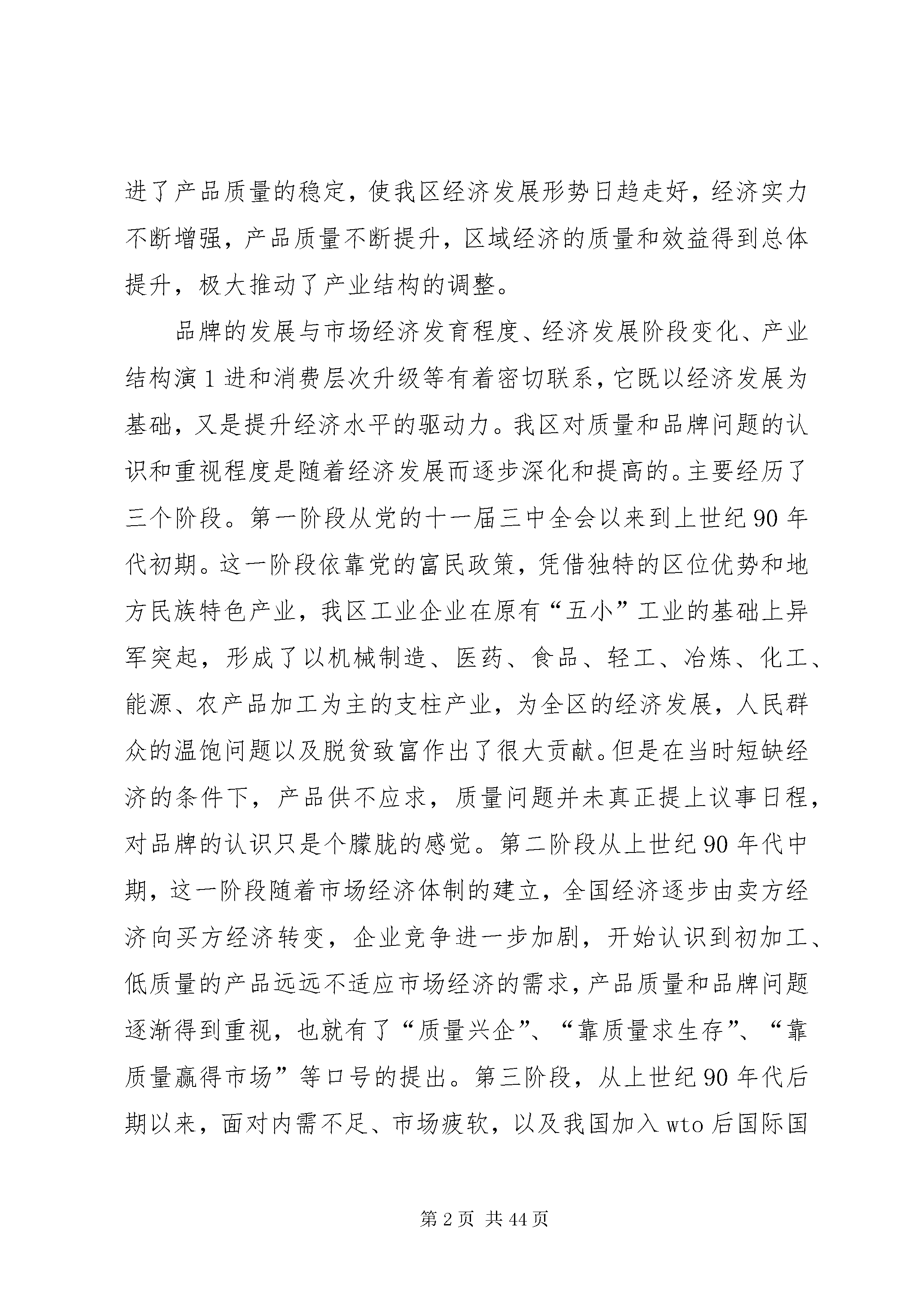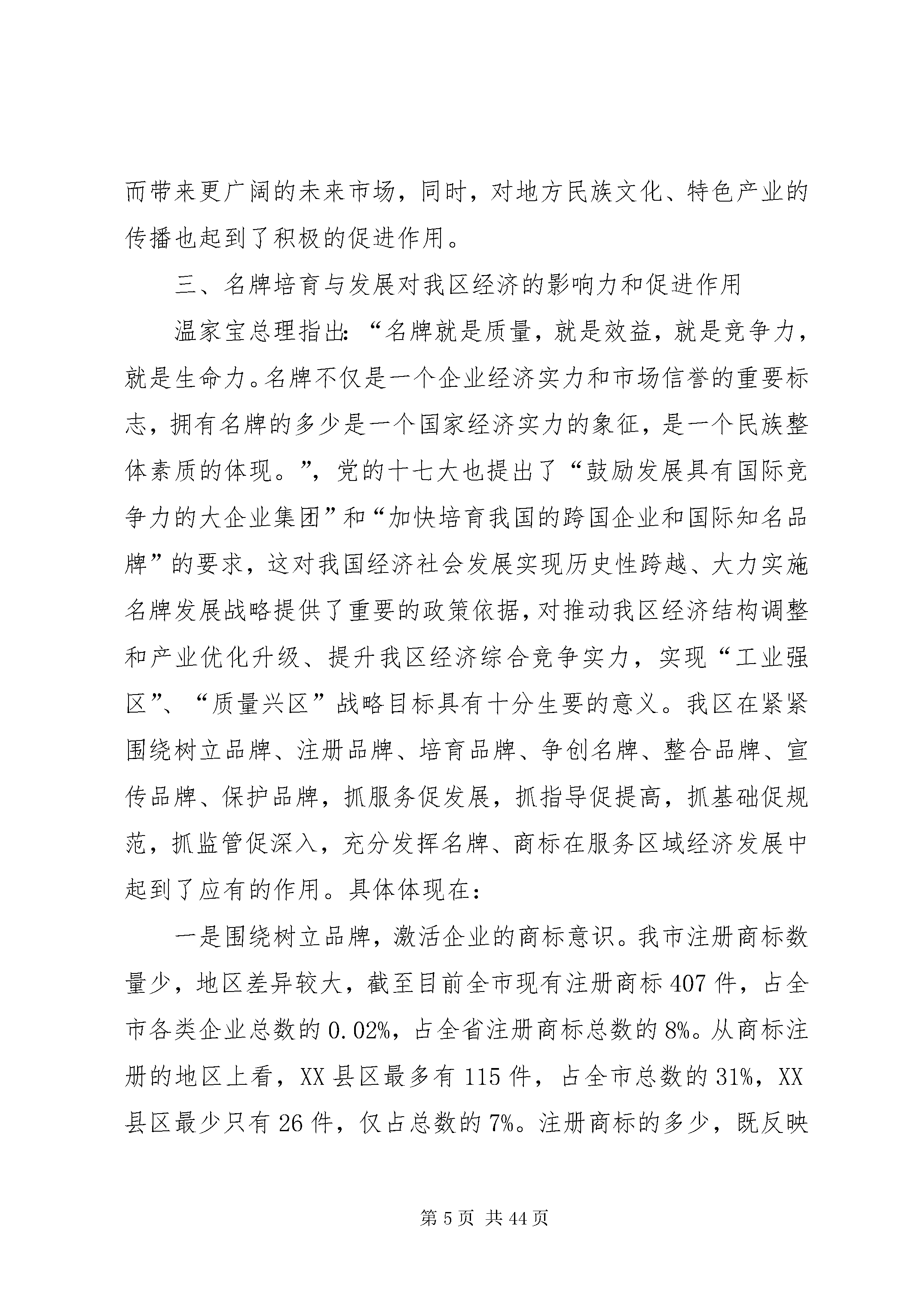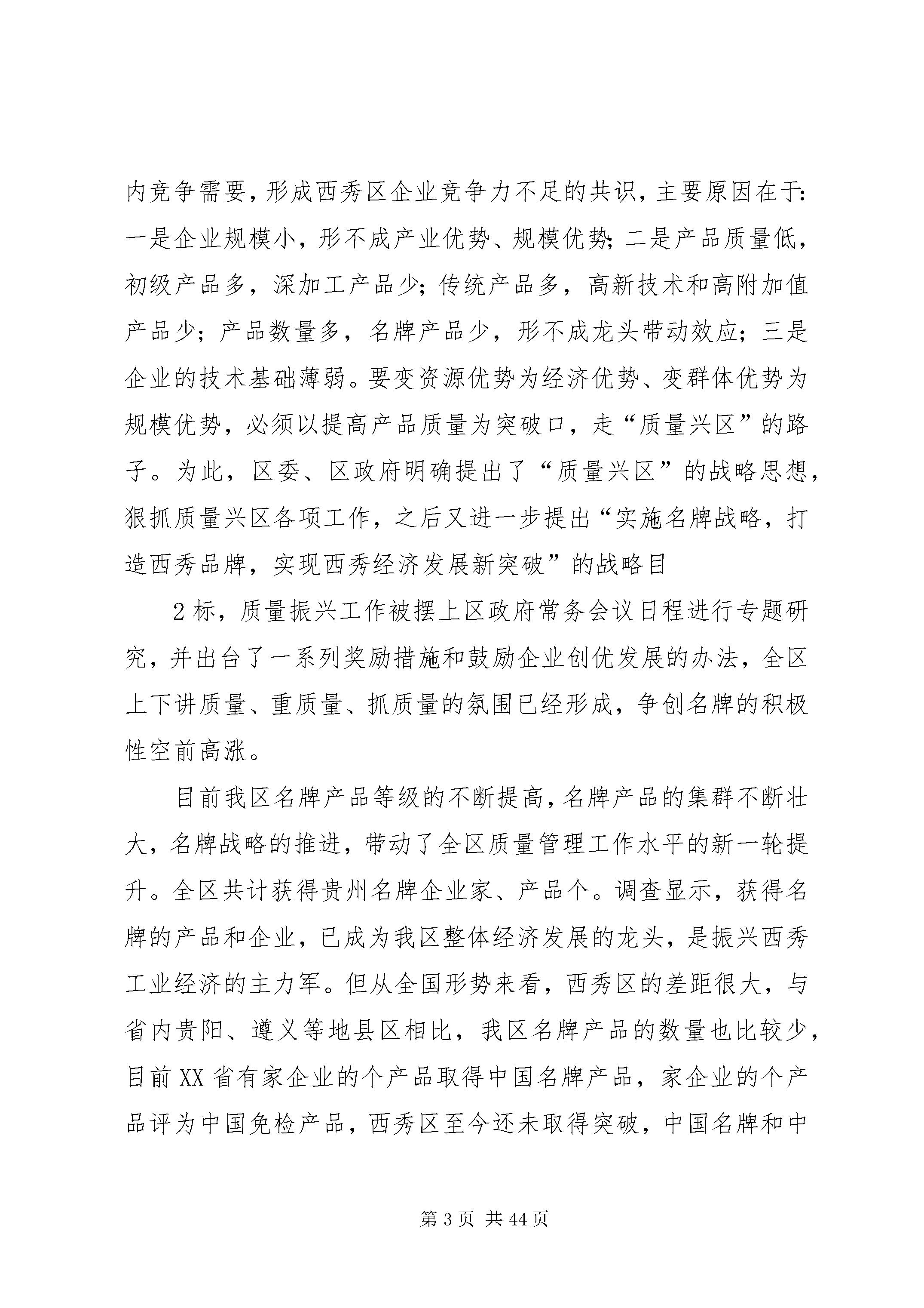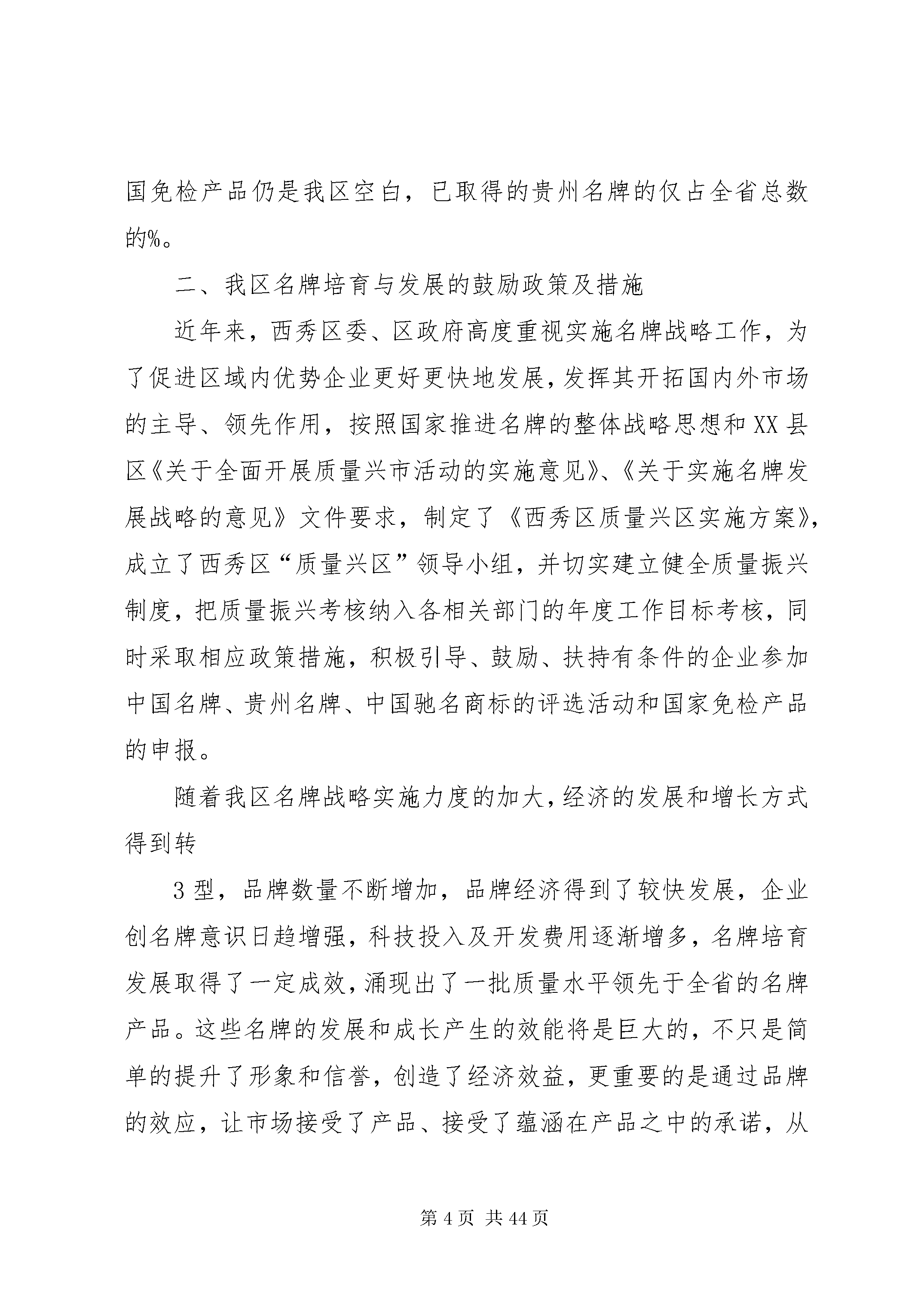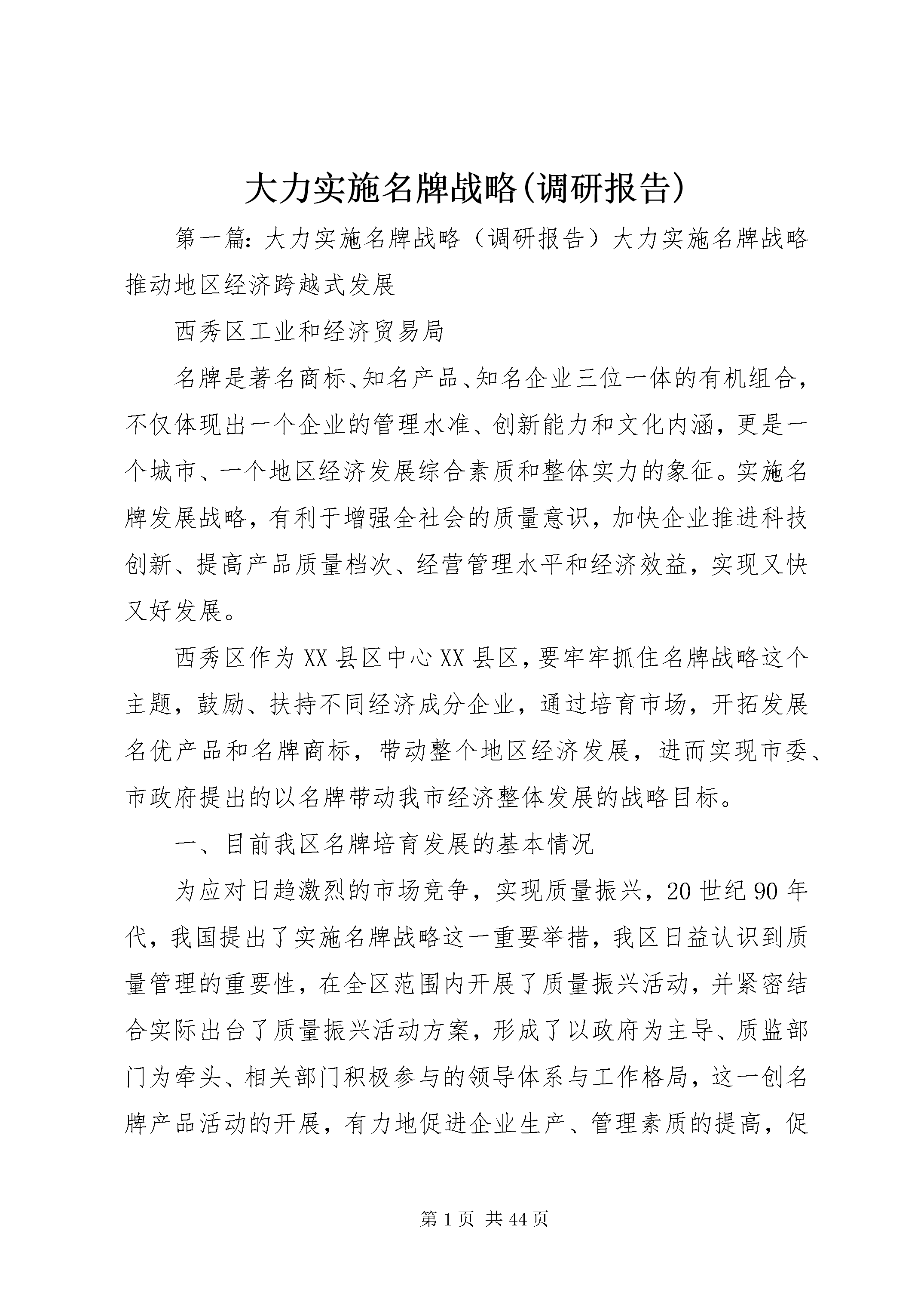大力实施名牌战略(调研报告)第一篇:大力实施名牌战略(调研报告)大力实施名牌战略推动地区经济跨越式发展西秀区工业和经济贸易局名牌是著名商标、知名产品、知名企业三位一体的有机组合,不仅体现出一个企业的管理水准、创新能力和文化内涵,更是一个城市、一个地区经济发展综合素质和整体实力的象征。实施名牌发展战略,有利于增强全社会的质量意识,加快企业推进科技创新、提高产品质量档次、经营管理水平和经济效益,实现又快又好发展。西秀区作为XX县区中心XX县区,要牢牢抓住名牌战略这个主题,鼓励、扶持不同经济成分企业,通过培育市场,开拓发展名优产品和名牌商标,带动整个地区经济发展,进而实现市委、市政府提出的以名牌带动我市经济整体发展的战略目标。一、目前我区名牌培育发展的基本情况为应对日趋激烈的市场竞争,实现质量振兴,20世纪90年代,我国提出了实施名牌战略这一重要举措,我区日益认识到质量管理的重要性,在全区范围内开展了质量振兴活动,并紧密结合实际出台了质量振兴活动方案,形成了以政府为主导、质监部门为牵头、相关部门积极参与的领导体系与工作格局,这一创名牌产品活动的开展,有力地促进企业生产、管理素质的提高,促进了产品质量的稳定,使我区经济发展形势日趋走好,经济实力不断增强,产品质量不断提升,区域经济的质量和效益得到总体提升,极大推动了产业结构的调整。品牌的发展与市场经济发育程度、经济发展阶段变化、产业结构演1进和消费层次升级等有着密切联系,它既以经济发展为基础,又是提升经济水平的驱动力。我区对质量和品牌问题的认识和重视程度是随着经济发展而逐步深化和提高的。主要经历了三个阶段。第一阶段从党的十一届三中全会以来到上世纪90年代初期。这一阶段依靠党的富民政策,凭借独特的区位优势和地方民族特色产业,我区工业企业在原有“五小”工业的基础上异军突起,形成了以机械制造、医药、食品、轻工、冶炼、化工、能源、农产品加工为主的支柱产业,为全区的经济发展,人民群众的温饱问题以及脱贫致富作出了很大贡献。但是在当时短缺经济的条件下,产品供不应求,质量问题并未真正提上议事日程,对品牌的认识只是个朦胧的感觉。第二阶段从上世纪90年代中期,这一阶段随着市场经济体制的建立,全国经济逐步由卖方经济向买方经济转变,企业竞争进一步加剧,开始认识到初加工、低质量的产品远远不适应市场经济的需求,产品质量和品牌问题逐渐得到重视,也就有了“质量兴企”、“靠质量求生存”、“靠质量赢得市场”等口号的提出。第三阶段,从上世纪90年代后期以来,面对内需不足、市场疲软,以及我国加入wto后国际国内竞争需要,形成西秀区企业竞争力不足的共识,主要原因在于:一是企业规模小,形不成产业优势、规模优势;二是产品质量低,初级产品多,深加工产品少;传统产品多,高新技术和高附加值产品少;产品数量多,名牌产品少,形不成龙头带动效应;三是企业的技术基础薄弱。要变资源优势为经济优势、变群体优势为规模优势,必须以提高产品质量为突破口,走“质量兴区”的路子。为此,区委、区政府明确提出了“质量兴区”的战略思想,狠抓质量兴区各项工作,之后又进一步提出“实施名牌战略,打造西秀品牌,实现西秀经济发展新突破”的战略目2标,质量振兴工作被摆上区政府常务会议日程进行专题研究,并出台了一系列奖励措施和鼓励企业创优发展的办法,全区上下讲质量、重质量、抓质量的氛围已经形成,争创名牌的积极性空前高涨。目前我区名牌产品等级的不断提高,名牌产品的集群不断壮大,名牌战略的推进,带动了全区质量管理工作水平的新一轮提升。全区共计获得贵州名牌企业家、产品个。调查显示,获得名牌的产品和企业,已成为我区整体经济发展的龙头,是振兴西秀工业经济的主力军。但从全国形势来看,西秀区的差距很大,与省内贵阳、遵义等地县区相比,我区名牌产品的数量也比较少,目前XX省有家企业的个产品取得中国名牌产品,家企业的个产品评为中国免检产品,西秀区至今还未取得突破,中国名牌和中国免检产品仍是我区空白,已取得的贵州名牌的仅占全省总数的%。二、我区名牌培育与发展的鼓励政策及措施近年来,西秀区委、区政府高度重视实施名牌战略工作,为了促进区域内优势企业更好更快地发展,发挥其开拓国内外市场的主导、领先作用,按照国家推进名牌的整体战略思想和XX县区《关于全面开展质量兴市活动的实施意见》、《关于实施名牌发展战略的意见》文件要求,制定了《西秀区质量兴区实施方案》,成立了西秀区“质量兴区”领导小组,并切实建立健全质量振兴制度,把质量振兴考核纳入各相关部门的年度工作目标考核,同时采取相应政策措施,积极引导、鼓励、扶持有条件的企业参加中国名牌、贵州名牌、中国驰名商标的评选活动和国家免检产品的申报。随着我区名牌战略实施力度的加大,经济的发展和增长方式得到转3型,品牌数量不断增加,品牌经济得到了较快发展,企业创名牌意识日趋增