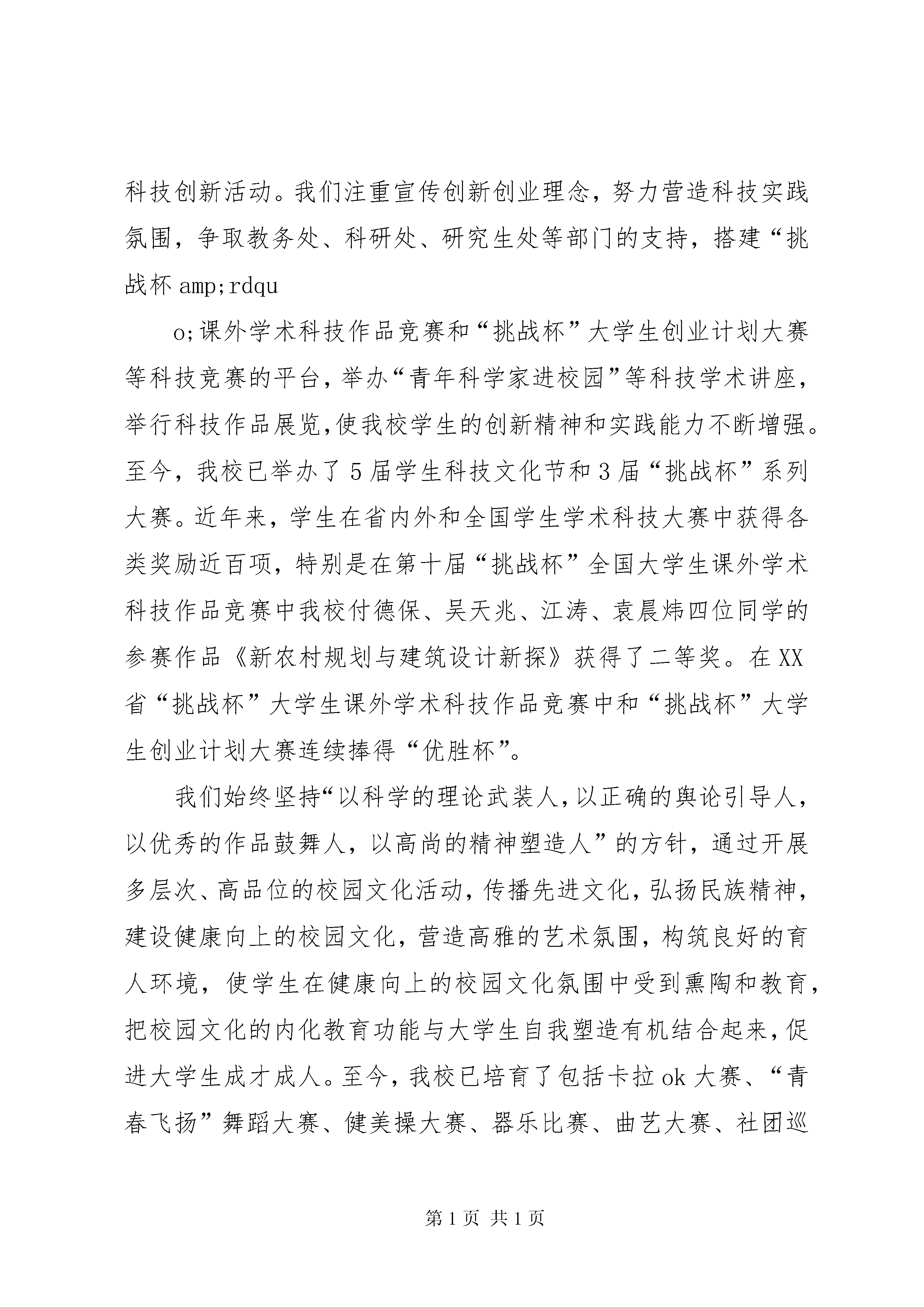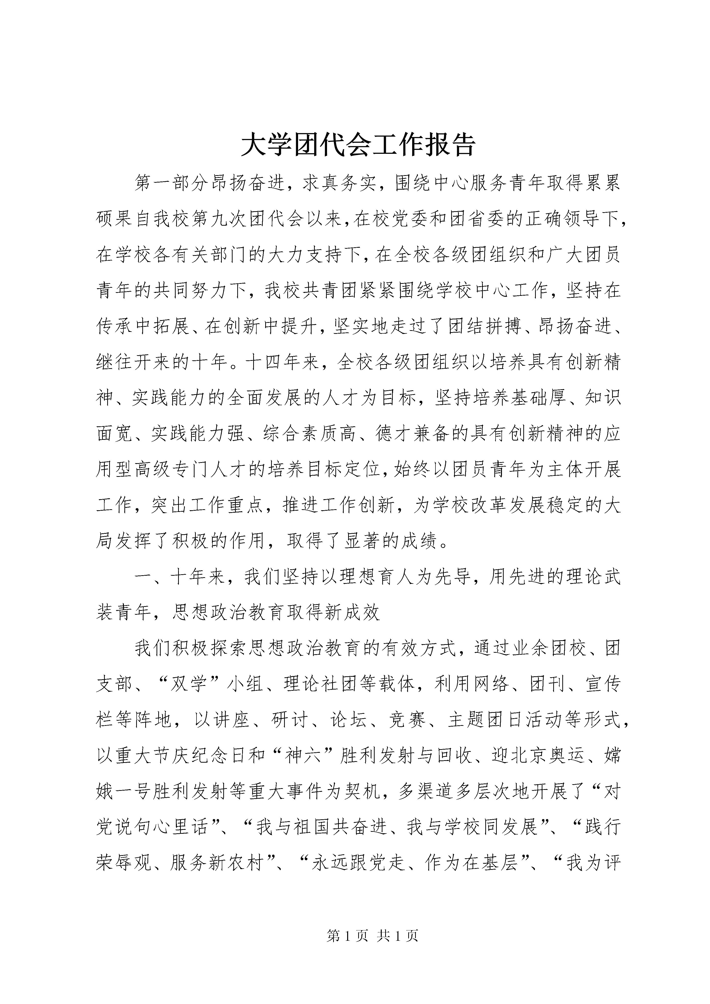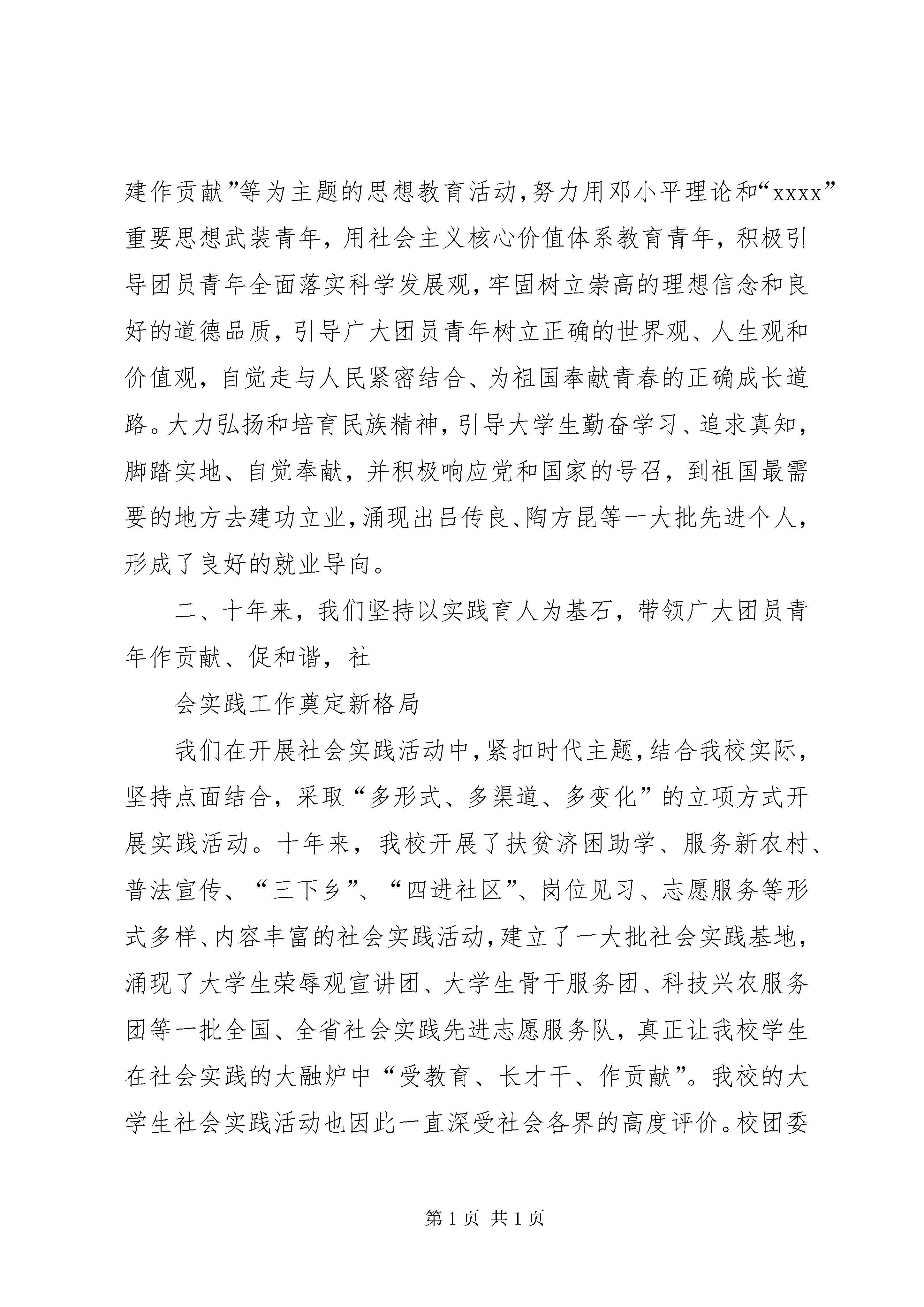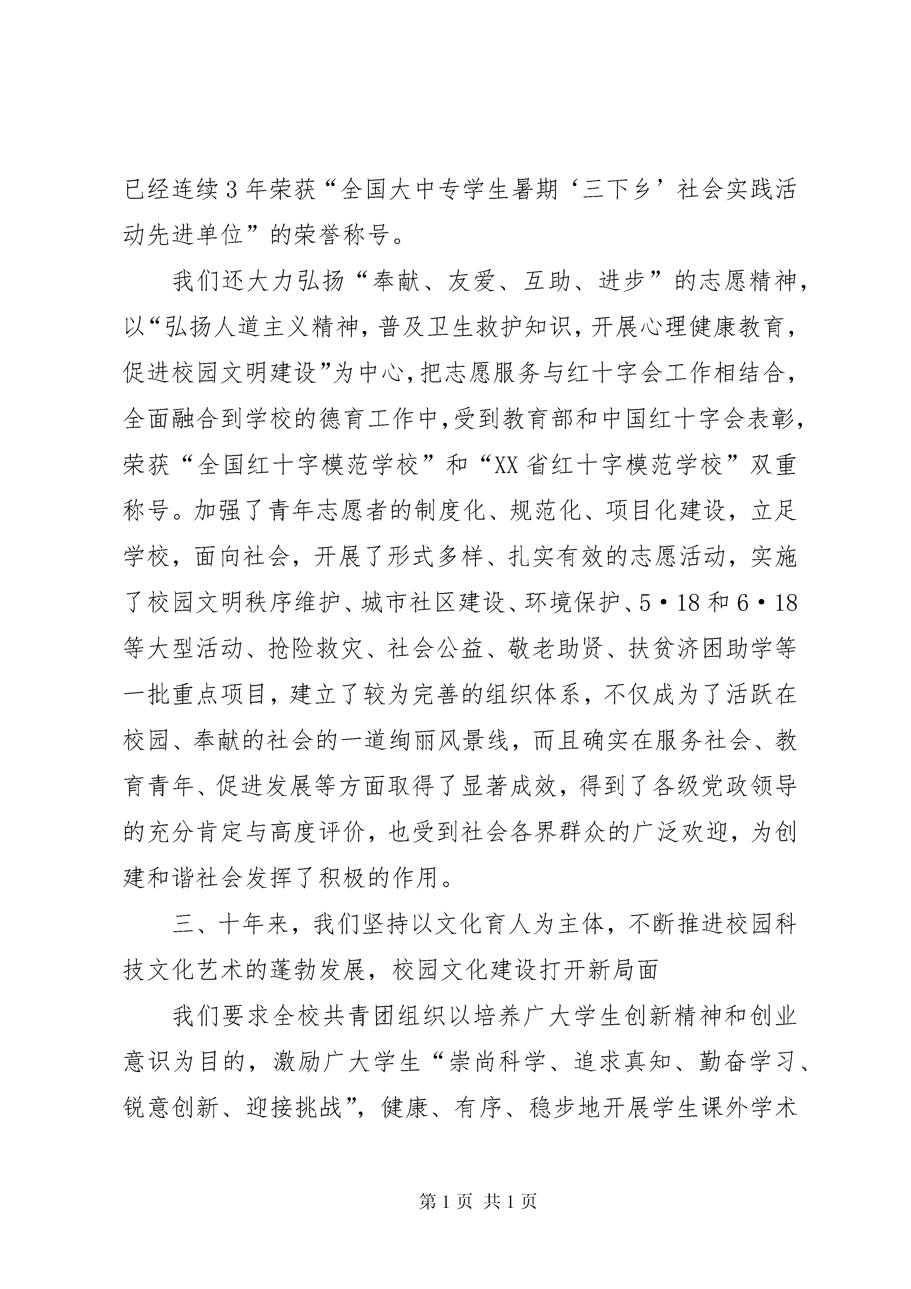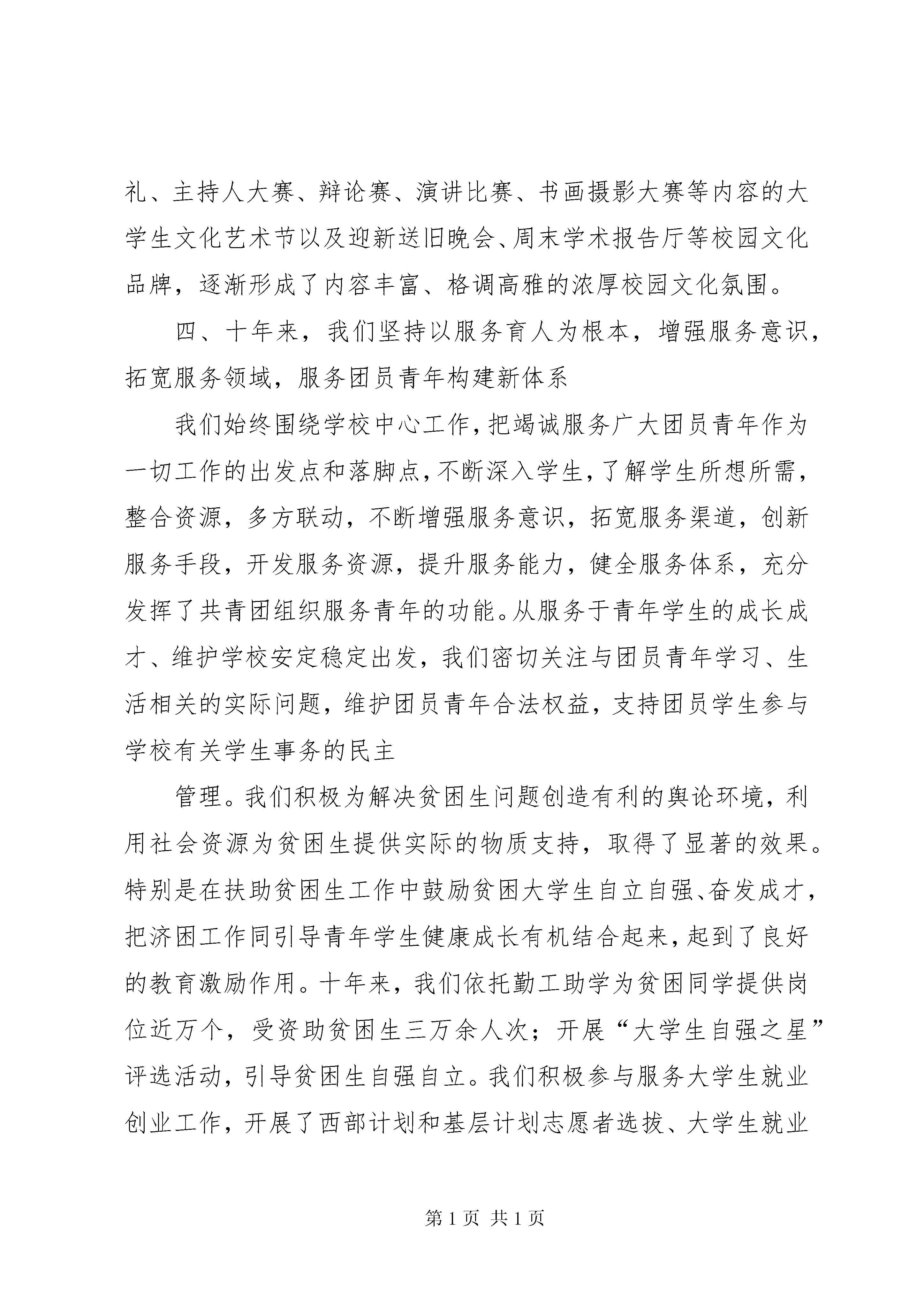大学团代会工作报告第一部分昂扬奋进,求真务实,围绕中心服务青年取得累累硕果自我校第九次团代会以来,在校党委和团省委的正确领导下,在学校各有关部门的大力支持下,在全校各级团组织和广大团员青年的共同努力下,我校共青团紧紧围绕学校中心工作,坚持在传承中拓展、在创新中提升,坚实地走过了团结拼搏、昂扬奋进、继往开来的十年。十四年来,全校各级团组织以培养具有创新精神、实践能力的全面发展的人才为目标,坚持培养基础厚、知识面宽、实践能力强、综合素质高、德才兼备的具有创新精神的应用型高级专门人才的培养目标定位,始终以团员青年为主体开展工作,突出工作重点,推进工作创新,为学校改革发展稳定的大局发挥了积极的作用,取得了显著的成绩。一、十年来,我们坚持以理想育人为先导,用先进的理论武装青年,思想政治教育取得新成效我们积极探索思想政治教育的有效方式,通过业余团校、团支部、“双学”小组、理论社团等载体,利用网络、团刊、宣传栏等阵地,以讲座、研讨、论坛、竞赛、主题团日活动等形式,以重大节庆纪念日和“神六”胜利发射与回收、迎北京奥运、嫦娥一号胜利发射等重大事件为契机,多渠道多层次地开展了“对党说句心里话”、“我与祖国共奋进、我与学校同发展”、“践行荣辱观、服务新农村”、“永远跟党走、作为在基层”、“我为评建作贡献”等为主题的思想教育活动,努力用邓小平理论和“xxxx”重要思想武装青年,用社会主义核心价值体系教育青年,积极引导团员青年全面落实科学发展观,牢固树立崇高的理想信念和良好的道德品质,引导广大团员青年树立正确的世界观、人生观和价值观,自觉走与人民紧密结合、为祖国奉献青春的正确成长道路。大力弘扬和培育民族精神,引导大学生勤奋学习、追求真知,脚踏实地、自觉奉献,并积极响应党和国家的号召,到祖国最需要的地方去建功立业,涌现出吕传良、陶方昆等一大批先进个人,形成了良好的就业导向。二、十年来,我们坚持以实践育人为基石,带领广大团员青年作贡献、促和谐,社会实践工作奠定新格局我们在开展社会实践活动中,紧扣时代主题,结合我校实际,坚持点面结合,采取“多形式、多渠道、多变化”的立项方式开展实践活动。十年来,我校开展了扶贫济困助学、服务新农村、普法宣传、“三下乡”、“四进社区”、岗位见习、志愿服务等形式多样、内容丰富的社会实践活动,建立了一大批社会实践基地,涌现了大学生荣辱观宣讲团、大学生骨干服务团、科技兴农服务团等一批全国、全省社会实践先进志愿服务队,真正让我校学生在社会实践的大融炉中“受教育、长才干、作贡献”。我校的大学生社会实践活动也因此一直深受社会各界的高度评价。校团委已经连续3年荣获“全国大中专学生暑期‘三下乡’社会实践活动先进单位”的荣誉称号。我们还大力弘扬“奉献、友爱、互助、进步”的志愿精神,以“弘扬人道主义精神,普及卫生救护知识,开展心理健康教育,促进校园文明建设”为中心,把志愿服务与红十字会工作相结合,全面融合到学校的德育工作中,受到教育部和中国红十字会表彰,荣获“全国红十字模范学校”和“XX省红十字模范学校”双重称号。加强了青年志愿者的制度化、规范化、项目化建设,立足学校,面向社会,开展了形式多样、扎实有效的志愿活动,实施了校园文明秩序维护、城市社区建设、环境保护、5·18和6·18等大型活动、抢险救灾、社会公益、敬老助贤、扶贫济困助学等一批重点项目,建立了较为完善的组织体系,不仅成为了活跃在校园、奉献的社会的一道绚丽风景线,而且确实在服务社会、教育青年、促进发展等方面取得了显著成效,得到了各级党政领导的充分肯定与高度评价,也受到社会各界群众的广泛欢迎,为创建和谐社会发挥了积极的作用。三、十年来,我们坚持以文化育人为主体,不断推进校园科技文化艺术的蓬勃发展,校园文化建设打开新局面我们要求全校共青团组织以培养广大学生创新精神和创业意识为目的,激励广大学生“崇尚科学、追求真知、勤奋学习、锐意创新、迎接挑战”,健康、有序、稳步地开展学生课外学术科技创新活动。我们注重宣传创新创业理念,努力营造科技实践氛围,争取教务处、科研处、研究生处等部门的支持,搭建“挑战杯amp;rdquo;课外学术科技作品竞赛和“挑战杯”大学生创业计划大赛等科技竞赛的平台,举办“青年科学家进校园”等科技学术讲座,举行科技作品展览,使我校学生的创新精神和实践能力不断增强。至今,我校已举办了5届学生科技文化节和3届“挑战杯”系列大赛。近年来,学生在省内外和全国学生学术科技大赛中获得各类奖励近百项,特别是在第十届“挑战杯”全国大学生课外学术科技作品竞赛中我校付德保、吴天兆、江涛、袁晨炜四位同学的参赛作品《新农村规划与建筑设计新探》获得了二等奖。在XX省“挑战杯”大学生课外学术科技作品竞赛中和“挑战杯”大学生创业计划大赛连续捧得“优胜杯”。我们始终坚持“以科学的理论武装