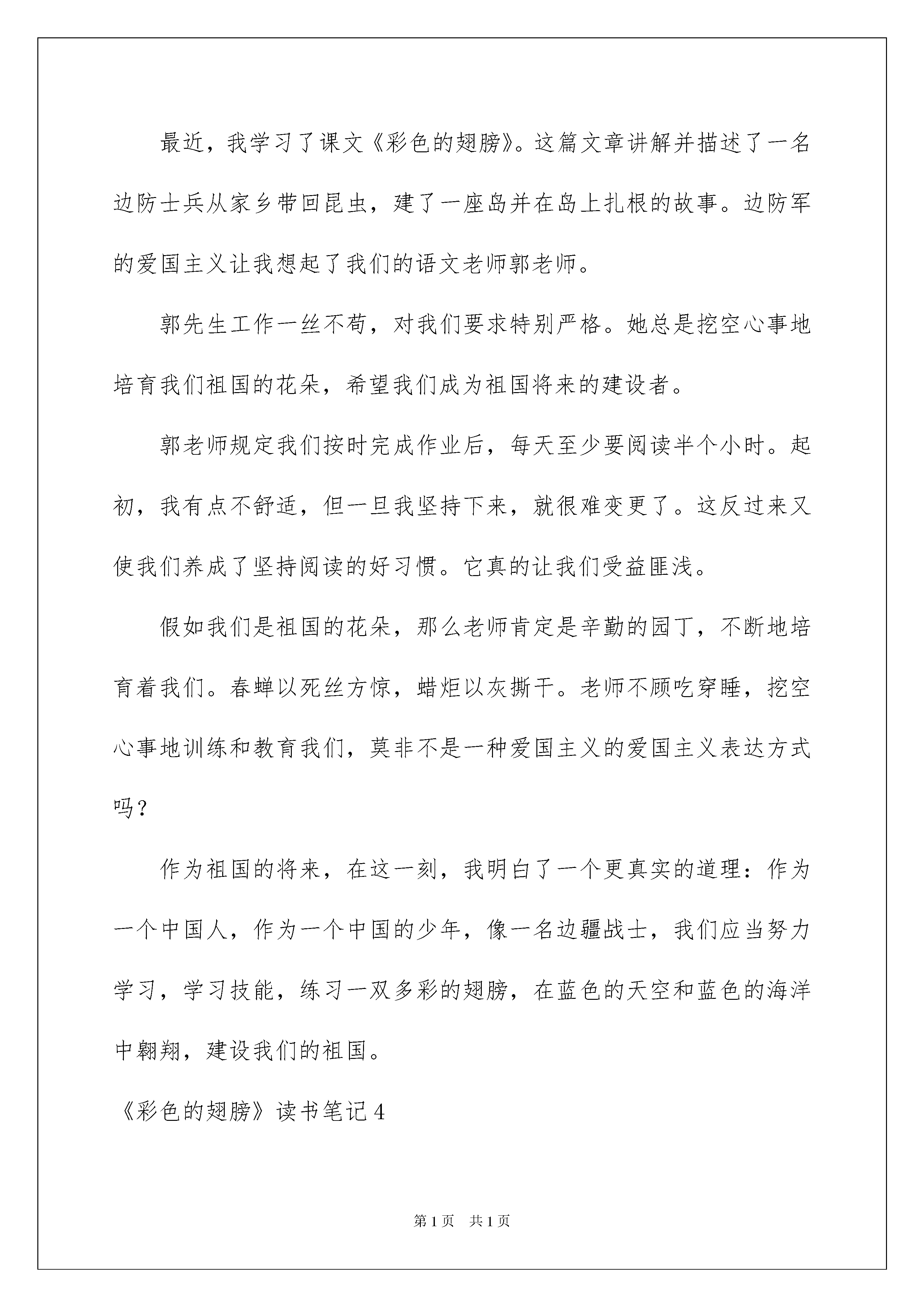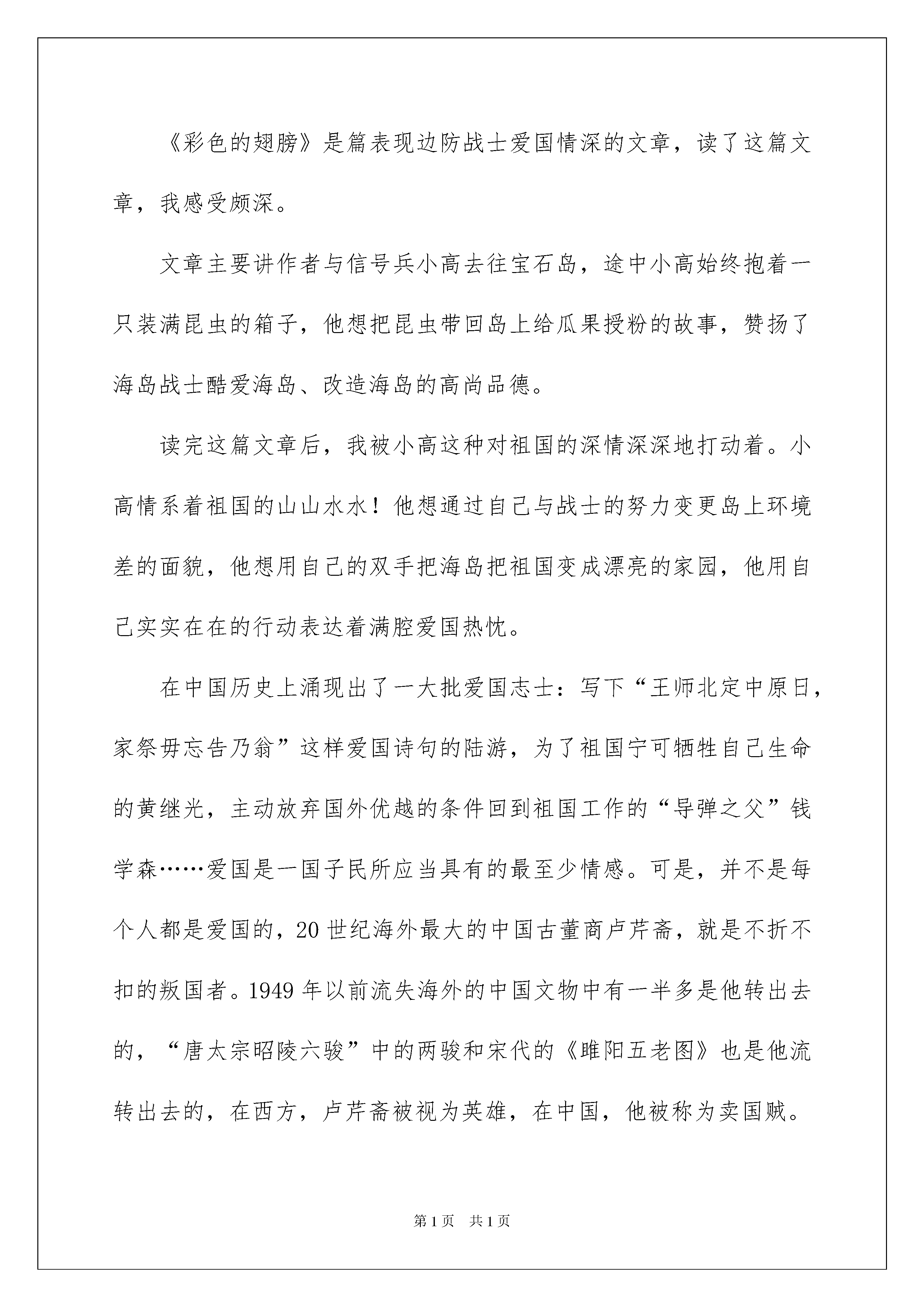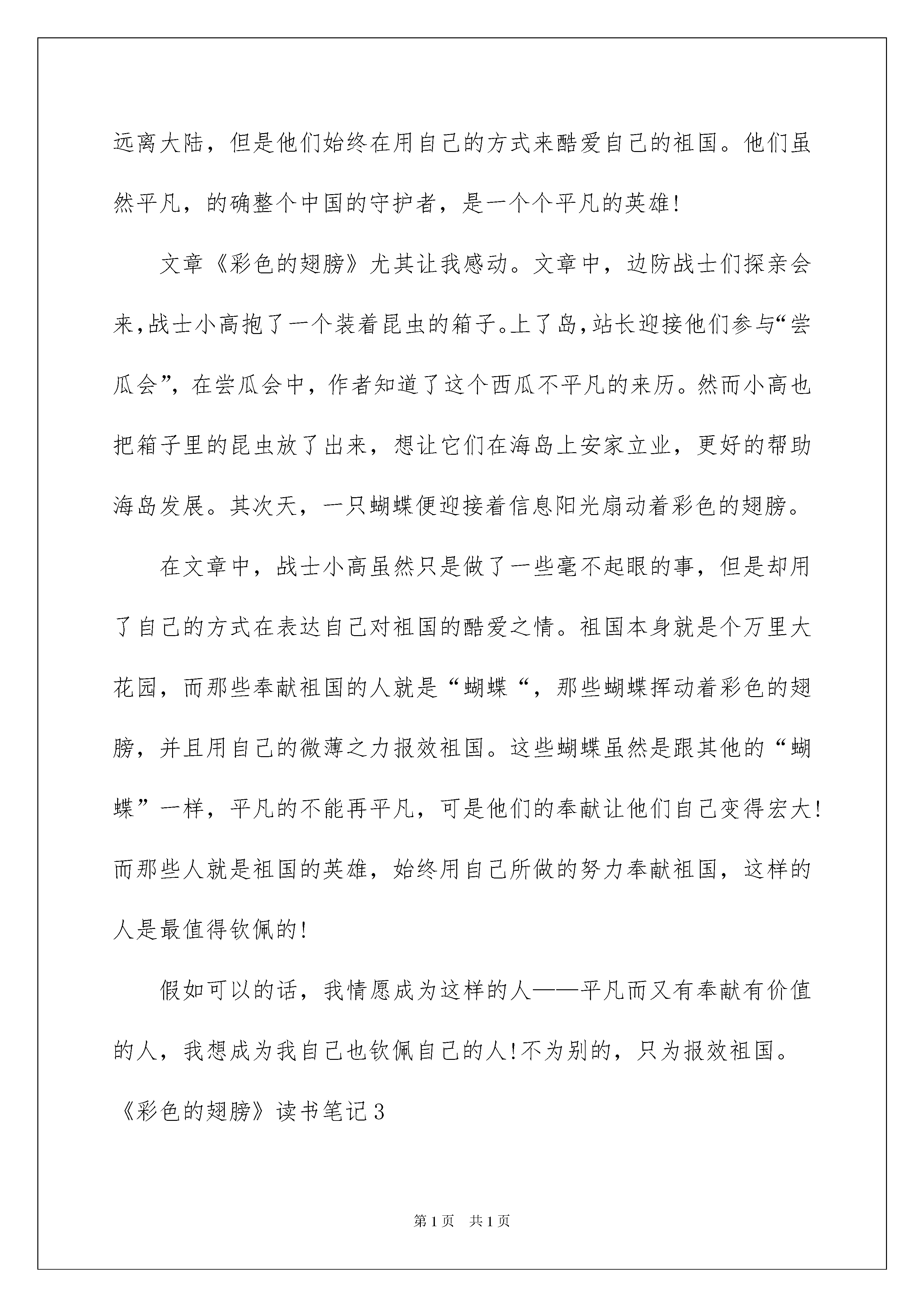 2022《彩色的翅膀》读书笔记《彩色的翅膀》读书笔记9篇品尝完一本名著后,大家对人生或者事物肯定产生了很多感想,此时须要仔细思索读书笔记如何写了哦。究竟应如何写读书笔记呢?下面是我收集整理的《彩色的翅膀》读书笔记,欢迎大家共享。《彩色的翅膀》读书笔记1学习了课文《彩色的翅膀》,我知道了您的事迹,原来宝石岛上的昆虫,是您带去的呀!您可真了不得呀!从大老远的黑龙江,一路颠簸护送到宝石岛,您吃了许多苦吧,而且您还晕船呢,却没让小昆虫受苦,假如我是一只小昆虫该多好,能感受到您真实的关爱。你们的工作多清苦啊,除了保卫我们的宝岛,还是保卫我们的宝岛,在那么艰苦的地方,只有石头与你们作伴,只有涛声为你们歌颂,你们从不叫一声苦,从不喊一声累,却把它当成最光荣的任务来仔细对待,你们是多么酷爱我们的祖国啊!正是有了你们的坚守,我们的祖国才会安静、富强、团结、华蜜。感谢你们,可敬的海岛战士!让我感受最深的还是你们的第一次尝瓜会,那么一只普一般通的西瓜,你们吃的时候竟然是“用两个手指头捏起一小片来,细细地端详着,轻轻地闻着,渐渐地咬着,还不住发出啧啧的赞美声”,可以看出你们有多么珍惜这来之不易的西瓜啊!我能看到你们吃西瓜时那喜悦、激烈、骄傲的表情,多像有一股甘泉,流进了每个战士的心田!我更能看到你们种西瓜时的艰辛:从岛外辛辛苦苦运进泥土,厚厚地整平在石头上,得有半米厚吧,要不行扎不了根,再把一粒粒小小的种子,轻轻的放进松软的泥土,培土、浇水,小苗苗长出来啦!那是怎样的惊喜啊!可是,一场暴风雨,摧残了娇嫩的幼苗,只有极少极少的幸运者存活下来,你们像对待自己的孩子细心照料,倍加呵护,浇水、施肥、除虫,眼看着小瓜一每天变大,那份骄傲啊,别提啦!瓜儿最终成熟了,于是起先了你们的尝瓜会。谁能不珍惜这来之不易的西瓜呢?经过你们辛勤的耕耘,现在的海岛早已变更了容颜,绿树成荫,鲜花盛开,感谢你们的辛勤付出,可敬的海岛战士!《彩色的翅膀》读书笔记2不知道你知不知道祖国海岛上面的边防战士,他们虽远离家乡,远离大陆,但是他们始终在用自己的方式来酷爱自己的祖国。他们虽然平凡,的确整个中国的守护者,是一个个平凡的英雄!文章《彩色的翅膀》尤其让我感动。文章中,边防战士们探亲会来,战士小高抱了一个装着昆虫的箱子。上了岛,站长迎接他们参与“尝瓜会”,在尝瓜会中,作者知道了这个西瓜不平凡的来历。然而小高也把箱子里的昆虫放了出来,想让它们在海岛上安家立业,更好的帮助海岛发展。其次天,一只蝴蝶便迎接着信息阳光扇动着彩色的翅膀。在文章中,战士小高虽然只是做了一些毫不起眼的事,但是却用了自己的方式在表达自己对祖国的酷爱之情。祖国本身就是个万里大花园,而那些奉献祖国的人就是“蝴蝶“,那些蝴蝶挥动着彩色的翅膀,并且用自己的微薄之力报效祖国。这些蝴蝶虽然是跟其他的“蝴蝶”一样,平凡的不能再平凡,可是他们的奉献让他们自己变得宏大!而那些人就是祖国的英雄,始终用自己所做的努力奉献祖国,这样的人是最值得钦佩的!假如可以的话,我情愿成为这样的人——平凡而又有奉献有价值的人,我想成为我自己也钦佩自己的人!不为别的,只为报效祖国。《彩色的翅膀》读书笔记3最近,我学习了课文《彩色的翅膀》。这篇文章讲解并描述了一名边防士兵从家乡带回昆虫,建了一座岛并在岛上扎根的故事。边防军的爱国主义让我想起了我们的语文老师郭老师。郭先生工作一丝不苟,对我们要求特别严格。她总是挖空心事地培育我们祖国的花朵,希望我们成为祖国将来的建设者。郭老师规定我们按时完成作业后,每天至少要阅读半个小时。起初,我有点不舒适,但一旦我坚持下来,就很难变更了。这反过来又使我们养成了坚持阅读的好习惯。它真的让我们受益匪浅。假如我们是祖国的花朵,那么老师肯定是辛勤的园丁,不断地培育着我们。春蝉以死丝方惊,蜡炬以灰撕干。老师不顾吃穿睡,挖空心事地训练和教育我们,莫非不是一种爱国主义的爱国主义表达方式吗?作为祖国的将来,在这一刻,我明白了一个更真实的道理:作为一个中国人,作为一个中国的少年,像一名边疆战士,我们应当努力学习,学习技能,练习一双多彩的翅膀,在蓝色的天空和蓝色的海洋中翱翔,建设我们的祖国。《彩色的翅膀》读书笔记4《彩色的翅膀》是篇表现边防战士爱国情深的文章,读了这篇文章,我感受颇深。文章主要讲作者与信号兵小高去往宝石岛,途中小高始终抱着一只装满昆虫的箱子,他想把昆虫带回岛上给瓜果授粉的故事,赞扬了海岛战士酷爱海岛、改造海岛的高尚品德。读完这篇文章后,我被小高这种对祖国的深情深深地打动着。小高情系着祖国的山山水水!他想通过自己与战士的努力变更岛上环境差的面貌,他想用自己的双手把海岛把祖国变成漂