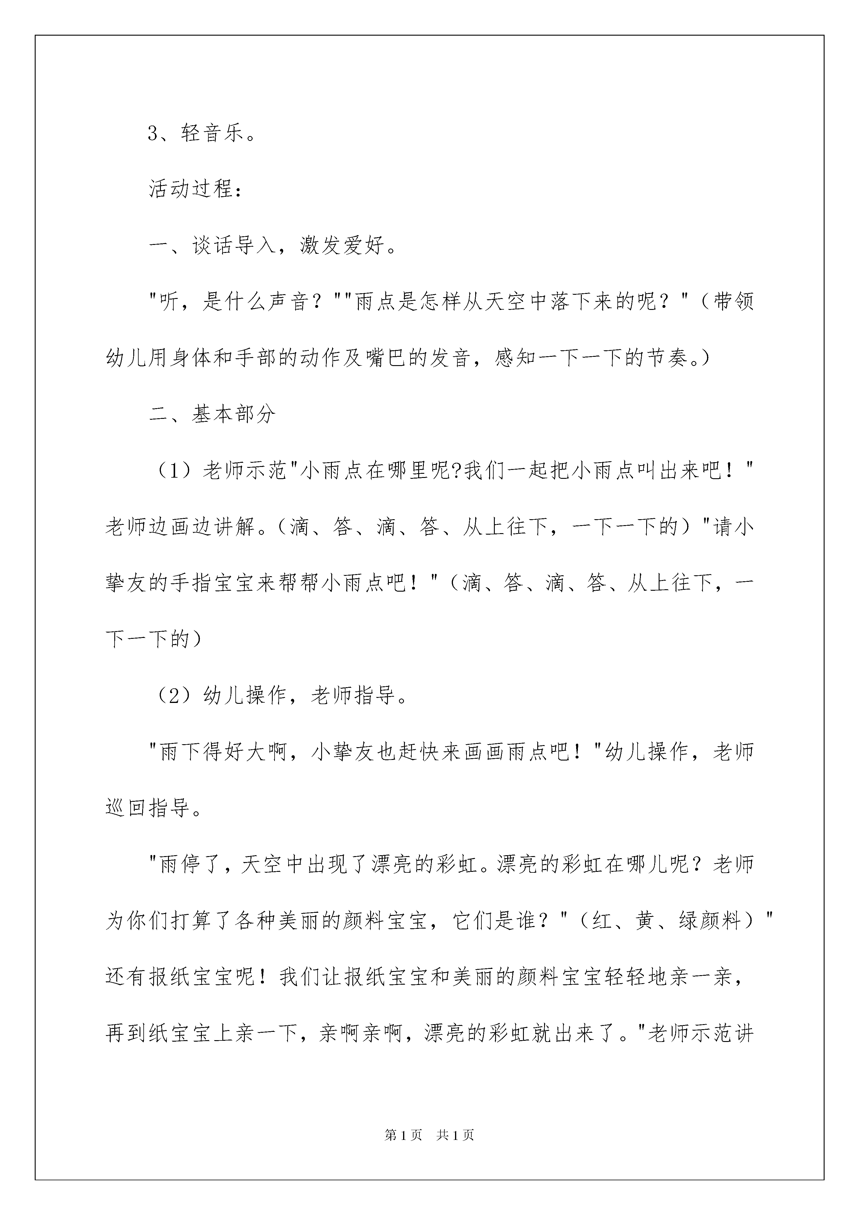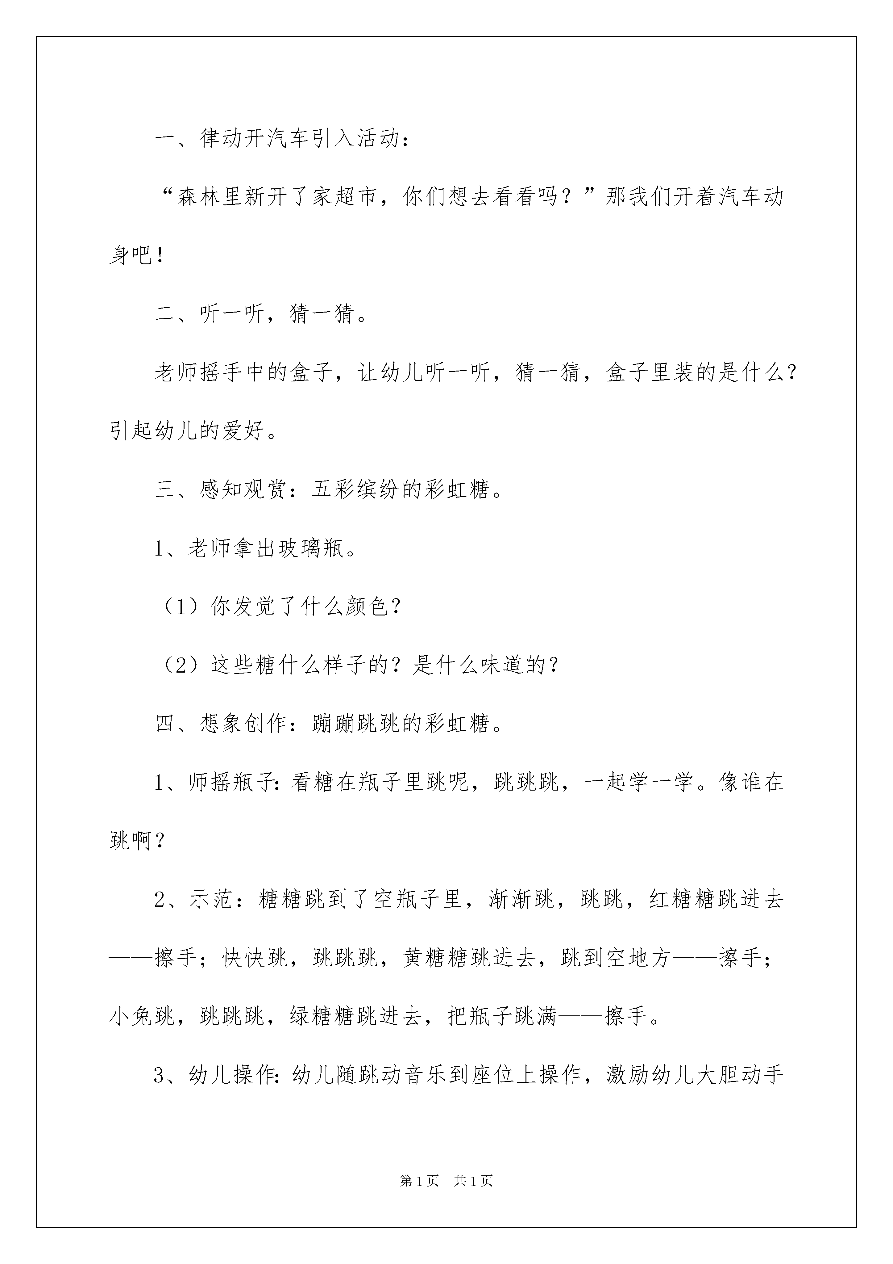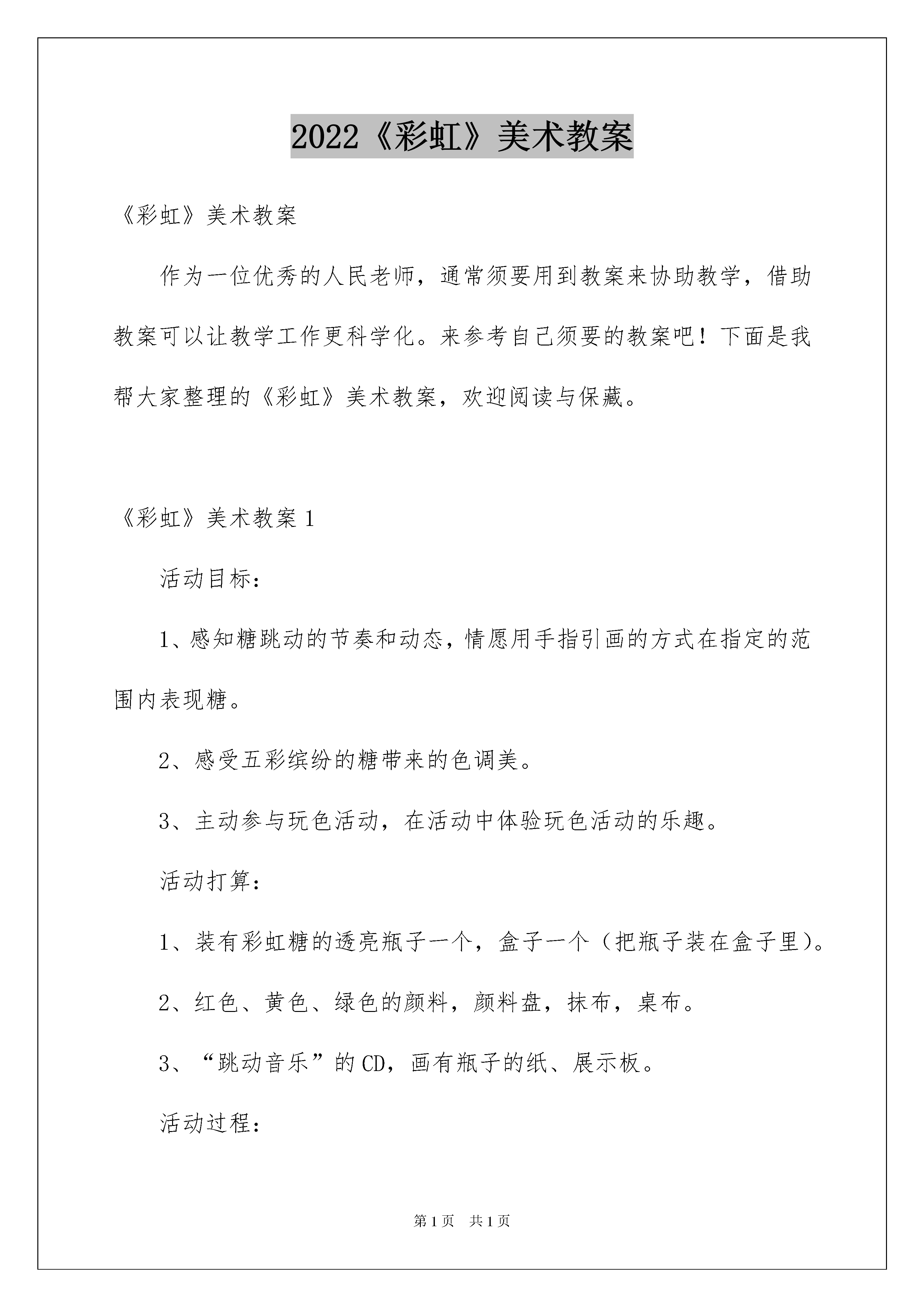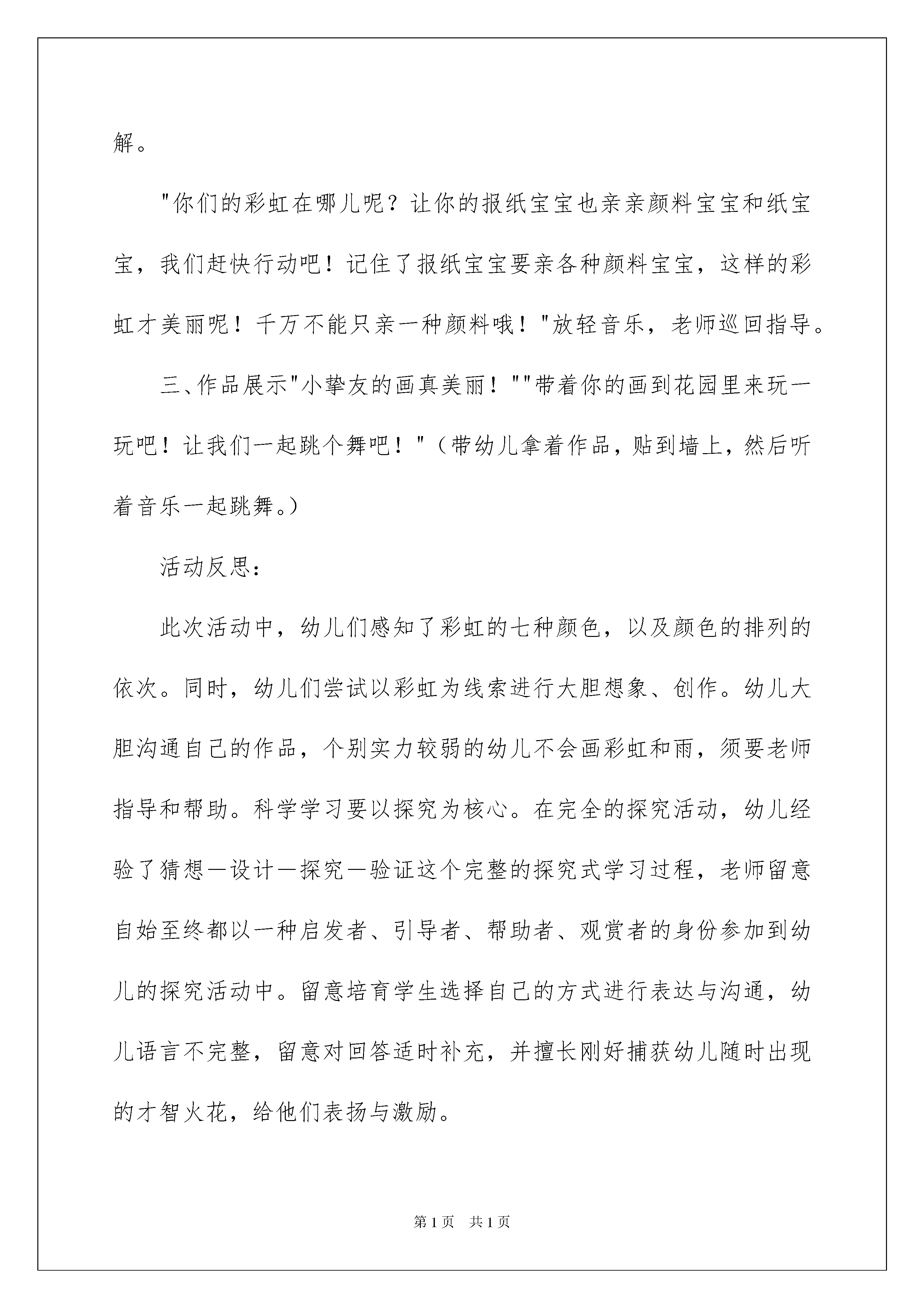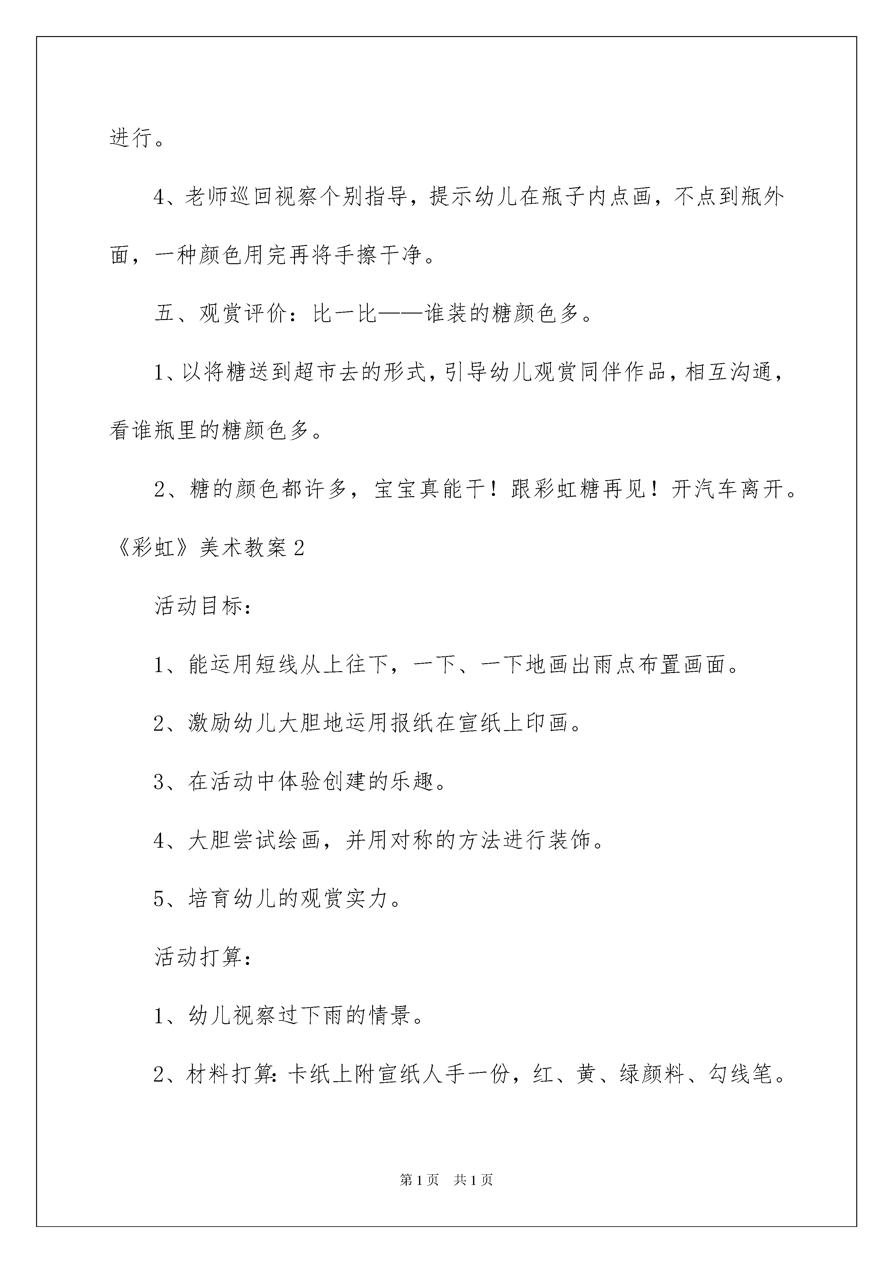 2022《彩虹》美术教案《彩虹》美术教案作为一位优秀的人民老师,通常须要用到教案来协助教学,借助教案可以让教学工作更科学化。来参考自己须要的教案吧!下面是我帮大家整理的《彩虹》美术教案,欢迎阅读与保藏。《彩虹》美术教案1活动目标:1、感知糖跳动的节奏和动态,情愿用手指引画的方式在指定的范围内表现糖。2、感受五彩缤纷的糖带来的色调美。3、主动参与玩色活动,在活动中体验玩色活动的乐趣。活动打算:1、装有彩虹糖的透亮瓶子一个,盒子一个(把瓶子装在盒子里)。2、红色、黄色、绿色的颜料,颜料盘,抹布,桌布。3、“跳动音乐”的CD,画有瓶子的纸、展示板。活动过程:一、律动开汽车引入活动:“森林里新开了家超市,你们想去看看吗?”那我们开着汽车动身吧!二、听一听,猜一猜。老师摇手中的盒子,让幼儿听一听,猜一猜,盒子里装的是什么?引起幼儿的爱好。三、感知观赏:五彩缤纷的彩虹糖。1、老师拿出玻璃瓶。(1)你发觉了什么颜色?(2)这些糖什么样子的?是什么味道的?四、想象创作:蹦蹦跳跳的彩虹糖。1、师摇瓶子:看糖在瓶子里跳呢,跳跳跳,一起学一学。像谁在跳啊?2、示范:糖糖跳到了空瓶子里,渐渐跳,跳跳,红糖糖跳进去——擦手;快快跳,跳跳跳,黄糖糖跳进去,跳到空地方——擦手;小兔跳,跳跳跳,绿糖糖跳进去,把瓶子跳满——擦手。3、幼儿操作:幼儿随跳动音乐到座位上操作,激励幼儿大胆动手进行。4、老师巡回视察个别指导,提示幼儿在瓶子内点画,不点到瓶外面,一种颜色用完再将手擦干净。五、观赏评价:比一比——谁装的糖颜色多。1、以将糖送到超市去的形式,引导幼儿观赏同伴作品,相互沟通,看谁瓶里的糖颜色多。2、糖的颜色都许多,宝宝真能干!跟彩虹糖再见!开汽车离开。《彩虹》美术教案2活动目标:1、能运用短线从上往下,一下、一下地画出雨点布置画面。2、激励幼儿大胆地运用报纸在宣纸上印画。3、在活动中体验创建的乐趣。4、大胆尝试绘画,并用对称的方法进行装饰。5、培育幼儿的观赏实力。活动打算:1、幼儿视察过下雨的情景。2、材料打算:卡纸上附宣纸人手一份,红、黄、绿颜料、勾线笔。3、轻音乐。活动过程:一、谈话导入,激发爱好。"听,是什么声音?""雨点是怎样从天空中落下来的呢?"(带领幼儿用身体和手部的动作及嘴巴的发音,感知一下一下的节奏。)二、基本部分(1)老师示范"小雨点在哪里呢?我们一起把小雨点叫出来吧!"老师边画边讲解。(滴、答、滴、答、从上往下,一下一下的)"请小挚友的手指宝宝来帮帮小雨点吧!"(滴、答、滴、答、从上往下,一下一下的)(2)幼儿操作,老师指导。"雨下得好大啊,小挚友也赶快来画画雨点吧!"幼儿操作,老师巡回指导。"雨停了,天空中出现了漂亮的彩虹。漂亮的彩虹在哪儿呢?老师为你们打算了各种美丽的颜料宝宝,它们是谁?"(红、黄、绿颜料)"还有报纸宝宝呢!我们让报纸宝宝和美丽的颜料宝宝轻轻地亲一亲,再到纸宝宝上亲一下,亲啊亲啊,漂亮的彩虹就出来了。"老师示范讲解。"你们的彩虹在哪儿呢?让你的报纸宝宝也亲亲颜料宝宝和纸宝宝,我们赶快行动吧!记住了报纸宝宝要亲各种颜料宝宝,这样的彩虹才美丽呢!千万不能只亲一种颜料哦!"放轻音乐,老师巡回指导。三、作品展示"小挚友的画真美丽!""带着你的画到花园里来玩一玩吧!让我们一起跳个舞吧!"(带幼儿拿着作品,贴到墙上,然后听着音乐一起跳舞。)活动反思:此次活动中,幼儿们感知了彩虹的七种颜色,以及颜色的排列的依次。同时,幼儿们尝试以彩虹为线索进行大胆想象、创作。幼儿大胆沟通自己的作品,个别实力较弱的幼儿不会画彩虹和雨,须要老师指导和帮助。科学学习要以探究为核心。在完全的探究活动,幼儿经验了猜想-设计-探究-验证这个完整的探究式学习过程,老师留意自始至终都以一种启发者、引导者、帮助者、观赏者的身份参加到幼儿的探究活动中。留意培育学生选择自己的方式进行表达与沟通,幼儿语言不完整,留意对回答适时补充,并擅长刚好捕获幼儿随时出现的才智火花,给他们表扬与激励。《彩虹》美术教案3活动目标1、视察、观赏彩虹的形态和色调,感受大自然的美,激发涂画彩虹的爱好。2、学习用红、橙、黄、绿青、蓝、紫等色调涂画彩虹。3、学习耐性、有序地进行操作。培育细致的工作看法。4、激发幼儿感受不同的艺术美,体验作画的乐趣。5、能呈现自己的作品,并能观赏别人的作品。活动打算1、课件:图片-彩虹2、涂色:彩虹3、幼儿用彩色笔活动过程一、引发爱好,启迪思维。1.观赏有关彩虹的图片,说说在哪里见过彩虹,它是什么形态的?2.引导幼儿想想彩虹有哪些颜色?请幼儿相互争论彩虹有些什么颜色。二、交代要求,幼儿涂画,老师指导。1.启发幼