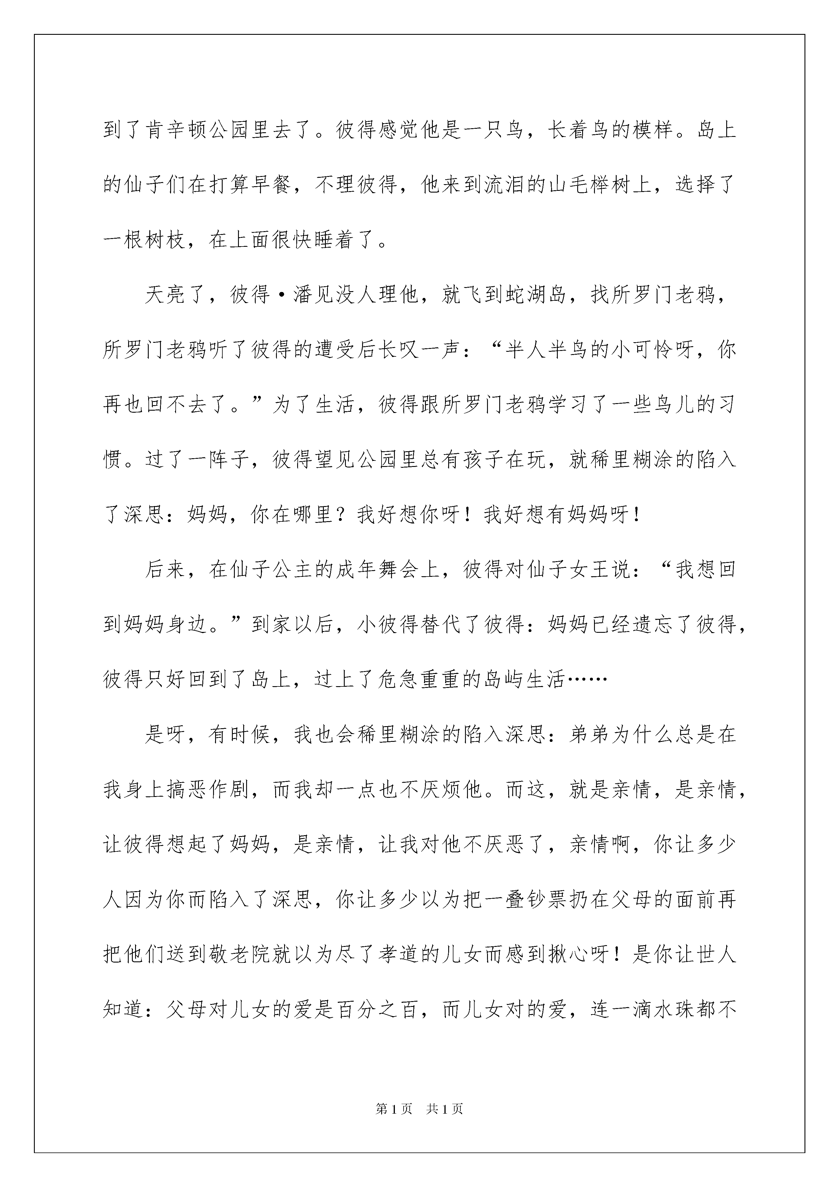 2022《彼得潘》的读书笔记《彼得潘》的读书笔记品尝完一本名著后,你有什么领悟呢?为此须要仔细地写一写读书笔记了。现在你是否对读书笔记一筹莫展呢?以下是我为大家收集的《彼得潘》的读书笔记,希望对大家有所帮助。《彼得潘》的读书笔记1最近,我读了一本书,名字叫做《彼得·潘》。这本书曾被改编为音乐剧,电视节目以及两部有声电影,剧作于1904年12月27日在伦敦首演,以后的每年的圣诞节都会在各国演出。通过读了这一本书,让我懂得了“友情是最重要的”!这是一个名叫温迪小女孩的冒险故事。温迪诞生于一个不裕的家。温迪宠爱和弟弟约翰、迈克尔在一起玩嬉戏。一天晚上,彼得·潘飞到了温迪的窗前,把温迪和她的两个弟弟一起带去了永无岛。最终,他们在永无岛上度过了大半个童年。“彼得·潘”这个会飞的男孩已经成为西方世界家喻户晓的人物。通过读完这一本书,使我的生活变的更加充溢。彼得·潘“恒久都不想长大”的思想真正的说出了很多孩子们的心声。彼得·潘是一个淘气的男孩,胆怯上学,不想长大,天真烂漫……每个孩子的童年都是丰富多彩的,他们有的在欢声笑语中度过了美妙的童年,有的在无忧无虑中度过难忘的童年……我们都应当好好珍惜这个美妙的童年,在欢乐中成长,在勤奋中努力学习,为将来做个有用之人打下坚实的基础。在童年时间中我们也要像彼得·潘那样注意友情,当挚友须要帮助时应当第一时间伸出救济之手,当挚友难受时应当去主动分担忧愁。“友情是最重要的”!《彼得潘》的读书笔记2时隔八年后,又重新读到了日本作家石田衣良《灰色的彼得潘》这本书。书中的四个故事:《灰色的彼得潘》、《与野兽重逢》、《站前无照托儿所》和《池袋凤凰安排》都特别精彩。作者以日本池袋为故事背景,通过“麻烦终结者”的男主真岛诚的第一人称视角关注了社会一些麻烦问题,比如校内暴力和酒店小姐儿女抚养问题等。我将这四个小故事总结为“孤寂少年的事理”、“不幸与怜悯的救赎”、“儿童正义”和“灼烧池袋的凤凰”。其中最让我印象深刻的故事还是其次篇《与野兽重逢》。我记得文中有一句话是这样讲的:“为什么世上不幸的人们,要这样去破坏彼此的幻想呢?”我想,世界上的许多无奈真的让人痛彻心扉,心灰意冷。但不幸肯定不是那么百分百肯定的存在。因无法抗拒命运的第一次不幸也绝不是再次不幸的助推器。面对已经不幸的心态的选择才成就了将来的光明和黑暗。当看到文中“野兽”苦痛忏悔的泪水和受害人忍痛的宽恕时,我也忍不住哭了起来。谁都有不幸,假如大家都能彼此谅解和用和善来悔改结局必定会变更曾经不幸的命运。或许有时,善待命运比抗拒命运更加让人华蜜。这本书举荐给大家看一看。不算长,一天就能读完的类型。作者文笔很顺畅,让人读起来很舒适。情节上可能没有特殊明显的大起大落,但我觉得能够让人思索问题思索自己人生的书就值得去读一读。《彼得潘》的读书笔记3说起“彼得·潘”这个名字,你们肯定很生疏,下面就听我渐渐跟你们说吧!《彼得·潘》这个名字是英国作家詹姆斯·巴里的一部小说,而彼得·潘不愿长大成人,七天大的时候就从一扇窗子里逃了出来,飞到了肯辛顿公园里去了。彼得感觉他是一只鸟,长着鸟的模样。岛上的仙子们在打算早餐,不理彼得,他来到流泪的山毛榉树上,选择了一根树枝,在上面很快睡着了。天亮了,彼得·潘见没人理他,就飞到蛇湖岛,找所罗门老鸦,所罗门老鸦听了彼得的遭受后长叹一声:“半人半鸟的小可怜呀,你再也回不去了。”为了生活,彼得跟所罗门老鸦学习了一些鸟儿的习惯。过了一阵子,彼得望见公园里总有孩子在玩,就稀里糊涂的陷入了深思:妈妈,你在哪里?我好想你呀!我好想有妈妈呀!后来,在仙子公主的成年舞会上,彼得对仙子女王说:“我想回到妈妈身边。”到家以后,小彼得替代了彼得:妈妈已经遗忘了彼得,彼得只好回到了岛上,过上了危急重重的岛屿生活……是呀,有时候,我也会稀里糊涂的陷入深思:弟弟为什么总是在我身上搞恶作剧,而我却一点也不厌烦他。而这,就是亲情,是亲情,让彼得想起了妈妈,是亲情,让我对他不厌恶了,亲情啊,你让多少人因为你而陷入了深思,你让多少以为把一叠钞票扔在父母的面前再把他们送到敬老院就以为尽了孝道的儿女而感到揪心呀!是你让世人知道:父母对儿女的爱是百分之百,而儿女对的爱,连一滴水珠都不如。我们肯定要珍惜父母的爱,不要让他们为我们而焦急,因为的爱对我们来说,是世上最美妙的东西。《彼得潘》的读书笔记4今日我读了一本书,书名叫《彼得潘》。刚起先读这本书的时候,我不知道“印第安人”是什么,这群人有什么特点。通过施老师的讲解,我才知道印第安人是美国的原住民,现在主要分散在非洲。他们的特点是战斗英勇,身强力壮,因为战胜了牛群而生存下来。可见,他们真是