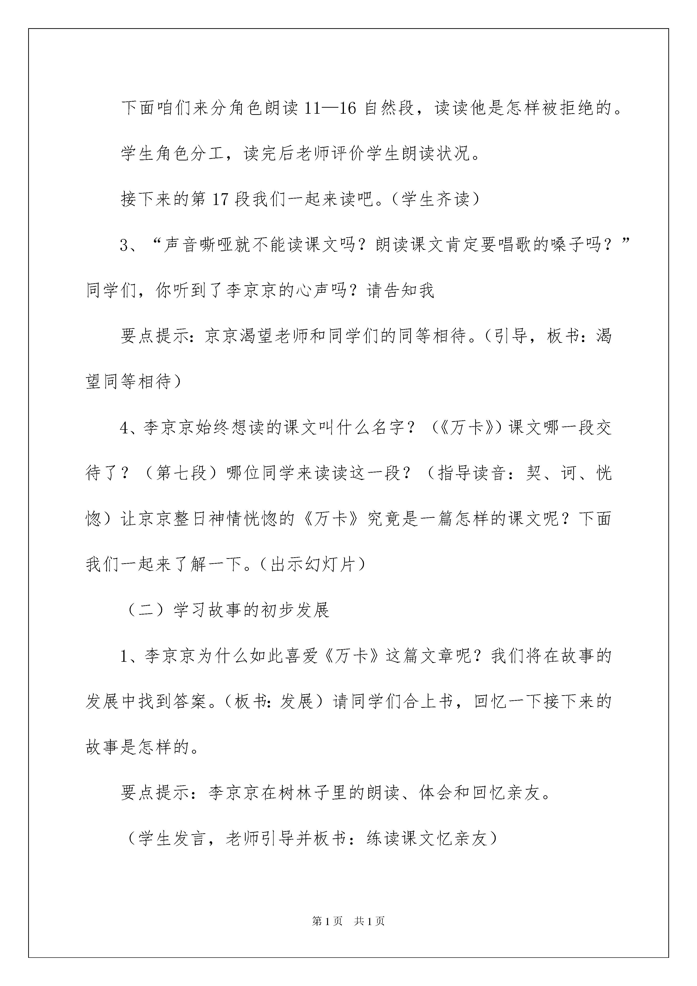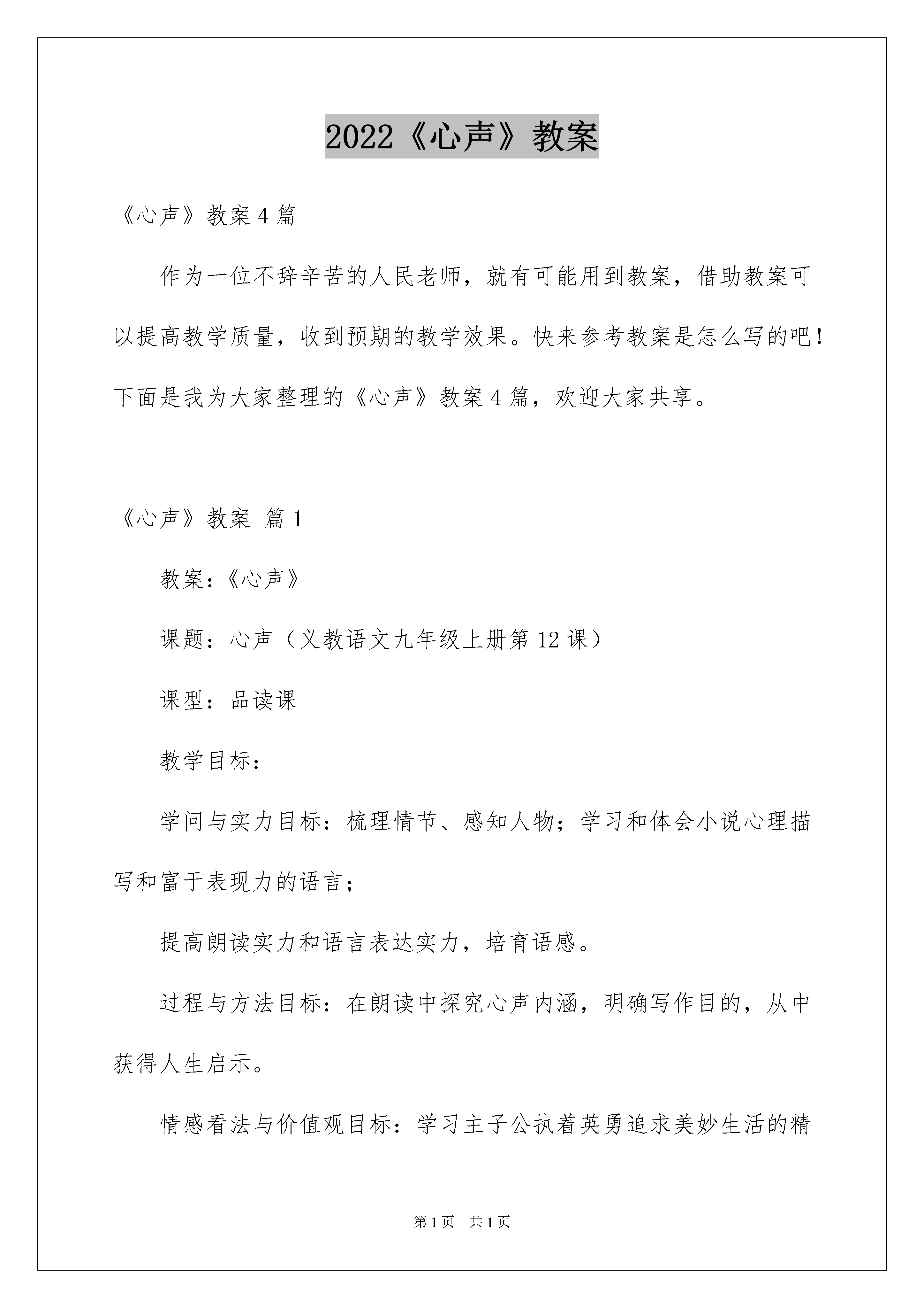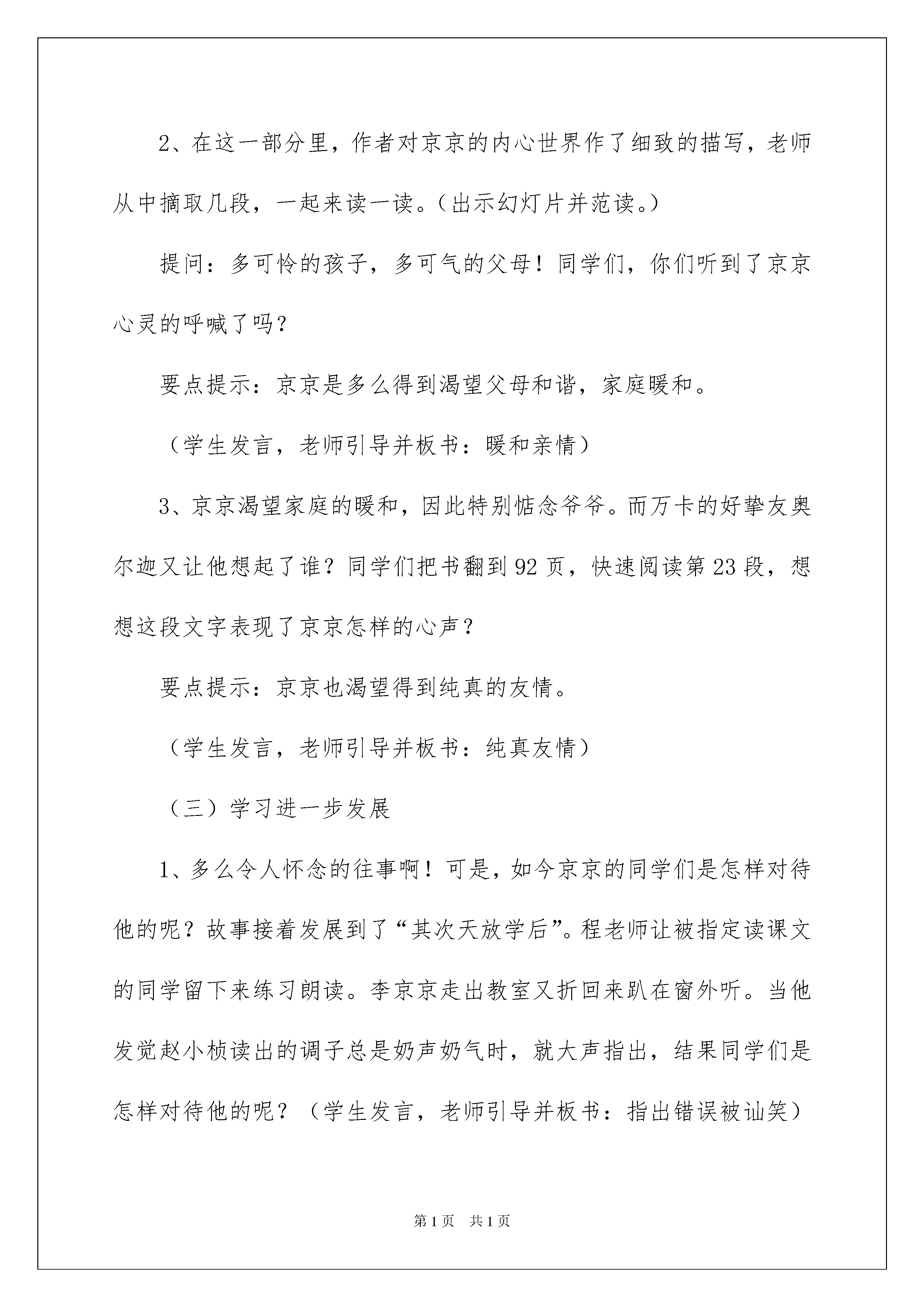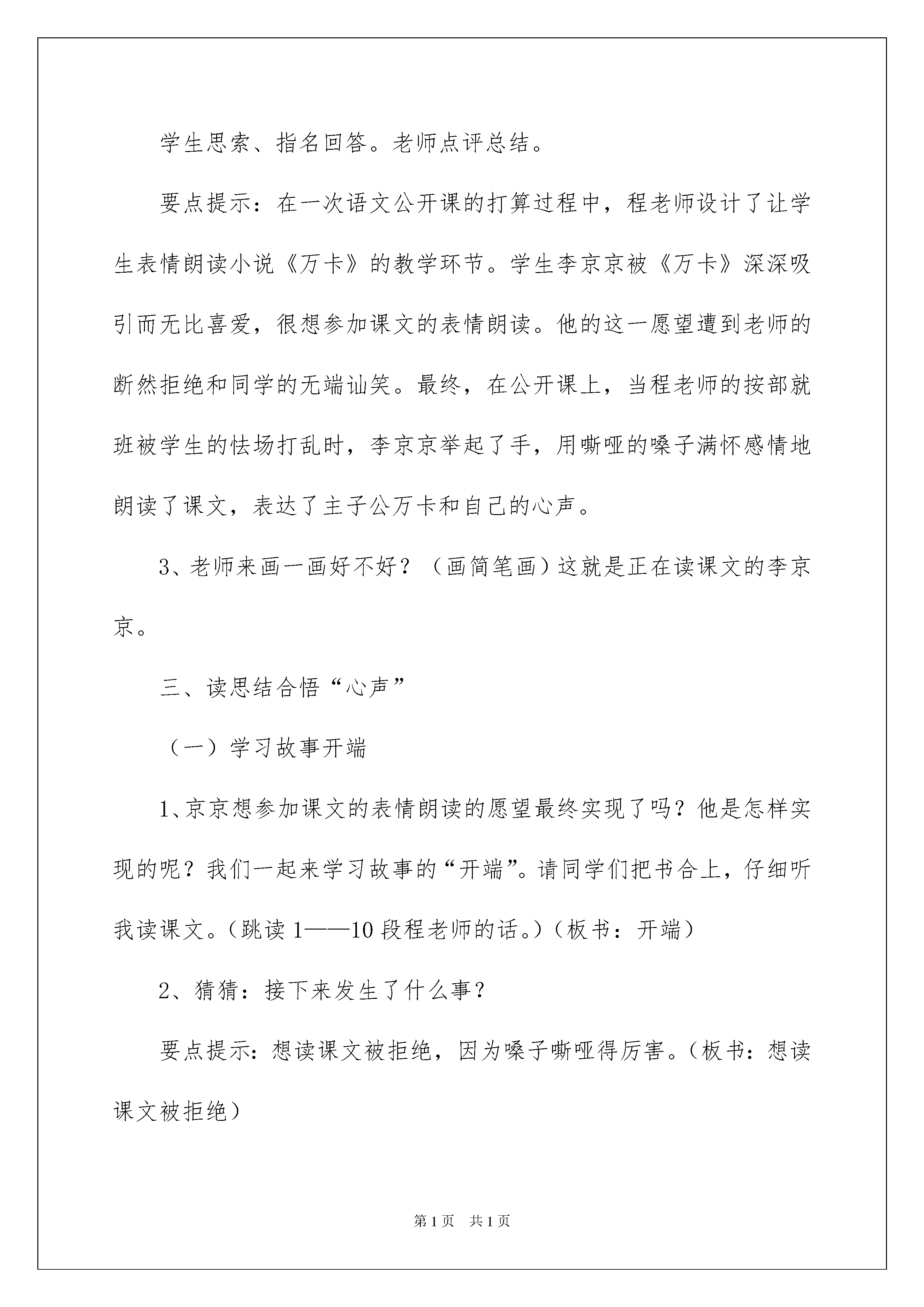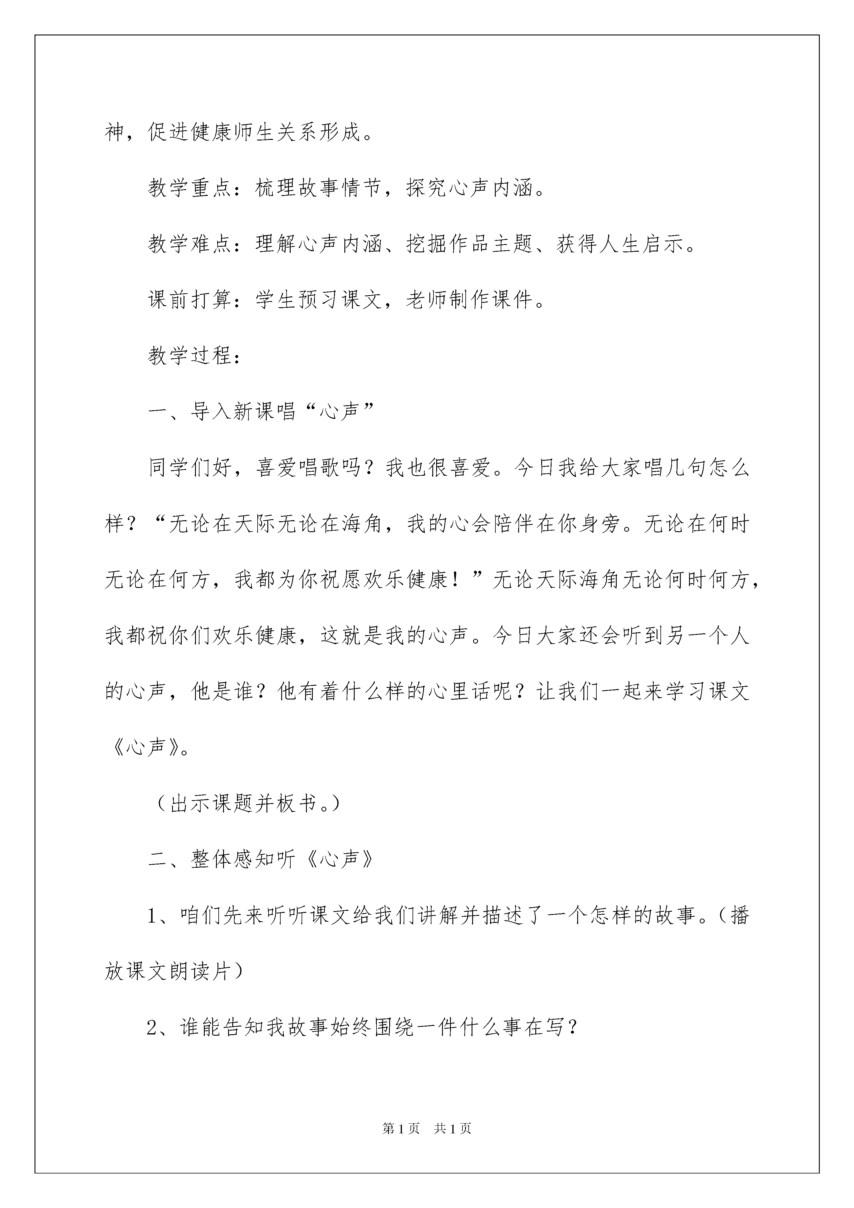 2022《心声》教案《心声》教案4篇作为一位不辞辛苦的人民老师,就有可能用到教案,借助教案可以提高教学质量,收到预期的教学效果。快来参考教案是怎么写的吧!下面是我为大家整理的《心声》教案4篇,欢迎大家共享。《心声》教案篇1教案:《心声》课题:心声(义教语文九年级上册第12课)课型:品读课教学目标:学问与实力目标:梳理情节、感知人物;学习和体会小说心理描写和富于表现力的语言;提高朗读实力和语言表达实力,培育语感。过程与方法目标:在朗读中探究心声内涵,明确写作目的,从中获得人生启示。情感看法与价值观目标:学习主子公执着英勇追求美妙生活的精神,促进健康师生关系形成。教学重点:梳理故事情节,探究心声内涵。教学难点:理解心声内涵、挖掘作品主题、获得人生启示。课前打算:学生预习课文,老师制作课件。教学过程:一、导入新课唱“心声”同学们好,喜爱唱歌吗?我也很喜爱。今日我给大家唱几句怎么样?“无论在天际无论在海角,我的心会陪伴在你身旁。无论在何时无论在何方,我都为你祝愿欢乐健康!”无论天际海角无论何时何方,我都祝你们欢乐健康,这就是我的心声。今日大家还会听到另一个人的心声,他是谁?他有着什么样的心里话呢?让我们一起来学习课文《心声》。(出示课题并板书。)二、整体感知听《心声》1、咱们先来听听课文给我们讲解并描述了一个怎样的故事。(播放课文朗读片)2、谁能告知我故事始终围绕一件什么事在写?学生思索、指名回答。老师点评总结。要点提示:在一次语文公开课的打算过程中,程老师设计了让学生表情朗读小说《万卡》的教学环节。学生李京京被《万卡》深深吸引而无比喜爱,很想参加课文的表情朗读。他的这一愿望遭到老师的断然拒绝和同学的无端讪笑。最终,在公开课上,当程老师的按部就班被学生的怯场打乱时,李京京举起了手,用嘶哑的嗓子满怀感情地朗读了课文,表达了主子公万卡和自己的心声。3、老师来画一画好不好?(画简笔画)这就是正在读课文的李京京。三、读思结合悟“心声”(一)学习故事开端1、京京想参加课文的表情朗读的愿望最终实现了吗?他是怎样实现的呢?我们一起来学习故事的“开端”。请同学们把书合上,仔细听我读课文。(跳读1——10段程老师的话。)(板书:开端)2、猜猜:接下来发生了什么事?要点提示:想读课文被拒绝,因为嗓子嘶哑得厉害。(板书:想读课文被拒绝)下面咱们来分角色朗读11—16自然段,读读他是怎样被拒绝的。学生角色分工,读完后老师评价学生朗读状况。接下来的第17段我们一起来读吧。(学生齐读)3、“声音嘶哑就不能读课文吗?朗读课文肯定要唱歌的嗓子吗?”同学们,你听到了李京京的心声吗?请告知我要点提示:京京渴望老师和同学们的同等相待。(引导,板书:渴望同等相待)4、李京京始终想读的课文叫什么名字?(《万卡》)课文哪一段交待了?(第七段)哪位同学来读读这一段?(指导读音:契、诃、恍惚)让京京整日神情恍惚的《万卡》究竟是一篇怎样的课文呢?下面我们一起来了解一下。(出示幻灯片)(二)学习故事的初步发展1、李京京为什么如此喜爱《万卡》这篇文章呢?我们将在故事的发展中找到答案。(板书:发展)请同学们合上书,回忆一下接下来的故事是怎样的。要点提示:李京京在树林子里的朗读、体会和回忆亲友。(学生发言,老师引导并板书:练读课文忆亲友)2、在这一部分里,作者对京京的内心世界作了细致的描写,老师从中摘取几段,一起来读一读。(出示幻灯片并范读。)提问:多可怜的孩子,多可气的父母!同学们,你们听到了京京心灵的呼喊了吗?要点提示:京京是多么得到渴望父母和谐,家庭暖和。(学生发言,老师引导并板书:暖和亲情)3、京京渴望家庭的暖和,因此特别惦念爷爷。而万卡的好挚友奥尔迦又让他想起了谁?同学们把书翻到92页,快速阅读第23段,想想这段文字表现了京京怎样的心声?要点提示:京京也渴望得到纯真的友情。(学生发言,老师引导并板书:纯真友情)(三)学习进一步发展1、多么令人怀念的往事啊!可是,如今京京的同学们是怎样对待他的呢?故事接着发展到了“其次天放学后”。程老师让被指定读课文的同学留下来练习朗读。李京京走出教室又折回来趴在窗外听。当他发觉赵小桢读出的调子总是奶声奶气时,就大声指出,结果同学们是怎样对待他的呢?(学生发言,老师引导并板书:指出错误被讪笑)咱们一起来读一小段好不好?就读第33至41段。京京:一男生;赵小桢:一女生;叙述性文字由老师读;其他同学当评委。提问:他们表现怎样?谁更好一点,为什么?学生自我评价后,老师订正强调读音,总结评价朗读。2、同学们读的很精彩,评的很专业,看来大家的朗读水平都很不错嘛。我们再一起来读读42段吧。(齐读42)提问: