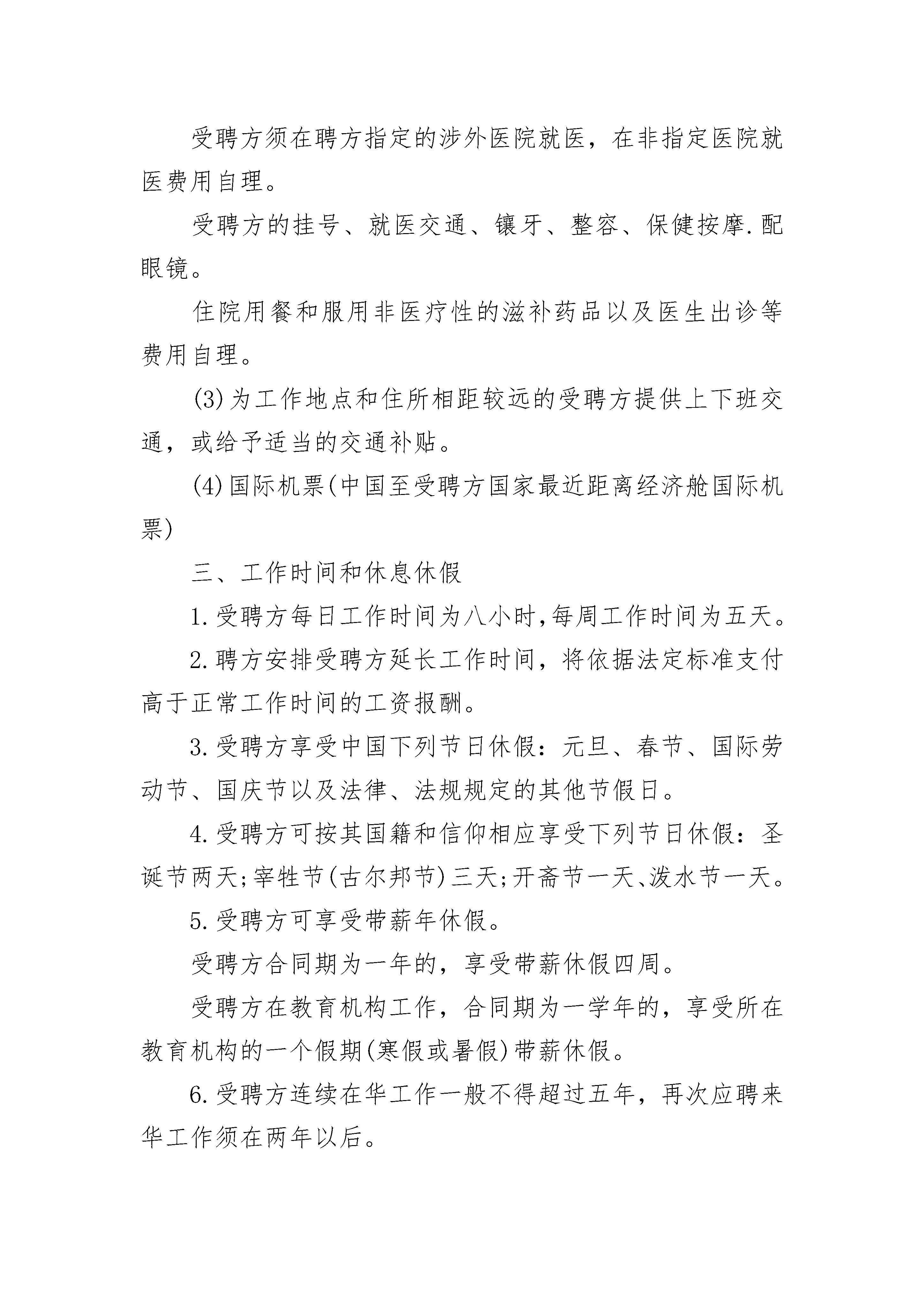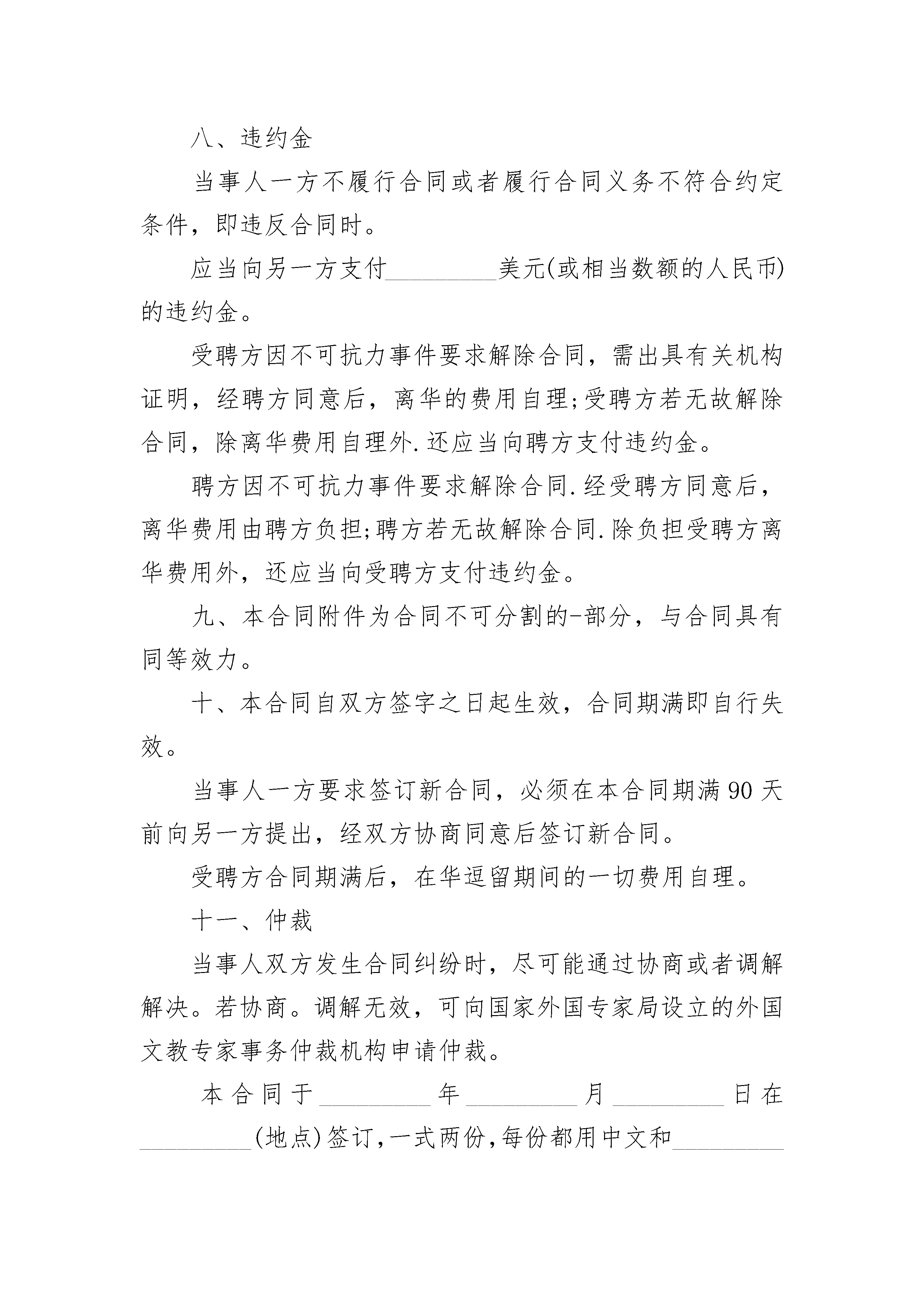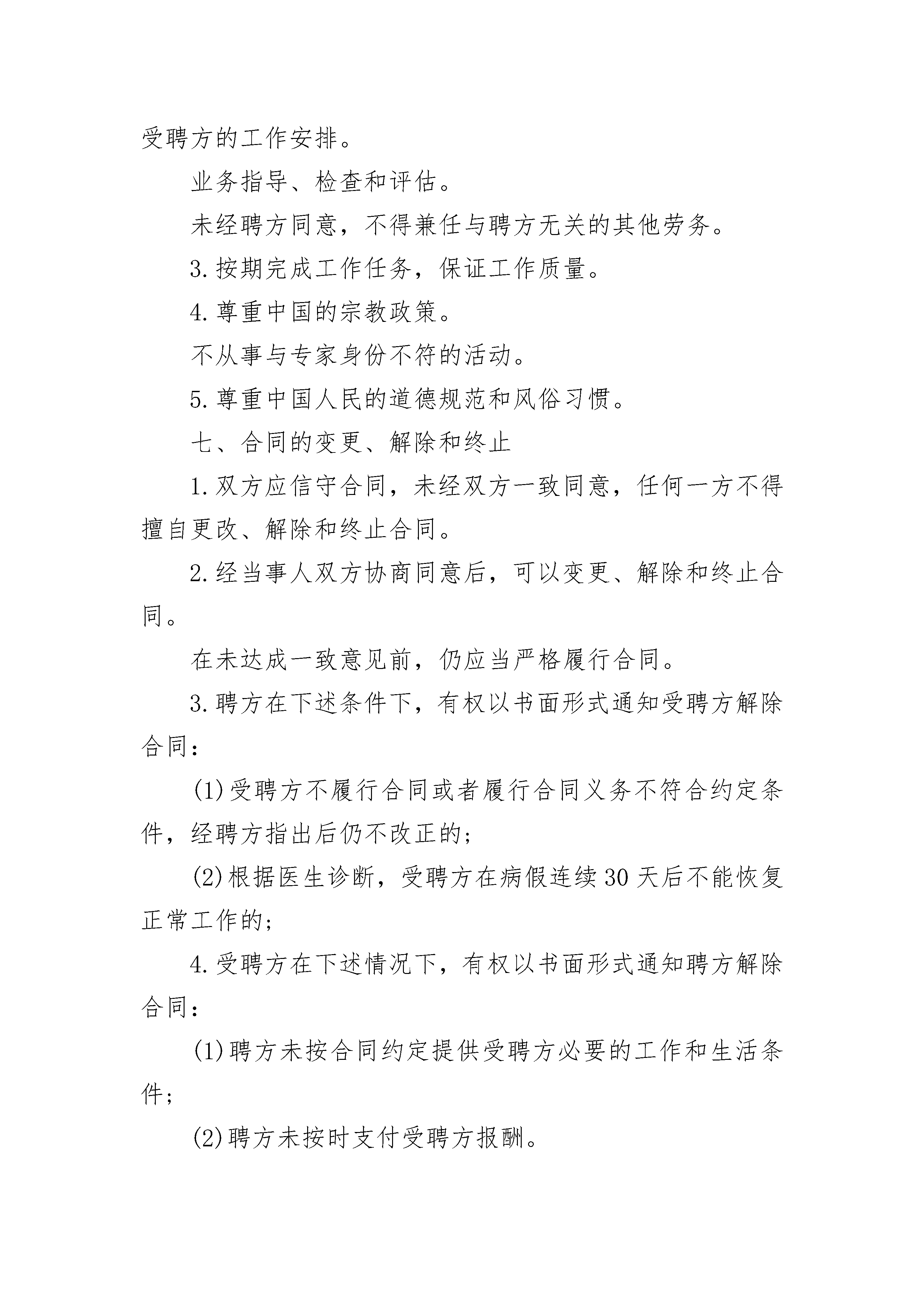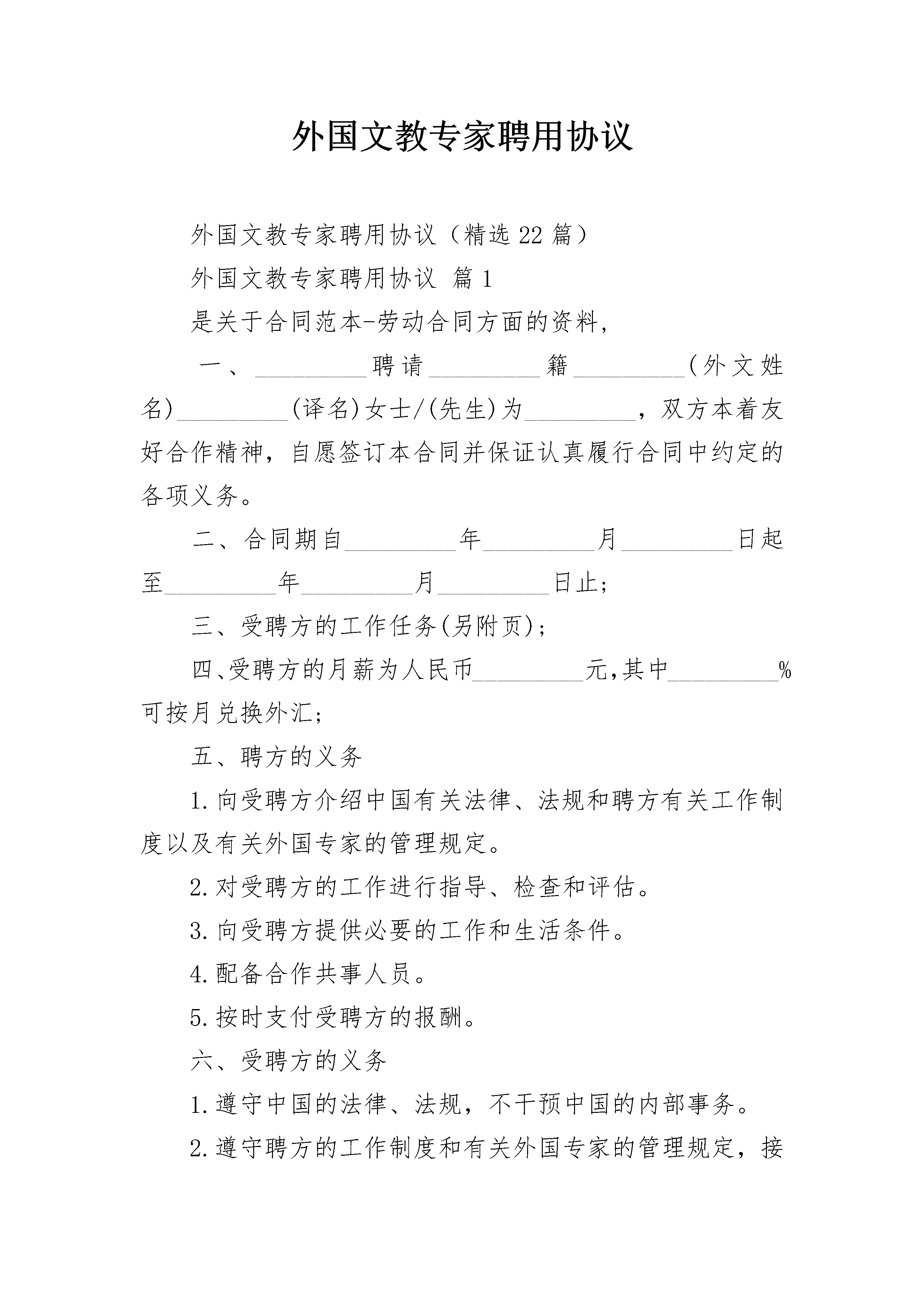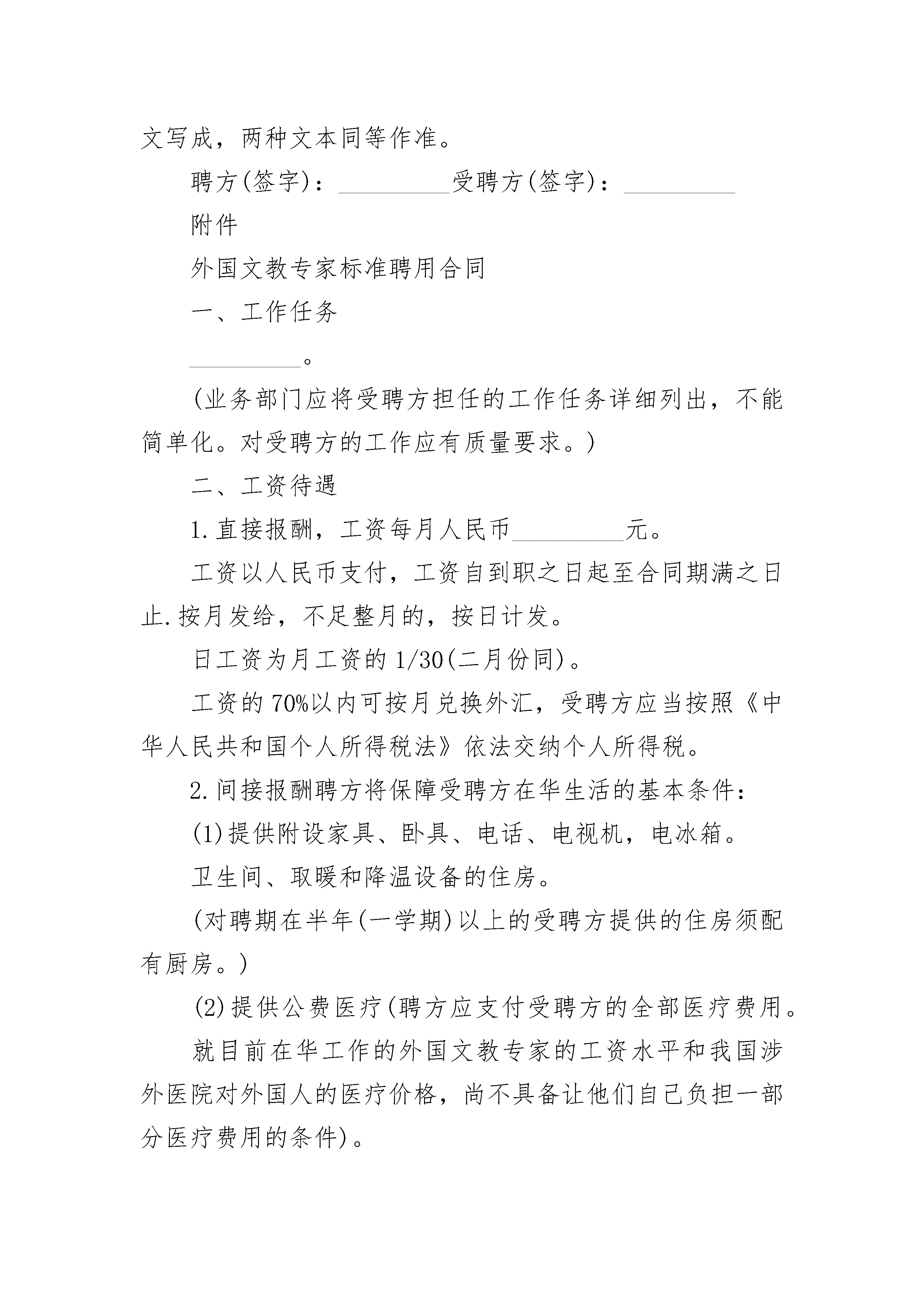 外国文教专家聘用协议外国文教专家聘用协议(精选22篇)外国文教专家聘用协议篇1是关于合同范本-劳动合同方面的资料,一、_________聘请_________籍_________(外文姓名)_________(译名)女士/(先生)为_________,双方本着友好合作精神,自愿签订本合同并保证认真履行合同中约定的各项义务。二、合同期自_________年_________月_________日起至_________年_________月_________日止;三、受聘方的工作任务(另附页);四、受聘方的月薪为人民币_________元,其中_________%可按月兑换外汇;五、聘方的义务1.向受聘方介绍中国有关法律、法规和聘方有关工作制度以及有关外国专家的管理规定。2.对受聘方的工作进行指导、检查和评估。3.向受聘方提供必要的工作和生活条件。4.配备合作共事人员。5.按时支付受聘方的报酬。六、受聘方的义务1.遵守中国的法律、法规,不干预中国的内部事务。2.遵守聘方的工作制度和有关外国专家的管理规定,接受聘方的工作安排。业务指导、检查和评估。未经聘方同意,不得兼任与聘方无关的其他劳务。3.按期完成工作任务,保证工作质量。4.尊重中国的宗教政策。不从事与专家身份不符的活动。5.尊重中国人民的道德规范和风俗习惯。七、合同的变更、解除和终止1.双方应信守合同,未经双方一致同意,任何一方不得擅自更改、解除和终止合同。2.经当事人双方协商同意后,可以变更、解除和终止合同。在未达成一致意见前,仍应当严格履行合同。3.聘方在下述条件下,有权以书面形式通知受聘方解除合同:(1)受聘方不履行合同或者履行合同义务不符合约定条件,经聘方指出后仍不改正的;(2)根据医生诊断,受聘方在病假连续30天后不能恢复正常工作的;4.受聘方在下述情况下,有权以书面形式通知聘方解除合同:(1)聘方未按合同约定提供受聘方必要的工作和生活条件;(2)聘方未按时支付受聘方报酬。八、违约金当事人一方不履行合同或者履行合同义务不符合约定条件,即违反合同时。应当向另一方支付_________美元(或相当数额的人民币)的违约金。受聘方因不可抗力事件要求解除合同,需出具有关机构证明,经聘方同意后,离华的费用自理;受聘方若无故解除合同,除离华费用自理外.还应当向聘方支付违约金。聘方因不可抗力事件要求解除合同.经受聘方同意后,离华费用由聘方负担;聘方若无故解除合同.除负担受聘方离华费用外,还应当向受聘方支付违约金。九、本合同附件为合同不可分割的-部分,与合同具有同等效力。十、本合同自双方签字之日起生效,合同期满即自行失效。当事人一方要求签订新合同,必须在本合同期满90天前向另一方提出,经双方协商同意后签订新合同。受聘方合同期满后,在华逗留期间的一切费用自理。十一、仲裁当事人双方发生合同纠纷时,尽可能通过协商或者调解解决。若协商。调解无效,可向国家外国专家局设立的外国文教专家事务仲裁机构申请仲裁。本合同于_________年_________月_________日在_________(地点)签订,一式两份,每份都用中文和_________文写成,两种文本同等作准。聘方(签字):_________受聘方(签字):_________附件外国文教专家标准聘用合同一、工作任务_________。(业务部门应将受聘方担任的工作任务详细列出,不能简单化。对受聘方的工作应有质量要求。)二、工资待遇1.直接报酬,工资每月人民币_________元。工资以人民币支付,工资自到职之日起至合同期满之日止.按月发给,不足整月的,按日计发。日工资为月工资的1/30(二月份同)。工资的70%以内可按月兑换外汇,受聘方应当按照《中华人民共和国个人所得税法》依法交纳个人所得税。2.间接报酬聘方将保障受聘方在华生活的基本条件:(1)提供附设家具、卧具、电话、电视机,电冰箱。卫生间、取暖和降温设备的住房。(对聘期在半年(一学期)以上的受聘方提供的住房须配有厨房。)(2)提供公费医疗(聘方应支付受聘方的全部医疗费用。就目前在华工作的外国文教专家的工资水平和我国涉外医院对外国人的医疗价格,尚不具备让他们自己负担一部分医疗费用的条件)。受聘方须在聘方指定的涉外医院就医,在非指定医院就医费用自理。受聘方的挂号、就医交通、镶牙、整容、保健按摩.配眼镜。住院用餐和服用非医疗性的滋补药品以及医生出诊等费用自理。(3)为工作地点和住所相距较远的受聘方提供上下班交通,或给予适当的交通补贴。(4)国际机票(中国至受聘方国家最近距离经济舱国际机票)三、工作时间和休息休假1.受聘方每日工作时间为八小时,每周工作时间为五天。2.聘方安排受聘方延长工作时间,将依据法定标准支付高于正常工作时间的工资报酬。3.受聘方享受中国下列节日休假:元旦、春节