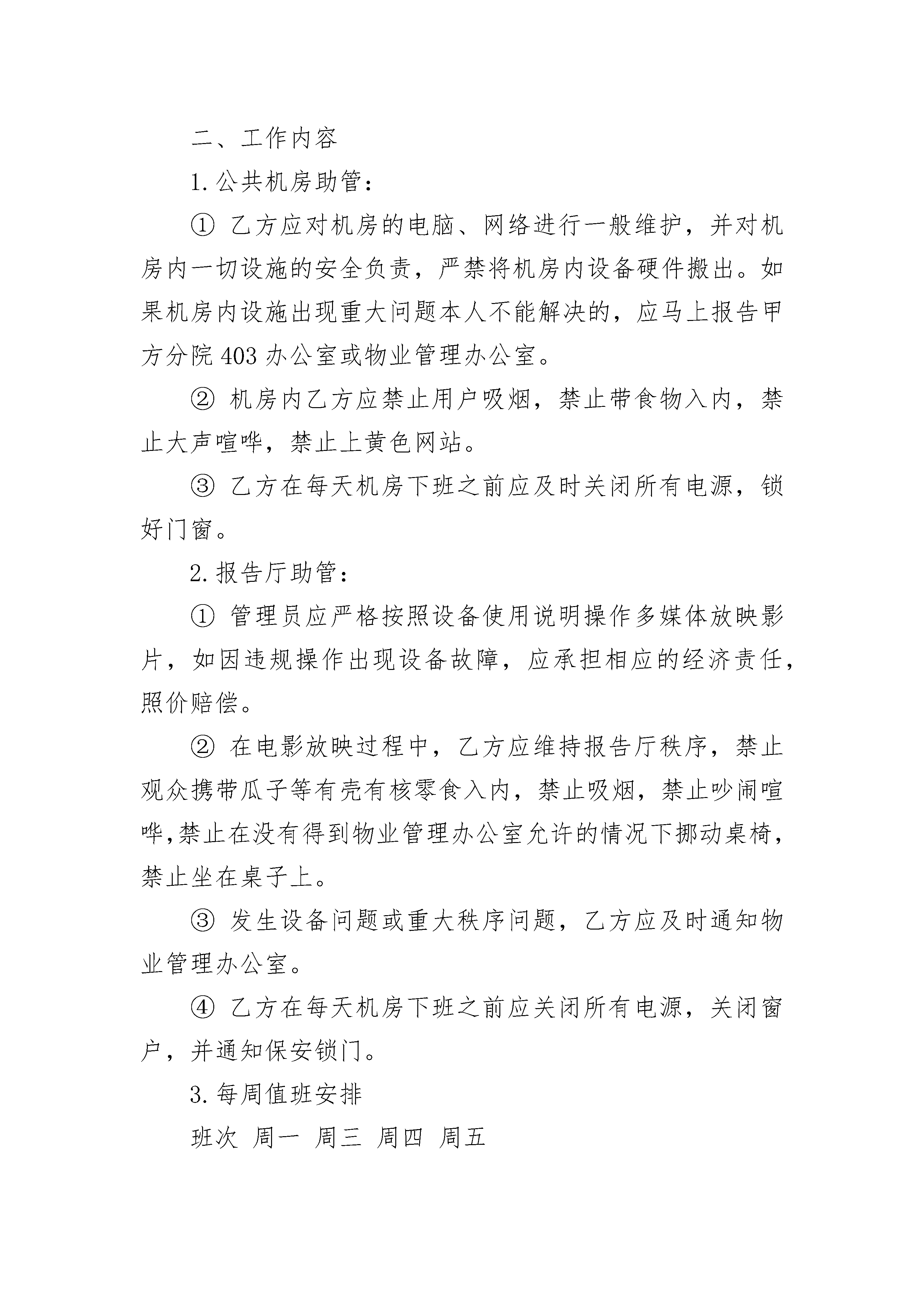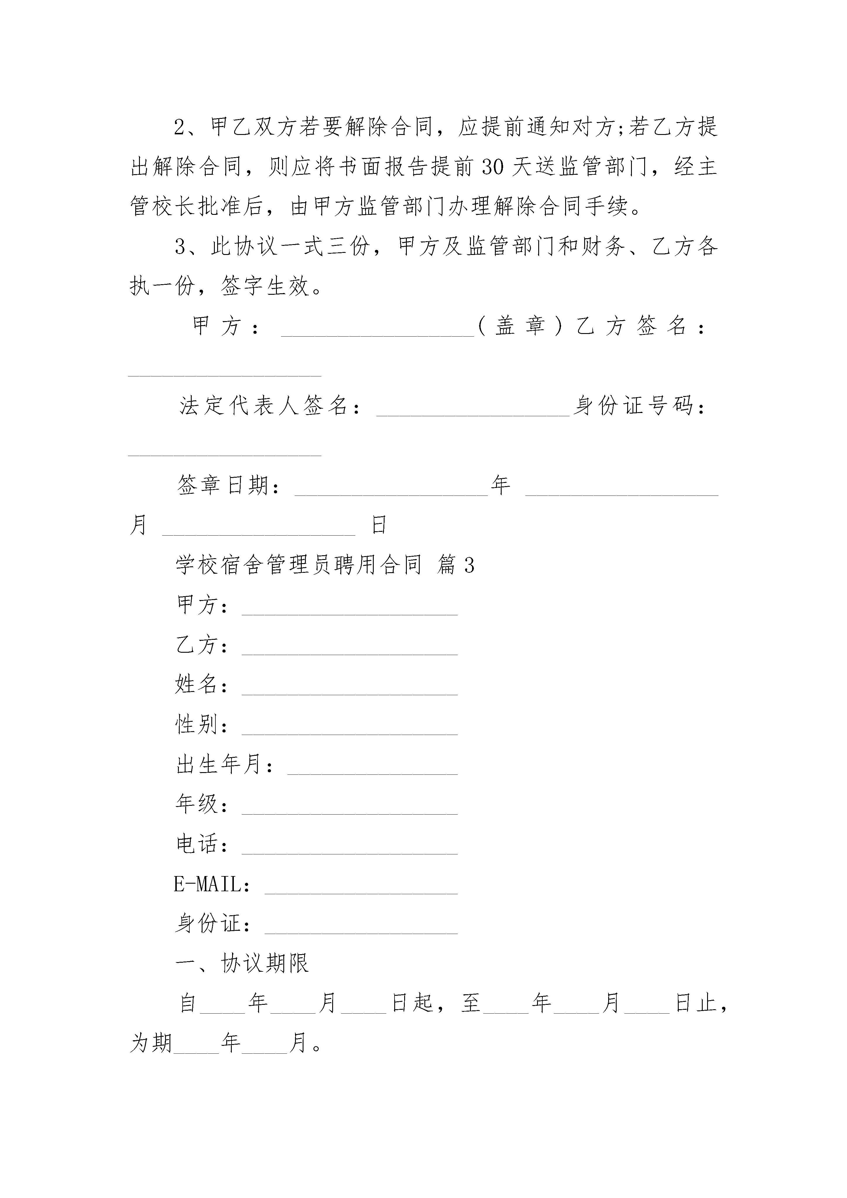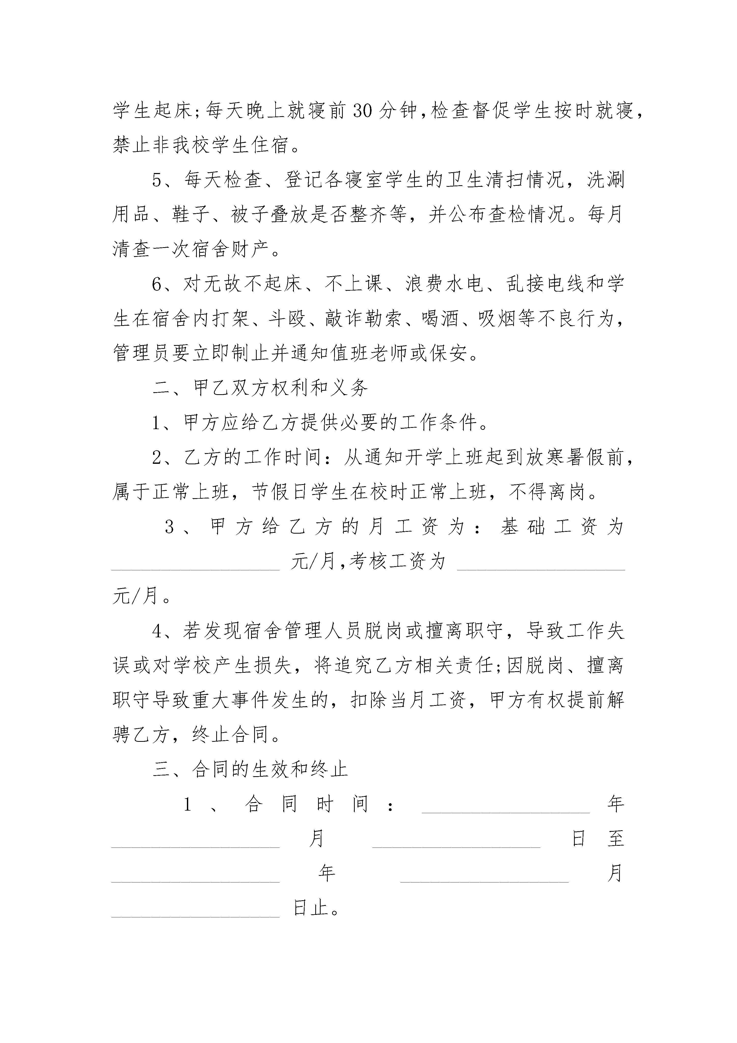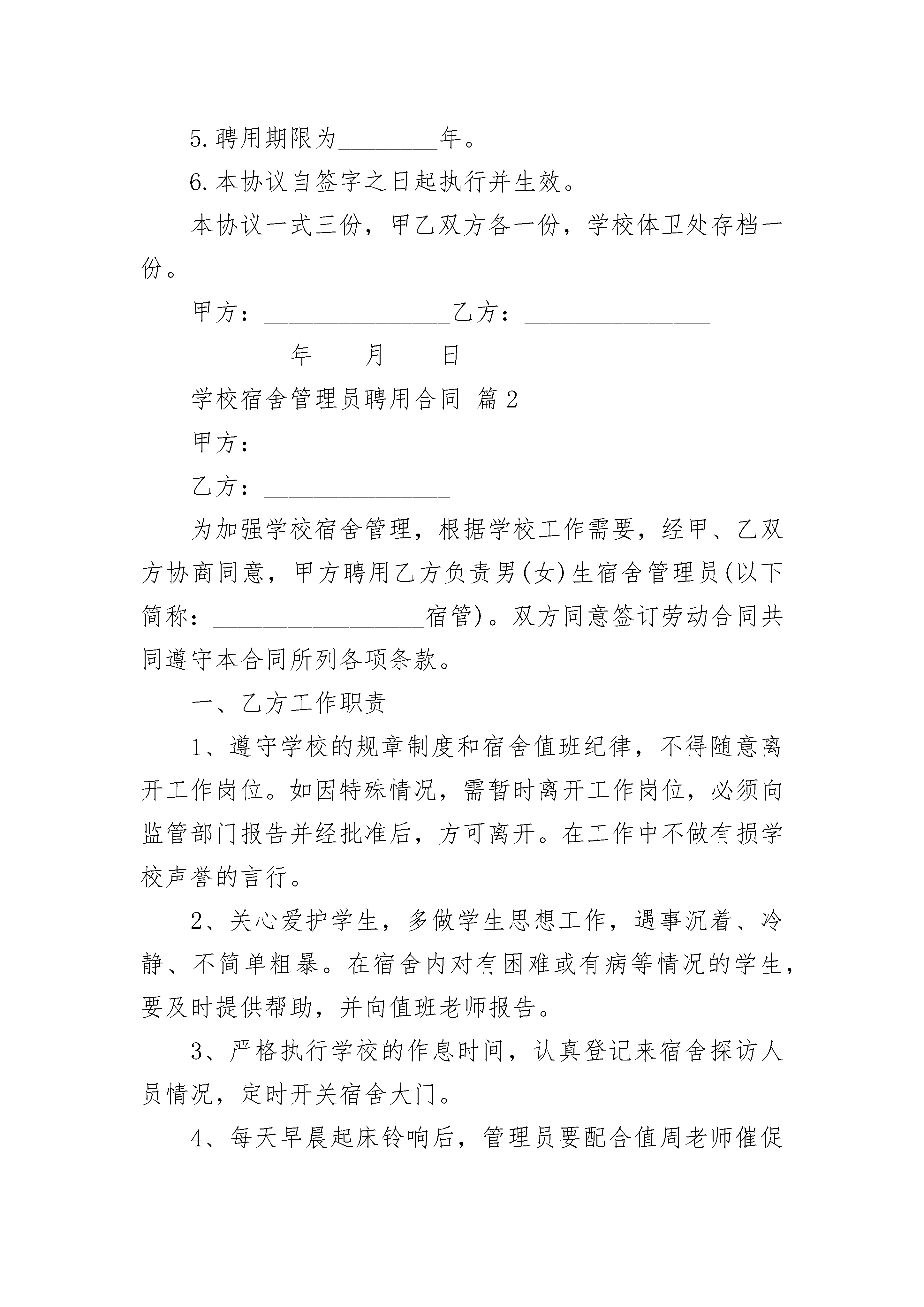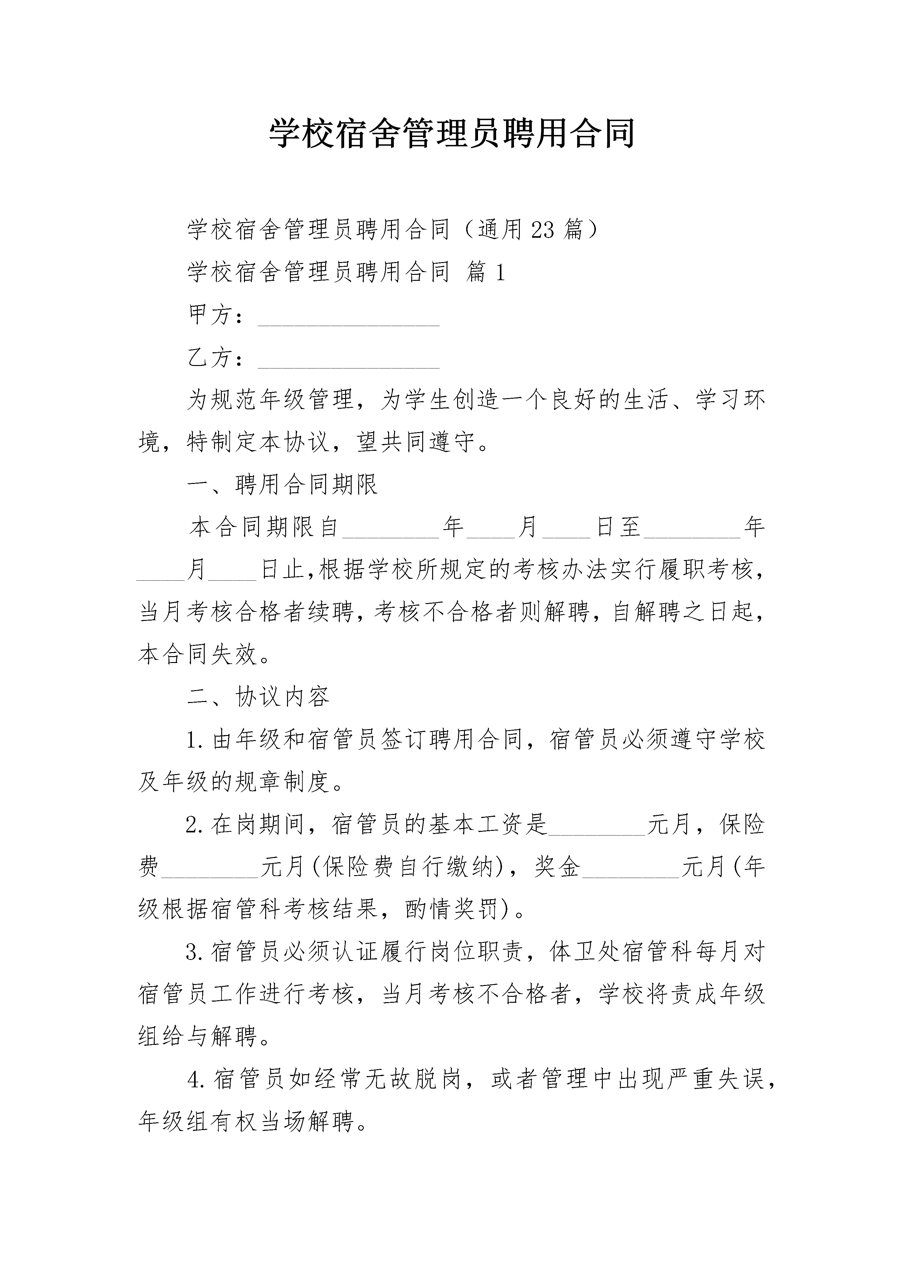 学校宿舍管理员聘用合同学校宿舍管理员聘用合同(通用23篇)学校宿舍管理员聘用合同篇1甲方:_______________乙方:_______________为规范年级管理,为学生创造一个良好的生活、学习环境,特制定本协议,望共同遵守。一、聘用合同期限本合同期限自________年____月____日至________年____月____日止,根据学校所规定的考核办法实行履职考核,当月考核合格者续聘,考核不合格者则解聘,自解聘之日起,本合同失效。二、协议内容1.由年级和宿管员签订聘用合同,宿管员必须遵守学校及年级的规章制度。2.在岗期间,宿管员的基本工资是________元月,保险费________元月(保险费自行缴纳),奖金________元月(年级根据宿管科考核结果,酌情奖罚)。3.宿管员必须认证履行岗位职责,体卫处宿管科每月对宿管员工作进行考核,当月考核不合格者,学校将责成年级组给与解聘。4.宿管员如经常无故脱岗,或者管理中出现严重失误,年级组有权当场解聘。5.聘用期限为________年。6.本协议自签字之日起执行并生效。本协议一式三份,甲乙双方各一份,学校体卫处存档一份。甲方:_______________乙方:_______________________年____月____日学校宿舍管理员聘用合同篇2甲方:_______________乙方:_______________为加强学校宿舍管理,根据学校工作需要,经甲、乙双方协商同意,甲方聘用乙方负责男(女)生宿舍管理员(以下简称:_________________宿管)。双方同意签订劳动合同共同遵守本合同所列各项条款。一、乙方工作职责1、遵守学校的规章制度和宿舍值班纪律,不得随意离开工作岗位。如因特殊情况,需暂时离开工作岗位,必须向监管部门报告并经批准后,方可离开。在工作中不做有损学校声誉的言行。2、关心爱护学生,多做学生思想工作,遇事沉着、冷静、不简单粗暴。在宿舍内对有困难或有病等情况的学生,要及时提供帮助,并向值班老师报告。3、严格执行学校的作息时间,认真登记来宿舍探访人员情况,定时开关宿舍大门。4、每天早晨起床铃响后,管理员要配合值周老师催促学生起床;每天晚上就寝前30分钟,检查督促学生按时就寝,禁止非我校学生住宿。5、每天检查、登记各寝室学生的卫生清扫情况,洗涮用品、鞋子、被子叠放是否整齐等,并公布查检情况。每月清查一次宿舍财产。6、对无故不起床、不上课、浪费水电、乱接电线和学生在宿舍内打架、斗殴、敲诈勒索、喝酒、吸烟等不良行为,管理员要立即制止并通知值班老师或保安。二、甲乙双方权利和义务1、甲方应给乙方提供必要的工作条件。2、乙方的工作时间:从通知开学上班起到放寒暑假前,属于正常上班,节假日学生在校时正常上班,不得离岗。3、甲方给乙方的月工资为:基础工资为_________________元/月,考核工资为_________________元/月。4、若发现宿舍管理人员脱岗或擅离职守,导致工作失误或对学校产生损失,将追究乙方相关责任;因脱岗、擅离职守导致重大事件发生的,扣除当月工资,甲方有权提前解骋乙方,终止合同。三、合同的生效和终止1、合同时间:_________________年_________________月_________________日至_________________年_________________月_________________日止。2、甲乙双方若要解除合同,应提前通知对方;若乙方提出解除合同,则应将书面报告提前30天送监管部门,经主管校长批准后,由甲方监管部门办理解除合同手续。3、此协议一式三份,甲方及监管部门和财务、乙方各执一份,签字生效。甲方:_________________(盖章)乙方签名:_________________法定代表人签名:_________________身份证号码:_________________签章日期:_________________年_________________月_________________日学校宿舍管理员聘用合同篇3甲方:___________________乙方:___________________姓名:___________________性别:___________________出生年月:_______________年级:___________________电话:___________________E-MAIL:_________________身份证:_________________一、协议期限自____年____月____日起,至____年____月____日止,为期____年____月。二、工作内容1.公共机房助管:①乙方应对机房的电脑、网络进行