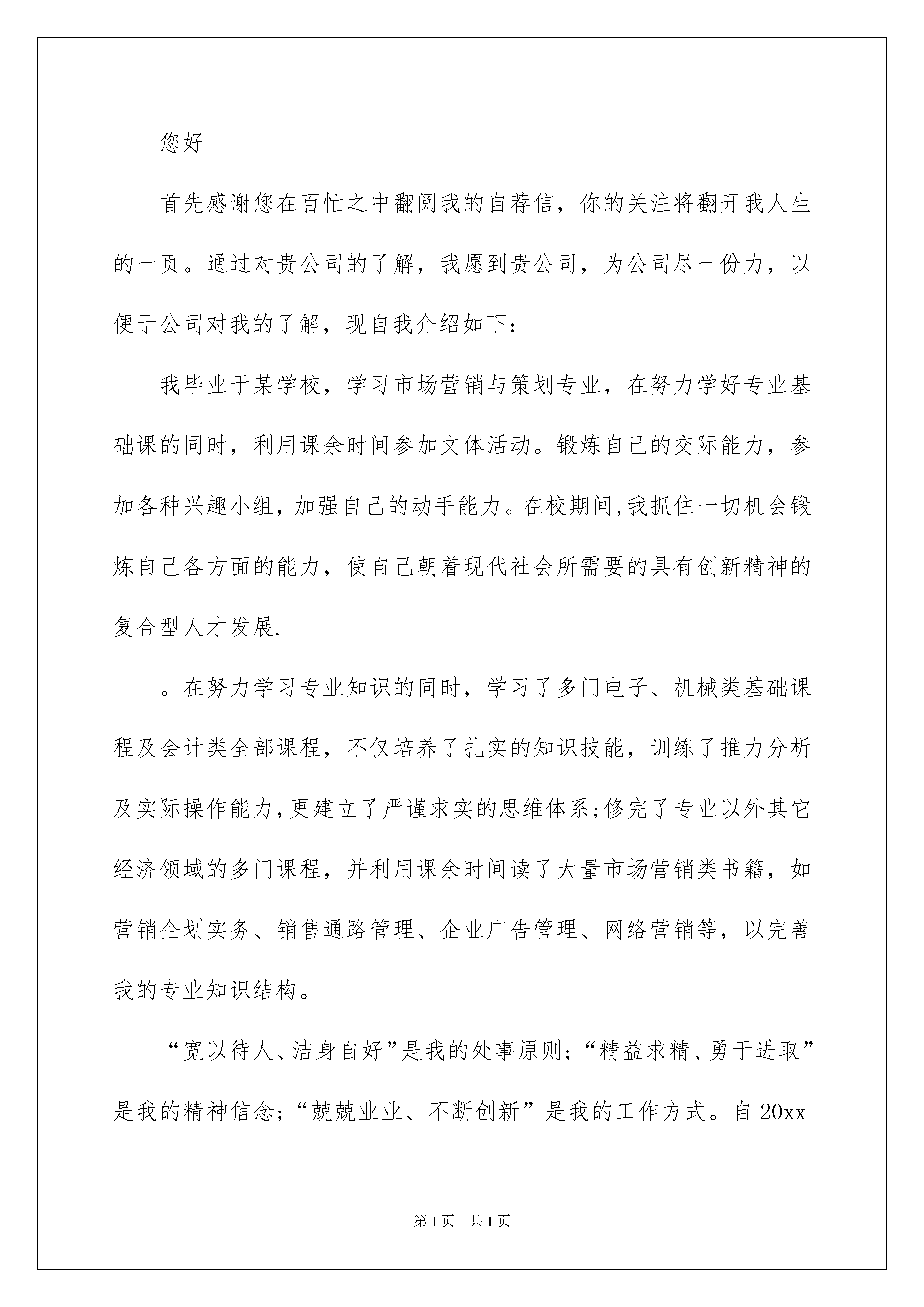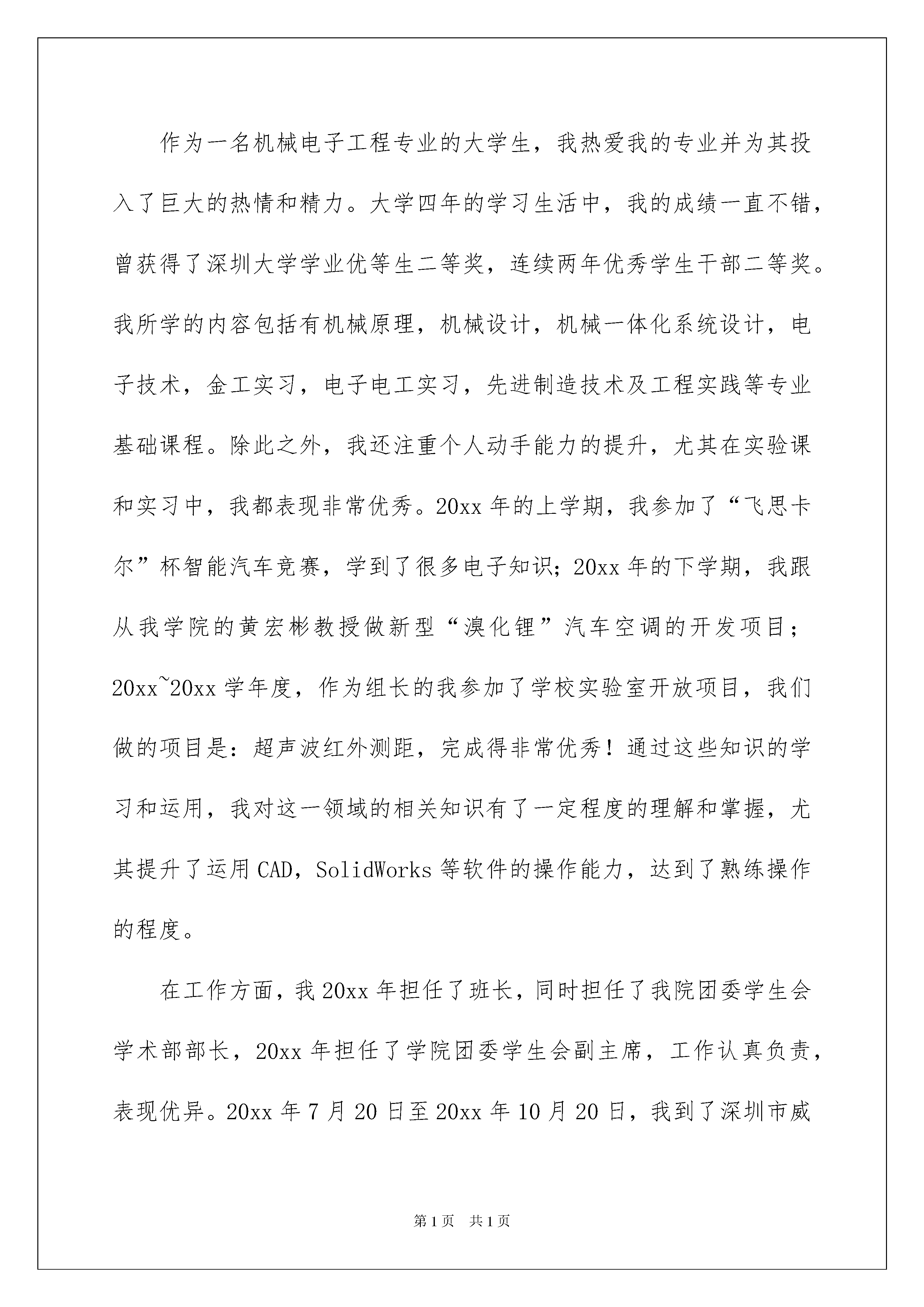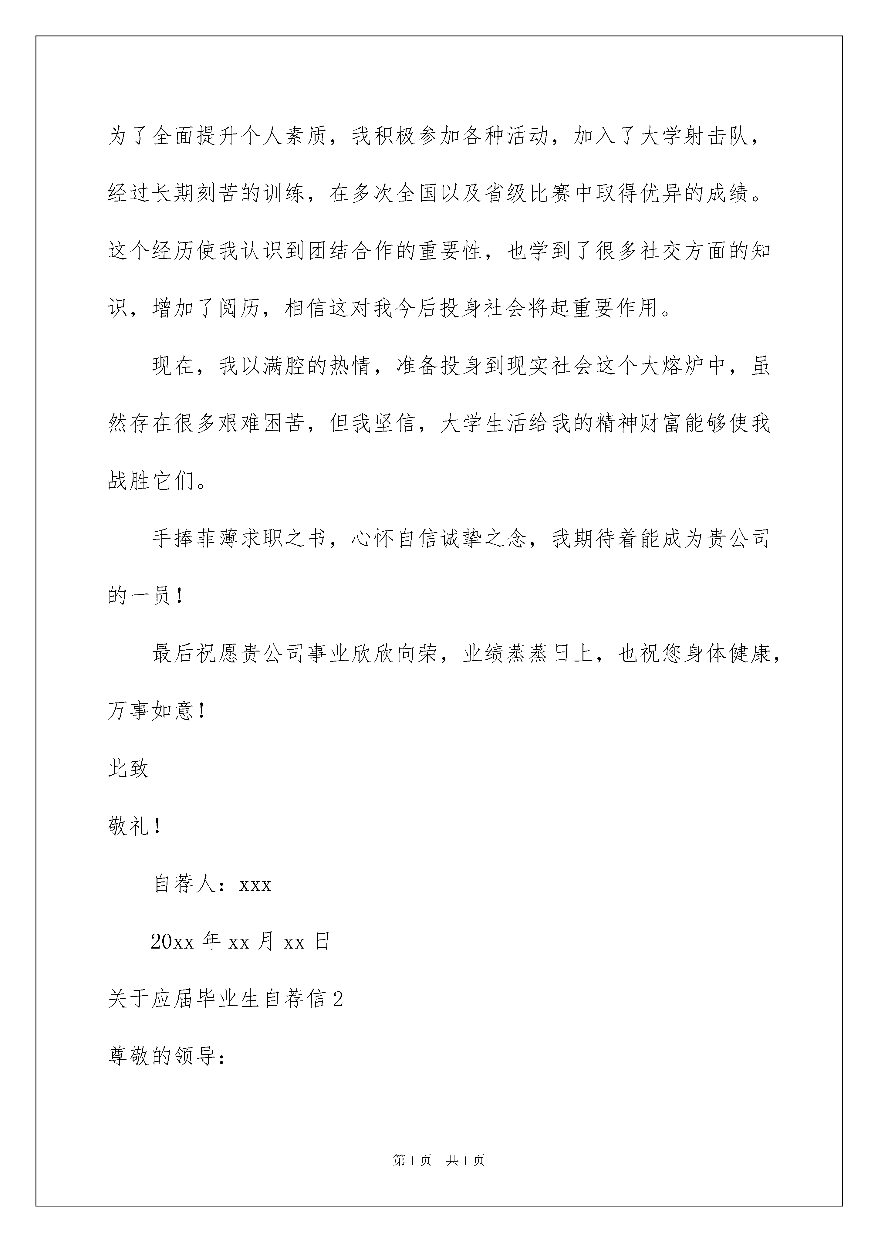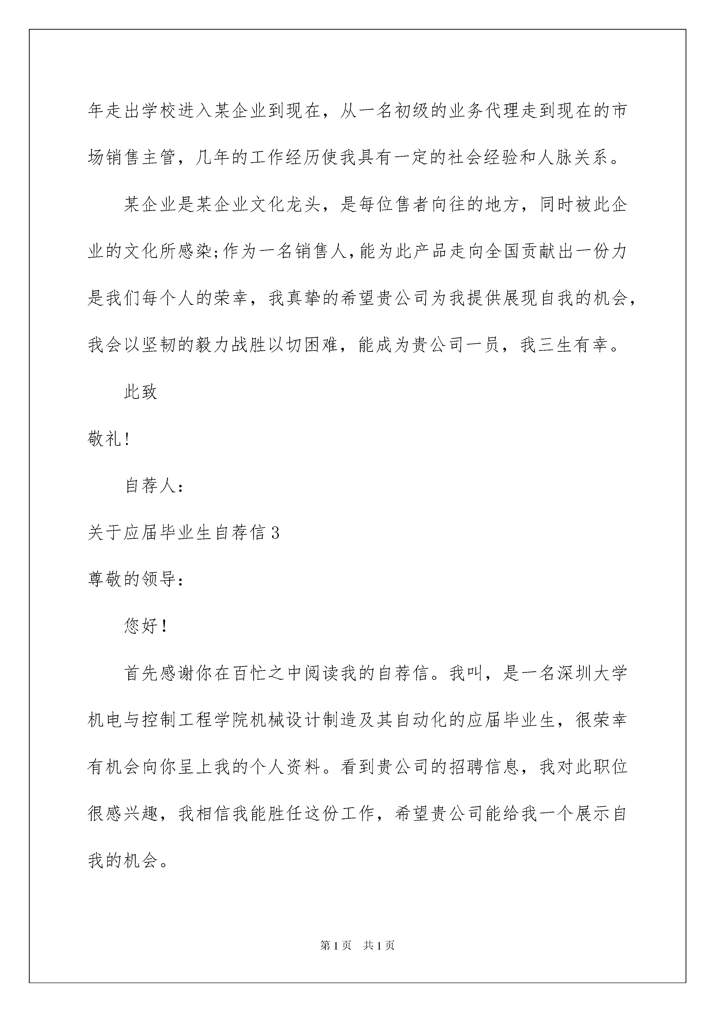 2022关于应届毕业生自荐信关于应届毕业生自荐信在当今社会生活中,用到自荐信的地方越来越多,自荐信能突出个人的特征,让他人看到自己的优势。那么什么样的自荐信才是有效的呢?下面是我帮大家整理的关于应届毕业生自荐信,供大家参考借鉴,希望可以帮助到有需要的朋友。关于应届毕业生自荐信1尊敬的领导:您好!首先感谢您在百忙之中抽时间来阅读这封自荐信。我是一名即将毕业的xxx系本科生,届时将获得xx学士学位。大学四年,奠定了扎实的专业理论基础,良好的组织能力,团队协作精神,务实的工作作风。为了发挥自己的才能,特向贵单位自荐。我以“严”字当头,在学习上勤奋严谨,对课堂知识不懂就问,力求深刻理解。在掌握了本专业知识的基础上,不忘拓展自己的知识面,特别是在xxx应用方面,及时阅读相关书籍。我很重视英语的学习,不断努力扩大词汇量,英语交际能力也有了长足的进步。同时,为了全面提升个人素质,我积极参加各种活动,加入了大学射击队,经过长期刻苦的训练,在多次全国以及省级比赛中取得优异的成绩。这个经历使我认识到团结合作的重要性,也学到了很多社交方面的知识,增加了阅历,相信这对我今后投身社会将起重要作用。现在,我以满腔的热情,准备投身到现实社会这个大熔炉中,虽然存在很多艰难困苦,但我坚信,大学生活给我的精神财富能够使我战胜它们。手捧菲薄求职之书,心怀自信诚挚之念,我期待着能成为贵公司的一员!最后祝愿贵公司事业欣欣向荣,业绩蒸蒸日上,也祝您身体健康,万事如意!此致敬礼!自荐人:xxx20xx年xx月xx日关于应届毕业生自荐信2尊敬的领导:您好首先感谢您在百忙之中翻阅我的自荐信,你的关注将翻开我人生的一页。通过对贵公司的了解,我愿到贵公司,为公司尽一份力,以便于公司对我的了解,现自我介绍如下:我毕业于某学校,学习市场营销与策划专业,在努力学好专业基础课的同时,利用课余时间参加文体活动。锻炼自己的交际能力,参加各种兴趣小组,加强自己的动手能力。在校期间,我抓住一切机会锻炼自己各方面的能力,使自己朝着现代社会所需要的具有创新精神的复合型人才发展.。在努力学习专业知识的同时,学习了多门电子、机械类基础课程及会计类全部课程,不仅培养了扎实的知识技能,训练了推力分析及实际操作能力,更建立了严谨求实的思维体系;修完了专业以外其它经济领域的多门课程,并利用课余时间读了大量市场营销类书籍,如营销企划实务、销售通路管理、企业广告管理、网络营销等,以完善我的专业知识结构。“宽以待人、洁身自好”是我的处事原则;“精益求精、勇于进取”是我的精神信念;“兢兢业业、不断创新”是我的工作方式。自20xx年走出学校进入某企业到现在,从一名初级的业务代理走到现在的市场销售主管,几年的工作经历使我具有一定的社会经验和人脉关系。某企业是某企业文化龙头,是每位售者向往的地方,同时被此企业的文化所感染;作为一名销售人,能为此产品走向全国贡献出一份力是我们每个人的荣幸,我真挚的希望贵公司为我提供展现自我的机会,我会以坚韧的毅力战胜以切困难,能成为贵公司一员,我三生有幸。此致敬礼!自荐人:关于应届毕业生自荐信3尊敬的领导:您好!首先感谢你在百忙之中阅读我的自荐信。我叫,是一名深圳大学机电与控制工程学院机械设计制造及其自动化的应届毕业生,很荣幸有机会向你呈上我的个人资料。看到贵公司的招聘信息,我对此职位很感兴趣,我相信我能胜任这份工作,希望贵公司能给我一个展示自我的机会。作为一名机械电子工程专业的大学生,我热爱我的专业并为其投入了巨大的热情和精力。大学四年的学习生活中,我的成绩一直不错,曾获得了深圳大学学业优等生二等奖,连续两年优秀学生干部二等奖。我所学的内容包括有机械原理,机械设计,机械一体化系统设计,电子技术,金工实习,电子电工实习,先进制造技术及工程实践等专业基础课程。除此之外,我还注重个人动手能力的提升,尤其在实验课和实习中,我都表现非常优秀。20xx年的上学期,我参加了“飞思卡尔”杯智能汽车竞赛,学到了很多电子知识;20xx年的下学期,我跟从我学院的黄宏彬教授做新型“溴化锂”汽车空调的开发项目;20xx~20xx学年度,作为组长的我参加了学校实验室开放项目,我们做的项目是:超声波红外测距,完成得非常优秀!通过这些知识的学习和运用,我对这一领域的相关知识有了一定程度的理解和掌握,尤其提升了运用CAD,SolidWorks等软件的操作能力,达到了熟练操作的程度。在工作方面,我20xx年担任了班长,同时担任了我院团委学生会学术部部长,20xx年担任了学院团委学生会副主席,工作认真负责,表现优异。20xx年7月20日至20xx年10月20日,我到了深圳市