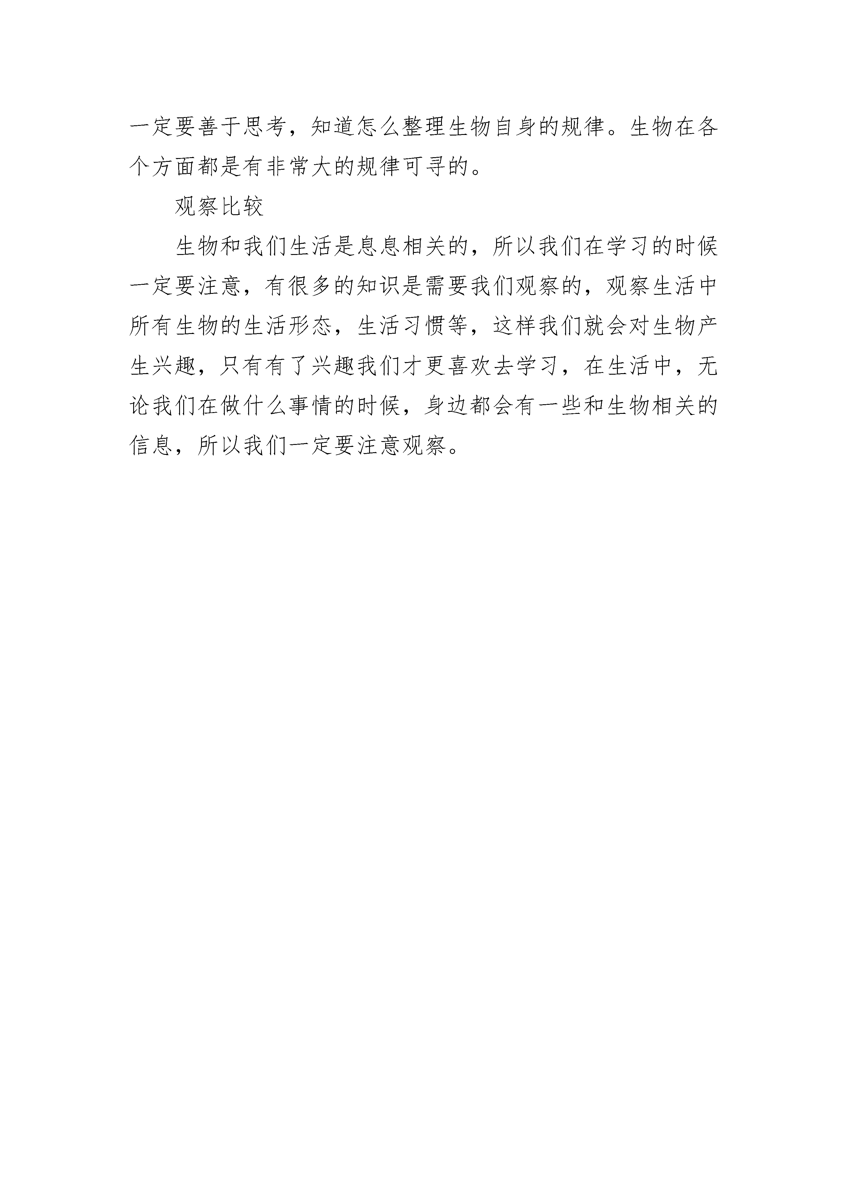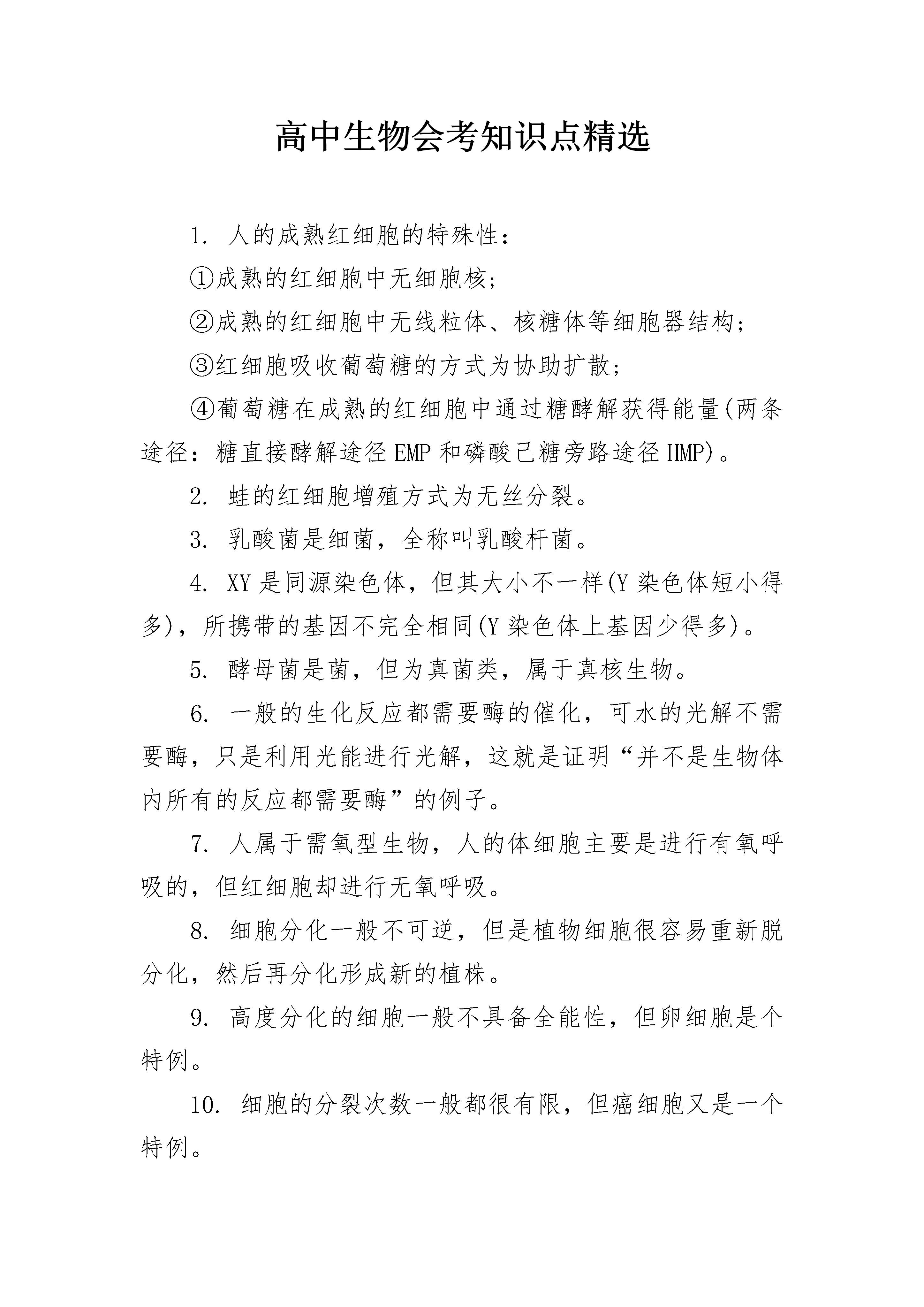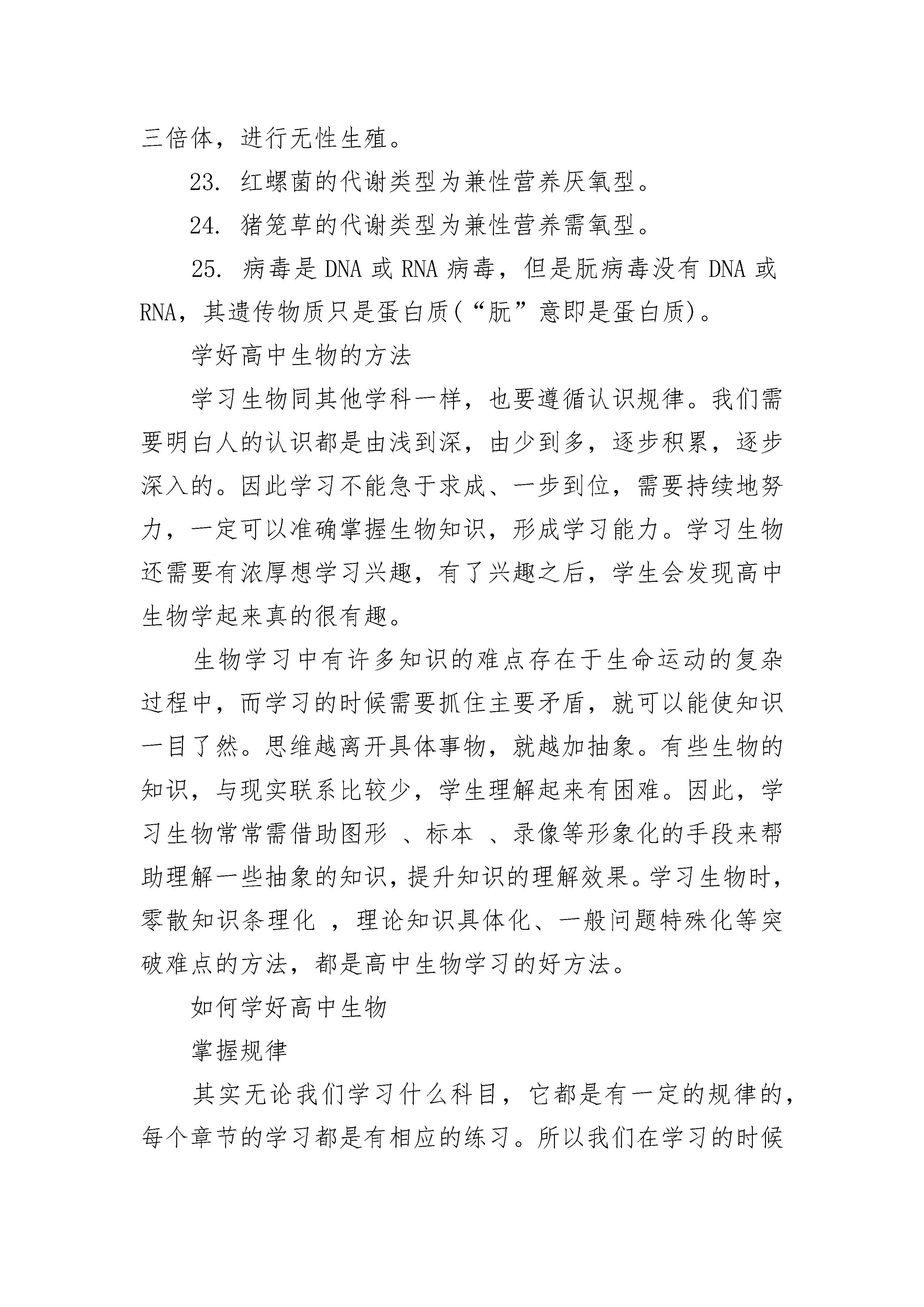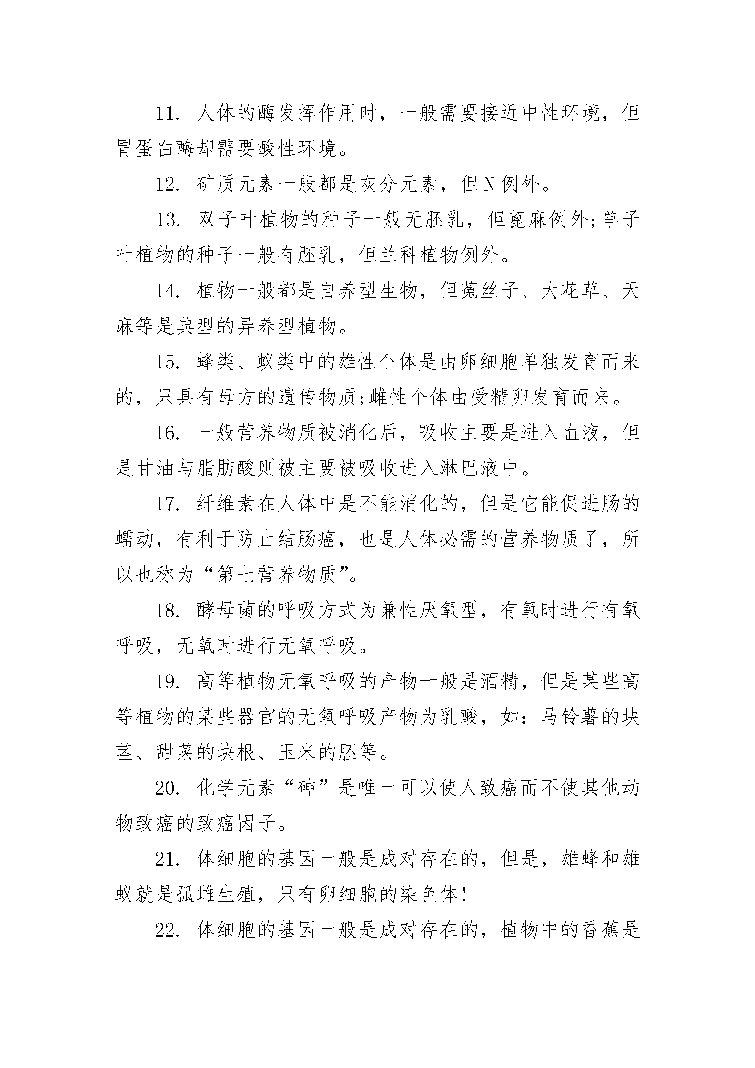 高中生物会考知识点精选1.人的成熟红细胞的特殊性:①成熟的红细胞中无细胞核;②成熟的红细胞中无线粒体、核糖体等细胞器结构;③红细胞吸收葡萄糖的方式为协助扩散;④葡萄糖在成熟的红细胞中通过糖酵解获得能量(两条途径:糖直接酵解途径EMP和磷酸己糖旁路途径HMP)。2.蛙的红细胞增殖方式为无丝分裂。3.乳酸菌是细菌,全称叫乳酸杆菌。4.XY是同源染色体,但其大小不一样(Y染色体短小得多),所携带的基因不完全相同(Y染色体上基因少得多)。5.酵母菌是菌,但为真菌类,属于真核生物。6.一般的生化反应都需要酶的催化,可水的光解不需要酶,只是利用光能进行光解,这就是证明“并不是生物体内所有的反应都需要酶”的例子。7.人属于需氧型生物,人的体细胞主要是进行有氧呼吸的,但红细胞却进行无氧呼吸。8.细胞分化一般不可逆,但是植物细胞很容易重新脱分化,然后再分化形成新的植株。9.高度分化的细胞一般不具备全能性,但卵细胞是个特例。10.细胞的分裂次数一般都很有限,但癌细胞又是一个特例。11.人体的酶发挥作用时,一般需要接近中性环境,但胃蛋白酶却需要酸性环境。12.矿质元素一般都是灰分元素,但N例外。13.双子叶植物的种子一般无胚乳,但蓖麻例外;单子叶植物的种子一般有胚乳,但兰科植物例外。14.植物一般都是自养型生物,但菟丝子、大花草、天麻等是典型的异养型植物。15.蜂类、蚁类中的雄性个体是由卵细胞单独发育而来的,只具有母方的遗传物质;雌性个体由受精卵发育而来。16.一般营养物质被消化后,吸收主要是进入血液,但是甘油与脂肪酸则被主要被吸收进入淋巴液中。17.纤维素在人体中是不能消化的,但是它能促进肠的蠕动,有利于防止结肠癌,也是人体必需的营养物质了,所以也称为“第七营养物质”。18.酵母菌的呼吸方式为兼性厌氧型,有氧时进行有氧呼吸,无氧时进行无氧呼吸。19.高等植物无氧呼吸的产物一般是酒精,但是某些高等植物的某些器官的无氧呼吸产物为乳酸,如:马铃薯的块茎、甜菜的块根、玉米的胚等。20.化学元素“砷”是唯一可以使人致癌而不使其他动物致癌的致癌因子。21.体细胞的基因一般是成对存在的,但是,雄蜂和雄蚁就是孤雌生殖,只有卵细胞的染色体!22.体细胞的基因一般是成对存在的,植物中的香蕉是三倍体,进行无性生殖。23.红螺菌的代谢类型为兼性营养厌氧型。24.猪笼草的代谢类型为兼性营养需氧型。25.病毒是DNA或RNA病毒,但是朊病毒没有DNA或RNA,其遗传物质只是蛋白质(“朊”意即是蛋白质)。学好高中生物的方法学习生物同其他学科一样,也要遵循认识规律。我们需要明白人的认识都是由浅到深,由少到多,逐步积累,逐步深入的。因此学习不能急于求成、一步到位,需要持续地努力,一定可以准确掌握生物知识,形成学习能力。学习生物还需要有浓厚想学习兴趣,有了兴趣之后,学生会发现高中生物学起来真的很有趣。生物学习中有许多知识的难点存在于生命运动的复杂过程中,而学习的时候需要抓住主要矛盾,就可以能使知识一目了然。思维越离开具体事物,就越加抽象。有些生物的知识,与现实联系比较少,学生理解起来有困难。因此,学习生物常常需借助图形、标本、录像等形象化的手段来帮助理解一些抽象的知识,提升知识的理解效果。学习生物时,零散知识条理化,理论知识具体化、一般问题特殊化等突破难点的方法,都是高中生物学习的好方法。如何学好高中生物掌握规律其实无论我们学习什么科目,它都是有一定的规律的,每个章节的学习都是有相应的练习。所以我们在学习的时候一定要善于思考,知道怎么整理生物自身的规律。生物在各个方面都是有非常大的规律可寻的。观察比较生物和我们生活是息息相关的,所以我们在学习的时候一定要注意,有很多的知识是需要我们观察的,观察生活中所有生物的生活形态,生活习惯等,这样我们就会对生物产生兴趣,只有有了兴趣我们才更喜欢去学习,在生活中,无论我们在做什么事情的时候,身边都会有一些和生物相关的信息,所以我们一定要注意观察。
