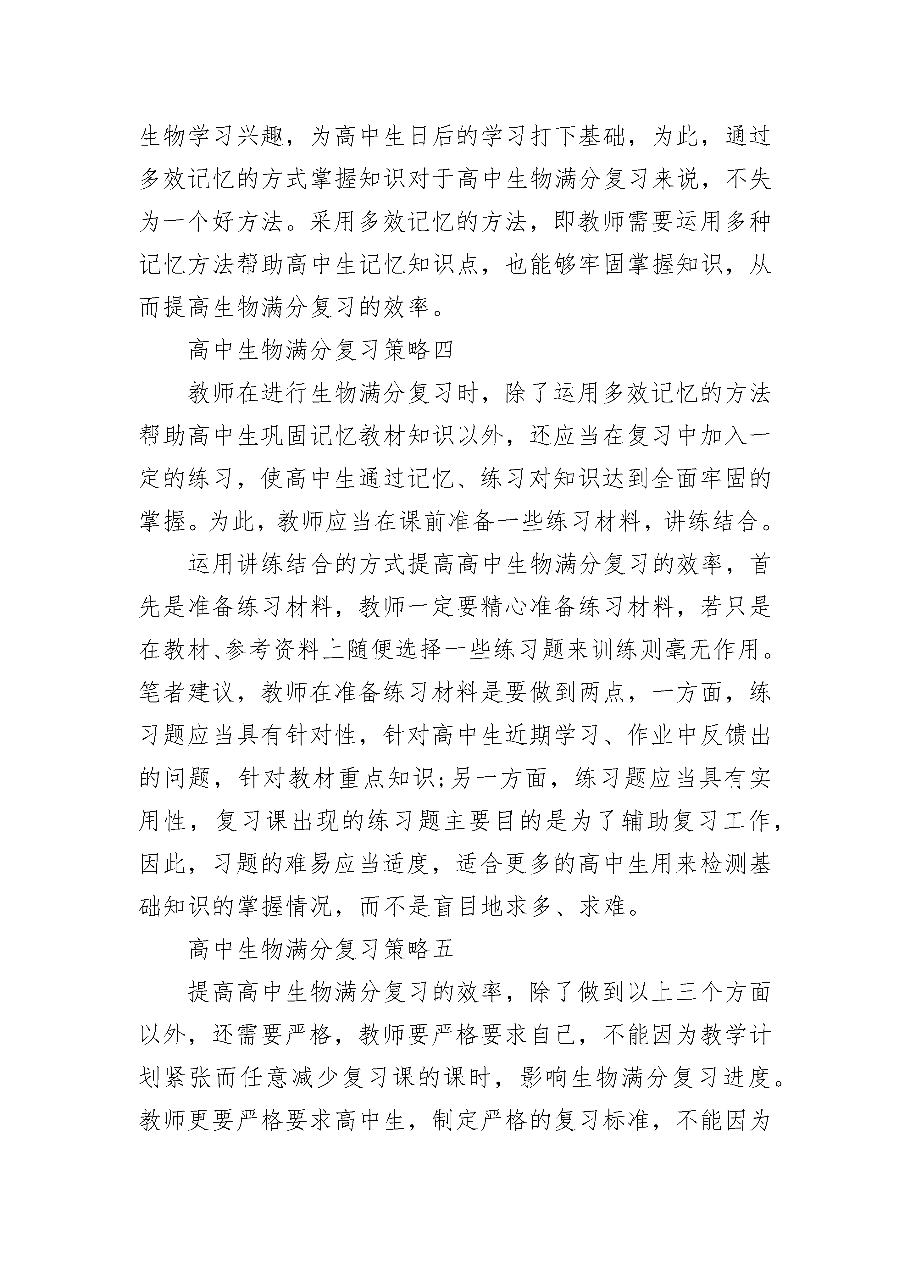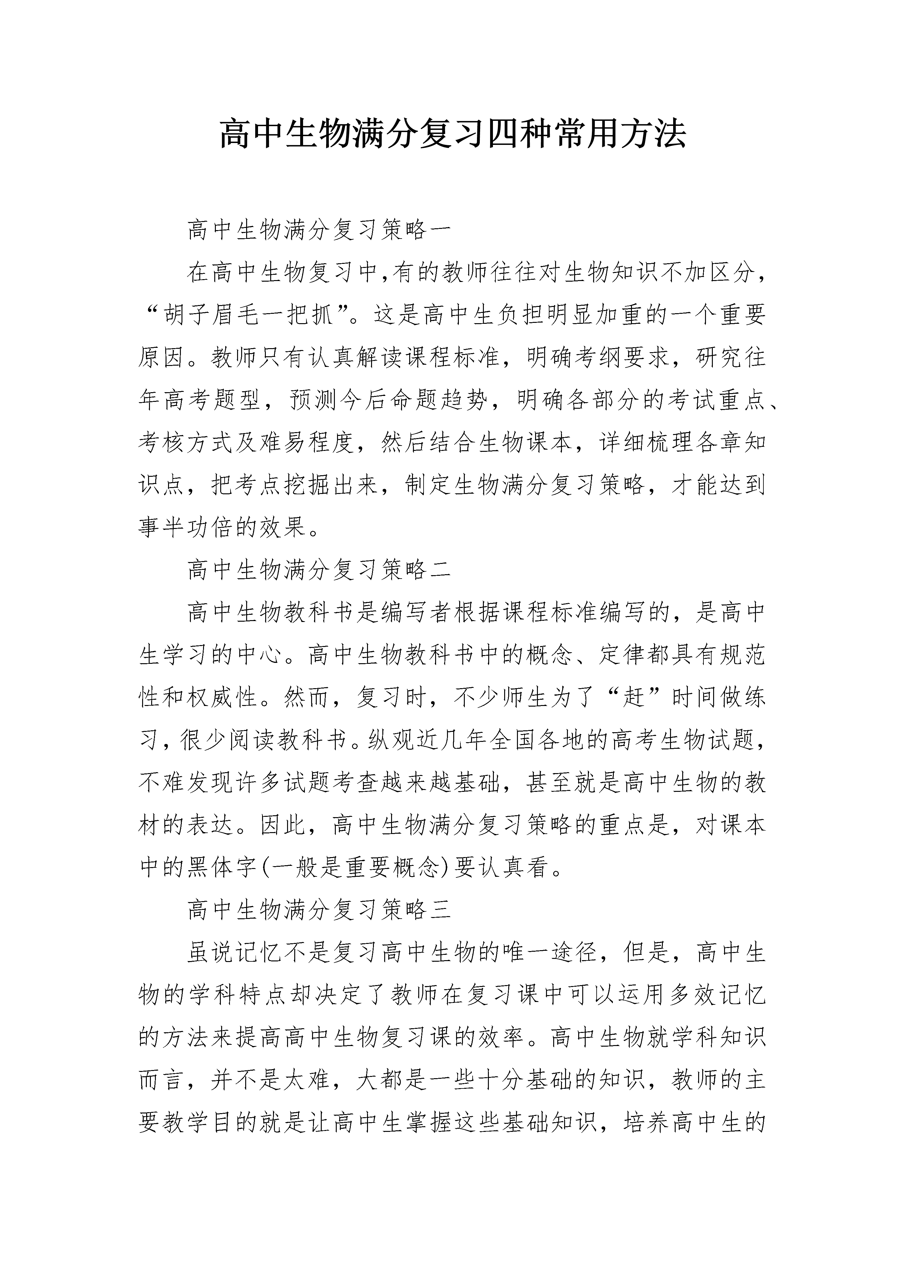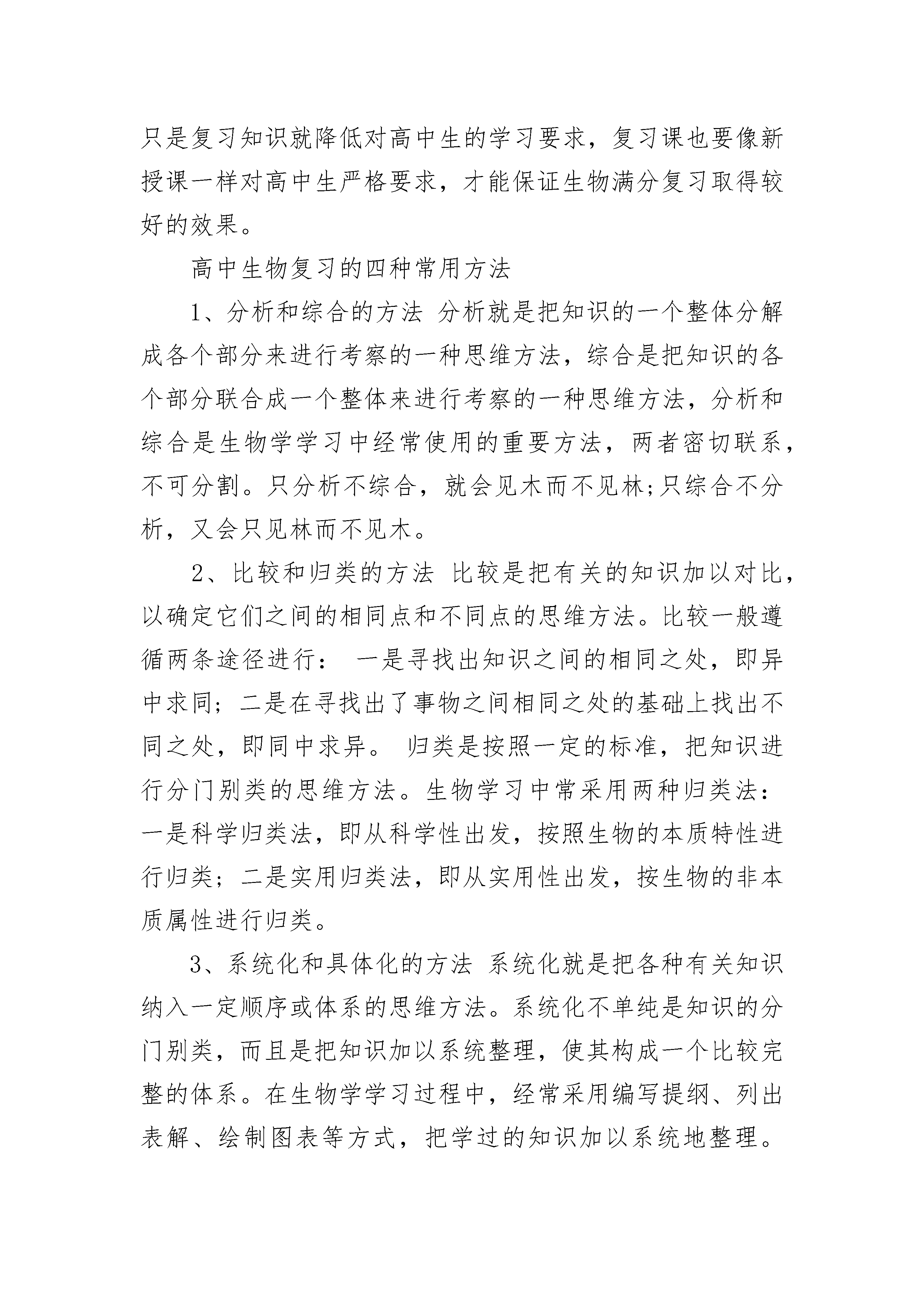 高中生物满分复习四种常用方法高中生物满分复习策略一在高中生物复习中,有的教师往往对生物知识不加区分,“胡子眉毛一把抓”。这是高中生负担明显加重的一个重要原因。教师只有认真解读课程标准,明确考纲要求,研究往年高考题型,预测今后命题趋势,明确各部分的考试重点、考核方式及难易程度,然后结合生物课本,详细梳理各章知识点,把考点挖掘出来,制定生物满分复习策略,才能达到事半功倍的效果。高中生物满分复习策略二高中生物教科书是编写者根据课程标准编写的,是高中生学习的中心。高中生物教科书中的概念、定律都具有规范性和权威性。然而,复习时,不少师生为了“赶”时间做练习,很少阅读教科书。纵观近几年全国各地的高考生物试题,不难发现许多试题考查越来越基础,甚至就是高中生物的教材的表达。因此,高中生物满分复习策略的重点是,对课本中的黑体字(一般是重要概念)要认真看。高中生物满分复习策略三虽说记忆不是复习高中生物的唯一途径,但是,高中生物的学科特点却决定了教师在复习课中可以运用多效记忆的方法来提高高中生物复习课的效率。高中生物就学科知识而言,并不是太难,大都是一些十分基础的知识,教师的主要教学目的就是让高中生掌握这些基础知识,培养高中生的生物学习兴趣,为高中生日后的学习打下基础,为此,通过多效记忆的方式掌握知识对于高中生物满分复习来说,不失为一个好方法。采用多效记忆的方法,即教师需要运用多种记忆方法帮助高中生记忆知识点,也能够牢固掌握知识,从而提高生物满分复习的效率。高中生物满分复习策略四教师在进行生物满分复习时,除了运用多效记忆的方法帮助高中生巩固记忆教材知识以外,还应当在复习中加入一定的练习,使高中生通过记忆、练习对知识达到全面牢固的掌握。为此,教师应当在课前准备一些练习材料,讲练结合。运用讲练结合的方式提高高中生物满分复习的效率,首先是准备练习材料,教师一定要精心准备练习材料,若只是在教材、参考资料上随便选择一些练习题来训练则毫无作用。笔者建议,教师在准备练习材料是要做到两点,一方面,练习题应当具有针对性,针对高中生近期学习、作业中反馈出的问题,针对教材重点知识;另一方面,练习题应当具有实用性,复习课出现的练习题主要目的是为了辅助复习工作,因此,习题的难易应当适度,适合更多的高中生用来检测基础知识的掌握情况,而不是盲目地求多、求难。高中生物满分复习策略五提高高中生物满分复习的效率,除了做到以上三个方面以外,还需要严格,教师要严格要求自己,不能因为教学计划紧张而任意减少复习课的课时,影响生物满分复习进度。教师更要严格要求高中生,制定严格的复习标准,不能因为只是复习知识就降低对高中生的学习要求,复习课也要像新授课一样对高中生严格要求,才能保证生物满分复习取得较好的效果。高中生物复习的四种常用方法1、分析和综合的方法分析就是把知识的一个整体分解成各个部分来进行考察的一种思维方法,综合是把知识的各个部分联合成一个整体来进行考察的一种思维方法,分析和综合是生物学学习中经常使用的重要方法,两者密切联系,不可分割。只分析不综合,就会见木而不见林;只综合不分析,又会只见林而不见木。2、比较和归类的方法比较是把有关的知识加以对比,以确定它们之间的相同点和不同点的思维方法。比较一般遵循两条途径进行:一是寻找出知识之间的相同之处,即异中求同;二是在寻找出了事物之间相同之处的基础上找出不同之处,即同中求异。归类是按照一定的标准,把知识进行分门别类的思维方法。生物学习中常采用两种归类法:一是科学归类法,即从科学性出发,按照生物的本质特性进行归类;二是实用归类法,即从实用性出发,按生物的非本质属性进行归类。3、系统化和具体化的方法系统化就是把各种有关知识纳入一定顺序或体系的思维方法。系统化不单纯是知识的分门别类,而且是把知识加以系统整理,使其构成一个比较完整的体系。在生物学学习过程中,经常采用编写提纲、列出表解、绘制图表等方式,把学过的知识加以系统地整理。具体化是把理论知识用于具体、个别场合的思维方法。在生物学学习中,适用具体化的方式有两种:一是用所学知识应用于生活和生产实践,分析和解释一些生命现象;二是用一些生活中的具体事例来说明生物学理论知识。4、抽象和概括的方法抽象是抽取知识的非本质属性或本质属性的一种思维方法,抽象可以有两种水平层次的抽象:一是非本质属性的抽象;二是本质属性的抽象。概括是将有关知识的非本质属性或本质属性联系起来的一种思维方法,它也有两种水平层次:一是非本质属性的概括,叫做感性概括;另一种是本质属性的概括,叫做理性概括。