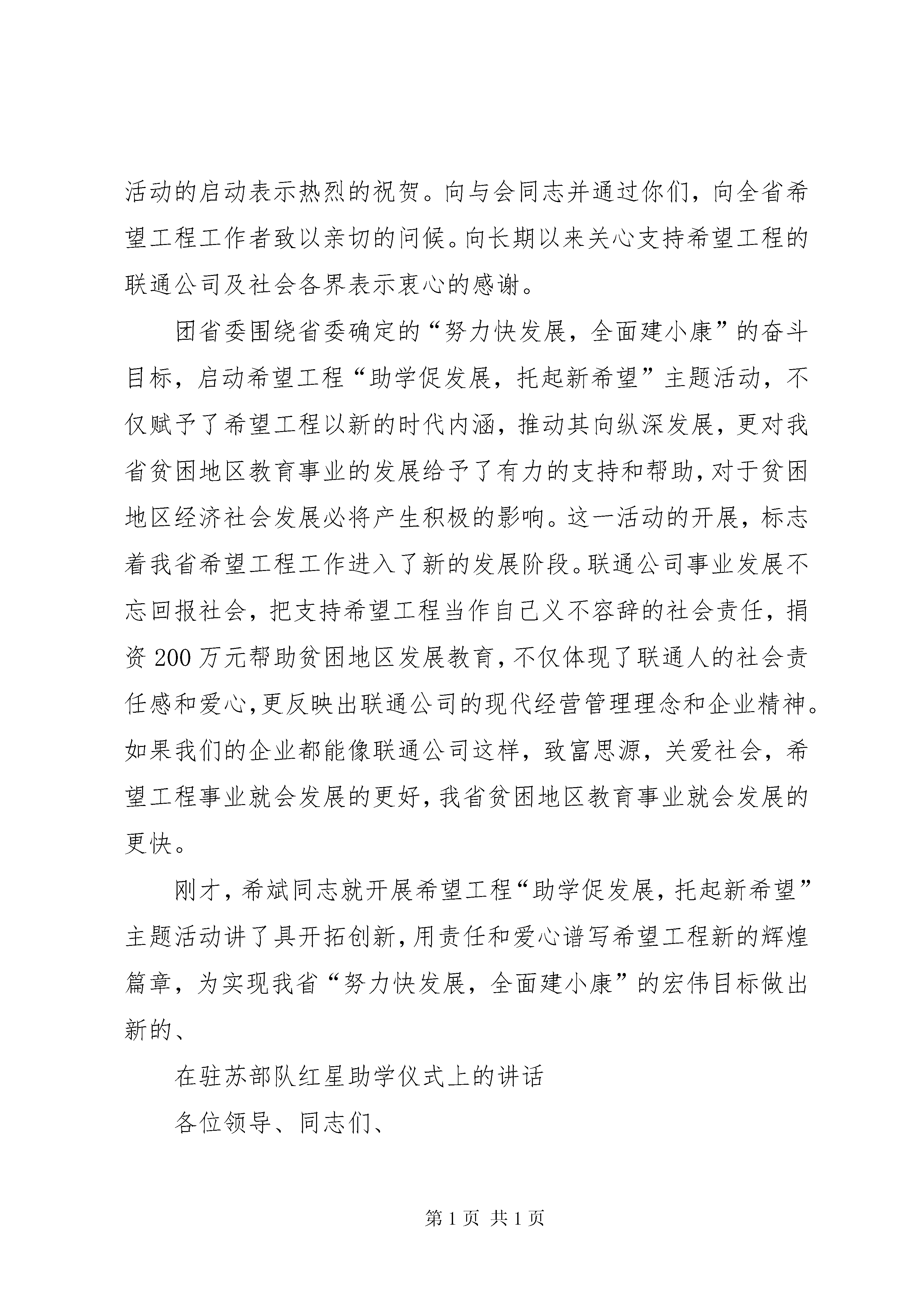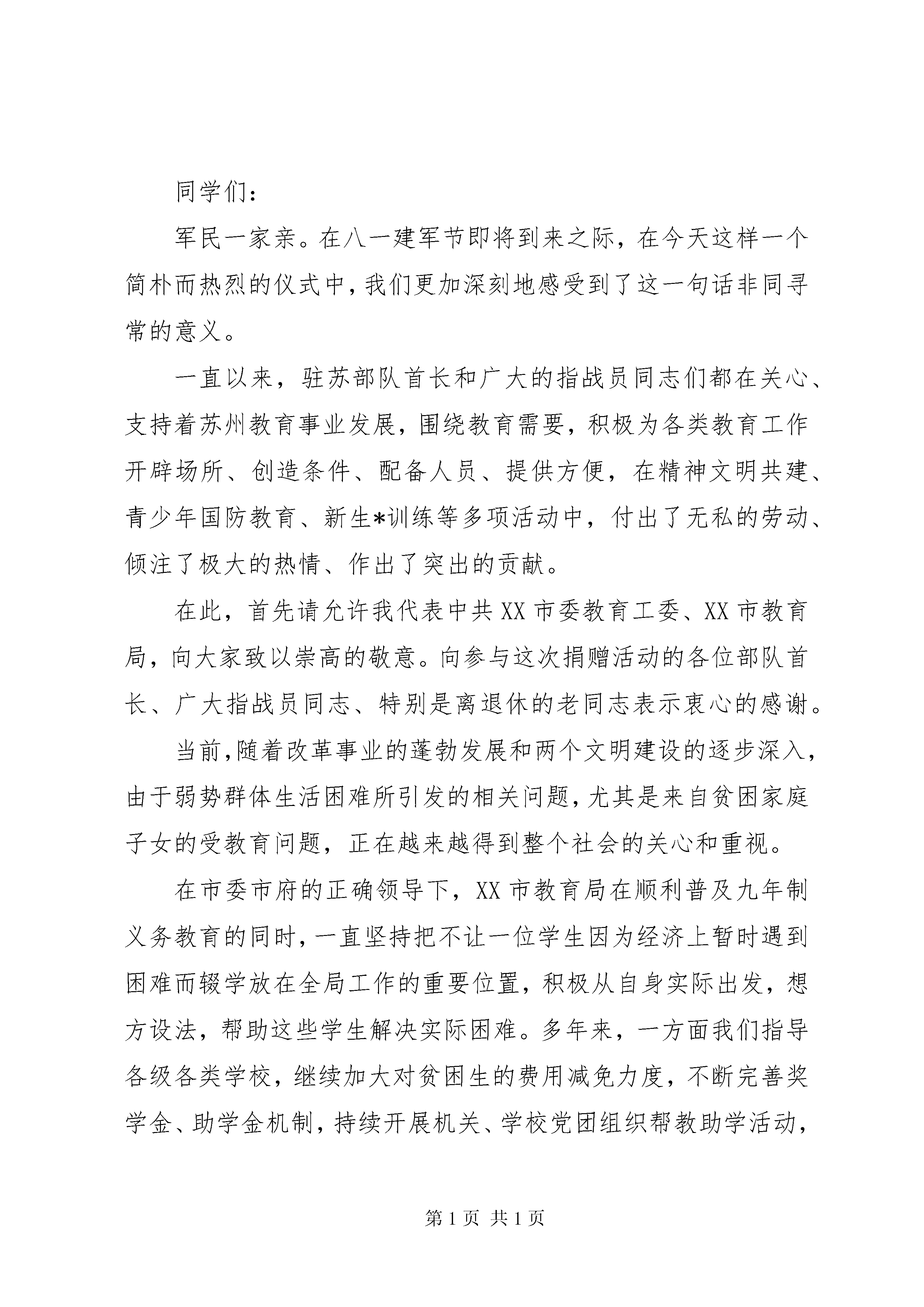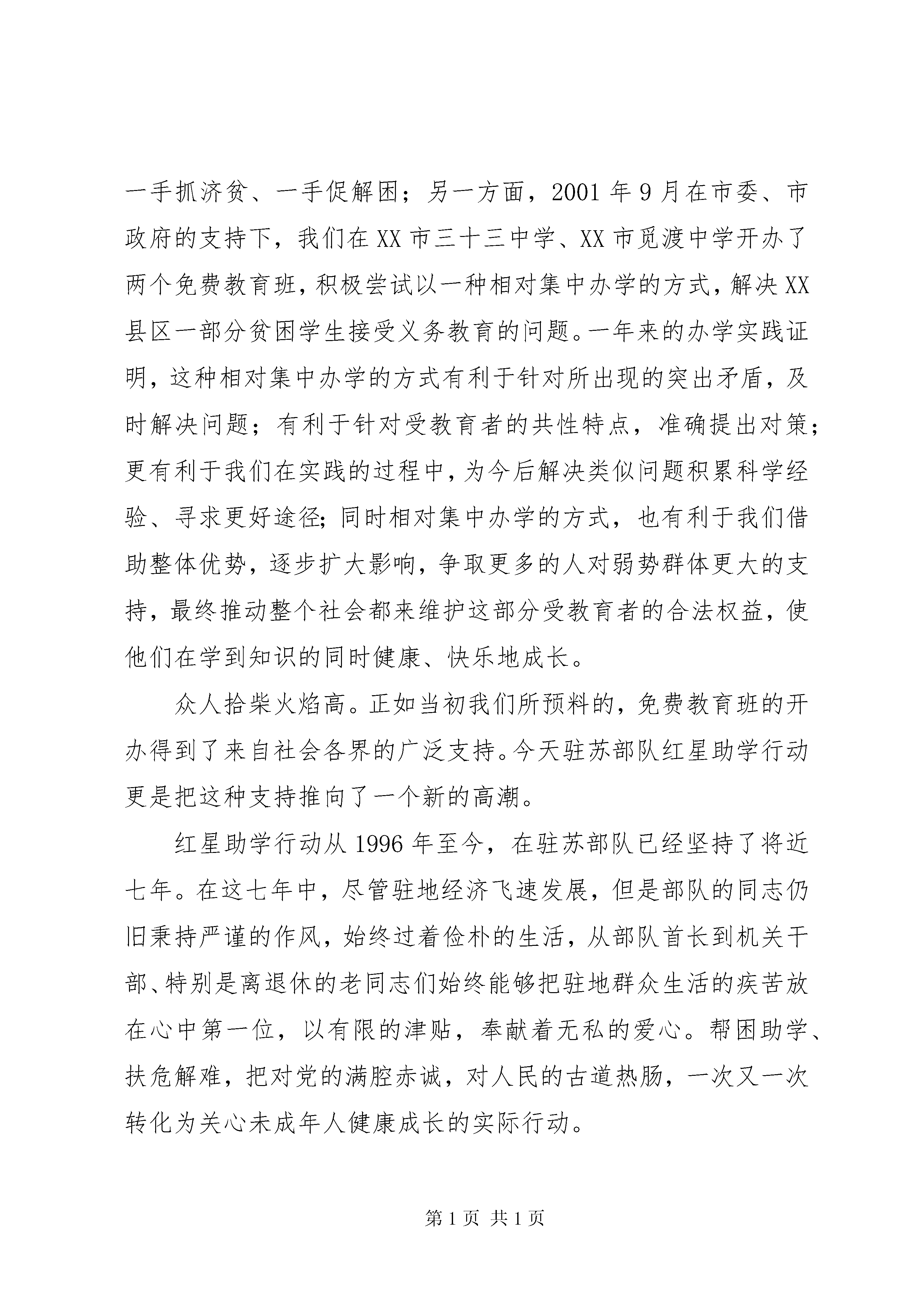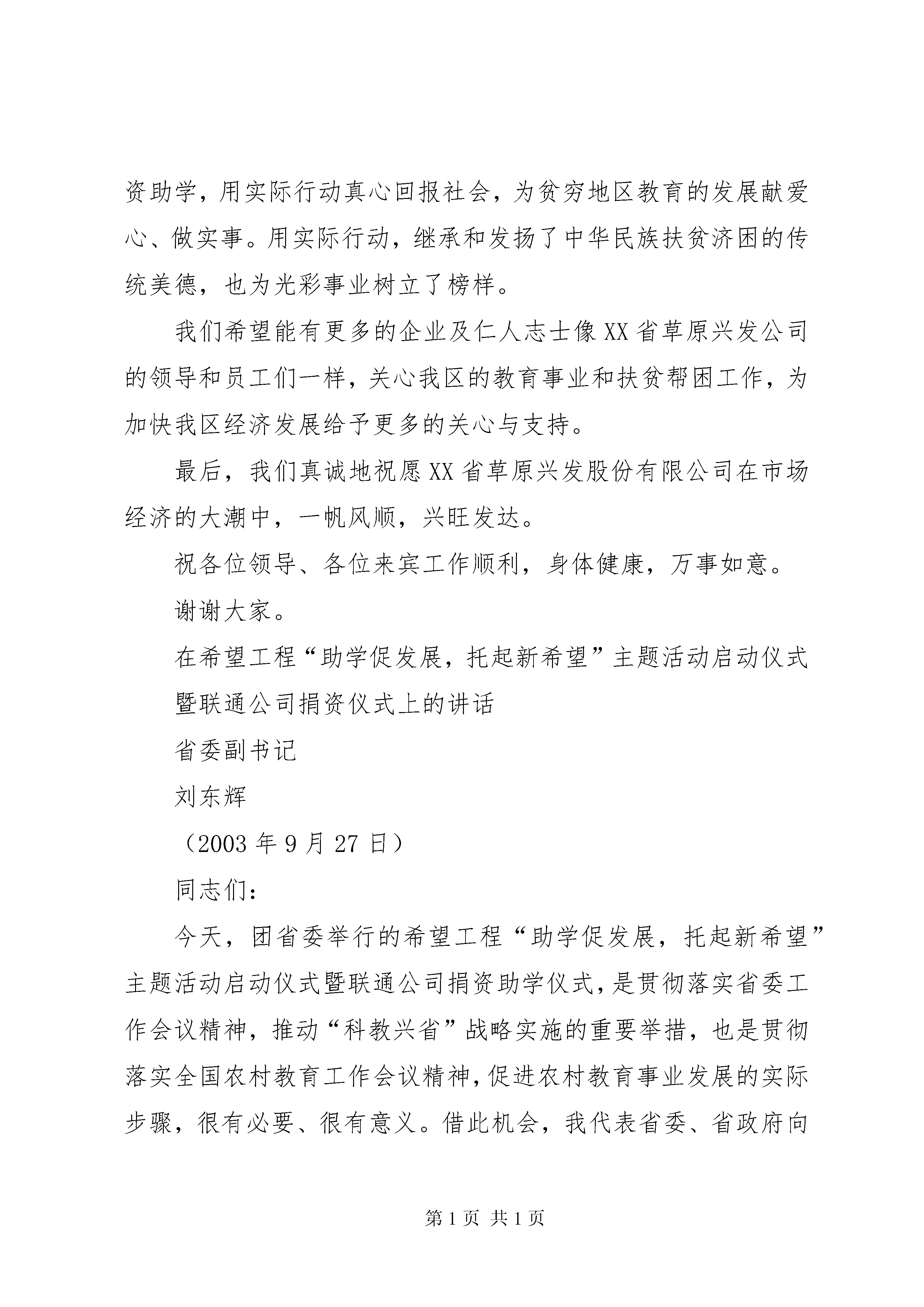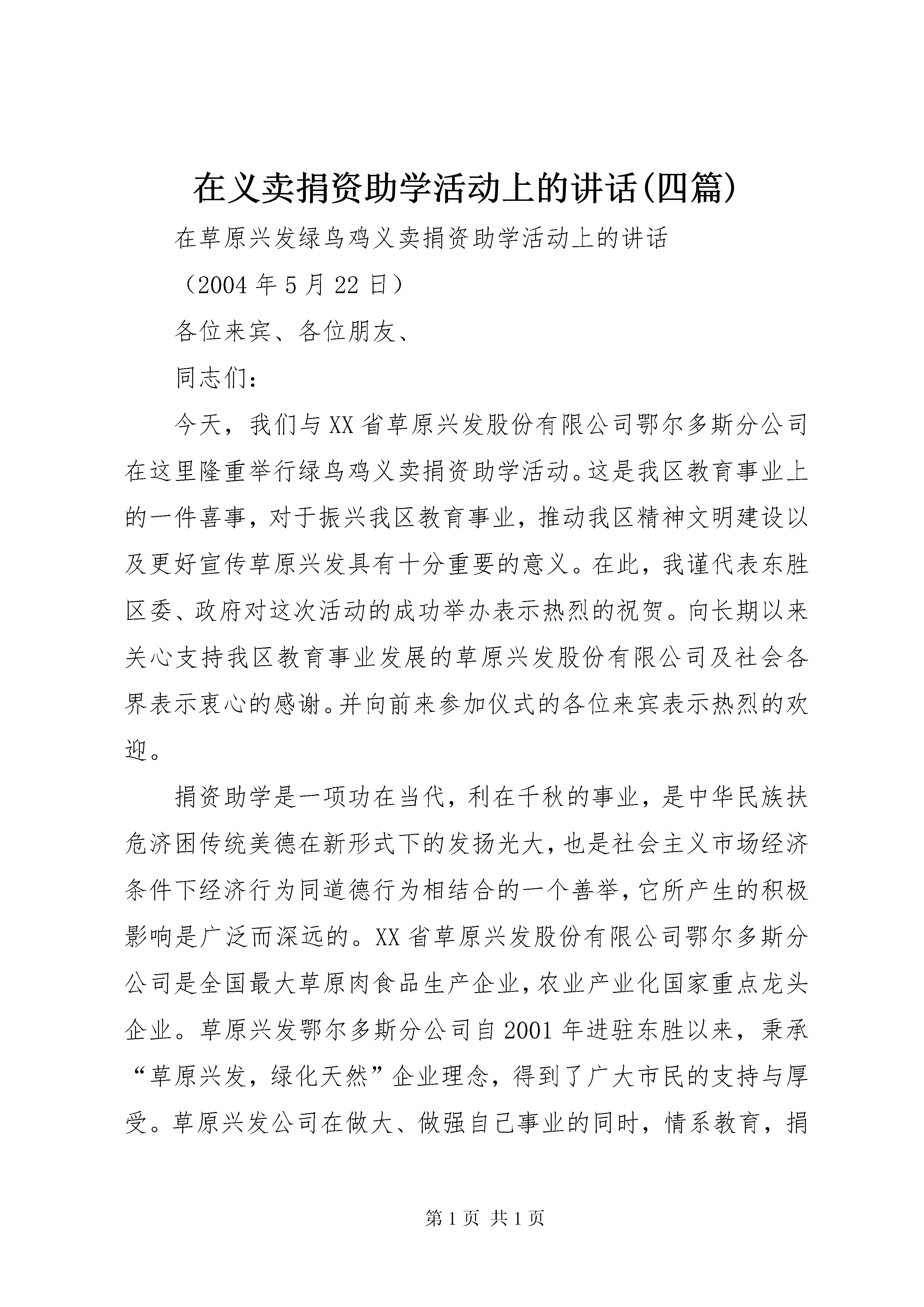 在义卖捐资助学活动上的讲话(四篇)在草原兴发绿鸟鸡义卖捐资助学活动上的讲话(2004年5月22日)各位来宾、各位朋友、同志们:今天,我们与XX省草原兴发股份有限公司鄂尔多斯分公司在这里隆重举行绿鸟鸡义卖捐资助学活动。这是我区教育事业上的一件喜事,对于振兴我区教育事业,推动我区精神文明建设以及更好宣传草原兴发具有十分重要的意义。在此,我谨代表东胜区委、政府对这次活动的成功举办表示热烈的祝贺。向长期以来关心支持我区教育事业发展的草原兴发股份有限公司及社会各界表示衷心的感谢。并向前来参加仪式的各位来宾表示热烈的欢迎。捐资助学是一项功在当代,利在千秋的事业,是中华民族扶危济困传统美德在新形式下的发扬光大,也是社会主义市场经济条件下经济行为同道德行为相结合的一个善举,它所产生的积极影响是广泛而深远的。XX省草原兴发股份有限公司鄂尔多斯分公司是全国最大草原肉食品生产企业,农业产业化国家重点龙头企业。草原兴发鄂尔多斯分公司自2001年进驻东胜以来,秉承“草原兴发,绿化天然”企业理念,得到了广大市民的支持与厚受。草原兴发公司在做大、做强自己事业的同时,情系教育,捐资助学,用实际行动真心回报社会,为贫穷地区教育的发展献爱心、做实事。用实际行动,继承和发扬了中华民族扶贫济困的传统美德,也为光彩事业树立了榜样。我们希望能有更多的企业及仁人志士像XX省草原兴发公司的领导和员工们一样,关心我区的教育事业和扶贫帮困工作,为加快我区经济发展给予更多的关心与支持。最后,我们真诚地祝愿XX省草原兴发股份有限公司在市场经济的大潮中,一帆风顺,兴旺发达。祝各位领导、各位来宾工作顺利,身体健康,万事如意。谢谢大家。在希望工程“助学促发展,托起新希望”主题活动启动仪式暨联通公司捐资仪式上的讲话省委副书记刘东辉(2003年9月27日)同志们:今天,团省委举行的希望工程“助学促发展,托起新希望”主题活动启动仪式暨联通公司捐资助学仪式,是贯彻落实省委工作会议精神,推动“科教兴省”战略实施的重要举措,也是贯彻落实全国农村教育工作会议精神,促进农村教育事业发展的实际步骤,很有必要、很有意义。借此机会,我代表省委、省政府向活动的启动表示热烈的祝贺。向与会同志并通过你们,向全省希望工程工作者致以亲切的问候。向长期以来关心支持希望工程的联通公司及社会各界表示衷心的感谢。团省委围绕省委确定的“努力快发展,全面建小康”的奋斗目标,启动希望工程“助学促发展,托起新希望”主题活动,不仅赋予了希望工程以新的时代内涵,推动其向纵深发展,更对我省贫困地区教育事业的发展给予了有力的支持和帮助,对于贫困地区经济社会发展必将产生积极的影响。这一活动的开展,标志着我省希望工程工作进入了新的发展阶段。联通公司事业发展不忘回报社会,把支持希望工程当作自己义不容辞的社会责任,捐资200万元帮助贫困地区发展教育,不仅体现了联通人的社会责任感和爱心,更反映出联通公司的现代经营管理理念和企业精神。如果我们的企业都能像联通公司这样,致富思源,关爱社会,希望工程事业就会发展的更好,我省贫困地区教育事业就会发展的更快。刚才,希斌同志就开展希望工程“助学促发展,托起新希望”主题活动讲了具开拓创新,用责任和爱心谱写希望工程新的辉煌篇章,为实现我省“努力快发展,全面建小康”的宏伟目标做出新的、在驻苏部队红星助学仪式上的讲话各位领导、同志们、同学们:军民一家亲。在八一建军节即将到来之际,在今天这样一个简朴而热烈的仪式中,我们更加深刻地感受到了这一句话非同寻常的意义。一直以来,驻苏部队首长和广大的指战员同志们都在关心、支持着苏州教育事业发展,围绕教育需要,积极为各类教育工作开辟场所、创造条件、配备人员、提供方便,在精神文明共建、青少年国防教育、新生*训练等多项活动中,付出了无私的劳动、倾注了极大的热情、作出了突出的贡献。在此,首先请允许我代表中共XX市委教育工委、XX市教育局,向大家致以崇高的敬意。向参与这次捐赠活动的各位部队首长、广大指战员同志、特别是离退休的老同志表示衷心的感谢。当前,随着改革事业的蓬勃发展和两个文明建设的逐步深入,由于弱势群体生活困难所引发的相关问题,尤其是来自贫困家庭子女的受教育问题,正在越来越得到整个社会的关心和重视。在市委市府的正确领导下,XX市教育局在顺利普及九年制义务教育的同时,一直坚持把不让一位学生因为经济上暂时遇到困难而辍学放在全局工作的重要位置,积极从自身实际出发,想方设法,帮助这些学生解决实际困难。多年来,一方面我们指导各级各类学校,继续加大对贫困生的费用减免力度,不断完善奖学金、助学金机制,持续开展机关、学校党团组织帮教助学活动,一手抓济贫、一手促解困;另一方面,2001年9月在市委、市政府的支持下,我们在XX市三十三中学、XX市觅渡中学开办了两个免费教育班,积极尝