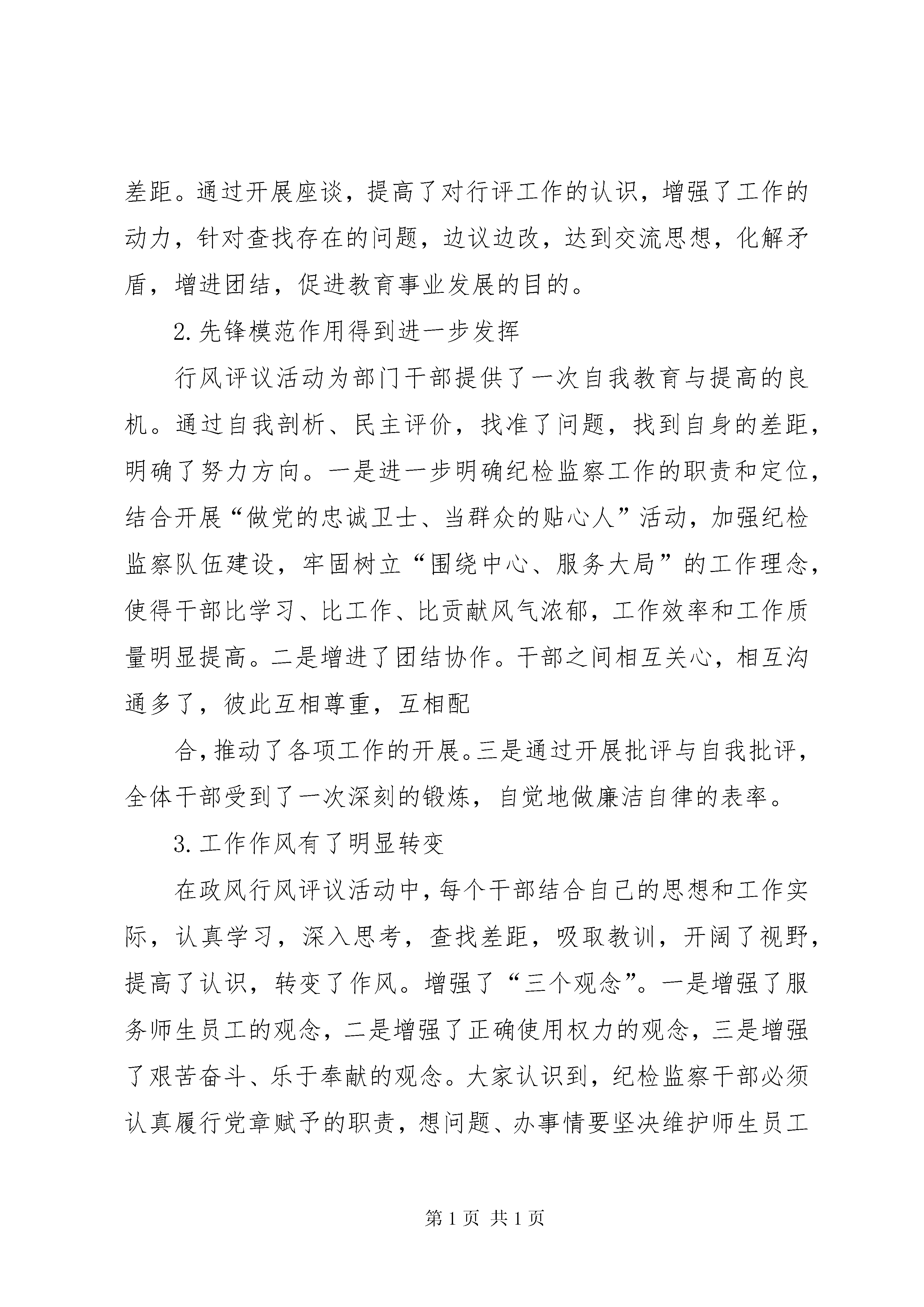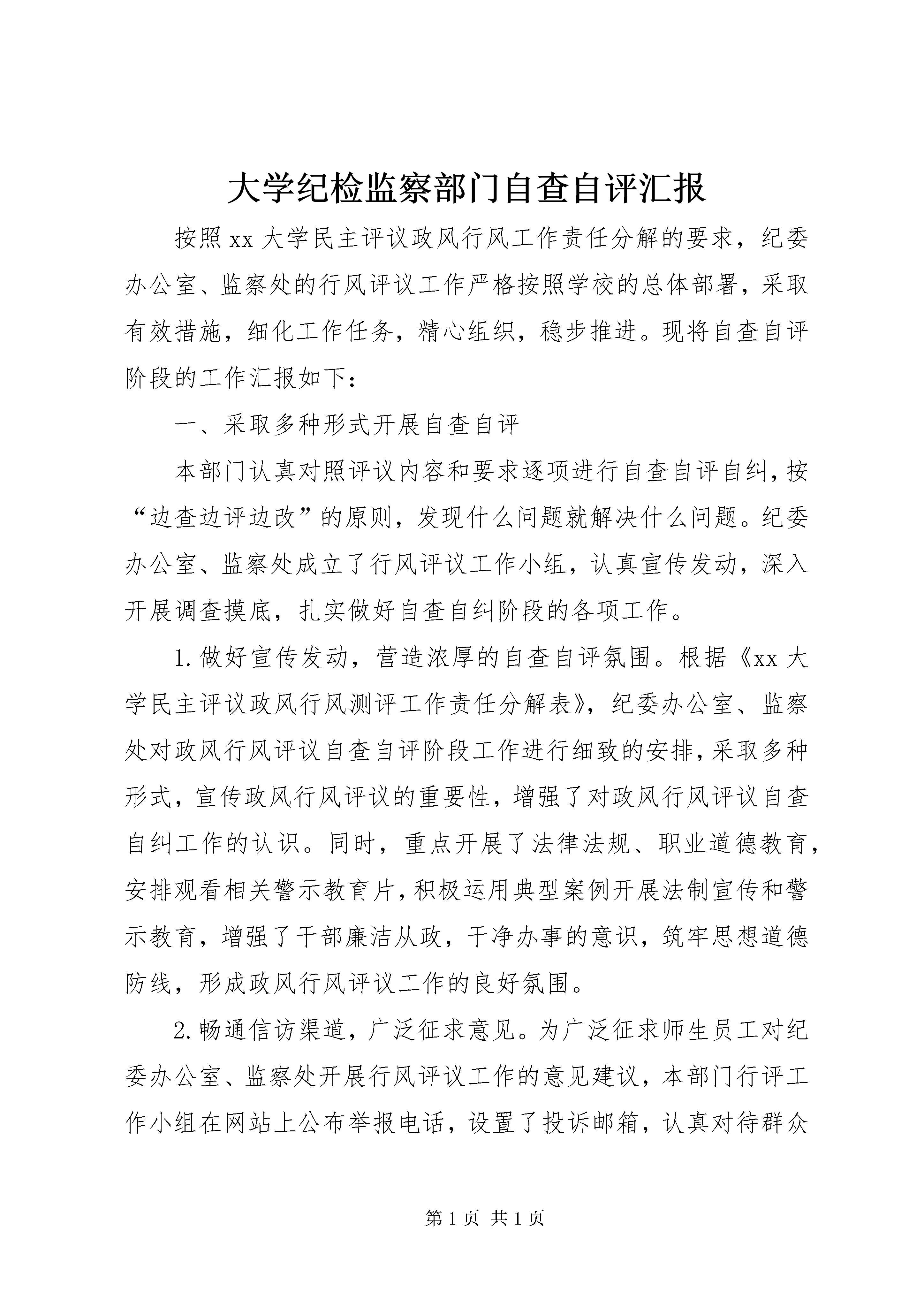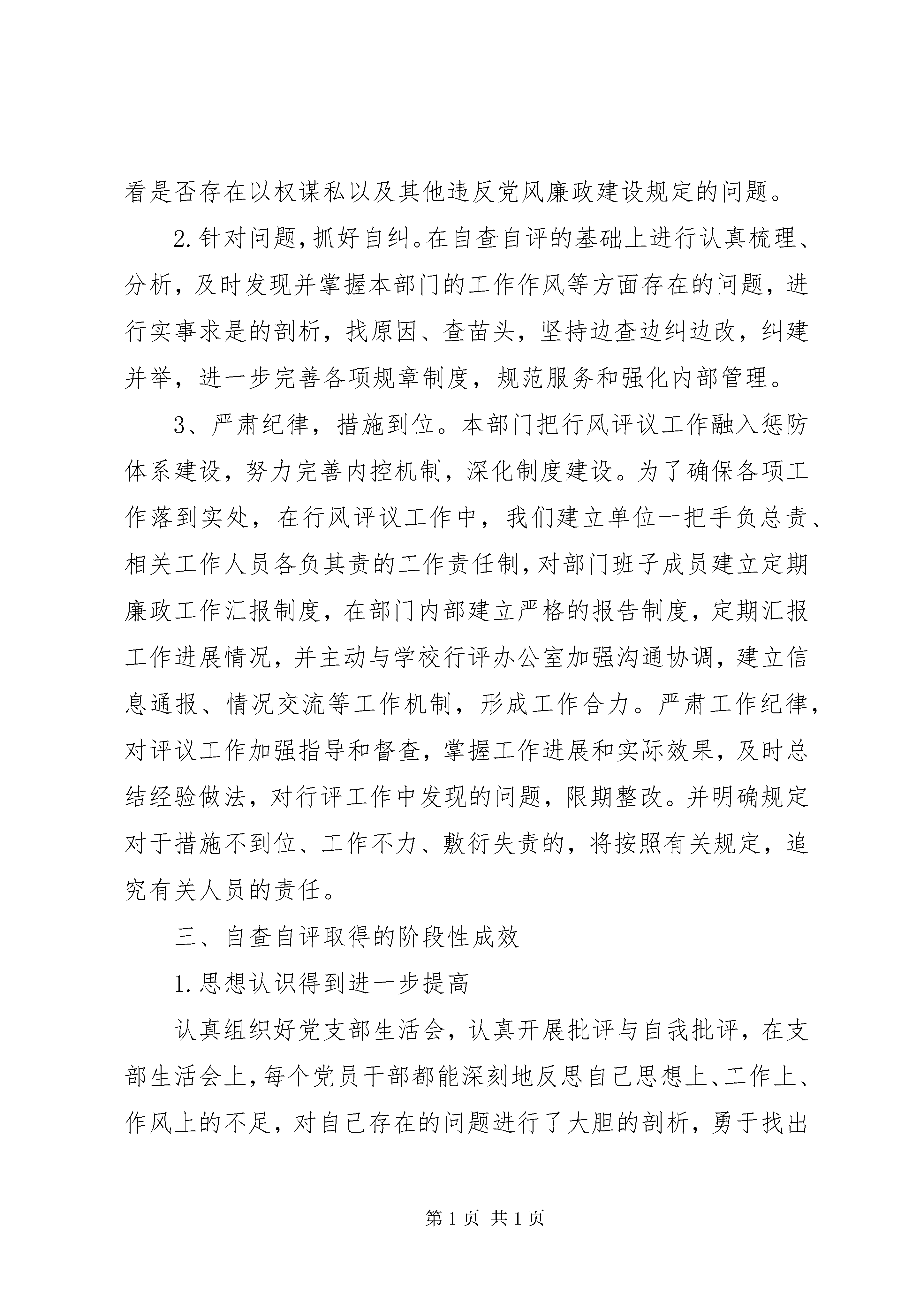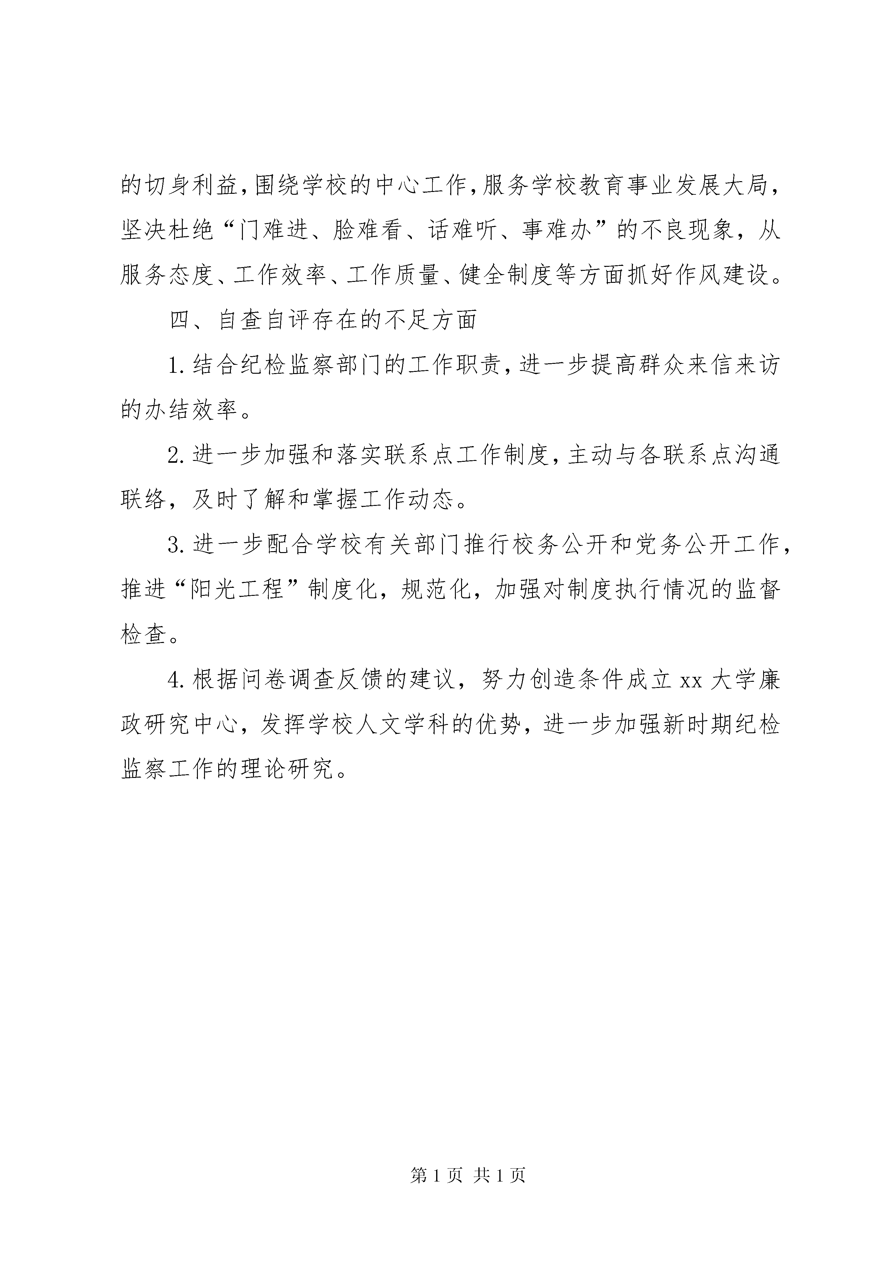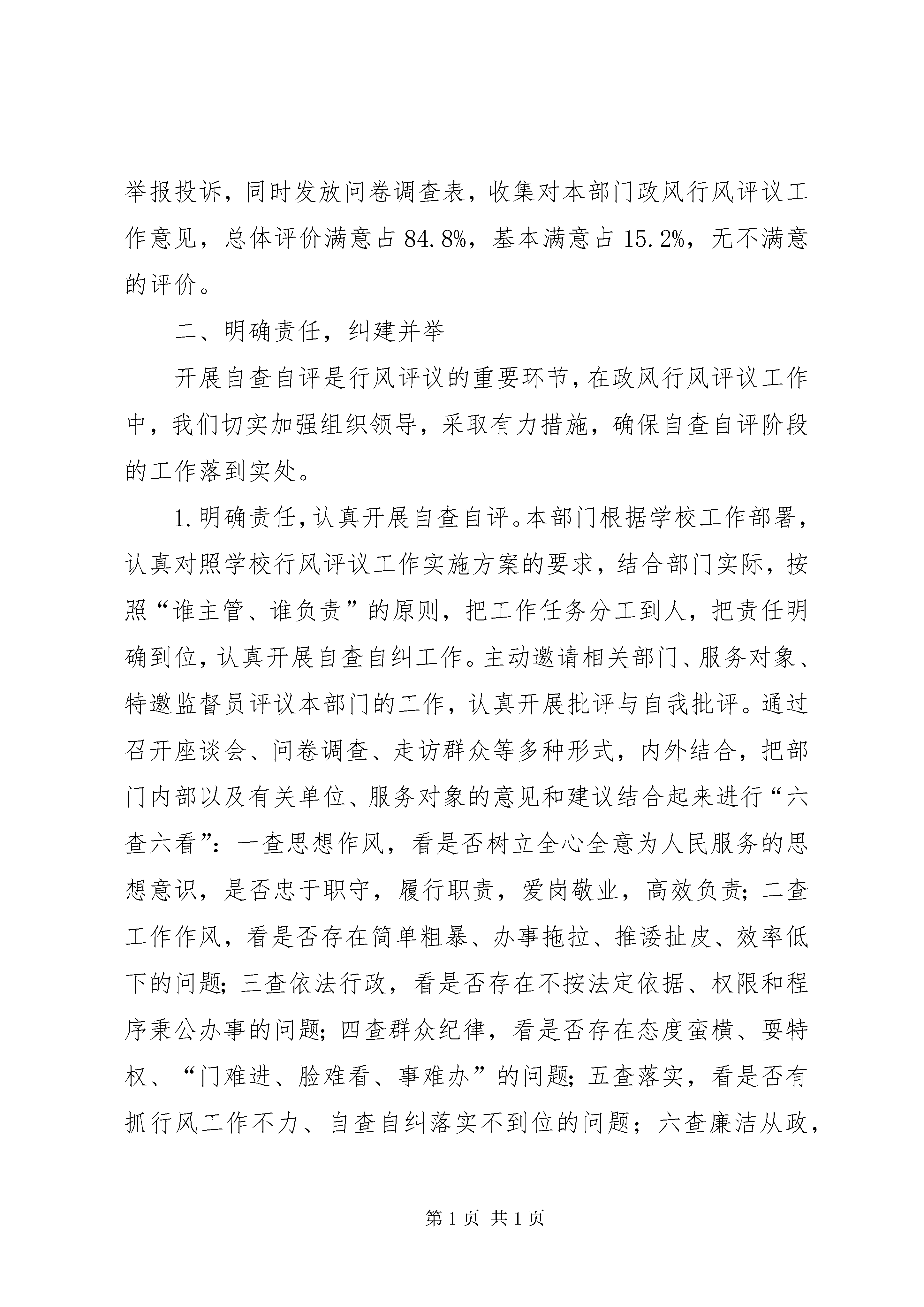 大学纪检监察部门自查自评汇报按照xx大学民主评议政风行风工作责任分解的要求,纪委办公室、监察处的行风评议工作严格按照学校的总体部署,采取有效措施,细化工作任务,精心组织,稳步推进。现将自查自评阶段的工作汇报如下:一、采取多种形式开展自查自评本部门认真对照评议内容和要求逐项进行自查自评自纠,按“边查边评边改”的原则,发现什么问题就解决什么问题。纪委办公室、监察处成立了行风评议工作小组,认真宣传发动,深入开展调查摸底,扎实做好自查自纠阶段的各项工作。1.做好宣传发动,营造浓厚的自查自评氛围。根据《xx大学民主评议政风行风测评工作责任分解表》,纪委办公室、监察处对政风行风评议自查自评阶段工作进行细致的安排,采取多种形式,宣传政风行风评议的重要性,增强了对政风行风评议自查自纠工作的认识。同时,重点开展了法律法规、职业道德教育,安排观看相关警示教育片,积极运用典型案例开展法制宣传和警示教育,增强了干部廉洁从政,干净办事的意识,筑牢思想道德防线,形成政风行风评议工作的良好氛围。2.畅通信访渠道,广泛征求意见。为广泛征求师生员工对纪委办公室、监察处开展行风评议工作的意见建议,本部门行评工作小组在网站上公布举报电话,设置了投诉邮箱,认真对待群众举报投诉,同时发放问卷调查表,收集对本部门政风行风评议工作意见,总体评价满意占84.8%,基本满意占15.2%,无不满意的评价。二、明确责任,纠建并举开展自查自评是行风评议的重要环节,在政风行风评议工作中,我们切实加强组织领导,采取有力措施,确保自查自评阶段的工作落到实处。1.明确责任,认真开展自查自评。本部门根据学校工作部署,认真对照学校行风评议工作实施方案的要求,结合部门实际,按照“谁主管、谁负责”的原则,把工作任务分工到人,把责任明确到位,认真开展自查自纠工作。主动邀请相关部门、服务对象、特邀监督员评议本部门的工作,认真开展批评与自我批评。通过召开座谈会、问卷调查、走访群众等多种形式,内外结合,把部门内部以及有关单位、服务对象的意见和建议结合起来进行“六查六看”:一查思想作风,看是否树立全心全意为人民服务的思想意识,是否忠于职守,履行职责,爱岗敬业,高效负责;二查工作作风,看是否存在简单粗暴、办事拖拉、推诿扯皮、效率低下的问题;三查依法行政,看是否存在不按法定依据、权限和程序秉公办事的问题;四查群众纪律,看是否存在态度蛮横、耍特权、“门难进、脸难看、事难办”的问题;五查落实,看是否有抓行风工作不力、自查自纠落实不到位的问题;六查廉洁从政,看是否存在以权谋私以及其他违反党风廉政建设规定的问题。2.针对问题,抓好自纠。在自查自评的基础上进行认真梳理、分析,及时发现并掌握本部门的工作作风等方面存在的问题,进行实事求是的剖析,找原因、查苗头,坚持边查边纠边改,纠建并举,进一步完善各项规章制度,规范服务和强化内部管理。3、严肃纪律,措施到位。本部门把行风评议工作融入惩防体系建设,努力完善内控机制,深化制度建设。为了确保各项工作落到实处,在行风评议工作中,我们建立单位一把手负总责、相关工作人员各负其责的工作责任制,对部门班子成员建立定期廉政工作汇报制度,在部门内部建立严格的报告制度,定期汇报工作进展情况,并主动与学校行评办公室加强沟通协调,建立信息通报、情况交流等工作机制,形成工作合力。严肃工作纪律,对评议工作加强指导和督查,掌握工作进展和实际效果,及时总结经验做法,对行评工作中发现的问题,限期整改。并明确规定对于措施不到位、工作不力、敷衍失责的,将按照有关规定,追究有关人员的责任。三、自查自评取得的阶段性成效1.思想认识得到进一步提高认真组织好党支部生活会,认真开展批评与自我批评,在支部生活会上,每个党员干部都能深刻地反思自己思想上、工作上、作风上的不足,对自己存在的问题进行了大胆的剖析,勇于找出差距。通过开展座谈,提高了对行评工作的认识,增强了工作的动力,针对查找存在的问题,边议边改,达到交流思想,化解矛盾,增进团结,促进教育事业发展的目的。2.先锋模范作用得到进一步发挥行风评议活动为部门干部提供了一次自我教育与提高的良机。通过自我剖析、民主评价,找准了问题,找到自身的差距,明确了努力方向。一是进一步明确纪检监察工作的职责和定位,结合开展“做党的忠诚卫士、当群众的贴心人”活动,加强纪检监察队伍建设,牢固树立“围绕中心、服务大局”的工作理念,使得干部比学习、比工作、比贡献风气浓郁,工作效率和工作质量明显提高。二是增进了团结协作。干部之间相互关心,相互沟通多了,彼此互相尊重,互相配合,推动了各项工作的开展。三是通过开展批评与自我批评,全体干部受到了一次深刻的锻炼,自觉地做廉洁自律的表率。3.工作作风有了明显转变在政风行风评议活动中,每个干部结合自己的思想和工作实际,认真学习,深入思考