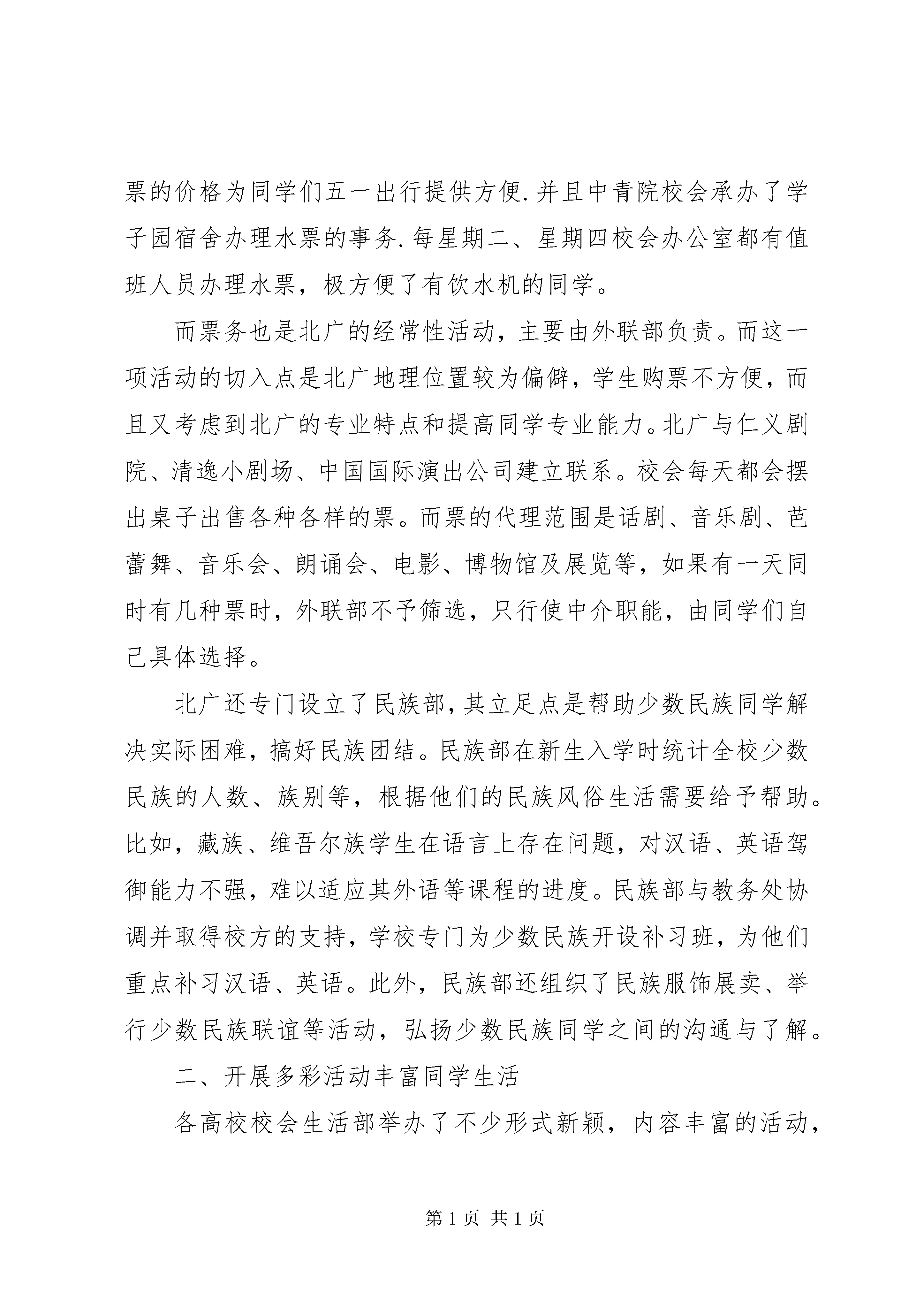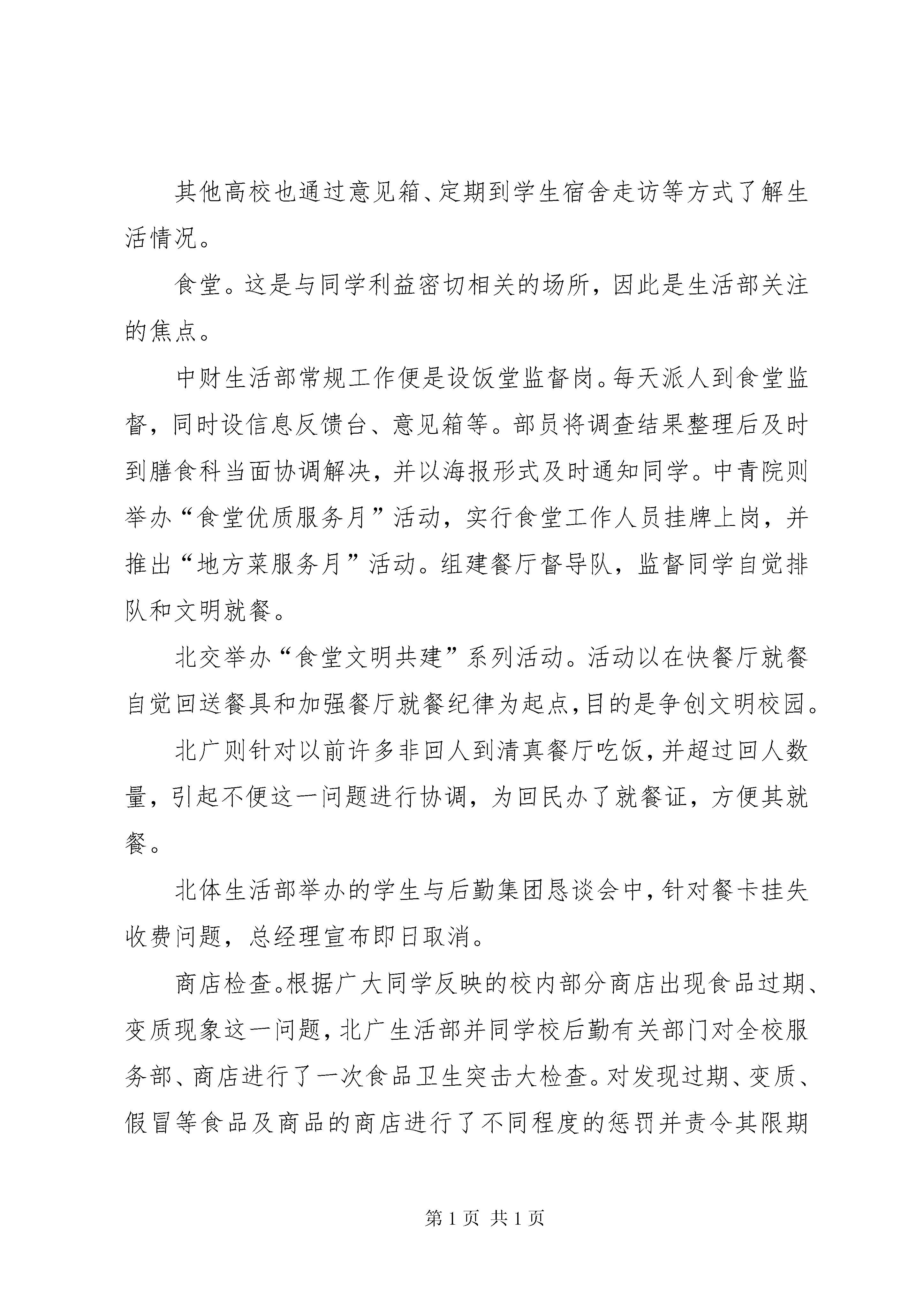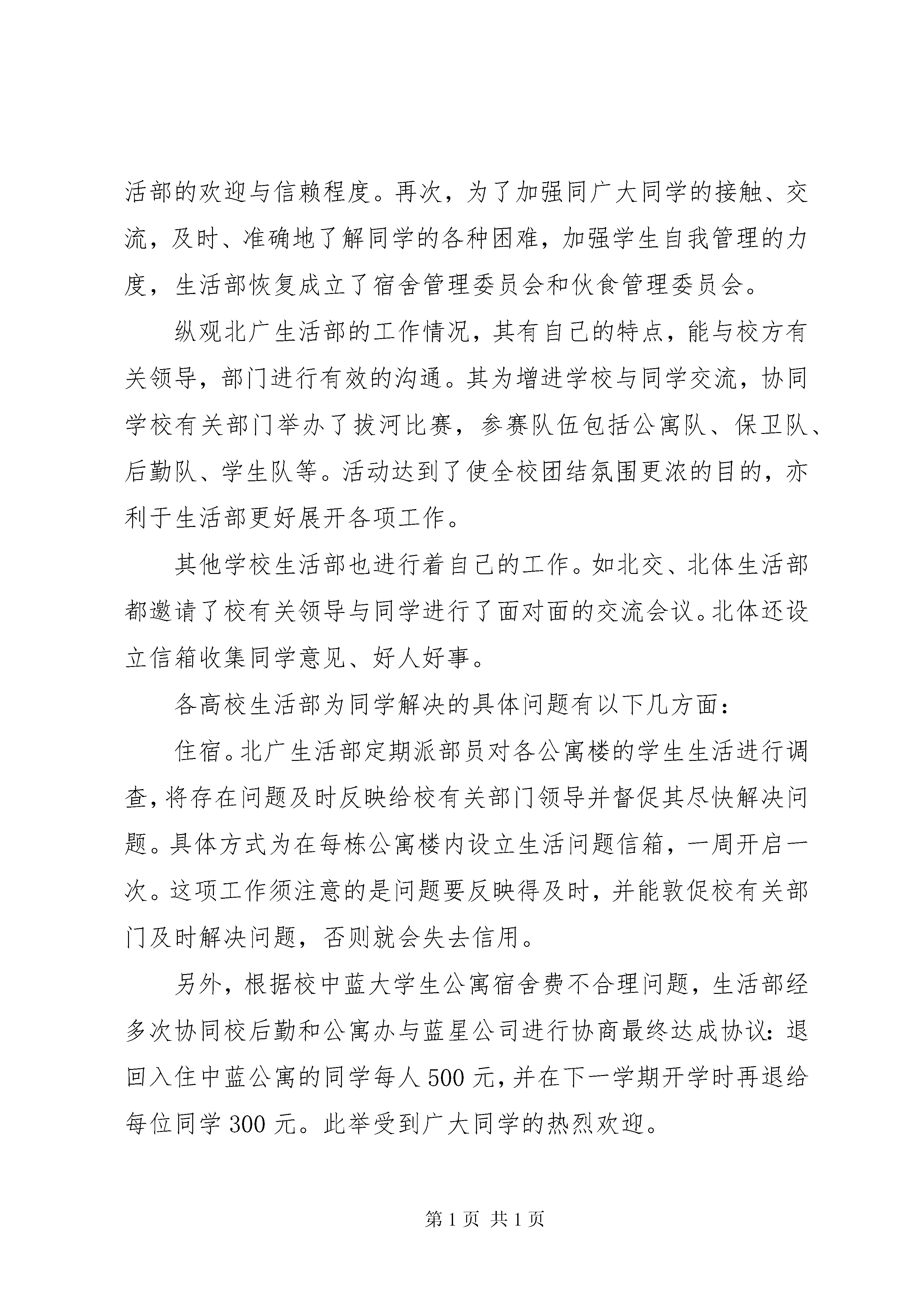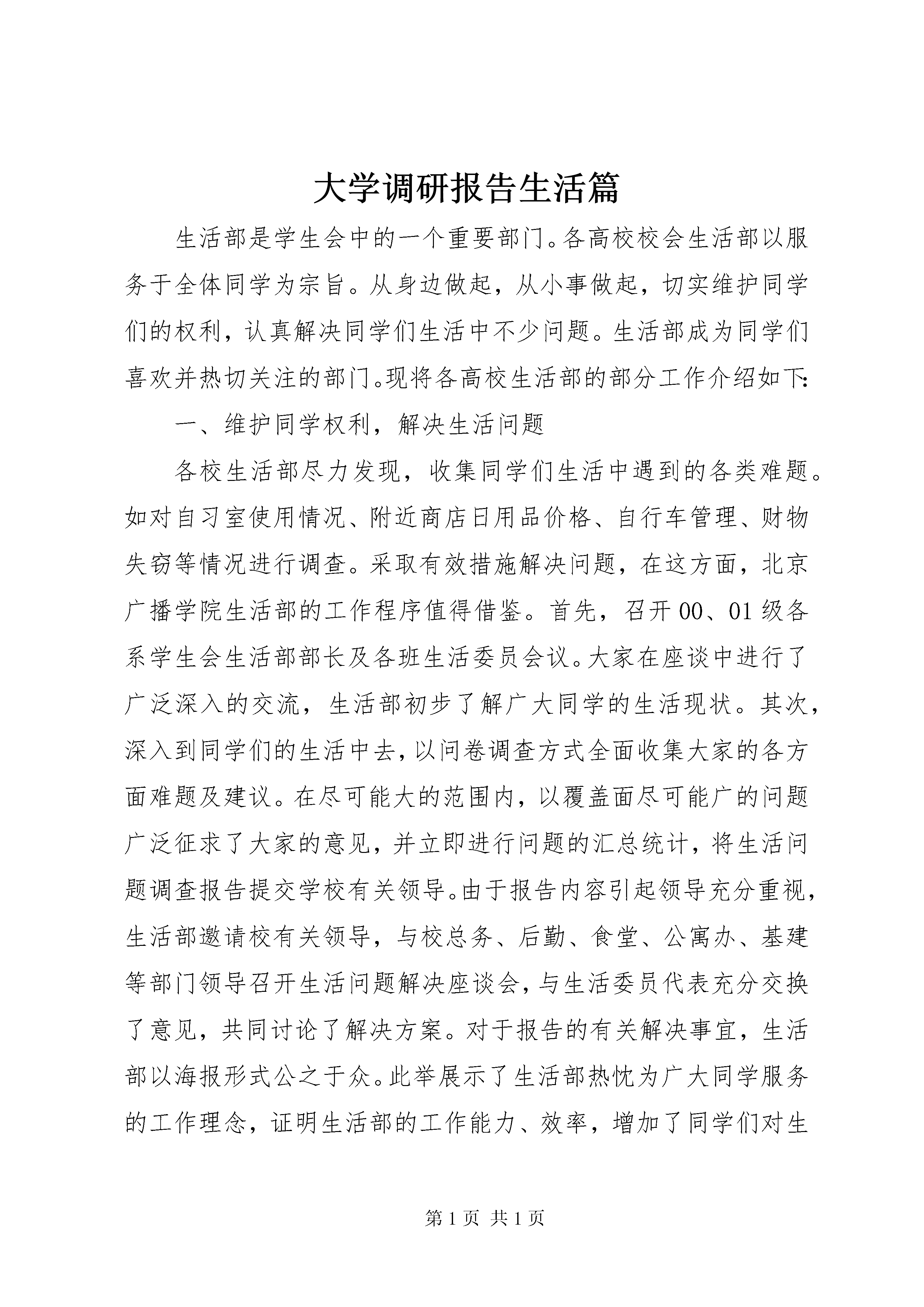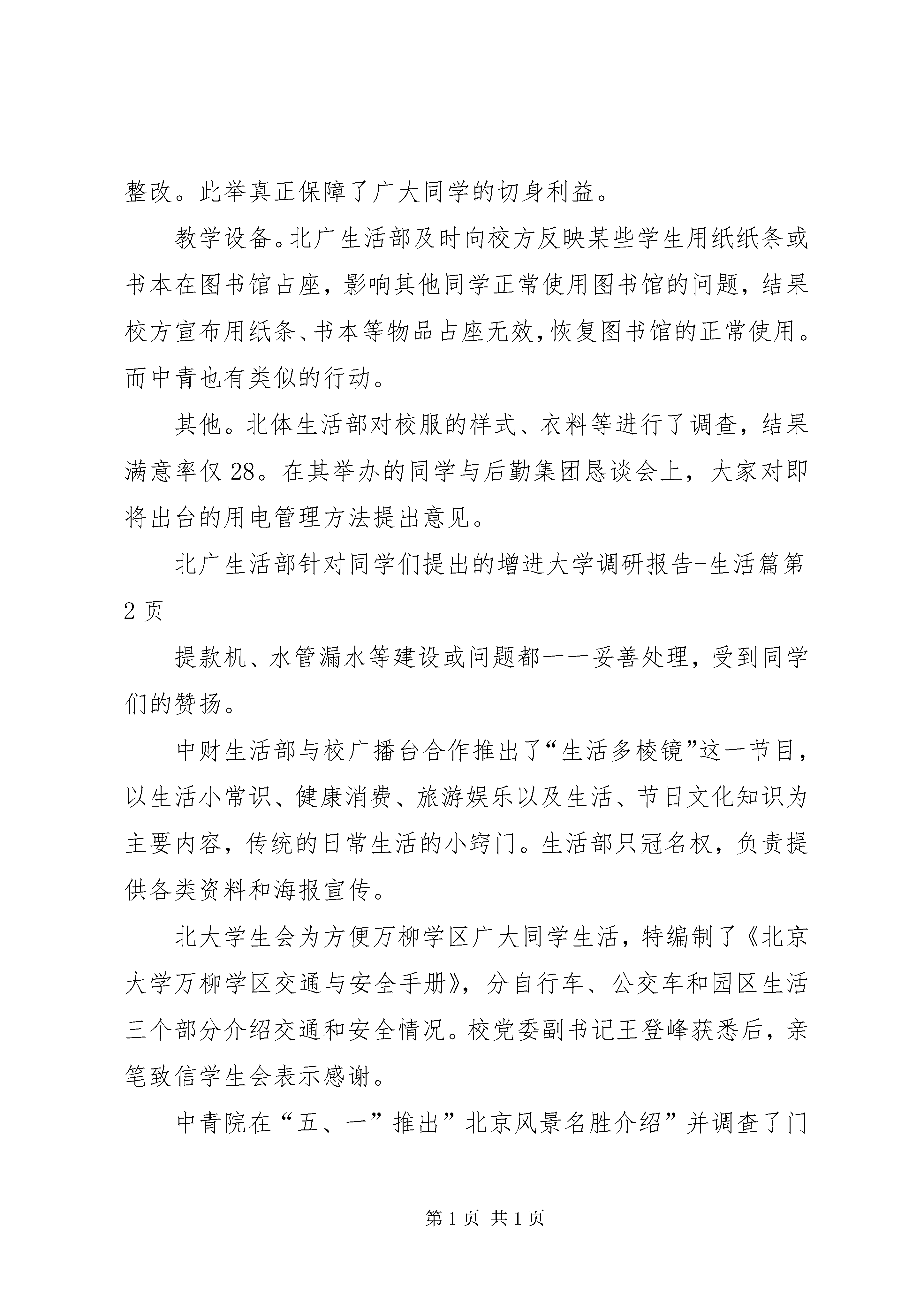 大学调研报告生活篇生活部是学生会中的一个重要部门。各高校校会生活部以服务于全体同学为宗旨。从身边做起,从小事做起,切实维护同学们的权利,认真解决同学们生活中不少问题。生活部成为同学们喜欢并热切关注的部门。现将各高校生活部的部分工作介绍如下:一、维护同学权利,解决生活问题各校生活部尽力发现,收集同学们生活中遇到的各类难题。如对自习室使用情况、附近商店日用品价格、自行车管理、财物失窃等情况进行调查。采取有效措施解决问题,在这方面,北京广播学院生活部的工作程序值得借鉴。首先,召开00、01级各系学生会生活部部长及各班生活委员会议。大家在座谈中进行了广泛深入的交流,生活部初步了解广大同学的生活现状。其次,深入到同学们的生活中去,以问卷调查方式全面收集大家的各方面难题及建议。在尽可能大的范围内,以覆盖面尽可能广的问题广泛征求了大家的意见,并立即进行问题的汇总统计,将生活问题调查报告提交学校有关领导。由于报告内容引起领导充分重视,生活部邀请校有关领导,与校总务、后勤、食堂、公寓办、基建等部门领导召开生活问题解决座谈会,与生活委员代表充分交换了意见,共同讨论了解决方案。对于报告的有关解决事宜,生活部以海报形式公之于众。此举展示了生活部热忱为广大同学服务的工作理念,证明生活部的工作能力、效率,增加了同学们对生活部的欢迎与信赖程度。再次,为了加强同广大同学的接触、交流,及时、准确地了解同学的各种困难,加强学生自我管理的力度,生活部恢复成立了宿舍管理委员会和伙食管理委员会。纵观北广生活部的工作情况,其有自己的特点,能与校方有关领导,部门进行有效的沟通。其为增进学校与同学交流,协同学校有关部门举办了拔河比赛,参赛队伍包括公寓队、保卫队、后勤队、学生队等。活动达到了使全校团结氛围更浓的目的,亦利于生活部更好展开各项工作。其他学校生活部也进行着自己的工作。如北交、北体生活部都邀请了校有关领导与同学进行了面对面的交流会议。北体还设立信箱收集同学意见、好人好事。各高校生活部为同学解决的具体问题有以下几方面:住宿。北广生活部定期派部员对各公寓楼的学生生活进行调查,将存在问题及时反映给校有关部门领导并督促其尽快解决问题。具体方式为在每栋公寓楼内设立生活问题信箱,一周开启一次。这项工作须注意的是问题要反映得及时,并能敦促校有关部门及时解决问题,否则就会失去信用。另外,根据校中蓝大学生公寓宿舍费不合理问题,生活部经多次协同校后勤和公寓办与蓝星公司进行协商最终达成协议:退回入住中蓝公寓的同学每人500元,并在下一学期开学时再退给每位同学300元。此举受到广大同学的热烈欢迎。其他高校也通过意见箱、定期到学生宿舍走访等方式了解生活情况。食堂。这是与同学利益密切相关的场所,因此是生活部关注的焦点。中财生活部常规工作便是设饭堂监督岗。每天派人到食堂监督,同时设信息反馈台、意见箱等。部员将调查结果整理后及时到膳食科当面协调解决,并以海报形式及时通知同学。中青院则举办“食堂优质服务月”活动,实行食堂工作人员挂牌上岗,并推出“地方菜服务月”活动。组建餐厅督导队,监督同学自觉排队和文明就餐。北交举办“食堂文明共建”系列活动。活动以在快餐厅就餐自觉回送餐具和加强餐厅就餐纪律为起点,目的是争创文明校园。北广则针对以前许多非回人到清真餐厅吃饭,并超过回人数量,引起不便这一问题进行协调,为回民办了就餐证,方便其就餐。北体生活部举办的学生与后勤集团恳谈会中,针对餐卡挂失收费问题,总经理宣布即日取消。商店检查。根据广大同学反映的校内部分商店出现食品过期、变质现象这一问题,北广生活部并同学校后勤有关部门对全校服务部、商店进行了一次食品卫生突击大检查。对发现过期、变质、假冒等食品及商品的商店进行了不同程度的惩罚并责令其限期整改。此举真正保障了广大同学的切身利益。教学设备。北广生活部及时向校方反映某些学生用纸纸条或书本在图书馆占座,影响其他同学正常使用图书馆的问题,结果校方宣布用纸条、书本等物品占座无效,恢复图书馆的正常使用。而中青也有类似的行动。其他。北体生活部对校服的样式、衣料等进行了调查,结果满意率仅28。在其举办的同学与后勤集团恳谈会上,大家对即将出台的用电管理方法提出意见。北广生活部针对同学们提出的增进大学调研报告-生活篇提款机、水管漏水等建设或问题都一一妥善处理,受到同学们的赞扬。中财生活部与校广播台合作推出了“生活多棱镜”这一节目,以生活小常识、健康消费、旅游娱乐以及生活、节日文化知识为主要内容,传统的日常生活的小窍门。生活部只冠名权,负责提供各类资料和海报宣传。北大学生会为方便万柳学区广大同学生活,特编制了《北京大学万柳学区交通与安全手册》,分自行车、公交车和园区生活三个部分介绍交通和安全情况。校党委副书记王登峰获悉后,亲笔致信学生会表示感谢。中青院在