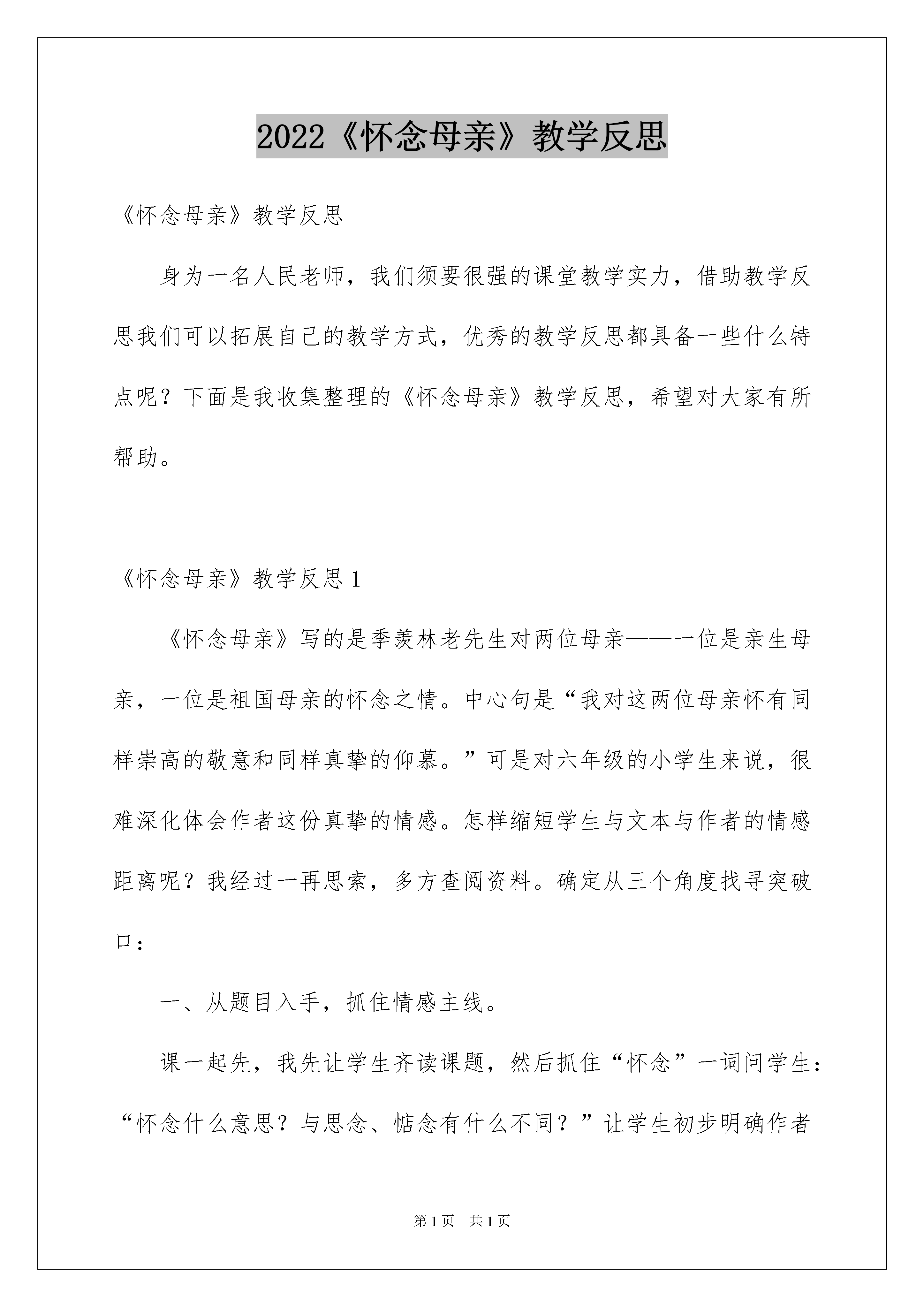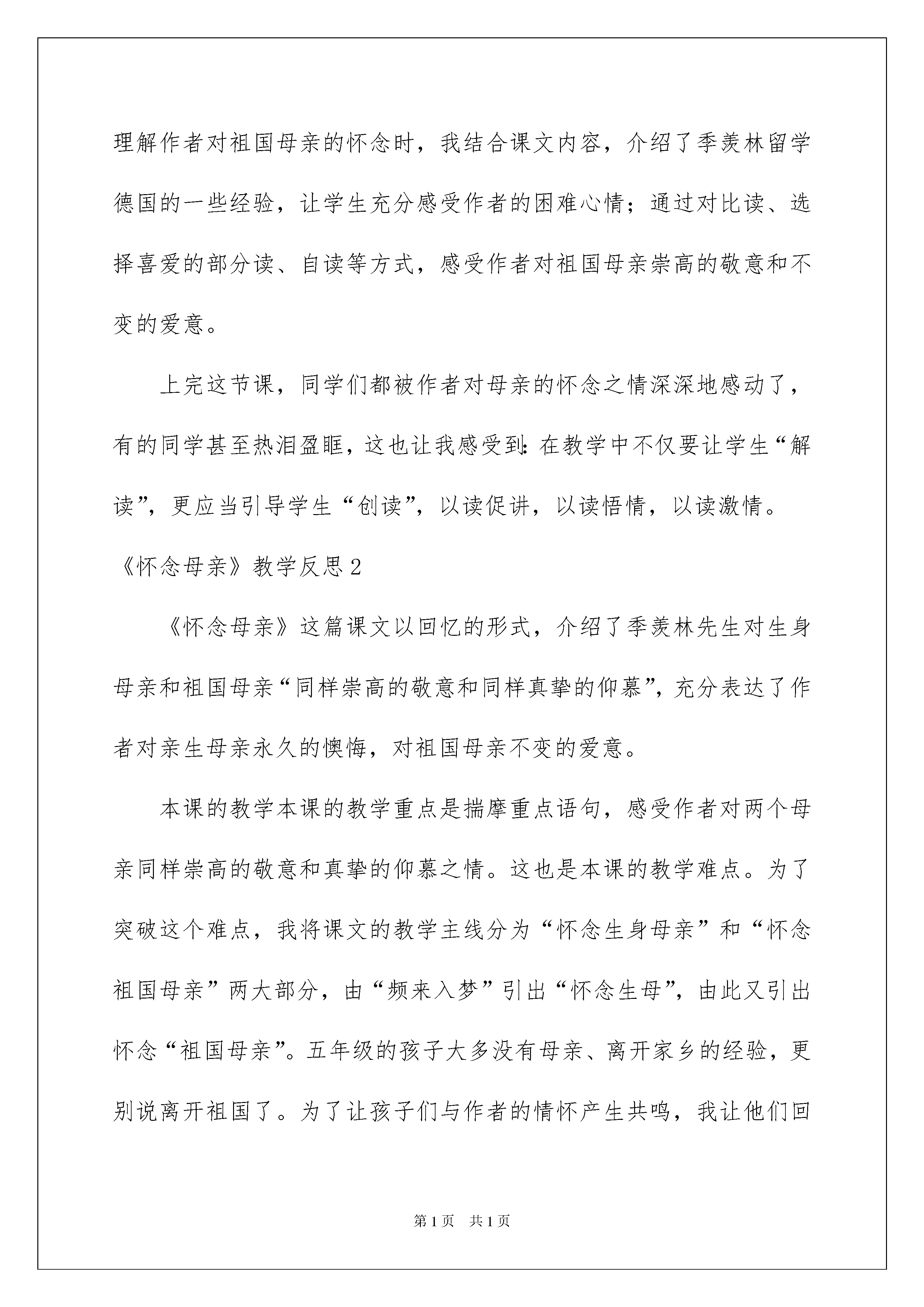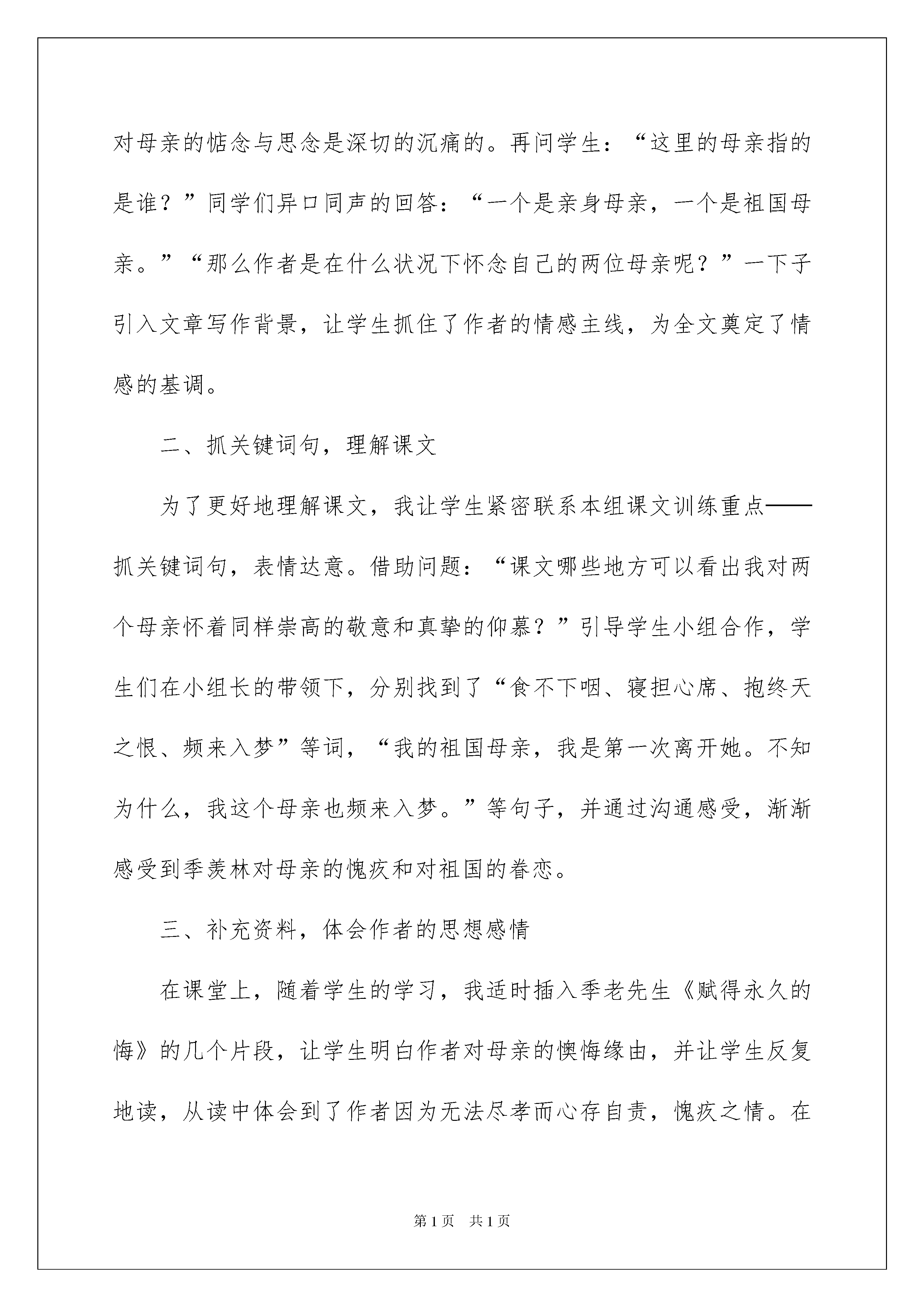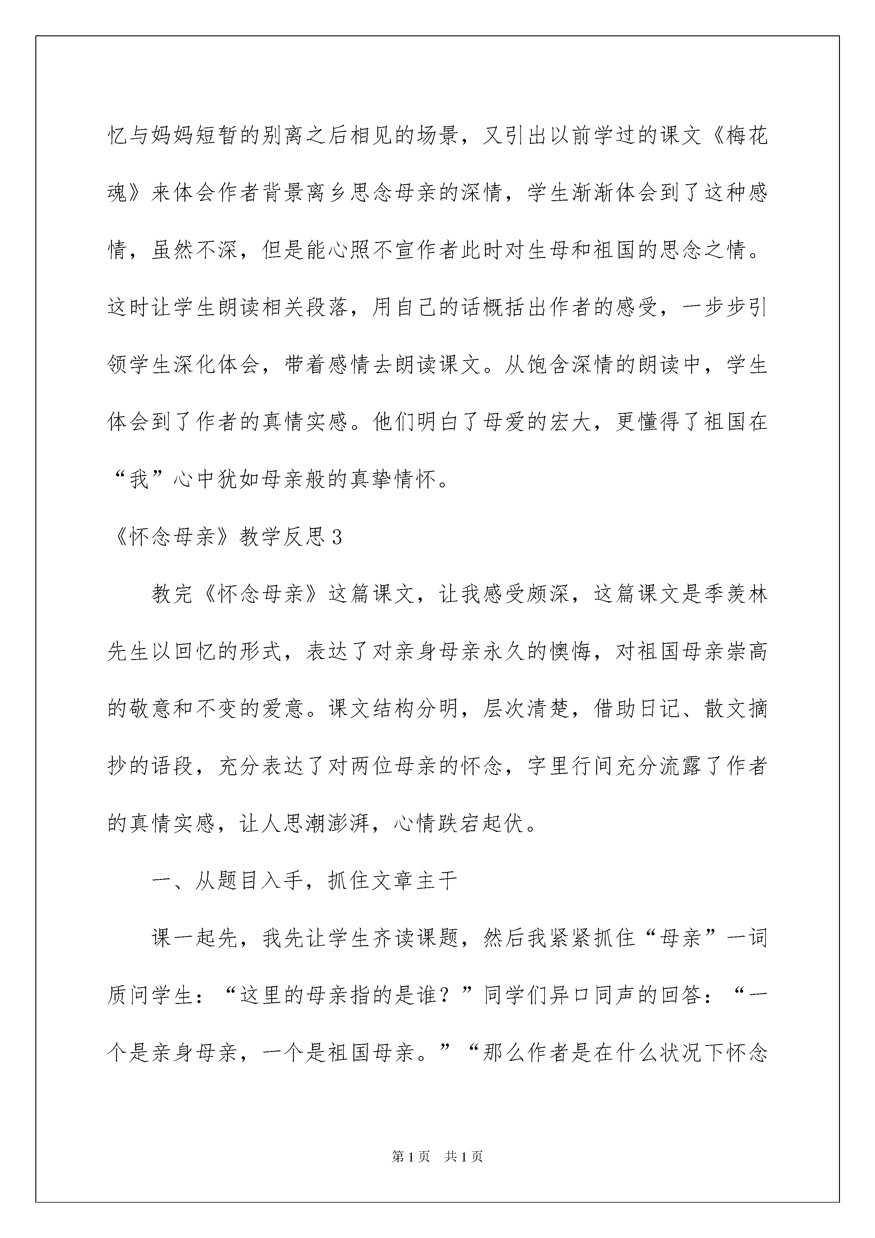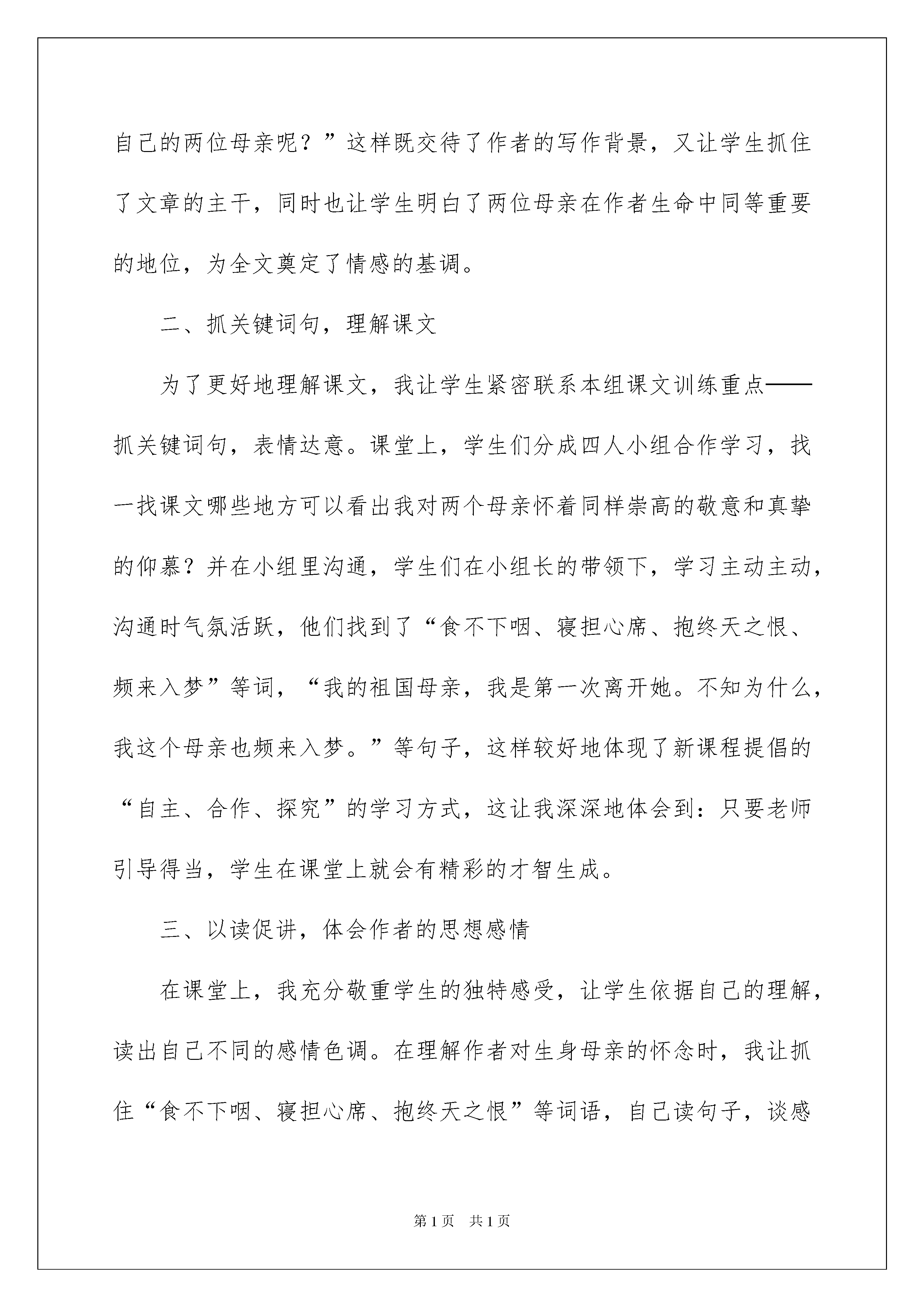 2022《怀念母亲》教学反思《怀念母亲》教学反思身为一名人民老师,我们须要很强的课堂教学实力,借助教学反思我们可以拓展自己的教学方式,优秀的教学反思都具备一些什么特点呢?下面是我收集整理的《怀念母亲》教学反思,希望对大家有所帮助。《怀念母亲》教学反思1《怀念母亲》写的是季羡林老先生对两位母亲——一位是亲生母亲,一位是祖国母亲的怀念之情。中心句是“我对这两位母亲怀有同样崇高的敬意和同样真挚的仰慕。”可是对六年级的小学生来说,很难深化体会作者这份真挚的情感。怎样缩短学生与文本与作者的情感距离呢?我经过一再思索,多方查阅资料。确定从三个角度找寻突破口:一、从题目入手,抓住情感主线。课一起先,我先让学生齐读课题,然后抓住“怀念”一词问学生:“怀念什么意思?与思念、惦念有什么不同?”让学生初步明确作者对母亲的惦念与思念是深切的沉痛的。再问学生:“这里的母亲指的是谁?”同学们异口同声的回答:“一个是亲身母亲,一个是祖国母亲。”“那么作者是在什么状况下怀念自己的两位母亲呢?”一下子引入文章写作背景,让学生抓住了作者的情感主线,为全文奠定了情感的基调。二、抓关键词句,理解课文为了更好地理解课文,我让学生紧密联系本组课文训练重点──抓关键词句,表情达意。借助问题:“课文哪些地方可以看出我对两个母亲怀着同样崇高的敬意和真挚的仰慕?”引导学生小组合作,学生们在小组长的带领下,分别找到了“食不下咽、寝担心席、抱终天之恨、频来入梦”等词,“我的祖国母亲,我是第一次离开她。不知为什么,我这个母亲也频来入梦。”等句子,并通过沟通感受,渐渐感受到季羡林对母亲的愧疚和对祖国的眷恋。三、补充资料,体会作者的思想感情在课堂上,随着学生的学习,我适时插入季老先生《赋得永久的悔》的几个片段,让学生明白作者对母亲的懊悔缘由,并让学生反复地读,从读中体会到了作者因为无法尽孝而心存自责,愧疚之情。在理解作者对祖国母亲的怀念时,我结合课文内容,介绍了季羡林留学德国的一些经验,让学生充分感受作者的困难心情;通过对比读、选择喜爱的部分读、自读等方式,感受作者对祖国母亲崇高的敬意和不变的爱意。上完这节课,同学们都被作者对母亲的怀念之情深深地感动了,有的同学甚至热泪盈眶,这也让我感受到:在教学中不仅要让学生“解读”,更应当引导学生“创读”,以读促讲,以读悟情,以读激情。《怀念母亲》教学反思2《怀念母亲》这篇课文以回忆的形式,介绍了季羡林先生对生身母亲和祖国母亲“同样崇高的敬意和同样真挚的仰慕”,充分表达了作者对亲生母亲永久的懊悔,对祖国母亲不变的爱意。本课的教学本课的教学重点是揣摩重点语句,感受作者对两个母亲同样崇高的敬意和真挚的仰慕之情。这也是本课的教学难点。为了突破这个难点,我将课文的教学主线分为“怀念生身母亲”和“怀念祖国母亲”两大部分,由“频来入梦”引出“怀念生母”,由此又引出怀念“祖国母亲”。五年级的孩子大多没有母亲、离开家乡的经验,更别说离开祖国了。为了让孩子们与作者的情怀产生共鸣,我让他们回忆与妈妈短暂的别离之后相见的场景,又引出以前学过的课文《梅花魂》来体会作者背景离乡思念母亲的深情,学生渐渐体会到了这种感情,虽然不深,但是能心照不宣作者此时对生母和祖国的思念之情。这时让学生朗读相关段落,用自己的话概括出作者的感受,一步步引领学生深化体会,带着感情去朗读课文。从饱含深情的朗读中,学生体会到了作者的真情实感。他们明白了母爱的宏大,更懂得了祖国在“我”心中犹如母亲般的真挚情怀。《怀念母亲》教学反思3教完《怀念母亲》这篇课文,让我感受颇深,这篇课文是季羡林先生以回忆的形式,表达了对亲身母亲永久的懊悔,对祖国母亲崇高的敬意和不变的爱意。课文结构分明,层次清楚,借助日记、散文摘抄的语段,充分表达了对两位母亲的怀念,字里行间充分流露了作者的真情实感,让人思潮澎湃,心情跌宕起伏。一、从题目入手,抓住文章主干课一起先,我先让学生齐读课题,然后我紧紧抓住“母亲”一词质问学生:“这里的母亲指的是谁?”同学们异口同声的回答:“一个是亲身母亲,一个是祖国母亲。”“那么作者是在什么状况下怀念自己的两位母亲呢?”这样既交待了作者的写作背景,又让学生抓住了文章的主干,同时也让学生明白了两位母亲在作者生命中同等重要的地位,为全文奠定了情感的基调。二、抓关键词句,理解课文为了更好地理解课文,我让学生紧密联系本组课文训练重点──抓关键词句,表情达意。课堂上,学生们分成四人小组合作学习,找一找课文哪些地方可以看出我对两个母亲怀着同样崇高的敬意和真挚的仰慕?并在小组里沟通,学生们在小组长的带领下,学习主动主动,沟通时气氛活跃,他们找到了“食不下咽、寝担