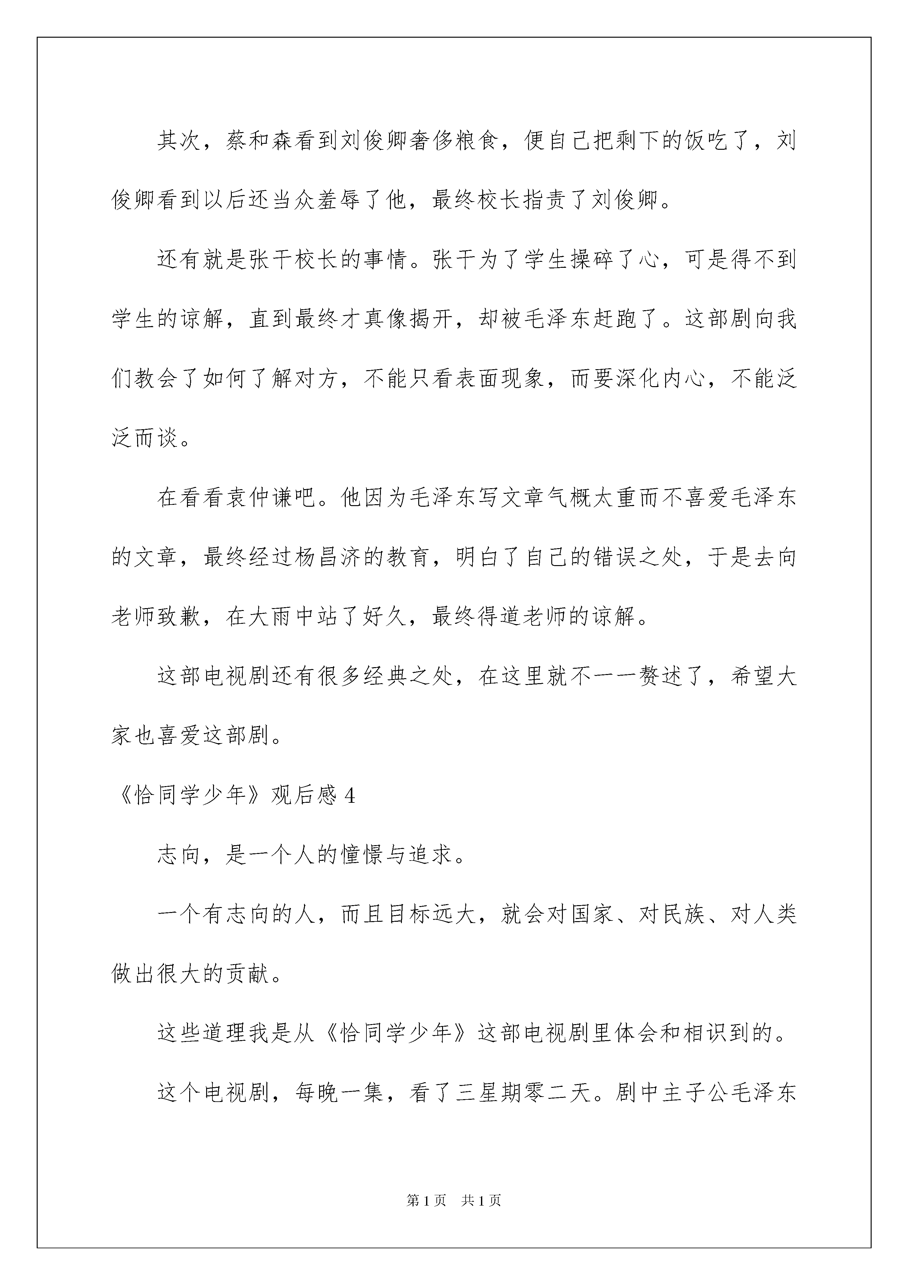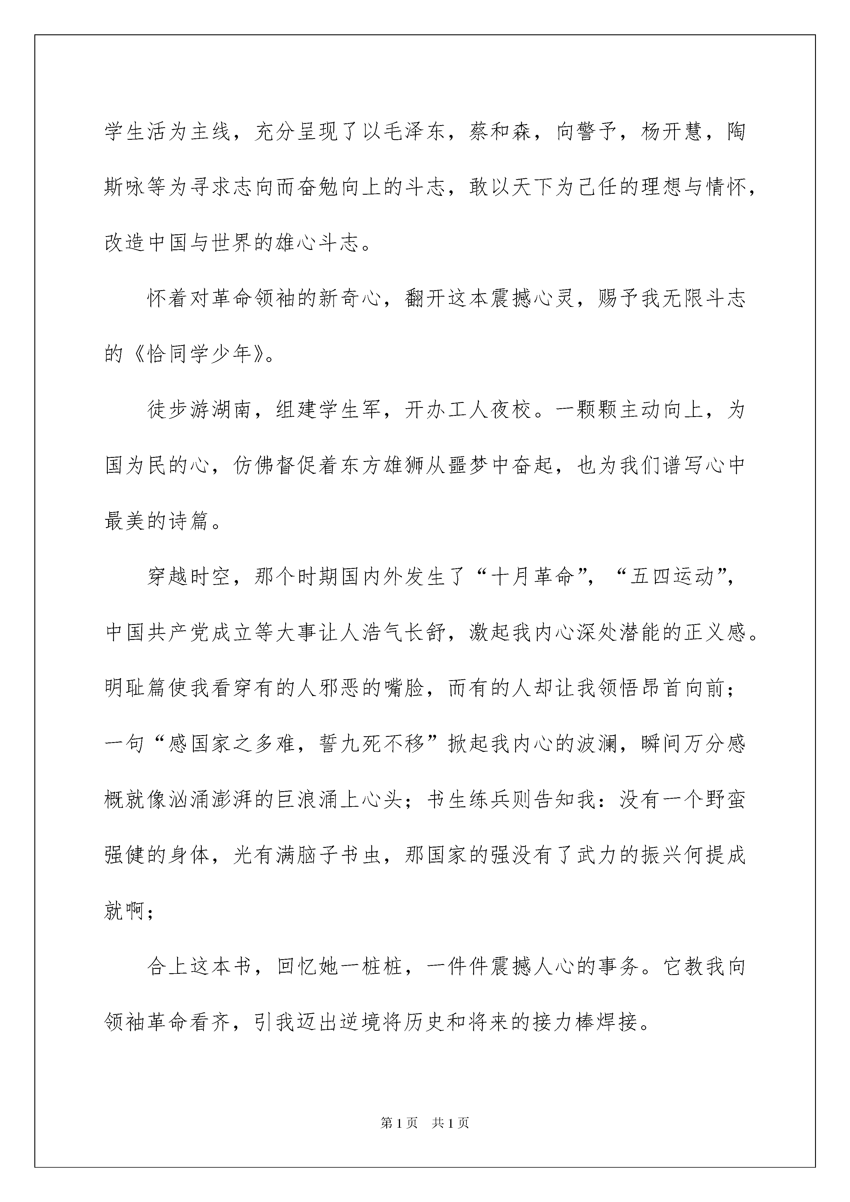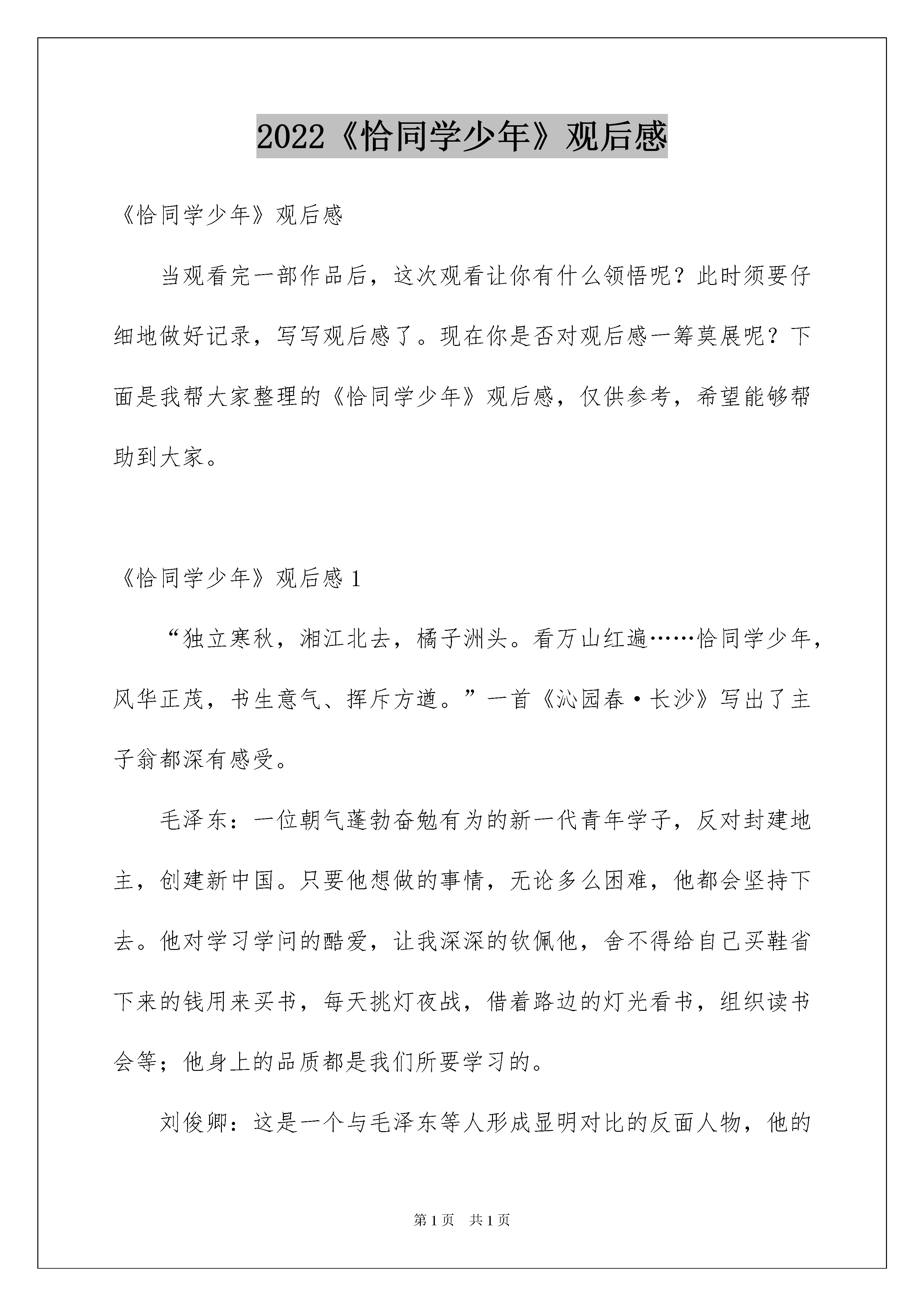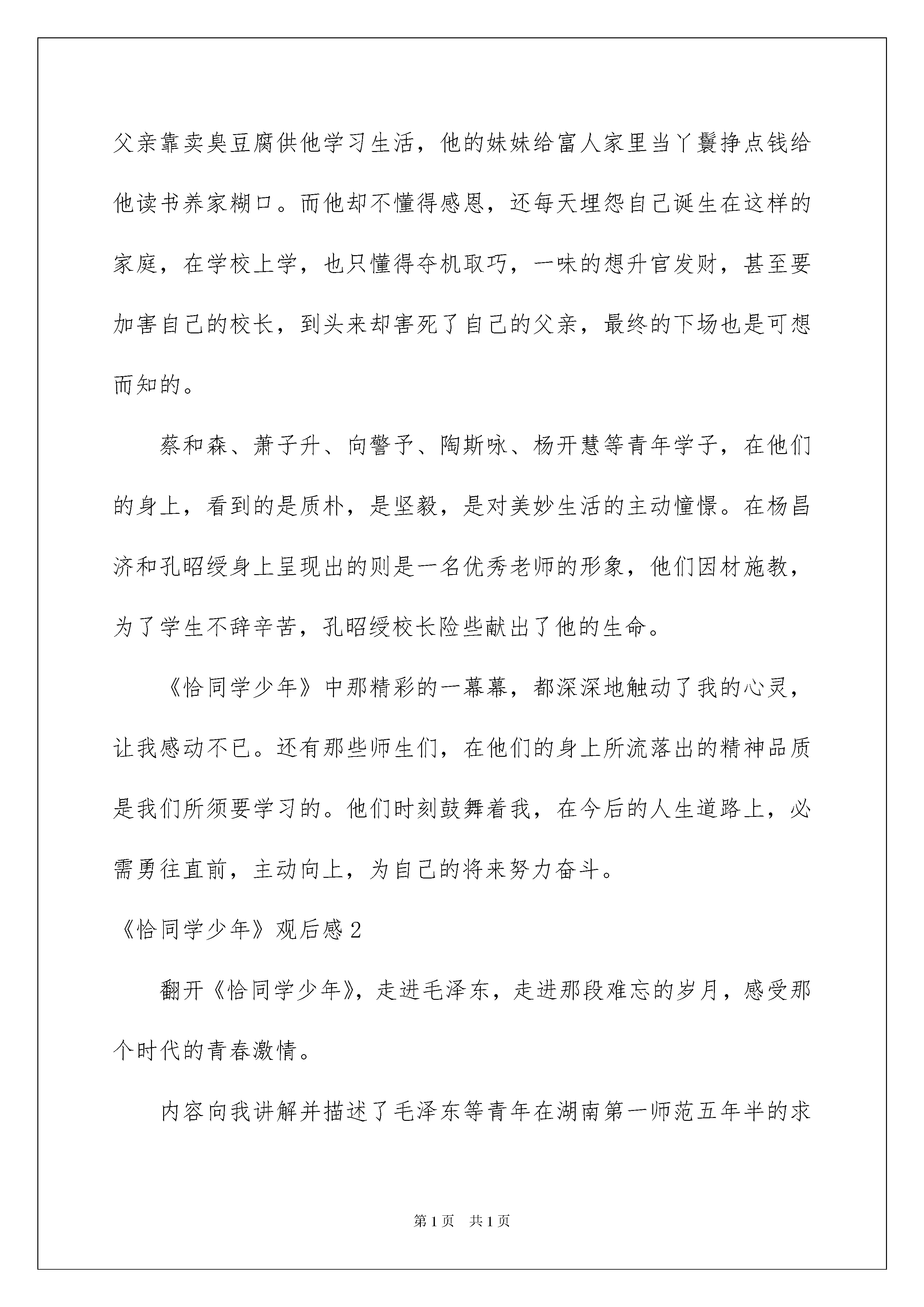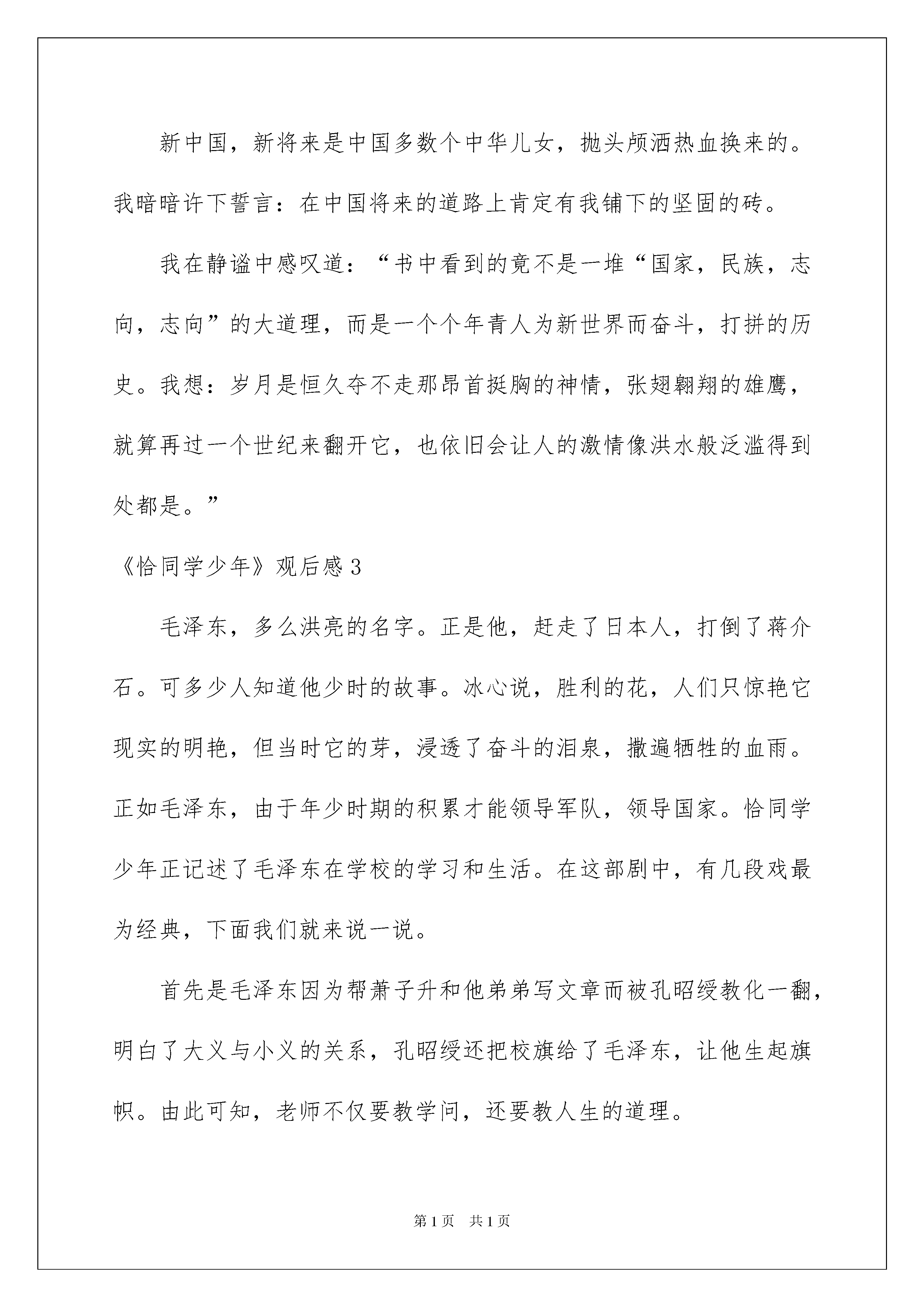 2022《恰同学少年》观后感《恰同学少年》观后感当观看完一部作品后,这次观看让你有什么领悟呢?此时须要仔细地做好记录,写写观后感了。现在你是否对观后感一筹莫展呢?下面是我帮大家整理的《恰同学少年》观后感,仅供参考,希望能够帮助到大家。《恰同学少年》观后感1“独立寒秋,湘江北去,橘子洲头。看万山红遍……恰同学少年,风华正茂,书生意气、挥斥方遒。”一首《沁园春·长沙》写出了主子翁都深有感受。毛泽东:一位朝气蓬勃奋勉有为的新一代青年学子,反对封建地主,创建新中国。只要他想做的事情,无论多么困难,他都会坚持下去。他对学习学问的酷爱,让我深深的钦佩他,舍不得给自己买鞋省下来的钱用来买书,每天挑灯夜战,借着路边的灯光看书,组织读书会等;他身上的品质都是我们所要学习的。刘俊卿:这是一个与毛泽东等人形成显明对比的反面人物,他的父亲靠卖臭豆腐供他学习生活,他的妹妹给富人家里当丫鬟挣点钱给他读书养家糊口。而他却不懂得感恩,还每天埋怨自己诞生在这样的家庭,在学校上学,也只懂得夺机取巧,一味的想升官发财,甚至要加害自己的校长,到头来却害死了自己的父亲,最终的下场也是可想而知的。蔡和森、萧子升、向警予、陶斯咏、杨开慧等青年学子,在他们的身上,看到的是质朴,是坚毅,是对美妙生活的主动憧憬。在杨昌济和孔昭绶身上呈现出的则是一名优秀老师的形象,他们因材施教,为了学生不辞辛苦,孔昭绶校长险些献出了他的生命。《恰同学少年》中那精彩的一幕幕,都深深地触动了我的心灵,让我感动不已。还有那些师生们,在他们的身上所流落出的精神品质是我们所须要学习的。他们时刻鼓舞着我,在今后的人生道路上,必需勇往直前,主动向上,为自己的将来努力奋斗。《恰同学少年》观后感2翻开《恰同学少年》,走进毛泽东,走进那段难忘的岁月,感受那个时代的青春激情。内容向我讲解并描述了毛泽东等青年在湖南第一师范五年半的求学生活为主线,充分呈现了以毛泽东,蔡和森,向警予,杨开慧,陶斯咏等为寻求志向而奋勉向上的斗志,敢以天下为己任的理想与情怀,改造中国与世界的雄心斗志。怀着对革命领袖的新奇心,翻开这本震撼心灵,赐予我无限斗志的《恰同学少年》。徒步游湖南,组建学生军,开办工人夜校。一颗颗主动向上,为国为民的心,仿佛督促着东方雄狮从噩梦中奋起,也为我们谱写心中最美的诗篇。穿越时空,那个时期国内外发生了“十月革命”,“五四运动”,中国共产党成立等大事让人浩气长舒,激起我内心深处潜能的正义感。明耻篇使我看穿有的人邪恶的嘴脸,而有的人却让我领悟昂首向前;一句“感国家之多难,誓九死不移”掀起我内心的波澜,瞬间万分感概就像汹涌澎湃的巨浪涌上心头;书生练兵则告知我:没有一个野蛮强健的身体,光有满脑子书虫,那国家的强没有了武力的振兴何提成就啊;合上这本书,回忆她一桩桩,一件件震撼人心的事务。它教我向领袖革命看齐,引我迈出逆境将历史和将来的接力棒焊接。新中国,新将来是中国多数个中华儿女,抛头颅洒热血换来的。我暗暗许下誓言:在中国将来的道路上肯定有我铺下的坚固的砖。我在静谧中感叹道:“书中看到的竟不是一堆“国家,民族,志向,志向”的大道理,而是一个个年青人为新世界而奋斗,打拼的历史。我想:岁月是恒久夺不走那昂首挺胸的神情,张翅翱翔的雄鹰,就算再过一个世纪来翻开它,也依旧会让人的激情像洪水般泛滥得到处都是。”《恰同学少年》观后感3毛泽东,多么洪亮的名字。正是他,赶走了日本人,打倒了蒋介石。可多少人知道他少时的故事。冰心说,胜利的花,人们只惊艳它现实的明艳,但当时它的芽,浸透了奋斗的泪泉,撒遍牺牲的血雨。正如毛泽东,由于年少时期的积累才能领导军队,领导国家。恰同学少年正记述了毛泽东在学校的学习和生活。在这部剧中,有几段戏最为经典,下面我们就来说一说。首先是毛泽东因为帮萧子升和他弟弟写文章而被孔昭绶教化一翻,明白了大义与小义的关系,孔昭绶还把校旗给了毛泽东,让他生起旗帜。由此可知,老师不仅要教学问,还要教人生的道理。其次,蔡和森看到刘俊卿奢侈粮食,便自己把剩下的饭吃了,刘俊卿看到以后还当众羞辱了他,最终校长指责了刘俊卿。还有就是张干校长的事情。张干为了学生操碎了心,可是得不到学生的谅解,直到最终才真像揭开,却被毛泽东赶跑了。这部剧向我们教会了如何了解对方,不能只看表面现象,而要深化内心,不能泛泛而谈。在看看袁仲谦吧。他因为毛泽东写文章气概太重而不喜爱毛泽东的文章,最终经过杨昌济的教育,明白了自己的错误之处,于是去向老师致歉,在大雨中站了好久,最终得道老师的谅解。这部电视剧还有很多经典之处,在这里就不一一赘述了,希望大家也喜爱这部剧。《恰同学少年》观后感4志向,是一个人的憧憬与追求。一