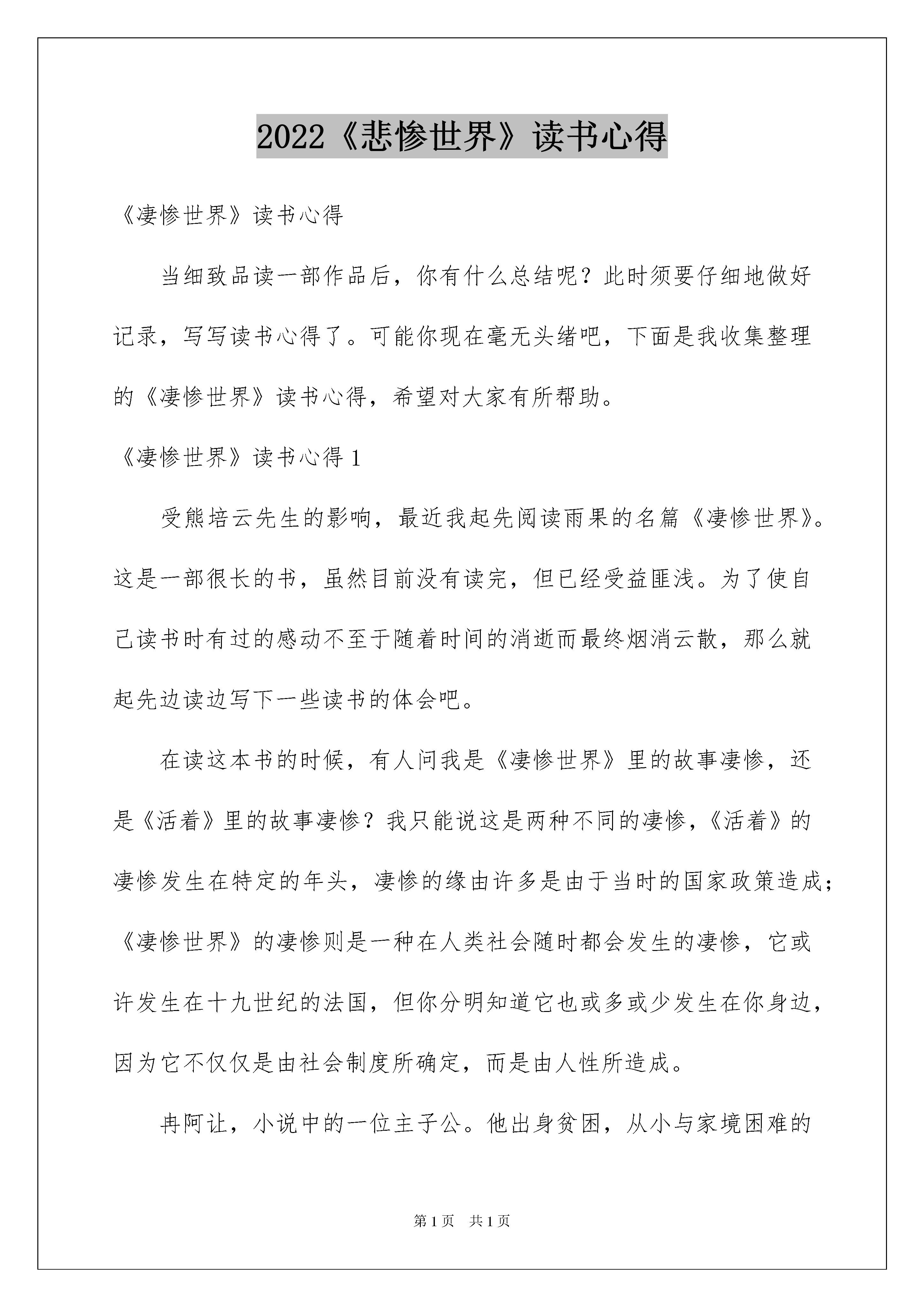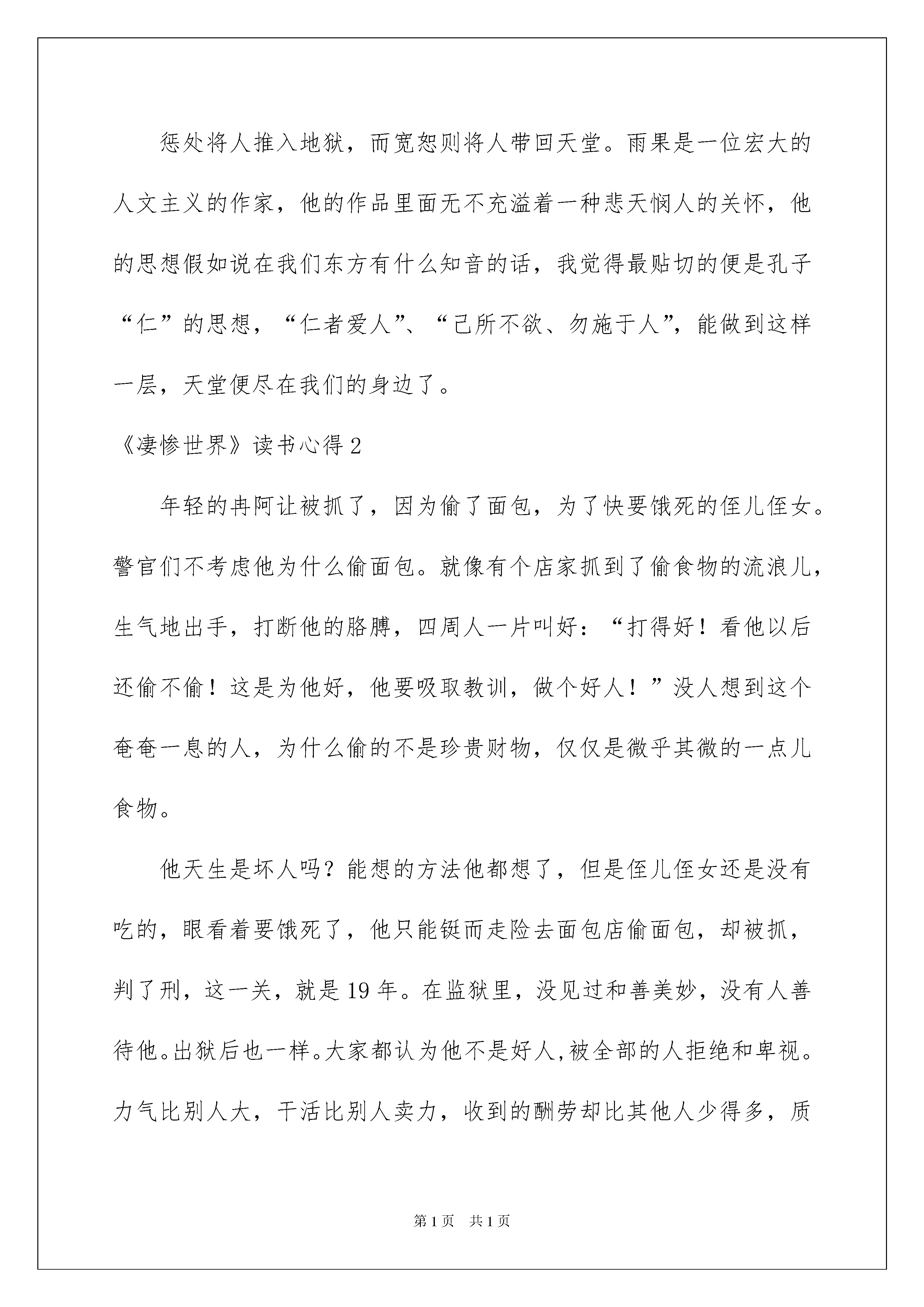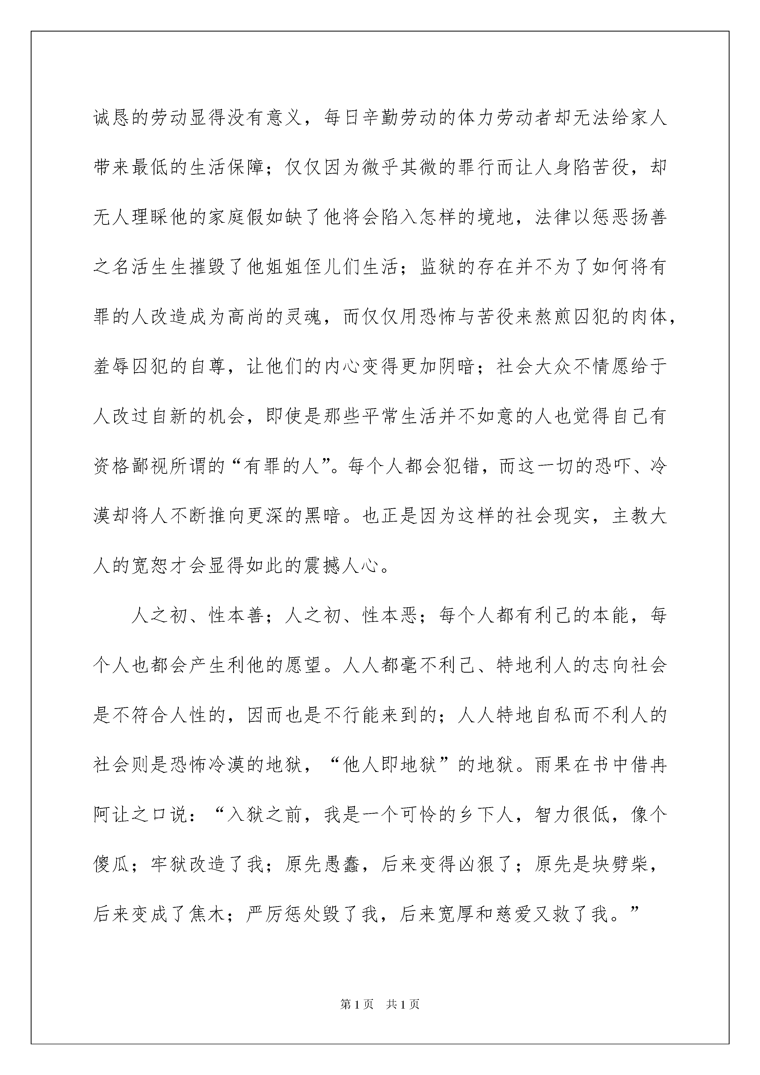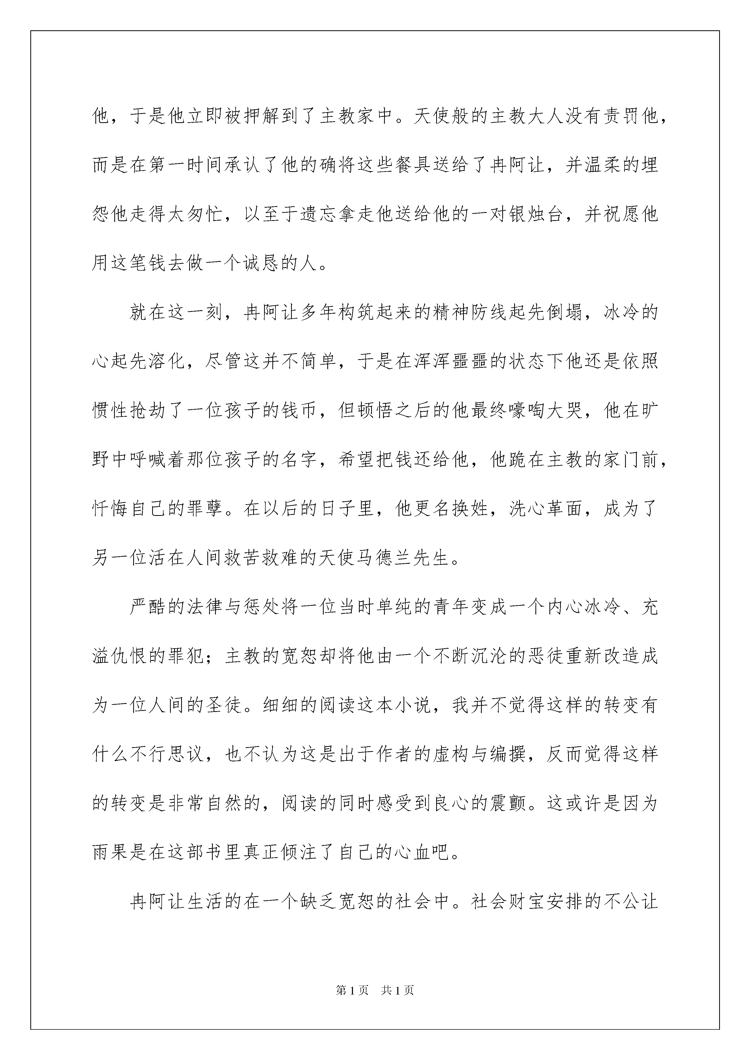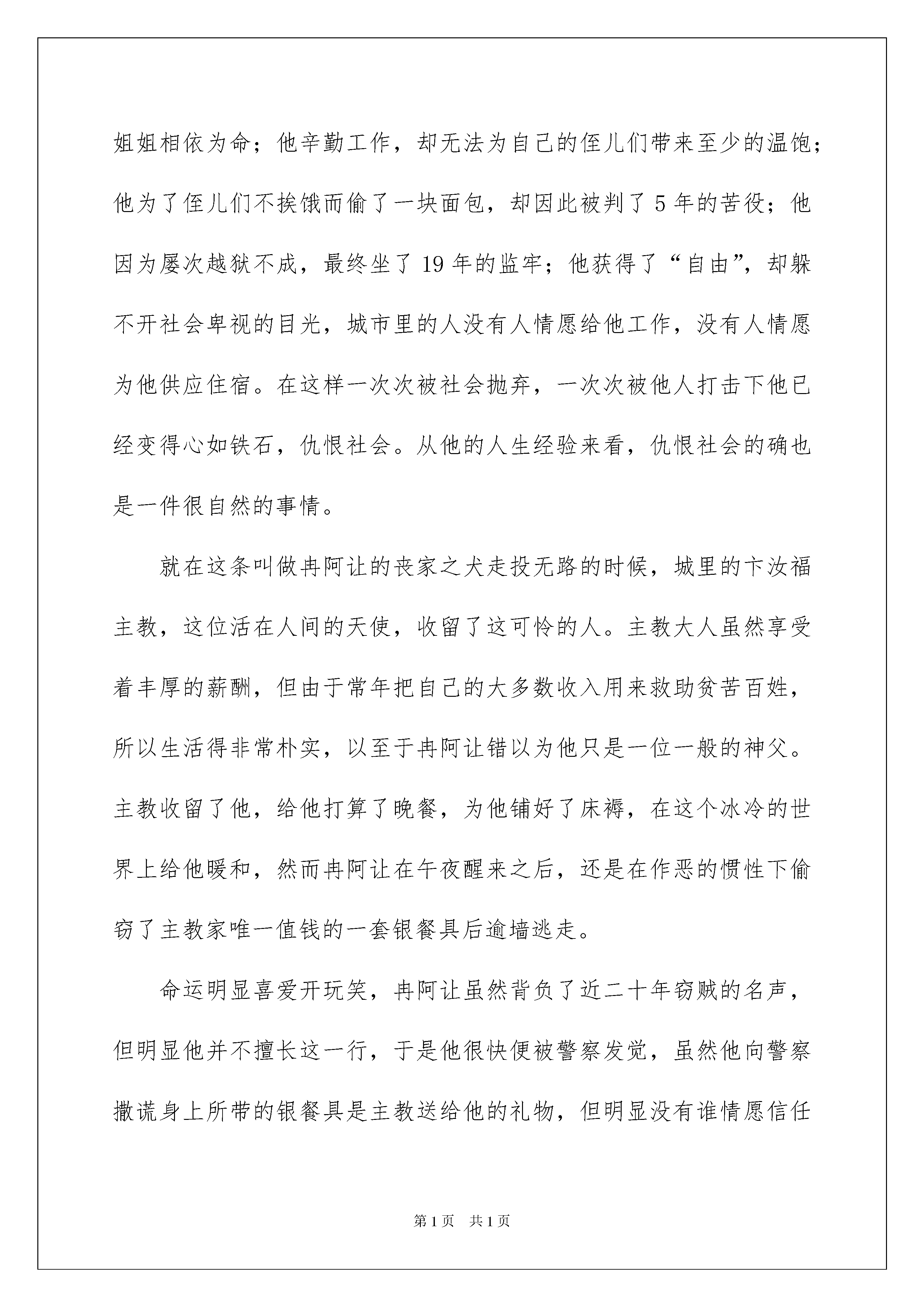 2022《悲惨世界》读书心得《凄惨世界》读书心得当细致品读一部作品后,你有什么总结呢?此时须要仔细地做好记录,写写读书心得了。可能你现在毫无头绪吧,下面是我收集整理的《凄惨世界》读书心得,希望对大家有所帮助。《凄惨世界》读书心得1受熊培云先生的影响,最近我起先阅读雨果的名篇《凄惨世界》。这是一部很长的书,虽然目前没有读完,但已经受益匪浅。为了使自己读书时有过的感动不至于随着时间的消逝而最终烟消云散,那么就起先边读边写下一些读书的体会吧。在读这本书的时候,有人问我是《凄惨世界》里的故事凄惨,还是《活着》里的故事凄惨?我只能说这是两种不同的凄惨,《活着》的凄惨发生在特定的年头,凄惨的缘由许多是由于当时的国家政策造成;《凄惨世界》的凄惨则是一种在人类社会随时都会发生的凄惨,它或许发生在十九世纪的法国,但你分明知道它也或多或少发生在你身边,因为它不仅仅是由社会制度所确定,而是由人性所造成。冉阿让,小说中的一位主子公。他出身贫困,从小与家境困难的姐姐相依为命;他辛勤工作,却无法为自己的侄儿们带来至少的温饱;他为了侄儿们不挨饿而偷了一块面包,却因此被判了5年的苦役;他因为屡次越狱不成,最终坐了19年的监牢;他获得了“自由”,却躲不开社会卑视的目光,城市里的人没有人情愿给他工作,没有人情愿为他供应住宿。在这样一次次被社会抛弃,一次次被他人打击下他已经变得心如铁石,仇恨社会。从他的人生经验来看,仇恨社会的确也是一件很自然的事情。就在这条叫做冉阿让的丧家之犬走投无路的时候,城里的卞汝福主教,这位活在人间的天使,收留了这可怜的人。主教大人虽然享受着丰厚的薪酬,但由于常年把自己的大多数收入用来救助贫苦百姓,所以生活得非常朴实,以至于冉阿让错以为他只是一位一般的神父。主教收留了他,给他打算了晚餐,为他铺好了床褥,在这个冰冷的世界上给他暖和,然而冉阿让在午夜醒来之后,还是在作恶的惯性下偷窃了主教家唯一值钱的一套银餐具后逾墙逃走。命运明显喜爱开玩笑,冉阿让虽然背负了近二十年窃贼的名声,但明显他并不擅长这一行,于是他很快便被警察发觉,虽然他向警察撒谎身上所带的银餐具是主教送给他的礼物,但明显没有谁情愿信任他,于是他立即被押解到了主教家中。天使般的主教大人没有责罚他,而是在第一时间承认了他的确将这些餐具送给了冉阿让,并温柔的埋怨他走得太匆忙,以至于遗忘拿走他送给他的一对银烛台,并祝愿他用这笔钱去做一个诚恳的人。就在这一刻,冉阿让多年构筑起来的精神防线起先倒塌,冰冷的心起先溶化,尽管这并不简单,于是在浑浑噩噩的状态下他还是依照惯性抢劫了一位孩子的钱币,但顿悟之后的他最终嚎啕大哭,他在旷野中呼喊着那位孩子的名字,希望把钱还给他,他跪在主教的家门前,忏悔自己的罪孽。在以后的日子里,他更名换姓,洗心革面,成为了另一位活在人间救苦救难的天使马德兰先生。严酷的法律与惩处将一位当时单纯的青年变成一个内心冰冷、充溢仇恨的罪犯;主教的宽恕却将他由一个不断沉沦的恶徒重新改造成为一位人间的圣徒。细细的阅读这本小说,我并不觉得这样的转变有什么不行思议,也不认为这是出于作者的虚构与编撰,反而觉得这样的转变是非常自然的,阅读的同时感受到良心的震颤。这或许是因为雨果是在这部书里真正倾注了自己的心血吧。冉阿让生活的在一个缺乏宽恕的社会中。社会财宝安排的不公让诚恳的劳动显得没有意义,每日辛勤劳动的体力劳动者却无法给家人带来最低的生活保障;仅仅因为微乎其微的罪行而让人身陷苦役,却无人理睬他的家庭假如缺了他将会陷入怎样的境地,法律以惩恶扬善之名活生生摧毁了他姐姐侄儿们生活;监狱的存在并不为了如何将有罪的人改造成为高尚的灵魂,而仅仅用恐怖与苦役来熬煎囚犯的肉体,羞辱囚犯的自尊,让他们的内心变得更加阴暗;社会大众不情愿给于人改过自新的机会,即使是那些平常生活并不如意的人也觉得自己有资格鄙视所谓的“有罪的人”。每个人都会犯错,而这一切的恐吓、冷漠却将人不断推向更深的黑暗。也正是因为这样的社会现实,主教大人的宽恕才会显得如此的震撼人心。人之初、性本善;人之初、性本恶;每个人都有利己的本能,每个人也都会产生利他的愿望。人人都毫不利己、特地利人的志向社会是不符合人性的,因而也是不行能来到的;人人特地自私而不利人的社会则是恐怖冷漠的地狱,“他人即地狱”的地狱。雨果在书中借冉阿让之口说:“入狱之前,我是一个可怜的乡下人,智力很低,像个傻瓜;牢狱改造了我;原先愚蠢,后来变得凶狠了;原先是块劈柴,后来变成了焦木;严厉惩处毁了我,后来宽厚和慈爱又救了我。”惩处将人推入地狱,而宽恕则将人带回天堂。雨果是一位宏大的人文主义的作家,他的作品里面无不充溢着一种悲天悯人的