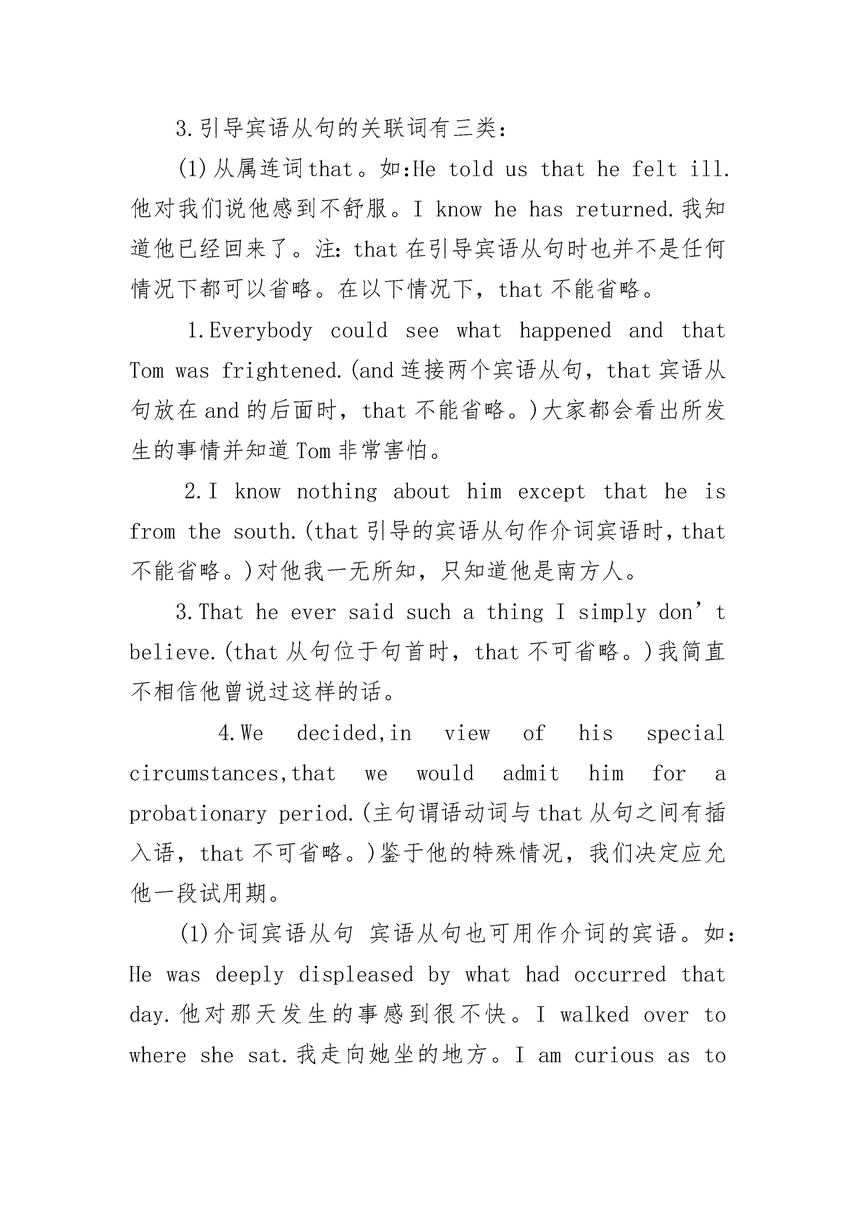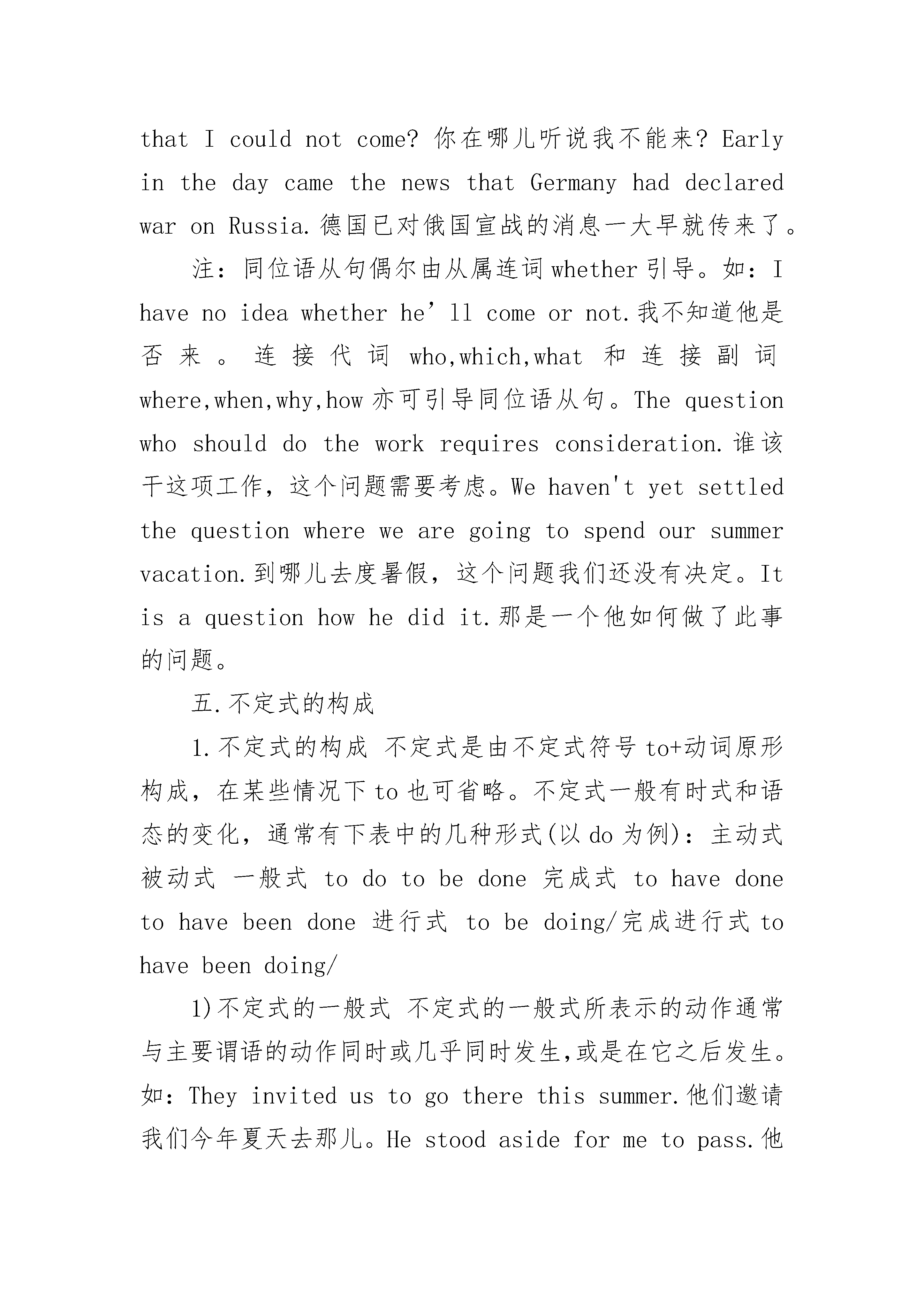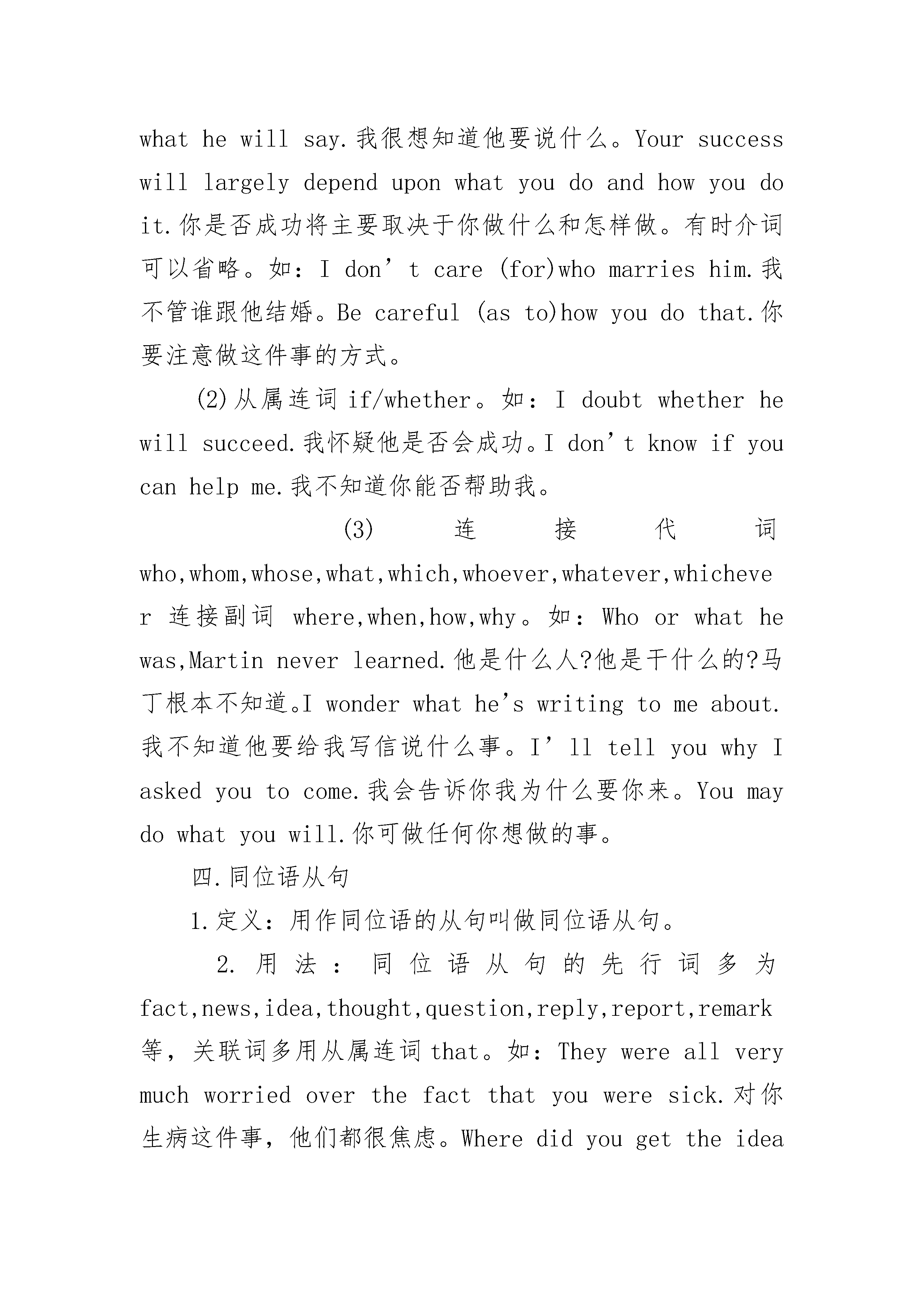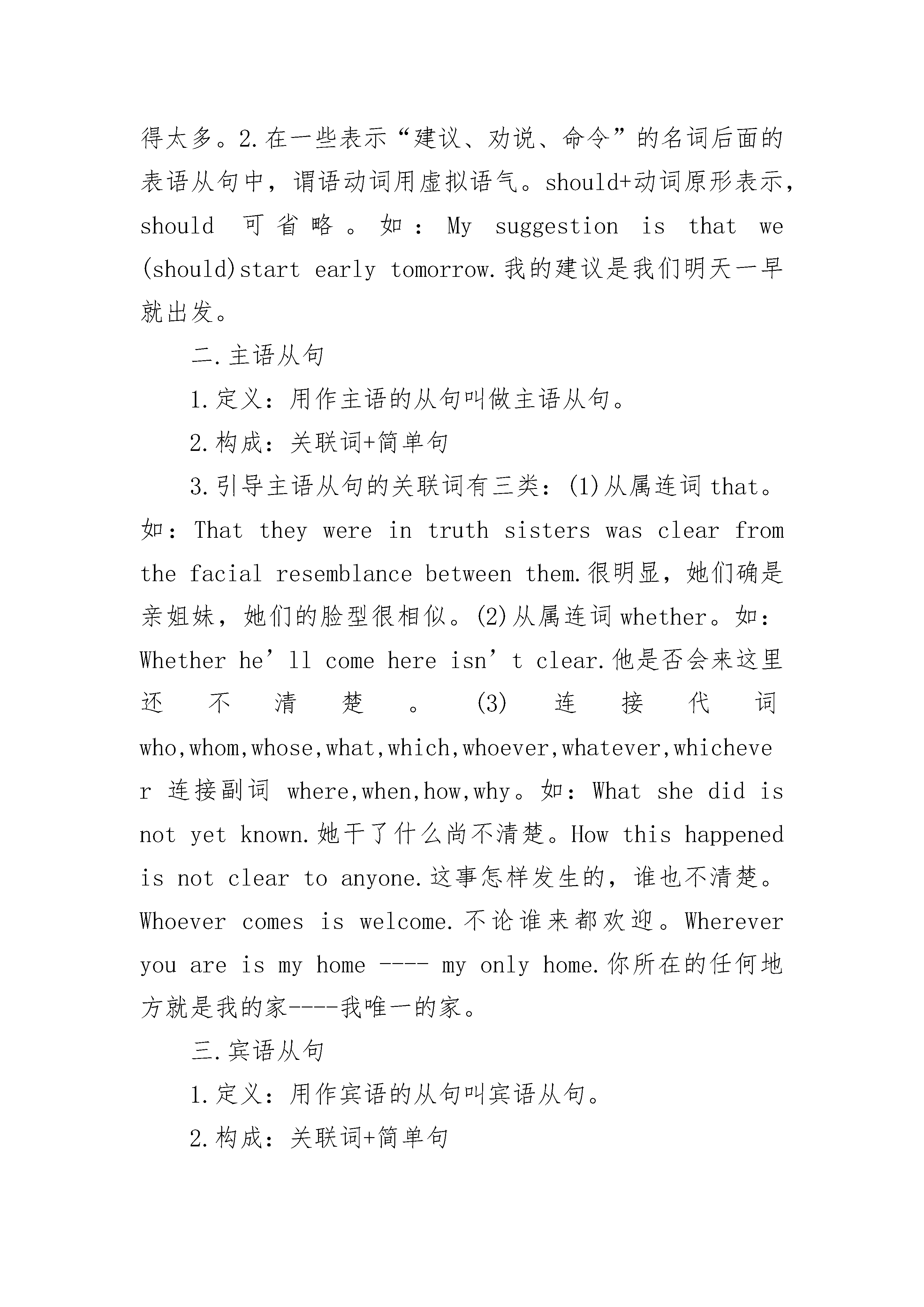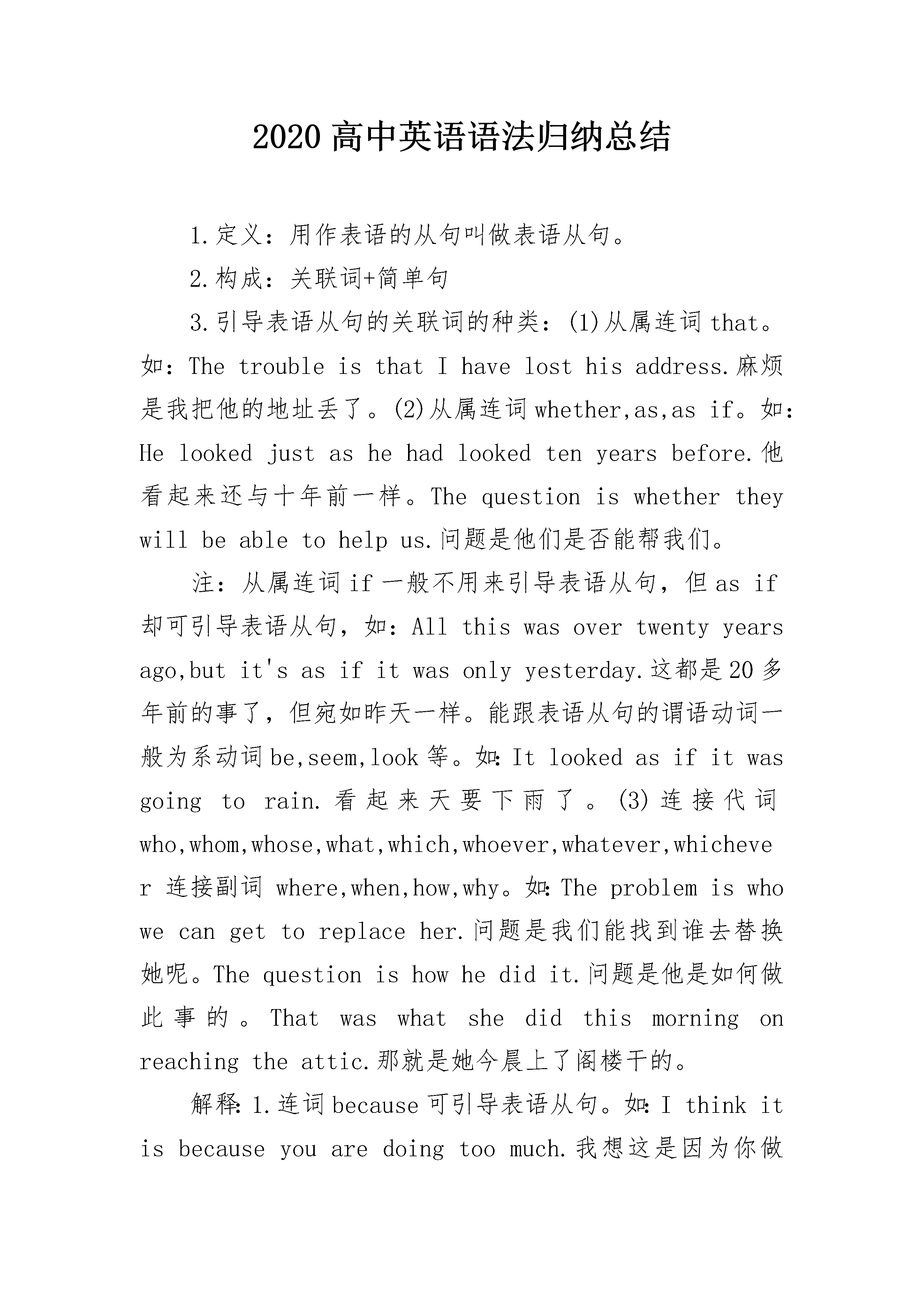 2020高中英语语法归纳总结1.定义:用作表语的从句叫做表语从句。2.构成:关联词+简单句3.引导表语从句的关联词的种类:(1)从属连词that。如:ThetroubleisthatIhavelosthisaddress.麻烦是我把他的地址丢了。(2)从属连词whether,as,asif。如:Helookedjustashehadlookedtenyearsbefore.他看起来还与十年前一样。Thequestioniswhethertheywillbeabletohelpus.问题是他们是否能帮我们。注:从属连词if一般不用来引导表语从句,但asif却可引导表语从句,如:Allthiswasovertwentyyearsago,butit'sasifitwasonlyyesterday.这都是20多年前的事了,但宛如昨天一样。能跟表语从句的谓语动词一般为系动词be,seem,look等。如:Itlookedasifitwasgoingtorain.看起来天要下雨了。(3)连接代词who,whom,whose,what,which,whoever,whatever,whichever连接副词where,when,how,why。如:Theproblemiswhowecangettoreplaceher.问题是我们能找到谁去替换她呢。Thequestionishowhedidit.问题是他是如何做此事的。Thatwaswhatshedidthismorningonreachingtheattic.那就是她今晨上了阁楼干的。解释:1.连词because可引导表语从句。如:Ithinkitisbecauseyouaredoingtoomuch.我想这是因为你做得太多。2.在一些表示“建议、劝说、命令”的名词后面的表语从句中,谓语动词用虚拟语气。should+动词原形表示,should可省略。如:Mysuggestionisthatwe(should)startearlytomorrow.我的建议是我们明天一早就出发。二.主语从句1.定义:用作主语的从句叫做主语从句。2.构成:关联词+简单句3.引导主语从句的关联词有三类:(1)从属连词that。如:Thattheywereintruthsisterswasclearfromthefacialresemblancebetweenthem.很明显,她们确是亲姐妹,她们的脸型很相似。(2)从属连词whether。如:Whetherhe’llcomehereisn’tclear.他是否会来这里还不清楚。(3)连接代词who,whom,whose,what,which,whoever,whatever,whichever连接副词where,when,how,why。如:Whatshedidisnotyetknown.她干了什么尚不清楚。Howthishappenedisnotcleartoanyone.这事怎样发生的,谁也不清楚。Whoevercomesiswelcome.不论谁来都欢迎。Whereveryouareismyhome----myonlyhome.你所在的任何地方就是我的家----我唯一的家。三.宾语从句1.定义:用作宾语的从句叫宾语从句。2.构成:关联词+简单句3.引导宾语从句的关联词有三类:(1)从属连词that。如:Hetoldusthathefeltill.他对我们说他感到不舒服。Iknowhehasreturned.我知道他已经回来了。注:that在引导宾语从句时也并不是任何情况下都可以省略。在以下情况下,that不能省略。1.EverybodycouldseewhathappenedandthatTomwasfrightened.(and连接两个宾语从句,that宾语从句放在and的后面时,that不能省略。)大家都会看出所发生的事情并知道Tom非常害怕。2.Iknownothingabouthimexceptthatheisfromthesouth.(that引导的宾语从句作介词宾语时,that不能省略。)对他我一无所知,只知道他是南方人。3.ThatheeversaidsuchathingIsimplydon’tbelieve.(that从句位于句首时,that不可省略。)我简直不相信他曾说过这样的话。4.Wedecided,inviewofhisspecialcircumstances,thatwewouldadmithimforaprobationaryperiod.(主句谓语动词与that从句之间有插入语,that不可省略。)鉴于他的特殊情况,我们决定应允他一段试用期。(1)介词宾语从句宾语从句也可用作介词的宾语。如:Hewasdeeplydisple